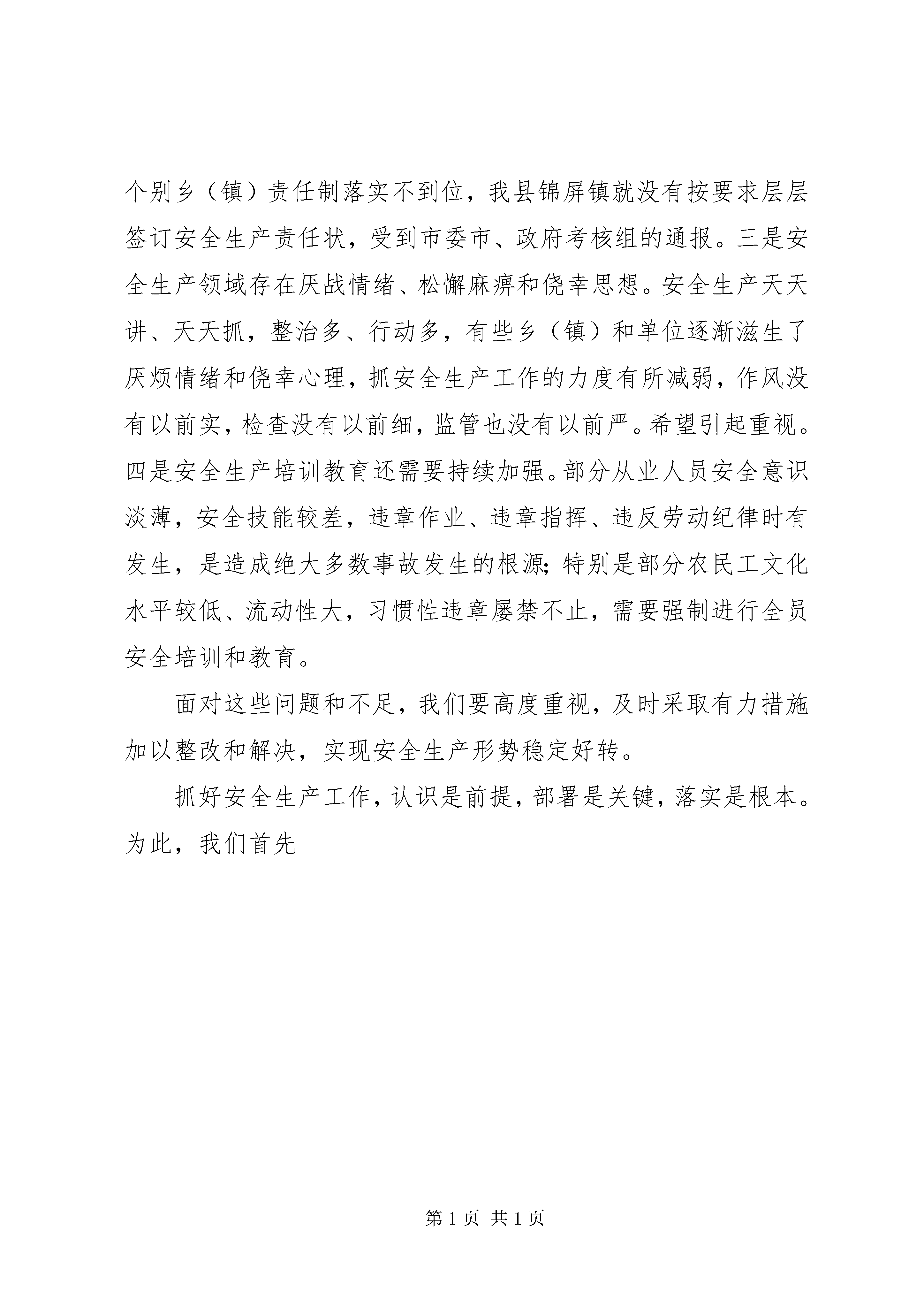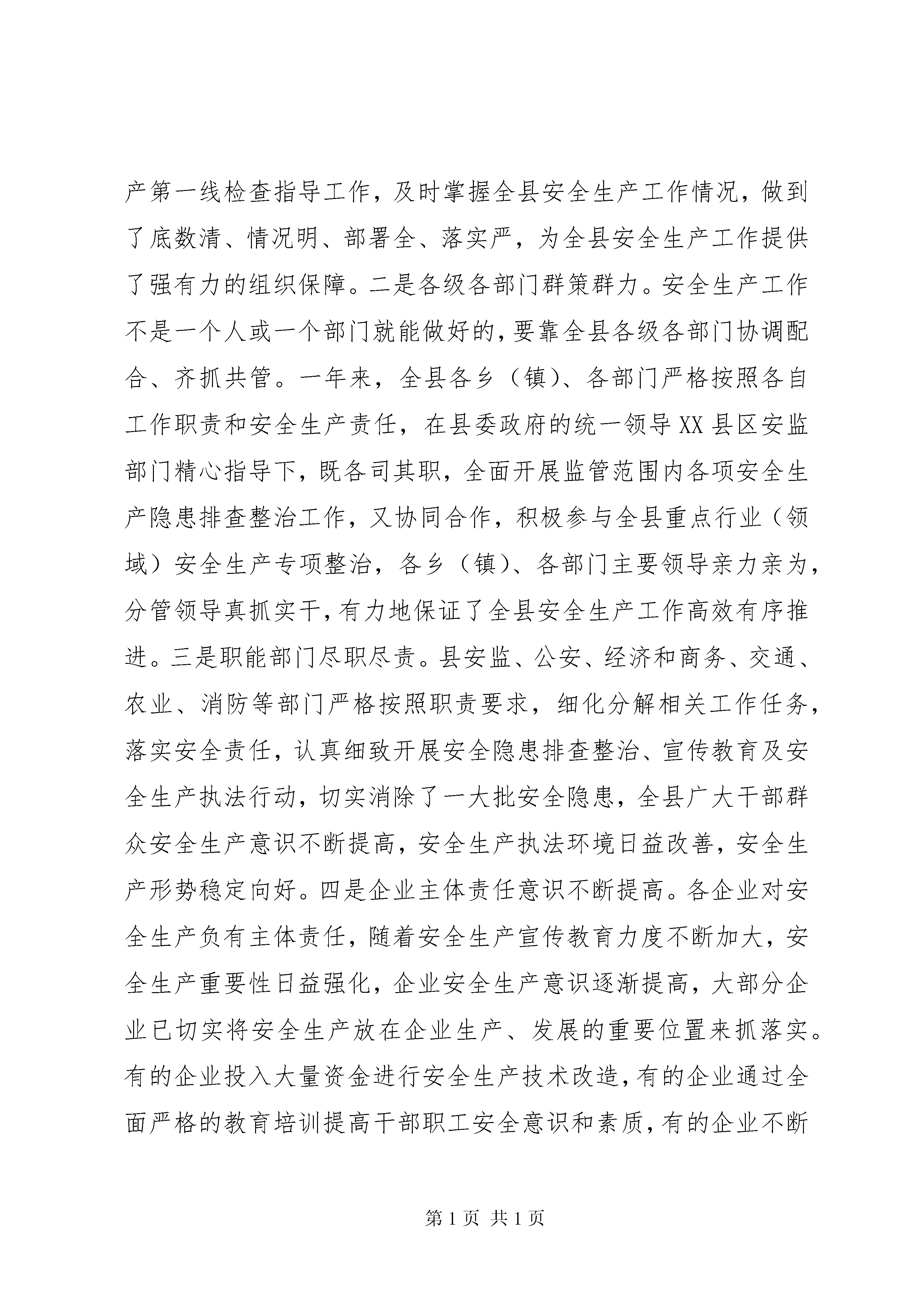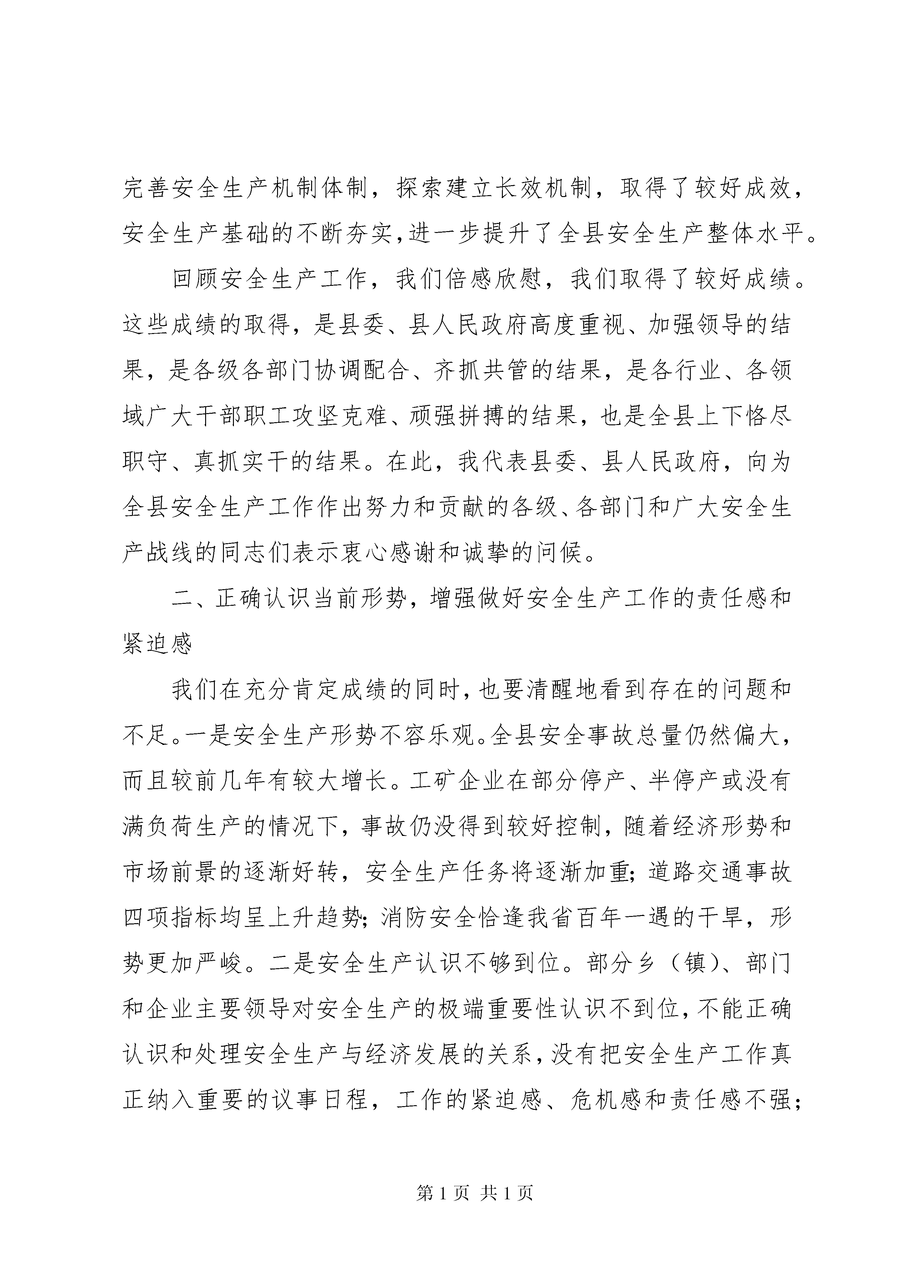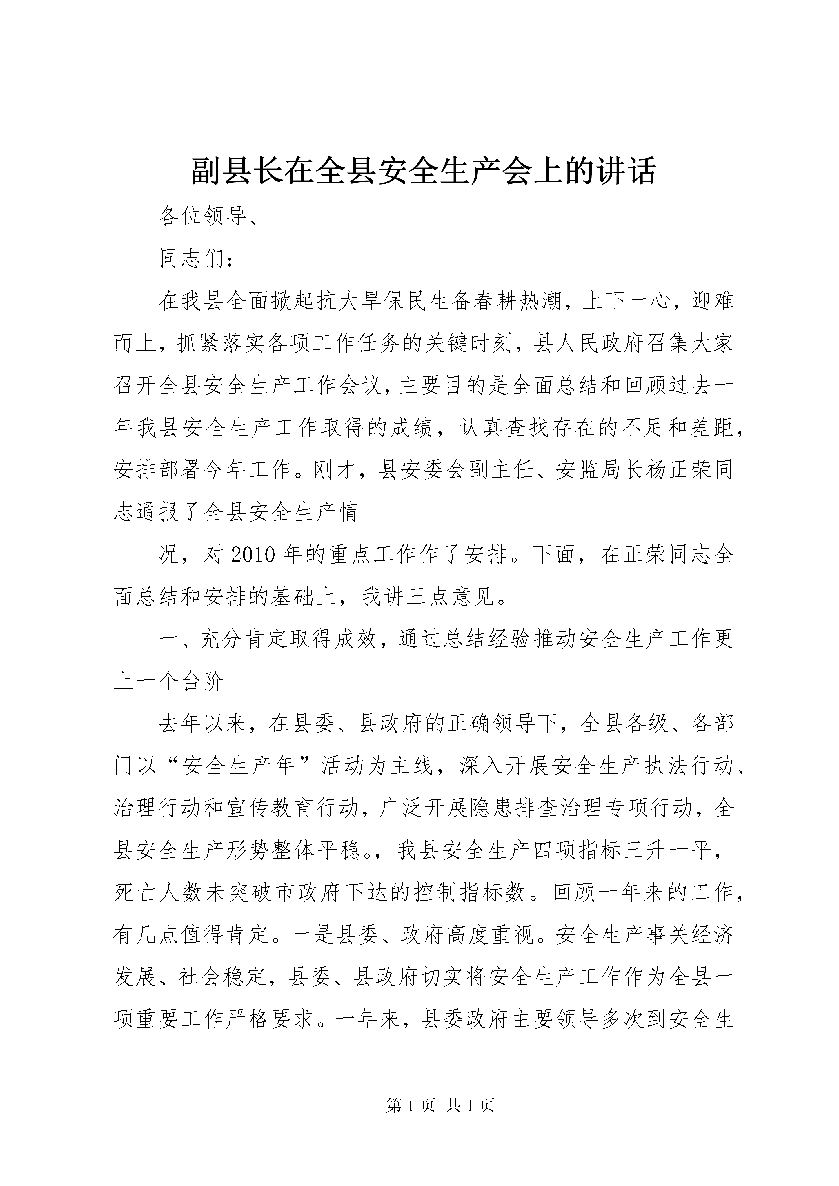 副县长在全县安全生产会上的讲话各位领导、同志们:在我县全面掀起抗大旱保民生备春耕热潮,上下一心,迎难而上,抓紧落实各项工作任务的关键时刻,县人民政府召集大家召开全县安全生产工作会议,主要目的是全面总结和回顾过去一年我县安全生产工作取得的成绩,认真查找存在的不足和差距,安排部署今年工作。刚才,县安委会副主任、安监局长杨正荣同志通报了全县安全生产情况,对2010年的重点工作作了安排。下面,在正荣同志全面总结和安排的基础上,我讲三点意见。一、充分肯定取得成效,通过总结经验推动安全生产工作更上一个台阶去年以来,在县委、县政府的正确领导下,全县各级、各部门以“安全生产年”活动为主线,深入开展安全生产执法行动、治理行动和宣传教育行动,广泛开展隐患排查治理专项行动,全县安全生产形势整体平稳。,我县安全生产四项指标三升一平,死亡人数未突破市政府下达的控制指标数。回顾一年来的工作,有几点值得肯定。一是县委、政府高度重视。安全生产事关经济发展、社会稳定,县委、县政府切实将安全生产工作作为全县一项重要工作严格要求。一年来,县委政府主要领导多次到安全生产第一线检查指导工作,及时掌握全县安全生产工作情况,做到了底数清、情况明、部署全、落实严,为全县安全生产工作提供了强有力的组织保障。二是各级各部门群策群力。安全生产工作不是一个人或一个部门就能做好的,要靠全县各级各部门协调配合、齐抓共管。一年来,全县各乡(镇)、各部门严格按照各自工作职责和安全生产责任,在县委政府的统一领导XX县区安监部门精心指导下,既各司其职,全面开展监管范围内各项安全生产隐患排查整治工作,又协同合作,积极参与全县重点行业(领域)安全生产专项整治,各乡(镇)、各部门主要领导亲力亲为,分管领导真抓实干,有力地保证了全县安全生产工作高效有序推进。三是职能部门尽职尽责。县安监、公安、经济和商务、交通、农业、消防等部门严格按照职责要求,细化分解相关工作任务,落实安全责任,认真细致开展安全隐患排查整治、宣传教育及安全生产执法行动,切实消除了一大批安全隐患,全县广大干部群众安全生产意识不断提高,安全生产执法环境日益改善,安全生产形势稳定向好。四是企业主体责任意识不断提高。各企业对安全生产负有主体责任,随着安全生产宣传教育力度不断加大,安全生产重要性日益强化,企业安全生产意识逐渐提高,大部分企业已切实将安全生产放在企业生产、发展的重要位置来抓落实。有的企业投入大量资金进行安全生产技术改造,有的企业通过全面严格的教育培训提高干部职工安全意识和素质,有的企业不断完善安全生产机制体制,探索建立长效机制,取得了较好成效,安全生产基础的不断夯实,进一步提升了全县安全生产整体水平。回顾安全生产工作,我们倍感欣慰,我们取得了较好成绩。这些成绩的取得,是县委、县人民政府高度重视、加强领导的结果,是各级各部门协调配合、齐抓共管的结果,是各行业、各领域广大干部职工攻坚克难、顽强拼搏的结果,也是全县上下恪尽职守、真抓实干的结果。在此,我代表县委、县人民政府,向为全县安全生产工作作出努力和贡献的各级、各部门和广大安全生产战线的同志们表示衷心感谢和诚挚的问候。二、正确认识当前形势,增强做好安全生产工作的责任感和紧迫感我们在充分肯定成绩的同时,也要清醒地看到存在的问题和不足。一是安全生产形势不容乐观。全县安全事故总量仍然偏大,而且较前几年有较大增长。工矿企业在部分停产、半停产或没有满负荷生产的情况下,事故仍没得到较好控制,随着经济形势和市场前景的逐渐好转,安全生产任务将逐渐加重;道路交通事故四项指标均呈上升趋势;消防安全恰逢我省百年一遇的干旱,形势更加严峻。二是安全生产认识不够到位。部分乡(镇)、部门和企业主要领导对安全生产的极端重要性认识不到位,不能正确认识和处理安全生产与经济发展的关系,没有把安全生产工作真正纳入重要的议事日程,工作的紧迫感、危机感和责任感不强;个别乡(镇)责任制落实不到位,我县锦屏镇就没有按要求层层签订安全生产责任状,受到市委市、政府考核组的通报。三是安全生产领域存在厌战情绪、松懈麻痹和侥幸思想。安全生产天天讲、天天抓,整治多、行动多,有些乡(镇)和单位逐渐滋生了厌烦情绪和侥幸心理,抓安全生产工作的力度有所减弱,作风没有以前实,检查没有以前细,监管也没有以前严。希望引起重视。四是安全生产培训教育还需要持续加强。部分从业人员安全意识淡薄,安全技能较差,违章作业、违章指挥、违反劳动纪律时有发生,是造成绝大多数事故发生的根源;特别是部分农民工文化水平较低、流动性大,习惯性违章屡禁不止,需要强制进行全员安全培训和教育。面对这些问题和不足,我们要高度重视,及时采取有力措施加以整改和解决,实现安全生产形势稳定好转。抓好安全生产工作,认识是前提,部署是关键,落实是根本。为此,我们首先