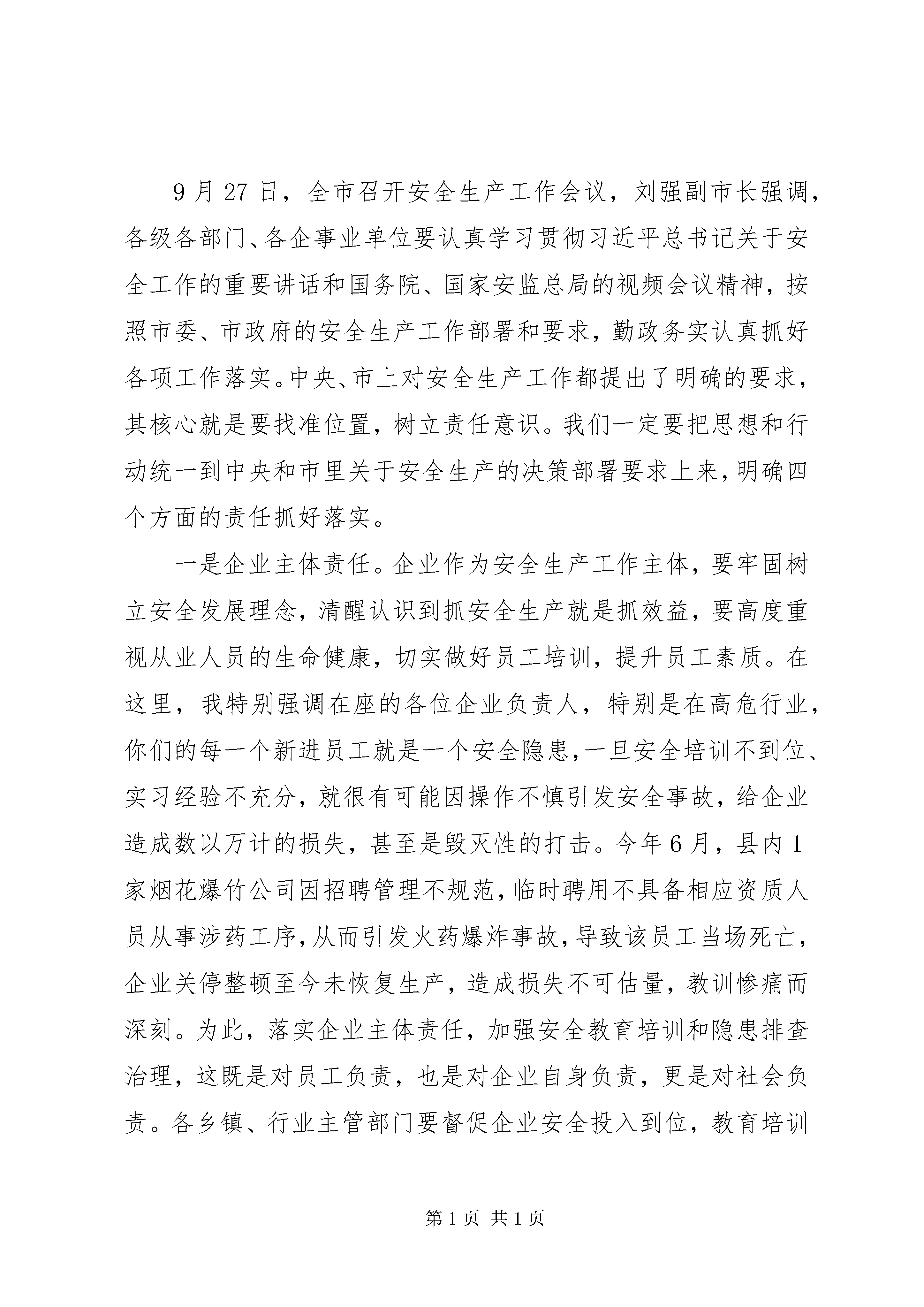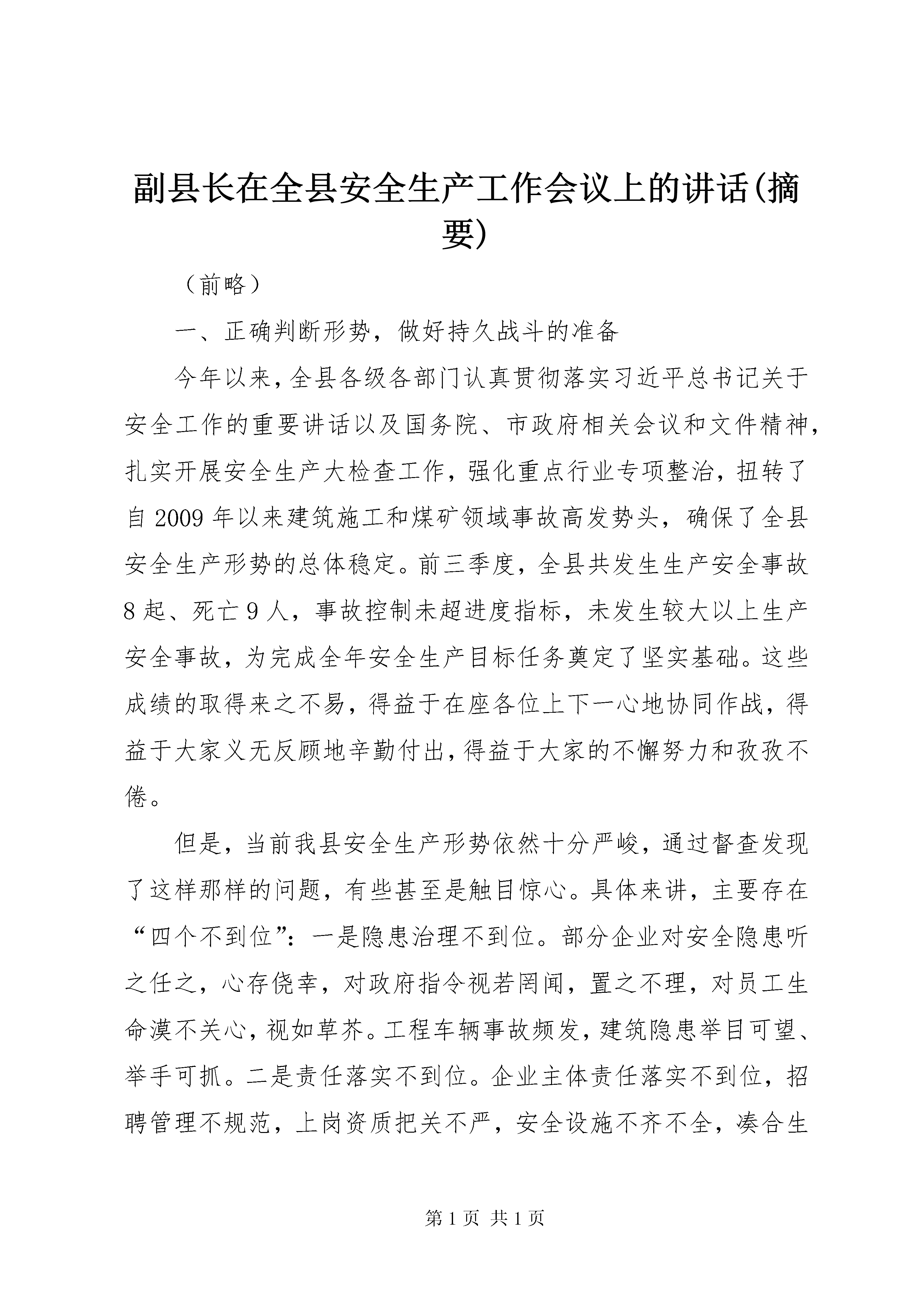 副县长在全县安全生产工作会议上的讲话(摘要)(前略)一、正确判断形势,做好持久战斗的准备今年以来,全县各级各部门认真贯彻落实习近平总书记关于安全工作的重要讲话以及国务院、市政府相关会议和文件精神,扎实开展安全生产大检查工作,强化重点行业专项整治,扭转了自2009年以来建筑施工和煤矿领域事故高发势头,确保了全县安全生产形势的总体稳定。前三季度,全县共发生生产安全事故8起、死亡9人,事故控制未超进度指标,未发生较大以上生产安全事故,为完成全年安全生产目标任务奠定了坚实基础。这些成绩的取得来之不易,得益于在座各位上下一心地协同作战,得益于大家义无反顾地辛勤付出,得益于大家的不懈努力和孜孜不倦。但是,当前我县安全生产形势依然十分严峻,通过督查发现了这样那样的问题,有些甚至是触目惊心。具体来讲,主要存在“四个不到位”:一是隐患治理不到位。部分企业对安全隐患听之任之,心存侥幸,对政府指令视若罔闻,置之不理,对员工生命漠不关心,视如草芥。工程车辆事故频发,建筑隐患举目可望、举手可抓。二是责任落实不到位。企业主体责任落实不到位,招聘管理不规范,上岗资质把关不严,安全设施不齐不全,凑合生产现象严重;地方属地管理、部门行业监管不到位,在某种程度上仍存在职责不清、界限不明,存在监管真空。三是教育培训不到位。特别是企业对员工的安全教育培训走过场,致使员工安全意识淡薄,违章操作屡见不鲜,引发的生产安全事故居高不下。四是安全管理不到位。除国有控股企业外,民营企业大多数缺乏安监机构和专职安全管理人才,现场安全管理流于形式,安全管理水平低下。安全生产工作任重而道远,我们不能有丝毫疏忽、半点马虎和片刻懈怠。习近平总书记在7月18日中央政治局常委会上强调,对安全生产工作要有畏惧之心,要有忧患意识,要经常临事而惧,要经常有睡不着觉、半夜惊醒的情况。为此,我们清醒认识到当前安全形势的严峻性和问题的复杂性,认识到安全生产不可能一蹴而就,要进一步强化责任意识、忧患意识和担当意识,以半夜惊醒的状态,时刻绷紧安全生产这根弦,做好打持久战的准备。二、明确四个责任,坚守安全生产的红线今年以来,习近平总书记、李克强总理等中央领导同志多次作出重要批示,强调要始终把人民生命安全放在首位,把安全生产作为一条不可逾越的红线。6月7日,国务院部署为期三个月的安全生产大检查,铁腕打击非法违法。7月4日、18日,中央政治局常委会连续两次讨论安全生产问题,习近平总书记作出重要讲话,特别强调要实施源头治理、系统治理、综合治理、依法治理,从提高思想认识、强化领导责任、排查治理隐患、落实防范措施、严格事故责任追究等各个方面,提出了新的更加明确的要求。市委、市政府迅速贯彻落实中央领导重要批示精神和国务院工作部署。孙政才书记先后8次对安全生产工作做出批示,6月6日、8日连续两次批示要求:“安全生产必须警钟长鸣、常抓不懈,须臾不可松懈。要认真贯彻落实习近平总书记重要指示和国务院安全生产会议精神,以良好的作风,不折不扣地抓好安全生产工作”。6月20日在市委常委会上要求:“认真学习领会习近平总书记重要指示精神,切实加强全市安全生产工作”,强调要“始终坚持以人为本、安全第一,始终坚持科学发展、安全发展,始终坚持预防为主、综合治理,始终坚持强化责任、狠抓落实”。市政府多次专题研究安全生产工作,6月8日,黄奇帆市长主持召开市政府第12次常务会议,对贯彻落实国务院大检查部署及政才书记的重要指示精神,进行了专题研究、细化安排。9月11日,市委、市政府出台了《关于深化平安重庆建设的意见》,9月16日又专题召开深化平安重庆建设工作会议,将安全生产纳入深化平安重庆建设的重要内容,作为人民幸福安康的基本要求和改革发展的基本前提,提出到2017年,事故死亡人数比2012年下降20%以上、全面建成安全保障型城市的工作目标。9月27日,全市召开安全生产工作会议,刘强副市长强调,各级各部门、各企事业单位要认真学习贯彻习近平总书记关于安全工作的重要讲话和国务院、国家安监总局的视频会议精神,按照市委、市政府的安全生产工作部署和要求,勤政务实认真抓好各项工作落实。中央、市上对安全生产工作都提出了明确的要求,其核心就是要找准位置,树立责任意识。我们一定要把思想和行动统一到中央和市里关于安全生产的决策部署要求上来,明确四个方面的责任抓好落实。一是企业主体责任。企业作为安全生产工作主体,要牢固树立安全发展理念,清醒认识到抓安全生产就是抓效益,要高度重视从业人员的生命健康,切实做好员工培训,提升员工素质。在这里,我特别强调在座的各位企业负责人,特别是在高危行业,你们的每一个新进员工就是一个安全隐患,一旦安全培训不到位、实习经验不充分,就很有可能因操作不慎引发安全事故,给企业造成数以万计的损失,甚至是毁灭性的打击。今年6月,县