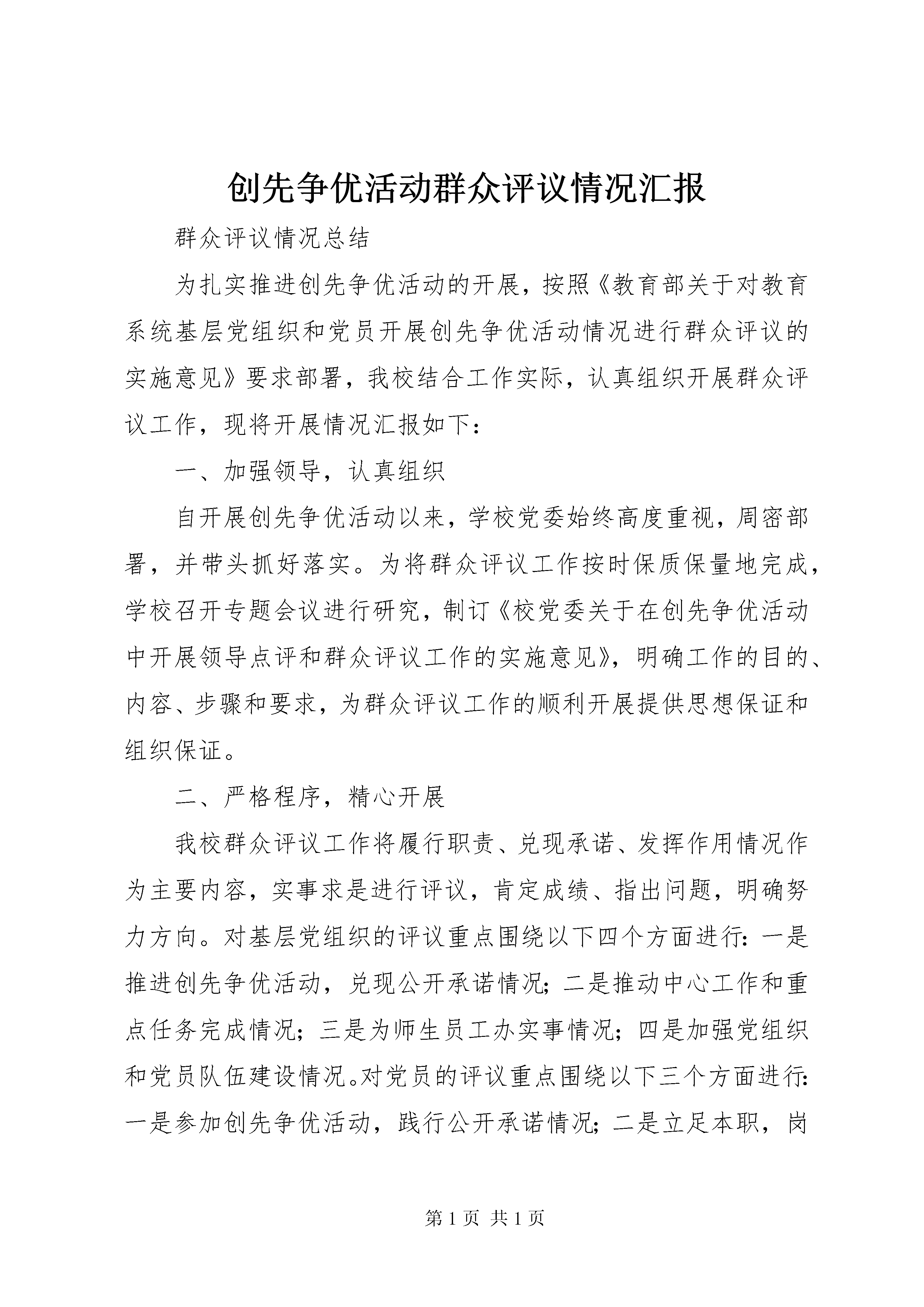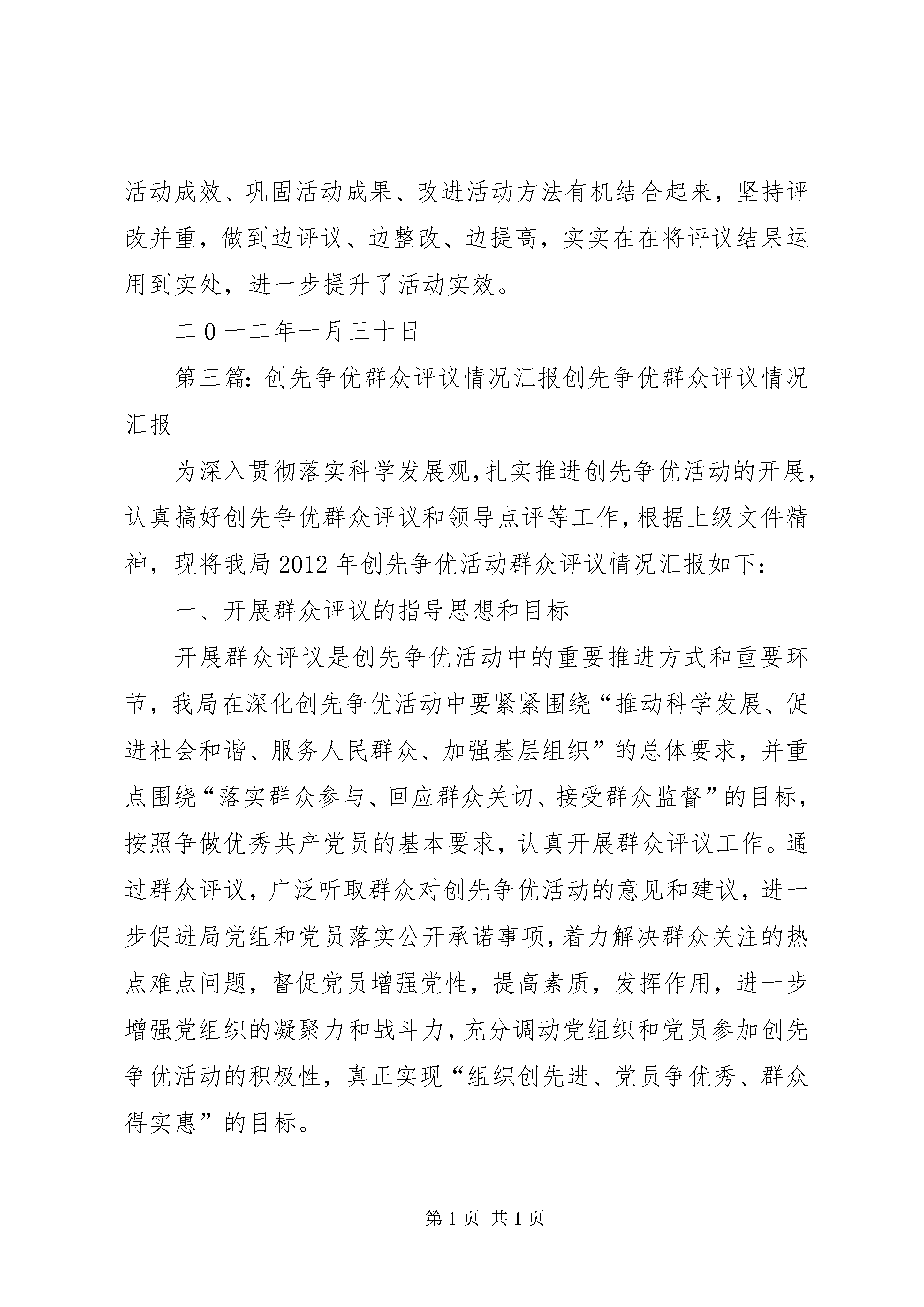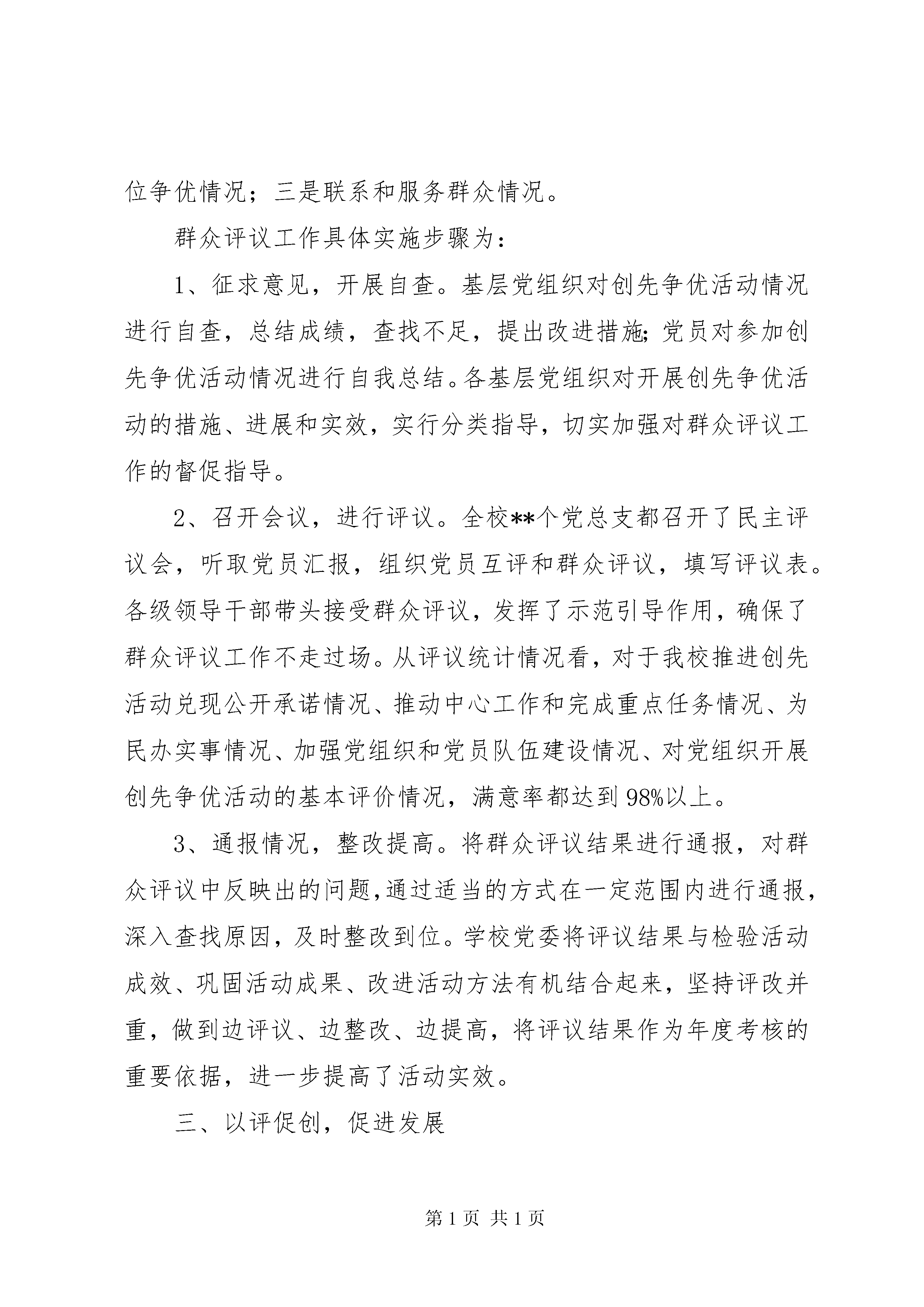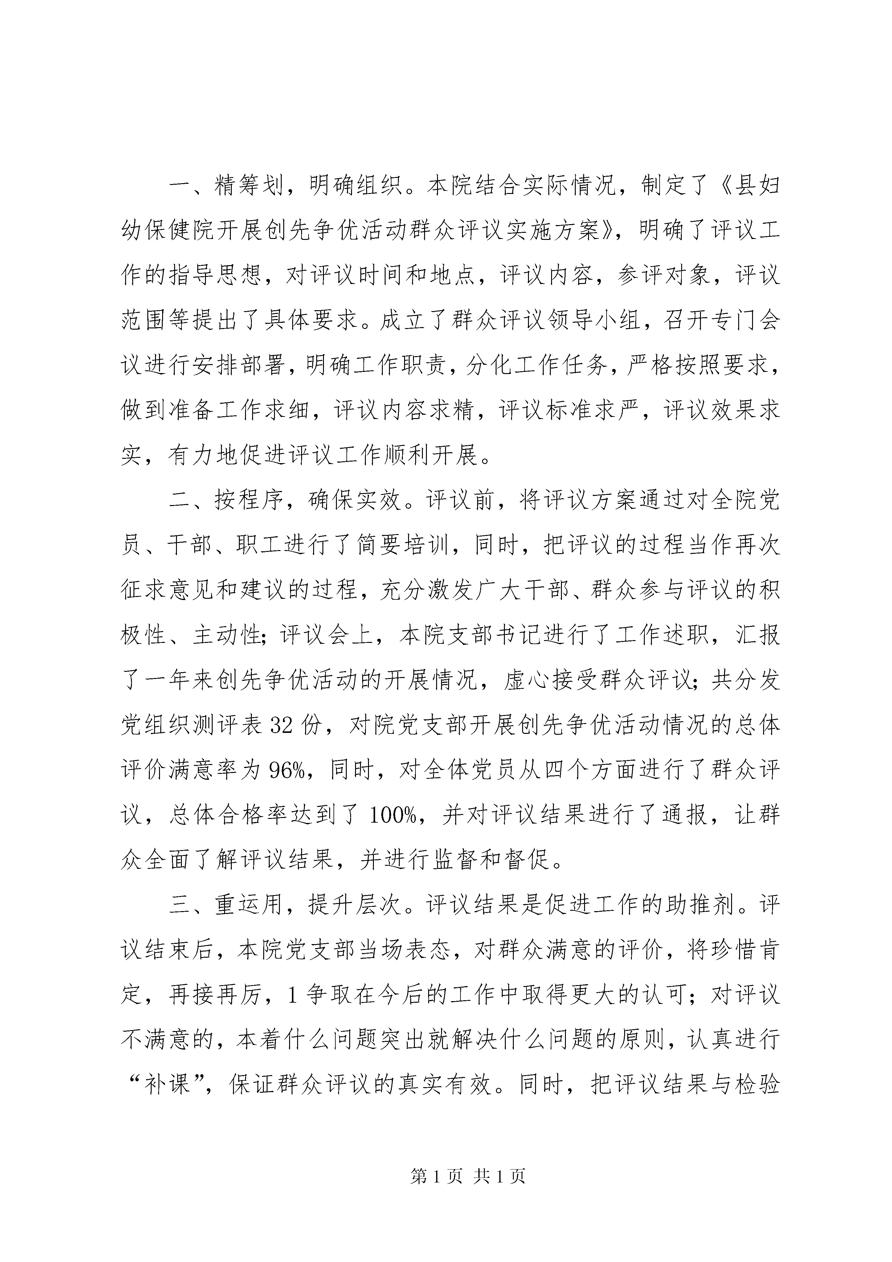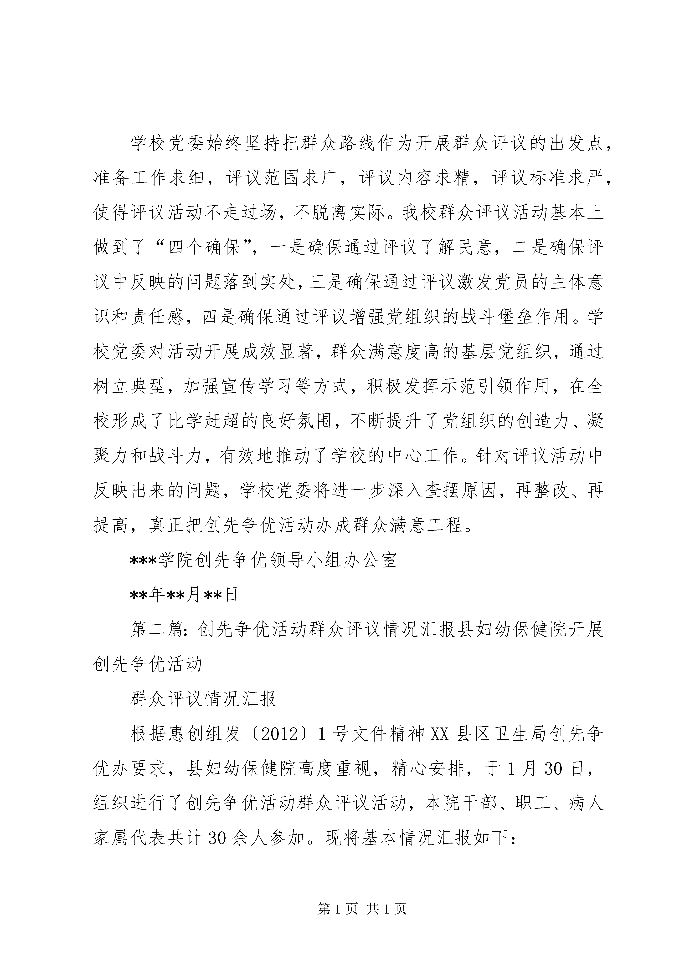 创先争优活动群众评议情况汇报群众评议情况总结为扎实推进创先争优活动的开展,按照《教育部关于对教育系统基层党组织和党员开展创先争优活动情况进行群众评议的实施意见》要求部署,我校结合工作实际,认真组织开展群众评议工作,现将开展情况汇报如下:一、加强领导,认真组织自开展创先争优活动以来,学校党委始终高度重视,周密部署,并带头抓好落实。为将群众评议工作按时保质保量地完成,学校召开专题会议进行研究,制订《校党委关于在创先争优活动中开展领导点评和群众评议工作的实施意见》,明确工作的目的、内容、步骤和要求,为群众评议工作的顺利开展提供思想保证和组织保证。二、严格程序,精心开展我校群众评议工作将履行职责、兑现承诺、发挥作用情况作为主要内容,实事求是进行评议,肯定成绩、指出问题,明确努力方向。对基层党组织的评议重点围绕以下四个方面进行:一是推进创先争优活动,兑现公开承诺情况;二是推动中心工作和重点任务完成情况;三是为师生员工办实事情况;四是加强党组织和党员队伍建设情况。对党员的评议重点围绕以下三个方面进行:一是参加创先争优活动,践行公开承诺情况;二是立足本职,岗位争优情况;三是联系和服务群众情况。群众评议工作具体实施步骤为:1、征求意见,开展自查。基层党组织对创先争优活动情况进行自查,总结成绩,查找不足,提出改进措施;党员对参加创先争优活动情况进行自我总结。各基层党组织对开展创先争优活动的措施、进展和实效,实行分类指导,切实加强对群众评议工作的督促指导。2、召开会议,进行评议。全校**个党总支都召开了民主评议会,听取党员汇报,组织党员互评和群众评议,填写评议表。各级领导干部带头接受群众评议,发挥了示范引导作用,确保了群众评议工作不走过场。从评议统计情况看,对于我校推进创先活动兑现公开承诺情况、推动中心工作和完成重点任务情况、为民办实事情况、加强党组织和党员队伍建设情况、对党组织开展创先争优活动的基本评价情况,满意率都达到98%以上。3、通报情况,整改提高。将群众评议结果进行通报,对群众评议中反映出的问题,通过适当的方式在一定范围内进行通报,深入查找原因,及时整改到位。学校党委将评议结果与检验活动成效、巩固活动成果、改进活动方法有机结合起来,坚持评改并重,做到边评议、边整改、边提高,将评议结果作为年度考核的重要依据,进一步提高了活动实效。三、以评促创,促进发展学校党委始终坚持把群众路线作为开展群众评议的出发点,准备工作求细,评议范围求广,评议内容求精,评议标准求严,使得评议活动不走过场,不脱离实际。我校群众评议活动基本上做到了“四个确保”,一是确保通过评议了解民意,二是确保评议中反映的问题落到实处,三是确保通过评议激发党员的主体意识和责任感,四是确保通过评议增强党组织的战斗堡垒作用。学校党委对活动开展成效显著,群众满意度高的基层党组织,通过树立典型,加强宣传学习等方式,积极发挥示范引领作用,在全校形成了比学赶超的良好氛围,不断提升了党组织的创造力、凝聚力和战斗力,有效地推动了学校的中心工作。针对评议活动中反映出来的问题,学校党委将进一步深入查摆原因,再整改、再提高,真正把创先争优活动办成群众满意工程。***学院创先争优领导小组办公室**年**月**日第二篇:创先争优活动群众评议情况汇报县妇幼保健院开展创先争优活动群众评议情况汇报根据惠创组发〔2012〕1号文件精神XX县区卫生局创先争优办要求,县妇幼保健院高度重视,精心安排,于1月30日,组织进行了创先争优活动群众评议活动,本院干部、职工、病人家属代表共计30余人参加。现将基本情况汇报如下:一、精筹划,明确组织。本院结合实际情况,制定了《县妇幼保健院开展创先争优活动群众评议实施方案》,明确了评议工作的指导思想,对评议时间和地点,评议内容,参评对象,评议范围等提出了具体要求。成立了群众评议领导小组,召开专门会议进行安排部署,明确工作职责,分化工作任务,严格按照要求,做到准备工作求细,评议内容求精,评议标准求严,评议效果求实,有力地促进评议工作顺利开展。二、按程序,确保实效。评议前,将评议方案通过对全院党员、干部、职工进行了简要培训,同时,把评议的过程当作再次征求意见和建议的过程,充分激发广大干部、群众参与评议的积极性、主动性;评议会上,本院支部书记进行了工作述职,汇报了一年来创先争优活动的开展情况,虚心接受群众评议;共分发党组织测评表32份,对院党支部开展创先争优活动情况的总体评价满意率为96%,同时,对全体党员从四个方面进行了群众评议,总体合格率达到了100%,并对评议结果进行了通报,让群众全面了解评议结果,并进行监督和督促。三、重运用,提升层次。评议结果是促进工作的助推剂。评议结束后,本院党支部当场表态,对群众满意的评价,将珍惜肯定,再接再厉,1争取在今后的工作中取得更