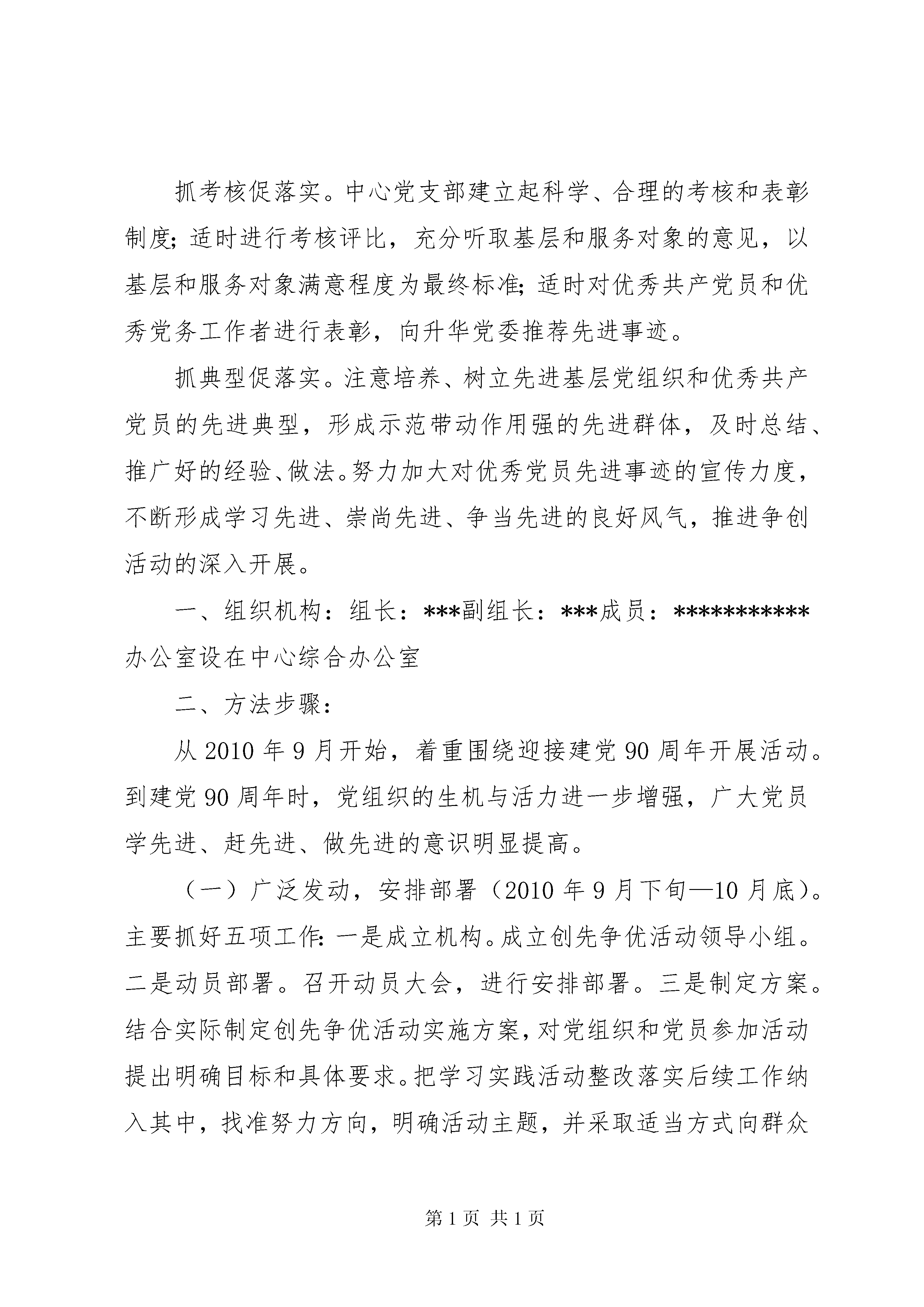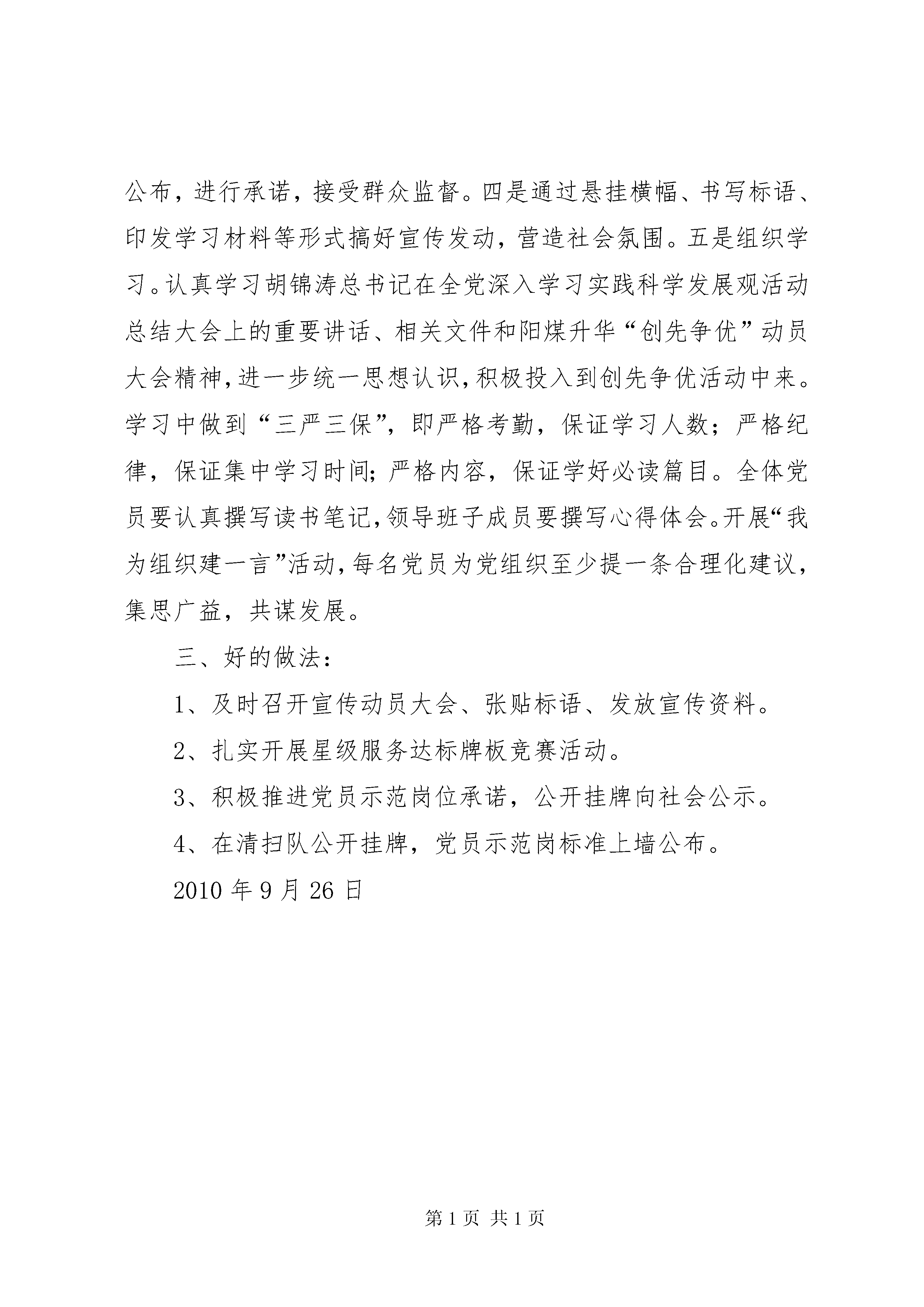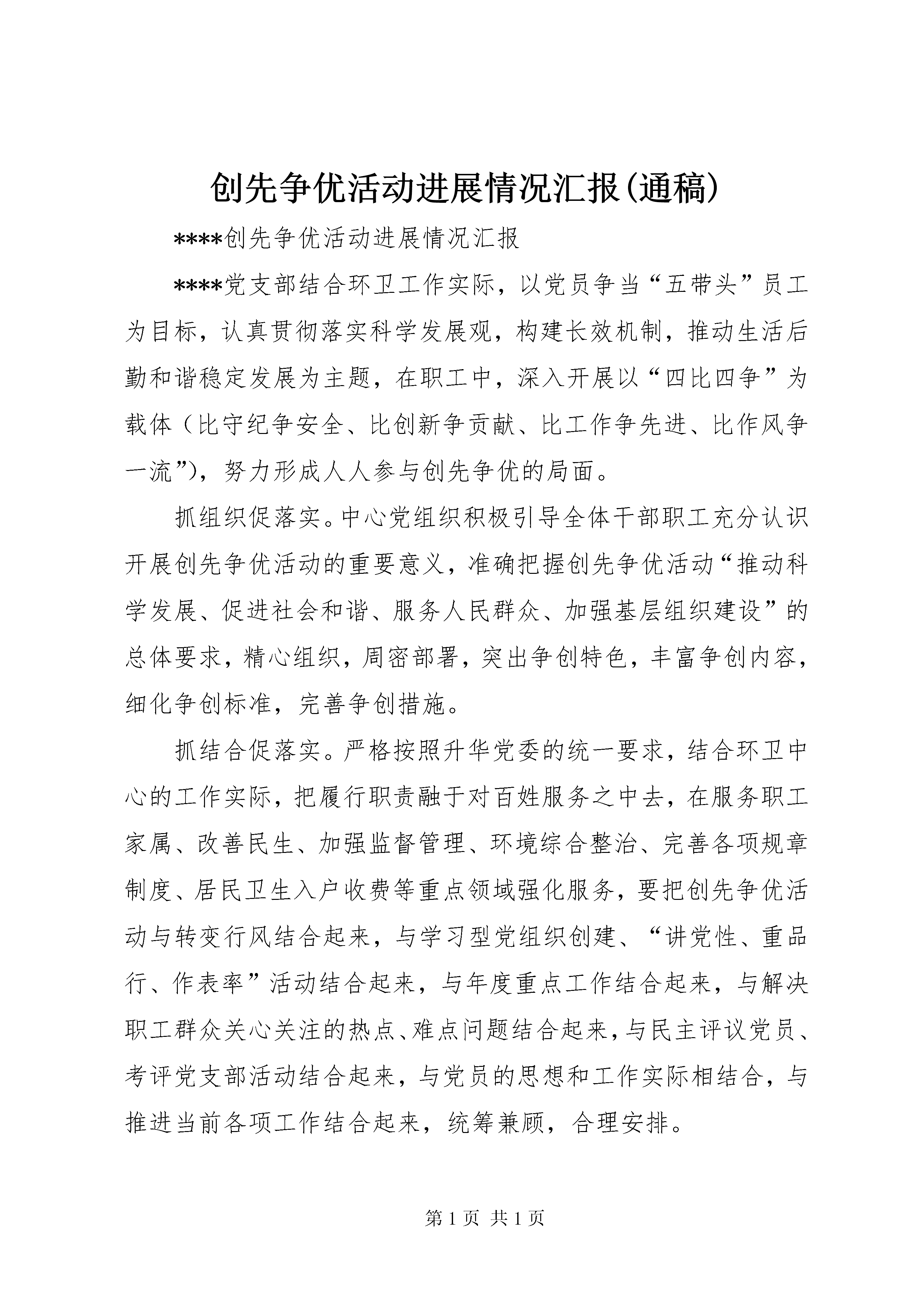 创先争优活动进展情况汇报(通稿)****创先争优活动进展情况汇报****党支部结合环卫工作实际,以党员争当“五带头”员工为目标,认真贯彻落实科学发展观,构建长效机制,推动生活后勤和谐稳定发展为主题,在职工中,深入开展以“四比四争”为载体(比守纪争安全、比创新争贡献、比工作争先进、比作风争一流”),努力形成人人参与创先争优的局面。抓组织促落实。中心党组织积极引导全体干部职工充分认识开展创先争优活动的重要意义,准确把握创先争优活动“推动科学发展、促进社会和谐、服务人民群众、加强基层组织建设”的总体要求,精心组织,周密部署,突出争创特色,丰富争创内容,细化争创标准,完善争创措施。抓结合促落实。严格按照升华党委的统一要求,结合环卫中心的工作实际,把履行职责融于对百姓服务之中去,在服务职工家属、改善民生、加强监督管理、环境综合整治、完善各项规章制度、居民卫生入户收费等重点领域强化服务,要把创先争优活动与转变行风结合起来,与学习型党组织创建、“讲党性、重品行、作表率”活动结合起来,与年度重点工作结合起来,与解决职工群众关心关注的热点、难点问题结合起来,与民主评议党员、考评党支部活动结合起来,与党员的思想和工作实际相结合,与推进当前各项工作结合起来,统筹兼顾,合理安排。抓考核促落实。中心党支部建立起科学、合理的考核和表彰制度;适时进行考核评比,充分听取基层和服务对象的意见,以基层和服务对象满意程度为最终标准;适时对优秀共产党员和优秀党务工作者进行表彰,向升华党委推荐先进事迹。抓典型促落实。注意培养、树立先进基层党组织和优秀共产党员的先进典型,形成示范带动作用强的先进群体,及时总结、推广好的经验、做法。努力加大对优秀党员先进事迹的宣传力度,不断形成学习先进、崇尚先进、争当先进的良好风气,推进争创活动的深入开展。一、组织机构:组长:***副组长:***成员:***********办公室设在中心综合办公室二、方法步骤:从2010年9月开始,着重围绕迎接建党90周年开展活动。到建党90周年时,党组织的生机与活力进一步增强,广大党员学先进、赶先进、做先进的意识明显提高。(一)广泛发动,安排部署(2010年9月下旬—10月底)。主要抓好五项工作:一是成立机构。成立创先争优活动领导小组。二是动员部署。召开动员大会,进行安排部署。三是制定方案。结合实际制定创先争优活动实施方案,对党组织和党员参加活动提出明确目标和具体要求。把学习实践活动整改落实后续工作纳入其中,找准努力方向,明确活动主题,并采取适当方式向群众公布,进行承诺,接受群众监督。四是通过悬挂横幅、书写标语、印发学习材料等形式搞好宣传发动,营造社会氛围。五是组织学习。认真学习胡锦涛总书记在全党深入学习实践科学发展观活动总结大会上的重要讲话、相关文件和阳煤升华“创先争优”动员大会精神,进一步统一思想认识,积极投入到创先争优活动中来。学习中做到“三严三保”,即严格考勤,保证学习人数;严格纪律,保证集中学习时间;严格内容,保证学好必读篇目。全体党员要认真撰写读书笔记,领导班子成员要撰写心得体会。开展“我为组织建一言”活动,每名党员为党组织至少提一条合理化建议,集思广益,共谋发展。三、好的做法:1、及时召开宣传动员大会、张贴标语、发放宣传资料。2、扎实开展星级服务达标牌板竞赛活动。3、积极推进党员示范岗位承诺,公开挂牌向社会公示。4、在清扫队公开挂牌,党员示范岗标准上墙公布。2010年9月26日