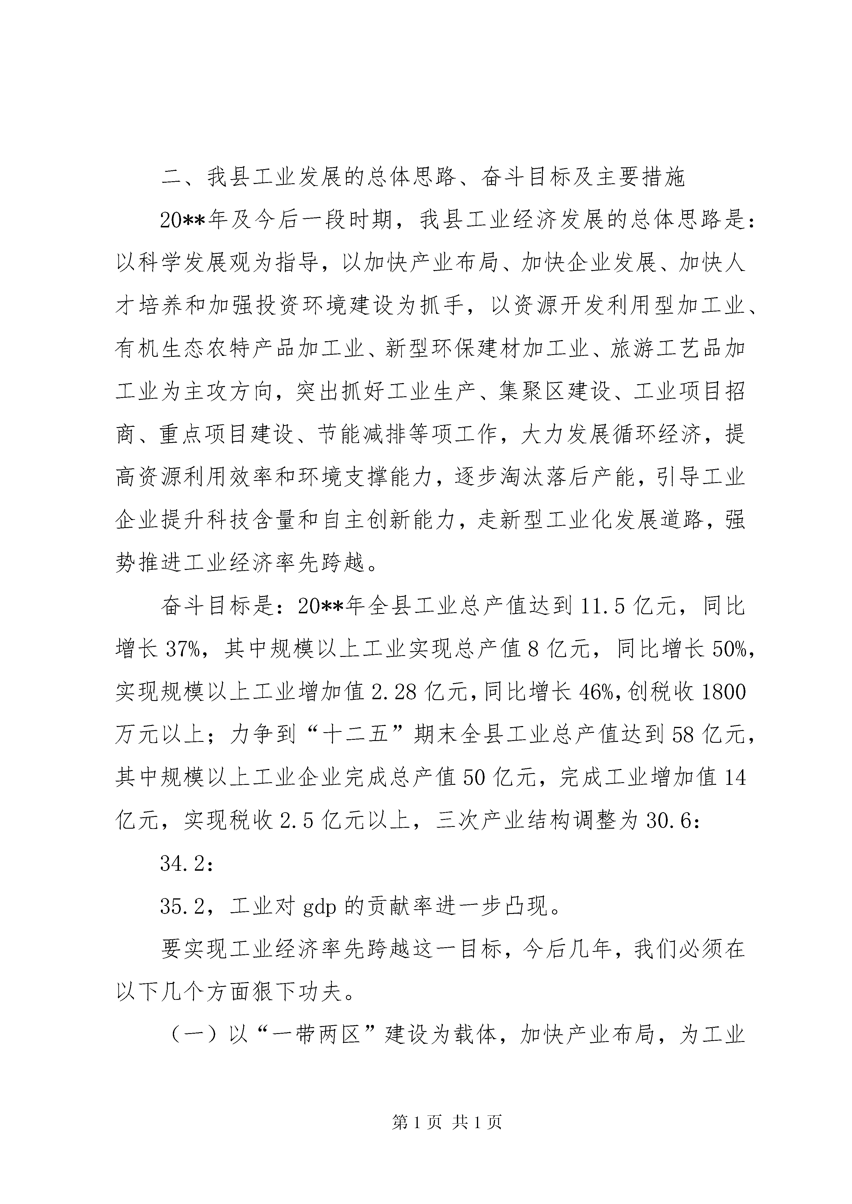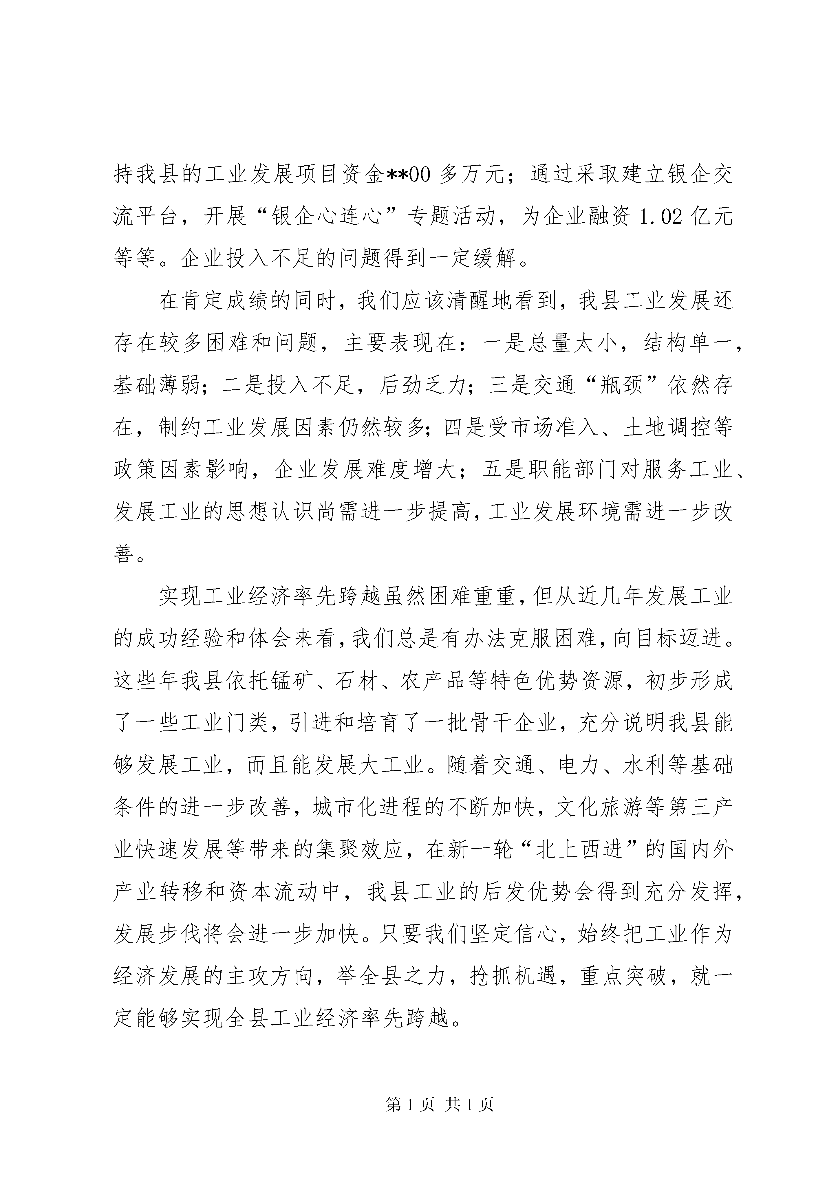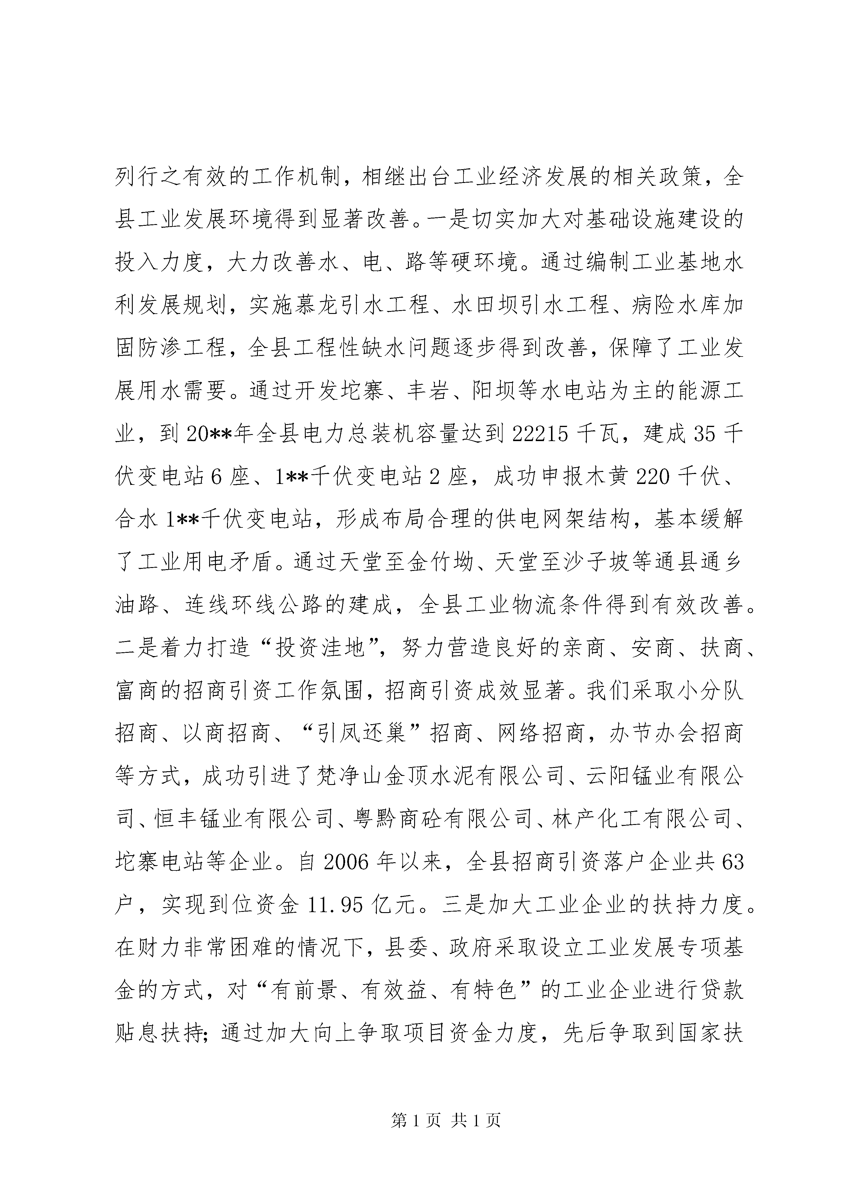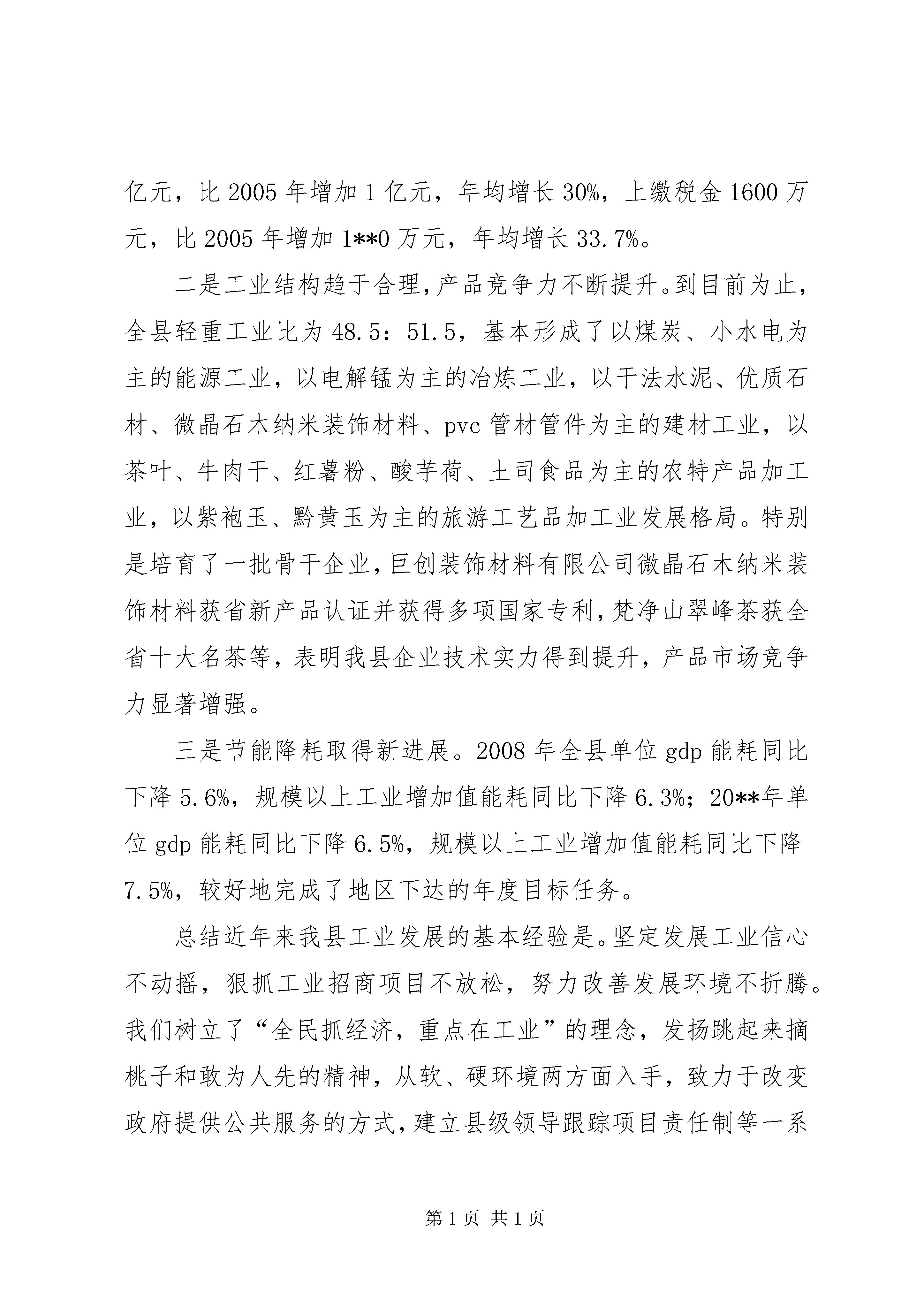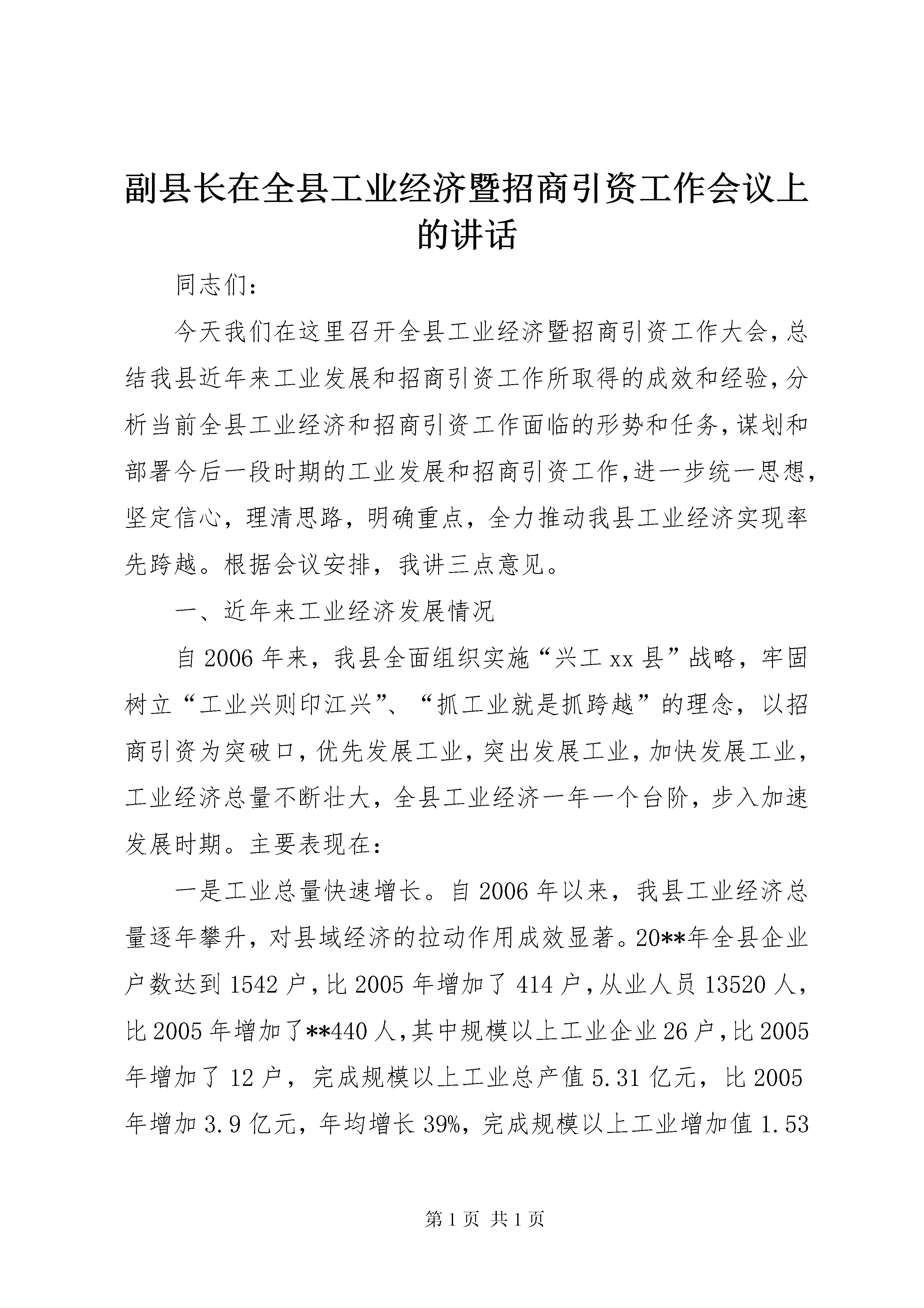 副县长在全县工业经济暨招商引资工作会议上的讲话同志们:今天我们在这里召开全县工业经济暨招商引资工作大会,总结我县近年来工业发展和招商引资工作所取得的成效和经验,分析当前全县工业经济和招商引资工作面临的形势和任务,谋划和部署今后一段时期的工业发展和招商引资工作,进一步统一思想,坚定信心,理清思路,明确重点,全力推动我县工业经济实现率先跨越。根据会议安排,我讲三点意见。一、近年来工业经济发展情况自2006年来,我县全面组织实施“兴工xx县”战略,牢固树立“工业兴则印江兴”、“抓工业就是抓跨越”的理念,以招商引资为突破口,优先发展工业,突出发展工业,加快发展工业,工业经济总量不断壮大,全县工业经济一年一个台阶,步入加速发展时期。主要表现在:一是工业总量快速增长。自2006年以来,我县工业经济总量逐年攀升,对县域经济的拉动作用成效显著。20**年全县企业户数达到1542户,比2005年增加了414户,从业人员13520人,比2005年增加了**440人,其中规模以上工业企业26户,比2005年增加了12户,完成规模以上工业总产值5.31亿元,比2005年增加3.9亿元,年均增长39%,完成规模以上工业增加值1.53亿元,比2005年增加1亿元,年均增长30%,上缴税金1600万元,比2005年增加1**0万元,年均增长33.7%。二是工业结构趋于合理,产品竞争力不断提升。到目前为止,全县轻重工业比为48.5:51.5,基本形成了以煤炭、小水电为主的能源工业,以电解锰为主的冶炼工业,以干法水泥、优质石材、微晶石木纳米装饰材料、pvc管材管件为主的建材工业,以茶叶、牛肉干、红薯粉、酸芋荷、土司食品为主的农特产品加工业,以紫袍玉、黔黄玉为主的旅游工艺品加工业发展格局。特别是培育了一批骨干企业,巨创装饰材料有限公司微晶石木纳米装饰材料获省新产品认证并获得多项国家专利,梵净山翠峰茶获全省十大名茶等,表明我县企业技术实力得到提升,产品市场竞争力显著增强。三是节能降耗取得新进展。2008年全县单位gdp能耗同比下降5.6%,规模以上工业增加值能耗同比下降6.3%;20**年单位gdp能耗同比下降6.5%,规模以上工业增加值能耗同比下降7.5%,较好地完成了地区下达的年度目标任务。总结近年来我县工业发展的基本经验是。坚定发展工业信心不动摇,狠抓工业招商项目不放松,努力改善发展环境不折腾。我们树立了“全民抓经济,重点在工业”的理念,发扬跳起来摘桃子和敢为人先的精神,从软、硬环境两方面入手,致力于改变政府提供公共服务的方式,建立县级领导跟踪项目责任制等一系列行之有效的工作机制,相继出台工业经济发展的相关政策,全县工业发展环境得到显著改善。一是切实加大对基础设施建设的投入力度,大力改善水、电、路等硬环境。通过编制工业基地水利发展规划,实施慕龙引水工程、水田坝引水工程、病险水库加固防渗工程,全县工程性缺水问题逐步得到改善,保障了工业发展用水需要。通过开发坨寨、丰岩、阳坝等水电站为主的能源工业,到20**年全县电力总装机容量达到22215千瓦,建成35千伏变电站6座、1**千伏变电站2座,成功申报木黄220千伏、合水1**千伏变电站,形成布局合理的供电网架结构,基本缓解了工业用电矛盾。通过天堂至金竹坳、天堂至沙子坡等通县通乡油路、连线环线公路的建成,全县工业物流条件得到有效改善。二是着力打造“投资洼地”,努力营造良好的亲商、安商、扶商、富商的招商引资工作氛围,招商引资成效显著。我们采取小分队招商、以商招商、“引凤还巢”招商、网络招商,办节办会招商等方式,成功引进了梵净山金顶水泥有限公司、云阳锰业有限公司、恒丰锰业有限公司、粤黔商砼有限公司、林产化工有限公司、坨寨电站等企业。自2006年以来,全县招商引资落户企业共63户,实现到位资金11.95亿元。三是加大工业企业的扶持力度。在财力非常困难的情况下,县委、政府采取设立工业发展专项基金的方式,对“有前景、有效益、有特色”的工业企业进行贷款贴息扶持;通过加大向上争取项目资金力度,先后争取到国家扶持我县的工业发展项目资金**00多万元;通过采取建立银企交流平台,开展“银企心连心”专题活动,为企业融资1.02亿元等等。企业投入不足的问题得到一定缓解。在肯定成绩的同时,我们应该清醒地看到,我县工业发展还存在较多困难和问题,主要表现在:一是总量太小,结构单一,基础薄弱;二是投入不足,后劲乏力;三是交通“瓶颈”依然存在,制约工业发展因素仍然较多;四是受市场准入、土地调控等政策因素影响,企业发展难度增大;五是职能部门对服务工业、发展工业的思想认识尚需进一步提高,工业发展环境需进一步改善。实现工业经济率先跨越虽然困难重重,但从近几年发展工业的成功经验和体会来看,我们总是有办法克服困难,向目标迈进。这些年
