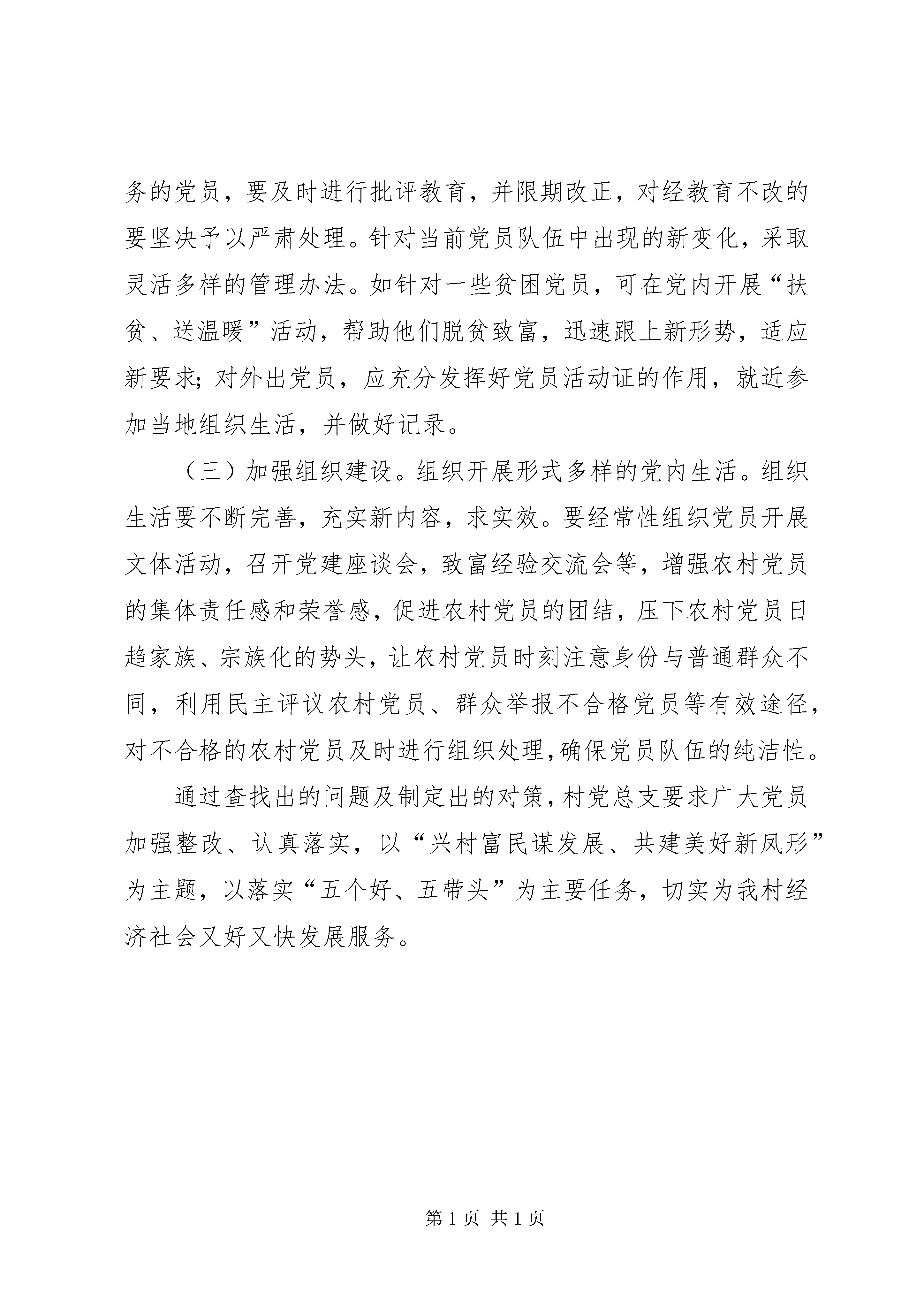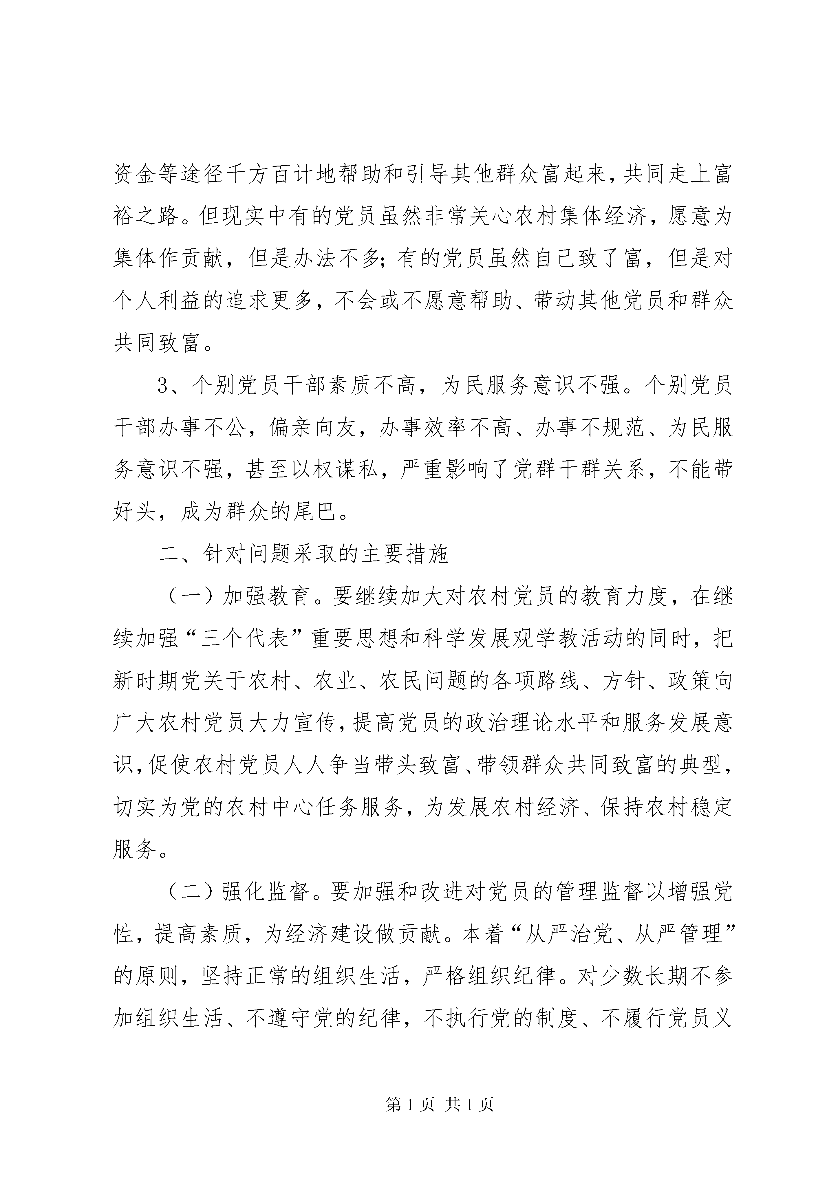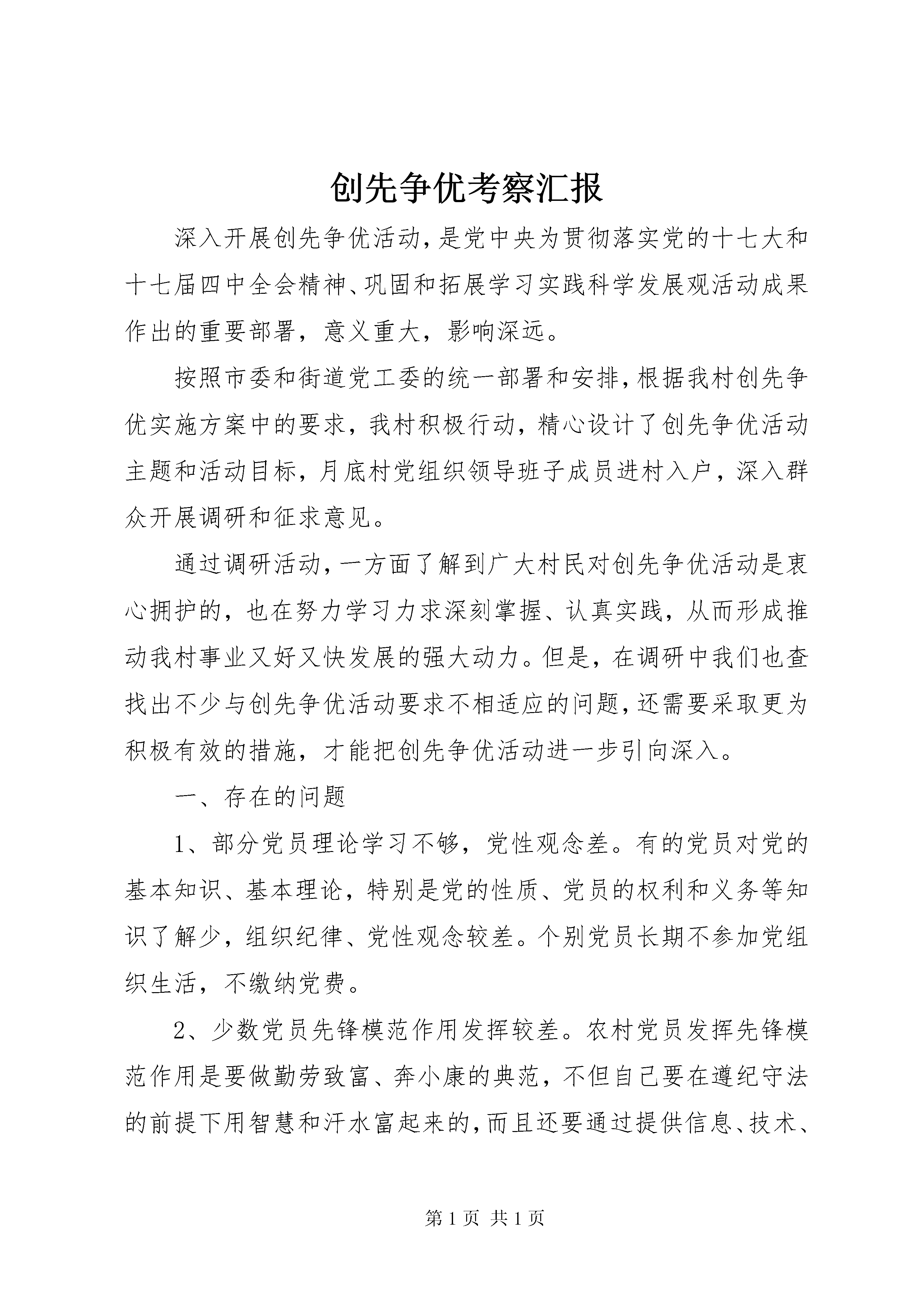 创先争优考察汇报深入开展创先争优活动,是党中央为贯彻落实党的十七大和十七届四中全会精神、巩固和拓展学习实践科学发展观活动成果作出的重要部署,意义重大,影响深远。按照市委和街道党工委的统一部署和安排,根据我村创先争优实施方案中的要求,我村积极行动,精心设计了创先争优活动主题和活动目标,月底村党组织领导班子成员进村入户,深入群众开展调研和征求意见。通过调研活动,一方面了解到广大村民对创先争优活动是衷心拥护的,也在努力学习力求深刻掌握、认真实践,从而形成推动我村事业又好又快发展的强大动力。但是,在调研中我们也查找出不少与创先争优活动要求不相适应的问题,还需要采取更为积极有效的措施,才能把创先争优活动进一步引向深入。一、存在的问题1、部分党员理论学习不够,党性观念差。有的党员对党的基本知识、基本理论,特别是党的性质、党员的权利和义务等知识了解少,组织纪律、党性观念较差。个别党员长期不参加党组织生活,不缴纳党费。2、少数党员先锋模范作用发挥较差。农村党员发挥先锋模范作用是要做勤劳致富、奔小康的典范,不但自己要在遵纪守法的前提下用智慧和汗水富起来的,而且还要通过提供信息、技术、资金等途径千方百计地帮助和引导其他群众富起来,共同走上富裕之路。但现实中有的党员虽然非常关心农村集体经济,愿意为集体作贡献,但是办法不多;有的党员虽然自己致了富,但是对个人利益的追求更多,不会或不愿意帮助、带动其他党员和群众共同致富。3、个别党员干部素质不高,为民服务意识不强。个别党员干部办事不公,偏亲向友,办事效率不高、办事不规范、为民服务意识不强,甚至以权谋私,严重影响了党群干群关系,不能带好头,成为群众的尾巴。二、针对问题采取的主要措施(一)加强教育。要继续加大对农村党员的教育力度,在继续加强“三个代表”重要思想和科学发展观学教活动的同时,把新时期党关于农村、农业、农民问题的各项路线、方针、政策向广大农村党员大力宣传,提高党员的政治理论水平和服务发展意识,促使农村党员人人争当带头致富、带领群众共同致富的典型,切实为党的农村中心任务服务,为发展农村经济、保持农村稳定服务。(二)强化监督。要加强和改进对党员的管理监督以增强党性,提高素质,为经济建设做贡献。本着“从严治党、从严管理”的原则,坚持正常的组织生活,严格组织纪律。对少数长期不参加组织生活、不遵守党的纪律,不执行党的制度、不履行党员义务的党员,要及时进行批评教育,并限期改正,对经教育不改的要坚决予以严肃处理。针对当前党员队伍中出现的新变化,采取灵活多样的管理办法。如针对一些贫困党员,可在党内开展“扶贫、送温暖”活动,帮助他们脱贫致富,迅速跟上新形势,适应新要求;对外出党员,应充分发挥好党员活动证的作用,就近参加当地组织生活,并做好记录。(三)加强组织建设。组织开展形式多样的党内生活。组织生活要不断完善,充实新内容,求实效。要经常性组织党员开展文体活动,召开党建座谈会,致富经验交流会等,增强农村党员的集体责任感和荣誉感,促进农村党员的团结,压下农村党员日趋家族、宗族化的势头,让农村党员时刻注意身份与普通群众不同,利用民主评议农村党员、群众举报不合格党员等有效途径,对不合格的农村党员及时进行组织处理,确保党员队伍的纯洁性。通过查找出的问题及制定出的对策,村党总支要求广大党员加强整改、认真落实,以“兴村富民谋发展、共建美好新凤形”为主题,以落实“五个好、五带头”为主要任务,切实为我村经济社会又好又快发展服务。