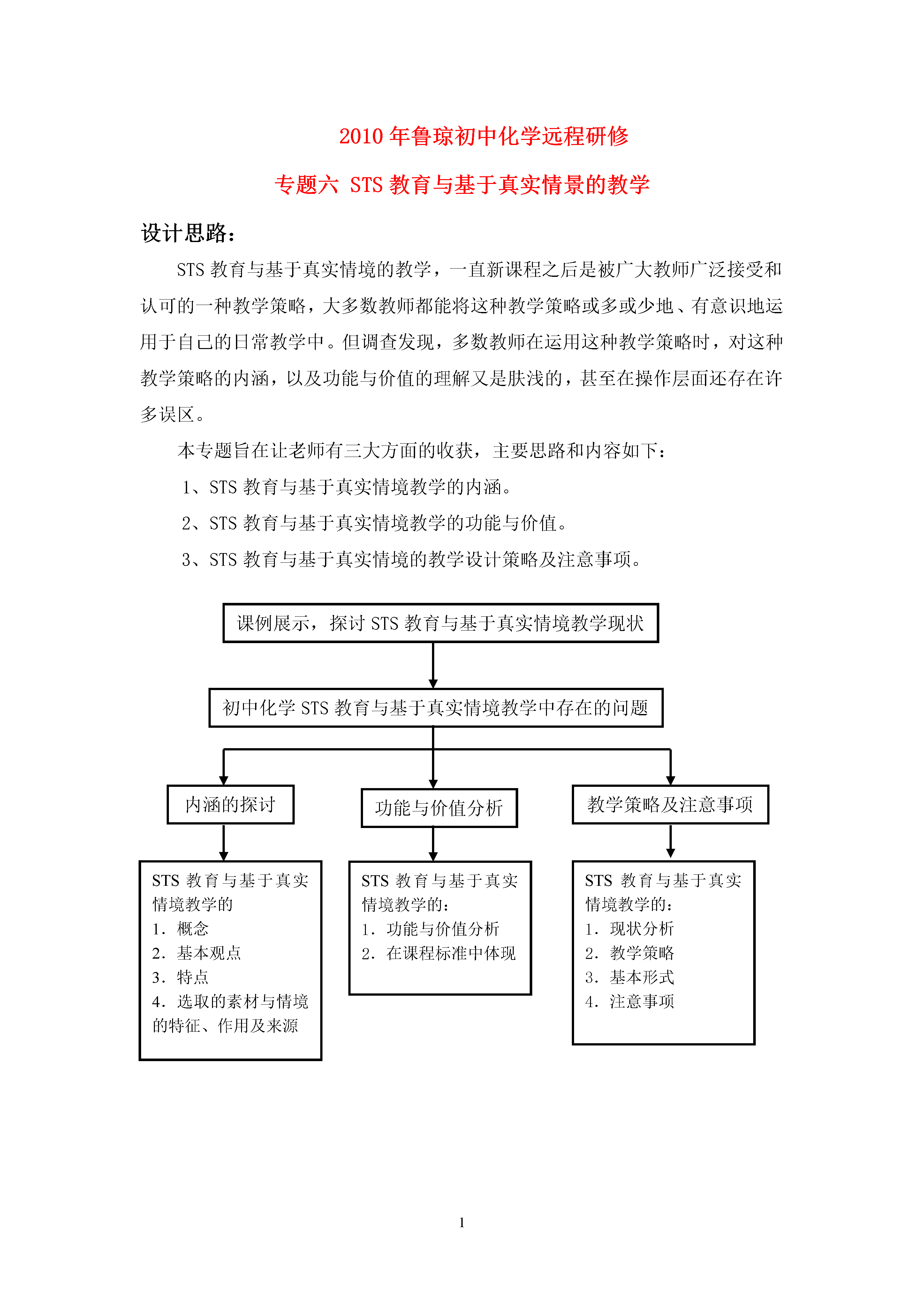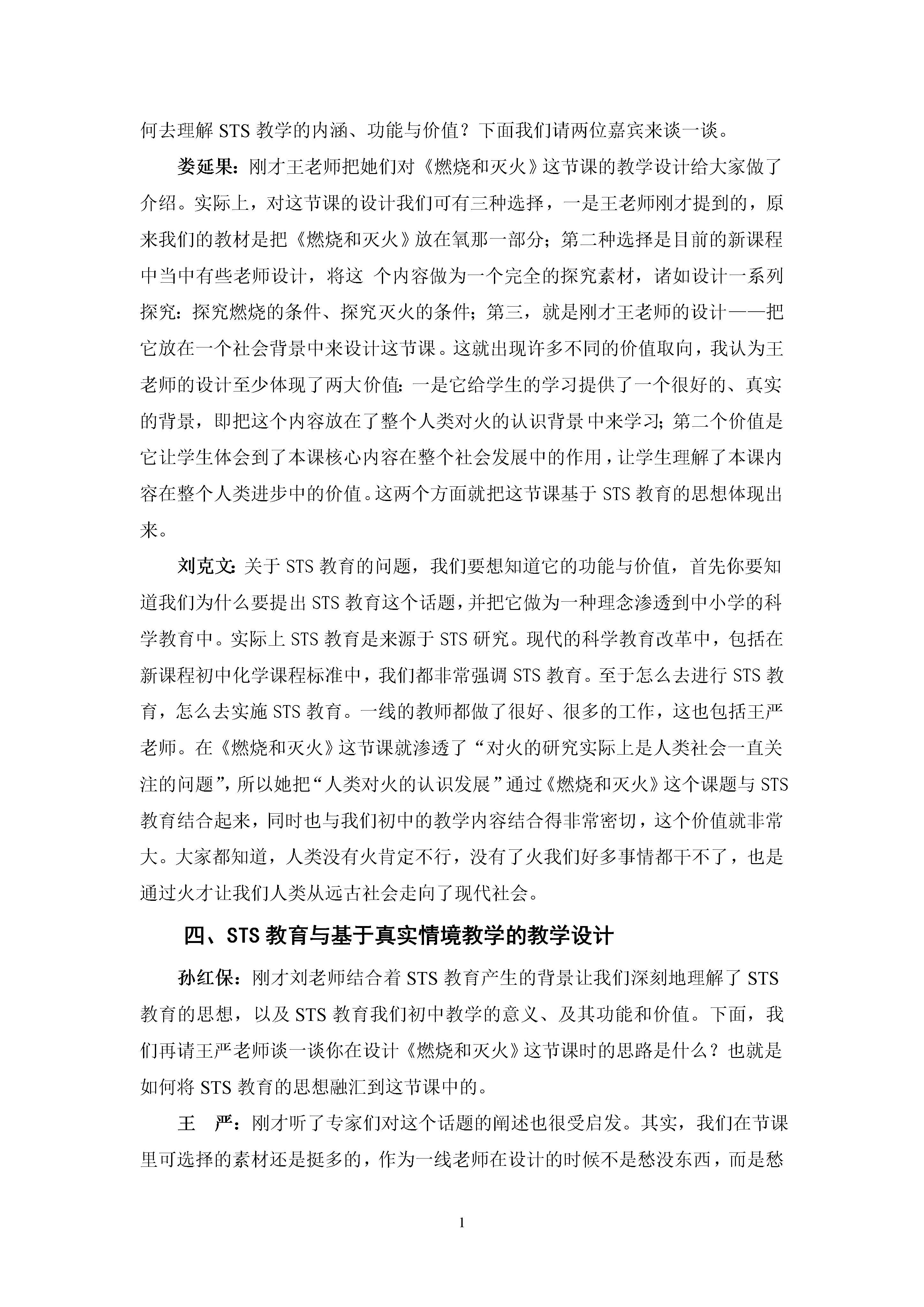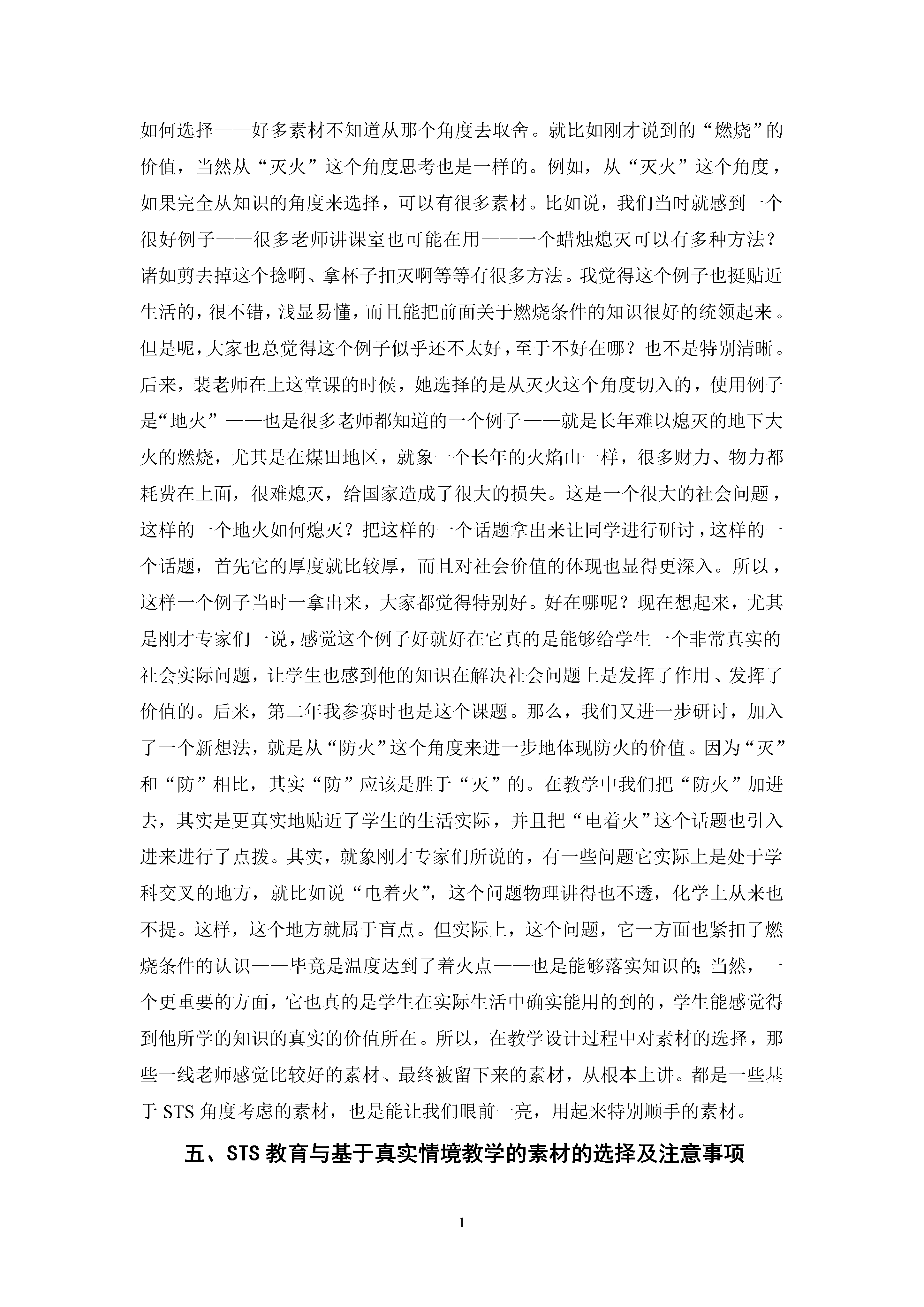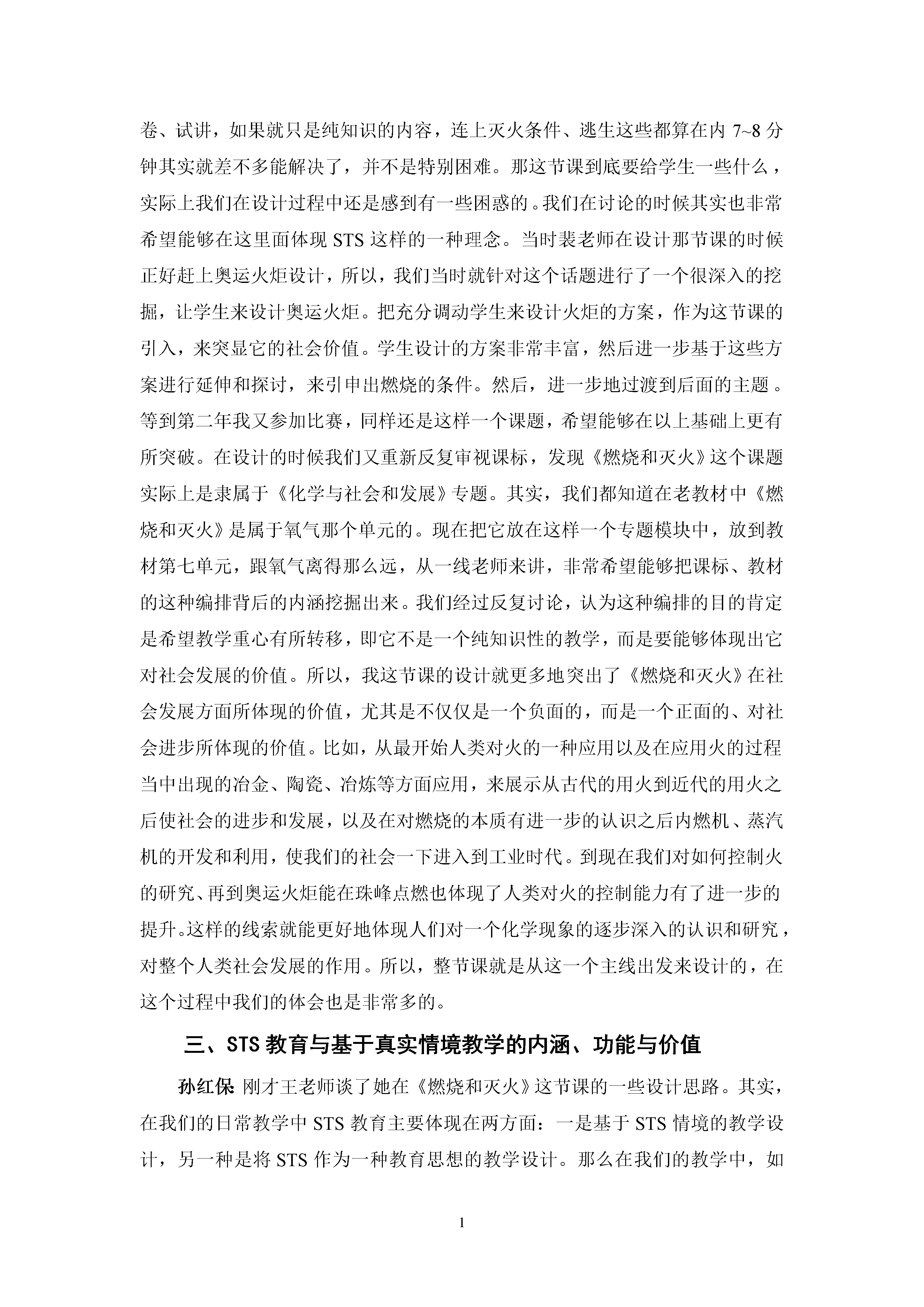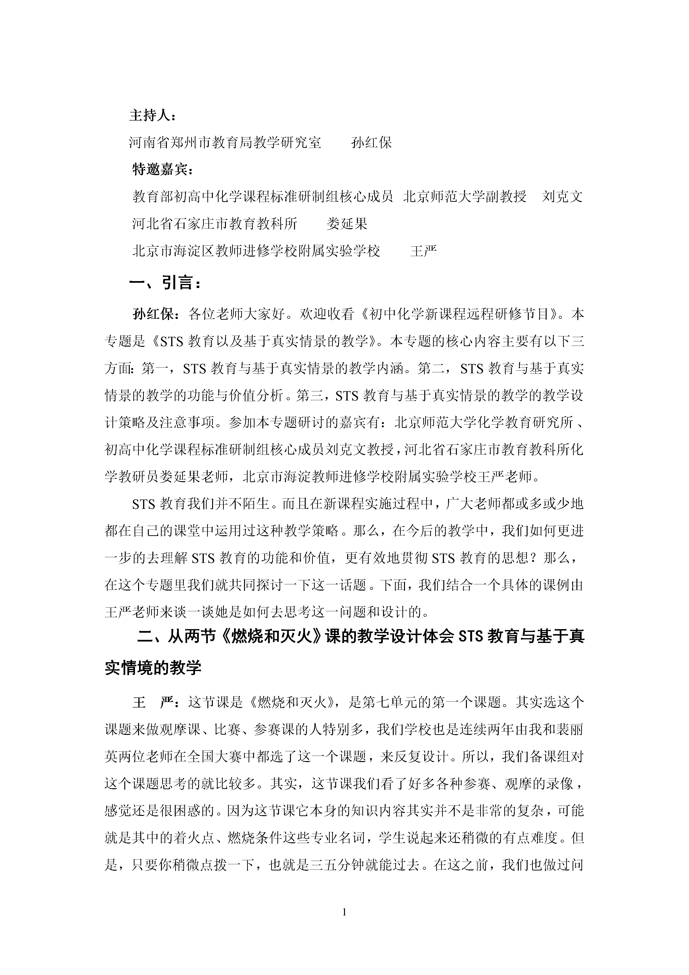 12010年鲁琼初中化学远程研修专题六STS教育与基于真实情景的教学设计思路:STS教育与基于真实情境的教学,一直新课程之后是被广大教师广泛接受和认可的一种教学策略,大多数教师都能将这种教学策略或多或少地、有意识地运用于自己的日常教学中。但调查发现,多数教师在运用这种教学策略时,对这种教学策略的内涵,以及功能与价值的理解又是肤浅的,甚至在操作层面还存在许多误区。本专题旨在让老师有三大方面的收获,主要思路和内容如下:1、STS教育与基于真实情境教学的内涵。2、STS教育与基于真实情境教学的功能与价值。3、STS教育与基于真实情境的教学设计策略及注意事项。课例展示,探讨STS教育与基于真实情境教学现状初中化学STS教育与基于真实情境教学中存在的问题教学策略及注意事项内涵的探讨功能与价值分析STS教育与基于真实情境教学的:1.现状分析2.教学策略3.基本形式4.注意事项STS教育与基于真实情境教学的:1.功能与价值分析2.在课程标准中体现STS教育与基于真实情境教学的1.概念2.基本观点3.特点4.选取的素材与情境的特征、作用及来源主持人:河南省郑州市教育局教学研究室孙红保特邀嘉宾:教育部初高中化学课程标准研制组核心成员北京师范大学副教授刘克文河北省石家庄市教育教科所娄延果北京市海淀区教师进修学校附属实验学校王严一、引言:孙红保:各位老师大家好。欢迎收看《初中化学新课程远程研修节目》。本专题是《STS教育以及基于真实情景的教学》。本专题的核心内容主要有以下三方面:第一,STS教育与基于真实情景的教学内涵。第二,STS教育与基于真实情景的教学的功能与价值分析。第三,STS教育与基于真实情景的教学的教学设计策略及注意事项。参加本专题研讨的嘉宾有:北京师范大学化学教育研究所、初高中化学课程标准研制组核心成员刘克文教授,河北省石家庄市教育教科所化学教研员娄延果老师,北京市海淀教师进修学校附属实验学校王严老师。STS教育我们并不陌生。而且在新课程实施过程中,广大老师都或多或少地都在自己的课堂中运用过这种教学策略。那么,在今后的教学中,我们如何更进一步的去理解STS教育的功能和价值,更有效地贯彻STS教育的思想?那么,在这个专题里我们就共同探讨一下这一话题。下面,我们结合一个具体的课例由王严老师来谈一谈她是如何去思考这一问题和设计的。二、从两节《燃烧和灭火》课的教学设计体会STS教育与基于真实情境的教学王严:这节课是《燃烧和灭火》,是第七单元的第一个课题。其实选这个课题来做观摩课、比赛、参赛课的人特别多,我们学校也是连续两年由我和裴丽英两位老师在全国大赛中都选了这一个课题,来反复设计。所以,我们备课组对这个课题思考的就比较多。其实,这节课我们看了好多各种参赛、观摩的录像,感觉还是很困惑的。因为这节课它本身的知识内容其实并不是非常的复杂,可能就是其中的着火点、燃烧条件这些专业名词,学生说起来还稍微的有点难度。但是,只要你稍微点拨一下,也就是三五分钟就能过去。在这之前,我们也做过问卷、试讲,如果就只是纯知识的内容,连上灭火条件、逃生这些都算在内7~8分钟其实就差不多能解决了,并不是特别困难。那这节课到底要给学生一些什么,实际上我们在设计过程中还是感到有一些困惑的。我们在讨论的时候其实也非常希望能够在这里面体现STS这样的一种理念。当时裴老师在设计那节课的时候正好赶上奥运火炬设计,所以,我们当时就针对这个话题进行了一个很深入的挖掘,让学生来设计奥运火炬。把充分调动学生来设计火炬的方案,作为这节课的引入,来突显它的社会价值。学生设计的方案非常丰富,然后进一步基于这些方案进行延伸和探讨,来引申出燃烧的条件。然后,进一步地过渡到后面的主题。等到第二年我又参加比赛,同样还是这样一个课题,希望能够在以上基础上更有所突破。在设计的时候我们又重新反复审视课标,发现《燃烧和灭火》这个课题实际上是隶属于《化学与社会和发展》专题。其实,我们都知道在老教材中《燃烧和灭火》是属于氧气那个单元的。现在把它放在这样一个专题模块中,放到教材第七单元,跟氧气离得那么远,从一线老师来讲,非常希望能够把课标、教材的这种编排背后的内涵挖掘出来。我们经过反复讨论,认为这种编排的目的肯定是希望教学重心有所转移,即它不是一个纯知识性的教学,而是要能够体现出它对社会发展的价值。所以,我这节课的设计就更多地突出了《燃烧和灭火》在社会发展方面所体现的价值,尤其是不仅仅是一个负面的,而是一个正面的、对社会进步所体现的价值。比如,从最开始人类对火的一种应用以及在应用火的过程当中出现的冶金、陶瓷、冶炼等方面应用,来展示从古代的用火到近代的用火之后使社会的进步和发展,以及在对燃烧的本质有进一