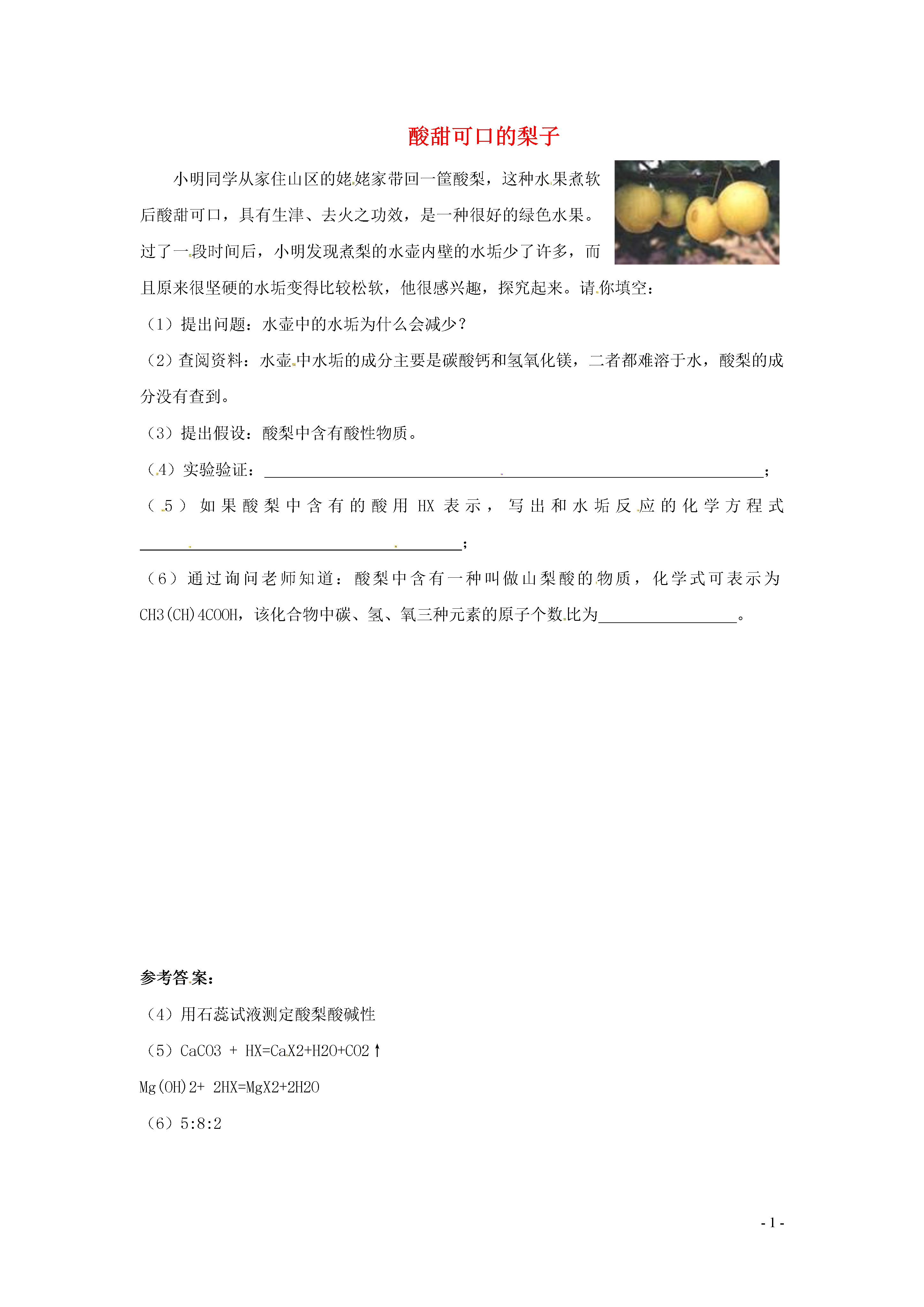 -1-酸甜可口的梨子小明同学从家住山区的姥姥家带回一筐酸梨,这种水果煮软后酸甜可口,具有生津、去火之功效,是一种很好的绿色水果。过了一段时间后,小明发现煮梨的水壶内壁的水垢少了许多,而且原来很坚硬的水垢变得比较松软,他很感兴趣,探究起来。请你填空:(1)提出问题:水壶中的水垢为什么会减少?(2)查阅资料:水壶中水垢的成分主要是碳酸钙和氢氧化镁,二者都难溶于水,酸梨的成分没有查到。(3)提出假设:酸梨中含有酸性物质。(4)实验验证:;(5)如果酸梨中含有的酸用HX表示,写出和水垢反应的化学方程式;(6)通过询问老师知道:酸梨中含有一种叫做山梨酸的物质,化学式可表示为CH3(CH)4COOH,该化合物中碳、氢、氧三种元素的原子个数比为。参考答案:(4)用石蕊试液测定酸梨酸碱性(5)CaCO3+HX=CaX2+H2O+CO2↑[来Mg(OH)2+2HX=MgX2+2H2O(6)5:8:2