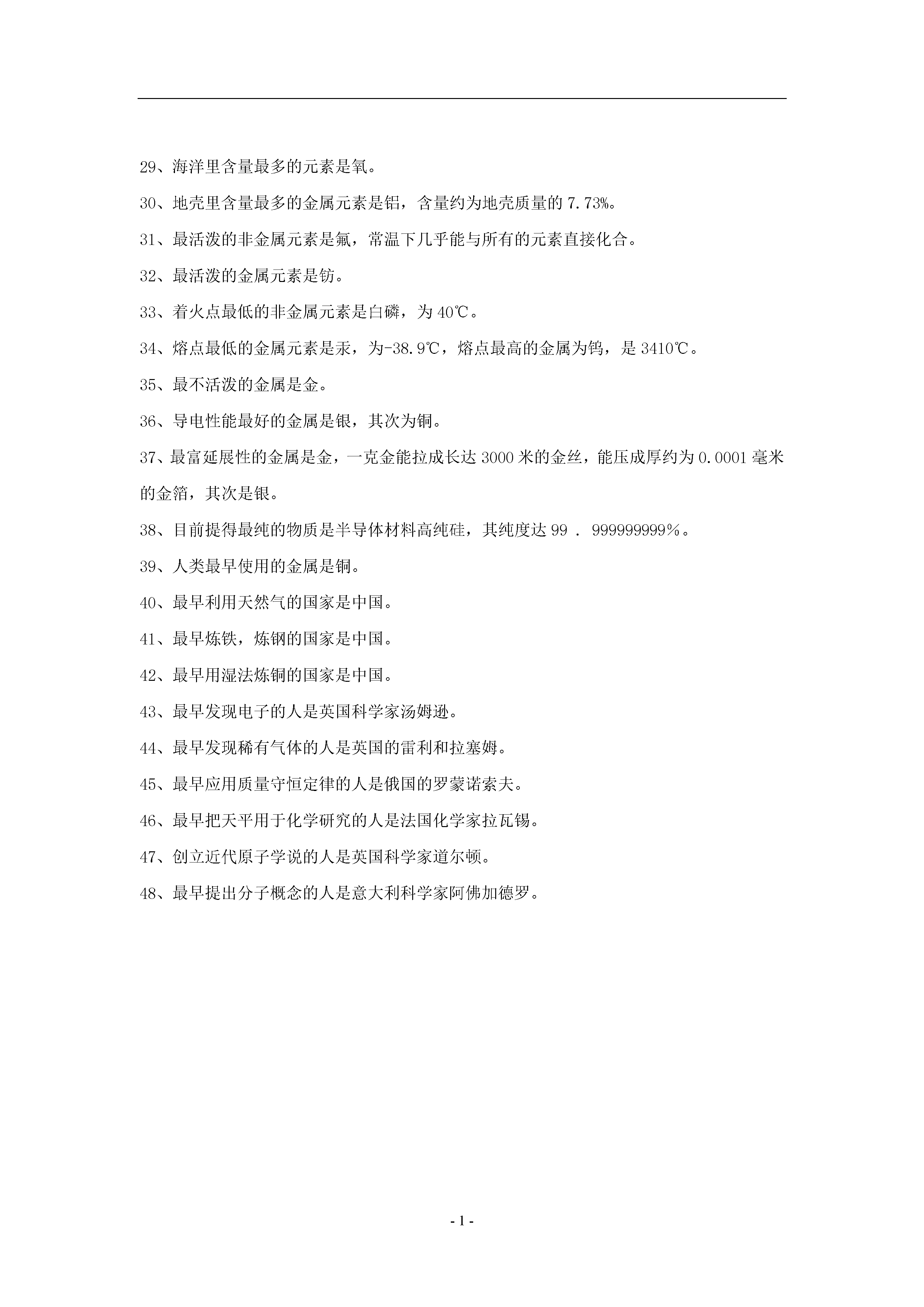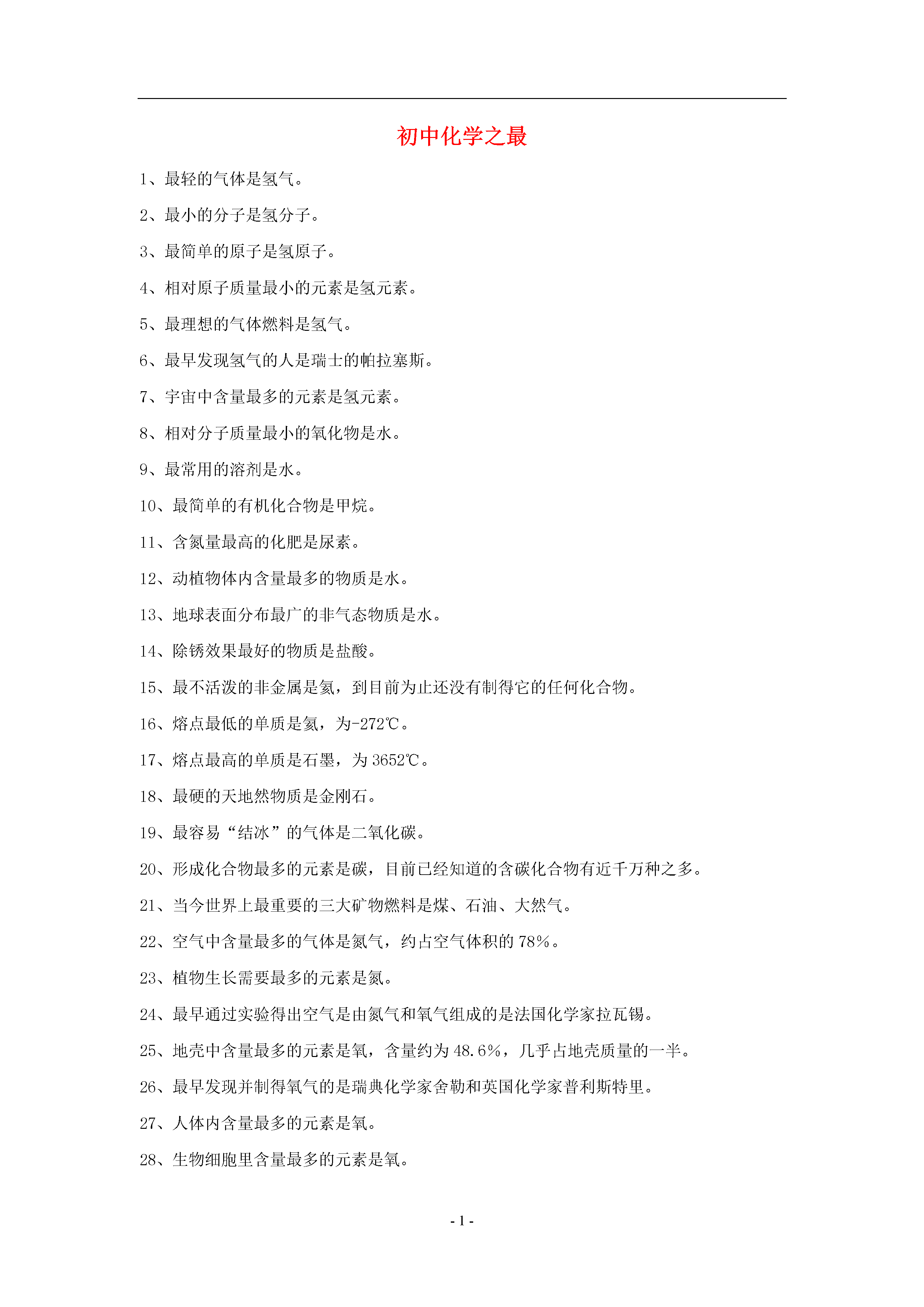 -1-初中化学之最1、最轻的气体是氢气。2、最小的分子是氢分子。3、最简单的原子是氢原子。4、相对原子质量最小的元素是氢元素。5、最理想的气体燃料是氢气。6、最早发现氢气的人是瑞士的帕拉塞斯。7、宇宙中含量最多的元素是氢元素。8、相对分子质量最小的氧化物是水。9、最常用的溶剂是水。10、最简单的有机化合物是甲烷。11、含氮量最高的化肥是尿素。12、动植物体内含量最多的物质是水。13、地球表面分布最广的非气态物质是水。14、除锈效果最好的物质是盐酸。15、最不活泼的非金属是氦,到目前为止还没有制得它的任何化合物。16、熔点最低的单质是氦,为-272℃。17、熔点最高的单质是石墨,为3652℃。18、最硬的天地然物质是金刚石。19、最容易“结冰”的气体是二氧化碳。20、形成化合物最多的元素是碳,目前已经知道的含碳化合物有近千万种之多。21、当今世界上最重要的三大矿物燃料是煤、石油、大然气。22、空气中含量最多的气体是氮气,约占空气体积的78%。23、植物生长需要最多的元素是氮。24、最早通过实验得出空气是由氮气和氧气组成的是法国化学家拉瓦锡。25、地壳中含量最多的元素是氧,含量约为48.6%,几乎占地壳质量的一半。26、最早发现并制得氧气的是瑞典化学家舍勒和英国化学家普利斯特里。27、人体内含量最多的元素是氧。28、生物细胞里含量最多的元素是氧。29、海洋里含量最多的元素是氧。30、地壳里含量最多的金属元素是铝,含量约为地壳质量的7.73%。31、最活泼的非金属元素是氟,常温下几乎能与所有的元素直接化合。32、最活泼的金属元素是钫。33、着火点最低的非金属元素是白磷,为40℃。34、熔点最低的金属元素是汞,为-38.9℃,熔点最高的金属为钨,是3410℃。35、最不活泼的金属是金。36、导电性能最好的金属是银,其次为铜。37、最富延展性的金属是金,一克金能拉成长达3000米的金丝,能压成厚约为0.0001毫米的金箔,其次是银。38、目前提得最纯的物质是半导体材料高纯硅,其纯度达99.999999999%。39、人类最早使用的金属是铜。40、最早利用天然气的国家是中国。41、最早炼铁,炼钢的国家是中国。42、最早用湿法炼铜的国家是中国。43、最早发现电子的人是英国科学家汤姆逊。44、最早发现稀有气体的人是英国的雷利和拉塞姆。45、最早应用质量守恒定律的人是俄国的罗蒙诺索夫。46、最早把天平用于化学研究的人是法国化学家拉瓦锡。47、创立近代原子学说的人是英国科学家道尔顿。48、最早提出分子概念的人是意大利科学家阿佛加德罗。
