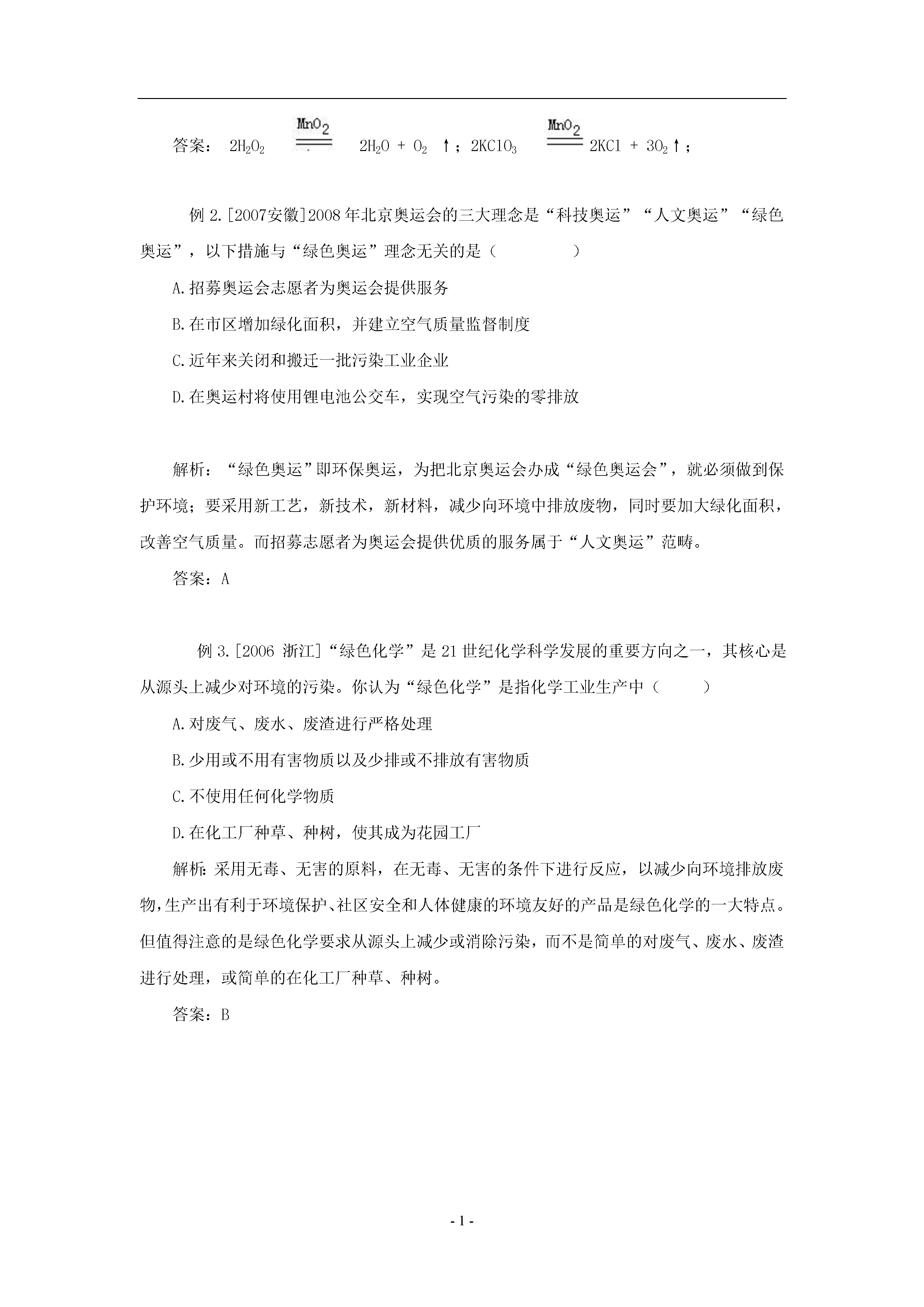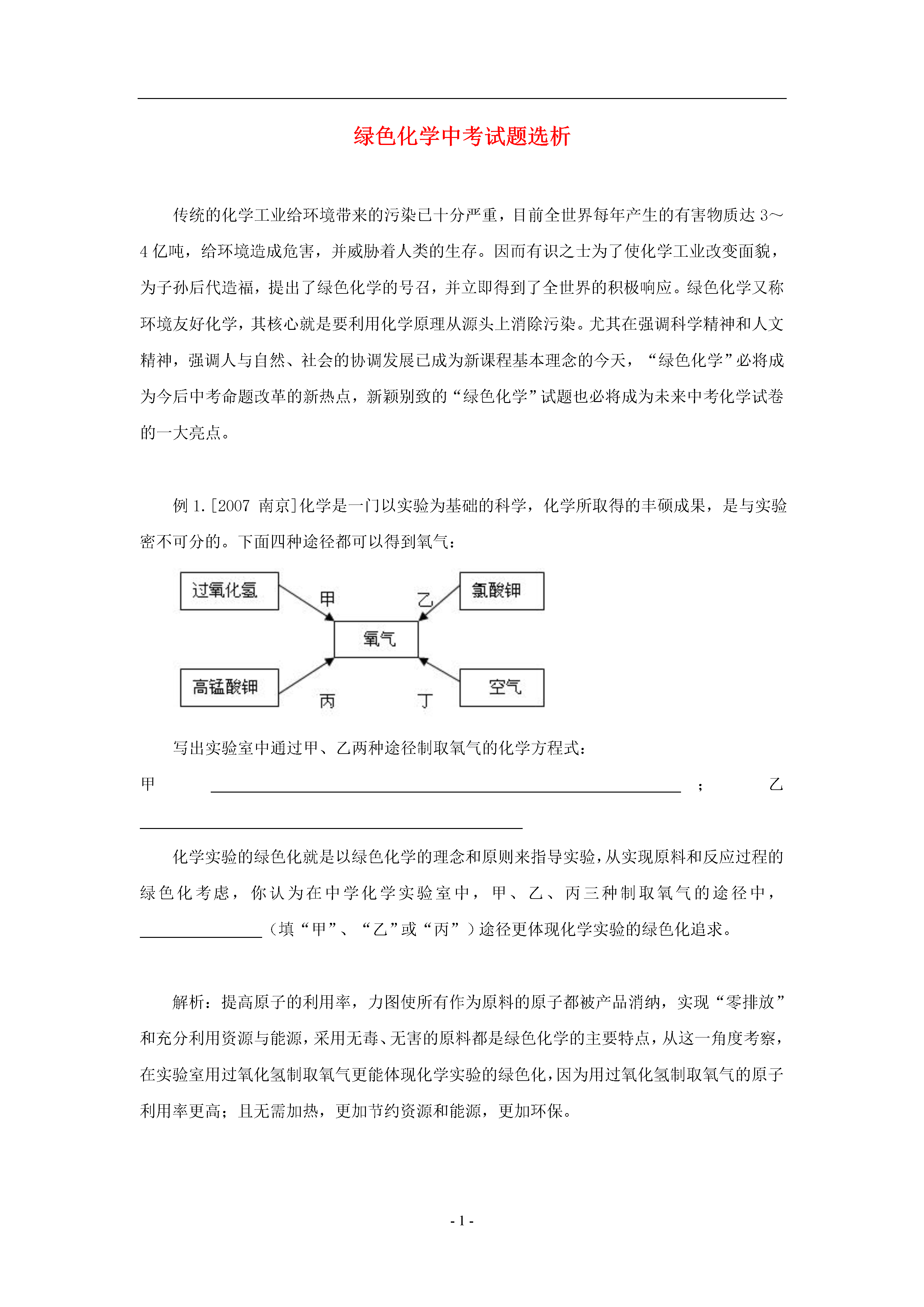 -1-绿色化学中考试题选析传统的化学工业给环境带来的污染已十分严重,目前全世界每年产生的有害物质达3~4亿吨,给环境造成危害,并威胁着人类的生存。因而有识之士为了使化学工业改变面貌,为子孙后代造福,提出了绿色化学的号召,并立即得到了全世界的积极响应。绿色化学又称环境友好化学,其核心就是要利用化学原理从源头上消除污染。尤其在强调科学精神和人文精神,强调人与自然、社会的协调发展已成为新课程基本理念的今天,“绿色化学”必将成为今后中考命题改革的新热点,新颖别致的“绿色化学”试题也必将成为未来中考化学试卷的一大亮点。例1.[2007南京]化学是一门以实验为基础的科学,化学所取得的丰硕成果,是与实验密不可分的。下面四种途径都可以得到氧气:写出实验室中通过甲、乙两种途径制取氧气的化学方程式:甲;乙化学实验的绿色化就是以绿色化学的理念和原则来指导实验,从实现原料和反应过程的绿色化考虑,你认为在中学化学实验室中,甲、乙、丙三种制取氧气的途径中,(填“甲”、“乙”或“丙”)途径更体现化学实验的绿色化追求。解析:提高原子的利用率,力图使所有作为原料的原子都被产品消纳,实现“零排放”和充分利用资源与能源,采用无毒、无害的原料都是绿色化学的主要特点,从这一角度考察,在实验室用过氧化氢制取氧气更能体现化学实验的绿色化,因为用过氧化氢制取氧气的原子利用率更高;且无需加热,更加节约资源和能源,更加环保。答案:2H2O22H2O+O2↑;2KClO32KCl+3O2↑;例2.[2007安徽]2008年北京奥运会的三大理念是“科技奥运”“人文奥运”“绿色奥运”,以下措施与“绿色奥运”理念无关的是()A.招募奥运会志愿者为奥运会提供服务B.在市区增加绿化面积,并建立空气质量监督制度C.近年来关闭和搬迁一批污染工业企业D.在奥运村将使用锂电池公交车,实现空气污染的零排放解析:“绿色奥运”即环保奥运,为把北京奥运会办成“绿色奥运会”,就必须做到保护环境;要采用新工艺,新技术,新材料,减少向环境中排放废物,同时要加大绿化面积,改善空气质量。而招募志愿者为奥运会提供优质的服务属于“人文奥运”范畴。答案:A例3.[2006浙江]“绿色化学”是21世纪化学科学发展的重要方向之一,其核心是从源头上减少对环境的污染。你认为“绿色化学”是指化学工业生产中()A.对废气、废水、废渣进行严格处理B.少用或不用有害物质以及少排或不排放有害物质C.不使用任何化学物质D.在化工厂种草、种树,使其成为花园工厂解析:采用无毒、无害的原料,在无毒、无害的条件下进行反应,以减少向环境排放废物,生产出有利于环境保护、社区安全和人体健康的环境友好的产品是绿色化学的一大特点。但值得注意的是绿色化学要求从源头上减少或消除污染,而不是简单的对废气、废水、废渣进行处理,或简单的在化工厂种草、种树。答案:B