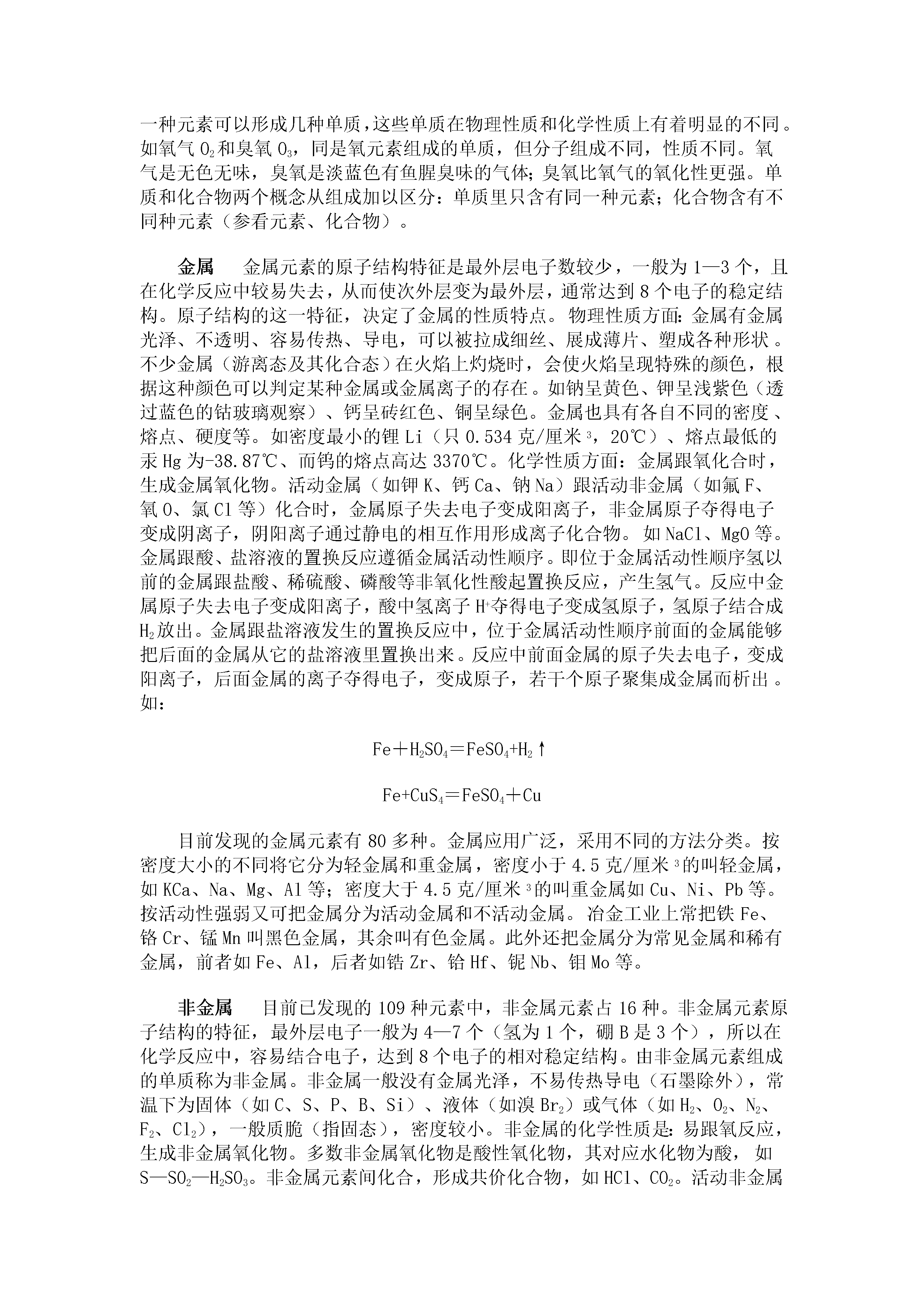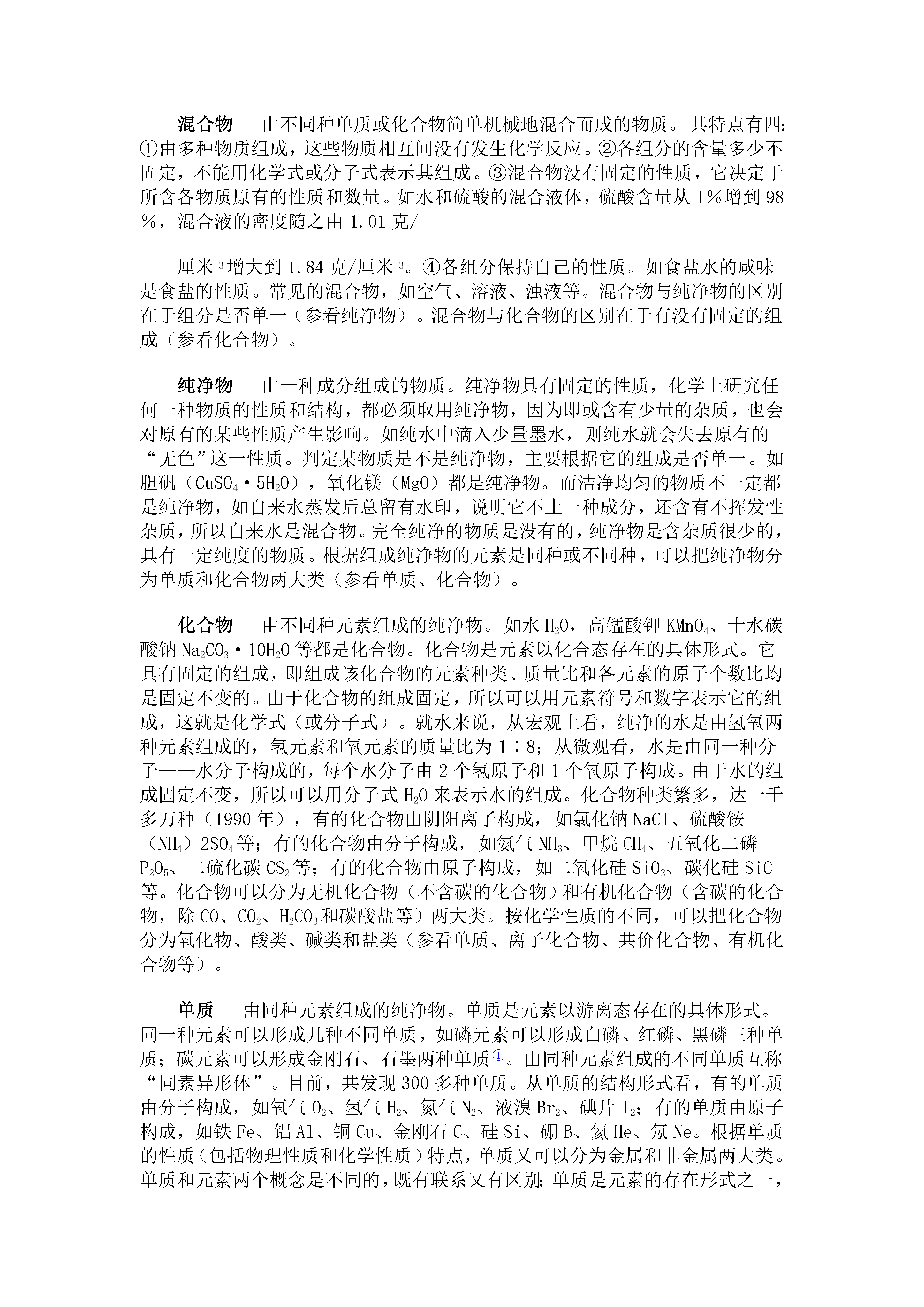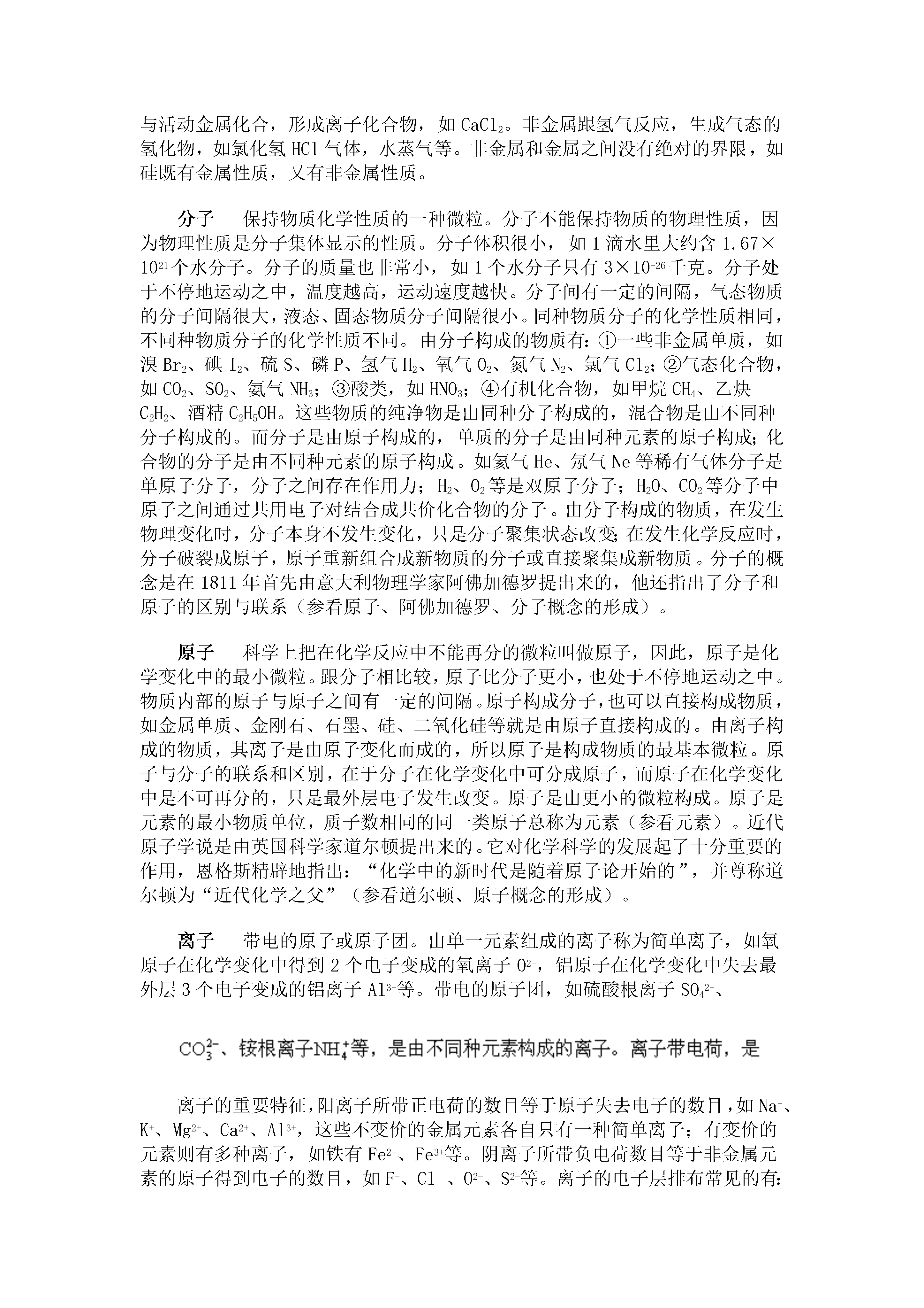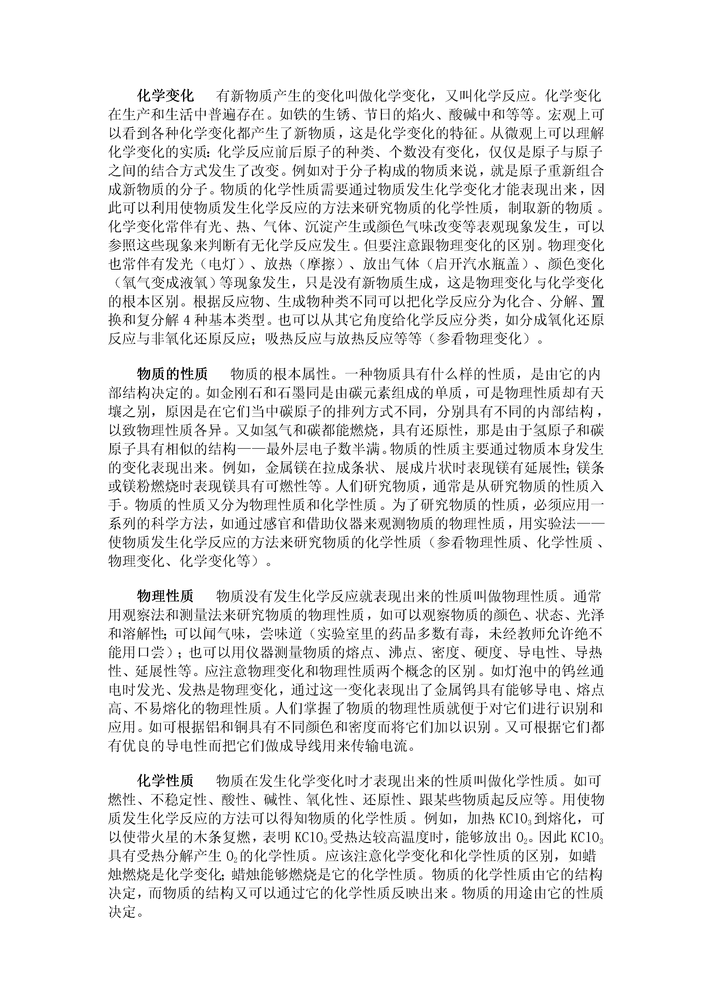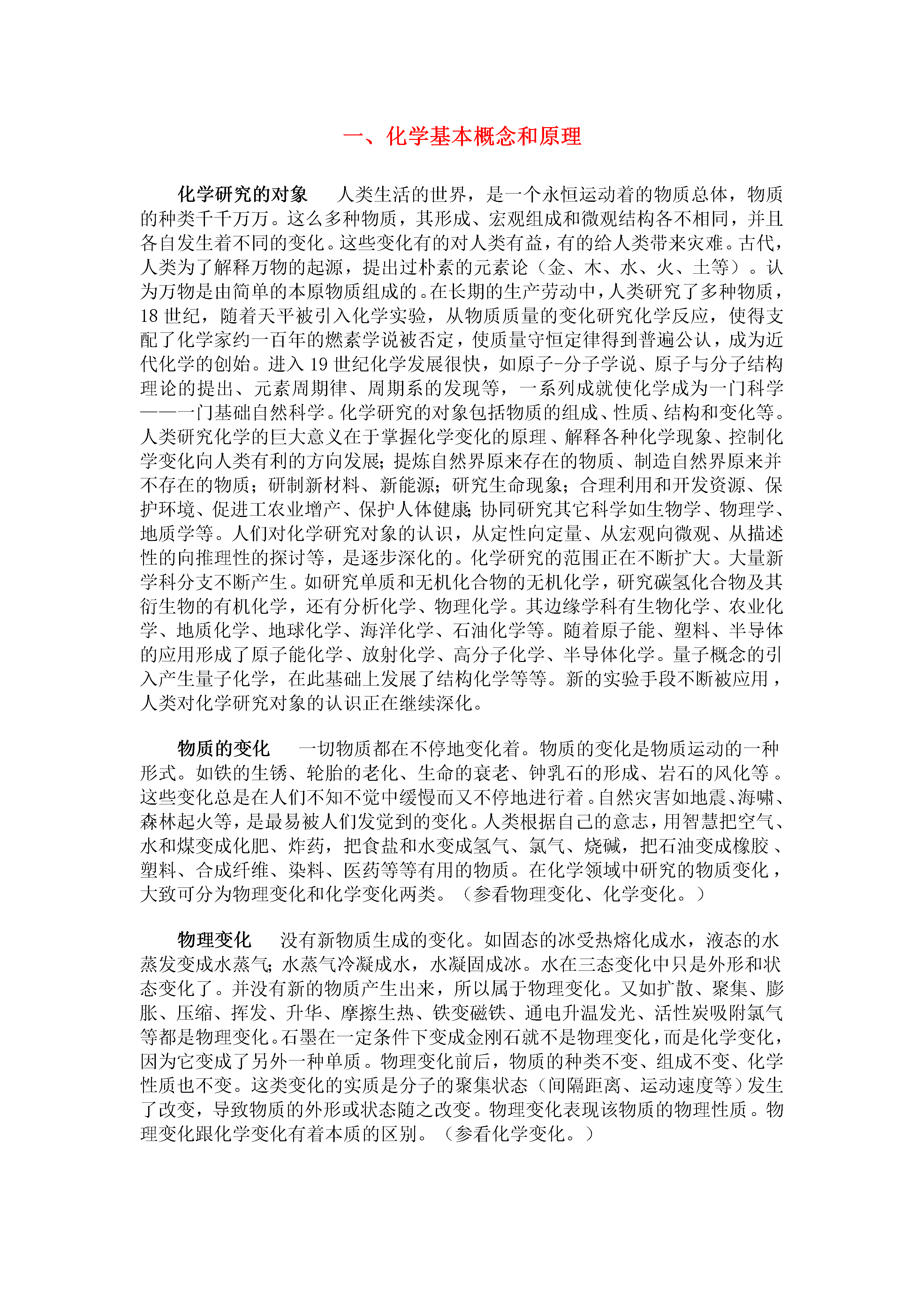 一、化学基本概念和原理化学研究的对象人类生活的世界,是一个永恒运动着的物质总体,物质的种类千千万万。这么多种物质,其形成、宏观组成和微观结构各不相同,并且各自发生着不同的变化。这些变化有的对人类有益,有的给人类带来灾难。古代,人类为了解释万物的起源,提出过朴素的元素论(金、木、水、火、土等)。认为万物是由简单的本原物质组成的。在长期的生产劳动中,人类研究了多种物质,18世纪,随着天平被引入化学实验,从物质质量的变化研究化学反应,使得支配了化学家约一百年的燃素学说被否定,使质量守恒定律得到普遍公认,成为近代化学的创始。进入19世纪化学发展很快,如原子-分子学说、原子与分子结构理论的提出、元素周期律、周期系的发现等,一系列成就使化学成为一门科学——一门基础自然科学。化学研究的对象包括物质的组成、性质、结构和变化等。人类研究化学的巨大意义在于掌握化学变化的原理、解释各种化学现象、控制化学变化向人类有利的方向发展;提炼自然界原来存在的物质、制造自然界原来并不存在的物质;研制新材料、新能源;研究生命现象;合理利用和开发资源、保护环境、促进工农业增产、保护人体健康;协同研究其它科学如生物学、物理学、地质学等。人们对化学研究对象的认识,从定性向定量、从宏观向微观、从描述性的向推理性的探讨等,是逐步深化的。化学研究的范围正在不断扩大。大量新学科分支不断产生。如研究单质和无机化合物的无机化学,研究碳氢化合物及其衍生物的有机化学,还有分析化学、物理化学。其边缘学科有生物化学、农业化学、地质化学、地球化学、海洋化学、石油化学等。随着原子能、塑料、半导体的应用形成了原子能化学、放射化学、高分子化学、半导体化学。量子概念的引入产生量子化学,在此基础上发展了结构化学等等。新的实验手段不断被应用,人类对化学研究对象的认识正在继续深化。物质的变化一切物质都在不停地变化着。物质的变化是物质运动的一种形式。如铁的生锈、轮胎的老化、生命的衰老、钟乳石的形成、岩石的风化等。这些变化总是在人们不知不觉中缓慢而又不停地进行着。自然灾害如地震、海啸、森林起火等,是最易被人们发觉到的变化。人类根据自己的意志,用智慧把空气、水和煤变成化肥、炸药,把食盐和水变成氢气、氯气、烧碱,把石油变成橡胶、塑料、合成纤维、染料、医药等等有用的物质。在化学领域中研究的物质变化,大致可分为物理变化和化学变化两类。(参看物理变化、化学变化。)物理变化没有新物质生成的变化。如固态的冰受热熔化成水,液态的水蒸发变成水蒸气;水蒸气冷凝成水,水凝固成冰。水在三态变化中只是外形和状态变化了。并没有新的物质产生出来,所以属于物理变化。又如扩散、聚集、膨胀、压缩、挥发、升华、摩擦生热、铁变磁铁、通电升温发光、活性炭吸附氯气等都是物理变化。石墨在一定条件下变成金刚石就不是物理变化,而是化学变化,因为它变成了另外一种单质。物理变化前后,物质的种类不变、组成不变、化学性质也不变。这类变化的实质是分子的聚集状态(间隔距离、运动速度等)发生了改变,导致物质的外形或状态随之改变。物理变化表现该物质的物理性质。物理变化跟化学变化有着本质的区别。(参看化学变化。)化学变化有新物质产生的变化叫做化学变化,又叫化学反应。化学变化在生产和生活中普遍存在。如铁的生锈、节日的焰火、酸碱中和等等。宏观上可以看到各种化学变化都产生了新物质,这是化学变化的特征。从微观上可以理解化学变化的实质:化学反应前后原子的种类、个数没有变化,仅仅是原子与原子之间的结合方式发生了改变。例如对于分子构成的物质来说,就是原子重新组合成新物质的分子。物质的化学性质需要通过物质发生化学变化才能表现出来,因此可以利用使物质发生化学反应的方法来研究物质的化学性质,制取新的物质。化学变化常伴有光、热、气体、沉淀产生或颜色气味改变等表观现象发生,可以参照这些现象来判断有无化学反应发生。但要注意跟物理变化的区别。物理变化也常伴有发光(电灯)、放热(摩擦)、放出气体(启开汽水瓶盖)、颜色变化(氧气变成液氧)等现象发生,只是没有新物质生成,这是物理变化与化学变化的根本区别。根据反应物、生成物种类不同可以把化学反应分为化合、分解、置换和复分解4种基本类型。也可以从其它角度给化学反应分类,如分成氧化还原反应与非氧化还原反应;吸热反应与放热反应等等(参看物理变化)。物质的性质物质的根本属性。一种物质具有什么样的性质,是由它的内部结构决定的。如金刚石和石墨同是由碳元素组成的单质,可是物理性质却有天壤之别,原因是在它们当中碳原子的排列方式不同,分别具有不同的内部结构,以致物理性质各异。又如氢气和碳都能燃烧,具有还原性,那是由于氢原子和碳原子具有相似的结构——最外层电子数半满。物质的性质主要通过物质本身发生的变化表现出来。例如,金属镁在拉成条状、展成片状时表现镁有延展