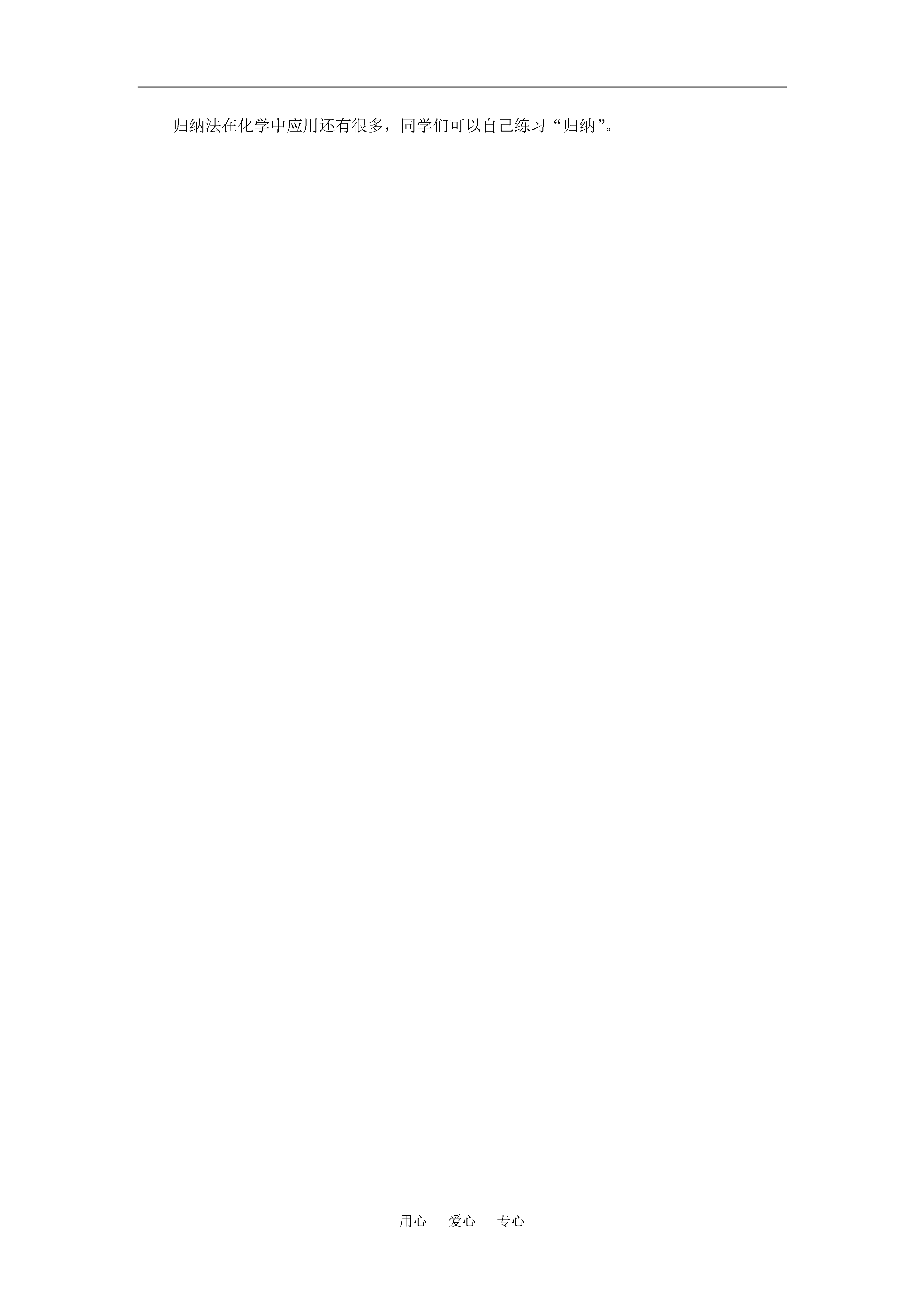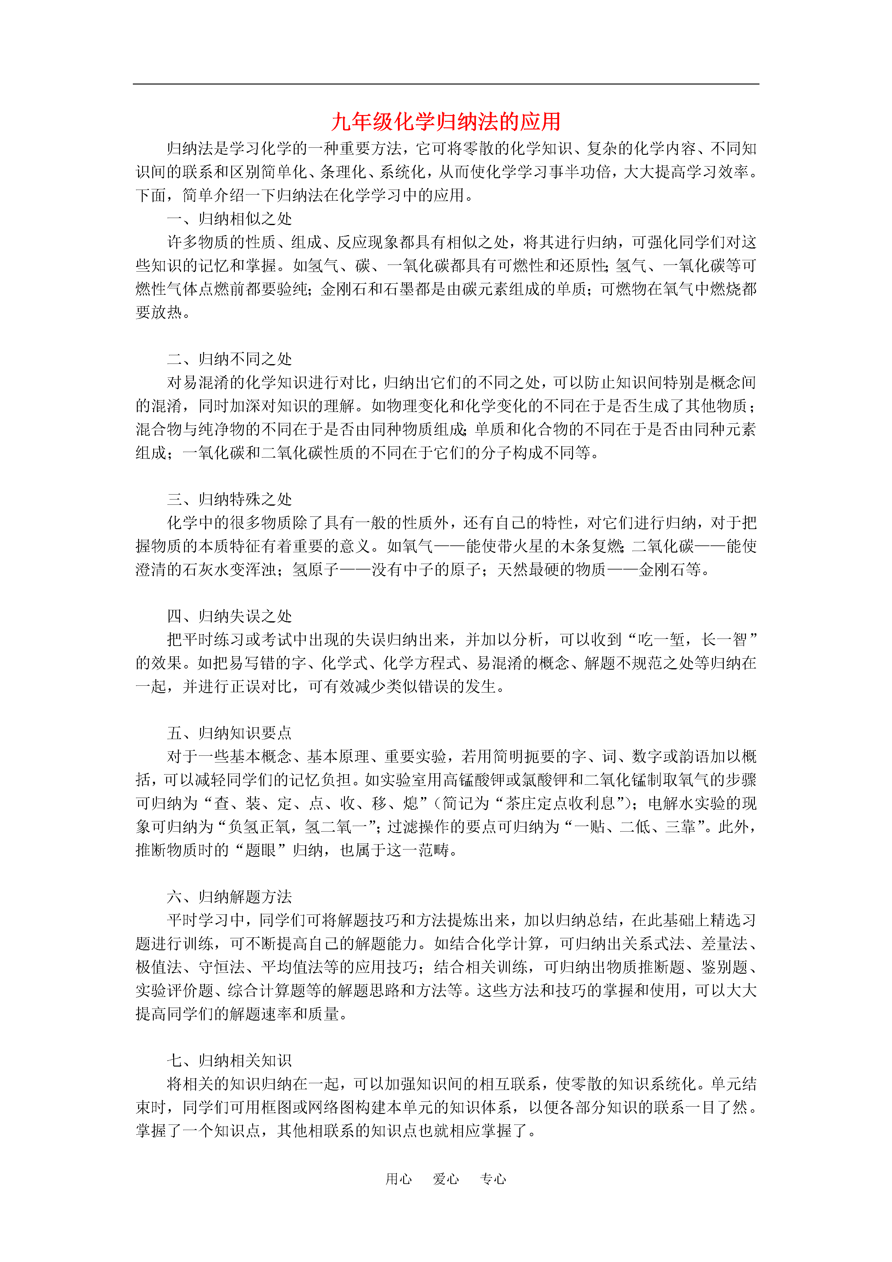 用心爱心专心九年级化学归纳法的应用归纳法是学习化学的一种重要方法,它可将零散的化学知识、复杂的化学内容、不同知识间的联系和区别简单化、条理化、系统化,从而使化学学习事半功倍,大大提高学习效率。下面,简单介绍一下归纳法在化学学习中的应用。一、归纳相似之处许多物质的性质、组成、反应现象都具有相似之处,将其进行归纳,可强化同学们对这些知识的记忆和掌握。如氢气、碳、一氧化碳都具有可燃性和还原性;氢气、一氧化碳等可燃性气体点燃前都要验纯;金刚石和石墨都是由碳元素组成的单质;可燃物在氧气中燃烧都要放热。二、归纳不同之处对易混淆的化学知识进行对比,归纳出它们的不同之处,可以防止知识间特别是概念间的混淆,同时加深对知识的理解。如物理变化和化学变化的不同在于是否生成了其他物质;混合物与纯净物的不同在于是否由同种物质组成;单质和化合物的不同在于是否由同种元素组成;一氧化碳和二氧化碳性质的不同在于它们的分子构成不同等。三、归纳特殊之处化学中的很多物质除了具有一般的性质外,还有自己的特性,对它们进行归纳,对于把握物质的本质特征有着重要的意义。如氧气——能使带火星的木条复燃;二氧化碳——能使澄清的石灰水变浑浊;氢原子——没有中子的原子;天然最硬的物质——金刚石等。四、归纳失误之处把平时练习或考试中出现的失误归纳出来,并加以分析,可以收到“吃一堑,长一智”的效果。如把易写错的字、化学式、化学方程式、易混淆的概念、解题不规范之处等归纳在一起,并进行正误对比,可有效减少类似错误的发生。五、归纳知识要点对于一些基本概念、基本原理、重要实验,若用简明扼要的字、词、数字或韵语加以概括,可以减轻同学们的记忆负担。如实验室用高锰酸钾或氯酸钾和二氧化锰制取氧气的步骤可归纳为“查、装、定、点、收、移、熄”(简记为“茶庄定点收利息”);电解水实验的现象可归纳为“负氢正氧,氢二氧一”;过滤操作的要点可归纳为“一贴、二低、三靠”。此外,推断物质时的“题眼”归纳,也属于这一范畴。六、归纳解题方法平时学习中,同学们可将解题技巧和方法提炼出来,加以归纳总结,在此基础上精选习题进行训练,可不断提高自己的解题能力。如结合化学计算,可归纳出关系式法、差量法、极值法、守恒法、平均值法等的应用技巧;结合相关训练,可归纳出物质推断题、鉴别题、实验评价题、综合计算题等的解题思路和方法等。这些方法和技巧的掌握和使用,可以大大提高同学们的解题速率和质量。七、归纳相关知识将相关的知识归纳在一起,可以加强知识间的相互联系,使零散的知识系统化。单元结束时,同学们可用框图或网络图构建本单元的知识体系,以便各部分知识的联系一目了然。掌握了一个知识点,其他相联系的知识点也就相应掌握了。归纳法在化学中应用还有很多,同学们可以自己练习“归纳”。