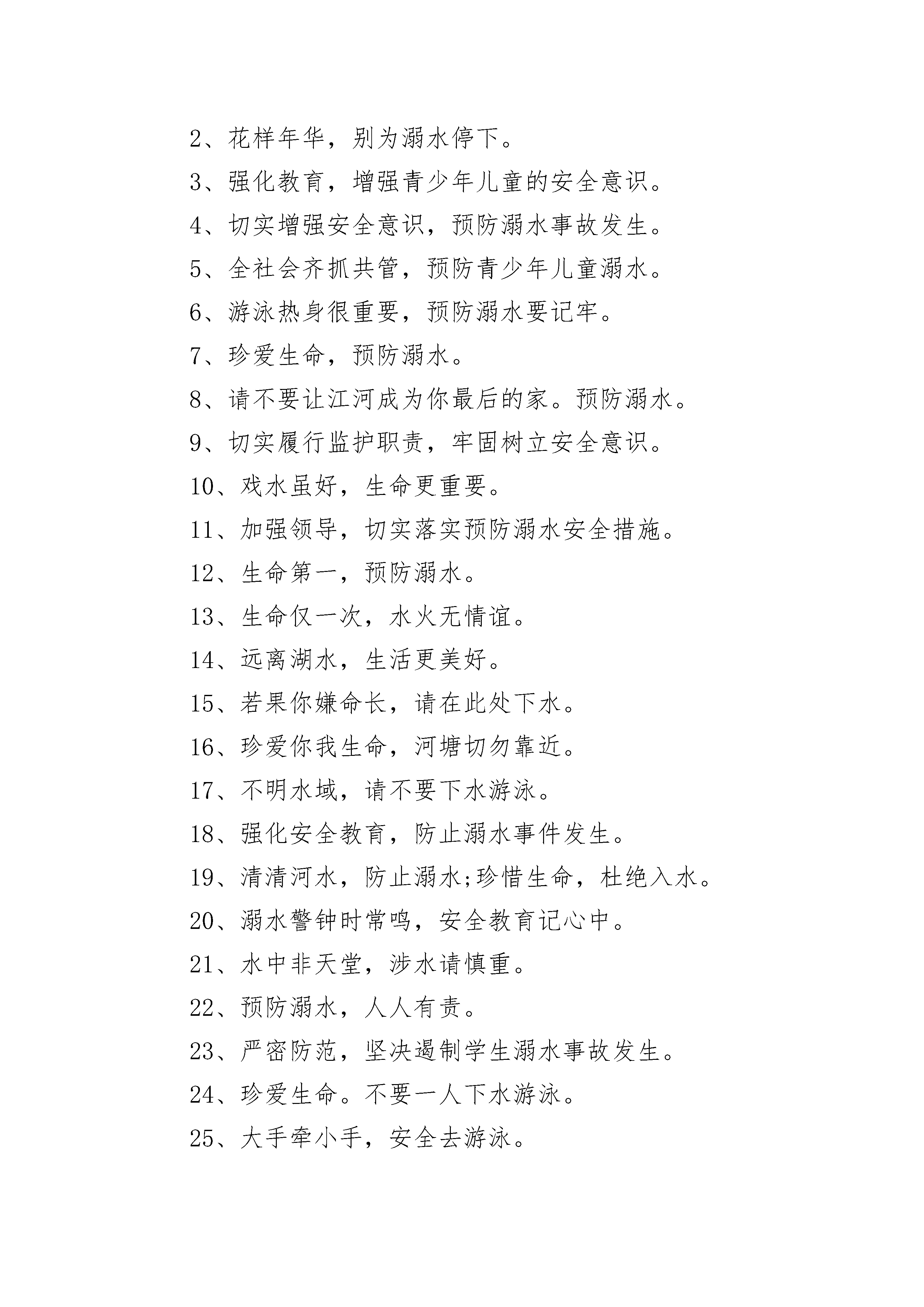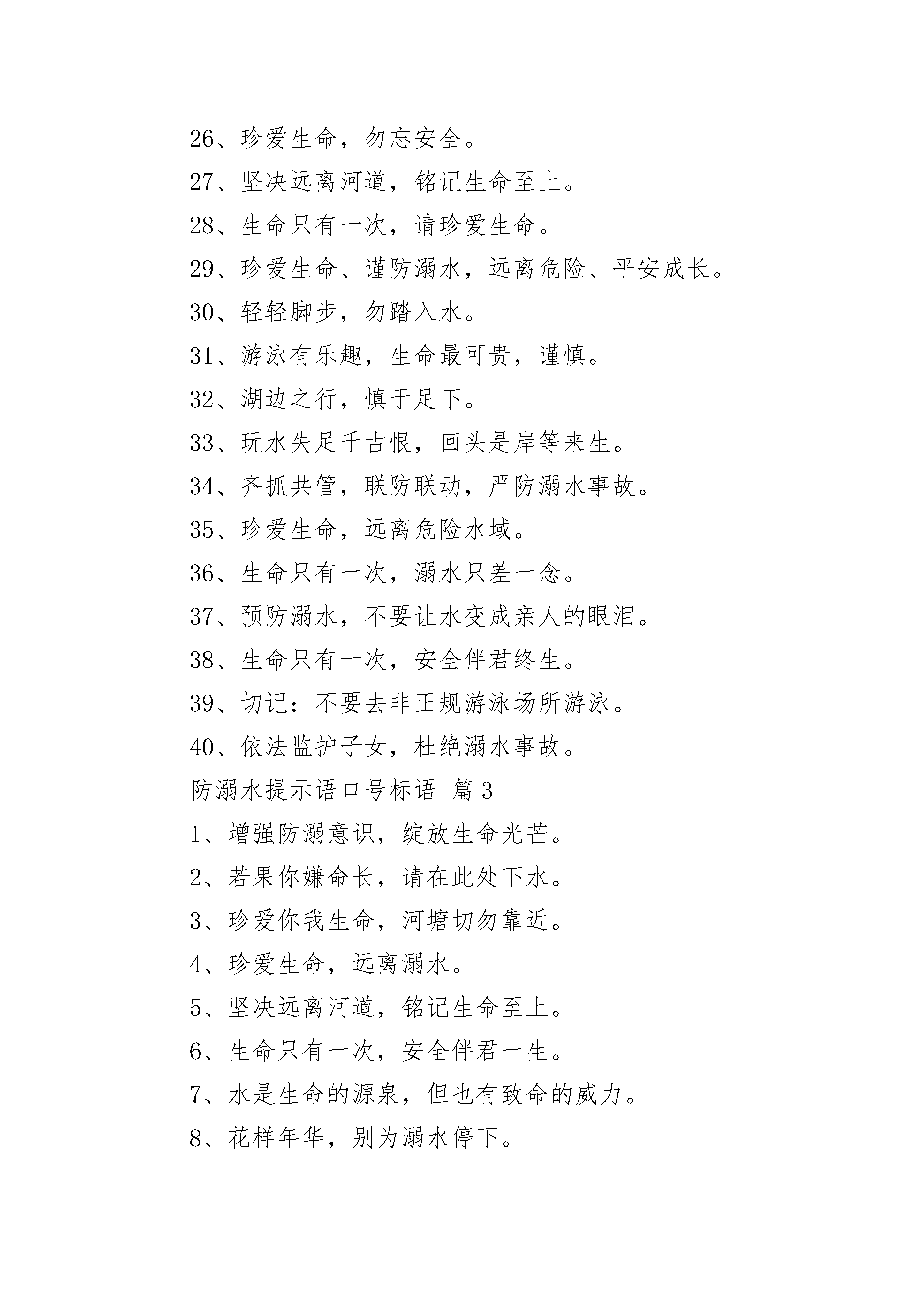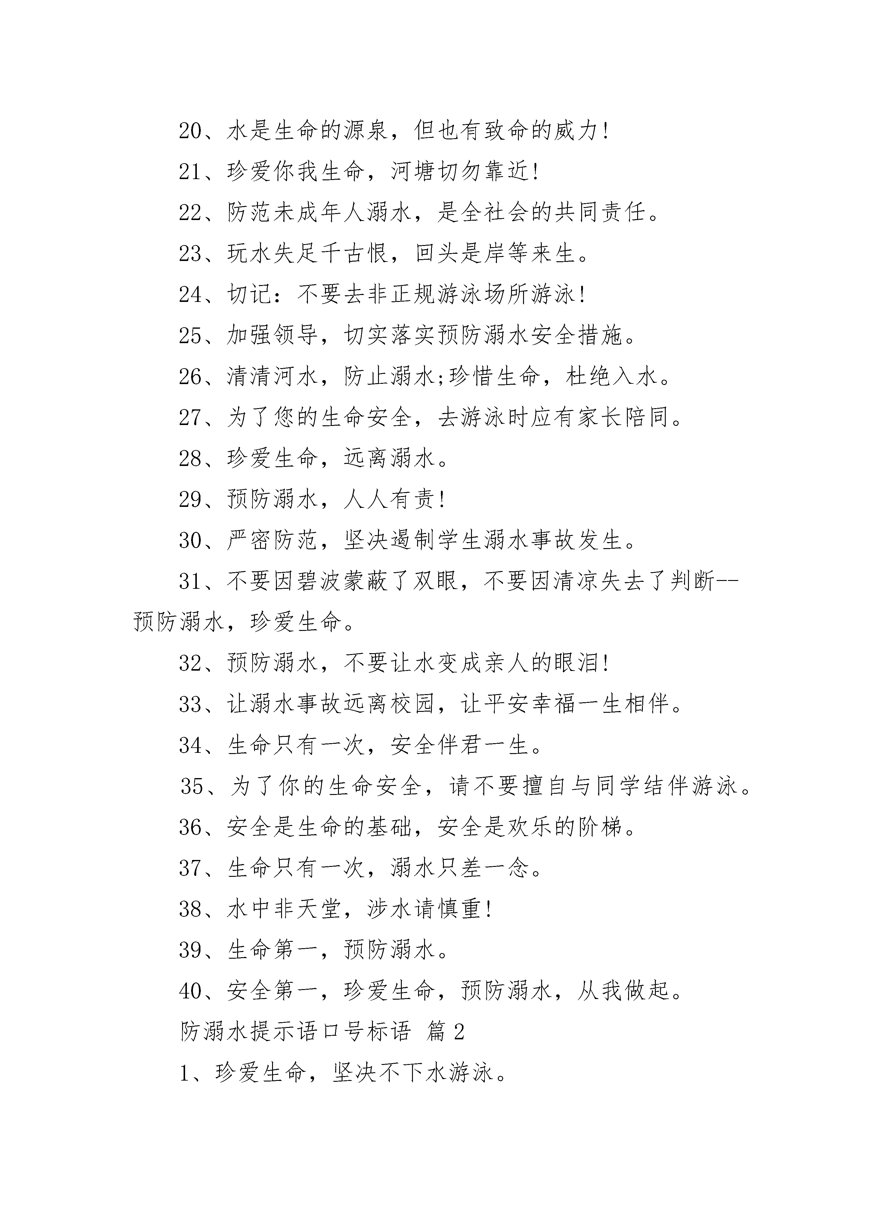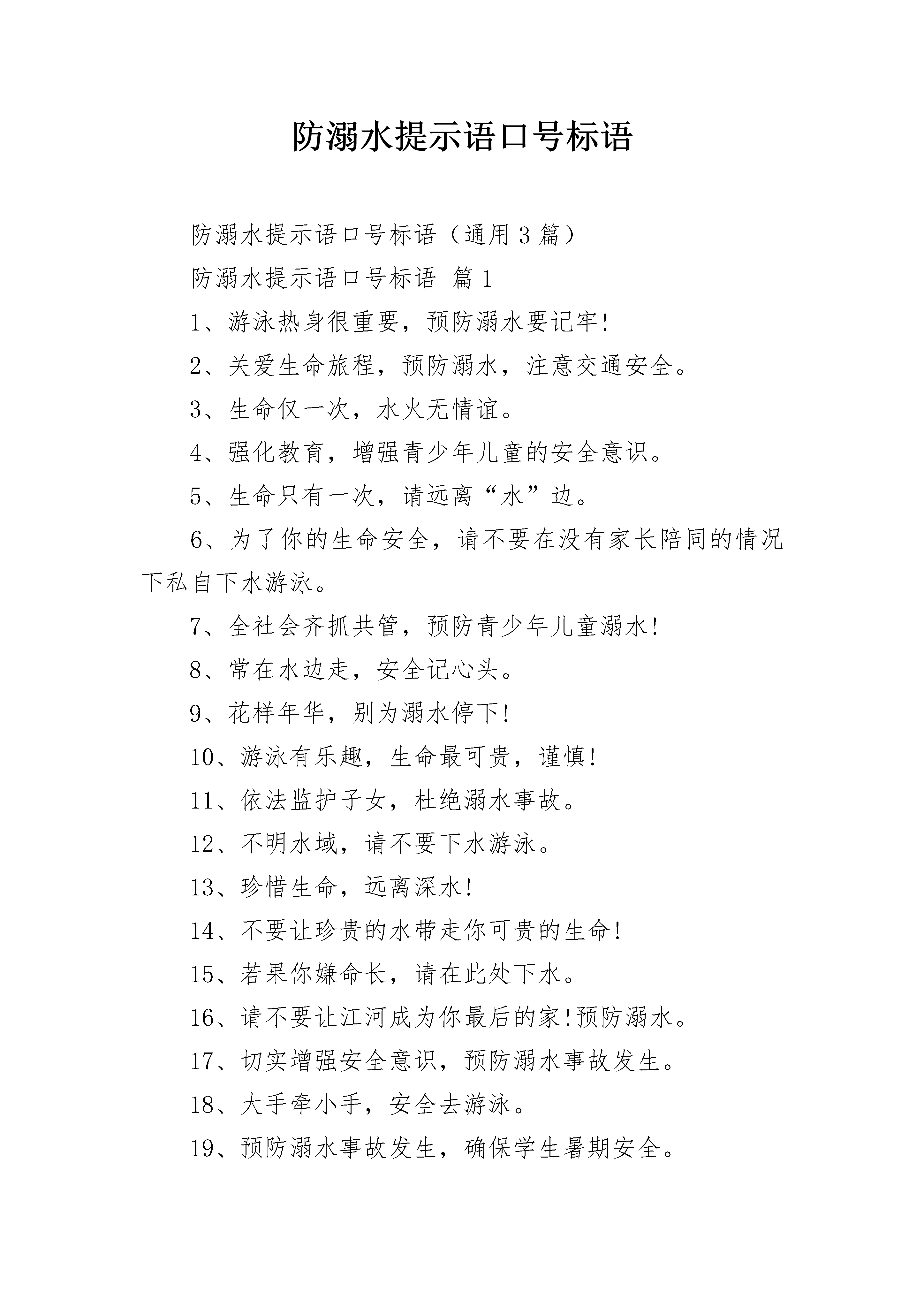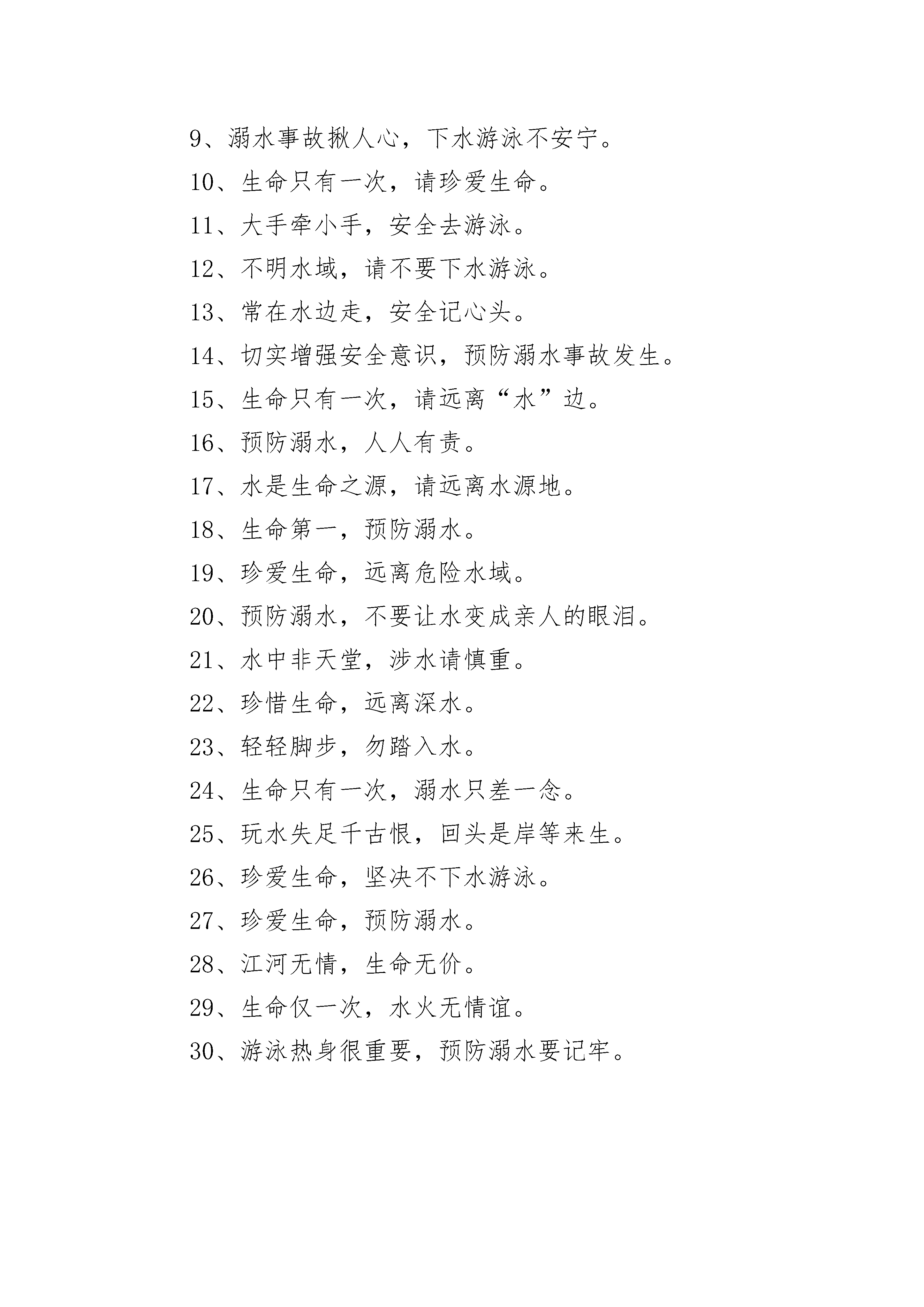 防溺水提示语口号标语防溺水提示语口号标语(通用3篇)防溺水提示语口号标语篇11、游泳热身很重要,预防溺水要记牢!2、关爱生命旅程,预防溺水,注意交通安全。3、生命仅一次,水火无情谊。4、强化教育,增强青少年儿童的安全意识。5、生命只有一次,请远离“水”边。6、为了你的生命安全,请不要在没有家长陪同的情况下私自下水游泳。7、全社会齐抓共管,预防青少年儿童溺水!8、常在水边走,安全记心头。9、花样年华,别为溺水停下!10、游泳有乐趣,生命最可贵,谨慎!11、依法监护子女,杜绝溺水事故。12、不明水域,请不要下水游泳。13、珍惜生命,远离深水!14、不要让珍贵的水带走你可贵的生命!15、若果你嫌命长,请在此处下水。16、请不要让江河成为你最后的家!预防溺水。17、切实增强安全意识,预防溺水事故发生。18、大手牵小手,安全去游泳。19、预防溺水事故发生,确保学生暑期安全。20、水是生命的源泉,但也有致命的威力!21、珍爱你我生命,河塘切勿靠近!22、防范未成年人溺水,是全社会的共同责任。23、玩水失足千古恨,回头是岸等来生。24、切记:不要去非正规游泳场所游泳!25、加强领导,切实落实预防溺水安全措施。26、清清河水,防止溺水;珍惜生命,杜绝入水。27、为了您的生命安全,去游泳时应有家长陪同。28、珍爱生命,远离溺水。29、预防溺水,人人有责!30、严密防范,坚决遏制学生溺水事故发生。31、不要因碧波蒙蔽了双眼,不要因清凉失去了判断--预防溺水,珍爱生命。32、预防溺水,不要让水变成亲人的眼泪!33、让溺水事故远离校园,让平安幸福一生相伴。34、生命只有一次,安全伴君一生。35、为了你的生命安全,请不要擅自与同学结伴游泳。36、安全是生命的基础,安全是欢乐的阶梯。37、生命只有一次,溺水只差一念。38、水中非天堂,涉水请慎重!39、生命第一,预防溺水。40、安全第一,珍爱生命,预防溺水,从我做起。防溺水提示语口号标语篇21、珍爱生命,坚决不下水游泳。2、花样年华,别为溺水停下。3、强化教育,增强青少年儿童的安全意识。4、切实增强安全意识,预防溺水事故发生。5、全社会齐抓共管,预防青少年儿童溺水。6、游泳热身很重要,预防溺水要记牢。7、珍爱生命,预防溺水。8、请不要让江河成为你最后的家。预防溺水。9、切实履行监护职责,牢固树立安全意识。10、戏水虽好,生命更重要。11、加强领导,切实落实预防溺水安全措施。12、生命第一,预防溺水。13、生命仅一次,水火无情谊。14、远离湖水,生活更美好。15、若果你嫌命长,请在此处下水。16、珍爱你我生命,河塘切勿靠近。17、不明水域,请不要下水游泳。18、强化安全教育,防止溺水事件发生。19、清清河水,防止溺水;珍惜生命,杜绝入水。20、溺水警钟时常鸣,安全教育记心中。21、水中非天堂,涉水请慎重。22、预防溺水,人人有责。23、严密防范,坚决遏制学生溺水事故发生。24、珍爱生命。不要一人下水游泳。25、大手牵小手,安全去游泳。26、珍爱生命,勿忘安全。27、坚决远离河道,铭记生命至上。28、生命只有一次,请珍爱生命。29、珍爱生命、谨防溺水,远离危险、平安成长。30、轻轻脚步,勿踏入水。31、游泳有乐趣,生命最可贵,谨慎。32、湖边之行,慎于足下。33、玩水失足千古恨,回头是岸等来生。34、齐抓共管,联防联动,严防溺水事故。35、珍爱生命,远离危险水域。36、生命只有一次,溺水只差一念。37、预防溺水,不要让水变成亲人的眼泪。38、生命只有一次,安全伴君终生。39、切记:不要去非正规游泳场所游泳。40、依法监护子女,杜绝溺水事故。防溺水提示语口号标语篇31、增强防溺意识,绽放生命光芒。2、若果你嫌命长,请在此处下水。3、珍爱你我生命,河塘切勿靠近。4、珍爱生命,远离溺水。5、坚决远离河道,铭记生命至上。6、生命只有一次,安全伴君一生。7、水是生命的源泉,但也有致命的威力。8、花样年华,别为溺水停下。9、溺水事故揪人心,下水游泳不安宁。10、生命只有一次,请珍爱生命。11、大手牵小手,安全去游泳。12、不明水域,请不要下水游泳。13、常在水边走,安全记心头。14、切实增强安全意识,预防溺水事故发生。15、生命只有一次,请远离“水”边。16、预防溺水,人人有责。17、水是生命之源,请远离水源地。18、生命第一,预防溺水。19、珍爱生命,远离危险水域。20、预防溺水,不要让水变成亲人的眼泪。21、水中非天堂,涉水请慎重。22、珍惜生命,远离深水。23、轻轻脚步,勿踏入水。24、生命只有一次,溺水只差一念。25、玩水失足千古恨,回头是岸等来生。26、珍爱生命,坚决不下水游泳。27、珍爱生命,预防溺水。28、江河无情,生命无价。29、生命仅一次,水火无情谊。30、游泳热身很重要,预防溺水要记牢。