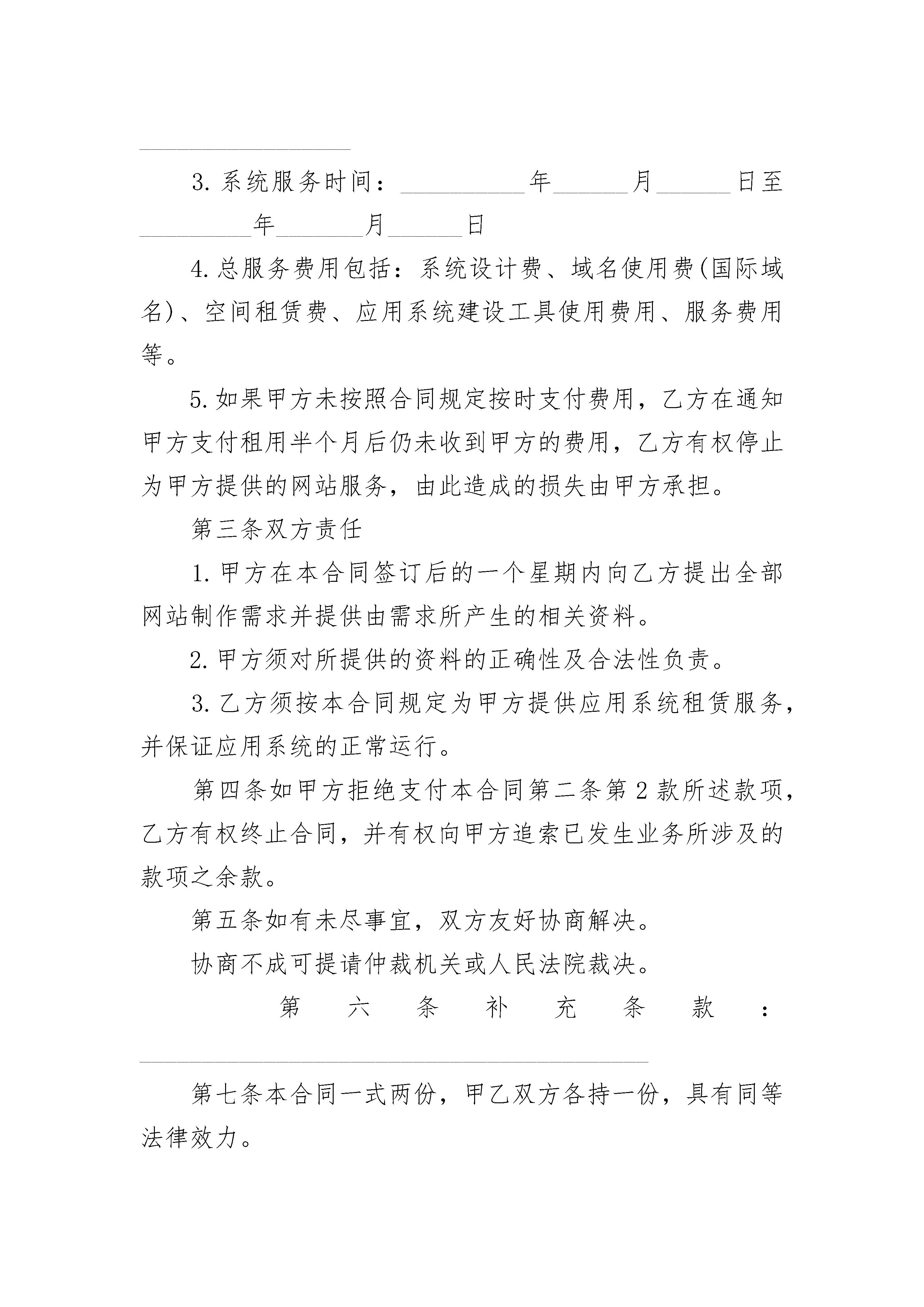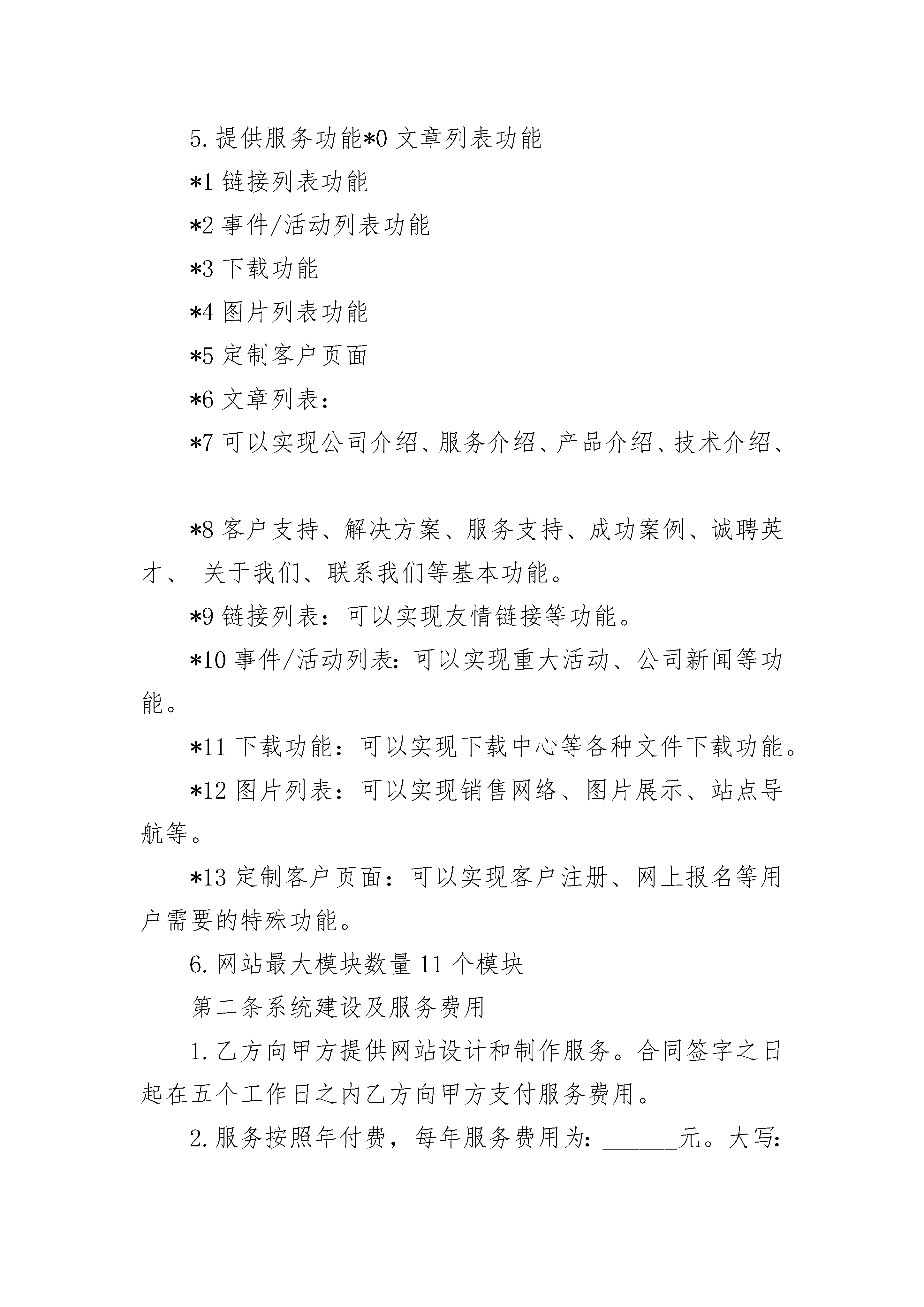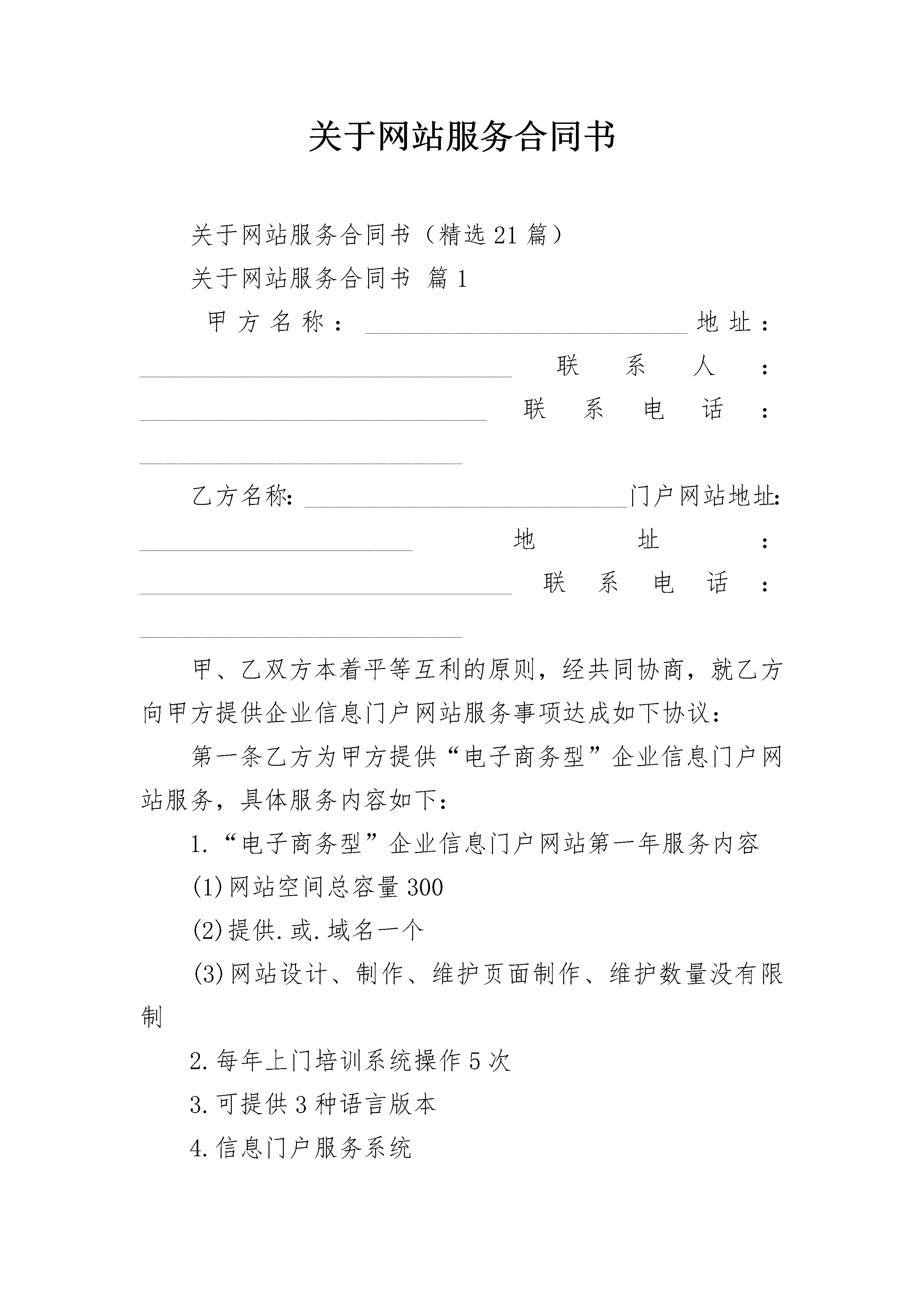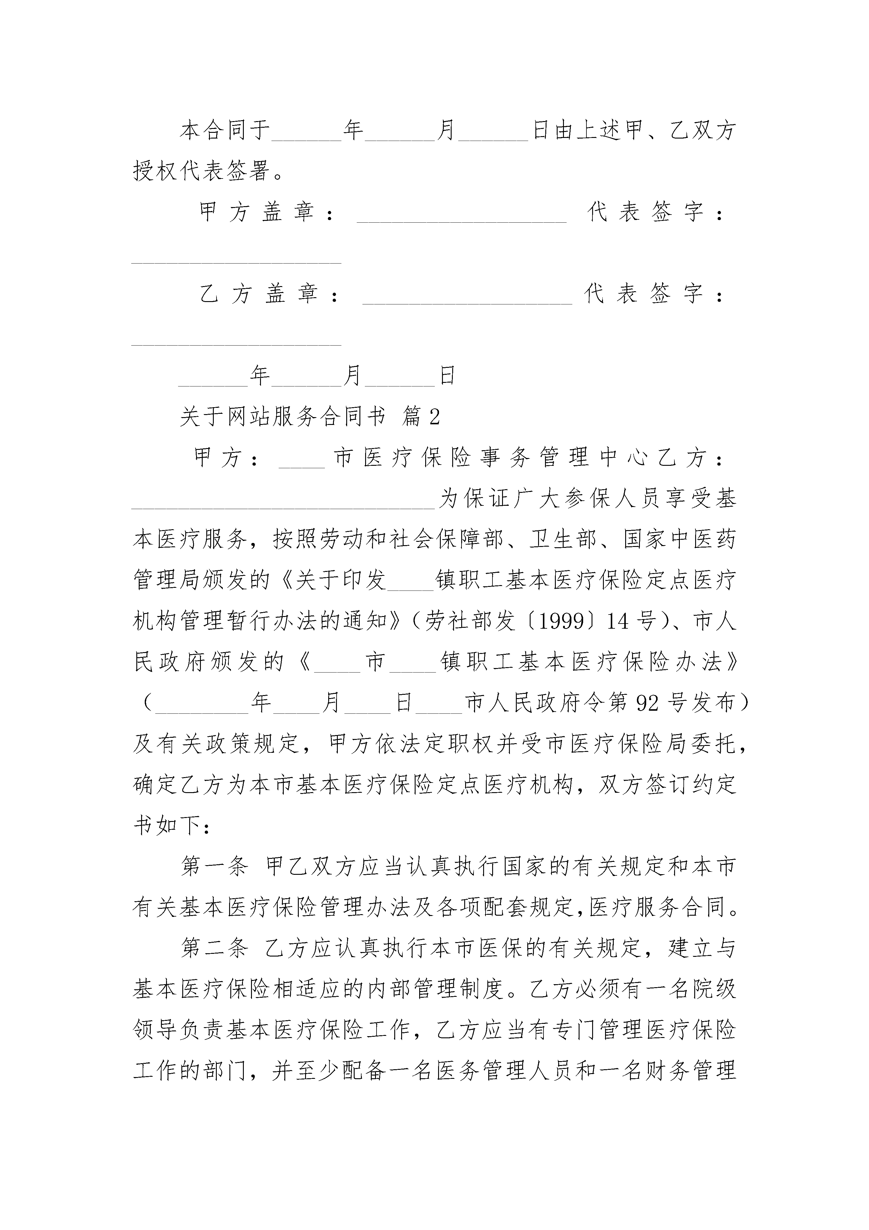 关于网站服务合同书关于网站服务合同书(精选21篇)关于网站服务合同书篇1甲方名称:__________________________地址:______________________________联系人:____________________________联系电话:__________________________乙方名称:__________________________门户网站地址:______________________地址:______________________________联系电话:__________________________甲、乙双方本着平等互利的原则,经共同协商,就乙方向甲方提供企业信息门户网站服务事项达成如下协议:第一条乙方为甲方提供“电子商务型”企业信息门户网站服务,具体服务内容如下:1.“电子商务型”企业信息门户网站第一年服务内容(1)网站空间总容量300(2)提供.或.域名一个(3)网站设计、制作、维护页面制作、维护数量没有限制2.每年上门培训系统操作5次3.可提供3种语言版本4.信息门户服务系统5.提供服务功能*0文章列表功能*1链接列表功能*2事件/活动列表功能*3下载功能*4图片列表功能*5定制客户页面*6文章列表:*7可以实现公司介绍、服务介绍、产品介绍、技术介绍、*8客户支持、解决方案、服务支持、成功案例、诚聘英才、关于我们、联系我们等基本功能。*9链接列表:可以实现友情链接等功能。*10事件/活动列表:可以实现重大活动、公司新闻等功能。*11下载功能:可以实现下载中心等各种文件下载功能。*12图片列表:可以实现销售网络、图片展示、站点导航等。*13定制客户页面:可以实现客户注册、网上报名等用户需要的特殊功能。6.网站最大模块数量11个模块第二条系统建设及服务费用1.乙方向甲方提供网站设计和制作服务。合同签字之日起在五个工作日之内乙方向甲方支付服务费用。2.服务按照年付费,每年服务费用为:______元。大写:_________________3.系统服务时间:__________年______月______日至_________年_______月______日4.总服务费用包括:系统设计费、域名使用费(国际域名)、空间租赁费、应用系统建设工具使用费用、服务费用等。5.如果甲方未按照合同规定按时支付费用,乙方在通知甲方支付租用半个月后仍未收到甲方的费用,乙方有权停止为甲方提供的网站服务,由此造成的损失由甲方承担。第三条双方责任1.甲方在本合同签订后的一个星期内向乙方提出全部网站制作需求并提供由需求所产生的相关资料。2.甲方须对所提供的资料的正确性及合法性负责。3.乙方须按本合同规定为甲方提供应用系统租赁服务,并保证应用系统的正常运行。第四条如甲方拒绝支付本合同第二条第2款所述款项,乙方有权终止合同,并有权向甲方追索已发生业务所涉及的款项之余款。第五条如有未尽事宜,双方友好协商解决。协商不成可提请仲裁机关或人民法院裁决。第六条补充条款:_________________________________________第七条本合同一式两份,甲乙双方各持一份,具有同等法律效力。本合同于______年______月______日由上述甲、乙双方授权代表签署。甲方盖章:__________________代表签字:__________________乙方盖章:__________________代表签字:________________________年______月______日关于网站服务合同书篇2甲方:____市医疗保险事务管理中心乙方:__________________________为保证广大参保人员享受基本医疗服务,按照劳动和社会保障部、卫生部、国家中医药管理局颁发的《关于印发____镇职工基本医疗保险定点医疗机构管理暂行办法的通知》(劳社部发〔1999〕14号)、市人民政府颁发的《____市____镇职工基本医疗保险办法》(________年____月____日____市人民政府令第92号发布)及有关政策规定,甲方依法定职权并受市医疗保险局委托,确定乙方为本市基本医疗保险定点医疗机构,双方签订约定书如下:第一条甲乙双方应当认真执行国家的有关规定和本市有关基本医疗保险管理办法及各项配套规定,医疗服务合同。第二条乙方应认真执行本市医保的有关规定,建立与基本医疗保险相适应的内部管理制度。乙方必须有一名院级领导负责基本医疗保险工作,乙方应当有专门管理医疗保险工作的部门,并至少配备一名医务管理人员和一名财务管理人员(二级专科医疗机构视实际情况定),与甲方共同做好定点医疗机构管理工作。乙方未按上述规定配备相关部门及其人员,甲方可通报其上级主管部门,并责令其整改。