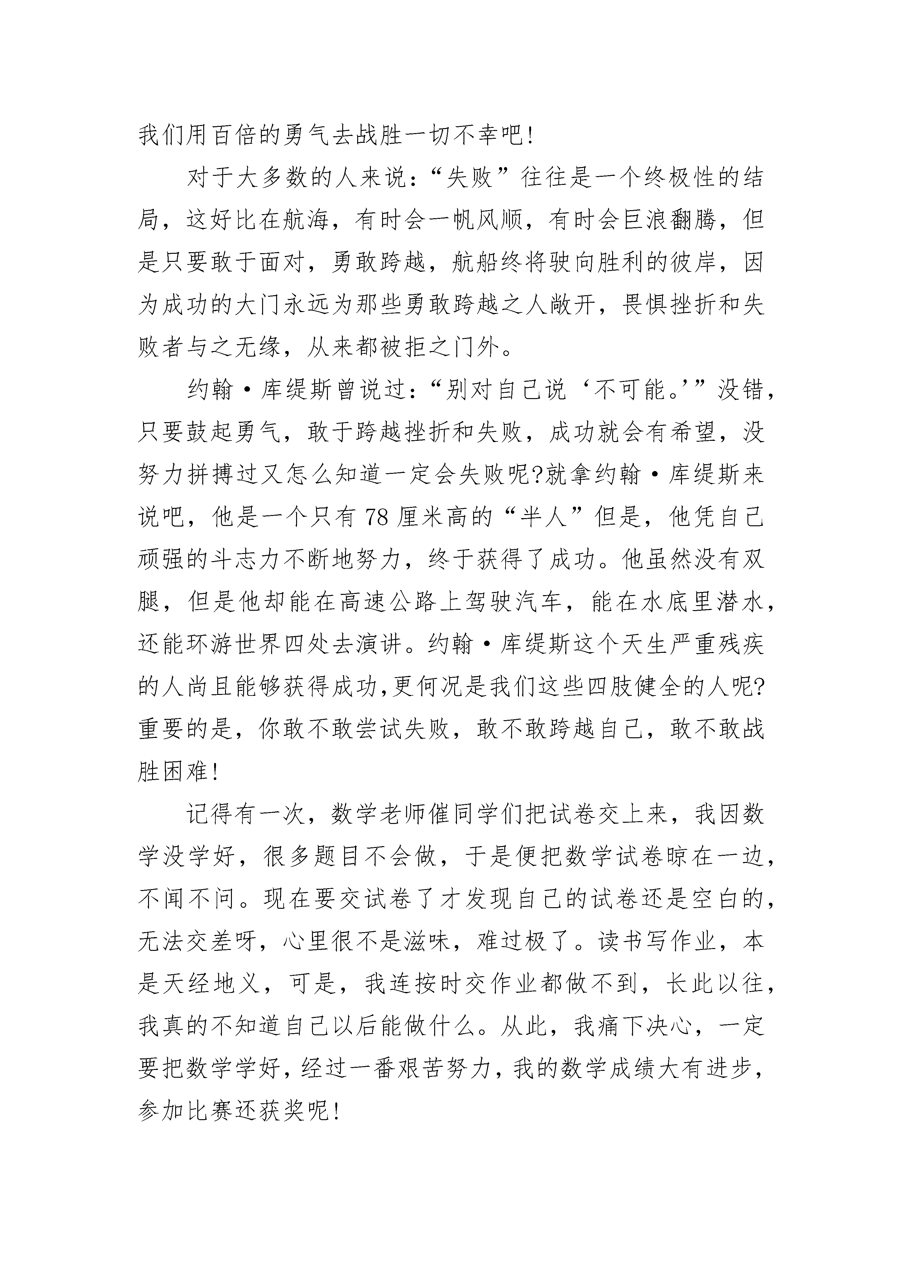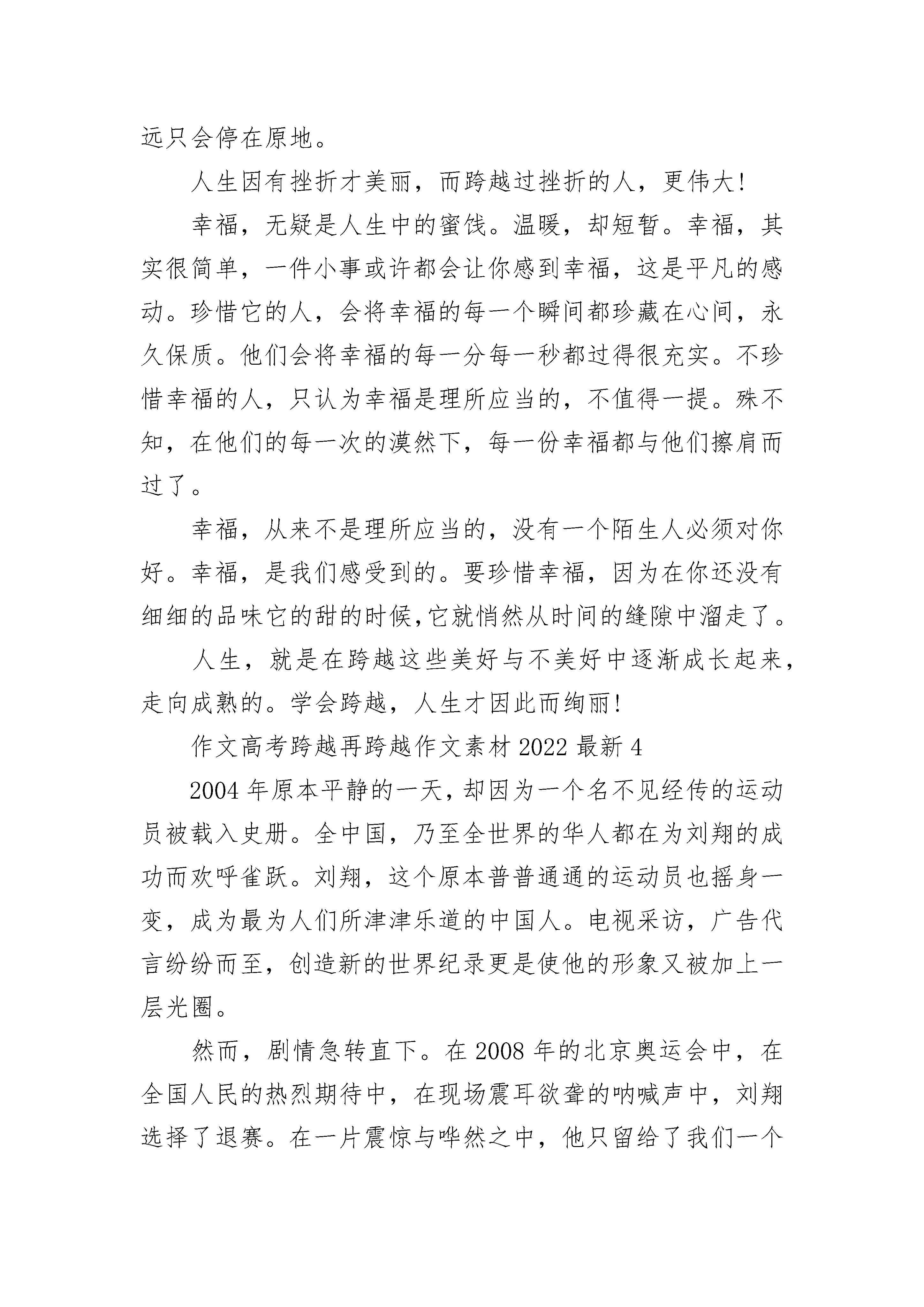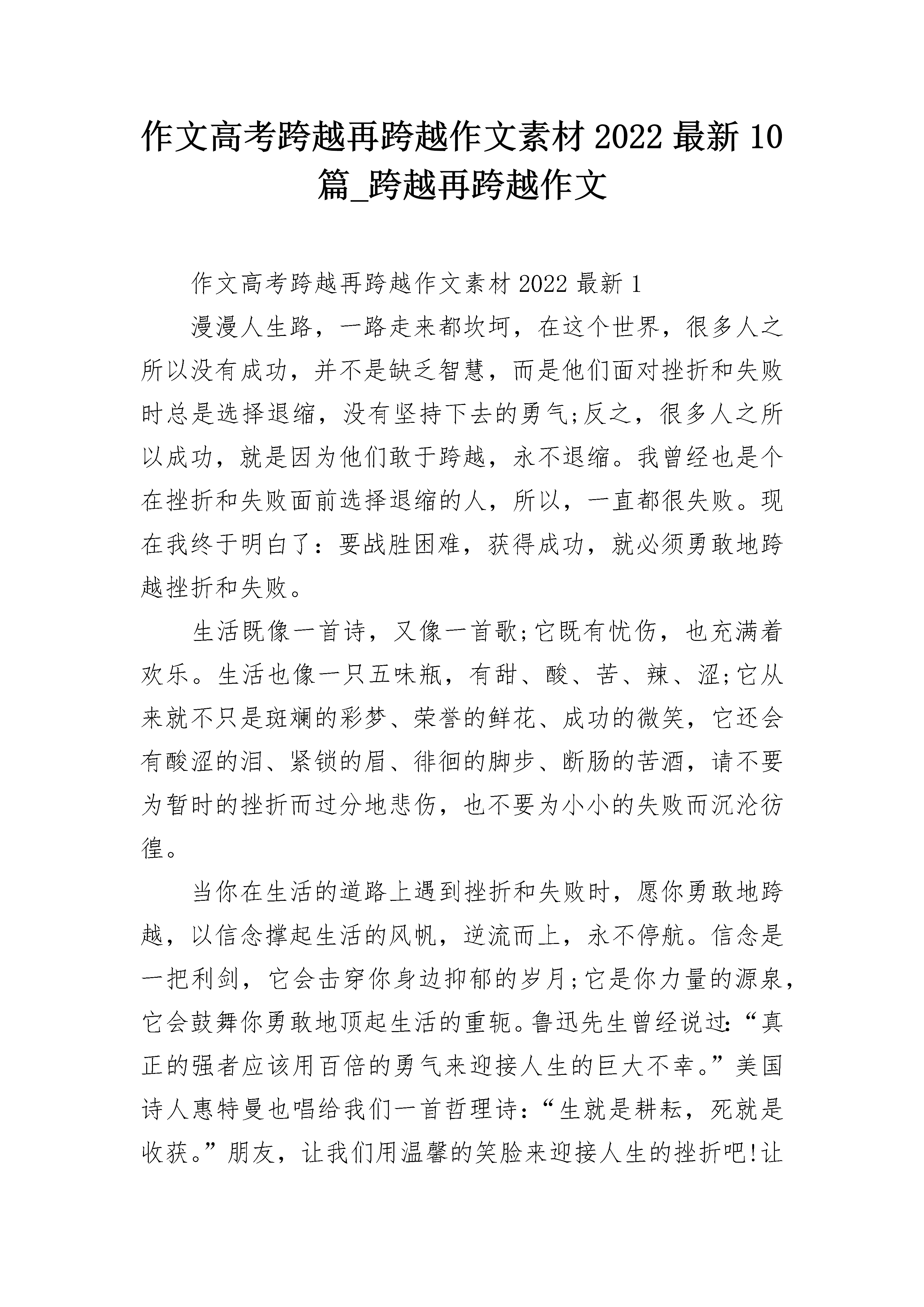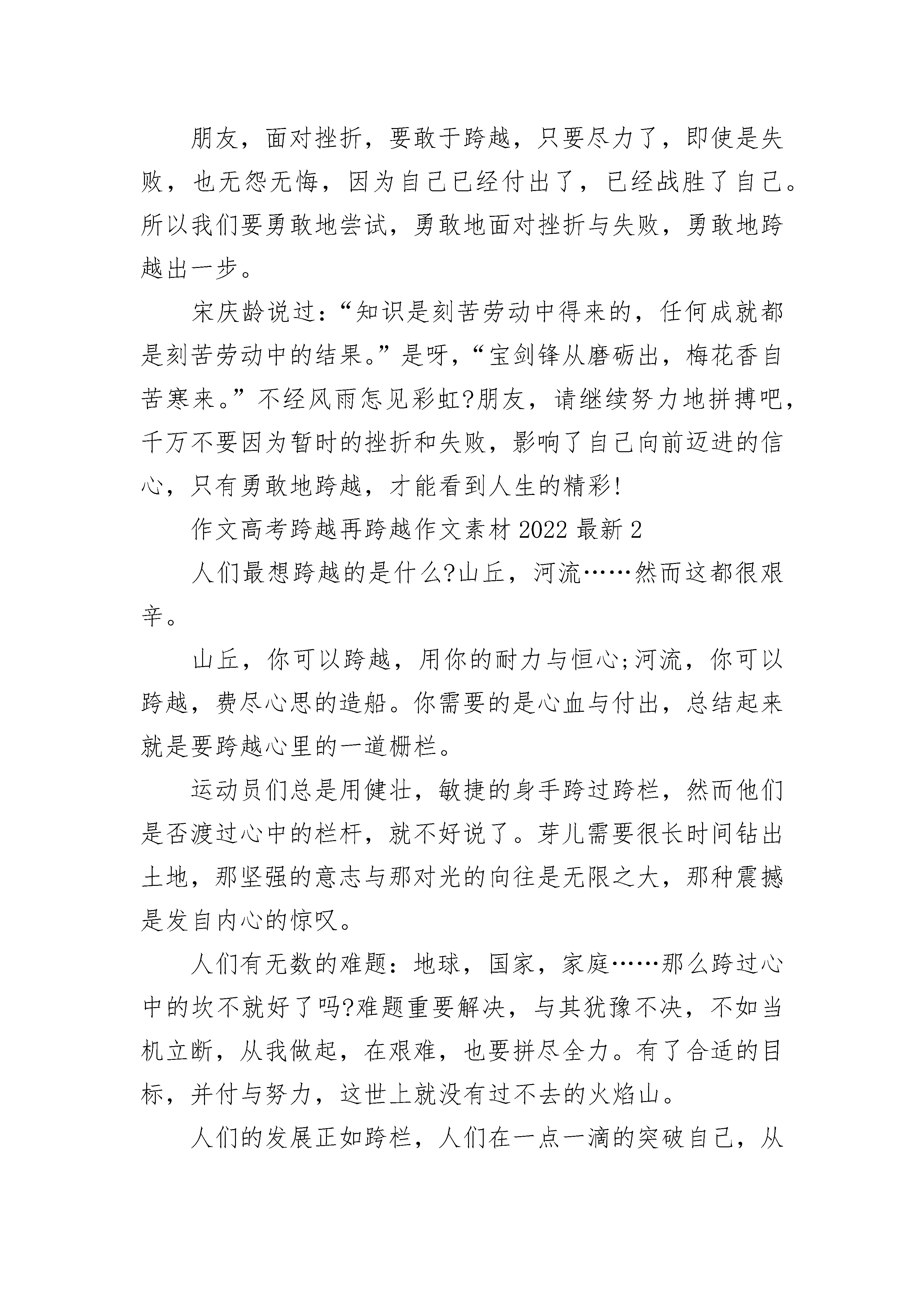 作文高考跨越再跨越作文素材2022最新10篇_跨越再跨越作文作文高考跨越再跨越作文素材2022最新1漫漫人生路,一路走来都坎坷,在这个世界,很多人之所以没有成功,并不是缺乏智慧,而是他们面对挫折和失败时总是选择退缩,没有坚持下去的勇气;反之,很多人之所以成功,就是因为他们敢于跨越,永不退缩。我曾经也是个在挫折和失败面前选择退缩的人,所以,一直都很失败。现在我终于明白了:要战胜困难,获得成功,就必须勇敢地跨越挫折和失败。生活既像一首诗,又像一首歌;它既有忧伤,也充满着欢乐。生活也像一只五味瓶,有甜、酸、苦、辣、涩;它从来就不只是斑斓的彩梦、荣誉的鲜花、成功的微笑,它还会有酸涩的泪、紧锁的眉、徘徊的脚步、断肠的苦酒,请不要为暂时的挫折而过分地悲伤,也不要为小小的失败而沉沦彷徨。当你在生活的道路上遇到挫折和失败时,愿你勇敢地跨越,以信念撑起生活的风帆,逆流而上,永不停航。信念是一把利剑,它会击穿你身边抑郁的岁月;它是你力量的源泉,它会鼓舞你勇敢地顶起生活的重轭。鲁迅先生曾经说过:“真正的强者应该用百倍的勇气来迎接人生的巨大不幸。”美国诗人惠特曼也唱给我们一首哲理诗:“生就是耕耘,死就是收获。”朋友,让我们用温馨的笑脸来迎接人生的挫折吧!让我们用百倍的勇气去战胜一切不幸吧!对于大多数的人来说:“失败”往往是一个终极性的结局,这好比在航海,有时会一帆风顺,有时会巨浪翻腾,但是只要敢于面对,勇敢跨越,航船终将驶向胜利的彼岸,因为成功的大门永远为那些勇敢跨越之人敞开,畏惧挫折和失败者与之无缘,从来都被拒之门外。约翰·库缇斯曾说过:“别对自己说‘不可能。’”没错,只要鼓起勇气,敢于跨越挫折和失败,成功就会有希望,没努力拼搏过又怎么知道一定会失败呢?就拿约翰·库缇斯来说吧,他是一个只有78厘米高的“半人”但是,他凭自己顽强的斗志力不断地努力,终于获得了成功。他虽然没有双腿,但是他却能在高速公路上驾驶汽车,能在水底里潜水,还能环游世界四处去演讲。约翰·库缇斯这个天生严重残疾的人尚且能够获得成功,更何况是我们这些四肢健全的人呢?重要的是,你敢不敢尝试失败,敢不敢跨越自己,敢不敢战胜困难!记得有一次,数学老师催同学们把试卷交上来,我因数学没学好,很多题目不会做,于是便把数学试卷晾在一边,不闻不问。现在要交试卷了才发现自己的试卷还是空白的,无法交差呀,心里很不是滋味,难过极了。读书写作业,本是天经地义,可是,我连按时交作业都做不到,长此以往,我真的不知道自己以后能做什么。从此,我痛下决心,一定要把数学学好,经过一番艰苦努力,我的数学成绩大有进步,参加比赛还获奖呢!朋友,面对挫折,要敢于跨越,只要尽力了,即使是失败,也无怨无悔,因为自己已经付出了,已经战胜了自己。所以我们要勇敢地尝试,勇敢地面对挫折与失败,勇敢地跨越出一步。宋庆龄说过:“知识是刻苦劳动中得来的,任何成就都是刻苦劳动中的结果。”是呀,“宝剑锋从磨砺出,梅花香自苦寒来。”不经风雨怎见彩虹?朋友,请继续努力地拼搏吧,千万不要因为暂时的挫折和失败,影响了自己向前迈进的信心,只有勇敢地跨越,才能看到人生的精彩!作文高考跨越再跨越作文素材2022最新2人们最想跨越的是什么?山丘,河流……然而这都很艰辛。山丘,你可以跨越,用你的耐力与恒心;河流,你可以跨越,费尽心思的造船。你需要的是心血与付出,总结起来就是要跨越心里的一道栅栏。运动员们总是用健壮,敏捷的身手跨过跨栏,然而他们是否渡过心中的栏杆,就不好说了。芽儿需要很长时间钻出土地,那坚强的意志与那对光的向往是无限之大,那种震撼是发自内心的惊叹。人们有无数的难题:地球,国家,家庭……那么跨过心中的坎不就好了吗?难题重要解决,与其犹豫不决,不如当机立断,从我做起,在艰难,也要拼尽全力。有了合适的目标,并付与努力,这世上就没有过不去的火焰山。人们的发展正如跨栏,人们在一点一滴的突破自己,从原始到奴隶制,再到后来的封建,最后是今天的现代,每一次改革都是在跨越。这一次次的跨越可谓令人敬仰不已,真是一种无尽的热情。前进一分叫跨越,前进一步也叫跨越。每一个人都希望能够超越自己,成为更好的人。没有人是完美的,但也没有人出生就有一堆堆的不足,就需要自己去跨越。没有做不到,只有不想做,加油!作文高考跨越再跨越作文素材2022最新3人生一去不复返,所有的美好与不美好,都要跨越过去。漫漫的人生长路上,有春的温情、下的喧闹、秋的悲伤、冬的寒冷。我们每个人,每一步的人生路,都在跨越着。跨越过昔日的挫折,才有今日的坚强;跨越昔日的幸福,才有今日的珍惜。我们跨越过身边每一份美好与每一份不美,乘着人生这场没有返程车票的列车,缓缓驶向终点……挫折,已成为成长中熟识的朋友。有人,会视它如洪水猛兽,慢慢的缩回自己那个狭小的龟壳之中。殊不知,逃避会让你变得越来越胆小。鹰儿没有冲上蓝天的勇