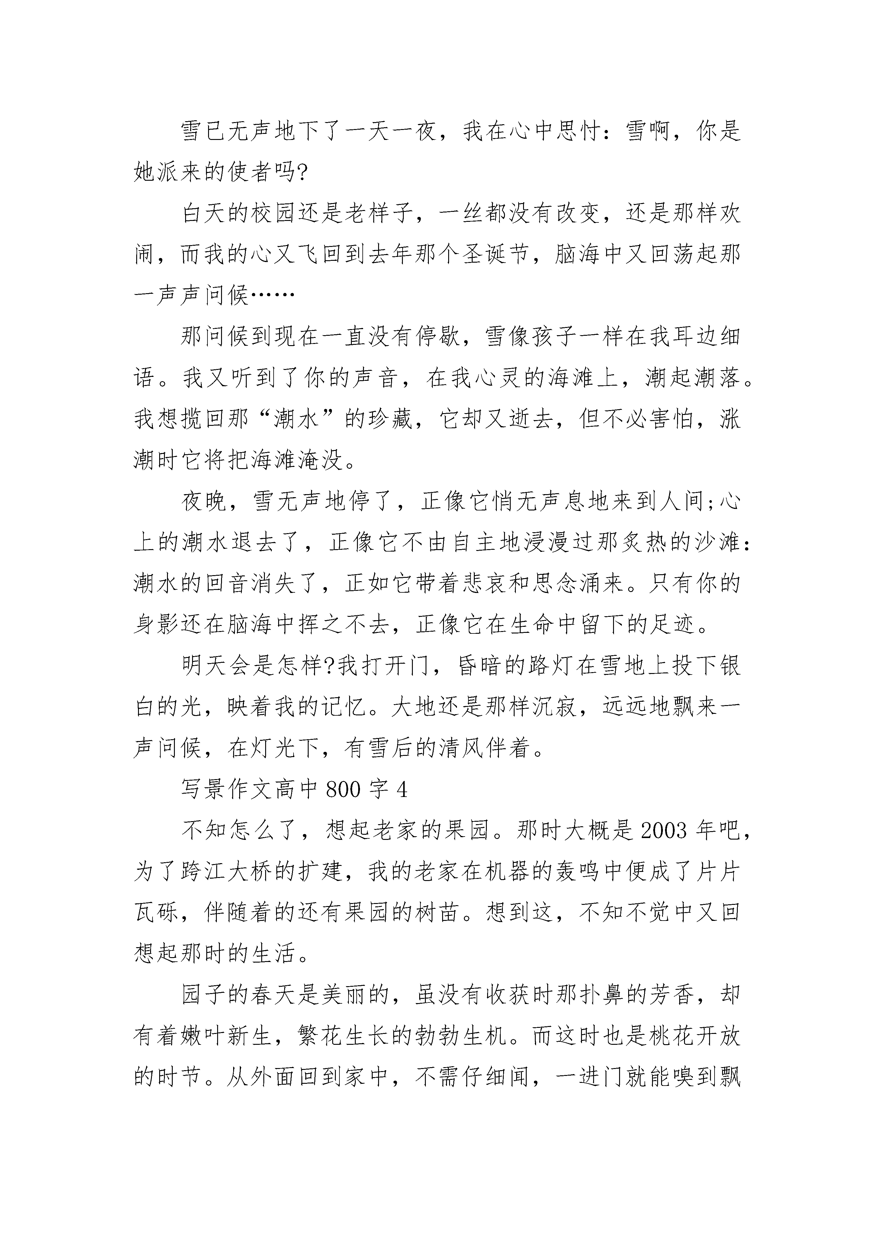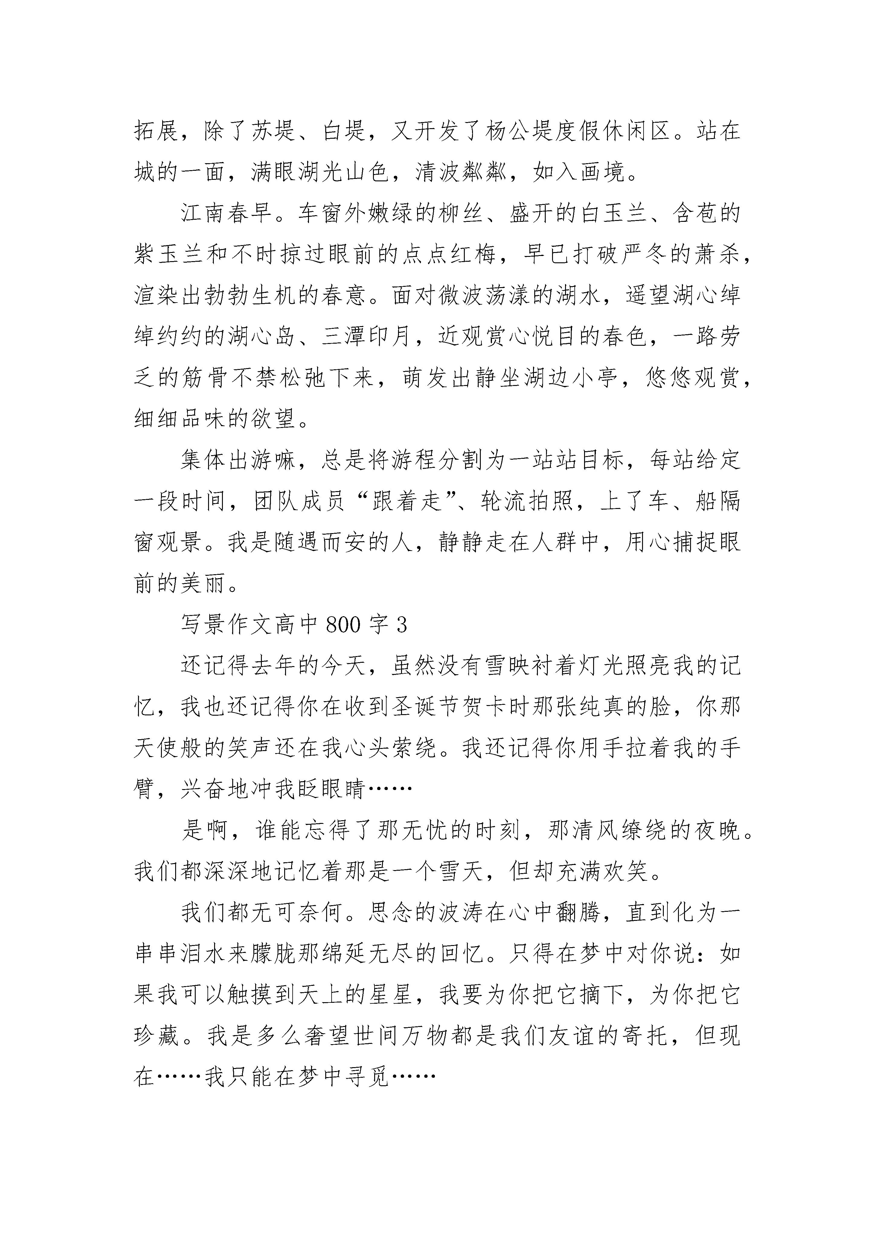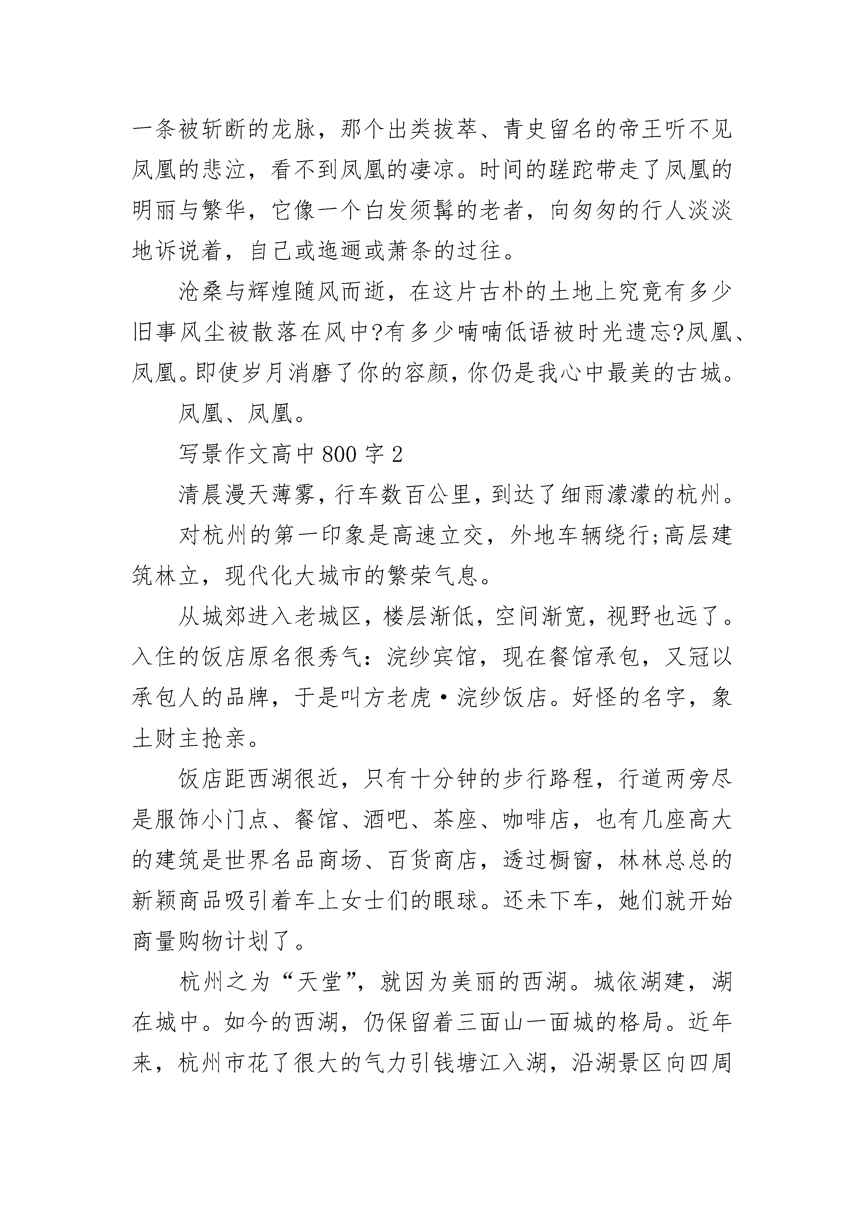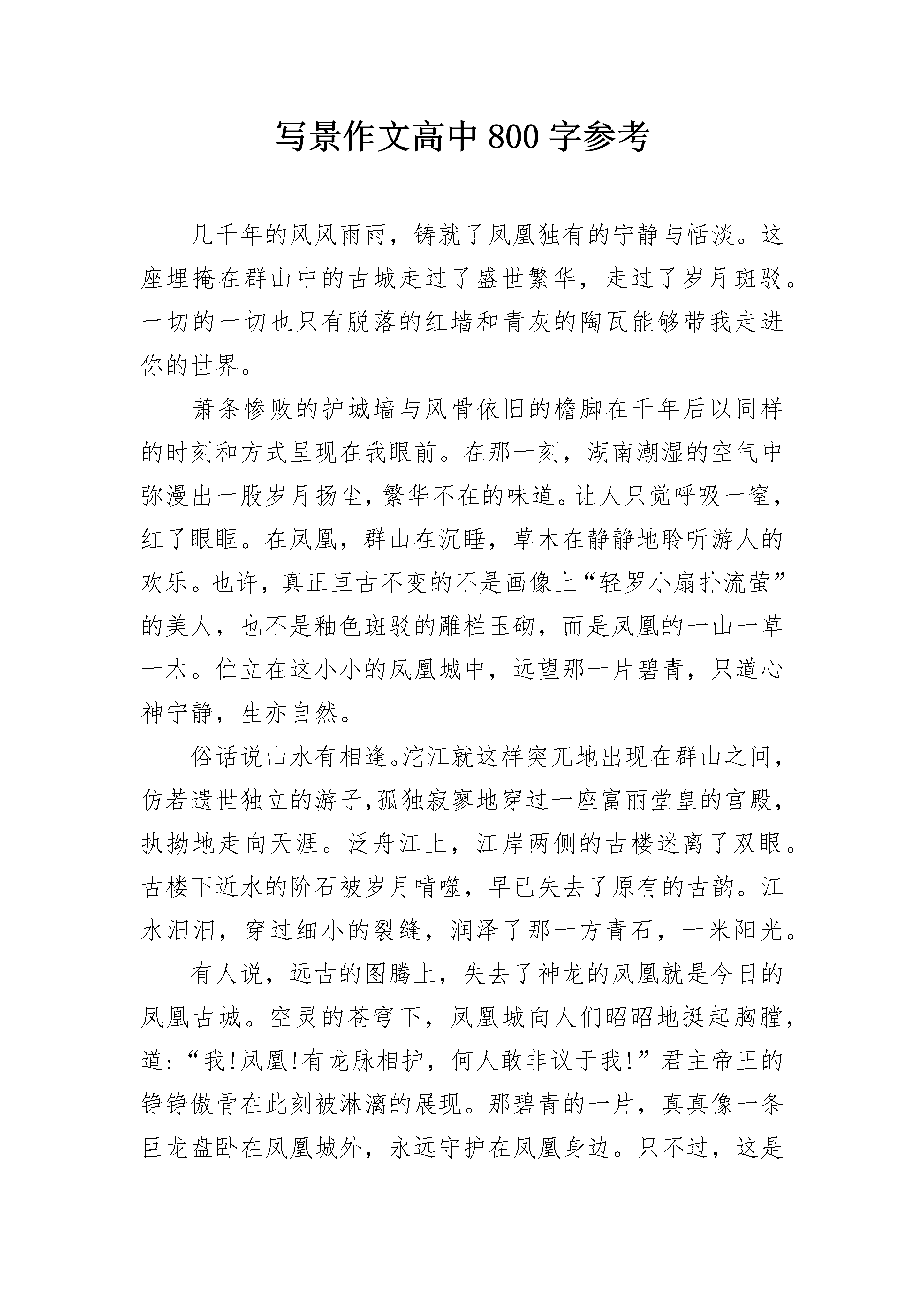写景作文高中800字参考几千年的风风雨雨,铸就了凤凰独有的宁静与恬淡。这座埋掩在群山中的古城走过了盛世繁华,走过了岁月斑驳。一切的一切也只有脱落的红墙和青灰的陶瓦能够带我走进你的世界。萧条惨败的护城墙与风骨依旧的檐脚在千年后以同样的时刻和方式呈现在我眼前。在那一刻,湖南潮湿的空气中弥漫出一股岁月扬尘,繁华不在的味道。让人只觉呼吸一窒,红了眼眶。在凤凰,群山在沉睡,草木在静静地聆听游人的欢乐。也许,真正亘古不变的不是画像上“轻罗小扇扑流萤”的美人,也不是釉色斑驳的雕栏玉砌,而是凤凰的一山一草一木。伫立在这小小的凤凰城中,远望那一片碧青,只道心神宁静,生亦自然。俗话说山水有相逢。沱江就这样突兀地出现在群山之间,仿若遗世独立的游子,孤独寂寥地穿过一座富丽堂皇的宫殿,执拗地走向天涯。泛舟江上,江岸两侧的古楼迷离了双眼。古楼下近水的阶石被岁月啃噬,早已失去了原有的古韵。江水汨汨,穿过细小的裂缝,润泽了那一方青石,一米阳光。有人说,远古的图腾上,失去了神龙的凤凰就是今日的凤凰古城。空灵的苍穹下,凤凰城向人们昭昭地挺起胸膛,道:“我!凤凰!有龙脉相护,何人敢非议于我!”君主帝王的铮铮傲骨在此刻被淋漓的展现。那碧青的一片,真真像一条巨龙盘卧在凤凰城外,永远守护在凤凰身边。只不过,这是一条被斩断的龙脉,那个出类拔萃、青史留名的帝王听不见凤凰的悲泣,看不到凤凰的凄凉。时间的蹉跎带走了凤凰的明丽与繁华,它像一个白发须髯的老者,向匆匆的行人淡淡地诉说着,自己或迤逦或萧条的过往。沧桑与辉煌随风而逝,在这片古朴的土地上究竟有多少旧事风尘被散落在风中?有多少喃喃低语被时光遗忘?凤凰、凤凰。即使岁月消磨了你的容颜,你仍是我心中最美的古城。凤凰、凤凰。写景作文高中800字2清晨漫天薄雾,行车数百公里,到达了细雨濛濛的杭州。对杭州的第一印象是高速立交,外地车辆绕行;高层建筑林立,现代化大城市的繁荣气息。从城郊进入老城区,楼层渐低,空间渐宽,视野也远了。入住的饭店原名很秀气:浣纱宾馆,现在餐馆承包,又冠以承包人的品牌,于是叫方老虎·浣纱饭店。好怪的名字,象土财主抢亲。饭店距西湖很近,只有十分钟的步行路程,行道两旁尽是服饰小门点、餐馆、酒吧、茶座、咖啡店,也有几座高大的建筑是世界名品商场、百货商店,透过橱窗,林林总总的新颖商品吸引着车上女士们的眼球。还未下车,她们就开始商量购物计划了。杭州之为“天堂”,就因为美丽的西湖。城依湖建,湖在城中。如今的西湖,仍保留着三面山一面城的格局。近年来,杭州市花了很大的气力引钱塘江入湖,沿湖景区向四周拓展,除了苏堤、白堤,又开发了杨公堤度假休闲区。站在城的一面,满眼湖光山色,清波粼粼,如入画境。江南春早。车窗外嫩绿的柳丝、盛开的白玉兰、含苞的紫玉兰和不时掠过眼前的点点红梅,早已打破严冬的萧杀,渲染出勃勃生机的春意。面对微波荡漾的湖水,遥望湖心绰绰约约的湖心岛、三潭印月,近观赏心悦目的春色,一路劳乏的筋骨不禁松弛下来,萌发出静坐湖边小亭,悠悠观赏,细细品味的欲望。集体出游嘛,总是将游程分割为一站站目标,每站给定一段时间,团队成员“跟着走”、轮流拍照,上了车、船隔窗观景。我是随遇而安的人,静静走在人群中,用心捕捉眼前的美丽。写景作文高中800字3还记得去年的今天,虽然没有雪映衬着灯光照亮我的记忆,我也还记得你在收到圣诞节贺卡时那张纯真的脸,你那天使般的笑声还在我心头萦绕。我还记得你用手拉着我的手臂,兴奋地冲我眨眼睛……是啊,谁能忘得了那无忧的时刻,那清风缭绕的夜晚。我们都深深地记忆着那是一个雪天,但却充满欢笑。我们都无可奈何。思念的波涛在心中翻腾,直到化为一串串泪水来朦胧那绵延无尽的回忆。只得在梦中对你说:如果我可以触摸到天上的星星,我要为你把它摘下,为你把它珍藏。我是多么奢望世间万物都是我们友谊的寄托,但现在……我只能在梦中寻觅……雪已无声地下了一天一夜,我在心中思忖:雪啊,你是她派来的使者吗?白天的校园还是老样子,一丝都没有改变,还是那样欢闹,而我的心又飞回到去年那个圣诞节,脑海中又回荡起那一声声问候……那问候到现在一直没有停歇,雪像孩子一样在我耳边细语。我又听到了你的声音,在我心灵的海滩上,潮起潮落。我想揽回那“潮水”的珍藏,它却又逝去,但不必害怕,涨潮时它将把海滩淹没。夜晚,雪无声地停了,正像它悄无声息地来到人间;心上的潮水退去了,正像它不由自主地浸漫过那炙热的沙滩:潮水的回音消失了,正如它带着悲哀和思念涌来。只有你的身影还在脑海中挥之不去,正像它在生命中留下的足迹。明天会是怎样?我打开门,昏暗的路灯在雪地上投下银白的光,映着我的记忆。大地还是那样沉寂,远远地飘来一声问候,在灯光下,有雪后的清风伴着。写景作文高中800字4不知怎么了,想起老家的果园。那时大概是2003年吧,为了跨江大桥的扩建,我的老家在机器的轰鸣中便成了片片