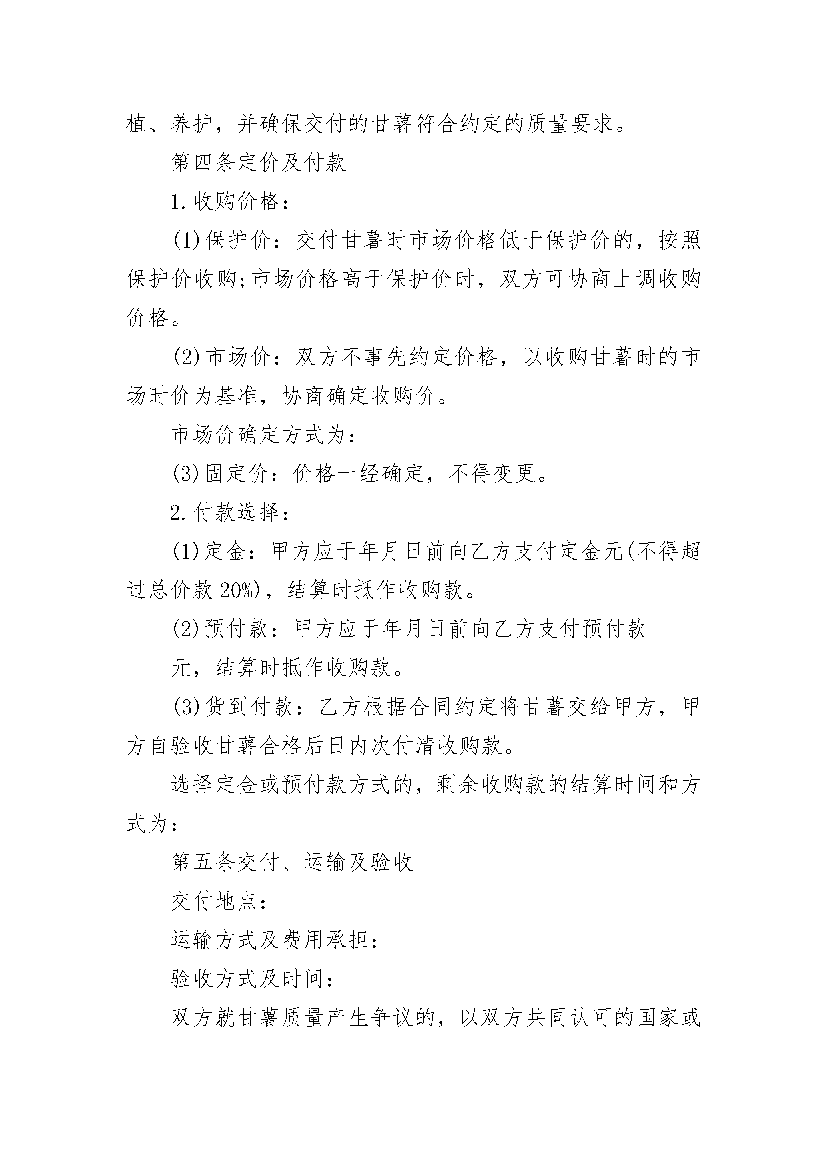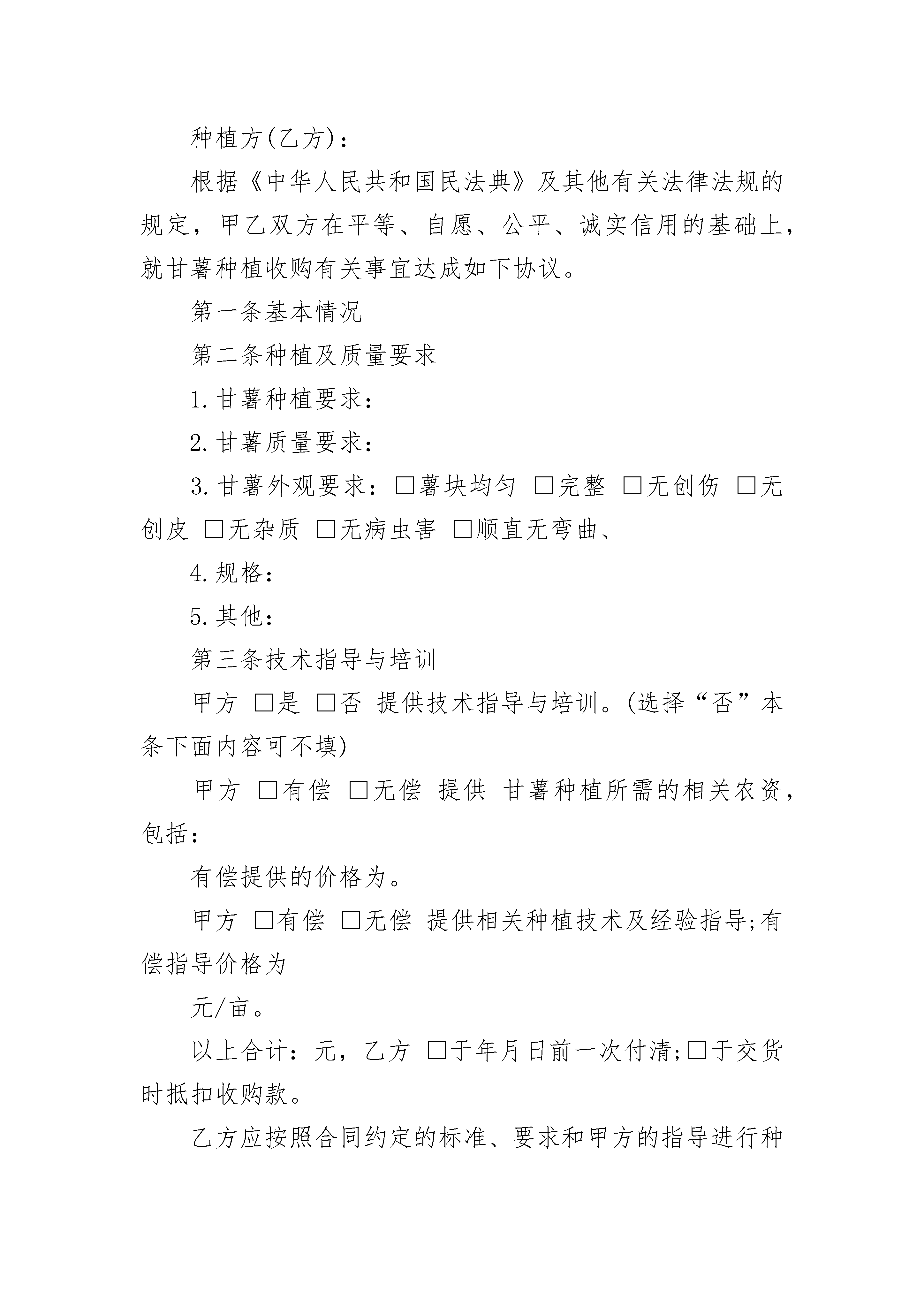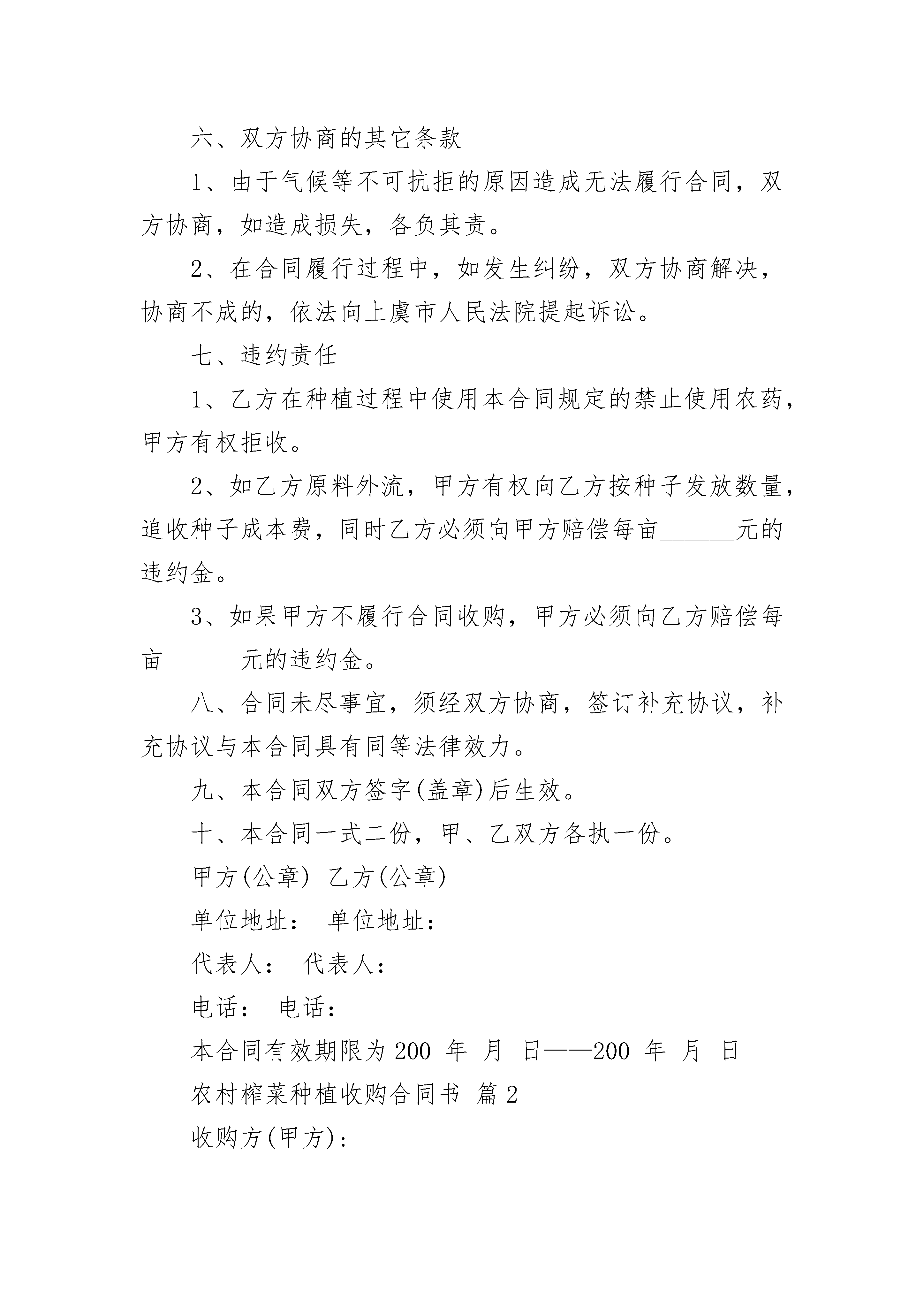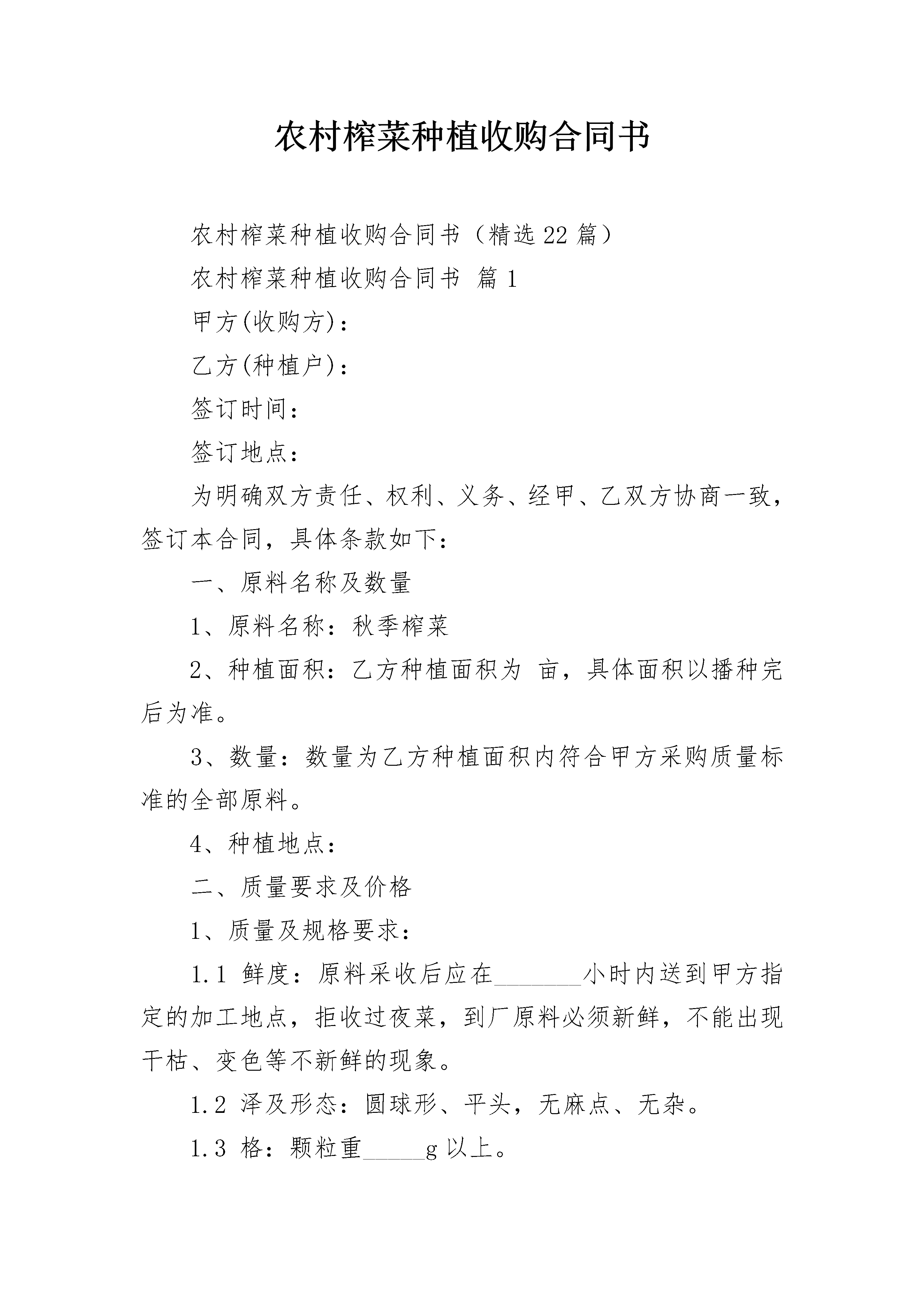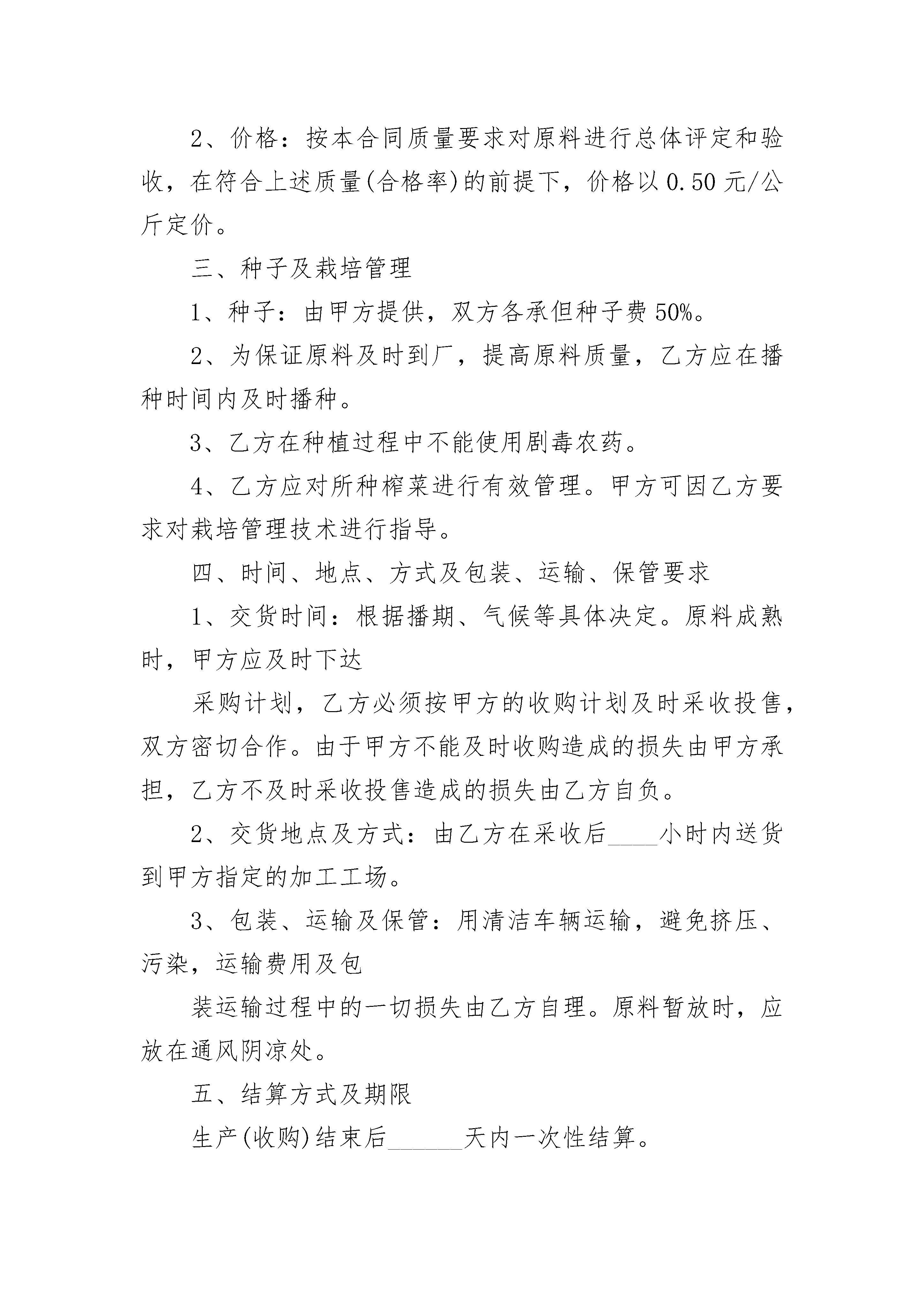 农村榨菜种植收购合同书农村榨菜种植收购合同书(精选22篇)农村榨菜种植收购合同书篇1甲方(收购方):乙方(种植户):签订时间:签订地点:为明确双方责任、权利、义务、经甲、乙双方协商一致,签订本合同,具体条款如下:一、原料名称及数量1、原料名称:秋季榨菜2、种植面积:乙方种植面积为亩,具体面积以播种完后为准。3、数量:数量为乙方种植面积内符合甲方采购质量标准的全部原料。4、种植地点:二、质量要求及价格1、质量及规格要求:1.1鲜度:原料采收后应在_______小时内送到甲方指定的加工地点,拒收过夜菜,到厂原料必须新鲜,不能出现干枯、变色等不新鲜的现象。1.2泽及形态:圆球形、平头,无麻点、无杂。1.3格:颗粒重_____g以上。2、价格:按本合同质量要求对原料进行总体评定和验收,在符合上述质量(合格率)的前提下,价格以0.50元/公斤定价。三、种子及栽培管理1、种子:由甲方提供,双方各承但种子费50%。2、为保证原料及时到厂,提高原料质量,乙方应在播种时间内及时播种。3、乙方在种植过程中不能使用剧毒农药。4、乙方应对所种榨菜进行有效管理。甲方可因乙方要求对栽培管理技术进行指导。四、时间、地点、方式及包装、运输、保管要求1、交货时间:根据播期、气候等具体决定。原料成熟时,甲方应及时下达采购计划,乙方必须按甲方的收购计划及时采收投售,双方密切合作。由于甲方不能及时收购造成的损失由甲方承担,乙方不及时采收投售造成的损失由乙方自负。2、交货地点及方式:由乙方在采收后____小时内送货到甲方指定的加工工场。3、包装、运输及保管:用清洁车辆运输,避免挤压、污染,运输费用及包装运输过程中的一切损失由乙方自理。原料暂放时,应放在通风阴凉处。五、结算方式及期限生产(收购)结束后______天内一次性结算。六、双方协商的其它条款1、由于气候等不可抗拒的原因造成无法履行合同,双方协商,如造成损失,各负其责。2、在合同履行过程中,如发生纠纷,双方协商解决,协商不成的,依法向上虞市人民法院提起诉讼。七、违约责任1、乙方在种植过程中使用本合同规定的禁止使用农药,甲方有权拒收。2、如乙方原料外流,甲方有权向乙方按种子发放数量,追收种子成本费,同时乙方必须向甲方赔偿每亩______元的违约金。3、如果甲方不履行合同收购,甲方必须向乙方赔偿每亩______元的违约金。八、合同未尽事宜,须经双方协商,签订补充协议,补充协议与本合同具有同等法律效力。九、本合同双方签字(盖章)后生效。十、本合同一式二份,甲、乙双方各执一份。甲方(公章)乙方(公章)单位地址:单位地址:代表人:代表人:电话:电话:本合同有效期限为200年月日——200年月日农村榨菜种植收购合同书篇2收购方(甲方):种植方(乙方):根据《中华人民共和国民法典》及其他有关法律法规的规定,甲乙双方在平等、自愿、公平、诚实信用的基础上,就甘薯种植收购有关事宜达成如下协议。第一条基本情况第二条种植及质量要求1.甘薯种植要求:2.甘薯质量要求:3.甘薯外观要求:□薯块均匀□完整□无创伤□无创皮□无杂质□无病虫害□顺直无弯曲、4.规格:5.其他:第三条技术指导与培训甲方□是□否提供技术指导与培训。(选择“否”本条下面内容可不填)甲方□有偿□无偿提供甘薯种植所需的相关农资,包括:有偿提供的价格为。甲方□有偿□无偿提供相关种植技术及经验指导;有偿指导价格为元/亩。以上合计:元,乙方□于年月日前一次付清;□于交货时抵扣收购款。乙方应按照合同约定的标准、要求和甲方的指导进行种植、养护,并确保交付的甘薯符合约定的质量要求。第四条定价及付款1.收购价格:(1)保护价:交付甘薯时市场价格低于保护价的,按照保护价收购;市场价格高于保护价时,双方可协商上调收购价格。(2)市场价:双方不事先约定价格,以收购甘薯时的市场时价为基准,协商确定收购价。市场价确定方式为:(3)固定价:价格一经确定,不得变更。2.付款选择:(1)定金:甲方应于年月日前向乙方支付定金元(不得超过总价款20%),结算时抵作收购款。(2)预付款:甲方应于年月日前向乙方支付预付款元,结算时抵作收购款。(3)货到付款:乙方根据合同约定将甘薯交给甲方,甲方自验收甘薯合格后日内次付清收购款。选择定金或预付款方式的,剩余收购款的结算时间和方式为:第五条交付、运输及验收交付地点:运输方式及费用承担:验收方式及时间:双方就甘薯质量产生争议的,以双方共同认可的国家或地方质量鉴定机构的鉴定结果为准。第六条违约责任1.甲方迟延支付收购款或乙方迟延交付甘薯的,应当每日按照迟延部分价款%的标准向对方支付违约金。2.乙方交付的甘薯不符合约定质量要求或掺入其他品种的,甲方有权书面通知乙方拒收,或要求乙方采取退、换货或降价等补救措施,由此发生的费用或造成的损失由乙方承担。3.乙方不交付甘薯或擅