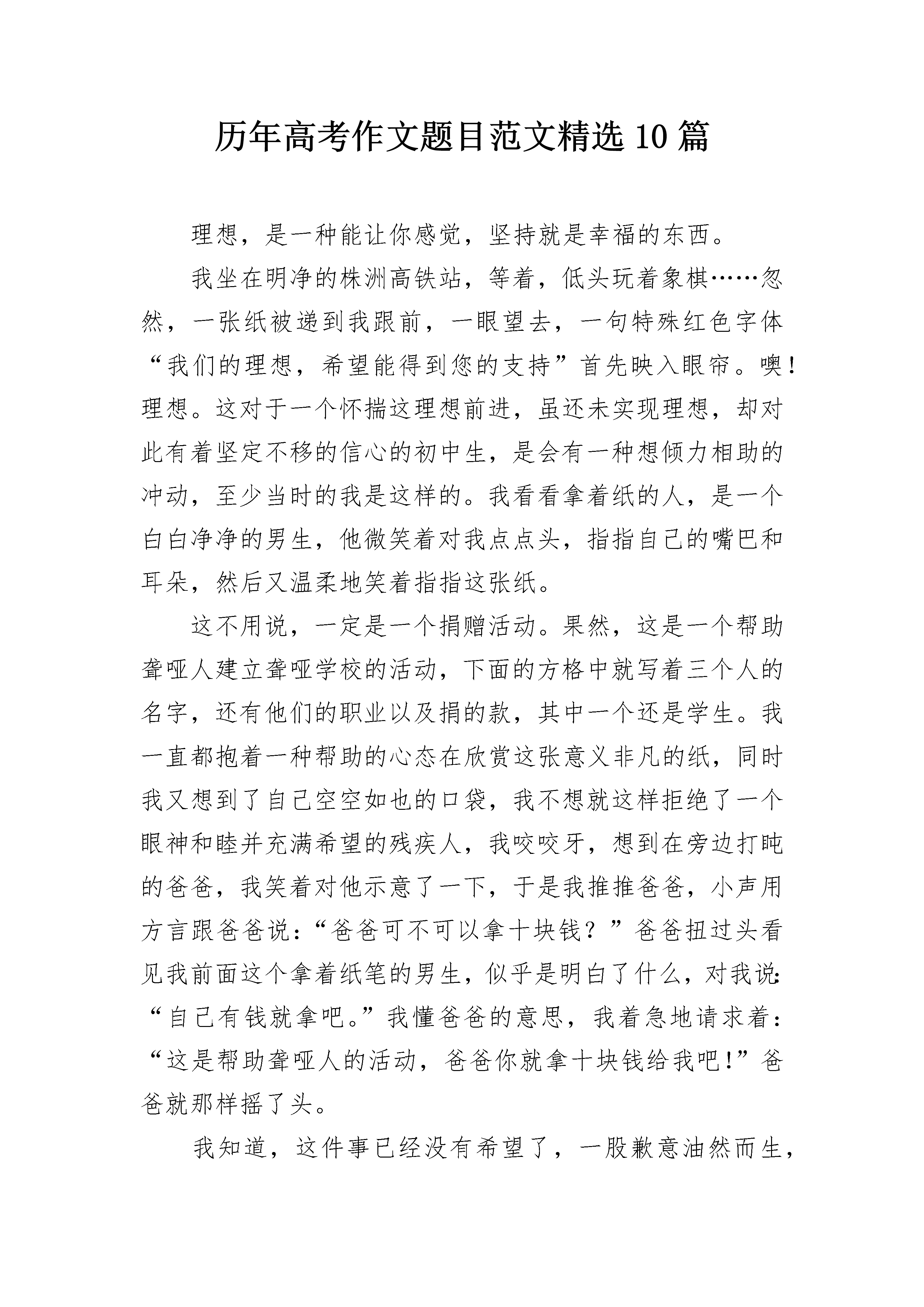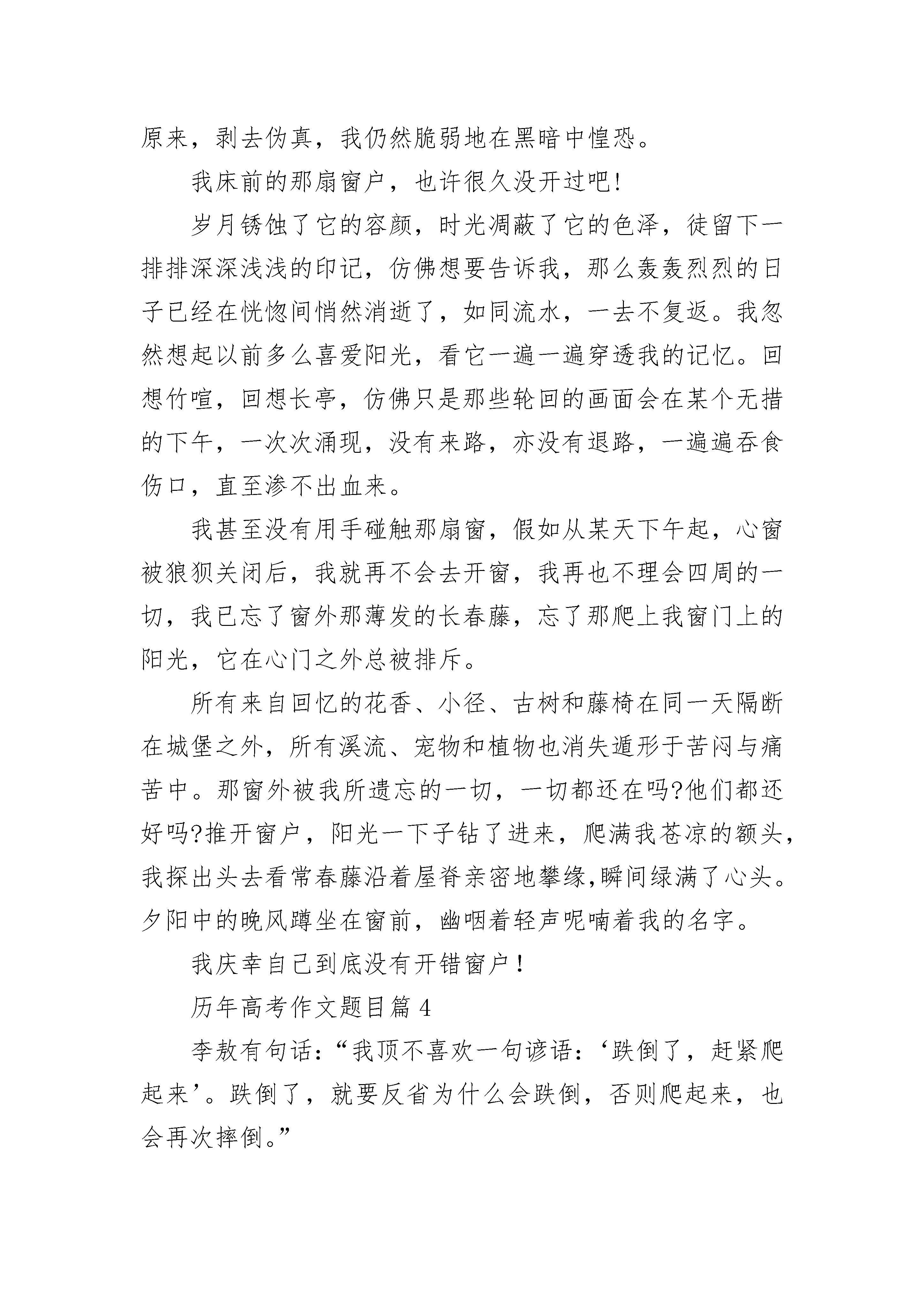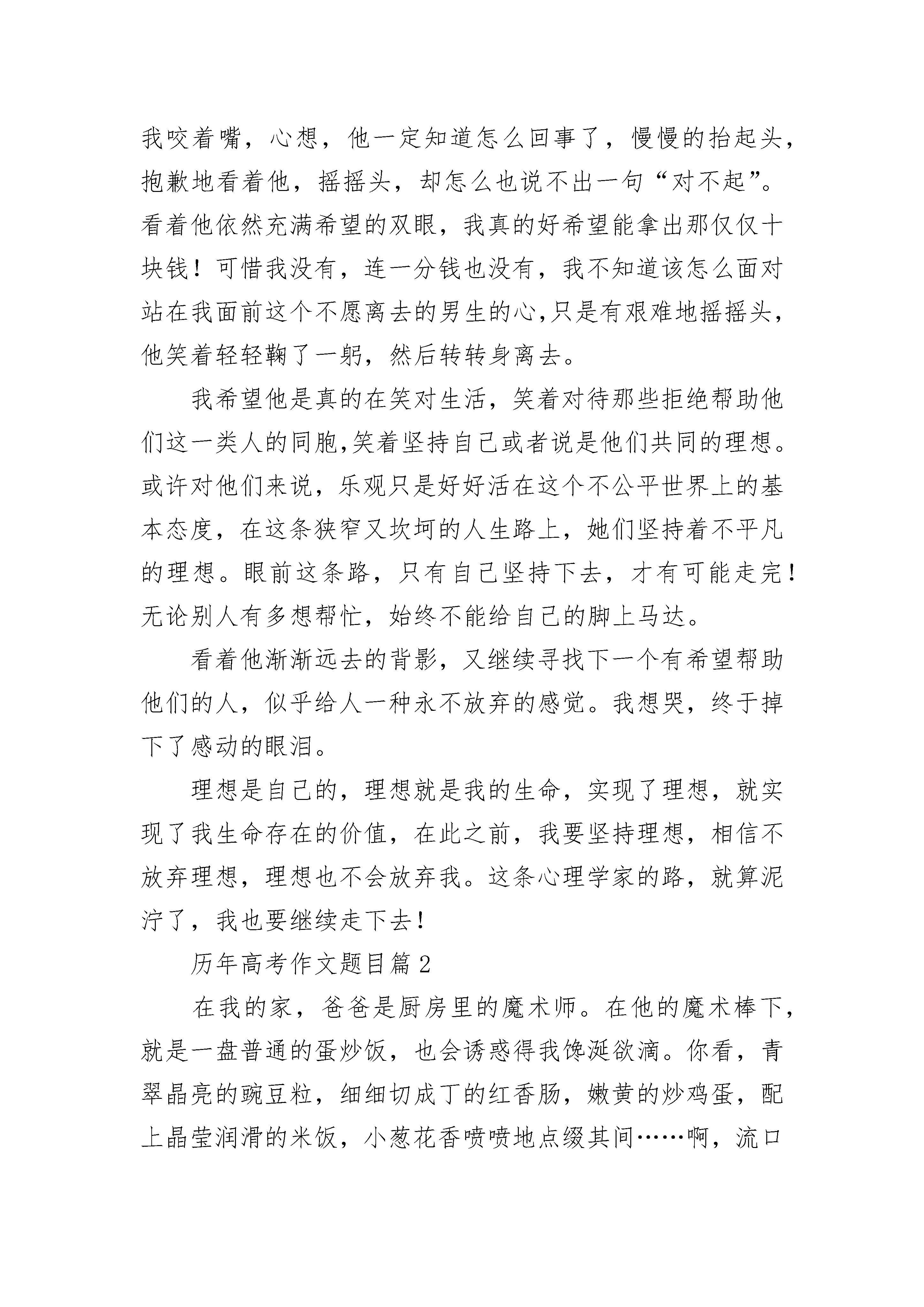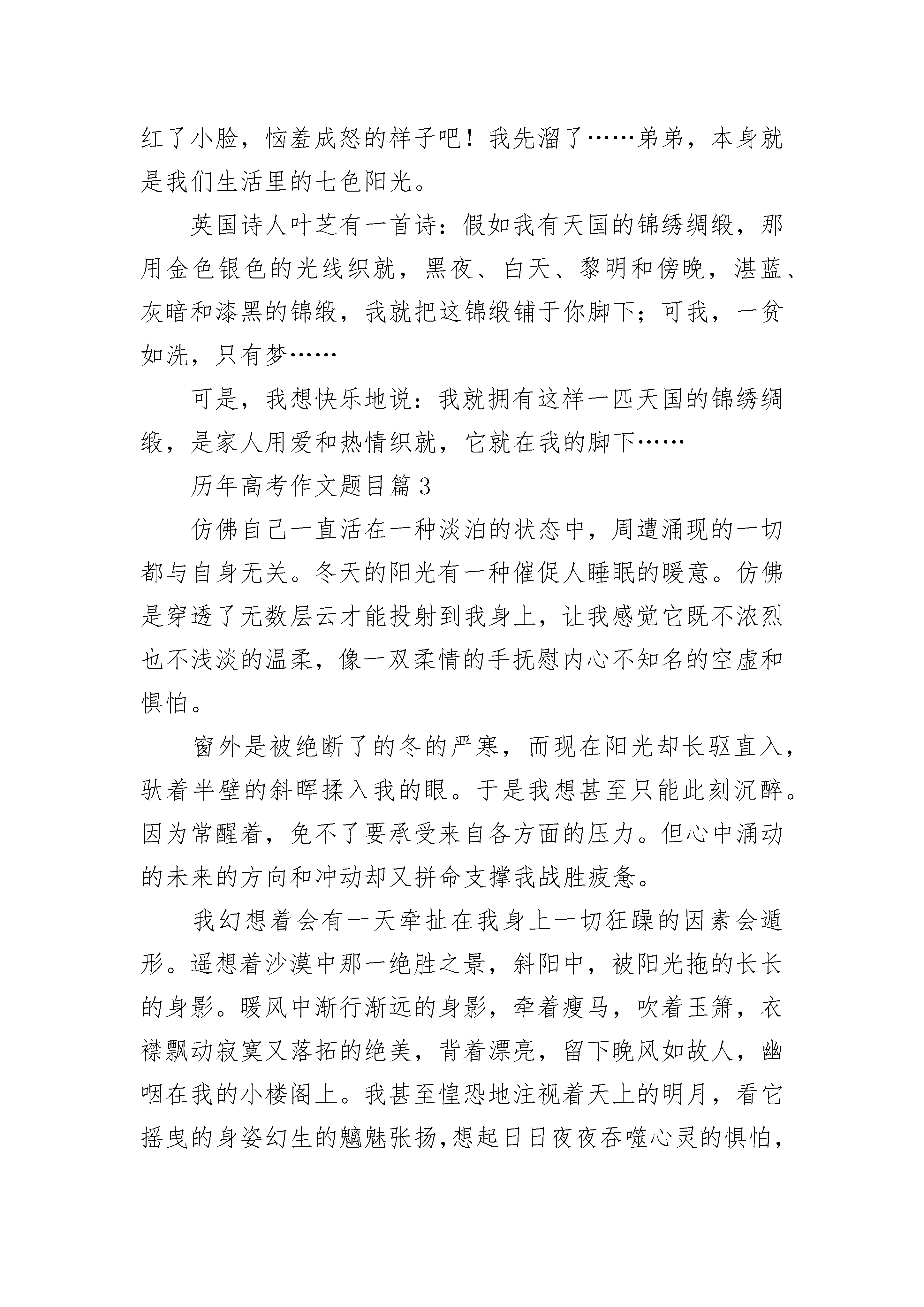 历年高考作文题目范文精选10篇理想,是一种能让你感觉,坚持就是幸福的东西。我坐在明净的株洲高铁站,等着,低头玩着象棋……忽然,一张纸被递到我跟前,一眼望去,一句特殊红色字体“我们的理想,希望能得到您的支持”首先映入眼帘。噢!理想。这对于一个怀揣这理想前进,虽还未实现理想,却对此有着坚定不移的信心的初中生,是会有一种想倾力相助的冲动,至少当时的我是这样的。我看看拿着纸的人,是一个白白净净的男生,他微笑着对我点点头,指指自己的嘴巴和耳朵,然后又温柔地笑着指指这张纸。这不用说,一定是一个捐赠活动。果然,这是一个帮助聋哑人建立聋哑学校的活动,下面的方格中就写着三个人的名字,还有他们的职业以及捐的款,其中一个还是学生。我一直都抱着一种帮助的心态在欣赏这张意义非凡的纸,同时我又想到了自己空空如也的口袋,我不想就这样拒绝了一个眼神和睦并充满希望的残疾人,我咬咬牙,想到在旁边打盹的爸爸,我笑着对他示意了一下,于是我推推爸爸,小声用方言跟爸爸说:“爸爸可不可以拿十块钱?”爸爸扭过头看见我前面这个拿着纸笔的男生,似乎是明白了什么,对我说:“自己有钱就拿吧。”我懂爸爸的意思,我着急地请求着:“这是帮助聋哑人的活动,爸爸你就拿十块钱给我吧!”爸爸就那样摇了头。我知道,这件事已经没有希望了,一股歉意油然而生,我咬着嘴,心想,他一定知道怎么回事了,慢慢的抬起头,抱歉地看着他,摇摇头,却怎么也说不出一句“对不起”。看着他依然充满希望的双眼,我真的好希望能拿出那仅仅十块钱!可惜我没有,连一分钱也没有,我不知道该怎么面对站在我面前这个不愿离去的男生的心,只是有艰难地摇摇头,他笑着轻轻鞠了一躬,然后转转身离去。我希望他是真的在笑对生活,笑着对待那些拒绝帮助他们这一类人的同胞,笑着坚持自己或者说是他们共同的理想。或许对他们来说,乐观只是好好活在这个不公平世界上的基本态度,在这条狭窄又坎坷的人生路上,她们坚持着不平凡的理想。眼前这条路,只有自己坚持下去,才有可能走完!无论别人有多想帮忙,始终不能给自己的脚上马达。看着他渐渐远去的背影,又继续寻找下一个有希望帮助他们的人,似乎给人一种永不放弃的感觉。我想哭,终于掉下了感动的眼泪。理想是自己的,理想就是我的生命,实现了理想,就实现了我生命存在的价值,在此之前,我要坚持理想,相信不放弃理想,理想也不会放弃我。这条心理学家的路,就算泥泞了,我也要继续走下去!历年高考作文题目篇2在我的家,爸爸是厨房里的魔术师。在他的魔术棒下,就是一盘普通的蛋炒饭,也会诱惑得我馋涎欲滴。你看,青翠晶亮的豌豆粒,细细切成丁的红香肠,嫩黄的炒鸡蛋,配上晶莹润滑的米饭,小葱花香喷喷地点缀其间……啊,流口水了吗?哈,就不提爸爸的水煮活鱼了吧?闭起眼睛,想象一下爸爸把那个热气腾腾的铁盆往饭桌中间一放的情景吧!白色的鱼片乖乖仰卧,青瓜绿得很招摇,亮晶晶的红辣椒发出“兹兹”的轻响……嘿,香气顺着我的鼻孔一路往下传,从口里到胃里。不知不觉,爸爸的美味在我心中幻化出生活的五彩斑斓。常常觉得,妈妈特别适合我家的小院。最爱看她身着宽松的衣裙,提一把喷壶在喷花。院子里有各色的玫瑰,鲜红的,粉红的,柠檬黄的,桔黄的,还有紫色的薰衣草,白色的栀子花和茉莉,都是妈妈亲手栽下的。她乳白色的上衣,幽绿的长裙,黑发在脑后松松地挽着,在花丛中就是一幅美丽的画。阳光灿烂的星期天,妈妈会叫我帮她晾衣服,微风轻拂,粉红色的被单和白色的衬衣在阳光下闪着金光,而背后,是院子里深深浅浅的绿。人们都说,妈妈是上天派来的天使。每当这时,我就深信不疑,妈妈原来在天上,是负责调色的。在她的调理下,我的生活色彩缤纷。弟弟白白净净,长着一个大圆脑袋。不知怎么的,我却觉得他是一只鹅黄的小鸡,有着红色的尖尖嘴。每天,弟弟都会给我们制造笑料。“姐姐,我考考你,2加2等于多少?”我知道,他只懂得2加2,3加3,……9加9。每次答对了他都很高兴,并且以此炫耀。现在,让我捉弄他一下。我说:“我自己算,你要告诉我对不对。2加2等于4。”“对!”“3加3等于6。”“对!”“10加12等于20。”“对!”弟弟不知是陷阱,煞有介事地点头。哈哈!是不是很好玩?等着看他涨红了小脸,恼羞成怒的样子吧!我先溜了……弟弟,本身就是我们生活里的七色阳光。英国诗人叶芝有一首诗:假如我有天国的锦绣绸缎,那用金色银色的光线织就,黑夜、白天、黎明和傍晚,湛蓝、灰暗和漆黑的锦缎,我就把这锦缎铺于你脚下;可我,一贫如洗,只有梦……可是,我想快乐地说:我就拥有这样一匹天国的锦绣绸缎,是家人用爱和热情织就,它就在我的脚下……历年高考作文题目篇3仿佛自己一直活在一种淡泊的状态中,周遭涌现的一切都与自身无关。冬天的阳光有一种催促人睡眠的暖意。仿佛是穿透了无数层云才能投射到我身上,让我感觉它既不浓烈也不浅淡的温柔,像一双柔情的手抚慰内心不知名的空虚和惧怕