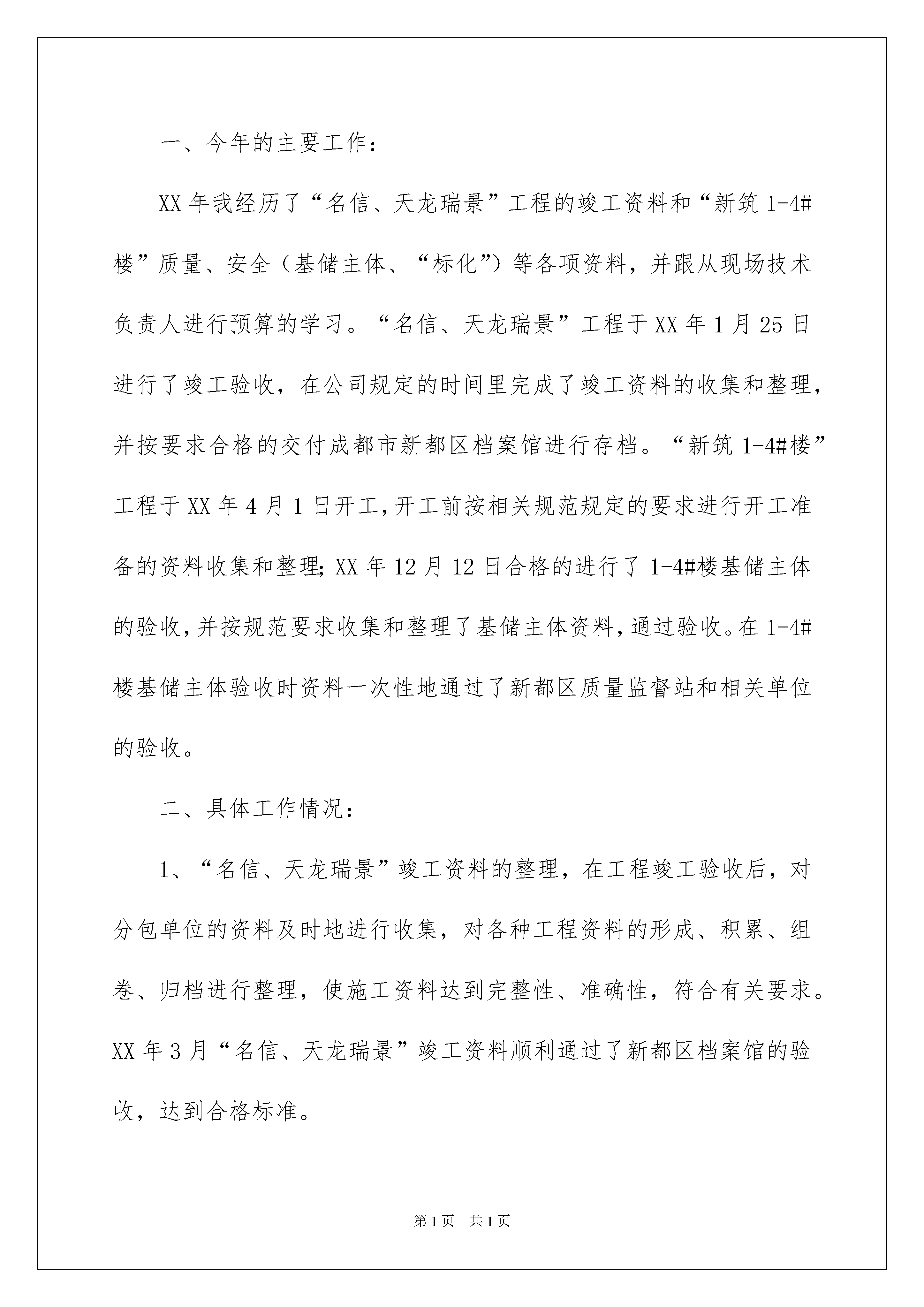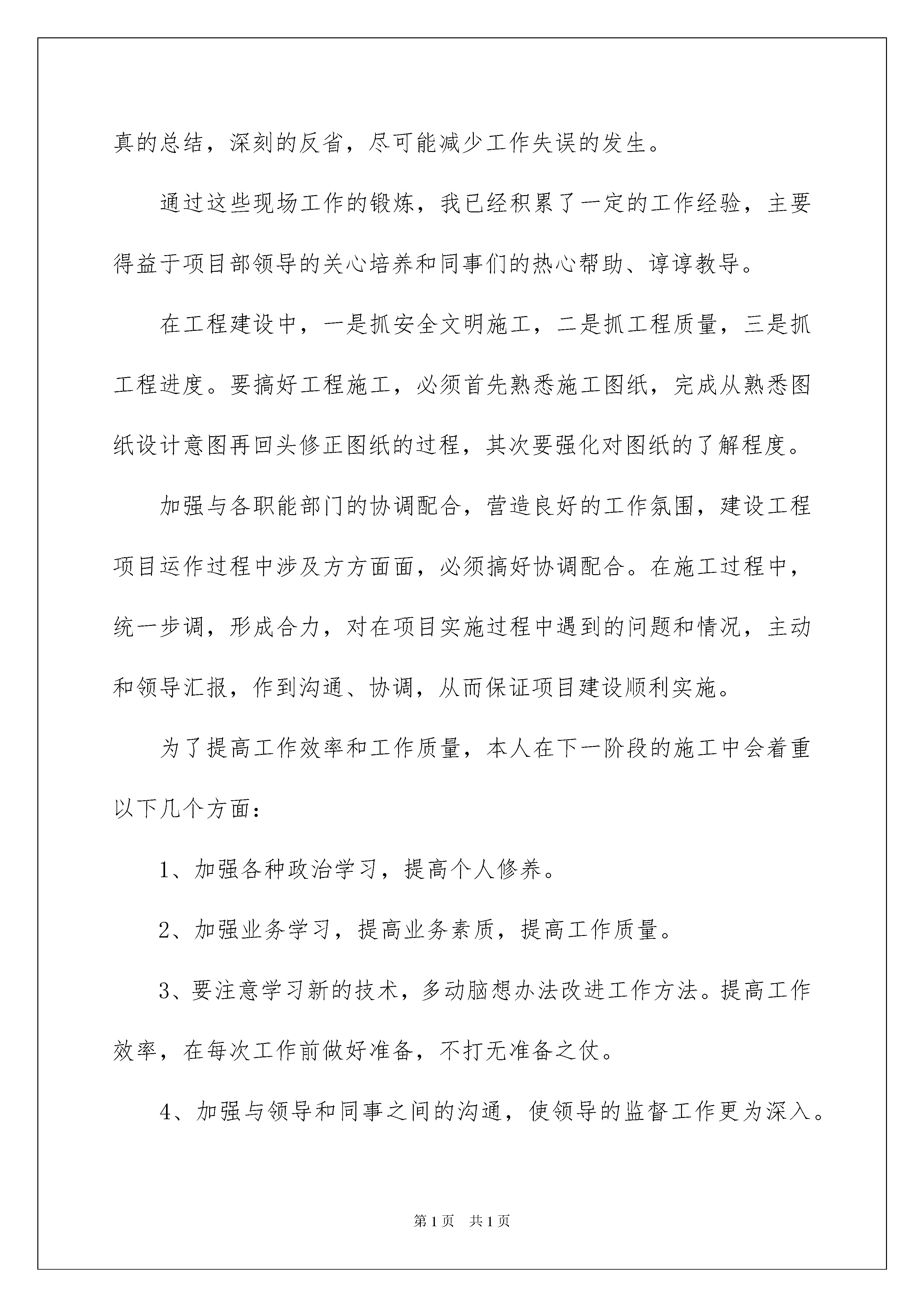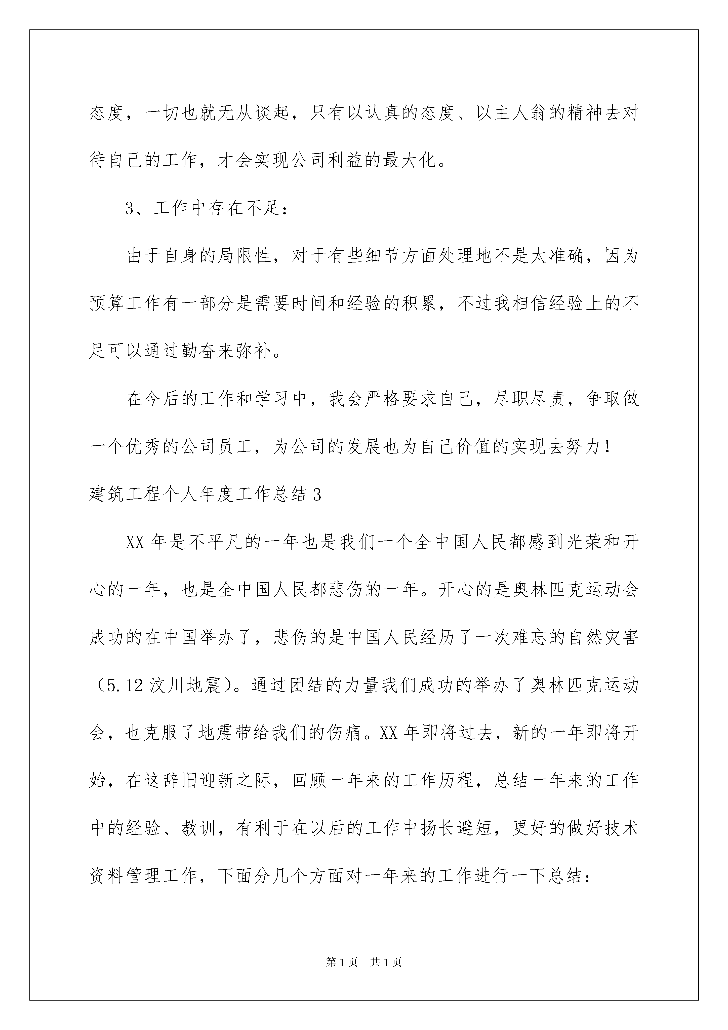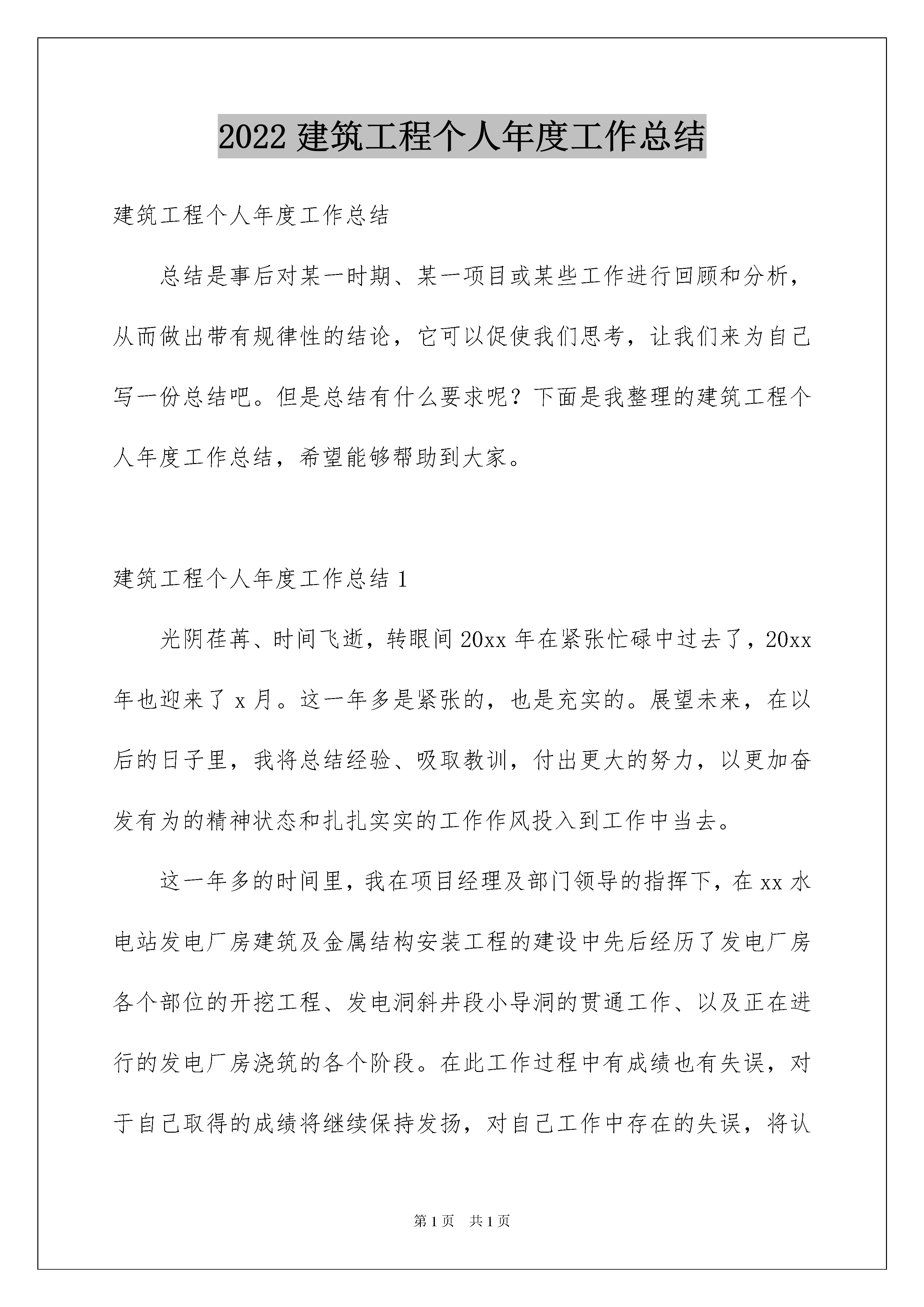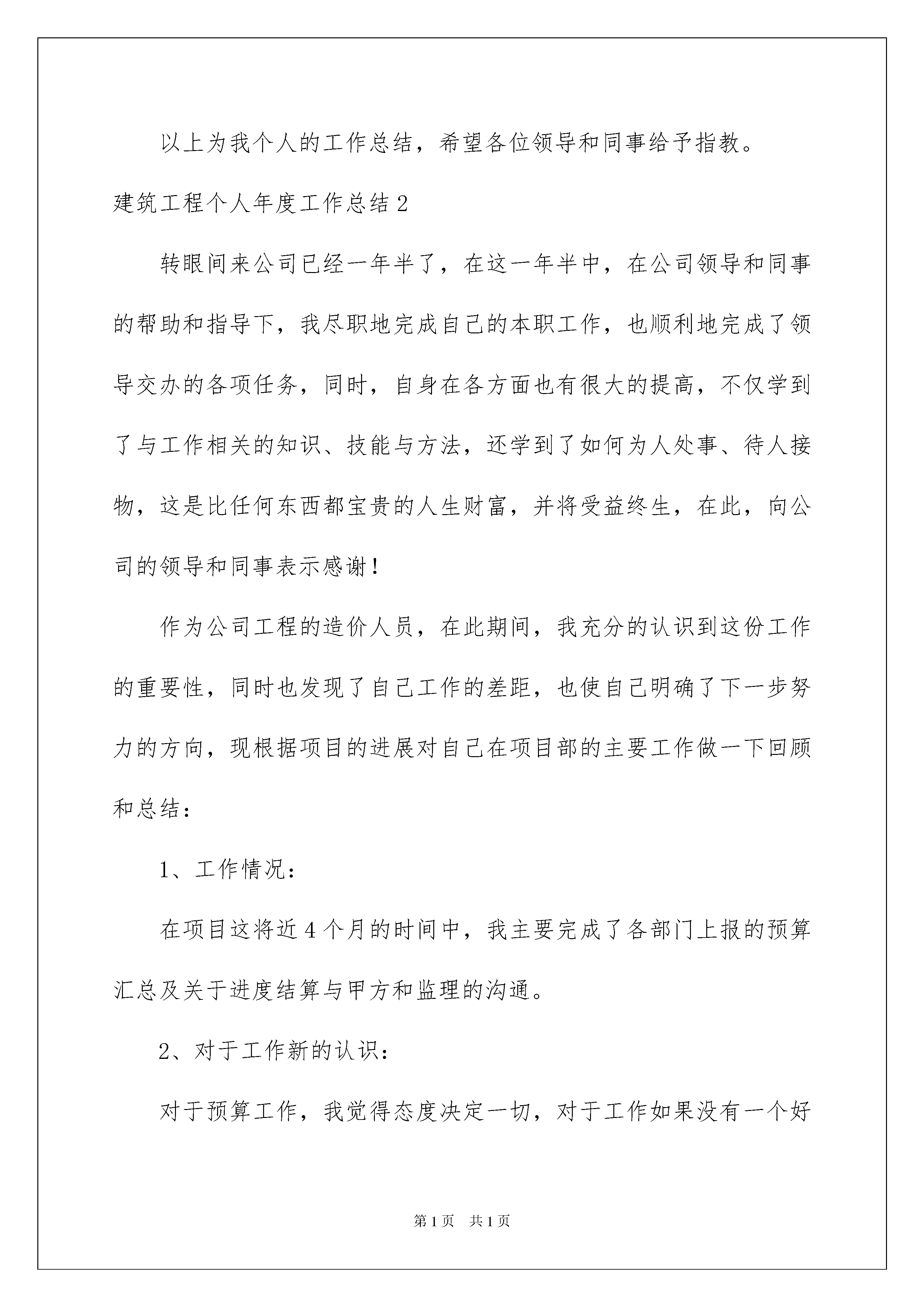 2022建筑工程个人年度工作总结建筑工程个人年度工作总结总结是事后对某一时期、某一项目或某些工作进行回顾和分析,从而做出带有规律性的结论,它可以促使我们思考,让我们来为自己写一份总结吧。但是总结有什么要求呢?下面是我整理的建筑工程个人年度工作总结,希望能够帮助到大家。建筑工程个人年度工作总结1光阴荏苒、时间飞逝,转眼间20xx年在紧张忙碌中过去了,20xx年也迎来了x月。这一年多是紧张的,也是充实的。展望未来,在以后的日子里,我将总结经验、吸取教训,付出更大的努力,以更加奋发有为的精神状态和扎扎实实的工作作风投入到工作中当去。这一年多的时间里,我在项目经理及部门领导的指挥下,在xx水电站发电厂房建筑及金属结构安装工程的建设中先后经历了发电厂房各个部位的开挖工程、发电洞斜井段小导洞的贯通工作、以及正在进行的发电厂房浇筑的各个阶段。在此工作过程中有成绩也有失误,对于自己取得的成绩将继续保持发扬,对自己工作中存在的失误,将认真的总结,深刻的反省,尽可能减少工作失误的发生。通过这些现场工作的锻炼,我已经积累了一定的工作经验,主要得益于项目部领导的关心培养和同事们的热心帮助、谆谆教导。在工程建设中,一是抓安全文明施工,二是抓工程质量,三是抓工程进度。要搞好工程施工,必须首先熟悉施工图纸,完成从熟悉图纸设计意图再回头修正图纸的过程,其次要强化对图纸的了解程度。加强与各职能部门的协调配合,营造良好的工作氛围,建设工程项目运作过程中涉及方方面面,必须搞好协调配合。在施工过程中,统一步调,形成合力,对在项目实施过程中遇到的问题和情况,主动和领导汇报,作到沟通、协调,从而保证项目建设顺利实施。为了提高工作效率和工作质量,本人在下一阶段的施工中会着重以下几个方面:1、加强各种政治学习,提高个人修养。2、加强业务学习,提高业务素质,提高工作质量。3、要注意学习新的技术,多动脑想办法改进工作方法。提高工作效率,在每次工作前做好准备,不打无准备之仗。4、加强与领导和同事之间的沟通,使领导的监督工作更为深入。以上为我个人的工作总结,希望各位领导和同事给予指教。建筑工程个人年度工作总结2转眼间来公司已经一年半了,在这一年半中,在公司领导和同事的帮助和指导下,我尽职地完成自己的本职工作,也顺利地完成了领导交办的各项任务,同时,自身在各方面也有很大的提高,不仅学到了与工作相关的知识、技能与方法,还学到了如何为人处事、待人接物,这是比任何东西都宝贵的人生财富,并将受益终生,在此,向公司的领导和同事表示感谢!作为公司工程的造价人员,在此期间,我充分的认识到这份工作的重要性,同时也发现了自己工作的差距,也使自己明确了下一步努力的方向,现根据项目的进展对自己在项目部的主要工作做一下回顾和总结:1、工作情况:在项目这将近4个月的时间中,我主要完成了各部门上报的预算汇总及关于进度结算与甲方和监理的沟通。2、对于工作新的认识:对于预算工作,我觉得态度决定一切,对于工作如果没有一个好态度,一切也就无从谈起,只有以认真的态度、以主人翁的精神去对待自己的工作,才会实现公司利益的最大化。3、工作中存在不足:由于自身的局限性,对于有些细节方面处理地不是太准确,因为预算工作有一部分是需要时间和经验的积累,不过我相信经验上的不足可以通过勤奋来弥补。在今后的工作和学习中,我会严格要求自己,尽职尽责,争取做一个优秀的公司员工,为公司的发展也为自己价值的实现去努力!建筑工程个人年度工作总结3XX年是不平凡的一年也是我们一个全中国人民都感到光荣和开心的一年,也是全中国人民都悲伤的一年。开心的是奥林匹克运动会成功的在中国举办了,悲伤的是中国人民经历了一次难忘的自然灾害(5.12汶川地震)。通过团结的力量我们成功的举办了奥林匹克运动会,也克服了地震带给我们的伤痛。XX年即将过去,新的一年即将开始,在这辞旧迎新之际,回顾一年来的工作历程,总结一年来的工作中的经验、教训,有利于在以后的工作中扬长避短,更好的做好技术资料管理工作,下面分几个方面对一年来的工作进行一下总结:一、今年的主要工作:XX年我经历了“名信、天龙瑞景”工程的竣工资料和“新筑1-4#楼”质量、安全(基储主体、“标化”)等各项资料,并跟从现场技术负责人进行预算的学习。“名信、天龙瑞景”工程于XX年1月25日进行了竣工验收,在公司规定的时间里完成了竣工资料的收集和整理,并按要求合格的交付成都市新都区档案馆进行存档。“新筑1-4#楼”工程于XX年4月1日开工,开工前按相关规范规定的要求进行开工准备的资料收集和整理;XX年12月12日合格的进行了1-4#楼基储主体的验收,并按规范要求收集和整