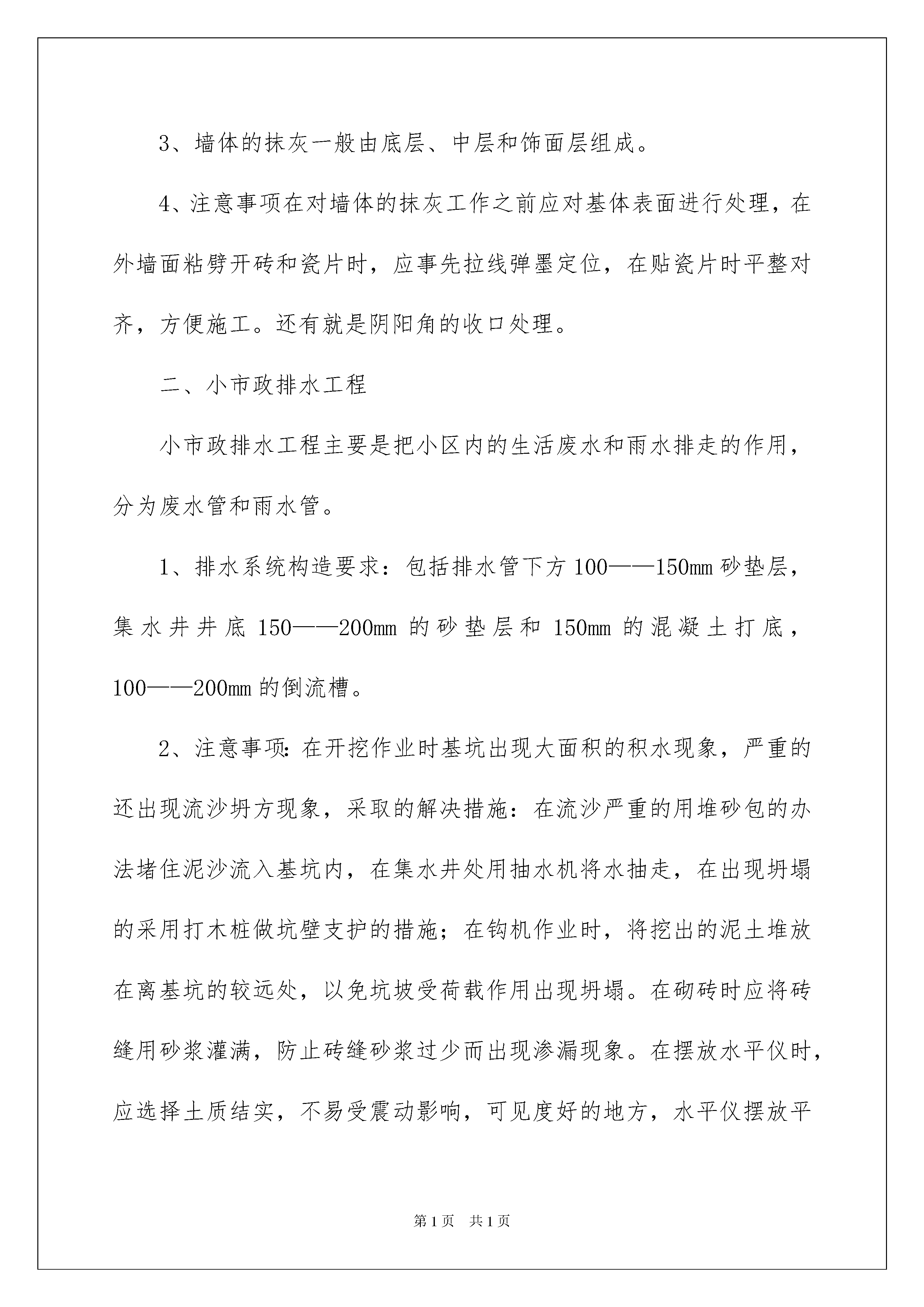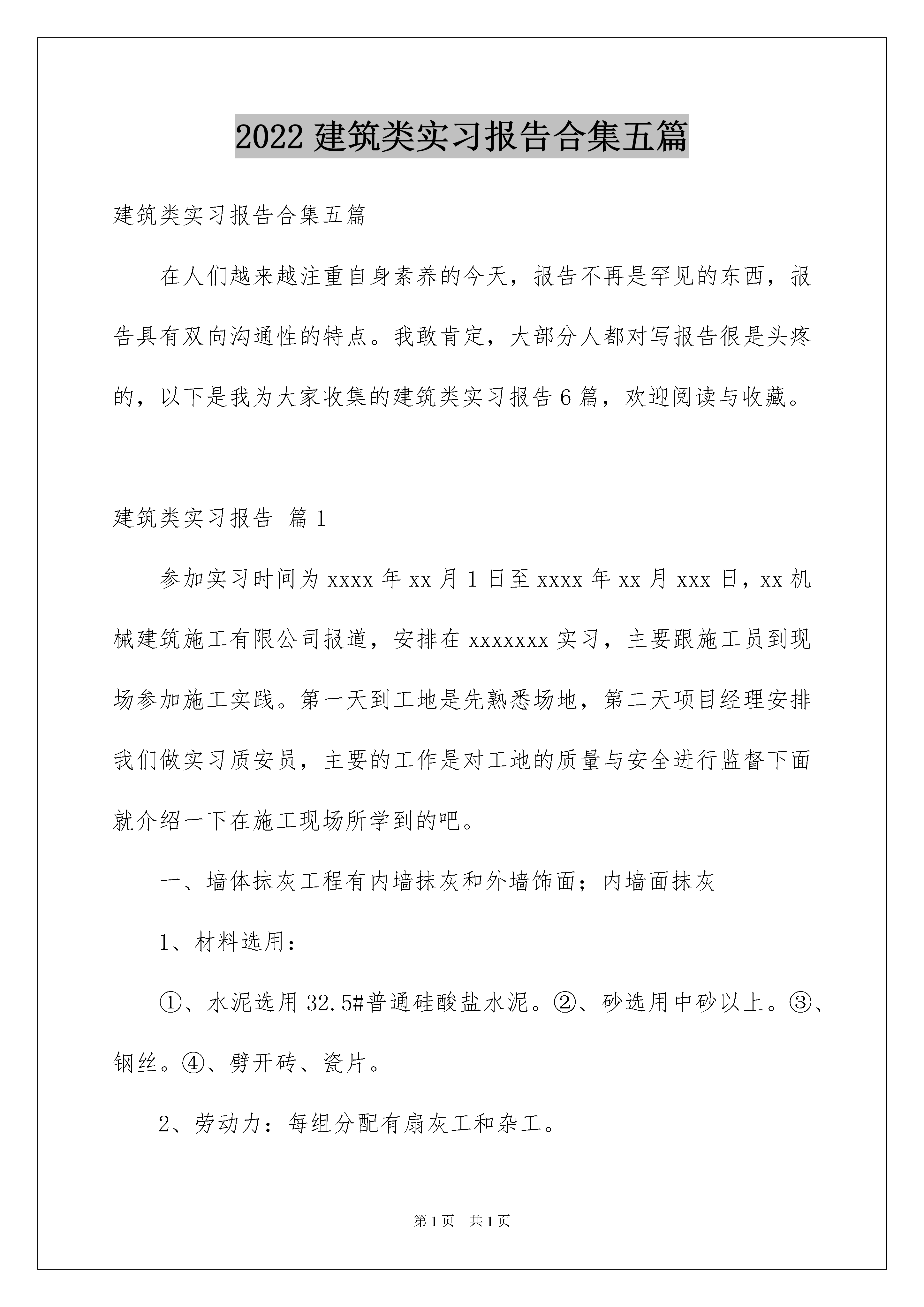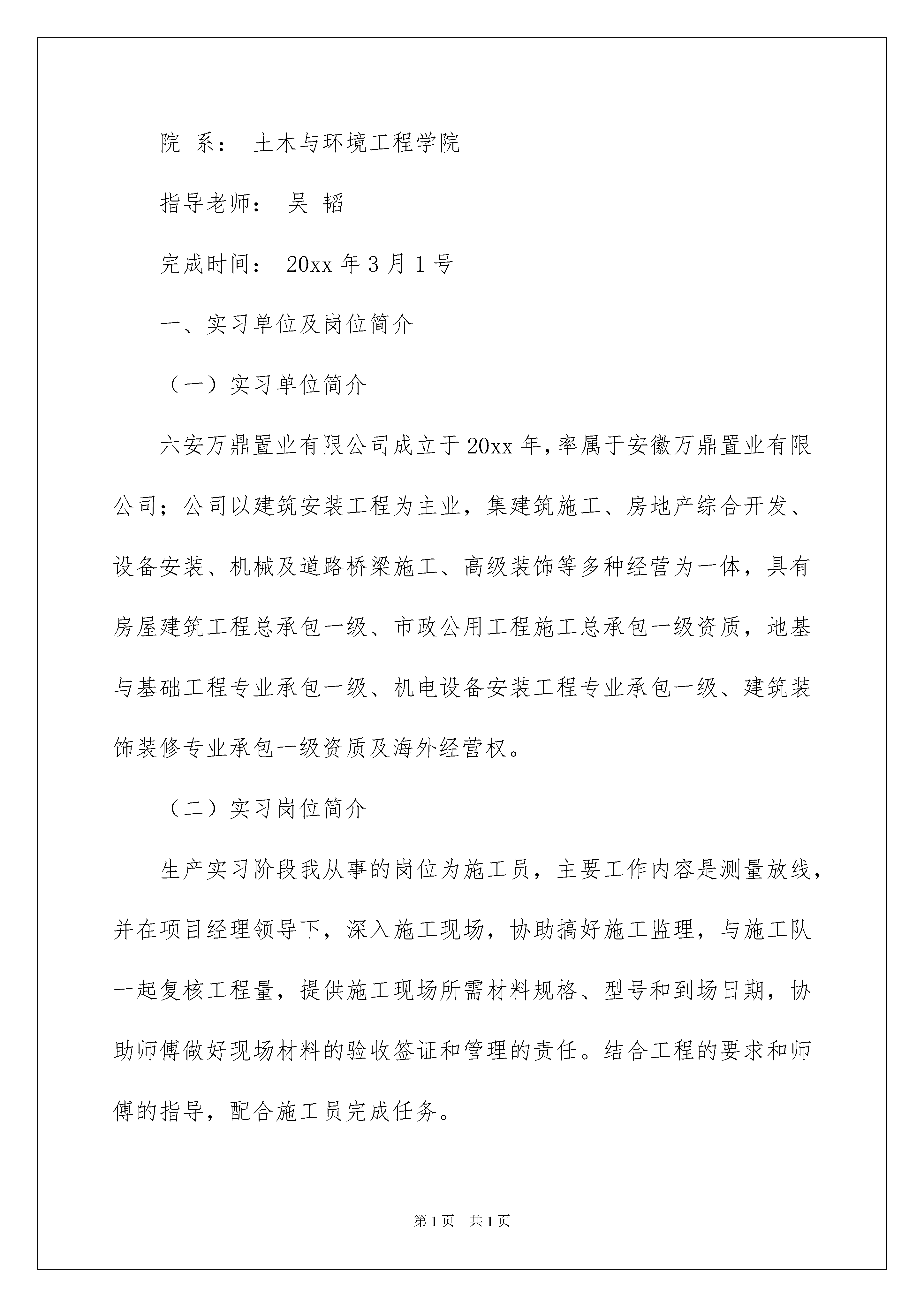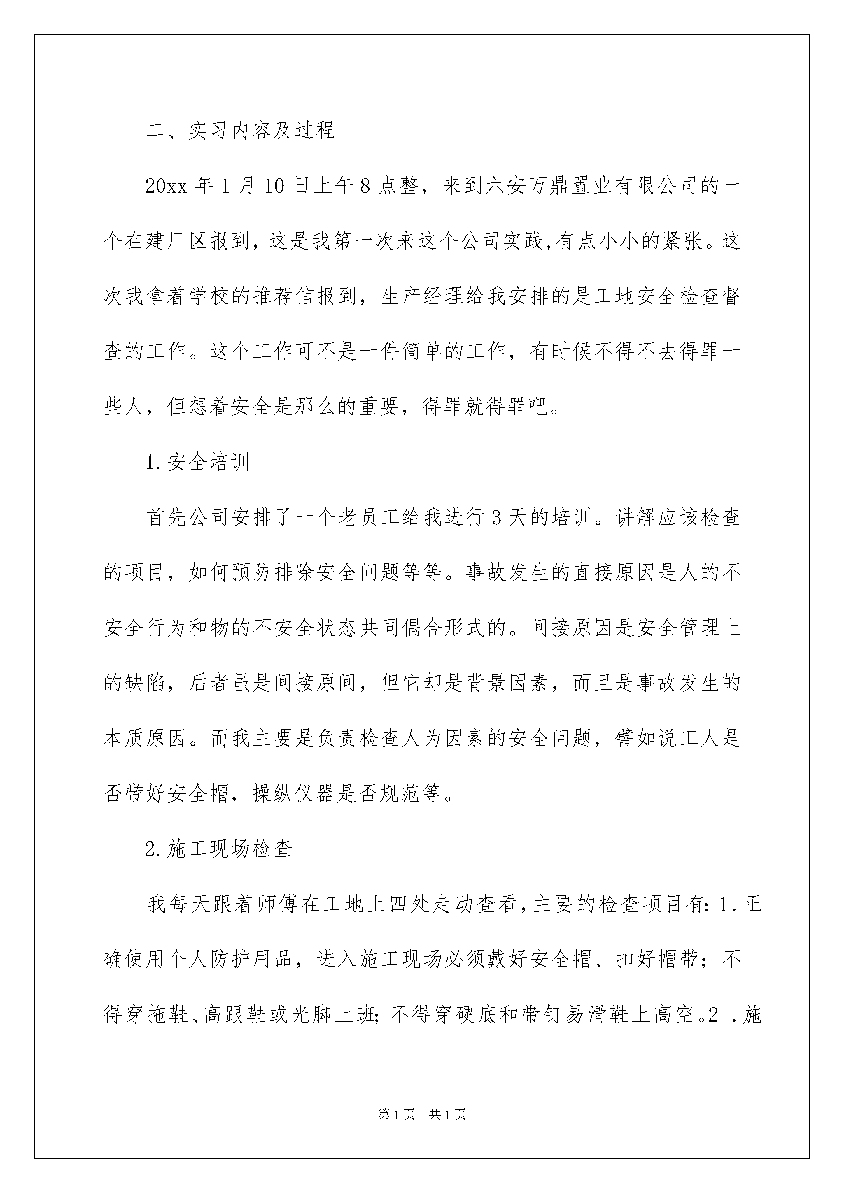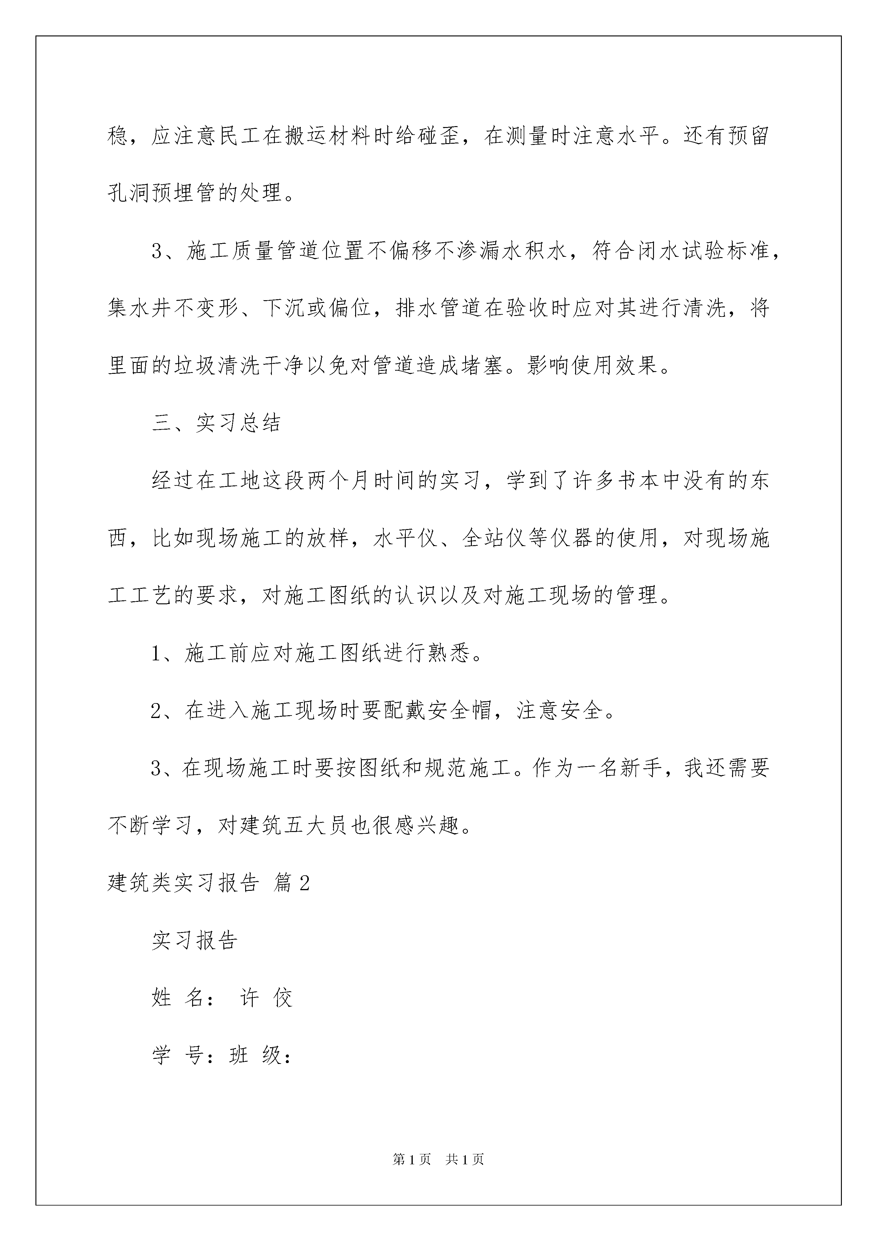2022建筑类实习报告合集五篇建筑类实习报告合集五篇在人们越来越注重自身素养的今天,报告不再是罕见的东西,报告具有双向沟通性的特点。我敢肯定,大部分人都对写报告很是头疼的,以下是我为大家收集的建筑类实习报告6篇,欢迎阅读与收藏。建筑类实习报告篇1参加实习时间为xxxx年xx月1日至xxxx年xx月xxx日,xx机械建筑施工有限公司报道,安排在xxxxxxx实习,主要跟施工员到现场参加施工实践。第一天到工地是先熟悉场地,第二天项目经理安排我们做实习质安员,主要的工作是对工地的质量与安全进行监督下面就介绍一下在施工现场所学到的吧。一、墙体抹灰工程有内墙抹灰和外墙饰面;内墙面抹灰1、材料选用:①、水泥选用32.5#普通硅酸盐水泥。②、砂选用中砂以上。③、钢丝。④、劈开砖、瓷片。2、劳动力:每组分配有扇灰工和杂工。3、墙体的抹灰一般由底层、中层和饰面层组成。4、注意事项在对墙体的抹灰工作之前应对基体表面进行处理,在外墙面粘劈开砖和瓷片时,应事先拉线弹墨定位,在贴瓷片时平整对齐,方便施工。还有就是阴阳角的收口处理。二、小市政排水工程小市政排水工程主要是把小区内的生活废水和雨水排走的作用,分为废水管和雨水管。1、排水系统构造要求:包括排水管下方100——150mm砂垫层,集水井井底150——200mm的砂垫层和150mm的混凝土打底,100——200mm的倒流槽。2、注意事项:在开挖作业时基坑出现大面积的积水现象,严重的还出现流沙坍方现象,采取的解决措施:在流沙严重的用堆砂包的办法堵住泥沙流入基坑内,在集水井处用抽水机将水抽走,在出现坍塌的采用打木桩做坑壁支护的措施;在钩机作业时,将挖出的泥土堆放在离基坑的较远处,以免坑坡受荷载作用出现坍塌。在砌砖时应将砖缝用砂浆灌满,防止砖缝砂浆过少而出现渗漏现象。在摆放水平仪时,应选择土质结实,不易受震动影响,可见度好的地方,水平仪摆放平稳,应注意民工在搬运材料时给碰歪,在测量时注意水平。还有预留孔洞预埋管的处理。3、施工质量管道位置不偏移不渗漏水积水,符合闭水试验标准,集水井不变形、下沉或偏位,排水管道在验收时应对其进行清洗,将里面的垃圾清洗干净以免对管道造成堵塞。影响使用效果。三、实习总结经过在工地这段两个月时间的实习,学到了许多书本中没有的东西,比如现场施工的放样,水平仪、全站仪等仪器的使用,对现场施工工艺的要求,对施工图纸的认识以及对施工现场的管理。1、施工前应对施工图纸进行熟悉。2、在进入施工现场时要配戴安全帽,注意安全。3、在现场施工时要按图纸和规范施工。作为一名新手,我还需要不断学习,对建筑五大员也很感兴趣。建筑类实习报告篇2实习报告姓名:许佼学号:班级:院系:土木与环境工程学院指导老师:吴韬完成时间:20xx年3月1号一、实习单位及岗位简介(一)实习单位简介六安万鼎置业有限公司成立于20xx年,率属于安徽万鼎置业有限公司;公司以建筑安装工程为主业,集建筑施工、房地产综合开发、设备安装、机械及道路桥梁施工、高级装饰等多种经营为一体,具有房屋建筑工程总承包一级、市政公用工程施工总承包一级资质,地基与基础工程专业承包一级、机电设备安装工程专业承包一级、建筑装饰装修专业承包一级资质及海外经营权。(二)实习岗位简介生产实习阶段我从事的岗位为施工员,主要工作内容是测量放线,并在项目经理领导下,深入施工现场,协助搞好施工监理,与施工队一起复核工程量,提供施工现场所需材料规格、型号和到场日期,协助师傅做好现场材料的验收签证和管理的责任。结合工程的要求和师傅的指导,配合施工员完成任务。二、实习内容及过程20xx年1月10日上午8点整,来到六安万鼎置业有限公司的一个在建厂区报到,这是我第一次来这个公司实践,有点小小的紧张。这次我拿着学校的推荐信报到,生产经理给我安排的是工地安全检查督查的工作。这个工作可不是一件简单的工作,有时候不得不去得罪一些人,但想着安全是那么的重要,得罪就得罪吧。1.安全培训首先公司安排了一个老员工给我进行3天的培训。讲解应该检查的项目,如何预防排除安全问题等等。事故发生的直接原因是人的不安全行为和物的不安全状态共同偶合形式的。间接原因是安全管理上的缺陷,后者虽是间接原间,但它却是背景因素,而且是事故发生的本质原因。而我主要是负责检查人为因素的安全问题,譬如说工人是否带好安全帽,操纵仪器是否规范等。2.施工现场检查我每天跟着师傅在工地上四处走动查看,主要的检查项目有:1.正确使用个人防护用品,进入施工现场必须戴好安全帽、扣好帽带;不得穿拖鞋、高跟鞋或光脚上班;不得穿硬底和带钉易滑鞋上高空。2.施工现场的各种设施,安全标志、警示牌