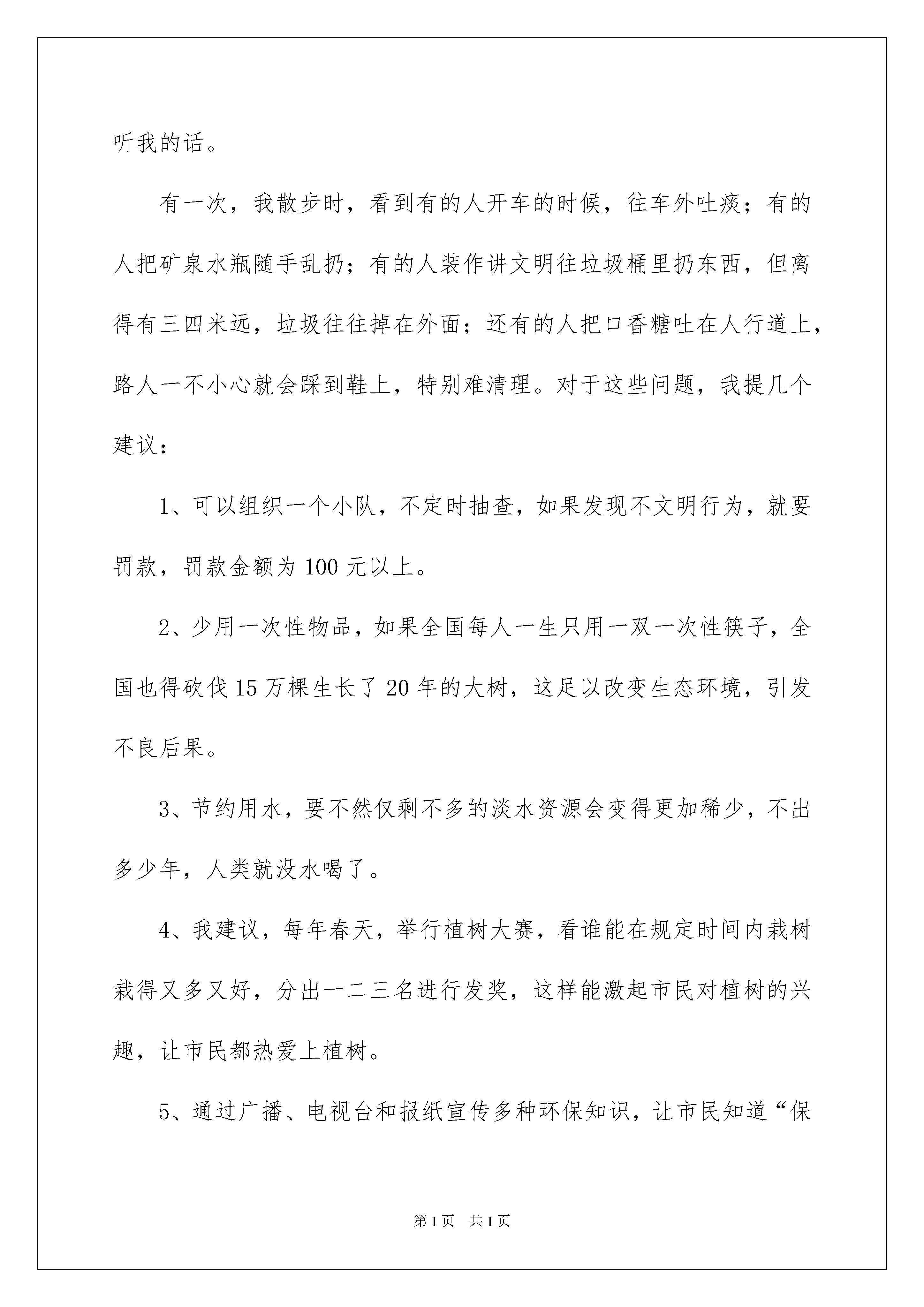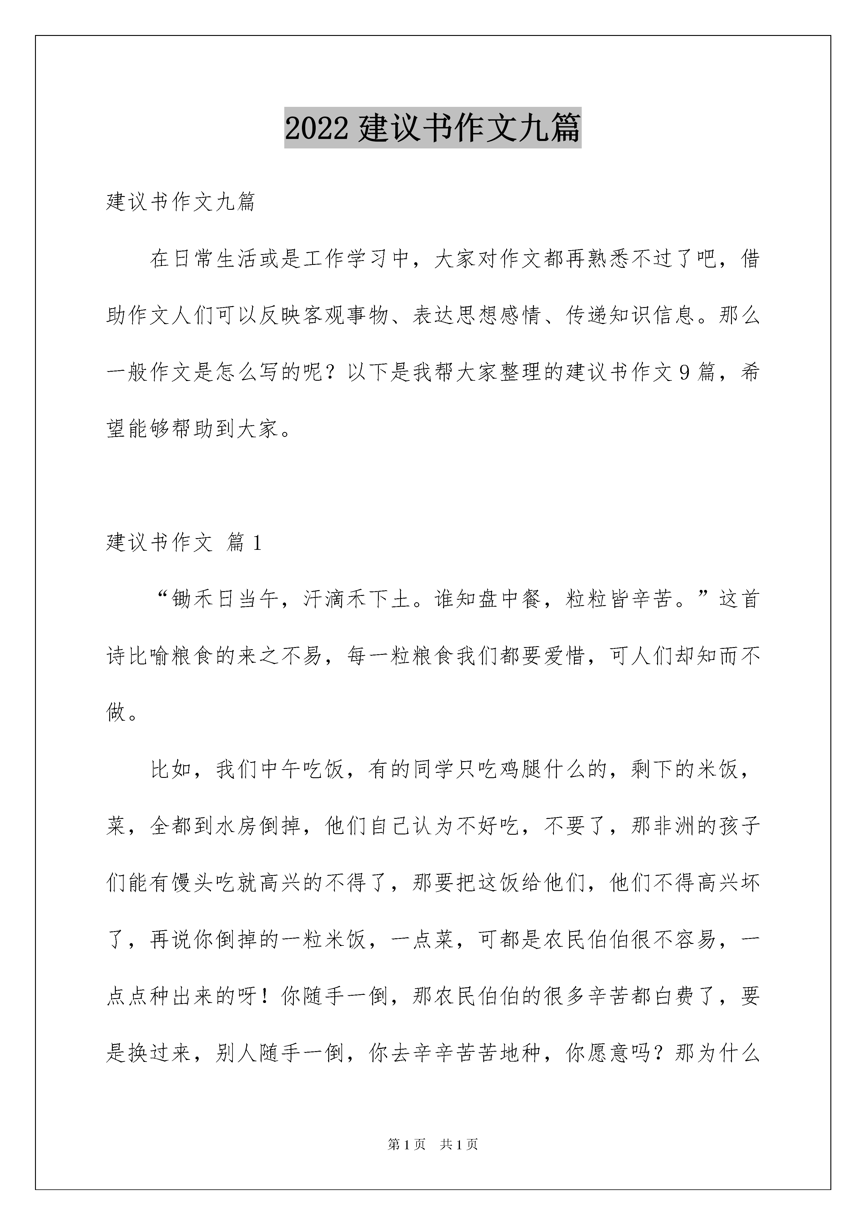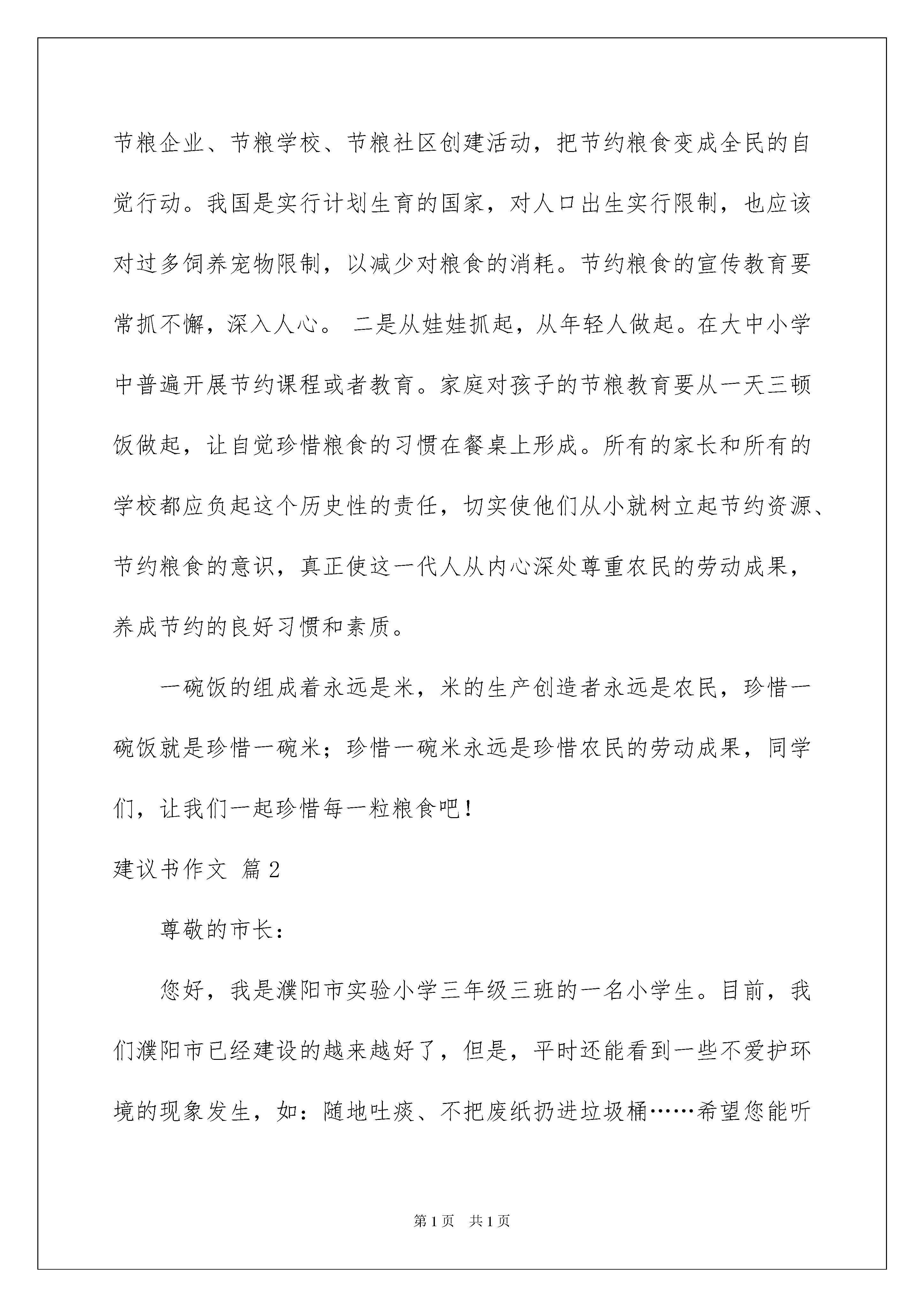 2022建议书作文九篇建议书作文九篇在日常生活或是工作学习中,大家对作文都再熟悉不过了吧,借助作文人们可以反映客观事物、表达思想感情、传递知识信息。那么一般作文是怎么写的呢?以下是我帮大家整理的建议书作文9篇,希望能够帮助到大家。建议书作文篇1“锄禾日当午,汗滴禾下土。谁知盘中餐,粒粒皆辛苦。”这首诗比喻粮食的来之不易,每一粒粮食我们都要爱惜,可人们却知而不做。比如,我们中午吃饭,有的同学只吃鸡腿什么的,剩下的米饭,菜,全都到水房倒掉,他们自己认为不好吃,不要了,那非洲的孩子们能有馒头吃就高兴的不得了,那要把这饭给他们,他们不得高兴坏了,再说你倒掉的一粒米饭,一点菜,可都是农民伯伯很不容易,一点点种出来的呀!你随手一倒,那农民伯伯的很多辛苦都白费了,要是换过来,别人随手一倒,你去辛辛苦苦地种,你愿意吗?那为什么你在倒的时候不去想想农民伯伯呢?粮食可是农民伯伯用汗水,用勤劳的双手种出来的,人们啊,节约一些粮食吧,就按小的来说,全国每人节约一粒米就等于节约了13亿粒米,如果毎人节约一些菜,那全国人一共就节约了13亿那么多的菜,吃惊吧,一粒米是很少,但你要坚持每天节约一粒,那你一年就节约了365粒米,那米就能再做成一碗米饭,去捐给一些贫苦的人,这样就可以帮助一个人维持一顿饭,如果这个人已饿到极点,已快无法坚持时,这碗饭就说不定可以延长她的生命,一碗饭的力量无限大,有时在你眼里是一碗即将被倒掉的饭,但在一个饥饿的人的眼里却是一碗维持生命的饭。因此,我建议:重视抓好节约粮食。一是在建设节约型社会过程中,把宣传对粮食的节约放在首位。充分利用报纸、广播、电视、网络及其他宣传教育手段,广泛宣传当前国际市场粮食紧缺的严峻形势、国家粮食政策和有关法律法规、勤俭节约传统美德、节约粮食和食品先进经验和典型事例,形成反对浪费粮食和食品强大声势。动员机关、部队、企业、学校、街道、社区、乡村各方力量共同参与,在全社会大力倡导崇尚节俭、适度消费、文明生活的理念。营造爱惜粮食、节约粮食光荣,浪费粮食可耻的浓厚氛围,开展节粮食堂、节粮连队、节粮企业、节粮学校、节粮社区创建活动,把节约粮食变成全民的自觉行动。我国是实行计划生育的国家,对人口出生实行限制,也应该对过多饲养宠物限制,以减少对粮食的消耗。节约粮食的宣传教育要常抓不懈,深入人心。二是从娃娃抓起,从年轻人做起。在大中小学中普遍开展节约课程或者教育。家庭对孩子的节粮教育要从一天三顿饭做起,让自觉珍惜粮食的习惯在餐桌上形成。所有的家长和所有的学校都应负起这个历史性的责任,切实使他们从小就树立起节约资源、节约粮食的意识,真正使这一代人从内心深处尊重农民的劳动成果,养成节约的良好习惯和素质。一碗饭的组成着永远是米,米的生产创造者永远是农民,珍惜一碗饭就是珍惜一碗米;珍惜一碗米永远是珍惜农民的劳动成果,同学们,让我们一起珍惜每一粒粮食吧!建议书作文篇2尊敬的市长:您好,我是濮阳市实验小学三年级三班的一名小学生。目前,我们濮阳市已经建设的越来越好了,但是,平时还能看到一些不爱护环境的现象发生,如:随地吐痰、不把废纸扔进垃圾桶……希望您能听听我的话。有一次,我散步时,看到有的人开车的时候,往车外吐痰;有的人把矿泉水瓶随手乱扔;有的人装作讲文明往垃圾桶里扔东西,但离得有三四米远,垃圾往往掉在外面;还有的人把口香糖吐在人行道上,路人一不小心就会踩到鞋上,特别难清理。对于这些问题,我提几个建议:1、可以组织一个小队,不定时抽查,如果发现不文明行为,就要罚款,罚款金额为100元以上。2、少用一次性物品,如果全国每人一生只用一双一次性筷子,全国也得砍伐15万棵生长了20年的大树,这足以改变生态环境,引发不良后果。3、节约用水,要不然仅剩不多的淡水资源会变得更加稀少,不出多少年,人类就没水喝了。4、我建议,每年春天,举行植树大赛,看谁能在规定时间内栽树栽得又多又好,分出一二三名进行发奖,这样能激起市民对植树的兴趣,让市民都热爱上植树。5、通过广播、电视台和报纸宣传多种环保知识,让市民知道“保护环境、人人有责”。这就是我的建议,希望您能抽时间看看,采纳一下我的建议。祝您工作顺利。建议书作文篇3敬爱的校长:您好!在您的领导和老师们辛勤努力下,我们的知识越来越多了。同学们在你们的教导下,都取得了良好的成绩。我对母校真是依依不舍啊!我想向您提一点儿建议。一、学校增加一节自习课,让同学们可以再这节课里看一些课外书,这样同学们就有充足的时间看课外书了,增长课外知识;二、学校应多搞一些活动,让同学们加强环保意识,在学校多搞一些关于卫生的活动,宣传垃圾堆满地球会怎样。地球母亲会不会哭泣;三、给