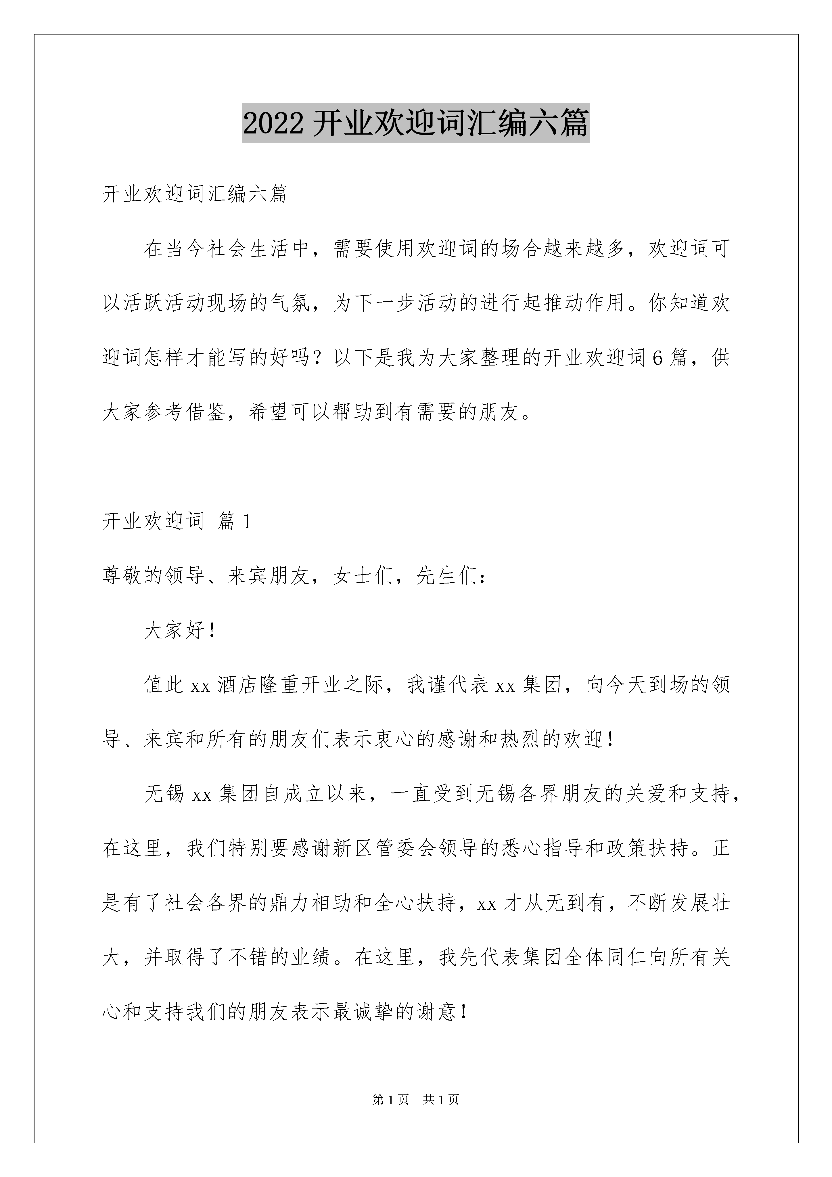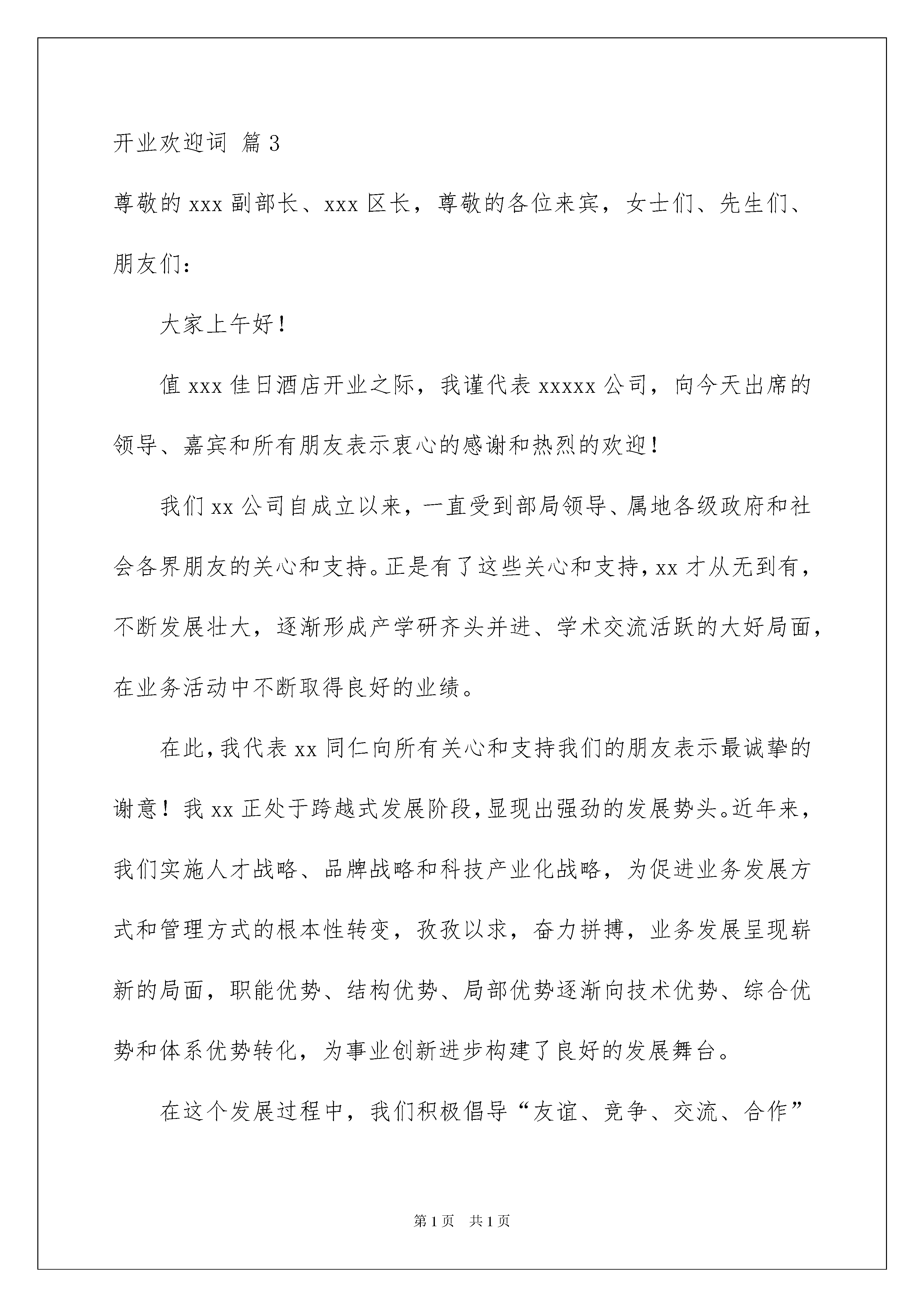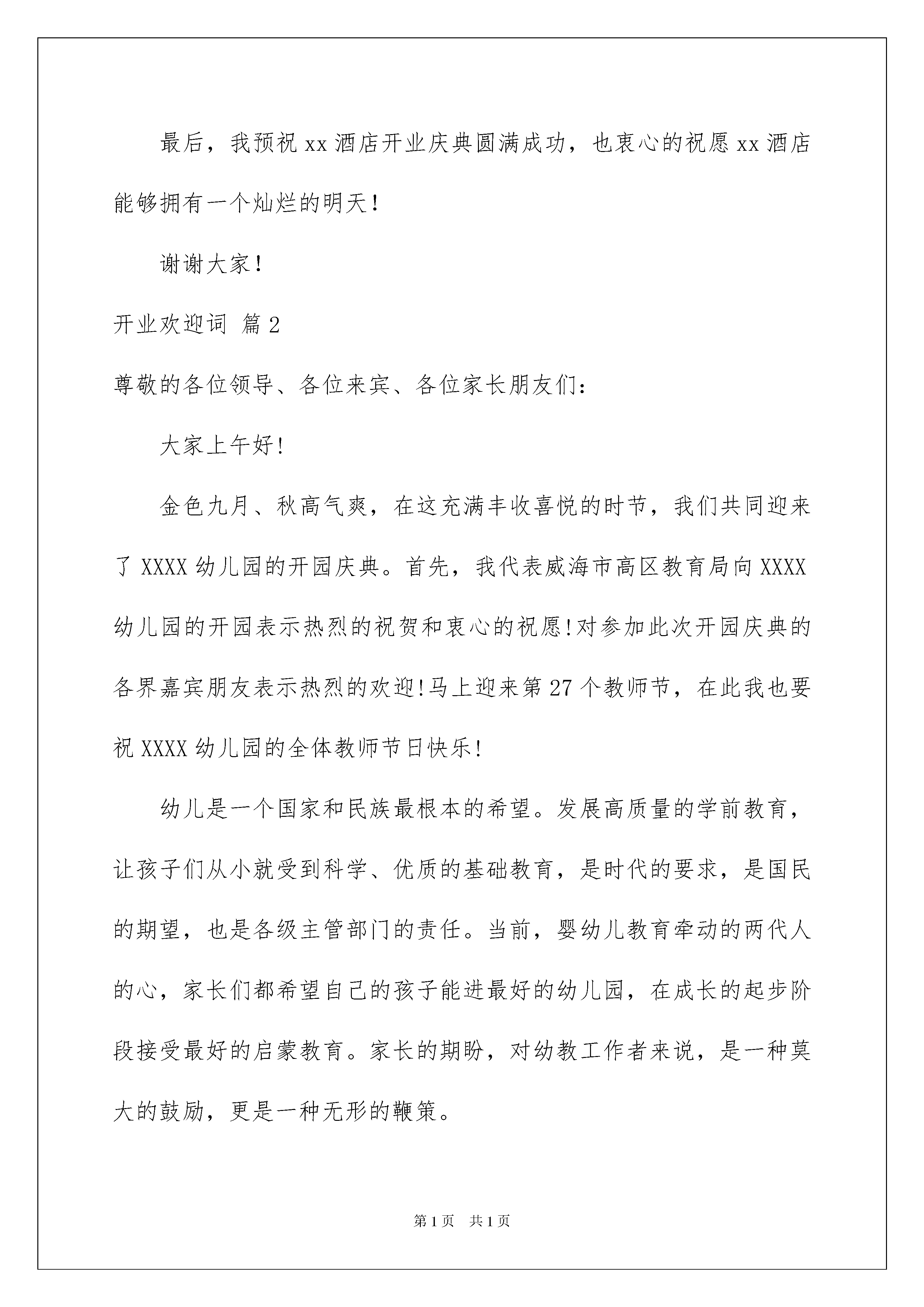 2022开业欢迎词汇编六篇开业欢迎词汇编六篇在当今社会生活中,需要使用欢迎词的场合越来越多,欢迎词可以活跃活动现场的气氛,为下一步活动的进行起推动作用。你知道欢迎词怎样才能写的好吗?以下是我为大家整理的开业欢迎词6篇,供大家参考借鉴,希望可以帮助到有需要的朋友。开业欢迎词篇1尊敬的领导、来宾朋友,女士们,先生们:大家好!值此xx酒店隆重开业之际,我谨代表xx集团,向今天到场的领导、来宾和所有的朋友们表示衷心的感谢和热烈的欢迎!无锡xx集团自成立以来,一直受到无锡各界朋友的关爱和支持,在这里,我们特别要感谢新区管委会领导的悉心指导和政策扶持。正是有了社会各界的鼎力相助和全心扶持,xx才从无到有,不断发展壮大,并取得了不错的业绩。在这里,我先代表集团全体同仁向所有关心和支持我们的朋友表示最诚挚的谢意!我们xx集团,是蓬勃发展的集团,是富有生命力的集团。一直以来,我们以“自我积累、自我发展、开拓进取”为集团发展的主要模式,以房地产为主要经营项目的集团化公司为发展目标,孜孜不倦,奋力拼搏。xx酒店,是我们xx集团投资兴建的又一大项目,也是我们xx人智慧和汗水的结晶。它是按照四星级旅游涉外饭店标准建设,集商铺、办公、酒店、餐饮、休闲、娱乐于一体的综合性商务酒店。它的落成和开业,是我们xx集团的发展壮大的一大里程碑,也是我们为答谢无锡人民而献上的一份珍贵的礼物。我们力图将其建设成为xx区的地标性建筑和对外的窗口,实现酒店的顺利经营和兴旺发展,为xx区的繁荣昌盛而全力以赴,竭尽所能的贡献出自己的力量!作为xx集团的董事长,我很高兴的看到xx酒店能够顺利落成并且隆重开业!在此,我特别要感谢xx的全体员工,是你们的坚定信念和艰辛努力才有了xx酒店。谢谢你们!我真诚的希望,在新的纪元里,社会各界的朋友们,特别是xx区的各位领导,能一如既往的关心和支持xx,扶持和帮助xx酒店不断发展和成长。同时,也诚挚的渴望,各位业界同仁能够和xx互相交流、提携发展,联手共创无锡新区辉煌的未来!最后,我预祝xx酒店开业庆典圆满成功,也衷心的祝愿xx酒店能够拥有一个灿烂的明天!谢谢大家!开业欢迎词篇2尊敬的各位领导、各位来宾、各位家长朋友们:大家上午好!金色九月、秋高气爽,在这充满丰收喜悦的时节,我们共同迎来了XXXX幼儿园的开园庆典。首先,我代表威海市高区教育局向XXXX幼儿园的开园表示热烈的祝贺和衷心的祝愿!对参加此次开园庆典的各界嘉宾朋友表示热烈的欢迎!马上迎来第27个教师节,在此我也要祝XXXX幼儿园的全体教师节日快乐!幼儿是一个国家和民族最根本的希望。发展高质量的学前教育,让孩子们从小就受到科学、优质的基础教育,是时代的要求,是国民的期望,也是各级主管部门的责任。当前,婴幼儿教育牵动的两代人的心,家长们都希望自己的孩子能进最好的幼儿园,在成长的起步阶段接受最好的启蒙教育。家长的期盼,对幼教工作者来说,是一种莫大的鼓励,更是一种无形的鞭策。XXXX幼儿园20xx年秋成功的加盟了北京博苑教育,引进博苑总部先进的管理理论和教育理念,童话式的建筑风格,映衬着竹林曲径、优雅宁静,充分体现出“东方与西方交融”、“自然与科学和谐”、“历史传统与现代人文交汇”的鲜明特色,园内现代化的教育教学环境与设施均达到山东省省级示范幼儿园的配置标准。蒙氏教学、视频直播、四季恒温游泳馆、远程消防监控系统让孩子们生活在一所精致高雅、童趣盎然、充满自然阳光的儿童乐园。我们殷切希望XXXX幼儿园的教职工始终坚持“一切为了孩子,精诚服务与家长”的办园宗旨和“让孩子攀登自己的高峰”的教育理念,从对每个孩子负责、对国家和人民负责的高度,切实办好让家长满意的幼儿园,尽心尽责地为幼教事业做出自己的努力,不断开创我区幼儿教育的新局面,让我们用自己的汗水为孩子们开辟一片广阔的优质成长空间,让孩子的童年拥有更多拥抱精彩的机会!争取把我们XXXX幼儿园打造成高品质、高品位、高质量的蒙氏幼儿园!最后,让我们一起向往XXXX幼儿园更美好的明天!祝XXXX幼儿园开园大吉!祝开园庆典圆满成功!祝愿各位来宾身体健康、万事如意!谢谢大家!开业欢迎词篇3尊敬的xxx副部长、xxx区长,尊敬的各位来宾,女士们、先生们、朋友们:大家上午好!值xxx佳日酒店开业之际,我谨代表xxxxx公司,向今天出席的领导、嘉宾和所有朋友表示衷心的感谢和热烈的欢迎!我们xx公司自成立以来,一直受到部局领导、属地各级政府和社会各界朋友的关心和支持。正是有了这些关心和支持,xx才从无到有,不断发展壮大,逐渐形成产学研齐头并进、学术交流活跃的大好局面,在业务活动中不断取得良好的业绩。在此,我代表