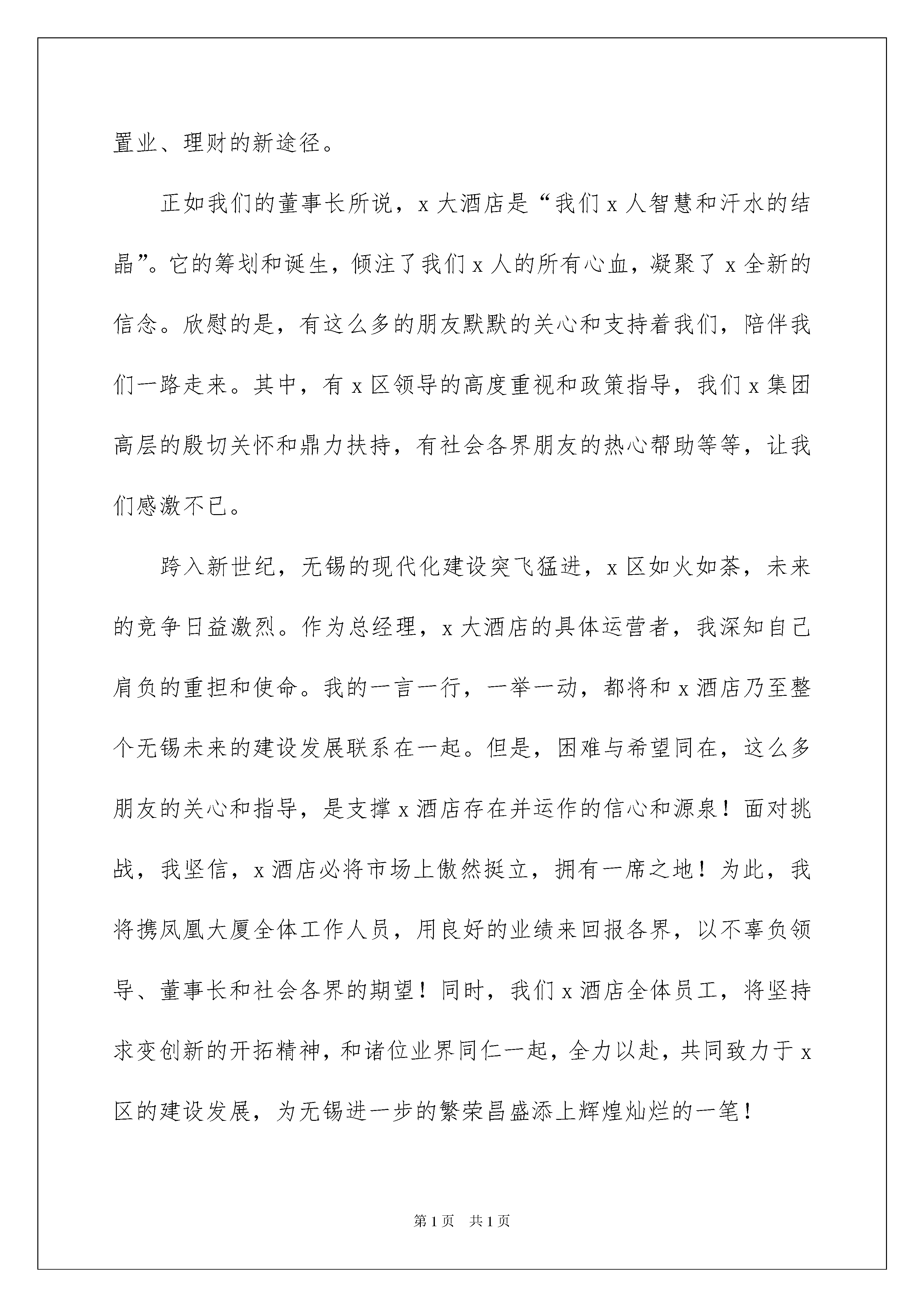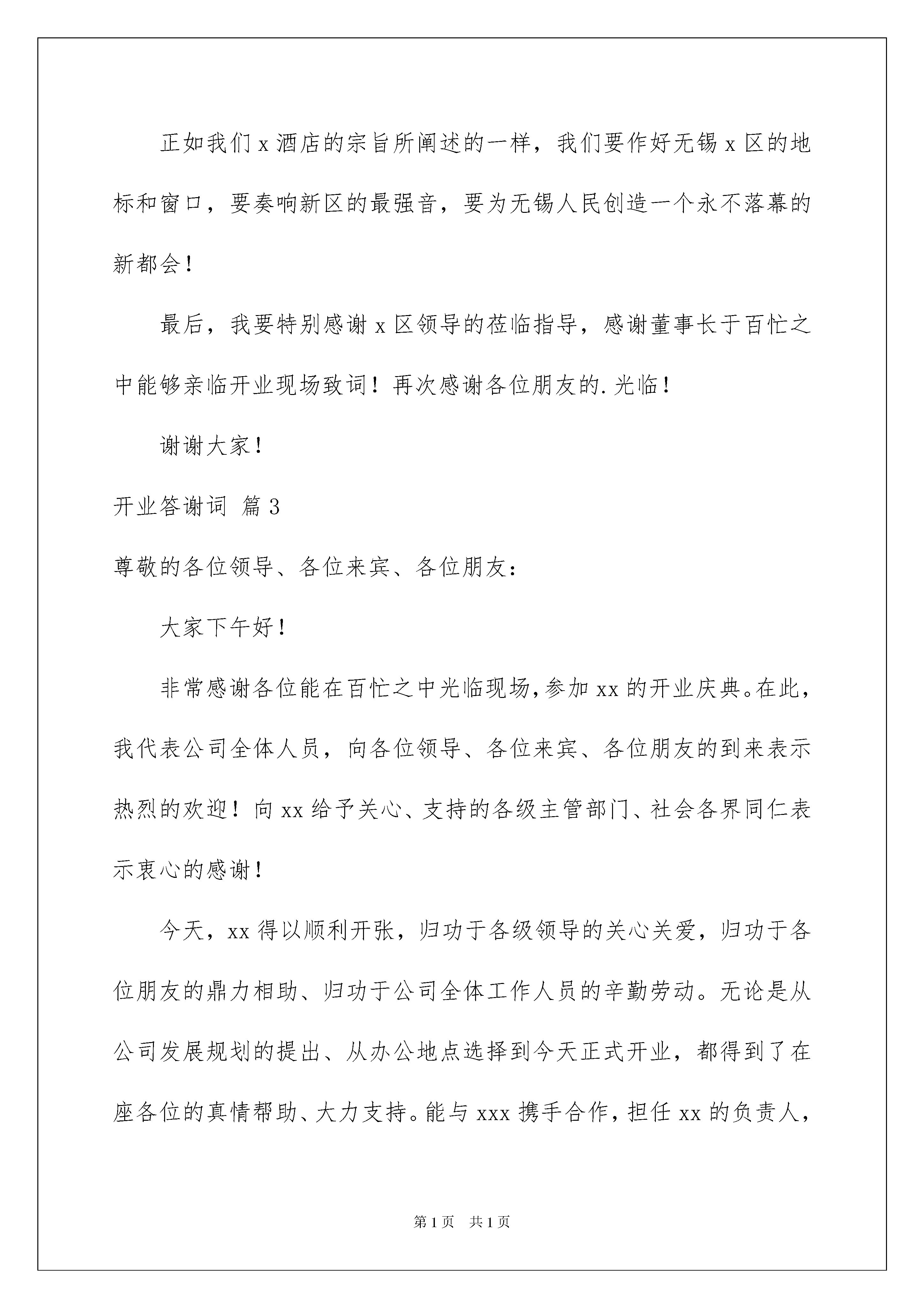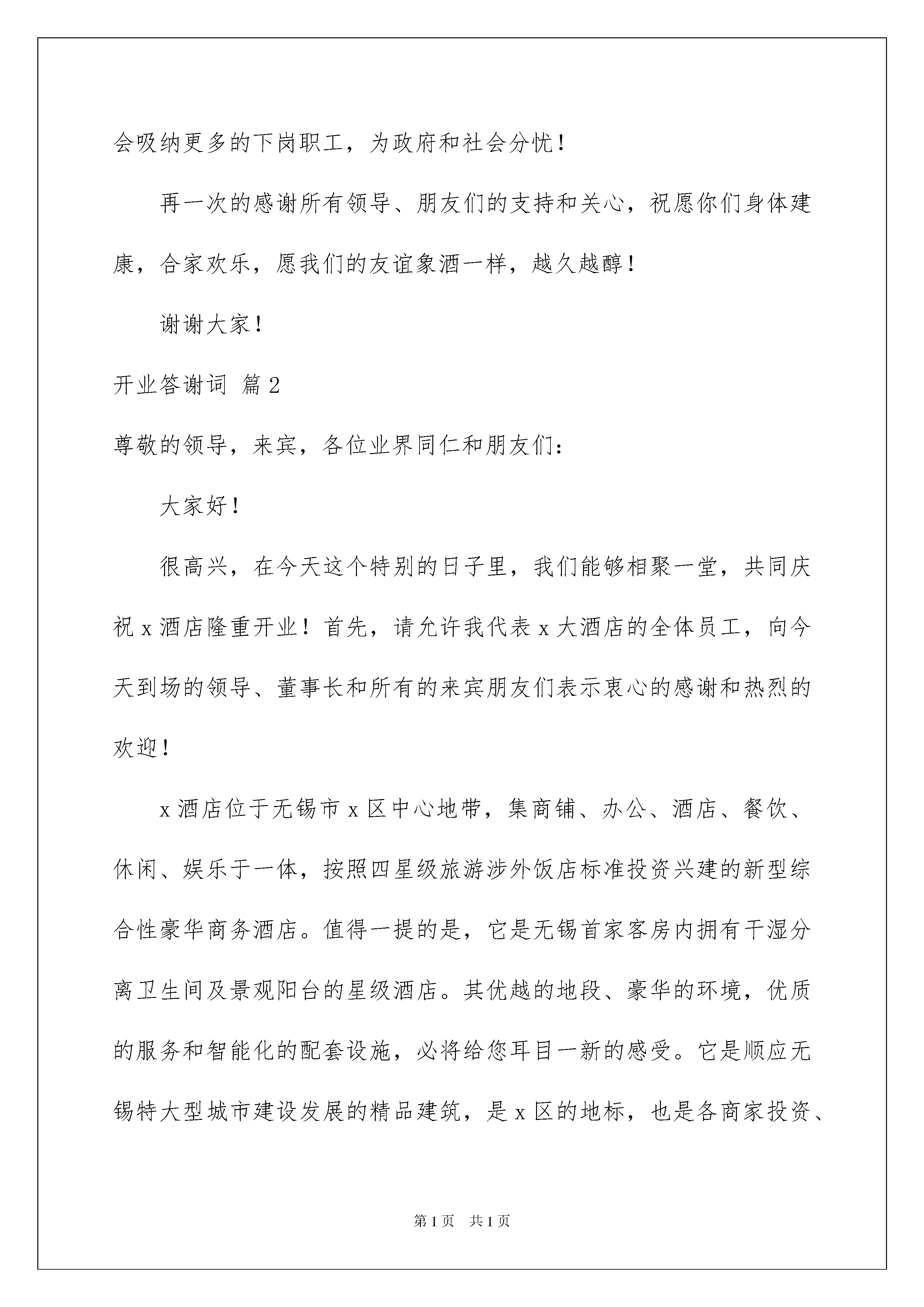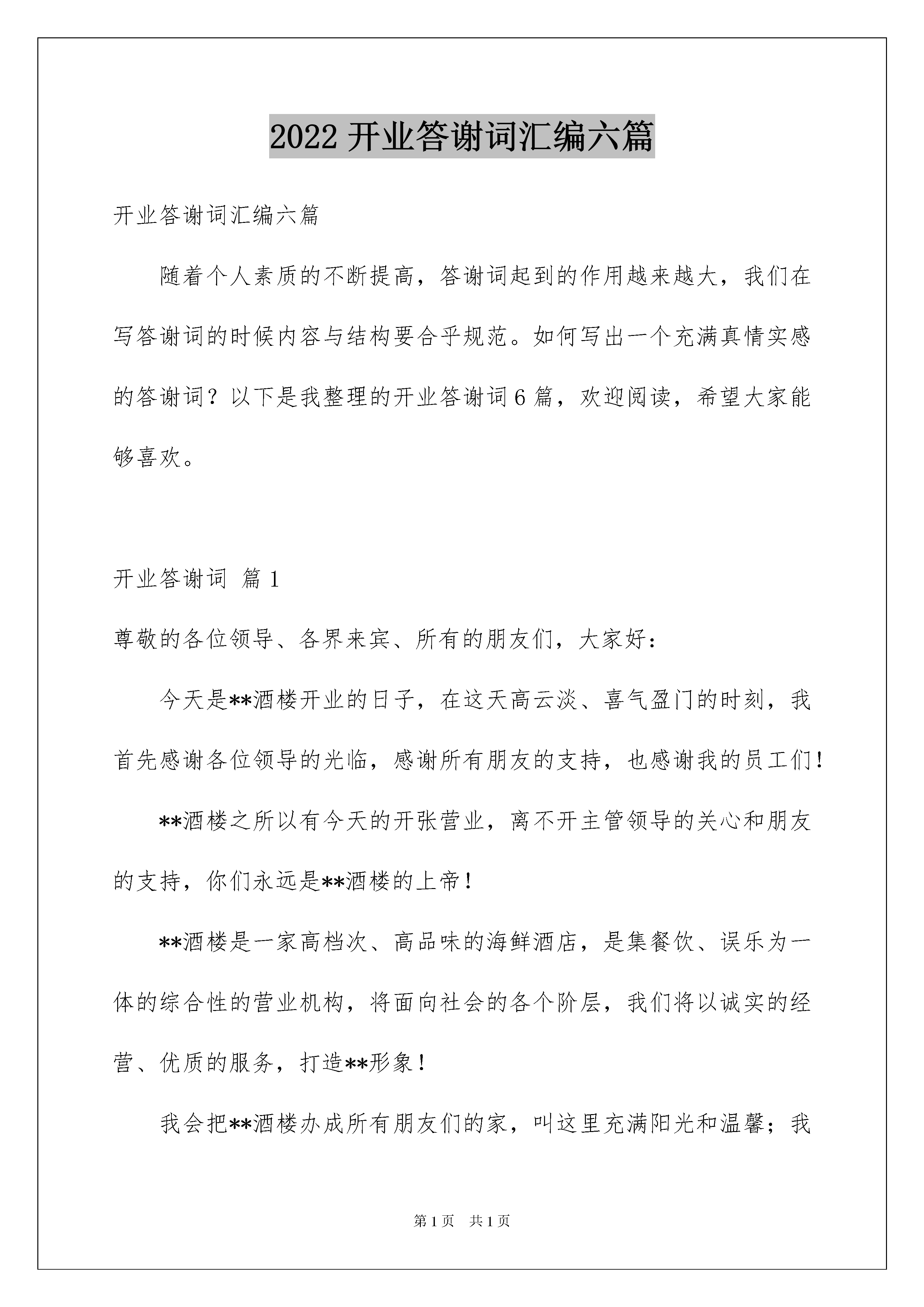 2022开业答谢词汇编六篇开业答谢词汇编六篇随着个人素质的不断提高,答谢词起到的作用越来越大,我们在写答谢词的时候内容与结构要合乎规范。如何写出一个充满真情实感的答谢词?以下是我整理的开业答谢词6篇,欢迎阅读,希望大家能够喜欢。开业答谢词篇1尊敬的各位领导、各界来宾、所有的朋友们,大家好:今天是**酒楼开业的日子,在这天高云淡、喜气盈门的时刻,我首先感谢各位领导的光临,感谢所有朋友的支持,也感谢我的员工们!**酒楼之所以有今天的开张营业,离不开主管领导的关心和朋友的支持,你们永远是**酒楼的上帝!**酒楼是一家高档次、高品味的海鲜酒店,是集餐饮、误乐为一体的综合性的营业机构,将面向社会的各个阶层,我们将以诚实的经营、优质的服务,打造**形象!我会把**酒楼办成所有朋友们的家,叫这里充满阳光和温馨;我会吸纳更多的下岗职工,为政府和社会分忧!再一次的感谢所有领导、朋友们的支持和关心,祝愿你们身体建康,合家欢乐,愿我们的友谊象酒一样,越久越醇!谢谢大家!开业答谢词篇2尊敬的领导,来宾,各位业界同仁和朋友们:大家好!很高兴,在今天这个特别的日子里,我们能够相聚一堂,共同庆祝x酒店隆重开业!首先,请允许我代表x大酒店的全体员工,向今天到场的领导、董事长和所有的来宾朋友们表示衷心的感谢和热烈的欢迎!x酒店位于无锡市x区中心地带,集商铺、办公、酒店、餐饮、休闲、娱乐于一体,按照四星级旅游涉外饭店标准投资兴建的新型综合性豪华商务酒店。值得一提的是,它是无锡首家客房内拥有干湿分离卫生间及景观阳台的星级酒店。其优越的地段、豪华的环境,优质的服务和智能化的配套设施,必将给您耳目一新的感受。它是顺应无锡特大型城市建设发展的精品建筑,是x区的地标,也是各商家投资、置业、理财的新途径。正如我们的董事长所说,x大酒店是“我们x人智慧和汗水的结晶”。它的筹划和诞生,倾注了我们x人的所有心血,凝聚了x全新的信念。欣慰的是,有这么多的朋友默默的关心和支持着我们,陪伴我们一路走来。其中,有x区领导的高度重视和政策指导,我们x集团高层的殷切关怀和鼎力扶持,有社会各界朋友的热心帮助等等,让我们感激不已。跨入新世纪,无锡的现代化建设突飞猛进,x区如火如荼,未来的竞争日益激烈。作为总经理,x大酒店的具体运营者,我深知自己肩负的重担和使命。我的一言一行,一举一动,都将和x酒店乃至整个无锡未来的建设发展联系在一起。但是,困难与希望同在,这么多朋友的关心和指导,是支撑x酒店存在并运作的信心和源泉!面对挑战,我坚信,x酒店必将市场上傲然挺立,拥有一席之地!为此,我将携凤凰大厦全体工作人员,用良好的业绩来回报各界,以不辜负领导、董事长和社会各界的期望!同时,我们x酒店全体员工,将坚持求变创新的开拓精神,和诸位业界同仁一起,全力以赴,共同致力于x区的建设发展,为无锡进一步的繁荣昌盛添上辉煌灿烂的一笔!正如我们x酒店的宗旨所阐述的一样,我们要作好无锡x区的地标和窗口,要奏响新区的最强音,要为无锡人民创造一个永不落幕的新都会!最后,我要特别感谢x区领导的莅临指导,感谢董事长于百忙之中能够亲临开业现场致词!再次感谢各位朋友的.光临!谢谢大家!开业答谢词篇3尊敬的各位领导、各位来宾、各位朋友:大家下午好!非常感谢各位能在百忙之中光临现场,参加xx的开业庆典。在此,我代表公司全体人员,向各位领导、各位来宾、各位朋友的到来表示热烈的欢迎!向xx给予关心、支持的各级主管部门、社会各界同仁表示衷心的感谢!今天,xx得以顺利开张,归功于各级领导的关心关爱,归功于各位朋友的鼎力相助、归功于公司全体工作人员的辛勤劳动。无论是从公司发展规划的提出、从办公地点选择到今天正式开业,都得到了在座各位的真情帮助、大力支持。能与xxx携手合作,担任xx的负责人,我感到十分荣幸,同时,深感责任重大。新的机遇,新的挑战,还希望能得到各位领导、各位朋友一如既往的关心和支持。我们将始终秉承勤恳诚信、惠人达己的企业文化,创新管理模式,不断将公司做大做强,为xx创造新的发展业绩。最后,衷心祝愿各位领导、各位来宾身体健康、万事如意!祝各位同仁、各位朋友生意兴隆、财源广进!谢谢大家!开业答谢词篇4在今天这个晴空万里、艳阳高照的吉时良辰,大家欢聚一堂,共同见证xx公司开业庆典。借此机会,我谨代表xx公司全体员工,向光临今天开业庆典的各位领导、各位嘉宾、各位朋友表示热烈的欢迎!向与我们同共济、休戚与共的各位客户表示衷心的感谢!xx县沃野千里,物产丰富,钟灵毓秀,人杰地灵,地理位置得天独厚,交通运输四通八达。伴随着改革开放步伐的加快,我县经济在县委、县政府的正确领导和勤劳勇敢的xx人