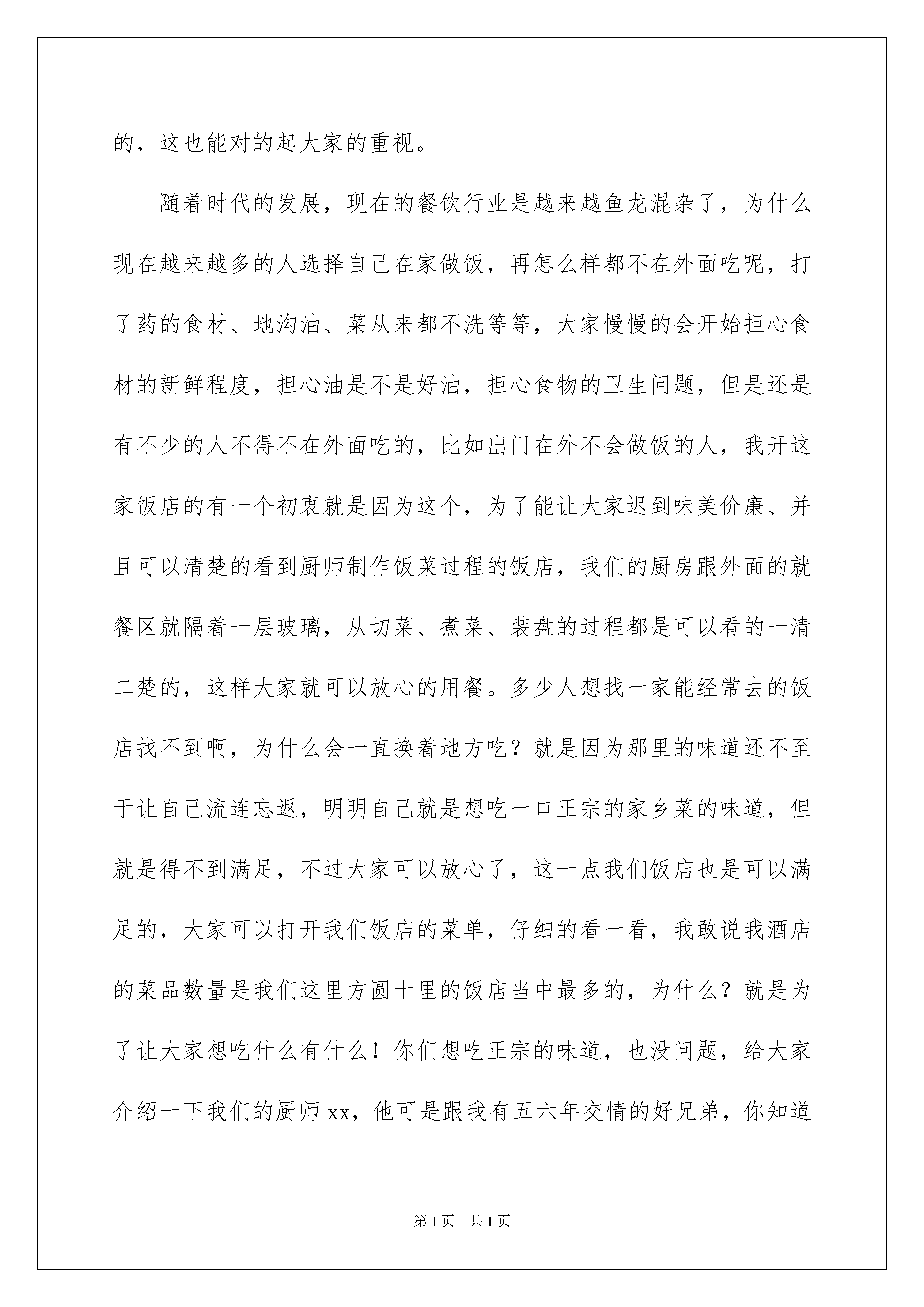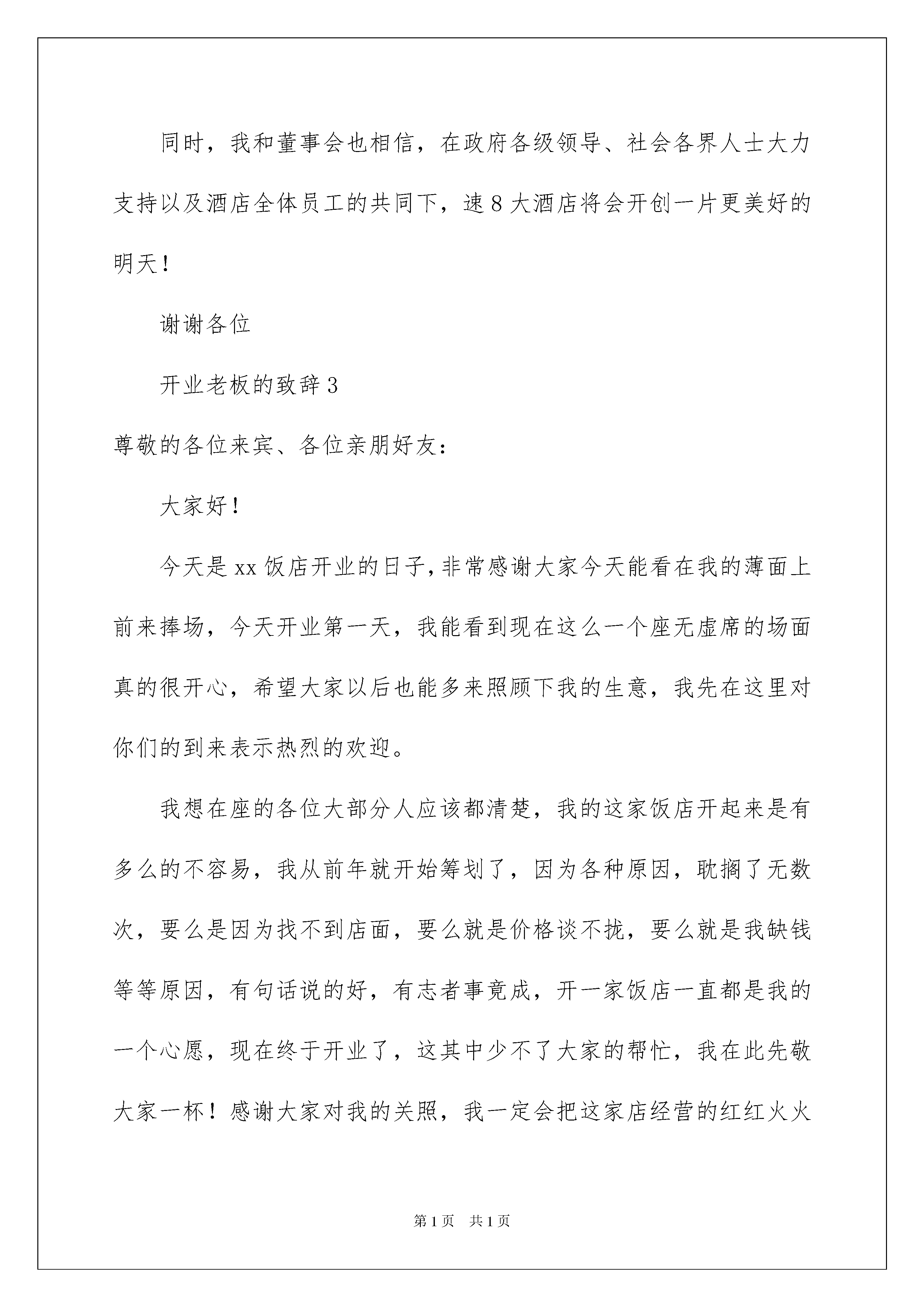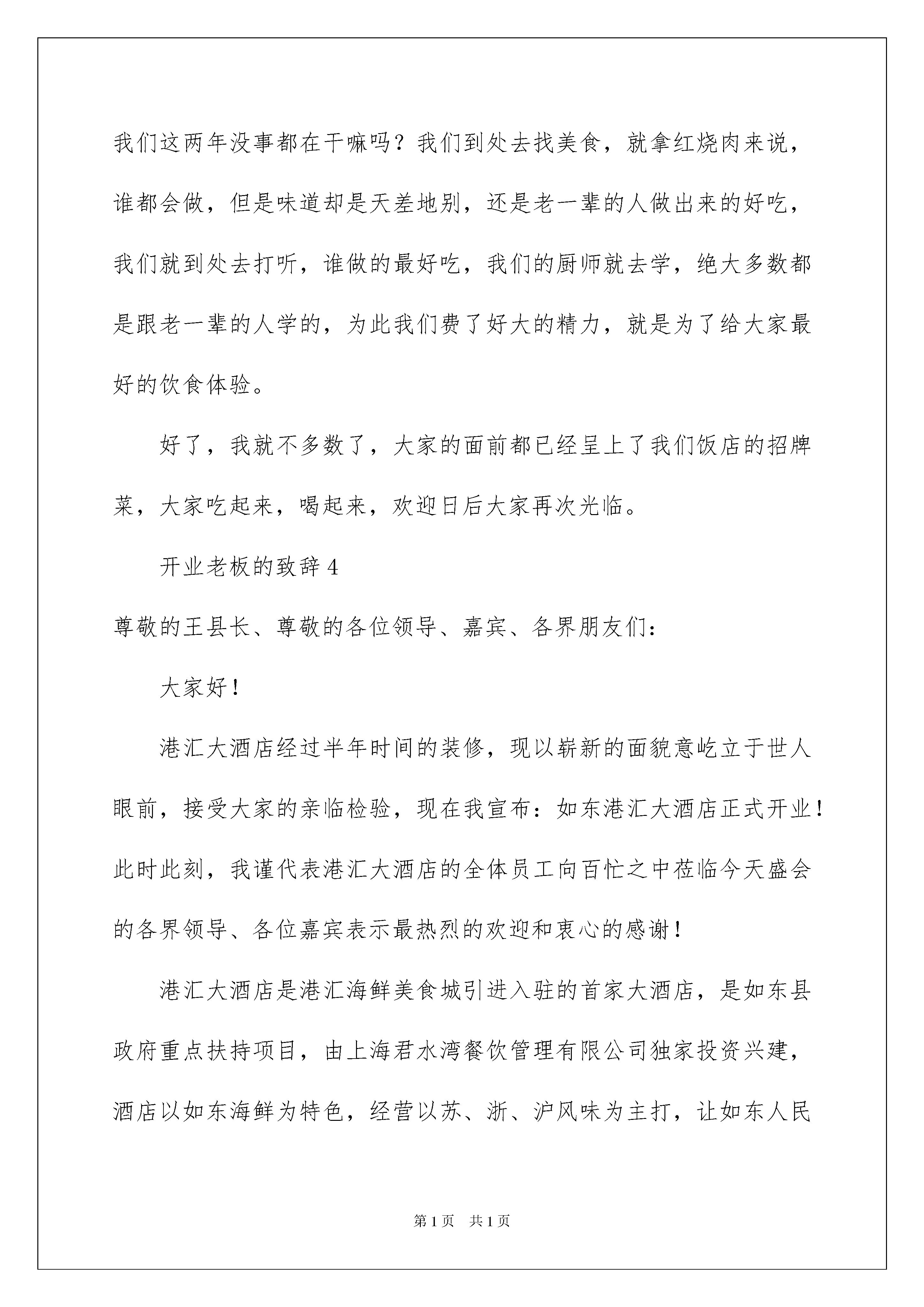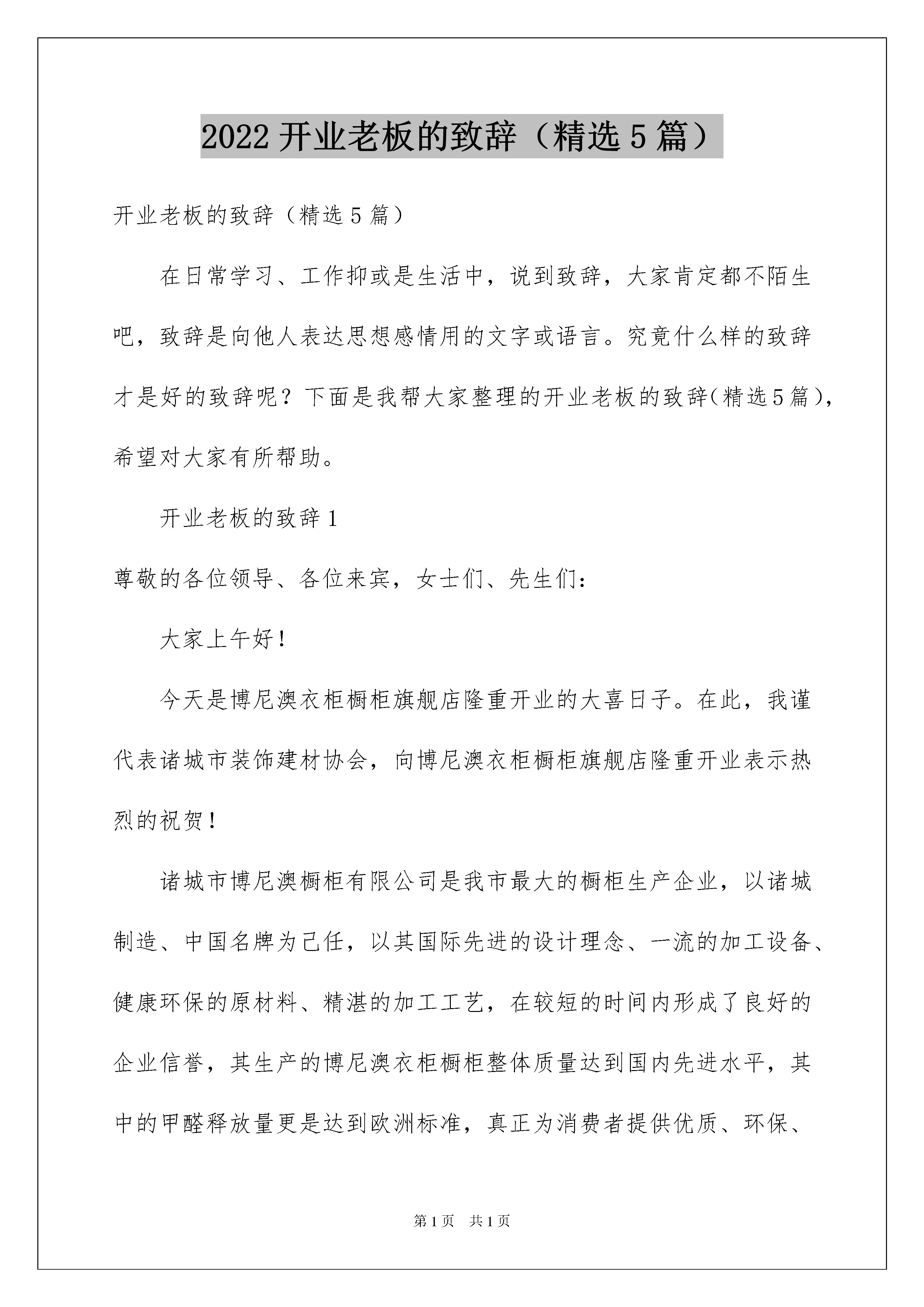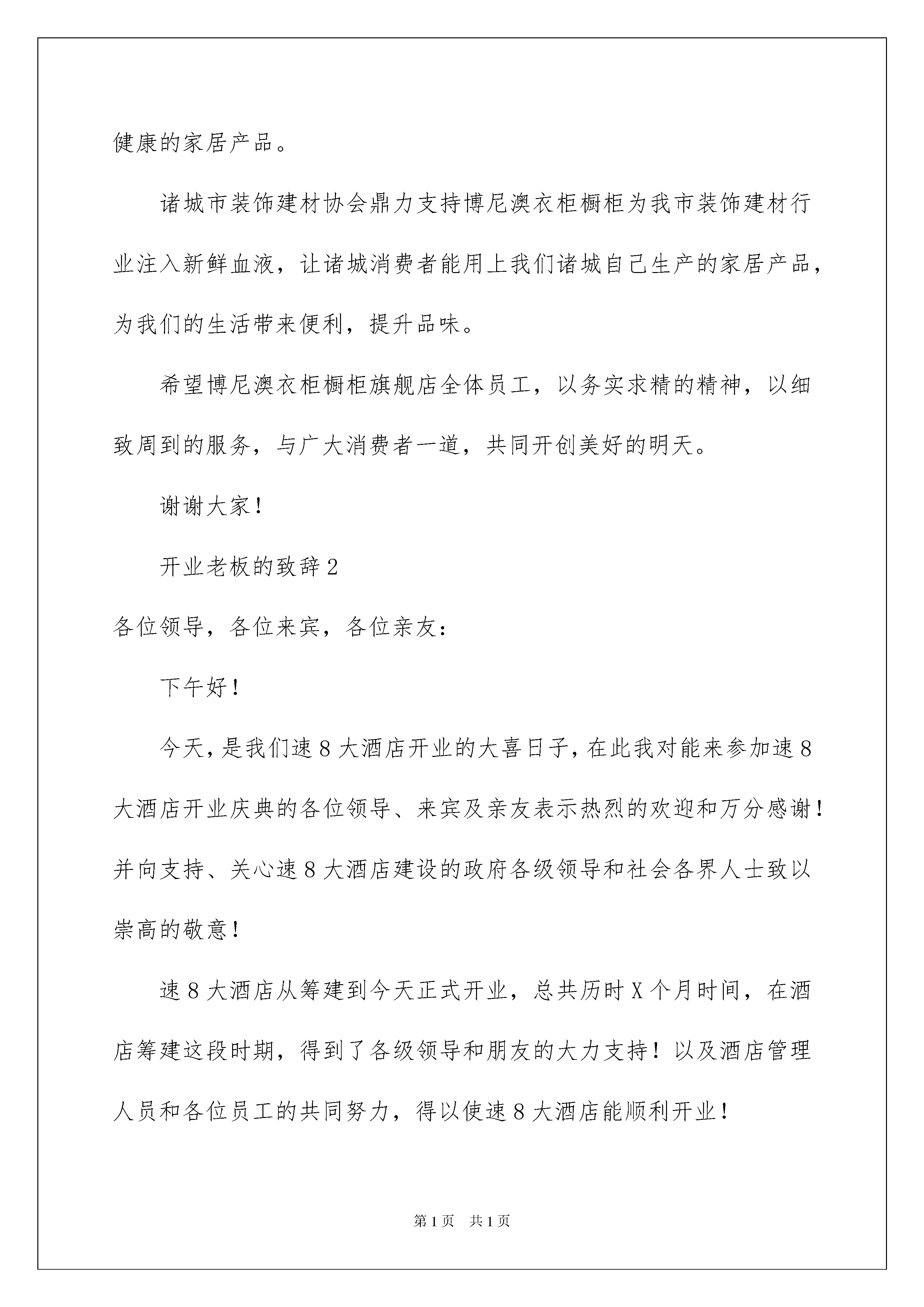 2022开业老板的致辞(精选5篇)开业老板的致辞(精选5篇)在日常学习、工作抑或是生活中,说到致辞,大家肯定都不陌生吧,致辞是向他人表达思想感情用的文字或语言。究竟什么样的致辞才是好的致辞呢?下面是我帮大家整理的开业老板的致辞(精选5篇),希望对大家有所帮助。开业老板的致辞1尊敬的各位领导、各位来宾,女士们、先生们:大家上午好!今天是博尼澳衣柜橱柜旗舰店隆重开业的大喜日子。在此,我谨代表诸城市装饰建材协会,向博尼澳衣柜橱柜旗舰店隆重开业表示热烈的祝贺!诸城市博尼澳橱柜有限公司是我市最大的橱柜生产企业,以诸城制造、中国名牌为己任,以其国际先进的设计理念、一流的加工设备、健康环保的原材料、精湛的加工工艺,在较短的时间内形成了良好的企业信誉,其生产的博尼澳衣柜橱柜整体质量达到国内先进水平,其中的甲醛释放量更是达到欧洲标准,真正为消费者提供优质、环保、健康的家居产品。诸城市装饰建材协会鼎力支持博尼澳衣柜橱柜为我市装饰建材行业注入新鲜血液,让诸城消费者能用上我们诸城自己生产的家居产品,为我们的生活带来便利,提升品味。希望博尼澳衣柜橱柜旗舰店全体员工,以务实求精的精神,以细致周到的服务,与广大消费者一道,共同开创美好的明天。谢谢大家!开业老板的致辞2各位领导,各位来宾,各位亲友:下午好!今天,是我们速8大酒店开业的大喜日子,在此我对能来参加速8大酒店开业庆典的各位领导、来宾及亲友表示热烈的欢迎和万分感谢!并向支持、关心速8大酒店建设的政府各级领导和社会各界人士致以崇高的敬意!速8大酒店从筹建到今天正式开业,总共历时X个月时间,在酒店筹建这段时期,得到了各级领导和朋友的大力支持!以及酒店管理人员和各位员工的共同努力,得以使速8大酒店能顺利开业!同时,我和董事会也相信,在政府各级领导、社会各界人士大力支持以及酒店全体员工的共同下,速8大酒店将会开创一片更美好的明天!谢谢各位开业老板的致辞3尊敬的各位来宾、各位亲朋好友:大家好!今天是xx饭店开业的日子,非常感谢大家今天能看在我的薄面上前来捧场,今天开业第一天,我能看到现在这么一个座无虚席的场面真的很开心,希望大家以后也能多来照顾下我的生意,我先在这里对你们的到来表示热烈的欢迎。我想在座的各位大部分人应该都清楚,我的这家饭店开起来是有多么的不容易,我从前年就开始筹划了,因为各种原因,耽搁了无数次,要么是因为找不到店面,要么就是价格谈不拢,要么就是我缺钱等等原因,有句话说的好,有志者事竟成,开一家饭店一直都是我的一个心愿,现在终于开业了,这其中少不了大家的帮忙,我在此先敬大家一杯!感谢大家对我的关照,我一定会把这家店经营的红红火火的,这也能对的起大家的重视。随着时代的发展,现在的餐饮行业是越来越鱼龙混杂了,为什么现在越来越多的人选择自己在家做饭,再怎么样都不在外面吃呢,打了药的食材、地沟油、菜从来都不洗等等,大家慢慢的会开始担心食材的新鲜程度,担心油是不是好油,担心食物的卫生问题,但是还是有不少的人不得不在外面吃的,比如出门在外不会做饭的人,我开这家饭店的有一个初衷就是因为这个,为了能让大家迟到味美价廉、并且可以清楚的看到厨师制作饭菜过程的饭店,我们的厨房跟外面的就餐区就隔着一层玻璃,从切菜、煮菜、装盘的过程都是可以看的一清二楚的,这样大家就可以放心的用餐。多少人想找一家能经常去的饭店找不到啊,为什么会一直换着地方吃?就是因为那里的味道还不至于让自己流连忘返,明明自己就是想吃一口正宗的家乡菜的味道,但就是得不到满足,不过大家可以放心了,这一点我们饭店也是可以满足的,大家可以打开我们饭店的菜单,仔细的看一看,我敢说我酒店的菜品数量是我们这里方圆十里的饭店当中最多的,为什么?就是为了让大家想吃什么有什么!你们想吃正宗的味道,也没问题,给大家介绍一下我们的厨师xx,他可是跟我有五六年交情的好兄弟,你知道我们这两年没事都在干嘛吗?我们到处去找美食,就拿红烧肉来说,谁都会做,但是味道却是天差地别,还是老一辈的人做出来的好吃,我们就到处去打听,谁做的最好吃,我们的厨师就去学,绝大多数都是跟老一辈的人学的,为此我们费了好大的精力,就是为了给大家最好的饮食体验。好了,我就不多数了,大家的面前都已经呈上了我们饭店的招牌菜,大家吃起来,喝起来,欢迎日后大家再次光临。开业老板的致辞4尊敬的王县长、尊敬的各位领导、嘉宾、各界朋友们:大家好!港汇大酒店经过半年时间的装修,现以崭新的面貌意屹立于世人眼前,接受大家的亲临检验,现在我宣布:如东港汇大酒店正式开业!此时此刻,我谨代表港汇大酒店的全体员工向百忙之中莅临今天盛会的各界领导、各位嘉宾表示最热烈的欢迎和衷心的感谢!港
