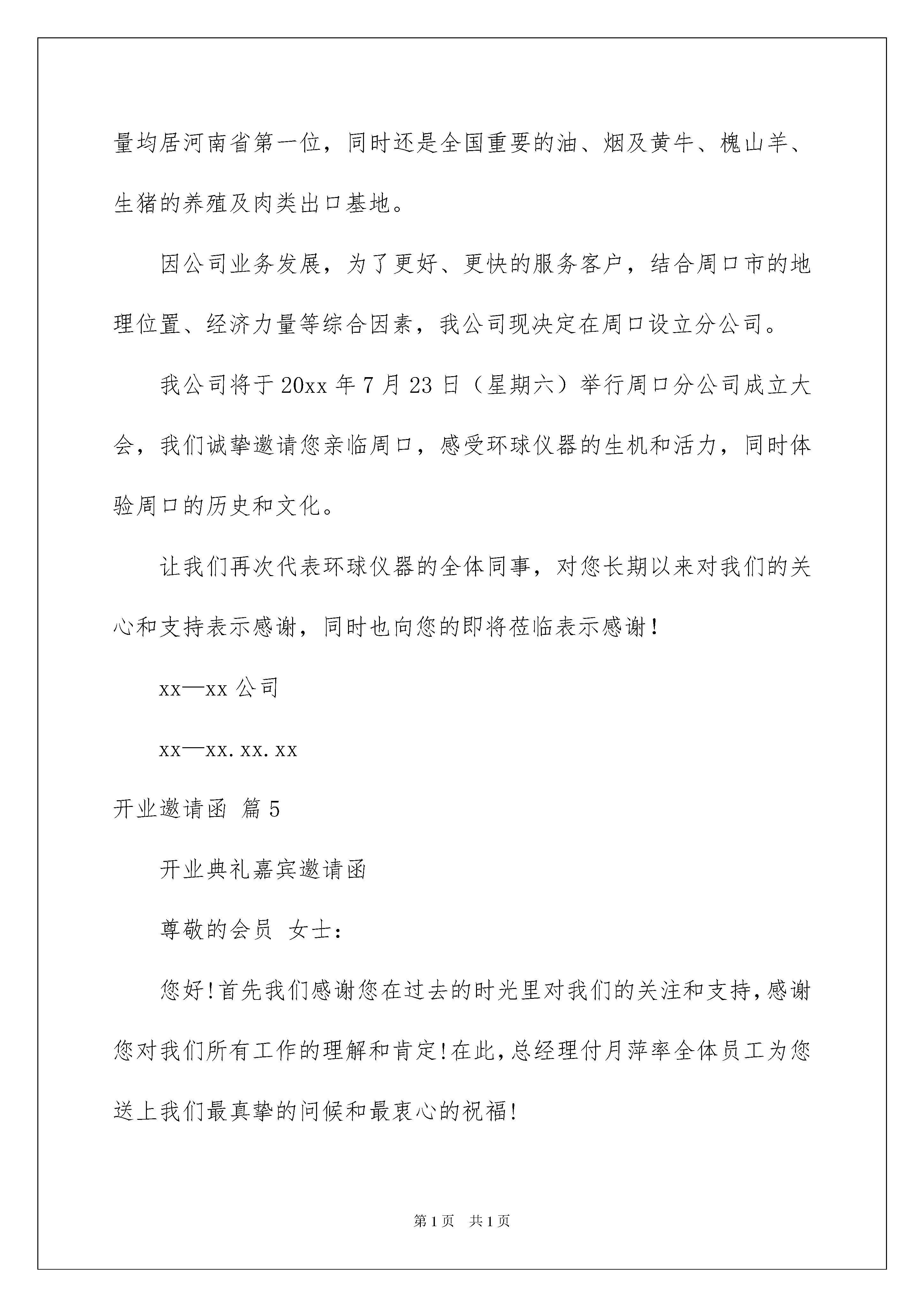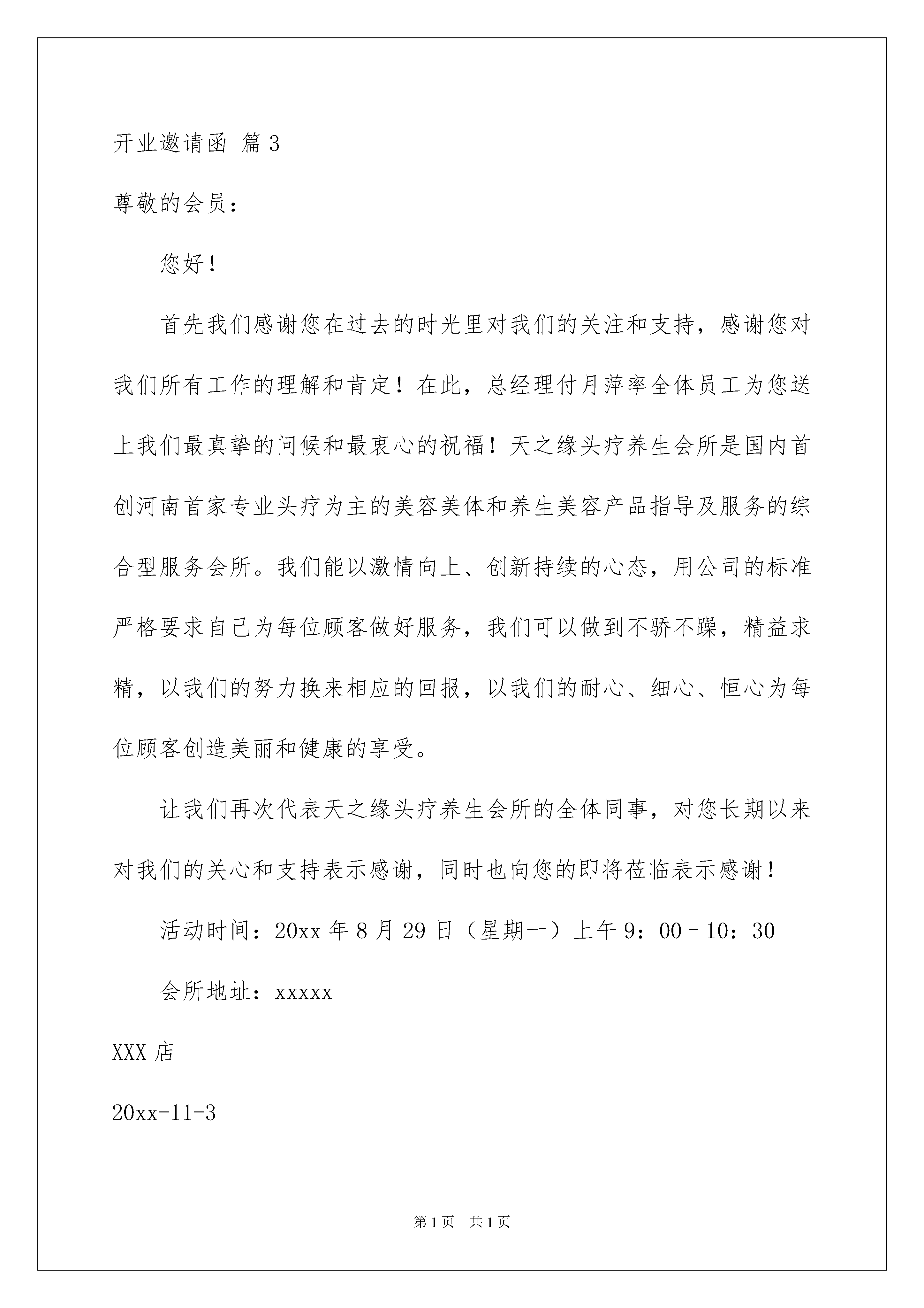 2022开业邀请函汇编8篇开业邀请函汇编8篇邀请函是商务礼仪与世俗礼仪的其中一部分。在充满活力,日益开放的今天,邀请函在活动中的使用越来越广泛,我敢肯定,大部分人都对拟定邀请函很是头疼的,下面是我收集整理的开业邀请函8篇,欢迎大家借鉴与参考,希望对大家有所帮助。开业邀请函篇1各位领导、各界同仁、各位家长:广州市海珠区太阳花儿童潜能开发中心将于20xx年2月25日举行太阳花新场地开业典礼义讲活动,希望能邀请您前来参加。广州市海珠区太阳花新场地的开业是本中心一个重要的里程,而这正是上级领导、社会各界、各位自闭症专家、家长的大力支持的成果。太阳花全体同仁真诚的邀请您的光临,谢谢!当天活动内容安排:上午:主题:居家干预16:40开业典礼活动圆满结束。注:如需参加开业典礼的家长请在2月18号前报名,额满即止。开业邀请函篇2尊敬的XX先生:您好!首先感谢您在过去的时光里对XX公司的关注和支持!感谢您对我们所有工作的理解和肯定!在此,总经理XX携公司全体员工为您送上最真挚的问候和最衷心的祝福!xx公司是xxx集团下属的一家子公司,并将于xxxx年xx月xx日(星期x)举行开业庆典,点火投产,诚挚邀请您的莅临。时间:xxxx年xx月xx日x点x分地点:xxxx联系人:xxxx联系电话:xxxx手机:xxxx具体到达时间、出席人数,请予以确认并回复,以便我方安排具体招待事宜。此致Xxx集团x年x月x日开业邀请函篇3尊敬的会员:您好!首先我们感谢您在过去的时光里对我们的关注和支持,感谢您对我们所有工作的理解和肯定!在此,总经理付月萍率全体员工为您送上我们最真挚的问候和最衷心的祝福!天之缘头疗养生会所是国内首创河南首家专业头疗为主的美容美体和养生美容产品指导及服务的综合型服务会所。我们能以激情向上、创新持续的心态,用公司的标准严格要求自己为每位顾客做好服务,我们可以做到不骄不躁,精益求精,以我们的努力换来相应的回报,以我们的耐心、细心、恒心为每位顾客创造美丽和健康的享受。让我们再次代表天之缘头疗养生会所的全体同事,对您长期以来对我们的关心和支持表示感谢,同时也向您的即将莅临表示感谢!活动时间:20xx年8月29日(星期一)上午9:00–10:30会所地址:xxxxxXXX店20xx-11-3开业邀请函篇4尊敬的先生/女士:您好!首先我们感谢您在过去的时光里对我们的关注和支持,感谢您对我们所有工作的理解和肯定!在此,董事长马丽率全体员工为您送上我们最真挚的问候和最衷心的祝福!河南环球仪器设备有限公司是河南远诚实业有限公司的子公司,是专门经销先进科学仪器的高科技企业。所经营产品涵盖高校、科研院所、疾控、畜牧、农业、林业、制药、药检、质检、检验检疫、环保、石化、公路、纺织、建材、能源等多行业,在同行业中具有良好的形象和信誉,客户美誉度100%,供应商信用度100%。我们拥有一支“敬业、专业、精业”的销售服务团队,为用户提供售前顾问式、售中一站式、售后本地化时效服务。我们将秉承“用户至上,信誉第一”的宗旨,一如既往的为用户提供全球最好的产品和最佳的服务!周口市位于河南省东南部,东临安徽阜阳,西接河南漯河市、许昌市,南与驻马店市相连,北与开封、商丘市接壤,耕地面积、总人口均居河南省第2位。周口市距今有6000多年的文明史,粮、棉总产量均居河南省第一位,同时还是全国重要的油、烟及黄牛、槐山羊、生猪的养殖及肉类出口基地。因公司业务发展,为了更好、更快的服务客户,结合周口市的地理位置、经济力量等综合因素,我公司现决定在周口设立分公司。我公司将于20xx年7月23日(星期六)举行周口分公司成立大会,我们诚挚邀请您亲临周口,感受环球仪器的生机和活力,同时体验周口的历史和文化。让我们再次代表环球仪器的全体同事,对您长期以来对我们的关心和支持表示感谢,同时也向您的即将莅临表示感谢!xx—xx公司xx—xx.xx.xx开业邀请函篇5开业典礼嘉宾邀请函尊敬的会员女士:您好!首先我们感谢您在过去的时光里对我们的关注和支持,感谢您对我们所有工作的理解和肯定!在此,总经理付月萍率全体员工为您送上我们最真挚的问候和最衷心的祝福!天之缘头疗养生会所是国内首创河南首家专业头疗为主的美容美体和养生美容产品指导及服务的综合型服务会所。我们能以激情向上、创新持续的心态,用公司的标准严格要求自己为每位顾客做好服务,我们可以做到不骄不躁,精益求精,以我们的努力换来相应的回报,以我们的耐心、细心、恒心为每位顾客创造美丽和健康的享受。天之缘头疗养生洗护区别于传统的泰式洗护,他以原汁原味的泰国古法洗头为基础,融入中医养生的外调经络理念,通过泰国古法