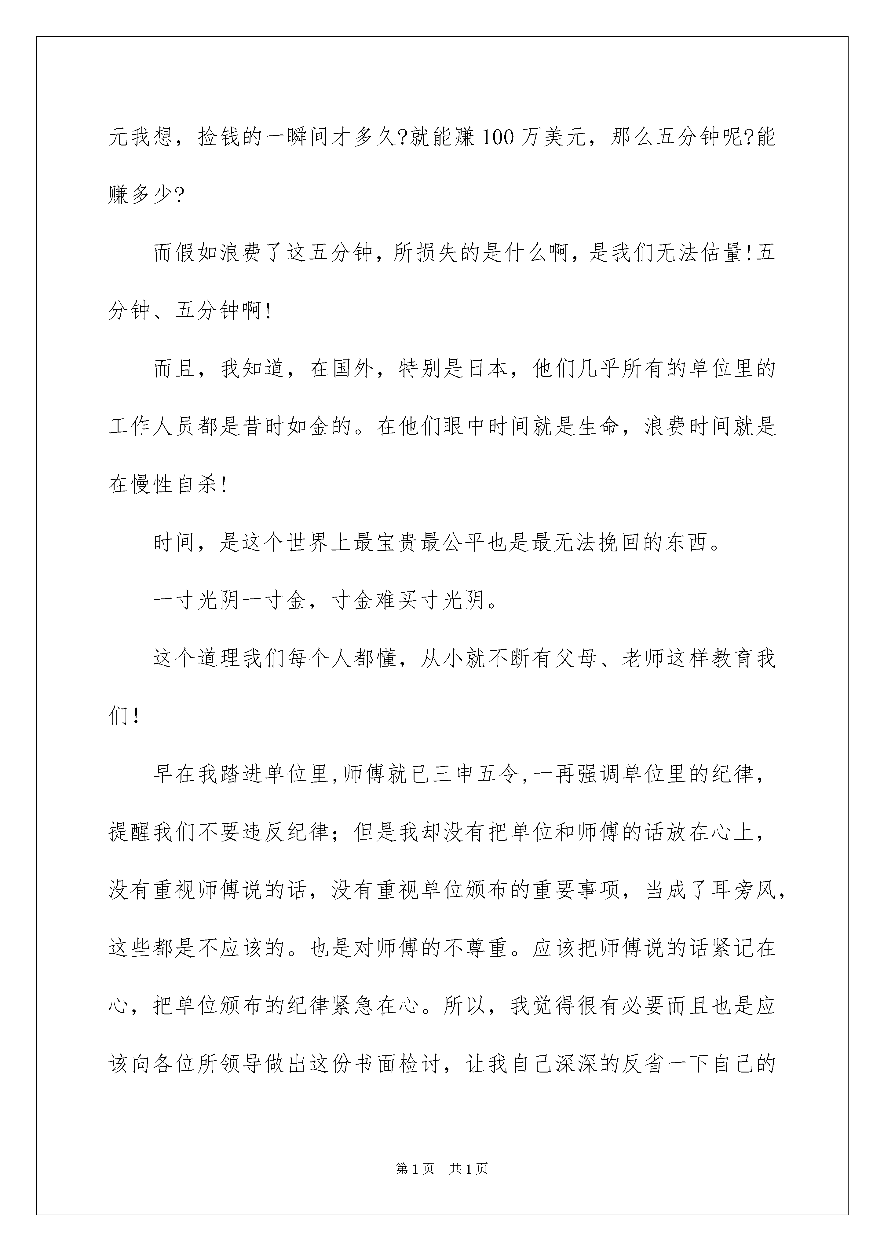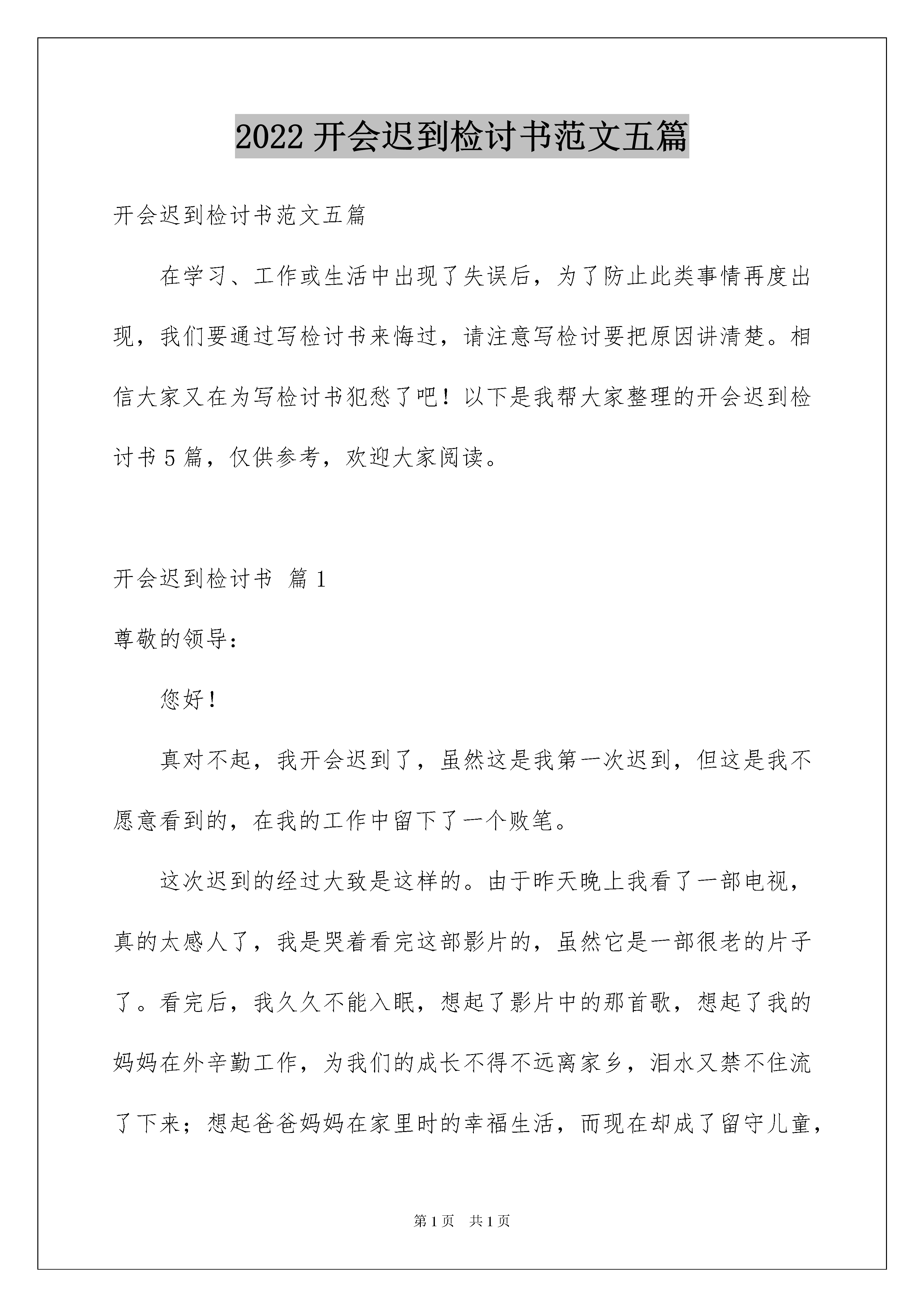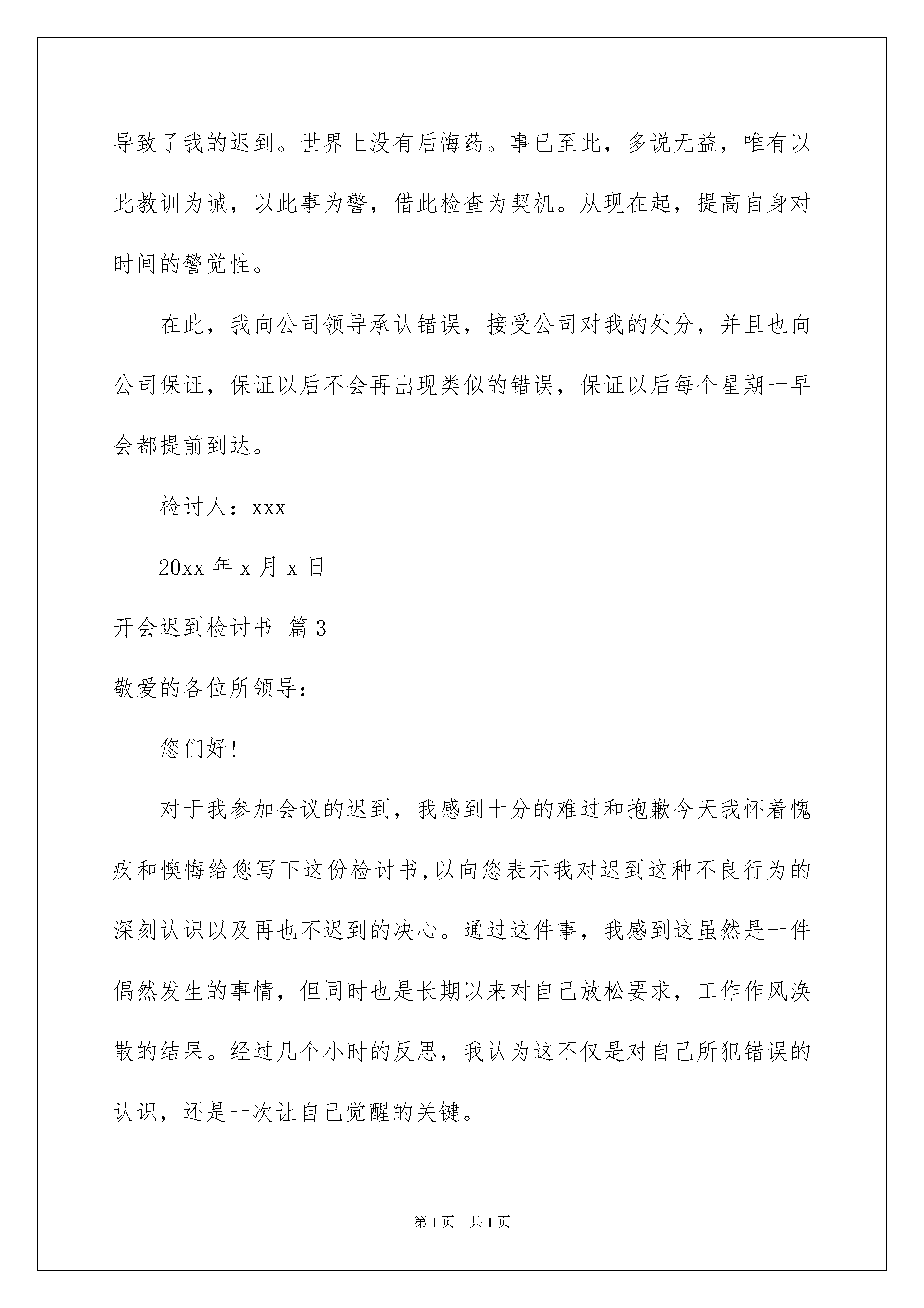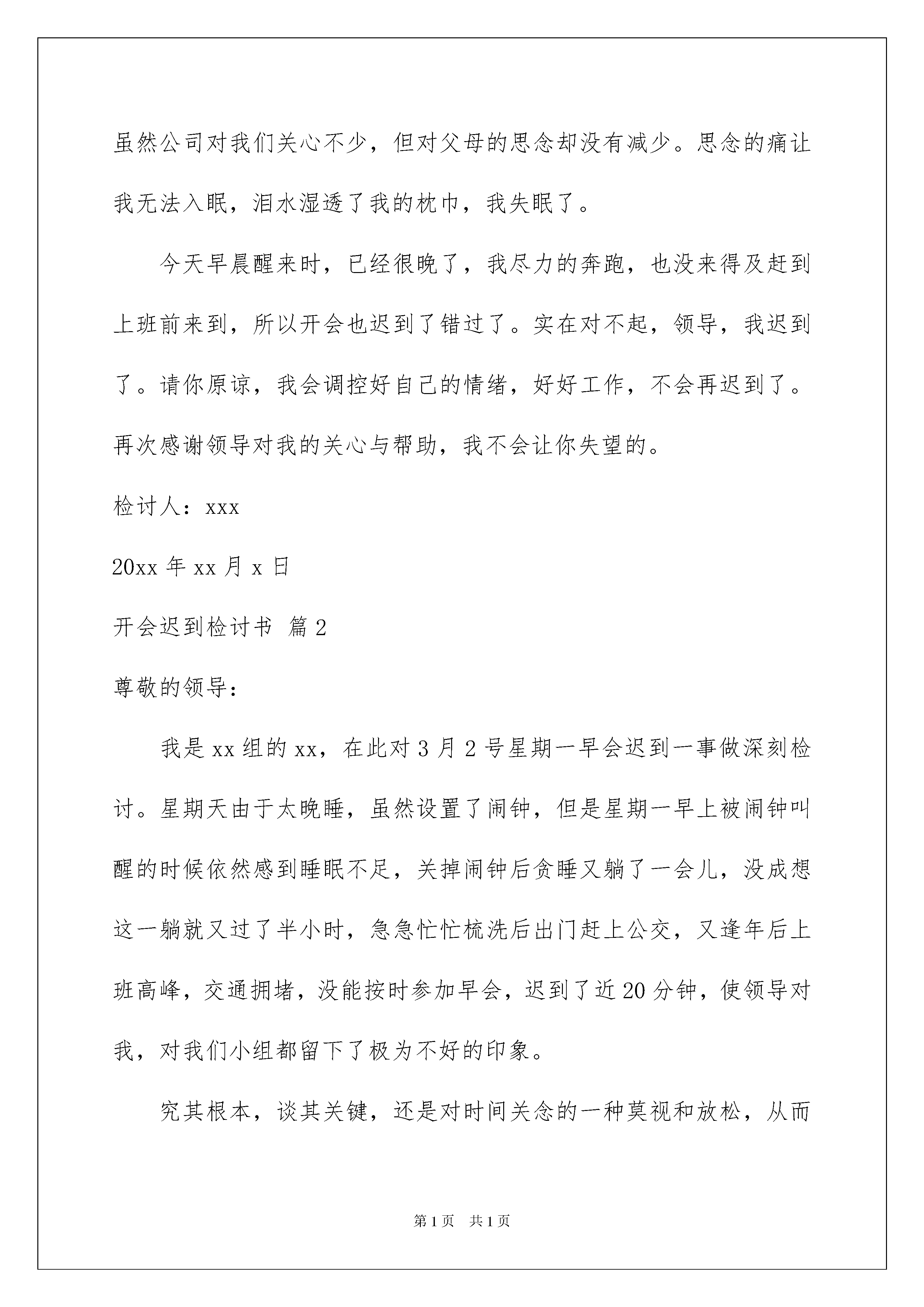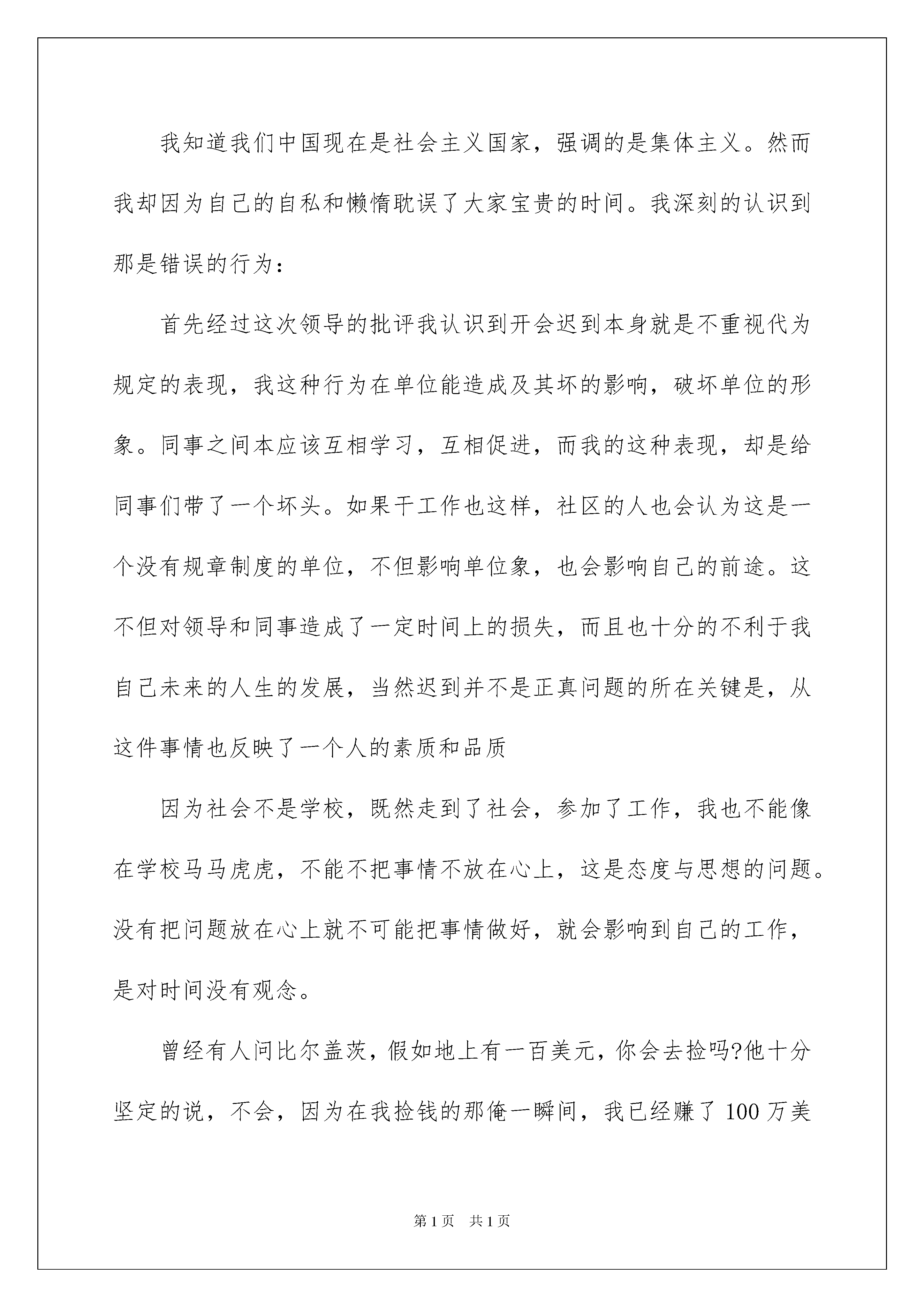 2022开会迟到检讨书范文五篇开会迟到检讨书范文五篇在学习、工作或生活中出现了失误后,为了防止此类事情再度出现,我们要通过写检讨书来悔过,请注意写检讨要把原因讲清楚。相信大家又在为写检讨书犯愁了吧!以下是我帮大家整理的开会迟到检讨书5篇,仅供参考,欢迎大家阅读。开会迟到检讨书篇1尊敬的领导:您好!真对不起,我开会迟到了,虽然这是我第一次迟到,但这是我不愿意看到的,在我的工作中留下了一个败笔。这次迟到的经过大致是这样的。由于昨天晚上我看了一部电视,真的太感人了,我是哭着看完这部影片的,虽然它是一部很老的片子了。看完后,我久久不能入眠,想起了影片中的那首歌,想起了我的妈妈在外辛勤工作,为我们的成长不得不远离家乡,泪水又禁不住流了下来;想起爸爸妈妈在家里时的幸福生活,而现在却成了留守儿童,虽然公司对我们关心不少,但对父母的思念却没有减少。思念的痛让我无法入眠,泪水湿透了我的枕巾,我失眠了。今天早晨醒来时,已经很晚了,我尽力的奔跑,也没来得及赶到上班前来到,所以开会也迟到了错过了。实在对不起,领导,我迟到了。请你原谅,我会调控好自己的情绪,好好工作,不会再迟到了。再次感谢领导对我的关心与帮助,我不会让你失望的。检讨人:xxx20xx年xx月x日开会迟到检讨书篇2尊敬的领导:我是xx组的xx,在此对3月2号星期一早会迟到一事做深刻检讨。星期天由于太晚睡,虽然设置了闹钟,但是星期一早上被闹钟叫醒的时候依然感到睡眠不足,关掉闹钟后贪睡又躺了一会儿,没成想这一躺就又过了半小时,急急忙忙梳洗后出门赶上公交,又逢年后上班高峰,交通拥堵,没能按时参加早会,迟到了近20分钟,使领导对我,对我们小组都留下了极为不好的印象。究其根本,谈其关键,还是对时间关念的一种莫视和放松,从而导致了我的迟到。世界上没有后悔药。事已至此,多说无益,唯有以此教训为诫,以此事为警,借此检查为契机。从现在起,提高自身对时间的警觉性。在此,我向公司领导承认错误,接受公司对我的处分,并且也向公司保证,保证以后不会再出现类似的错误,保证以后每个星期一早会都提前到达。检讨人:xxx20xx年x月x日开会迟到检讨书篇3敬爱的各位所领导:您们好!对于我参加会议的迟到,我感到十分的难过和抱歉今天我怀着愧疚和懊悔给您写下这份检讨书,以向您表示我对迟到这种不良行为的深刻认识以及再也不迟到的决心。通过这件事,我感到这虽然是一件偶然发生的事情,但同时也是长期以来对自己放松要求,工作作风涣散的结果。经过几个小时的反思,我认为这不仅是对自己所犯错误的认识,还是一次让自己觉醒的关键。我知道我们中国现在是社会主义国家,强调的是集体主义。然而我却因为自己的自私和懒惰耽误了大家宝贵的时间。我深刻的认识到那是错误的行为:首先经过这次领导的批评我认识到开会迟到本身就是不重视代为规定的表现,我这种行为在单位能造成及其坏的影响,破坏单位的形象。同事之间本应该互相学习,互相促进,而我的这种表现,却是给同事们带了一个坏头。如果干工作也这样,社区的人也会认为这是一个没有规章制度的单位,不但影响单位象,也会影响自己的前途。这不但对领导和同事造成了一定时间上的损失,而且也十分的不利于我自己未来的人生的发展,当然迟到并不是正真问题的所在关键是,从这件事情也反映了一个人的素质和品质因为社会不是学校,既然走到了社会,参加了工作,我也不能像在学校马马虎虎,不能不把事情不放在心上,这是态度与思想的问题。没有把问题放在心上就不可能把事情做好,就会影响到自己的工作,是对时间没有观念。曾经有人问比尔盖茨,假如地上有一百美元,你会去捡吗?他十分坚定的说,不会,因为在我捡钱的那俺一瞬间,我已经赚了100万美元我想,捡钱的一瞬间才多久?就能赚100万美元,那么五分钟呢?能赚多少?而假如浪费了这五分钟,所损失的是什么啊,是我们无法估量!五分钟、五分钟啊!而且,我知道,在国外,特别是日本,他们几乎所有的单位里的工作人员都是昔时如金的。在他们眼中时间就是生命,浪费时间就是在慢性自杀!时间,是这个世界上最宝贵最公平也是最无法挽回的东西。一寸光阴一寸金,寸金难买寸光阴。这个道理我们每个人都懂,从小就不断有父母、老师这样教育我们!早在我踏进单位里,师傅就已三申五令,一再强调单位里的纪律,提醒我们不要违反纪律;但是我却没有把单位和师傅的话放在心上,没有重视师傅说的话,没有重视单位颁布的重要事项,当成了耳旁风,这些都是不应该的。也是对师傅的不尊重。应该把师傅说的话紧记在心,把单位颁布的纪律紧急在心。所以,我觉得很有必要而且也是应该向各位所领导做出这份书面检讨,让我自己深深的反省一下自己的错误。对不起,各位所领
