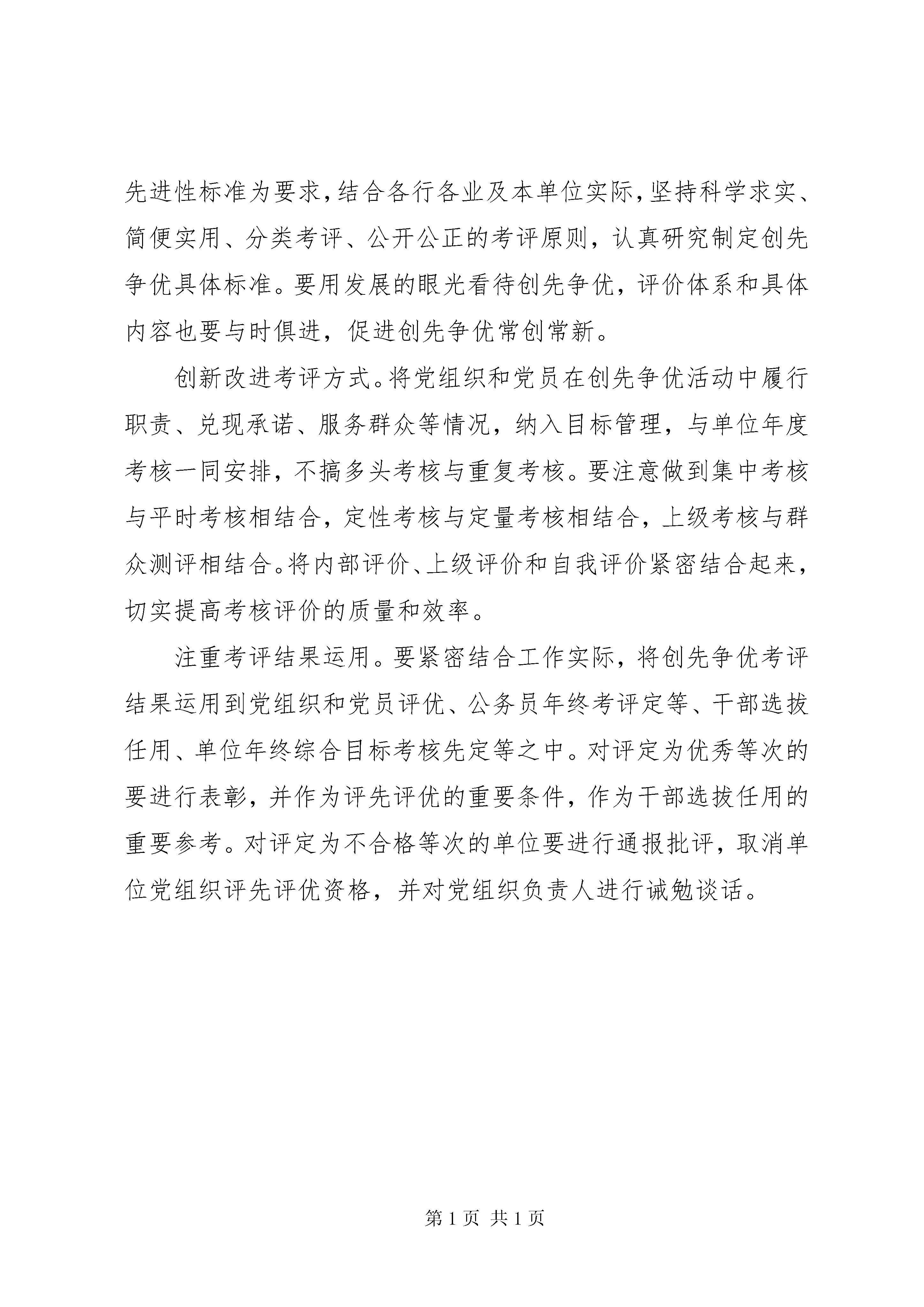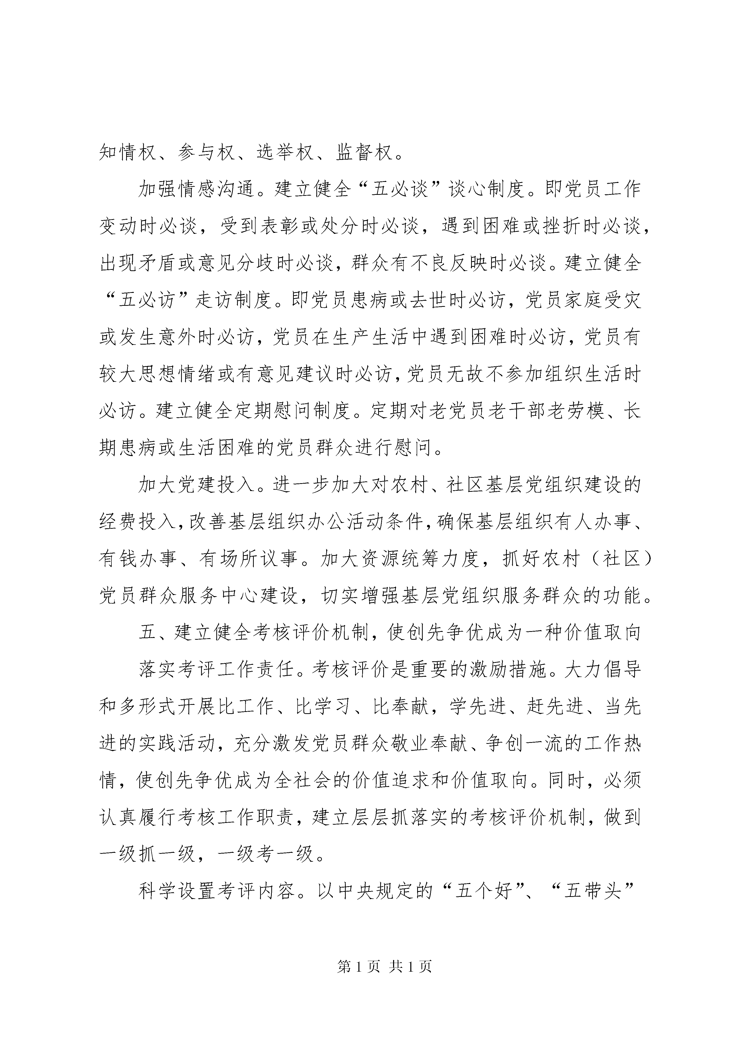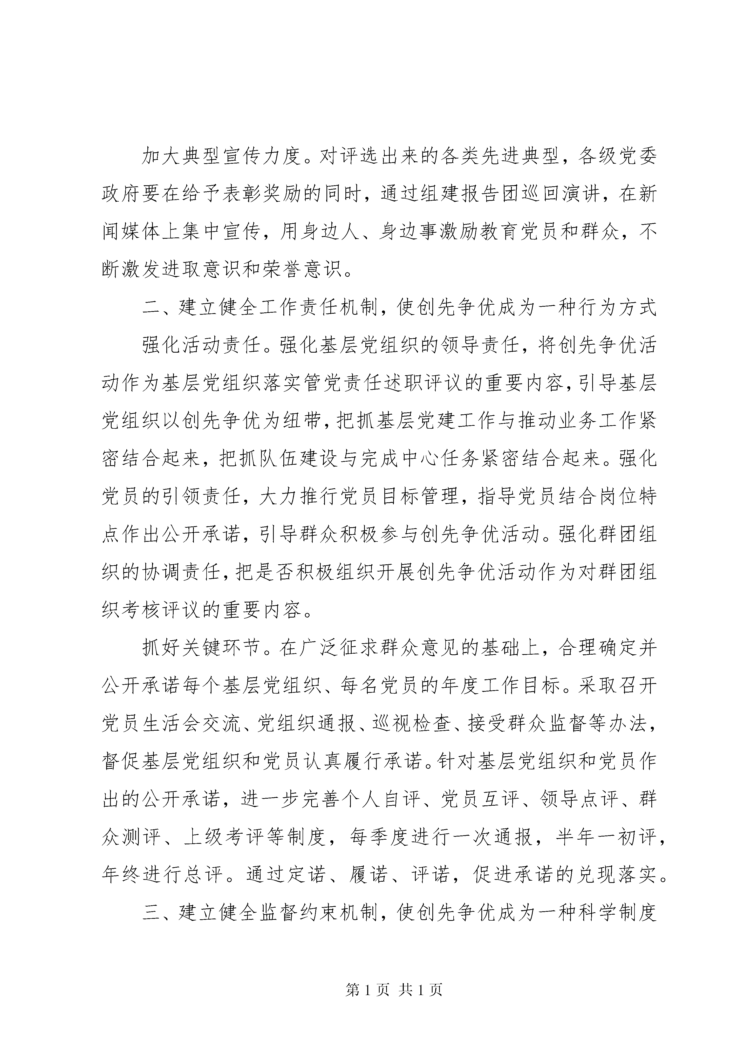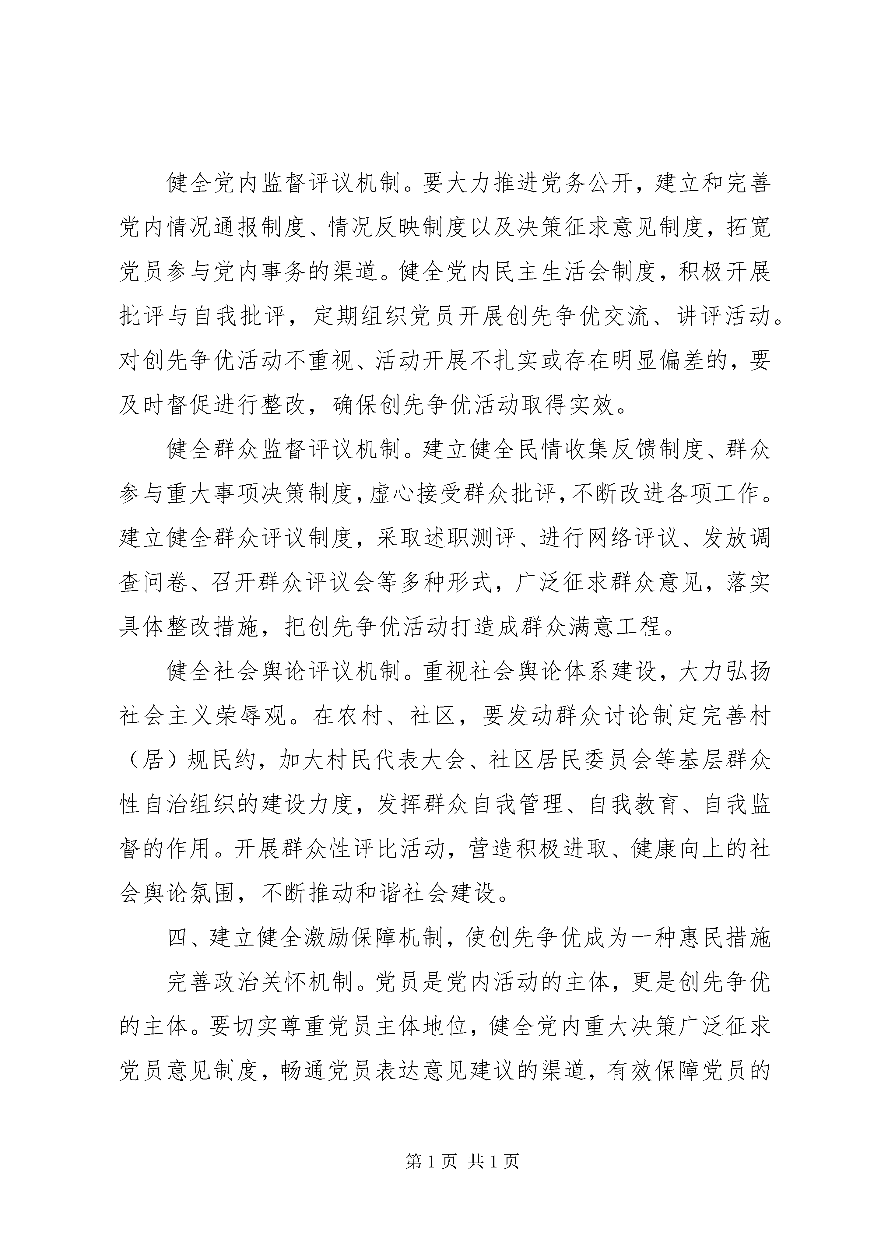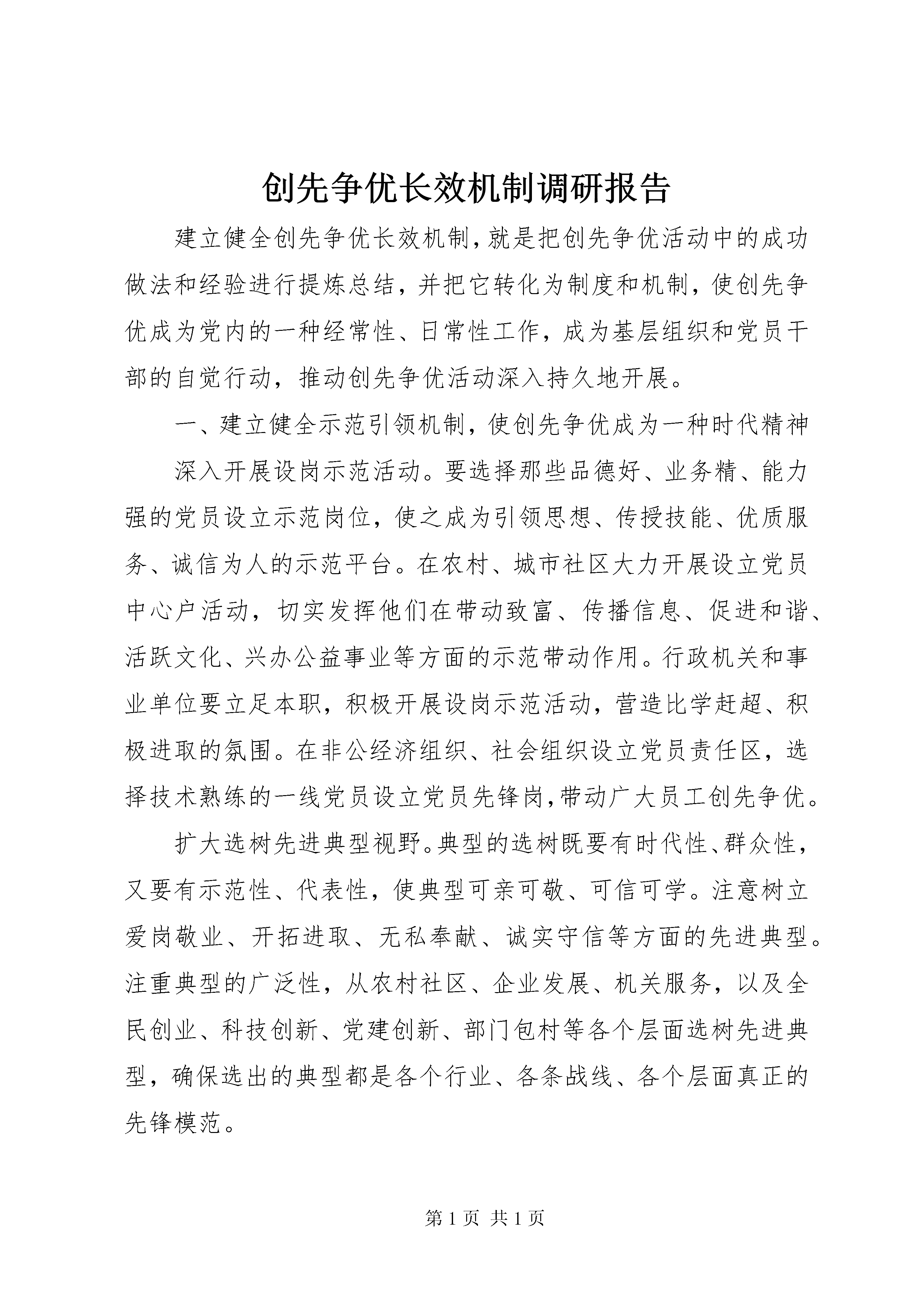 创先争优长效机制调研报告建立健全创先争优长效机制,就是把创先争优活动中的成功做法和经验进行提炼总结,并把它转化为制度和机制,使创先争优成为党内的一种经常性、日常性工作,成为基层组织和党员干部的自觉行动,推动创先争优活动深入持久地开展。一、建立健全示范引领机制,使创先争优成为一种时代精神深入开展设岗示范活动。要选择那些品德好、业务精、能力强的党员设立示范岗位,使之成为引领思想、传授技能、优质服务、诚信为人的示范平台。在农村、城市社区大力开展设立党员中心户活动,切实发挥他们在带动致富、传播信息、促进和谐、活跃文化、兴办公益事业等方面的示范带动作用。行政机关和事业单位要立足本职,积极开展设岗示范活动,营造比学赶超、积极进取的氛围。在非公经济组织、社会组织设立党员责任区,选择技术熟练的一线党员设立党员先锋岗,带动广大员工创先争优。扩大选树先进典型视野。典型的选树既要有时代性、群众性,又要有示范性、代表性,使典型可亲可敬、可信可学。注意树立爱岗敬业、开拓进取、无私奉献、诚实守信等方面的先进典型。注重典型的广泛性,从农村社区、企业发展、机关服务,以及全民创业、科技创新、党建创新、部门包村等各个层面选树先进典型,确保选出的典型都是各个行业、各条战线、各个层面真正的先锋模范。加大典型宣传力度。对评选出来的各类先进典型,各级党委政府要在给予表彰奖励的同时,通过组建报告团巡回演讲,在新闻媒体上集中宣传,用身边人、身边事激励教育党员和群众,不断激发进取意识和荣誉意识。二、建立健全工作责任机制,使创先争优成为一种行为方式强化活动责任。强化基层党组织的领导责任,将创先争优活动作为基层党组织落实管党责任述职评议的重要内容,引导基层党组织以创先争优为纽带,把抓基层党建工作与推动业务工作紧密结合起来,把抓队伍建设与完成中心任务紧密结合起来。强化党员的引领责任,大力推行党员目标管理,指导党员结合岗位特点作出公开承诺,引导群众积极参与创先争优活动。强化群团组织的协调责任,把是否积极组织开展创先争优活动作为对群团组织考核评议的重要内容。抓好关键环节。在广泛征求群众意见的基础上,合理确定并公开承诺每个基层党组织、每名党员的年度工作目标。采取召开党员生活会交流、党组织通报、巡视检查、接受群众监督等办法,督促基层党组织和党员认真履行承诺。针对基层党组织和党员作出的公开承诺,进一步完善个人自评、党员互评、领导点评、群众测评、上级考评等制度,每季度进行一次通报,半年一初评,年终进行总评。通过定诺、履诺、评诺,促进承诺的兑现落实。三、建立健全监督约束机制,使创先争优成为一种科学制度健全党内监督评议机制。要大力推进党务公开,建立和完善党内情况通报制度、情况反映制度以及决策征求意见制度,拓宽党员参与党内事务的渠道。健全党内民主生活会制度,积极开展批评与自我批评,定期组织党员开展创先争优交流、讲评活动。对创先争优活动不重视、活动开展不扎实或存在明显偏差的,要及时督促进行整改,确保创先争优活动取得实效。健全群众监督评议机制。建立健全民情收集反馈制度、群众参与重大事项决策制度,虚心接受群众批评,不断改进各项工作。建立健全群众评议制度,采取述职测评、进行网络评议、发放调查问卷、召开群众评议会等多种形式,广泛征求群众意见,落实具体整改措施,把创先争优活动打造成群众满意工程。健全社会舆论评议机制。重视社会舆论体系建设,大力弘扬社会主义荣辱观。在农村、社区,要发动群众讨论制定完善村(居)规民约,加大村民代表大会、社区居民委员会等基层群众性自治组织的建设力度,发挥群众自我管理、自我教育、自我监督的作用。开展群众性评比活动,营造积极进取、健康向上的社会舆论氛围,不断推动和谐社会建设。四、建立健全激励保障机制,使创先争优成为一种惠民措施完善政治关怀机制。党员是党内活动的主体,更是创先争优的主体。要切实尊重党员主体地位,健全党内重大决策广泛征求党员意见制度,畅通党员表达意见建议的渠道,有效保障党员的知情权、参与权、选举权、监督权。加强情感沟通。建立健全“五必谈”谈心制度。即党员工作变动时必谈,受到表彰或处分时必谈,遇到困难或挫折时必谈,出现矛盾或意见分歧时必谈,群众有不良反映时必谈。建立健全“五必访”走访制度。即党员患病或去世时必访,党员家庭受灾或发生意外时必访,党员在生产生活中遇到困难时必访,党员有较大思想情绪或有意见建议时必访,党员无故不参加组织生活时必访。建立健全定期慰问制度。定期对老党员老干部老劳模、长期患病或生活困难的党员群众进行慰问。加大党建投入。进一步加大对农村、社区基层党组织建设的经费投入,改善基层组织办公活动条件,确保基层组织有人办事、有钱办事、有场所议事。加大资源统筹力度,抓好农村(社区)党员群众服务中心建设,切实增强基层党组织服务群众的功能。五、建立健全