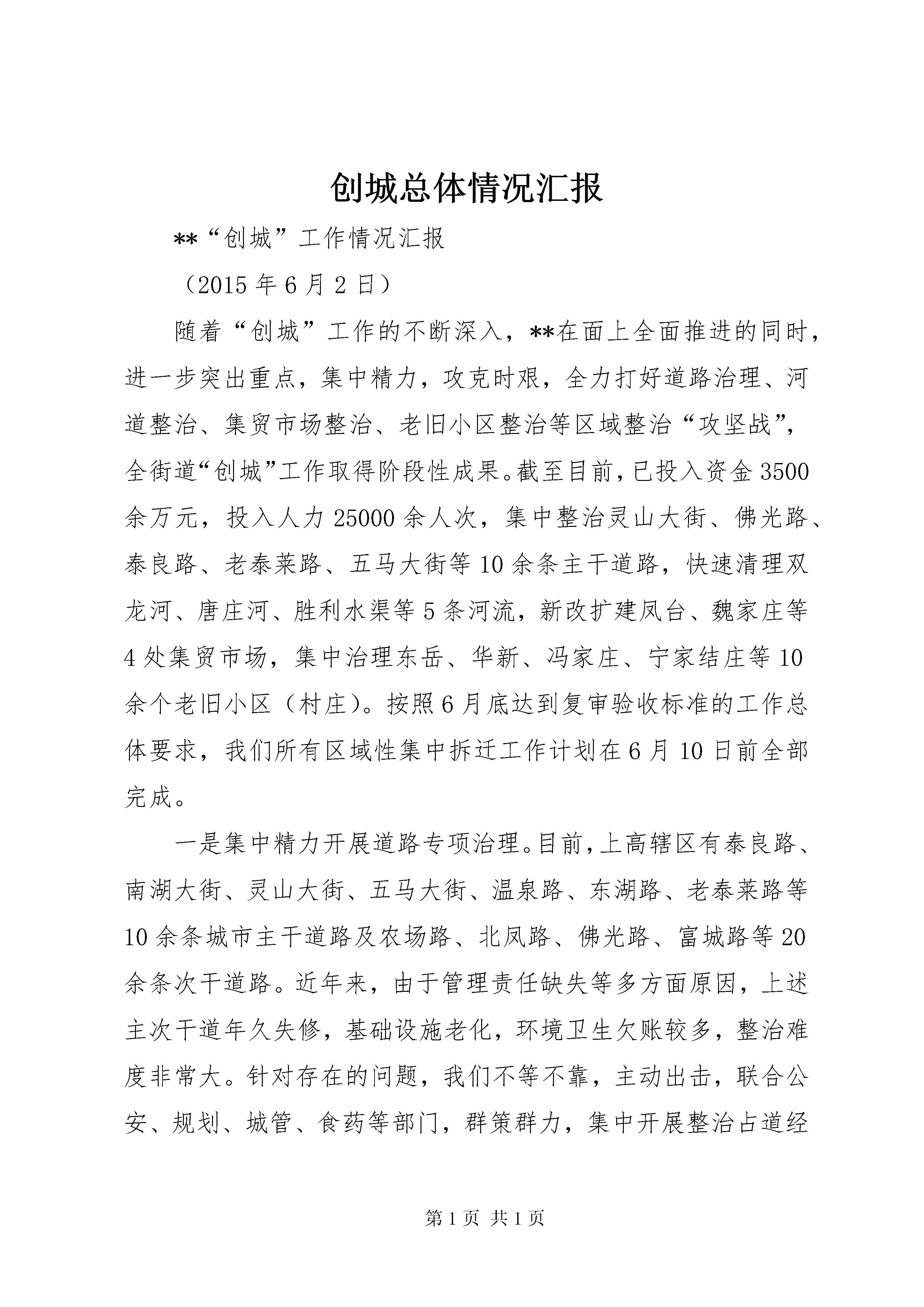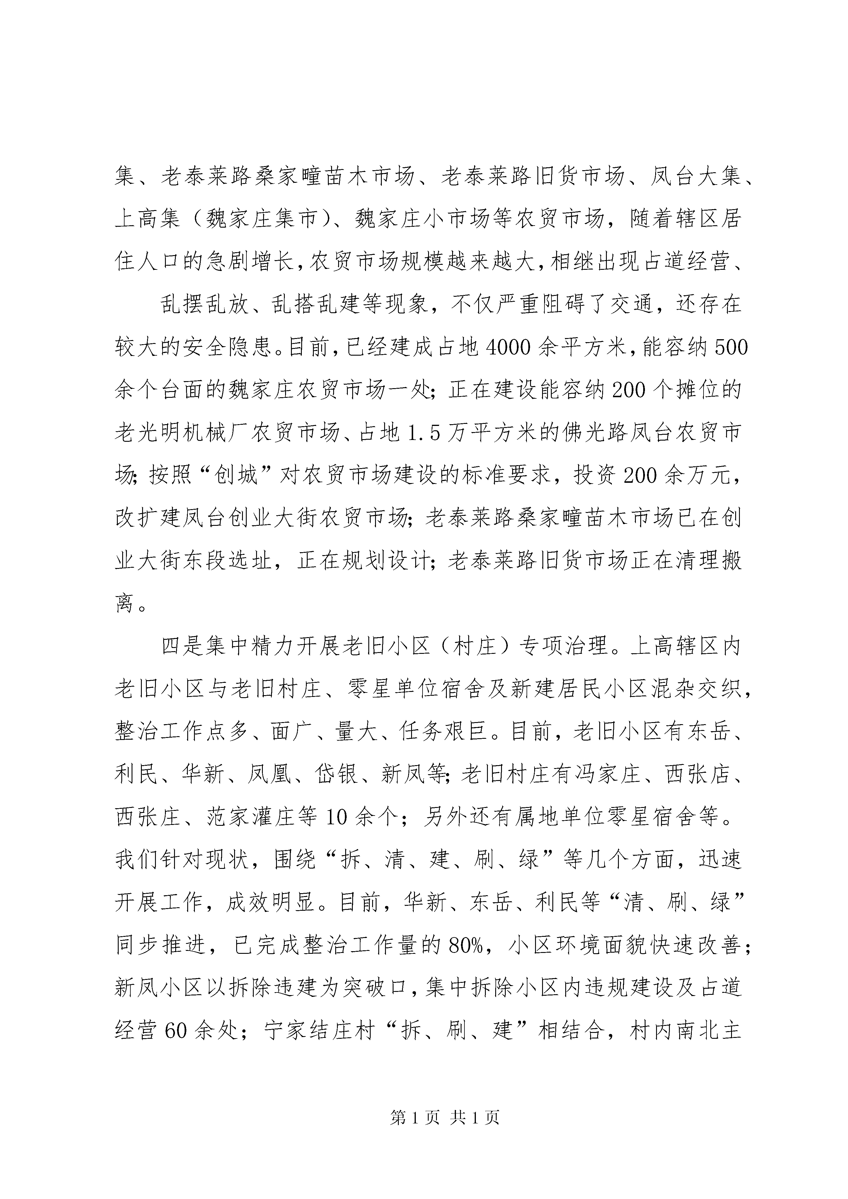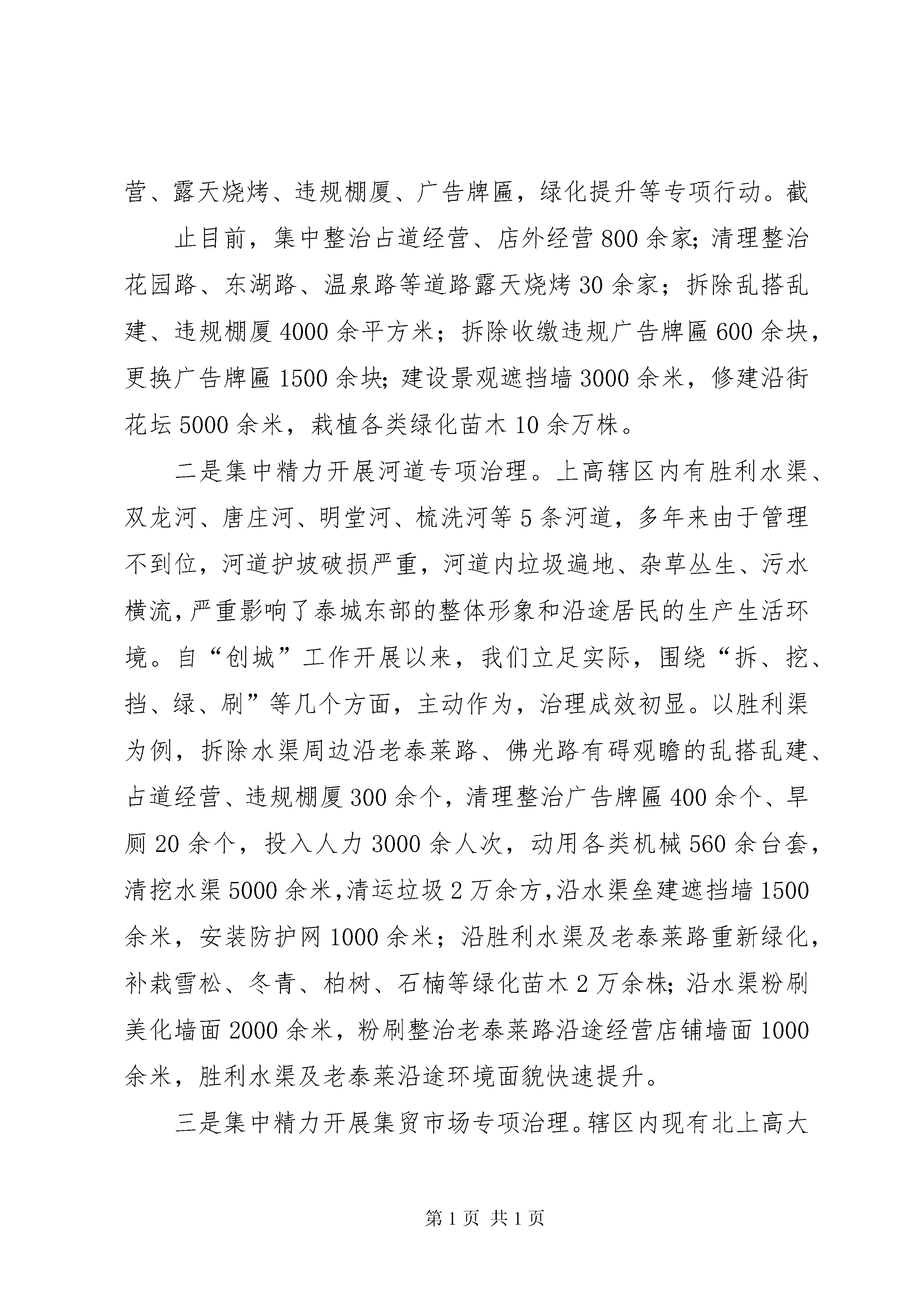 创城总体情况汇报**“创城”工作情况汇报(2015年6月2日)随着“创城”工作的不断深入,**在面上全面推进的同时,进一步突出重点,集中精力,攻克时艰,全力打好道路治理、河道整治、集贸市场整治、老旧小区整治等区域整治“攻坚战”,全街道“创城”工作取得阶段性成果。截至目前,已投入资金3500余万元,投入人力25000余人次,集中整治灵山大街、佛光路、泰良路、老泰莱路、五马大街等10余条主干道路,快速清理双龙河、唐庄河、胜利水渠等5条河流,新改扩建凤台、魏家庄等4处集贸市场,集中治理东岳、华新、冯家庄、宁家结庄等10余个老旧小区(村庄)。按照6月底达到复审验收标准的工作总体要求,我们所有区域性集中拆迁工作计划在6月10日前全部完成。一是集中精力开展道路专项治理。目前,上高辖区有泰良路、南湖大街、灵山大街、五马大街、温泉路、东湖路、老泰莱路等10余条城市主干道路及农场路、北凤路、佛光路、富城路等20余条次干道路。近年来,由于管理责任缺失等多方面原因,上述主次干道年久失修,基础设施老化,环境卫生欠账较多,整治难度非常大。针对存在的问题,我们不等不靠,主动出击,联合公安、规划、城管、食药等部门,群策群力,集中开展整治占道经营、露天烧烤、违规棚厦、广告牌匾,绿化提升等专项行动。截止目前,集中整治占道经营、店外经营800余家;清理整治花园路、东湖路、温泉路等道路露天烧烤30余家;拆除乱搭乱建、违规棚厦4000余平方米;拆除收缴违规广告牌匾600余块,更换广告牌匾1500余块;建设景观遮挡墙3000余米,修建沿街花坛5000余米,栽植各类绿化苗木10余万株。二是集中精力开展河道专项治理。上高辖区内有胜利水渠、双龙河、唐庄河、明堂河、梳洗河等5条河道,多年来由于管理不到位,河道护坡破损严重,河道内垃圾遍地、杂草丛生、污水横流,严重影响了泰城东部的整体形象和沿途居民的生产生活环境。自“创城”工作开展以来,我们立足实际,围绕“拆、挖、挡、绿、刷”等几个方面,主动作为,治理成效初显。以胜利渠为例,拆除水渠周边沿老泰莱路、佛光路有碍观瞻的乱搭乱建、占道经营、违规棚厦300余个,清理整治广告牌匾400余个、旱厕20余个,投入人力3000余人次,动用各类机械560余台套,清挖水渠5000余米,清运垃圾2万余方,沿水渠垒建遮挡墙1500余米,安装防护网1000余米;沿胜利水渠及老泰莱路重新绿化,补栽雪松、冬青、柏树、石楠等绿化苗木2万余株;沿水渠粉刷美化墙面2000余米,粉刷整治老泰莱路沿途经营店铺墙面1000余米,胜利水渠及老泰莱沿途环境面貌快速提升。三是集中精力开展集贸市场专项治理。辖区内现有北上高大集、老泰莱路桑家疃苗木市场、老泰莱路旧货市场、凤台大集、上高集(魏家庄集市)、魏家庄小市场等农贸市场,随着辖区居住人口的急剧增长,农贸市场规模越来越大,相继出现占道经营、乱摆乱放、乱搭乱建等现象,不仅严重阻碍了交通,还存在较大的安全隐患。目前,已经建成占地4000余平方米,能容纳500余个台面的魏家庄农贸市场一处;正在建设能容纳200个摊位的老光明机械厂农贸市场、占地1.5万平方米的佛光路凤台农贸市场;按照“创城”对农贸市场建设的标准要求,投资200余万元,改扩建凤台创业大街农贸市场;老泰莱路桑家疃苗木市场已在创业大街东段选址,正在规划设计;老泰莱路旧货市场正在清理搬离。四是集中精力开展老旧小区(村庄)专项治理。上高辖区内老旧小区与老旧村庄、零星单位宿舍及新建居民小区混杂交织,整治工作点多、面广、量大、任务艰巨。目前,老旧小区有东岳、利民、华新、凤凰、岱银、新凤等;老旧村庄有冯家庄、西张店、西张庄、范家灌庄等10余个;另外还有属地单位零星宿舍等。我们针对现状,围绕“拆、清、建、刷、绿”等几个方面,迅速开展工作,成效明显。目前,华新、东岳、利民等“清、刷、绿”同步推进,已完成整治工作量的80%,小区环境面貌快速改善;新凤小区以拆除违建为突破口,集中拆除小区内违规建设及占道经营60余处;宁家结庄村“拆、刷、建”相结合,村内南北主干道路违章建设拆除已接近尾声;冯家庄、西张店、西张庄等“拆、刷、绿”相结合,老旧村庄整治效果初显;140余家驻地单位及零星宿舍以“清、刷”为主,正在按照计划快速推进整治工作开展。