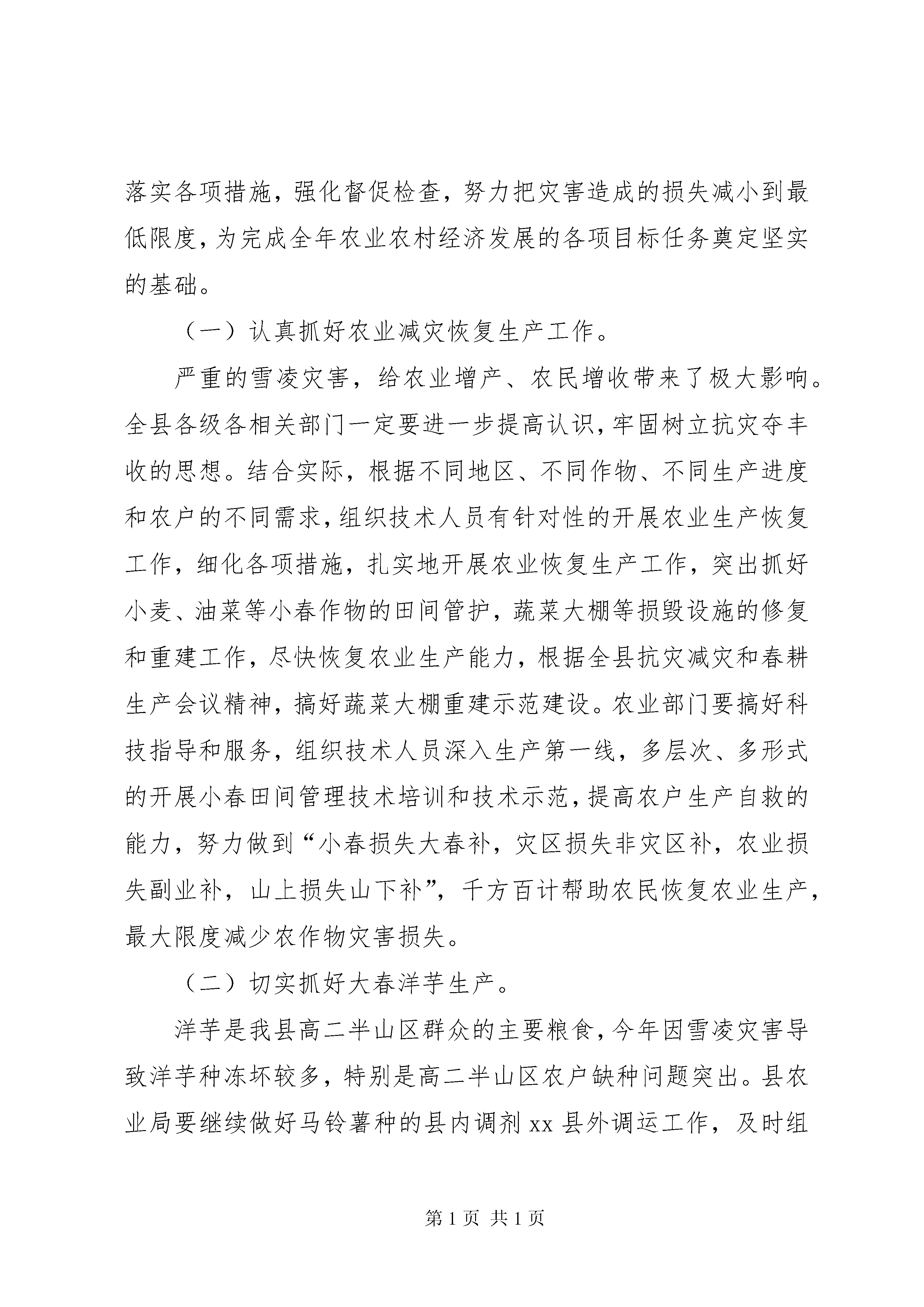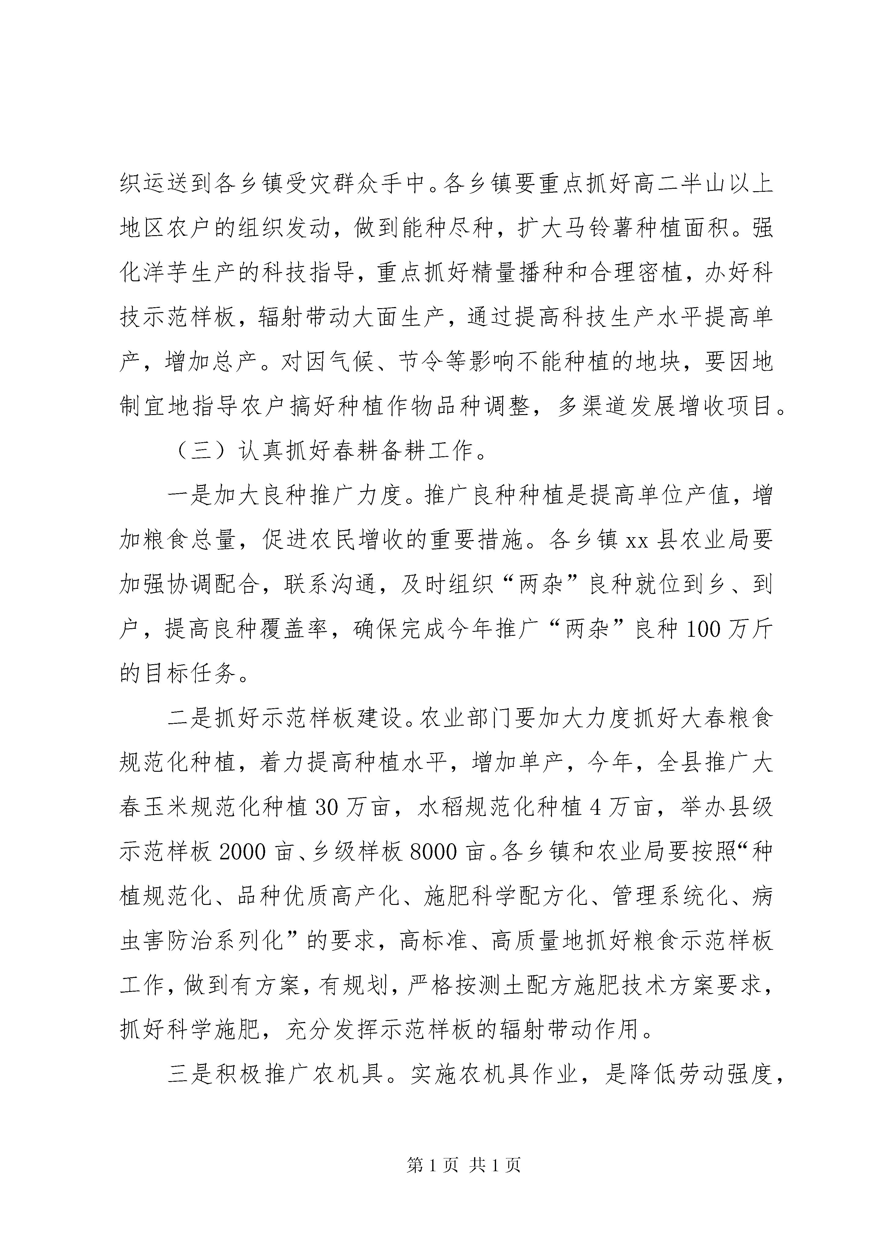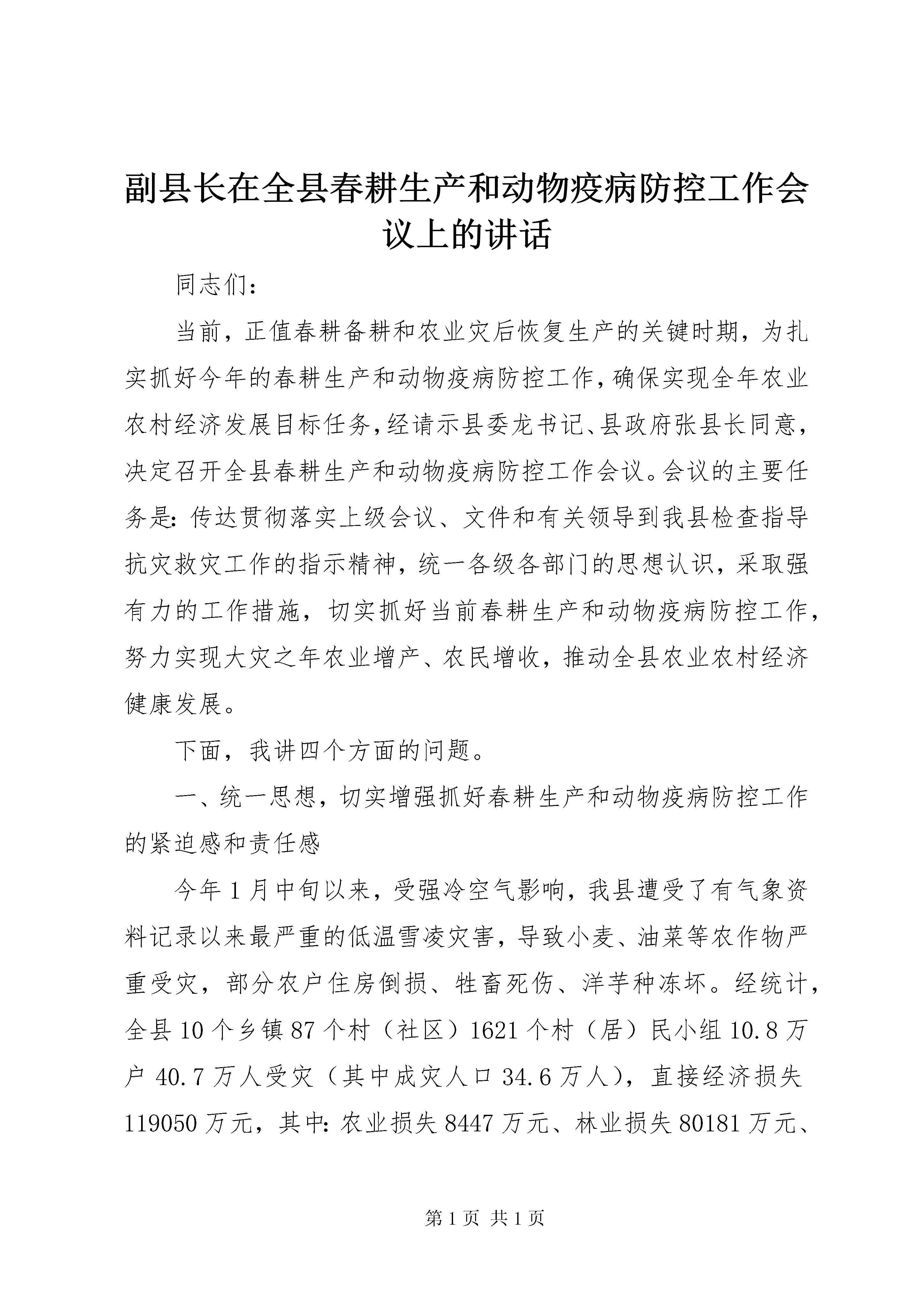副县长在全县春耕生产和动物疫病防控工作会议上的讲话同志们:当前,正值春耕备耕和农业灾后恢复生产的关键时期,为扎实抓好今年的春耕生产和动物疫病防控工作,确保实现全年农业农村经济发展目标任务,经请示县委龙书记、县政府张县长同意,决定召开全县春耕生产和动物疫病防控工作会议。会议的主要任务是:传达贯彻落实上级会议、文件和有关领导到我县检查指导抗灾救灾工作的指示精神,统一各级各部门的思想认识,采取强有力的工作措施,切实抓好当前春耕生产和动物疫病防控工作,努力实现大灾之年农业增产、农民增收,推动全县农业农村经济健康发展。下面,我讲四个方面的问题。一、统一思想,切实增强抓好春耕生产和动物疫病防控工作的紧迫感和责任感今年1月中旬以来,受强冷空气影响,我县遭受了有气象资料记录以来最严重的低温雪凌灾害,导致小麦、油菜等农作物严重受灾,部分农户住房倒损、牲畜死伤、洋芋种冻坏。经统计,全县10个乡镇87个村(社区)1621个村(居)民小组10.8万户40.7万人受灾(其中成灾人口34.6万人),直接经济损失119050万元,其中:农业损失8447万元、林业损失80181万元、民房损失6888万元、基础设施损失23534万元。在农业上,全县小麦受灾7689公顷,油菜受灾4259公顷,蚕豆、豌豆受灾788公顷,蔬菜受灾4328公顷,冻坏洋芋种325万公斤,沼气池受损491口,冻死冻伤牛503头,冻死冻伤猪3802头,冻死马35匹、羊195只、家禽1336只、兔子83只,垮塌厩舍3566间35660平方米,冻坏饲草3000吨。这次雪凌灾害造成的受灾范围之广、强度之大、时间之长、品种之多,在威信历史上是罕见的,特别是冬季农业生产损失、农业设施破坏较为严重,极大地破坏了我县农业生产力,严重影响了农业持续稳定发展,给灾区农民生产生活造成了重大损失,灾后恢复生产和春耕备耕任务非常艰巨。灾情发生后,中央、省、市各级党委、政府高度重视,有关领导相继作出重要批示,市委夜礼斌书记、市政府王敏正代市长、锁飞常务副市长、市委张纪华秘书长、杨艾东副市长、文雅芹副市长等各位领导亲临我县视察雪凌灾情,深入一线指导应急抢险和灾后恢复重建工作,看望慰问受灾群众和抢险队伍,极大地增强了我县抓好抗灾救灾工作的信心和决心。我县各级各部门反应及时,行动迅速,措施有力,把抗击灾害作为最紧迫的任务,切实加强组织领导,及早部署防灾救灾工作,及时启动应急预案,全力以赴抢险应急和抗灾救灾,取得了重大阶段性成效,各项基础设施得到及时恢复,人民群众生产生活得到妥善安排,确保了社会政治稳,得到了省、市的充分肯定。由于雪凌灾害持续时间长,影响范围广,危害程度深,灾害损失大,灾后恢复农业生产、春耕备耕工作受到了极大影响,主要表现在:灾区群众马铃薯种薯冻坏严重,农民冬季生产减收突出,灾后恢复生产所需劳动力不足,动物疫病及农作物病害发生潜在风险增加,灾后农业重建和恢复生产所需资金短缺。这些问题如果不能及时得以解决,势必会影响到全年粮食生产的稳定发展和主要农产品的基本供给,关系到农业稳步增产和农民持续增收,关系到全县经济社会发展的大局。因此,全县各级各有关部门务必保持清醒头脑,充分认识农业抗灾救灾工作的紧迫性、复杂性和艰巨性,充分认识灾后恢复重建和全面完成今年农业农村经济发展任务的严峻性,坚决贯彻党中央、国务院、省委、省政府和市委、市政府的各项安排部署,深入分析灾害对农业生产的后续影响,把这次灾害放在全年农业农村经济发展的背景下来深化认识,坚决克服松懈思想、麻痹心理和厌战情绪,紧急行动起来,迅速掀起灾后恢复农业生产和春耕备耕的高潮,努力推动全县农业农村经济发展。二、强化措施,千方百计抓好当前春耕生产当前,我县抗击冰凌雪灾的工作已由应急抢险转入抗灾救灾、恢复建设阶段。全县各级要把抗灾救灾、恢复重建作为当前工作的重中之重,早规划、早安排、早启动,迅速组织开展农业抗灾减灾和春耕生产。要坚持目标不变、任务不减,加大工作力度,落实各项措施,强化督促检查,努力把灾害造成的损失减小到最低限度,为完成全年农业农村经济发展的各项目标任务奠定坚实的基础。(一)认真抓好农业减灾恢复生产工作。严重的雪凌灾害,给农业增产、农民增收带来了极大影响。全县各级各相关部门一定要进一步提高认识,牢固树立抗灾夺丰收的思想。结合实际,根据不同地区、不同作物、不同生产进度和农户的不同需求,组织技术人员有针对性的开展农业生产恢复工作,细化各项措施,扎实地开展农业恢复生产工作,突出抓好小麦、油菜等小春作物的田间管护,蔬菜大棚等损毁设施的修复和重建工作,尽快恢复农业生产能力,根据全县抗灾减灾和春耕生产会议精神,搞好蔬菜大棚重建示范建设。农业部门要搞好科技指导和服务,组织技术人员深入生产第一线,多层次、多形式的开展小春田间管理技术培训和技术示