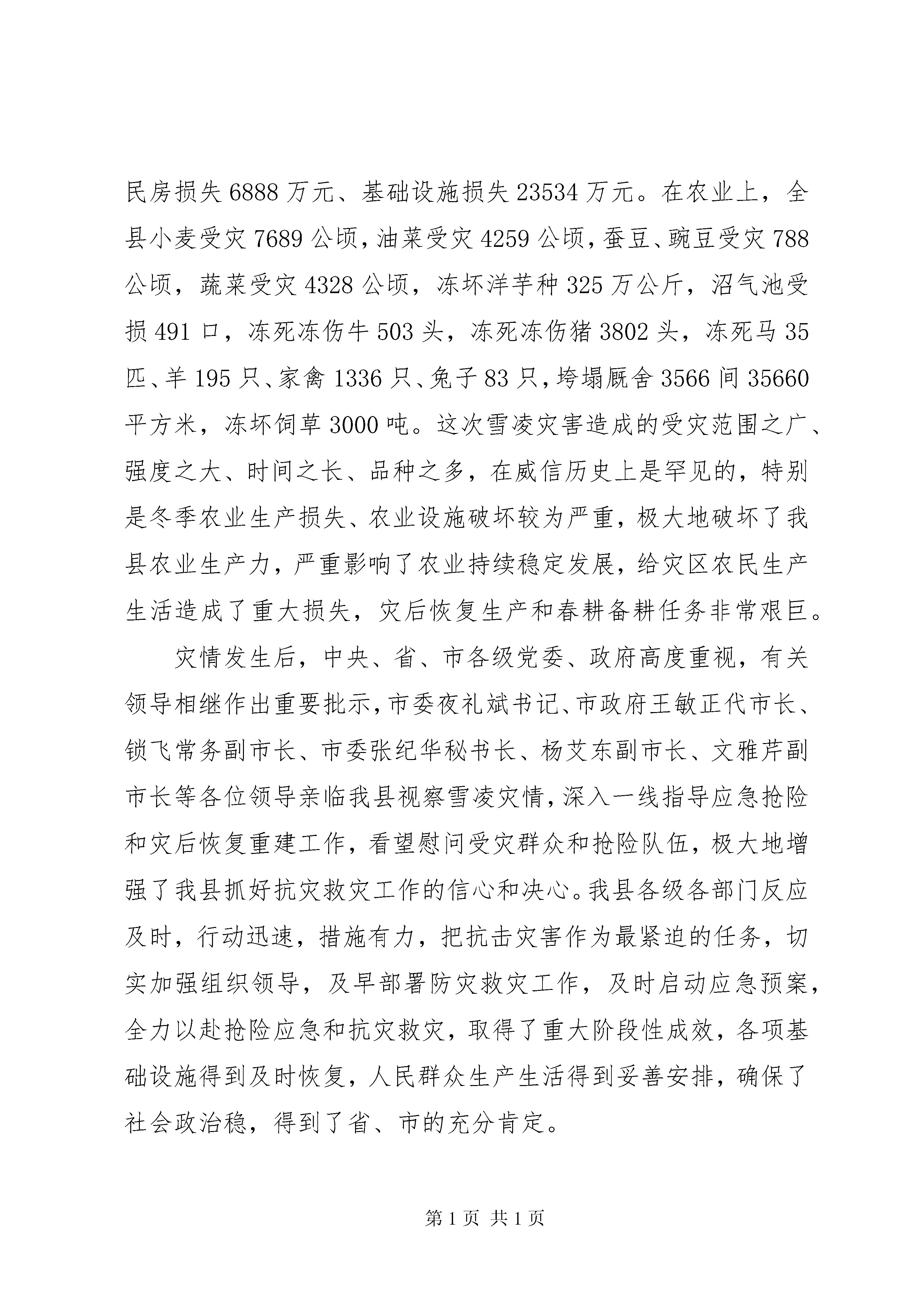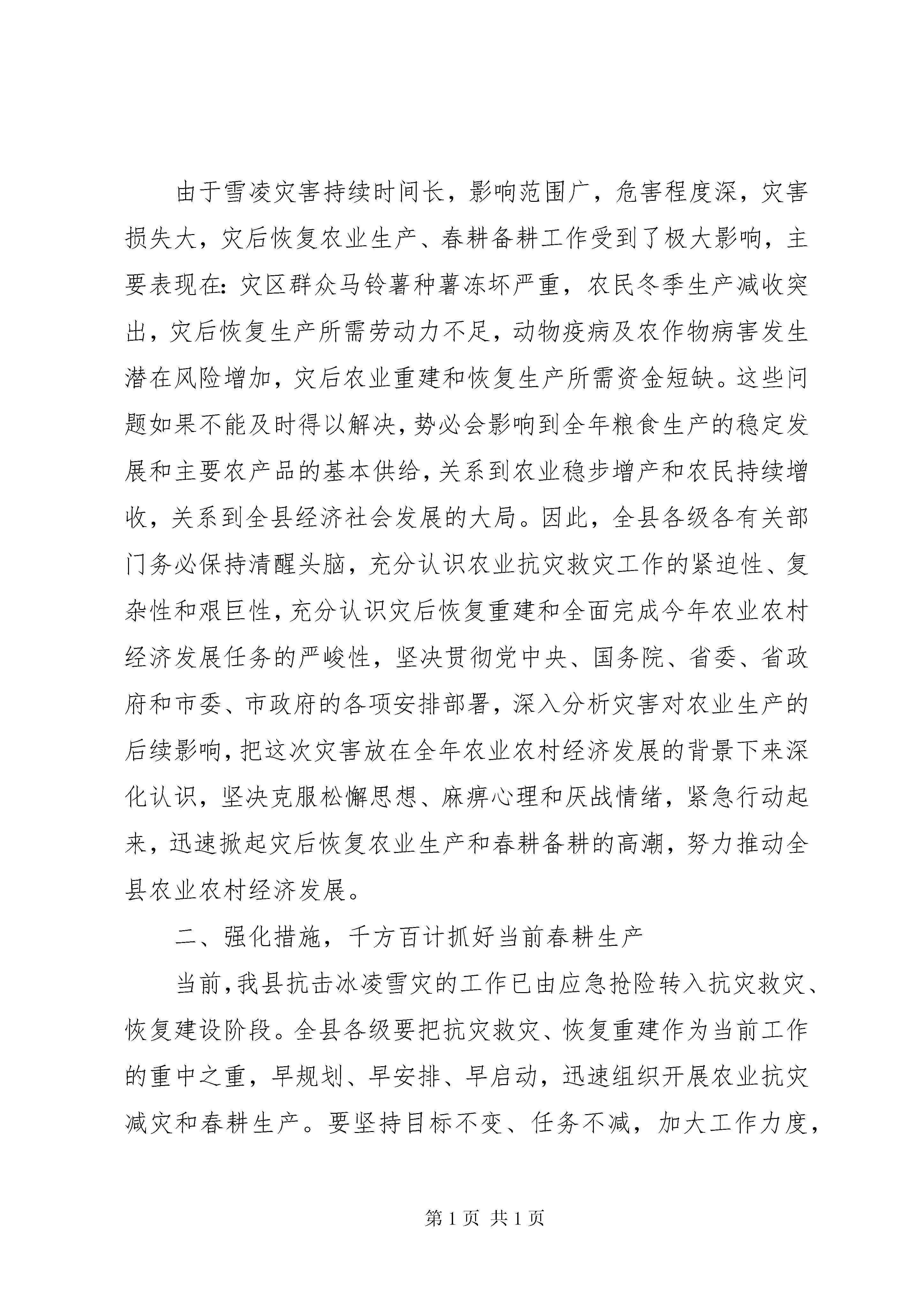 副县长在全县春耕生产和动物疫病防控工作会议上的讲话同志们:当前,正值春耕备耕和农业灾后恢复生产的关键时期,为扎实抓好今年的春耕生产和动物疫病防控工作,确保实现全年农业农村经济发展目标任务,经请示县委龙书记、县政府张县长同意,决定召开全县春耕生产和动物疫病防控工作会议。会议的主要任务是:传达贯彻落实上级会议、文件和有关领导到我县检查指导抗灾救灾工作的指示精神,统一各级各部门的思想认识,采取强有力的工作措施,切实抓好当前春耕生产和动物疫病防控工作,努力实现大灾之年农业增产、农民增收,推动全县农业农村经济健康发展。下面,我讲四个方面的问题。一、统一思想,切实增强抓好春耕生产和动物疫病防控工作的紧迫感和责任感今年1月中旬以来,受强冷空气影响,我县遭受了有气象资料记录以来最严重的低温雪凌灾害,导致小麦、油菜等农作物严重受灾,部分农户住房倒损、牲畜死伤、洋芋种冻坏。经统计,全县10个乡镇87个村(社区)1621个村(居)民小组10.8万户40.7万人受灾(其中成灾人口34.6万人),直接经济损失119050万元,其中:农业损失8447万元、林业损失80181万元、民房损失6888万元、基础设施损失23534万元。在农业上,全县小麦受灾7689公顷,油菜受灾4259公顷,蚕豆、豌豆受灾788公顷,蔬菜受灾4328公顷,冻坏洋芋种325万公斤,沼气池受损491口,冻死冻伤牛503头,冻死冻伤猪3802头,冻死马35匹、羊195只、家禽1336只、兔子83只,垮塌厩舍3566间35660平方米,冻坏饲草3000吨。这次雪凌灾害造成的受灾范围之广、强度之大、时间之长、品种之多,在威信历史上是罕见的,特别是冬季农业生产损失、农业设施破坏较为严重,极大地破坏了我县农业生产力,严重影响了农业持续稳定发展,给灾区农民生产生活造成了重大损失,灾后恢复生产和春耕备耕任务非常艰巨。灾情发生后,中央、省、市各级党委、政府高度重视,有关领导相继作出重要批示,市委夜礼斌书记、市政府王敏正代市长、锁飞常务副市长、市委张纪华秘书长、杨艾东副市长、文雅芹副市长等各位领导亲临我县视察雪凌灾情,深入一线指导应急抢险和灾后恢复重建工作,看望慰问受灾群众和抢险队伍,极大地增强了我县抓好抗灾救灾工作的信心和决心。我县各级各部门反应及时,行动迅速,措施有力,把抗击灾害作为最紧迫的任务,切实加强组织领导,及早部署防灾救灾工作,及时启动应急预案,全力以赴抢险应急和抗灾救灾,取得了重大阶段性成效,各项基础设施得到及时恢复,人民群众生产生活得到妥善安排,确保了社会政治稳,得到了省、市的充分肯定。由于雪凌灾害持续时间长,影响范围广,危害程度深,灾害损失大,灾后恢复农业生产、春耕备耕工作受到了极大影响,主要表现在:灾区群众马铃薯种薯冻坏严重,农民冬季生产减收突出,灾后恢复生产所需劳动力不足,动物疫病及农作物病害发生潜在风险增加,灾后农业重建和恢复生产所需资金短缺。这些问题如果不能及时得以解决,势必会影响到全年粮食生产的稳定发展和主要农产品的基本供给,关系到农业稳步增产和农民持续增收,关系到全县经济社会发展的大局。因此,全县各级各有关部门务必保持清醒头脑,充分认识农业抗灾救灾工作的紧迫性、复杂性和艰巨性,充分认识灾后恢复重建和全面完成今年农业农村经济发展任务的严峻性,坚决贯彻党中央、国务院、省委、省政府和市委、市政府的各项安排部署,深入分析灾害对农业生产的后续影响,把这次灾害放在全年农业农村经济发展的背景下来深化认识,坚决克服松懈思想、麻痹心理和厌战情绪,紧急行动起来,迅速掀起灾后恢复农业生产和春耕备耕的高潮,努力推动全县农业农村经济发展。二、强化措施,千方百计抓好当前春耕生产当前,我县抗击冰凌雪灾的工作已由应急抢险转入抗灾救灾、恢复建设阶段。全县各级要把抗灾救灾、恢复重建作为当前工作的重中之重,早规划、早安排、早启动,迅速组织开展农业抗灾减灾和春耕生产。要坚持目标不变、任务不减,加大工作力度,落实各项措施,强化督促检查,努力把灾害造成的损失减小到最低限度,为完成全年农业农村经济发展的各项目标任务奠定坚实的基础。(一)认真抓好农业减灾恢复生产工作。严重的雪凌灾害,给农业增产、农民增收带来了极大影响。全县各级各相关部门一定要进一步提高认识,牢固树立抗灾夺丰收的思想。结合实际,根据不同地区、不同作物、不同生产进度和农户的不同需求,组织技术人员有针对性的开展农业生产恢复工作,细化各项措施,扎实地开展农业恢复生产工作,突出抓好小麦、油菜等小春作物的田间管护,蔬菜大棚等损毁设施的修复和重建工作,尽快恢复农业生产能力,根据全县抗灾减灾和春耕生产会议精神,搞好蔬菜大棚重建示范建设。农业部门要搞好科技指导和服务,组织技术人员深入生产第一线,多层次、多形式的开展小春田间管理技术培训和技术示