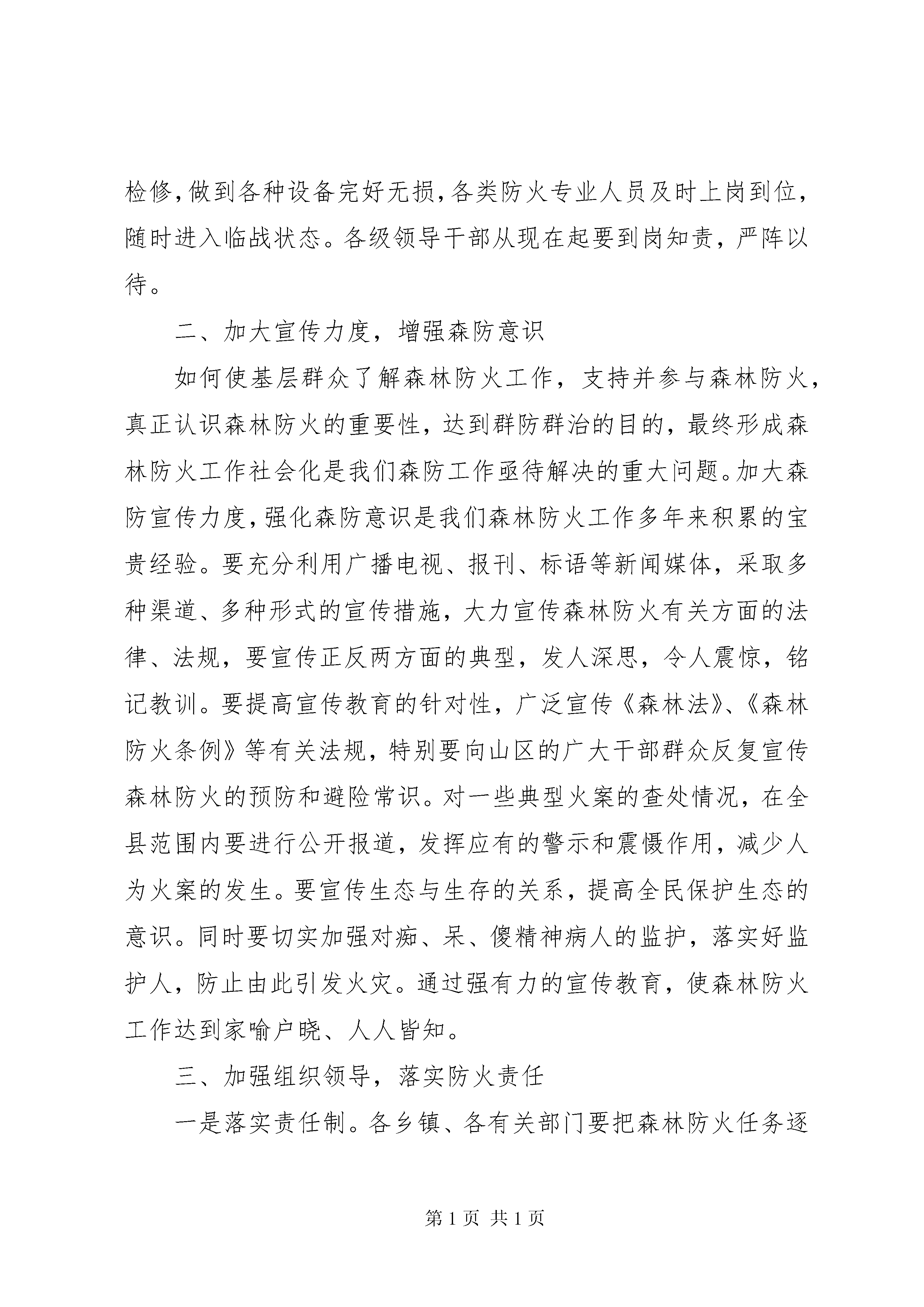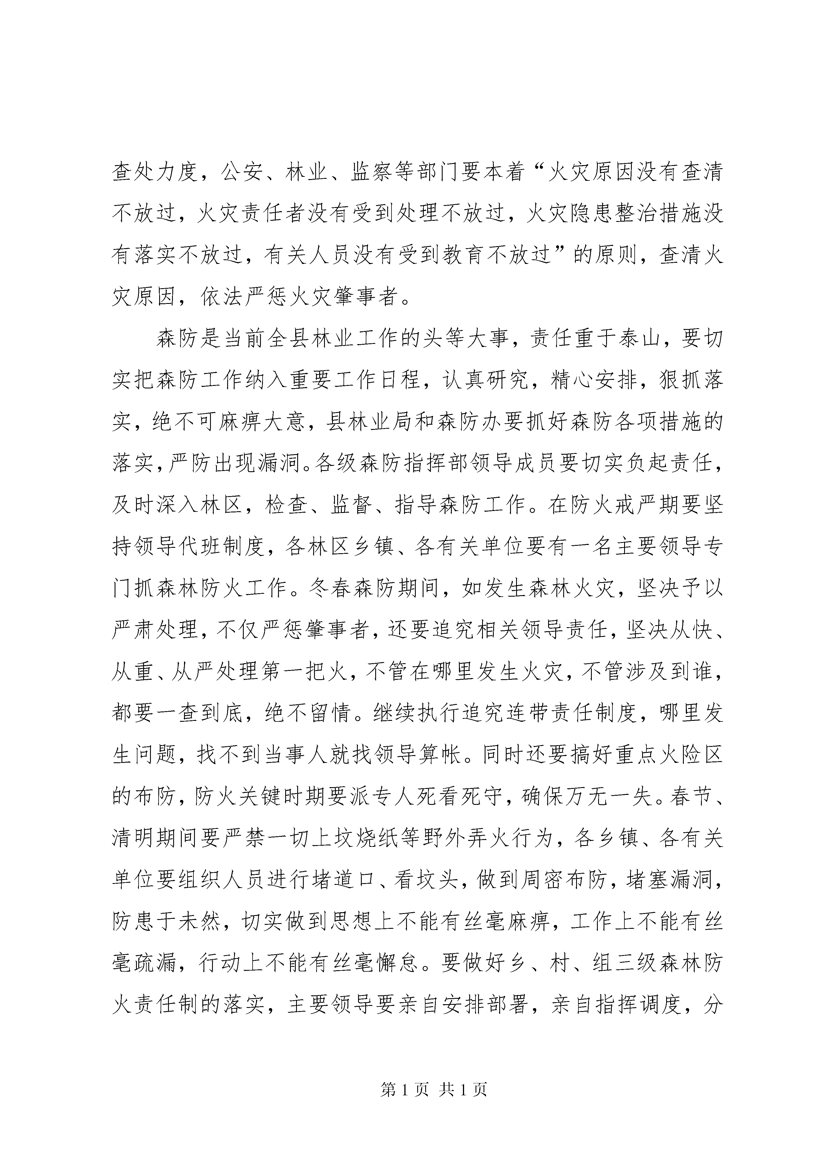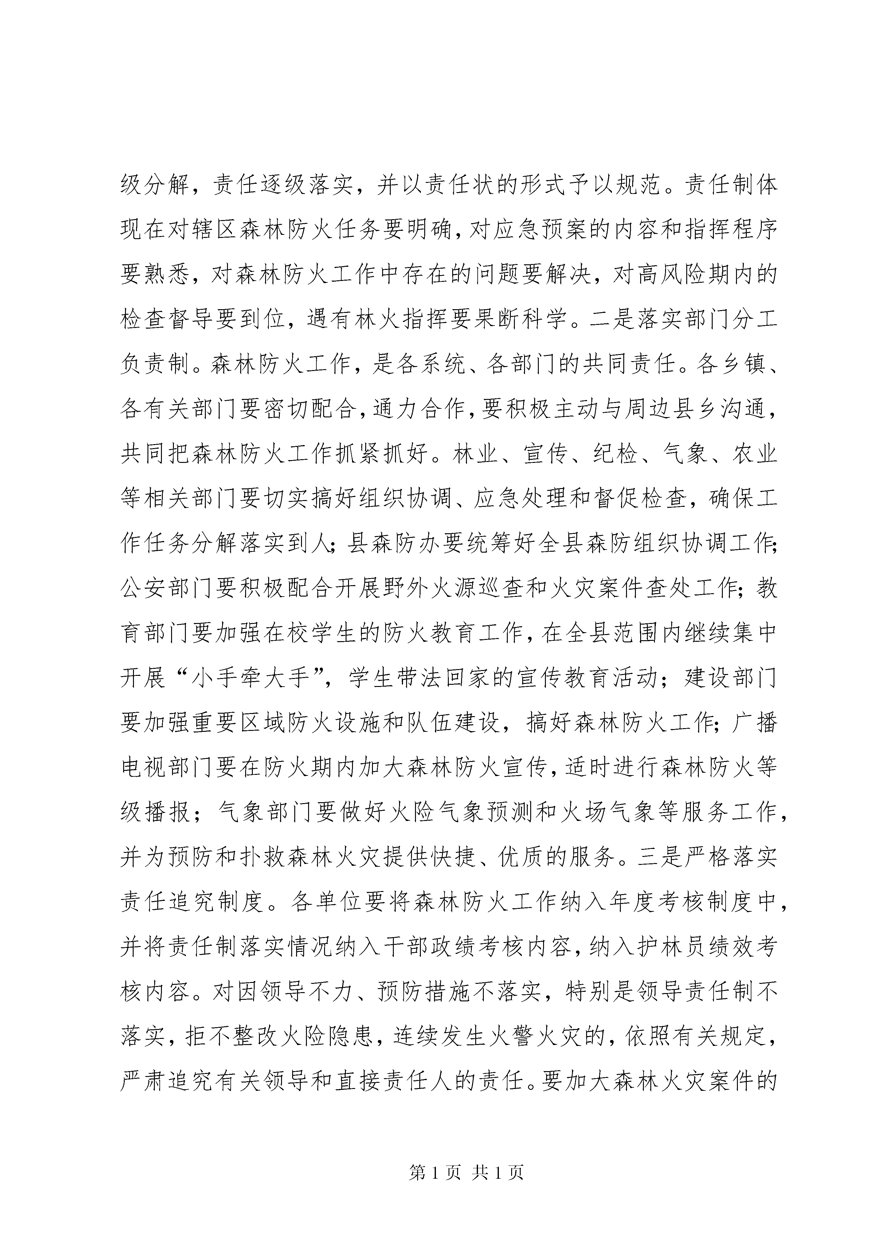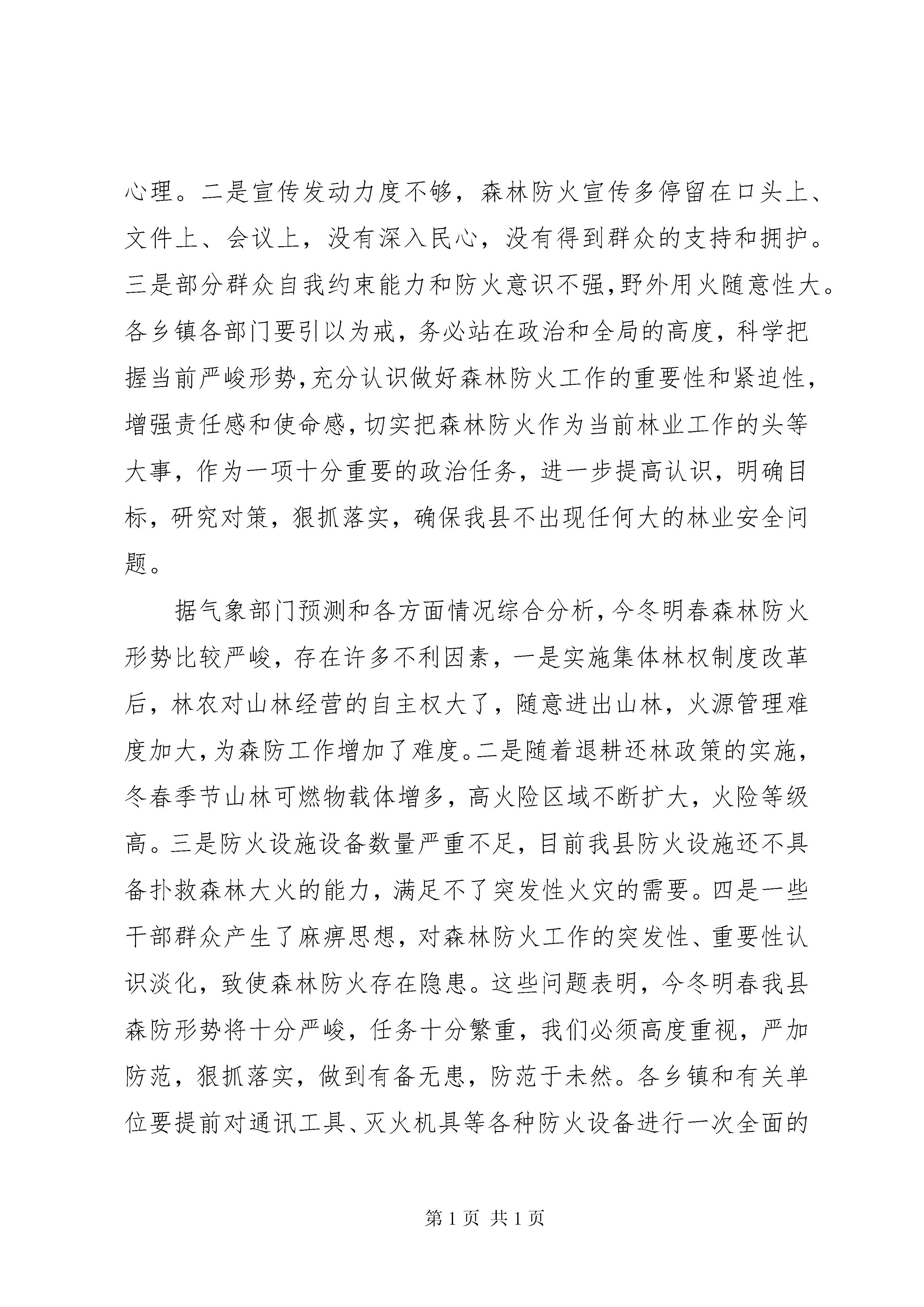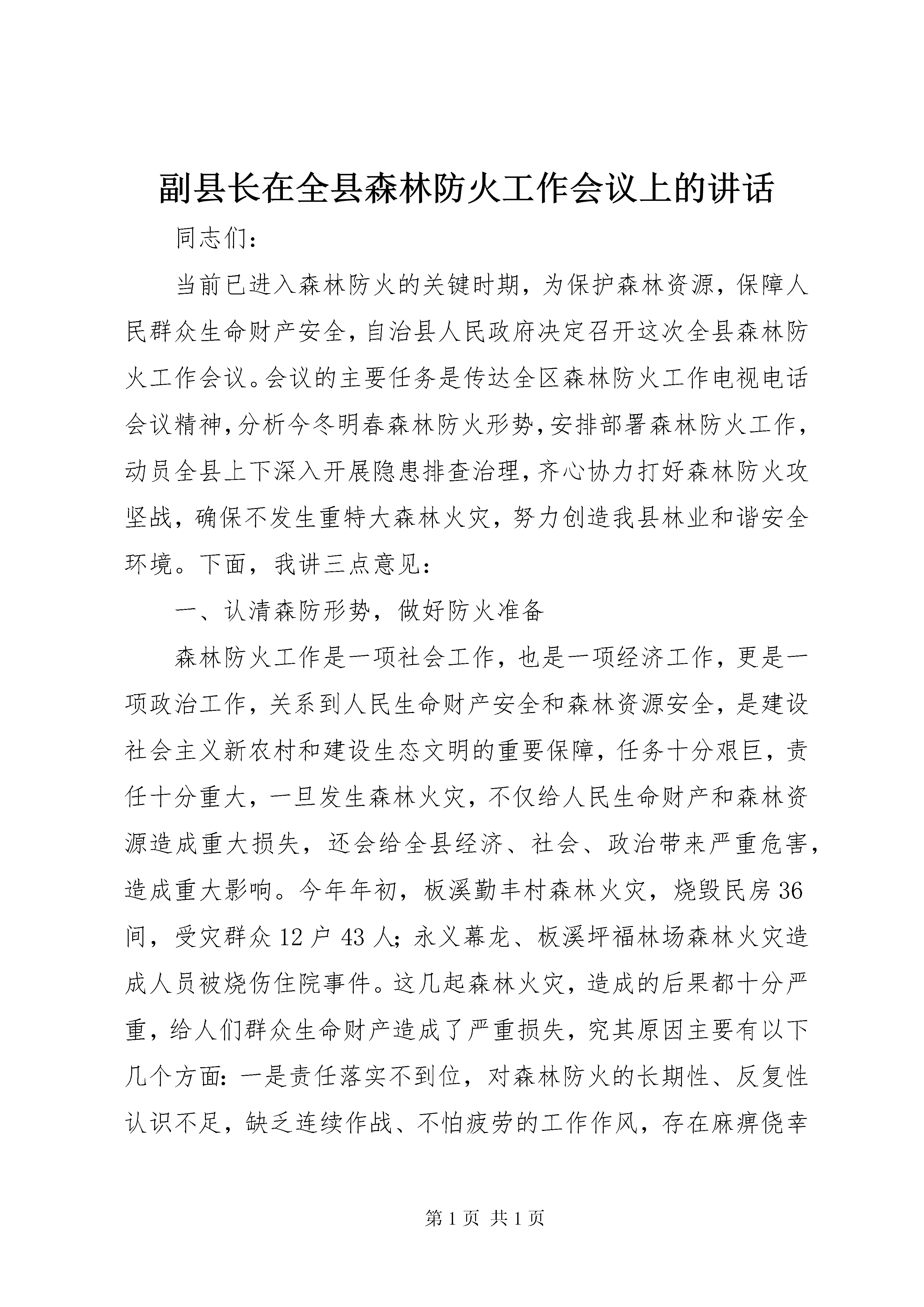 副县长在全县森林防火工作会议上的讲话同志们:当前已进入森林防火的关键时期,为保护森林资源,保障人民群众生命财产安全,自治县人民政府决定召开这次全县森林防火工作会议。会议的主要任务是传达全区森林防火工作电视电话会议精神,分析今冬明春森林防火形势,安排部署森林防火工作,动员全县上下深入开展隐患排查治理,齐心协力打好森林防火攻坚战,确保不发生重特大森林火灾,努力创造我县林业和谐安全环境。下面,我讲三点意见:一、认清森防形势,做好防火准备森林防火工作是一项社会工作,也是一项经济工作,更是一项政治工作,关系到人民生命财产安全和森林资源安全,是建设社会主义新农村和建设生态文明的重要保障,任务十分艰巨,责任十分重大,一旦发生森林火灾,不仅给人民生命财产和森林资源造成重大损失,还会给全县经济、社会、政治带来严重危害,造成重大影响。今年年初,板溪勤丰村森林火灾,烧毁民房36间,受灾群众12户43人;永义幕龙、板溪坪福林场森林火灾造成人员被烧伤住院事件。这几起森林火灾,造成的后果都十分严重,给人们群众生命财产造成了严重损失,究其原因主要有以下几个方面:一是责任落实不到位,对森林防火的长期性、反复性认识不足,缺乏连续作战、不怕疲劳的工作作风,存在麻痹侥幸心理。二是宣传发动力度不够,森林防火宣传多停留在口头上、文件上、会议上,没有深入民心,没有得到群众的支持和拥护。三是部分群众自我约束能力和防火意识不强,野外用火随意性大。各乡镇各部门要引以为戒,务必站在政治和全局的高度,科学把握当前严峻形势,充分认识做好森林防火工作的重要性和紧迫性,增强责任感和使命感,切实把森林防火作为当前林业工作的头等大事,作为一项十分重要的政治任务,进一步提高认识,明确目标,研究对策,狠抓落实,确保我县不出现任何大的林业安全问题。据气象部门预测和各方面情况综合分析,今冬明春森林防火形势比较严峻,存在许多不利因素,一是实施集体林权制度改革后,林农对山林经营的自主权大了,随意进出山林,火源管理难度加大,为森防工作增加了难度。二是随着退耕还林政策的实施,冬春季节山林可燃物载体增多,高火险区域不断扩大,火险等级高。三是防火设施设备数量严重不足,目前我县防火设施还不具备扑救森林大火的能力,满足不了突发性火灾的需要。四是一些干部群众产生了麻痹思想,对森林防火工作的突发性、重要性认识淡化,致使森林防火存在隐患。这些问题表明,今冬明春我县森防形势将十分严峻,任务十分繁重,我们必须高度重视,严加防范,狠抓落实,做到有备无患,防范于未然。各乡镇和有关单位要提前对通讯工具、灭火机具等各种防火设备进行一次全面的检修,做到各种设备完好无损,各类防火专业人员及时上岗到位,随时进入临战状态。各级领导干部从现在起要到岗知责,严阵以待。二、加大宣传力度,增强森防意识如何使基层群众了解森林防火工作,支持并参与森林防火,真正认识森林防火的重要性,达到群防群治的目的,最终形成森林防火工作社会化是我们森防工作亟待解决的重大问题。加大森防宣传力度,强化森防意识是我们森林防火工作多年来积累的宝贵经验。要充分利用广播电视、报刊、标语等新闻媒体,采取多种渠道、多种形式的宣传措施,大力宣传森林防火有关方面的法律、法规,要宣传正反两方面的典型,发人深思,令人震惊,铭记教训。要提高宣传教育的针对性,广泛宣传《森林法》、《森林防火条例》等有关法规,特别要向山区的广大干部群众反复宣传森林防火的预防和避险常识。对一些典型火案的查处情况,在全县范围内要进行公开报道,发挥应有的警示和震慑作用,减少人为火案的发生。要宣传生态与生存的关系,提高全民保护生态的意识。同时要切实加强对痴、呆、傻精神病人的监护,落实好监护人,防止由此引发火灾。通过强有力的宣传教育,使森林防火工作达到家喻户晓、人人皆知。三、加强组织领导,落实防火责任一是落实责任制。各乡镇、各有关部门要把森林防火任务逐级分解,责任逐级落实,并以责任状的形式予以规范。责任制体现在对辖区森林防火任务要明确,对应急预案的内容和指挥程序要熟悉,对森林防火工作中存在的问题要解决,对高风险期内的检查督导要到位,遇有林火指挥要果断科学。二是落实部门分工负责制。森林防火工作,是各系统、各部门的共同责任。各乡镇、各有关部门要密切配合,通力合作,要积极主动与周边县乡沟通,共同把森林防火工作抓紧抓好。林业、宣传、纪检、气象、农业等相关部门要切实搞好组织协调、应急处理和督促检查,确保工作任务分解落实到人;县森防办要统筹好全县森防组织协调工作;公安部门要积极配合开展野外火源巡查和火灾案件查处工作;教育部门要加强在校学生的防火教育工作,在全县范围内继续集中开展“小手牵大手”,学生带法回家的宣传教育活动;建设部门要加强重要区域防火设施和队伍建设,搞好森林防火工作;广播电视部门要在防火期内加大森