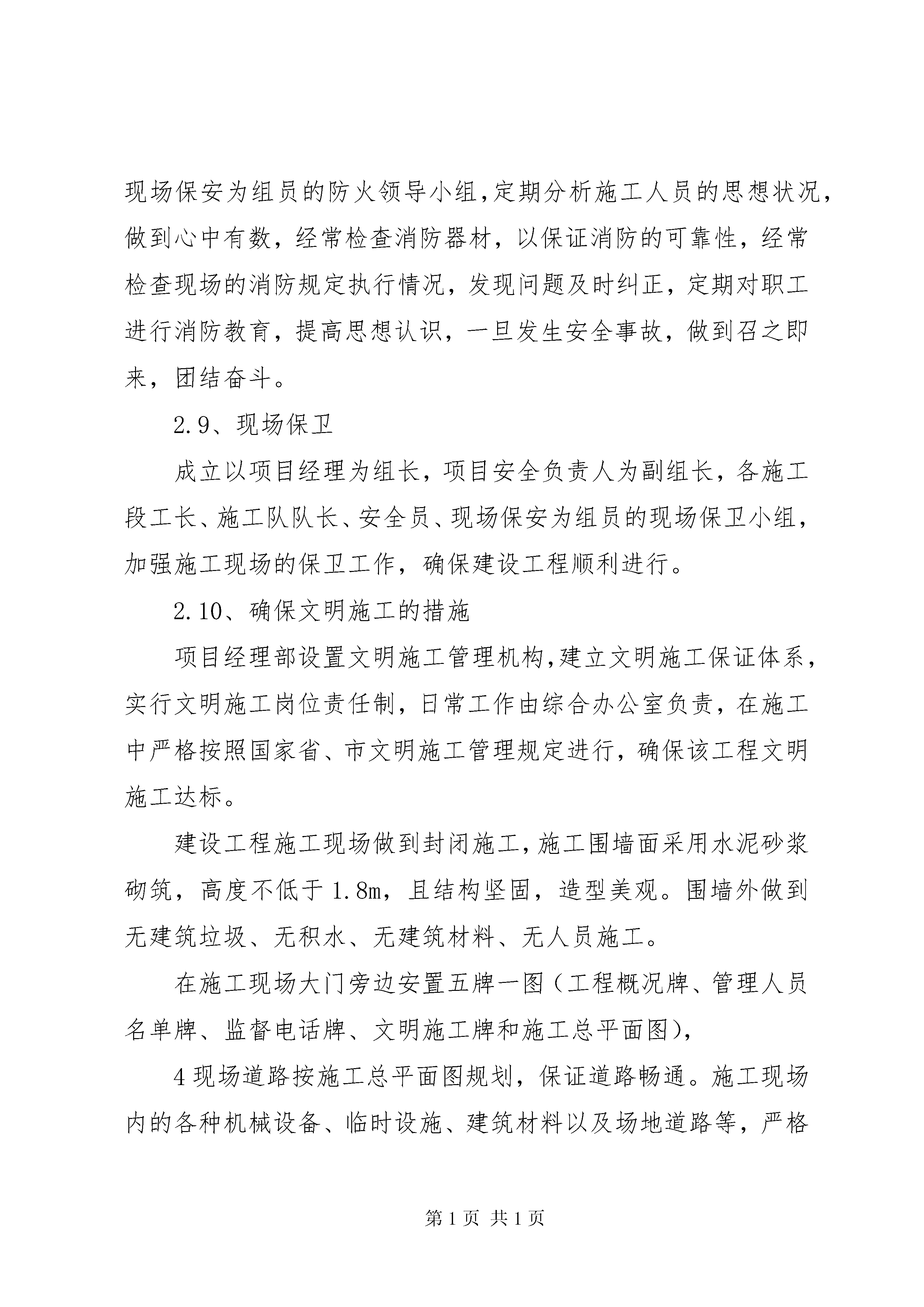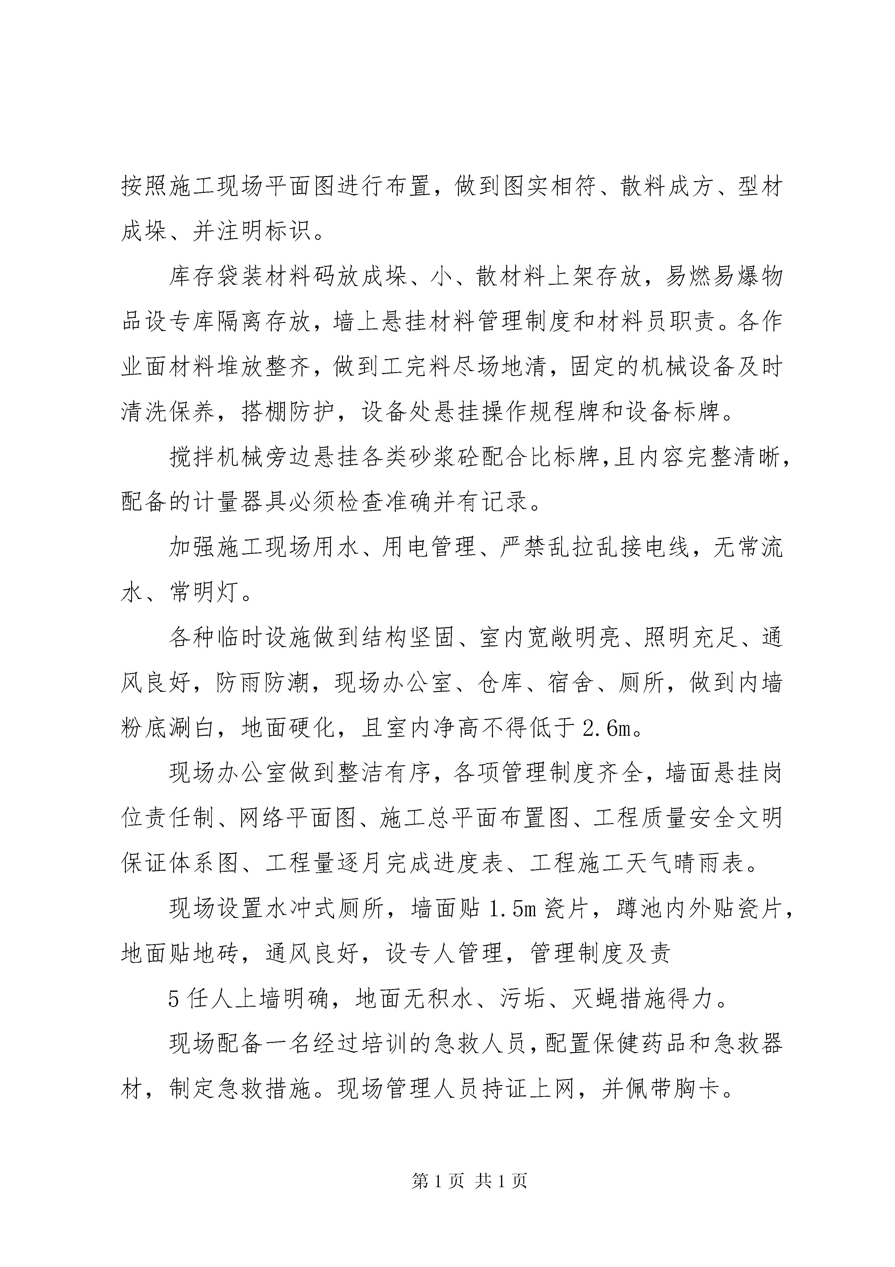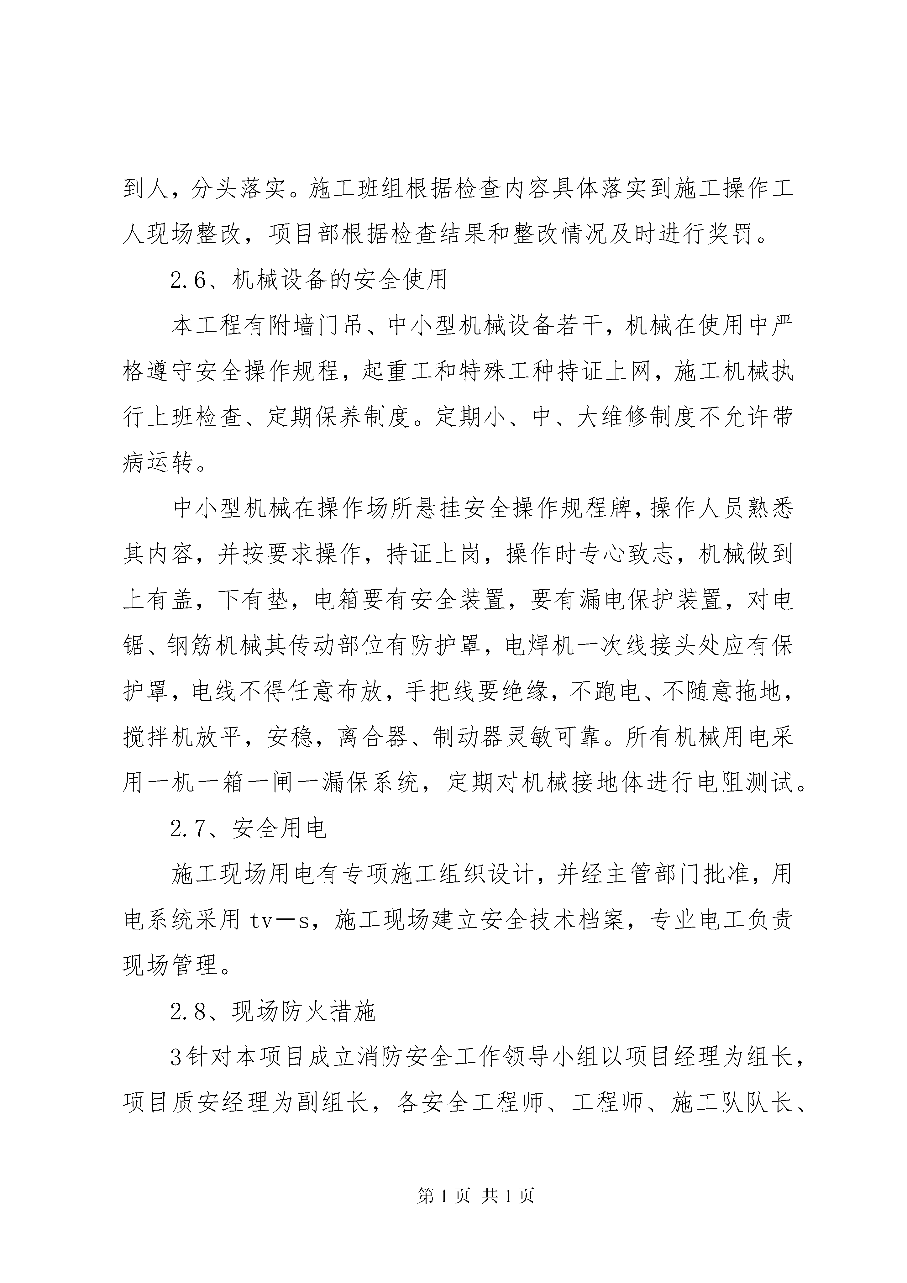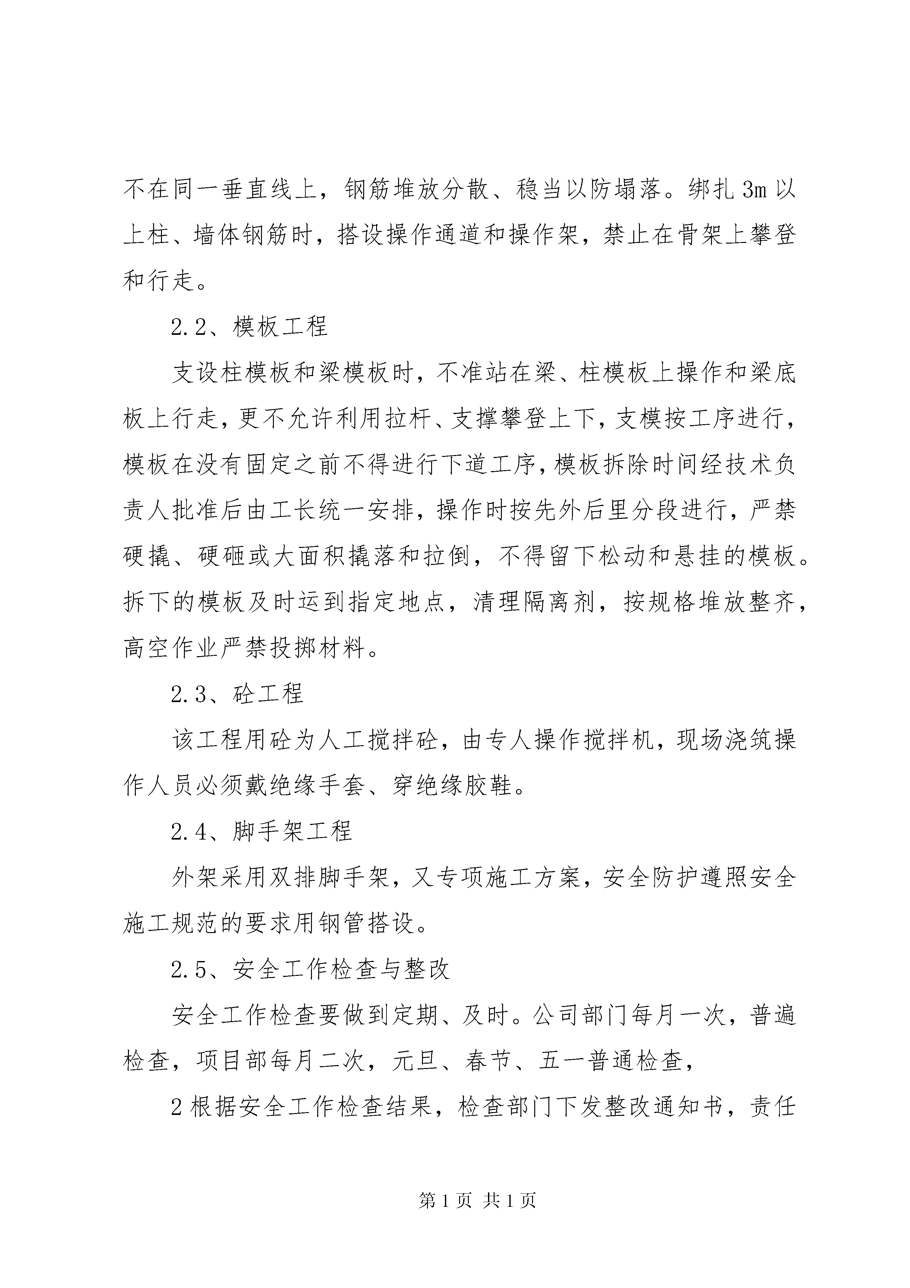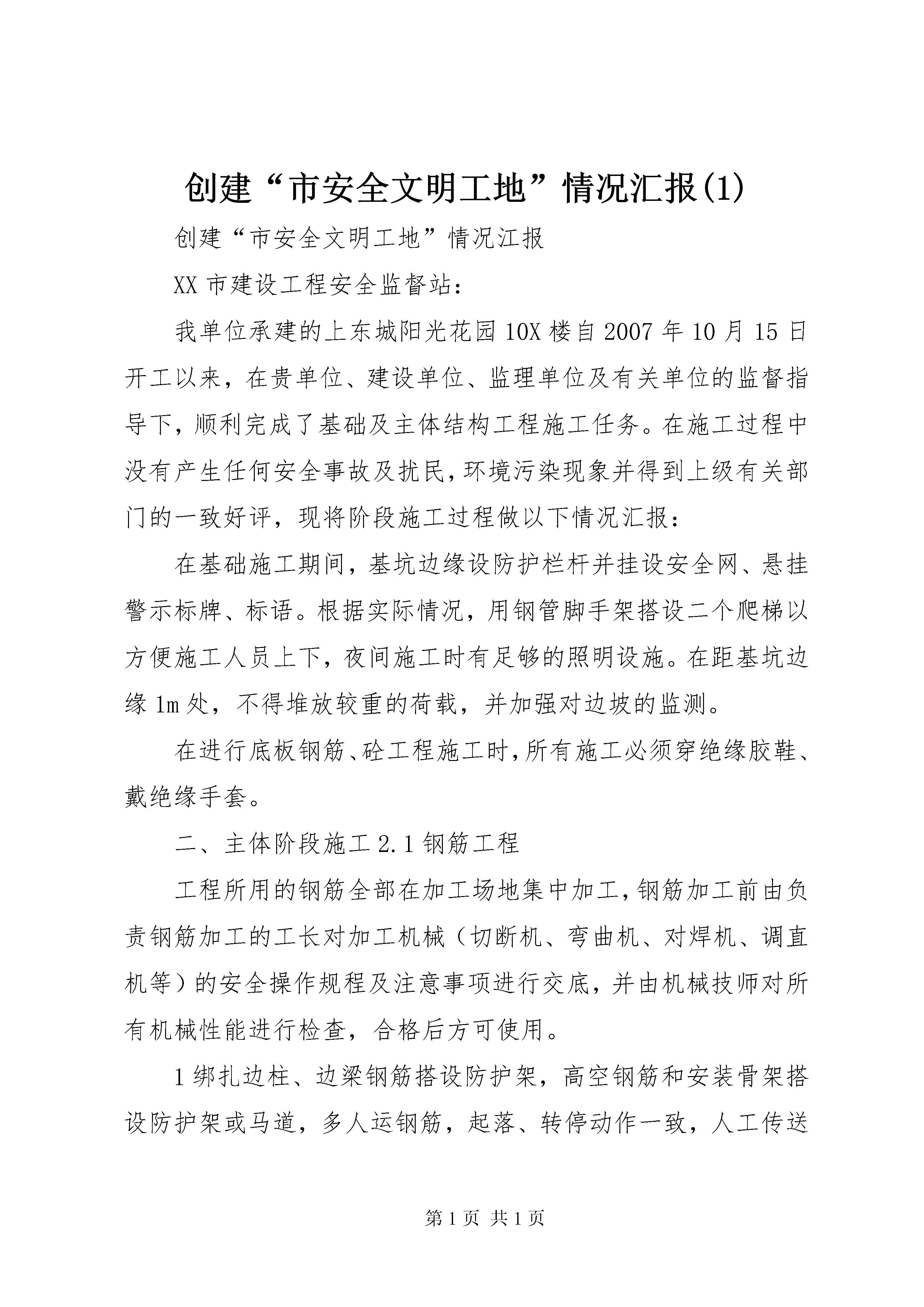 创建“市安全文明工地”情况汇报(1)创建“市安全文明工地”情况江报XX市建设工程安全监督站:我单位承建的上东城阳光花园10X楼自2007年10月15日开工以来,在贵单位、建设单位、监理单位及有关单位的监督指导下,顺利完成了基础及主体结构工程施工任务。在施工过程中没有产生任何安全事故及扰民,环境污染现象并得到上级有关部门的一致好评,现将阶段施工过程做以下情况汇报:在基础施工期间,基坑边缘设防护栏杆并挂设安全网、悬挂警示标牌、标语。根据实际情况,用钢管脚手架搭设二个爬梯以方便施工人员上下,夜间施工时有足够的照明设施。在距基坑边缘1m处,不得堆放较重的荷载,并加强对边坡的监测。在进行底板钢筋、砼工程施工时,所有施工必须穿绝缘胶鞋、戴绝缘手套。二、主体阶段施工2.1钢筋工程工程所用的钢筋全部在加工场地集中加工,钢筋加工前由负责钢筋加工的工长对加工机械(切断机、弯曲机、对焊机、调直机等)的安全操作规程及注意事项进行交底,并由机械技师对所有机械性能进行检查,合格后方可使用。1绑扎边柱、边梁钢筋搭设防护架,高空钢筋和安装骨架搭设防护架或马道,多人运钢筋,起落、转停动作一致,人工传送不在同一垂直线上,钢筋堆放分散、稳当以防塌落。绑扎3m以上柱、墙体钢筋时,搭设操作通道和操作架,禁止在骨架上攀登和行走。2.2、模板工程支设柱模板和梁模板时,不准站在梁、柱模板上操作和梁底板上行走,更不允许利用拉杆、支撑攀登上下,支模按工序进行,模板在没有固定之前不得进行下道工序,模板拆除时间经技术负责人批准后由工长统一安排,操作时按先外后里分段进行,严禁硬撬、硬砸或大面积撬落和拉倒,不得留下松动和悬挂的模板。拆下的模板及时运到指定地点,清理隔离剂,按规格堆放整齐,高空作业严禁投掷材料。2.3、砼工程该工程用砼为人工搅拌砼,由专人操作搅拌机,现场浇筑操作人员必须戴绝缘手套、穿绝缘胶鞋。2.4、脚手架工程外架采用双排脚手架,又专项施工方案,安全防护遵照安全施工规范的要求用钢管搭设。2.5、安全工作检查与整改安全工作检查要做到定期、及时。公司部门每月一次,普遍检查,项目部每月二次,元旦、春节、五一普通检查,2根据安全工作检查结果,检查部门下发整改通知书,责任到人,分头落实。施工班组根据检查内容具体落实到施工操作工人现场整改,项目部根据检查结果和整改情况及时进行奖罚。2.6、机械设备的安全使用本工程有附墙门吊、中小型机械设备若干,机械在使用中严格遵守安全操作规程,起重工和特殊工种持证上网,施工机械执行上班检查、定期保养制度。定期小、中、大维修制度不允许带病运转。中小型机械在操作场所悬挂安全操作规程牌,操作人员熟悉其内容,并按要求操作,持证上岗,操作时专心致志,机械做到上有盖,下有垫,电箱要有安全装置,要有漏电保护装置,对电锯、钢筋机械其传动部位有防护罩,电焊机一次线接头处应有保护罩,电线不得任意布放,手把线要绝缘,不跑电、不随意拖地,搅拌机放平,安稳,离合器、制动器灵敏可靠。所有机械用电采用一机一箱一闸一漏保系统,定期对机械接地体进行电阻测试。2.7、安全用电施工现场用电有专项施工组织设计,并经主管部门批准,用电系统采用tv-s,施工现场建立安全技术档案,专业电工负责现场管理。2.8、现场防火措施3针对本项目成立消防安全工作领导小组以项目经理为组长,项目质安经理为副组长,各安全工程师、工程师、施工队队长、现场保安为组员的防火领导小组,定期分析施工人员的思想状况,做到心中有数,经常检查消防器材,以保证消防的可靠性,经常检查现场的消防规定执行情况,发现问题及时纠正,定期对职工进行消防教育,提高思想认识,一旦发生安全事故,做到召之即来,团结奋斗。2.9、现场保卫成立以项目经理为组长,项目安全负责人为副组长,各施工段工长、施工队队长、安全员、现场保安为组员的现场保卫小组,加强施工现场的保卫工作,确保建设工程顺利进行。2.10、确保文明施工的措施项目经理部设置文明施工管理机构,建立文明施工保证体系,实行文明施工岗位责任制,日常工作由综合办公室负责,在施工中严格按照国家省、市文明施工管理规定进行,确保该工程文明施工达标。建设工程施工现场做到封闭施工,施工围墙面采用水泥砂浆砌筑,高度不低于1.8m,且结构坚固,造型美观。围墙外做到无建筑垃圾、无积水、无建筑材料、无人员施工。在施工现场大门旁边安置五牌一图(工程概况牌、管理人员名单牌、监督电话牌、文明施工牌和施工总平面图),4现场道路按施工总平面图规划,保证道路畅通。施工现场内的各种机械设备、临时设施、建筑材料以及场地道路等,严格按照施工现场平面图进行布置,做到图实相符、散料成方、型材成垛、并注明标识。库存袋装材料码放成垛、小、散材料上架存放,易燃易爆物品设专库隔离存放,墙上悬挂材料管理制度和材料员职责。各作业