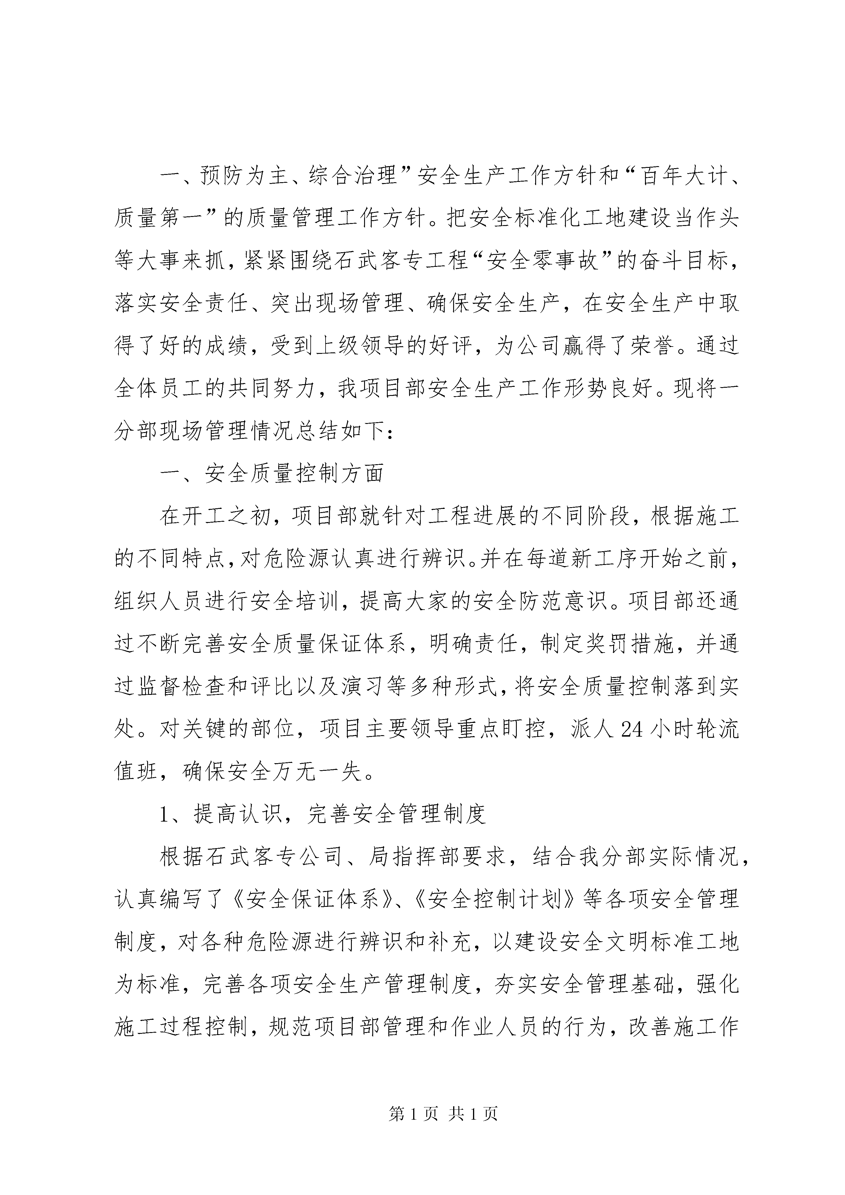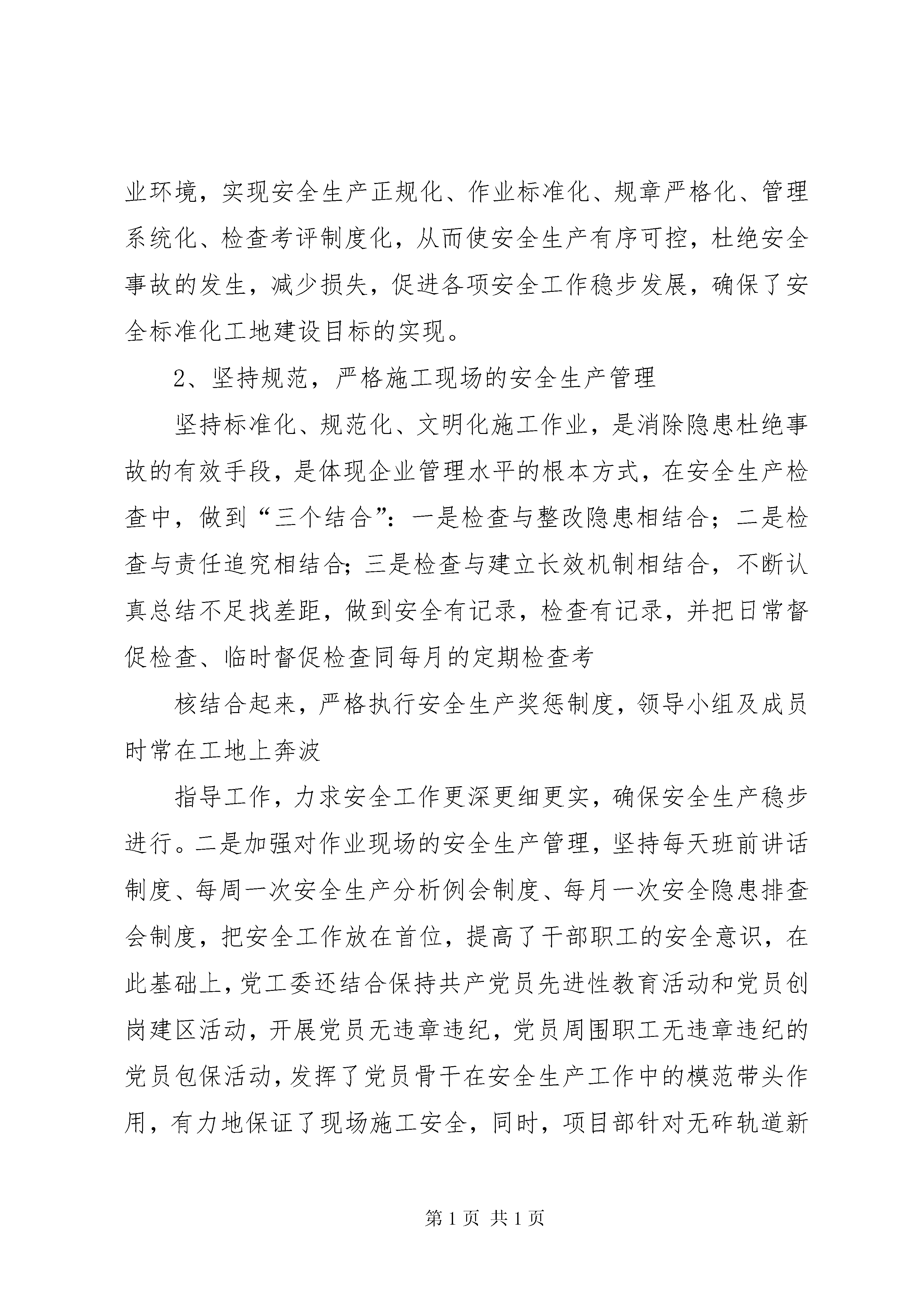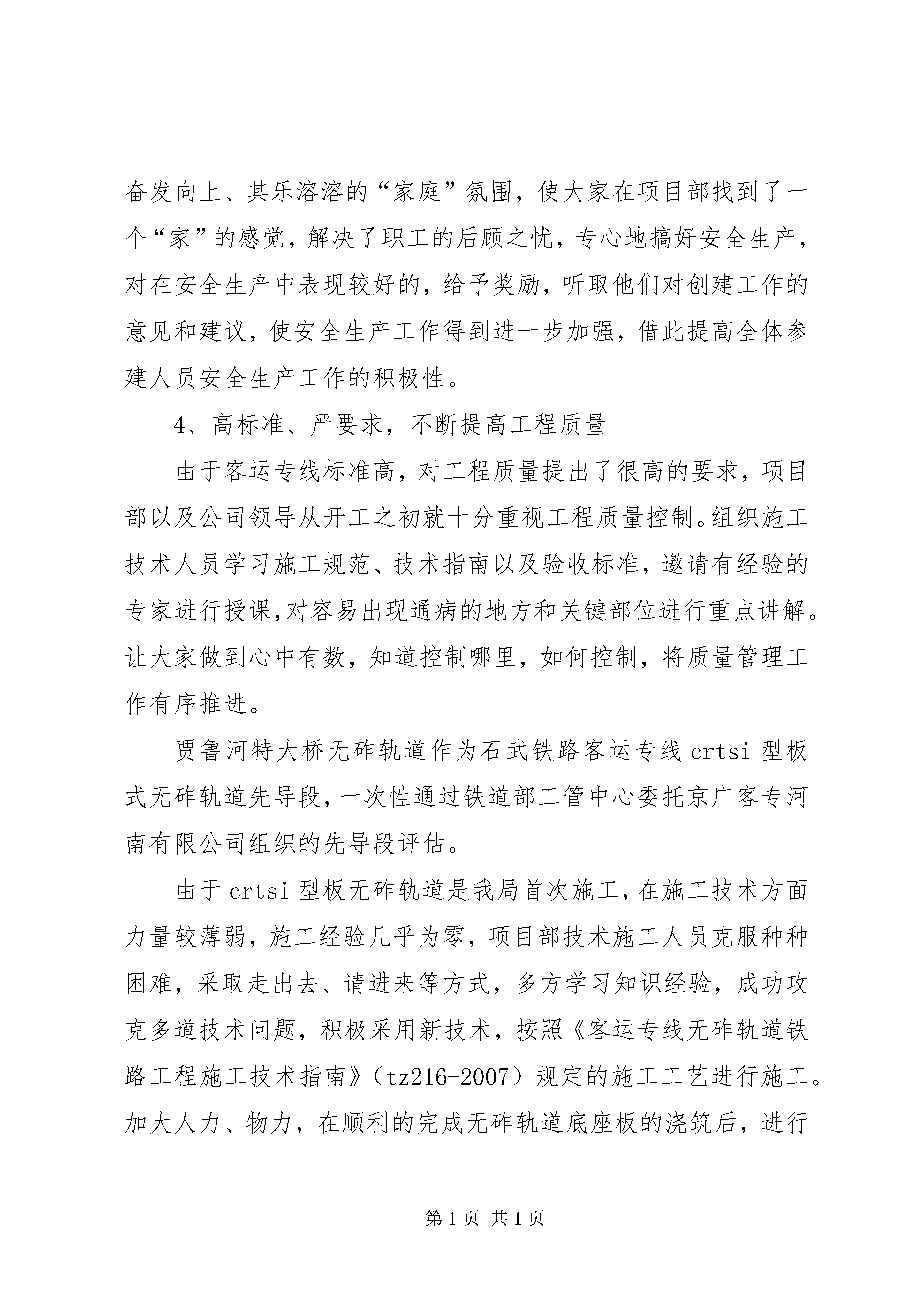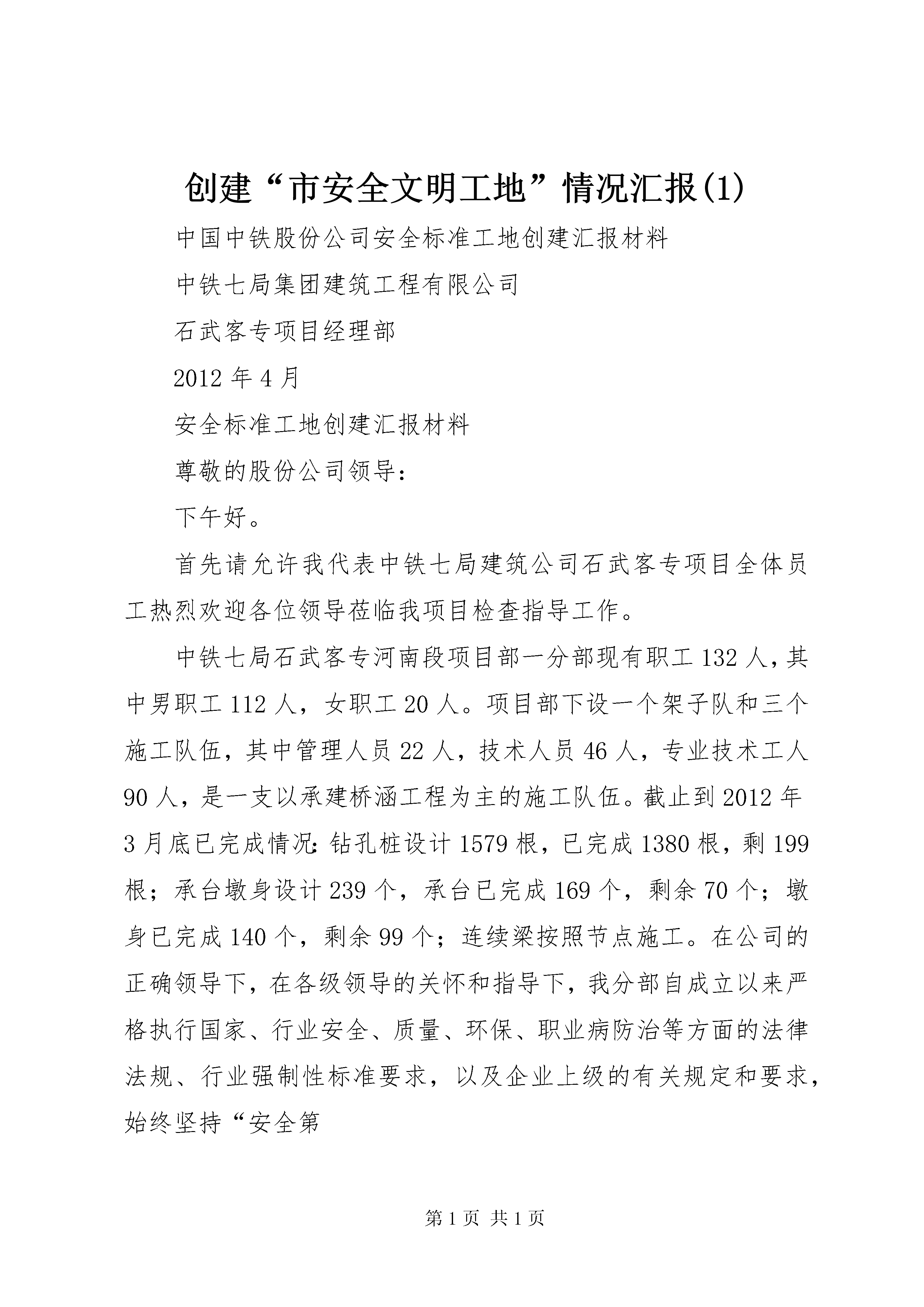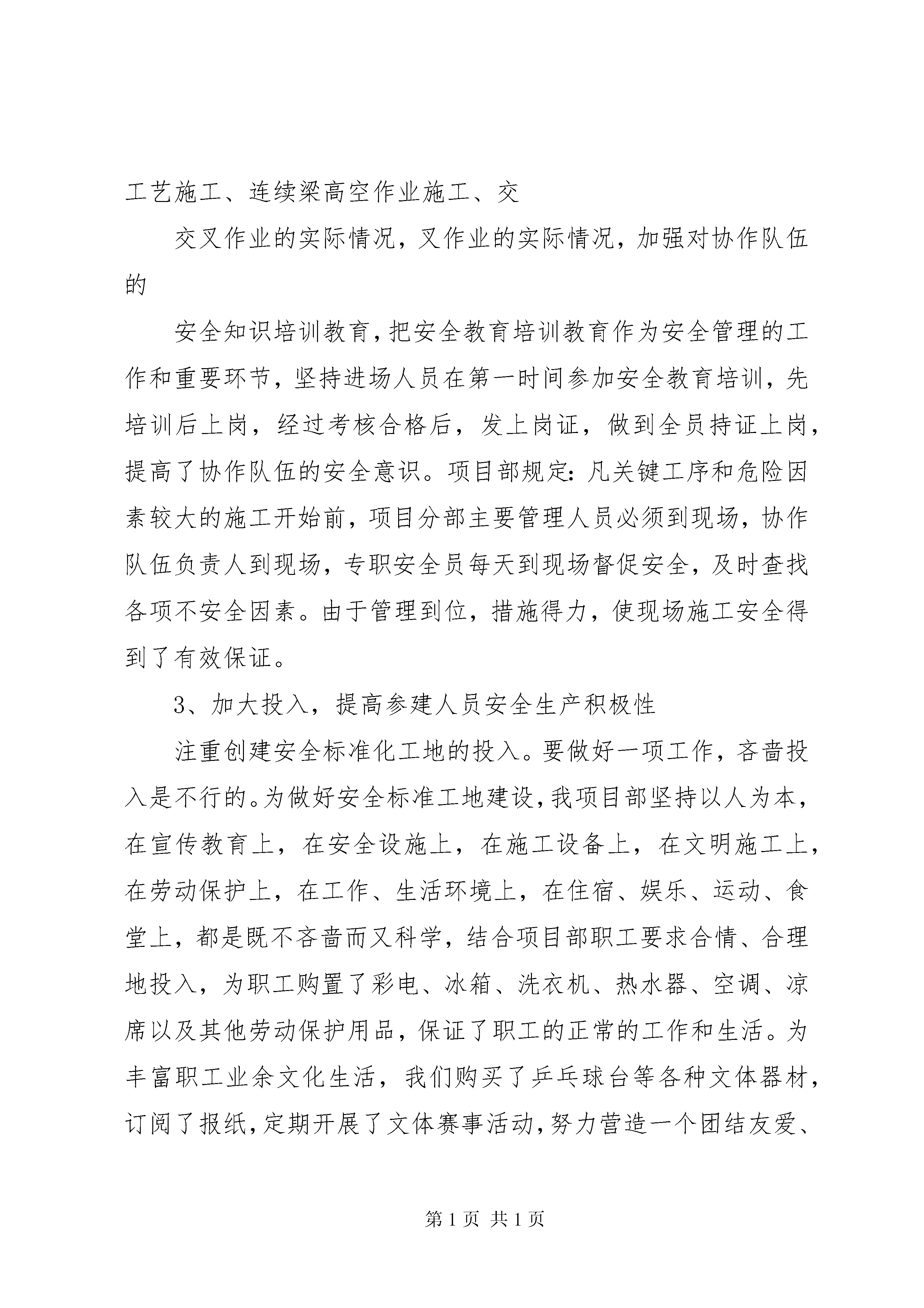 创建“市安全文明工地”情况汇报(1)中国中铁股份公司安全标准工地创建汇报材料中铁七局集团建筑工程有限公司石武客专项目经理部2012年4月安全标准工地创建汇报材料尊敬的股份公司领导:下午好。首先请允许我代表中铁七局建筑公司石武客专项目全体员工热烈欢迎各位领导莅临我项目检查指导工作。中铁七局石武客专河南段项目部一分部现有职工132人,其中男职工112人,女职工20人。项目部下设一个架子队和三个施工队伍,其中管理人员22人,技术人员46人,专业技术工人90人,是一支以承建桥涵工程为主的施工队伍。截止到2012年3月底已完成情况:钻孔桩设计1579根,已完成1380根,剩199根;承台墩身设计239个,承台已完成169个,剩余70个;墩身已完成140个,剩余99个;连续梁按照节点施工。在公司的正确领导下,在各级领导的关怀和指导下,我分部自成立以来严格执行国家、行业安全、质量、环保、职业病防治等方面的法律法规、行业强制性标准要求,以及企业上级的有关规定和要求,始终坚持“安全第一、预防为主、综合治理”安全生产工作方针和“百年大计、质量第一”的质量管理工作方针。把安全标准化工地建设当作头等大事来抓,紧紧围绕石武客专工程“安全零事故”的奋斗目标,落实安全责任、突出现场管理、确保安全生产,在安全生产中取得了好的成绩,受到上级领导的好评,为公司赢得了荣誉。通过全体员工的共同努力,我项目部安全生产工作形势良好。现将一分部现场管理情况总结如下:一、安全质量控制方面在开工之初,项目部就针对工程进展的不同阶段,根据施工的不同特点,对危险源认真进行辨识。并在每道新工序开始之前,组织人员进行安全培训,提高大家的安全防范意识。项目部还通过不断完善安全质量保证体系,明确责任,制定奖罚措施,并通过监督检查和评比以及演习等多种形式,将安全质量控制落到实处。对关键的部位,项目主要领导重点盯控,派人24小时轮流值班,确保安全万无一失。1、提高认识,完善安全管理制度根据石武客专公司、局指挥部要求,结合我分部实际情况,认真编写了《安全保证体系》、《安全控制计划》等各项安全管理制度,对各种危险源进行辨识和补充,以建设安全文明标准工地为标准,完善各项安全生产管理制度,夯实安全管理基础,强化施工过程控制,规范项目部管理和作业人员的行为,改善施工作业环境,实现安全生产正规化、作业标准化、规章严格化、管理系统化、检查考评制度化,从而使安全生产有序可控,杜绝安全事故的发生,减少损失,促进各项安全工作稳步发展,确保了安全标准化工地建设目标的实现。2、坚持规范,严格施工现场的安全生产管理坚持标准化、规范化、文明化施工作业,是消除隐患杜绝事故的有效手段,是体现企业管理水平的根本方式,在安全生产检查中,做到“三个结合”:一是检查与整改隐患相结合;二是检查与责任追究相结合;三是检查与建立长效机制相结合,不断认真总结不足找差距,做到安全有记录,检查有记录,并把日常督促检查、临时督促检查同每月的定期检查考核结合起来,严格执行安全生产奖惩制度,领导小组及成员时常在工地上奔波指导工作,力求安全工作更深更细更实,确保安全生产稳步进行。二是加强对作业现场的安全生产管理,坚持每天班前讲话制度、每周一次安全生产分析例会制度、每月一次安全隐患排查会制度,把安全工作放在首位,提高了干部职工的安全意识,在此基础上,党工委还结合保持共产党员先进性教育活动和党员创岗建区活动,开展党员无违章违纪,党员周围职工无违章违纪的党员包保活动,发挥了党员骨干在安全生产工作中的模范带头作用,有力地保证了现场施工安全,同时,项目部针对无砟轨道新工艺施工、连续梁高空作业施工、交交叉作业的实际情况,叉作业的实际情况,加强对协作队伍的安全知识培训教育,把安全教育培训教育作为安全管理的工作和重要环节,坚持进场人员在第一时间参加安全教育培训,先培训后上岗,经过考核合格后,发上岗证,做到全员持证上岗,提高了协作队伍的安全意识。项目部规定:凡关键工序和危险因素较大的施工开始前,项目分部主要管理人员必须到现场,协作队伍负责人到现场,专职安全员每天到现场督促安全,及时查找各项不安全因素。由于管理到位,措施得力,使现场施工安全得到了有效保证。3、加大投入,提高参建人员安全生产积极性注重创建安全标准化工地的投入。要做好一项工作,吝啬投入是不行的。为做好安全标准工地建设,我项目部坚持以人为本,在宣传教育上,在安全设施上,在施工设备上,在文明施工上,在劳动保护上,在工作、生活环境上,在住宿、娱乐、运动、食堂上,都是既不吝啬而又科学,结合项目部职工要求合情、合理地投入,为职工购置了彩电、冰箱、洗衣机、热水器、空调、凉席以及其他劳动保护用品,保证了职工的正常的工作和生活。为丰富职工业余文化生活,我们购买了乒乓球台等各种文体器材,订阅了报纸,