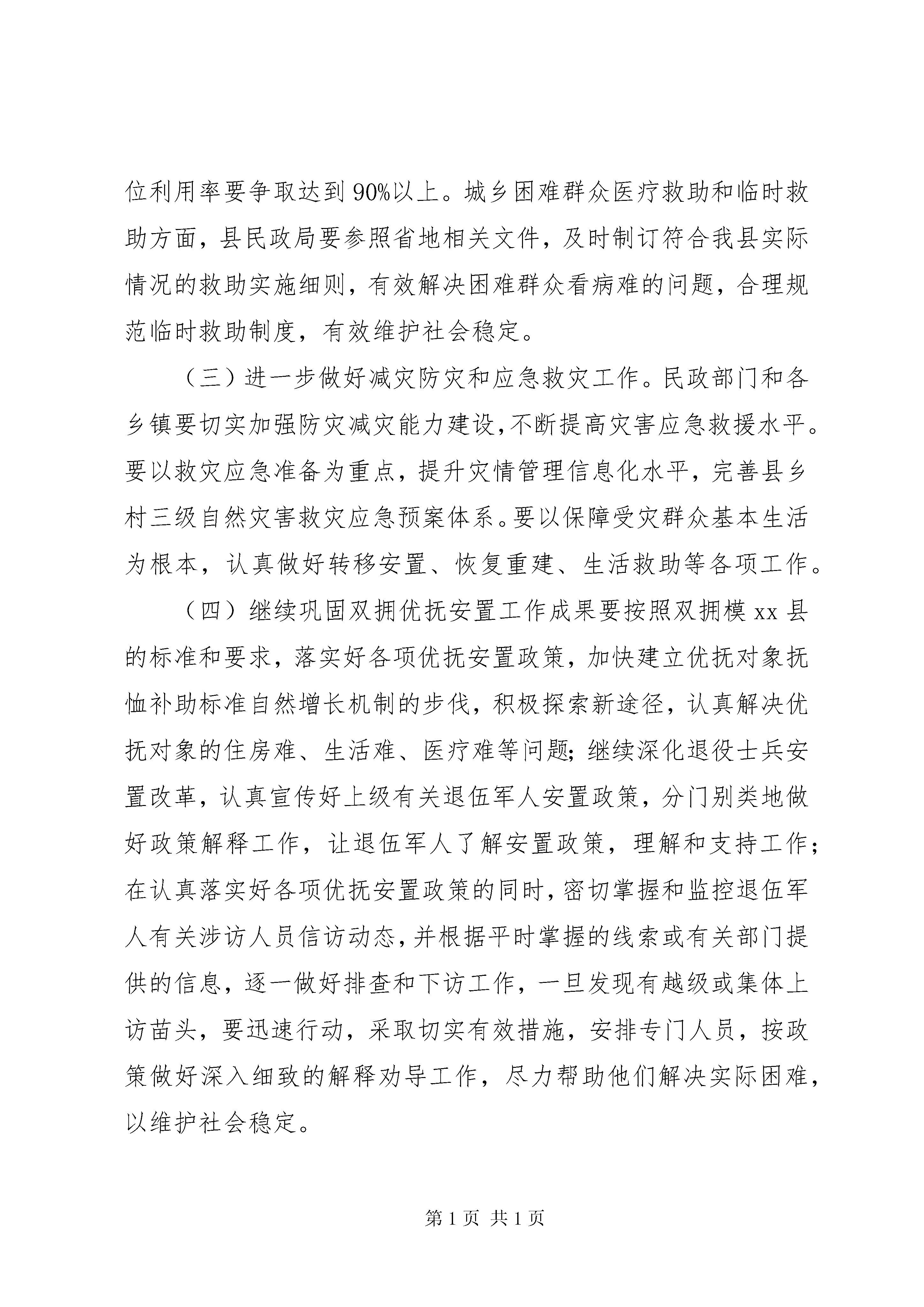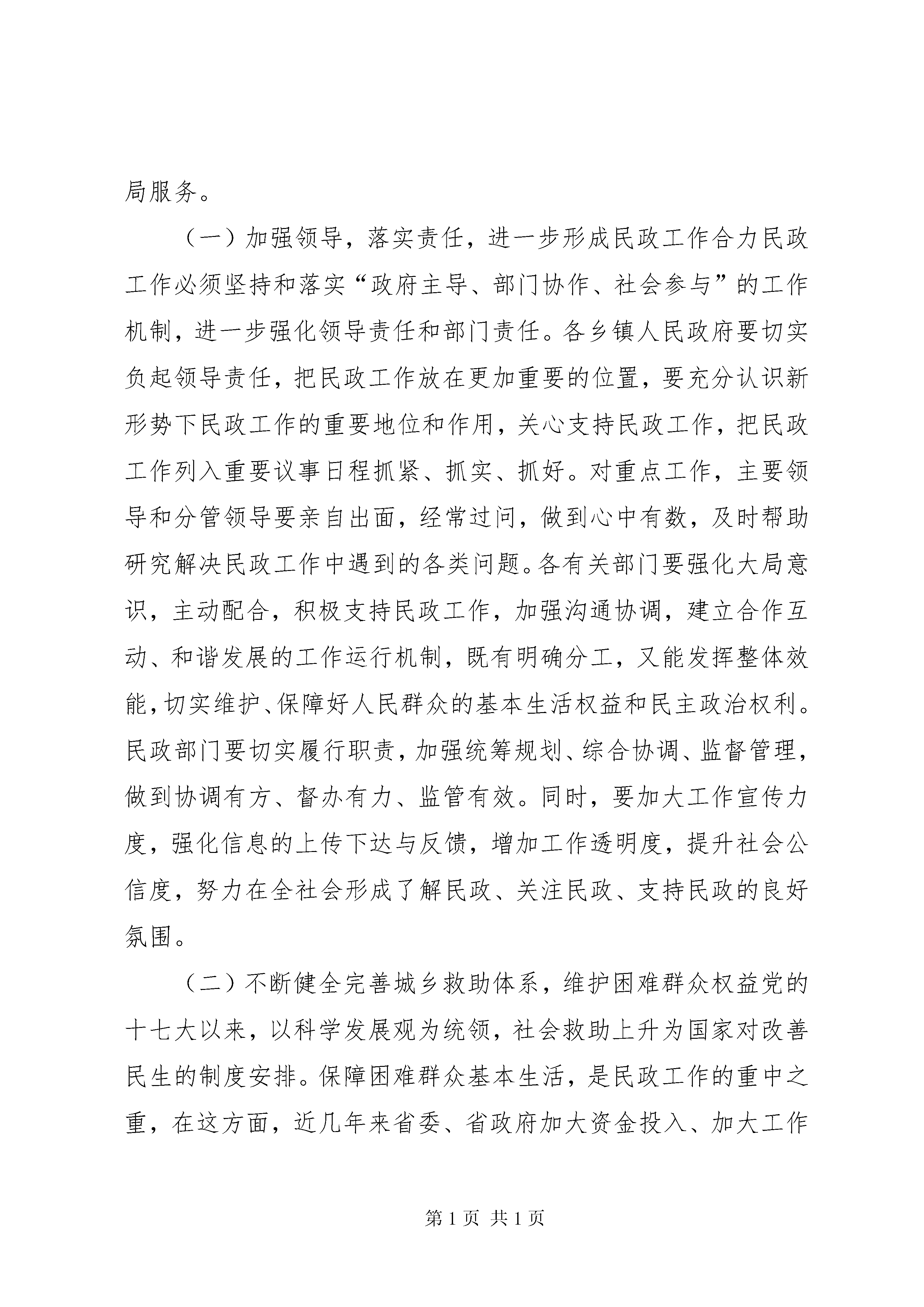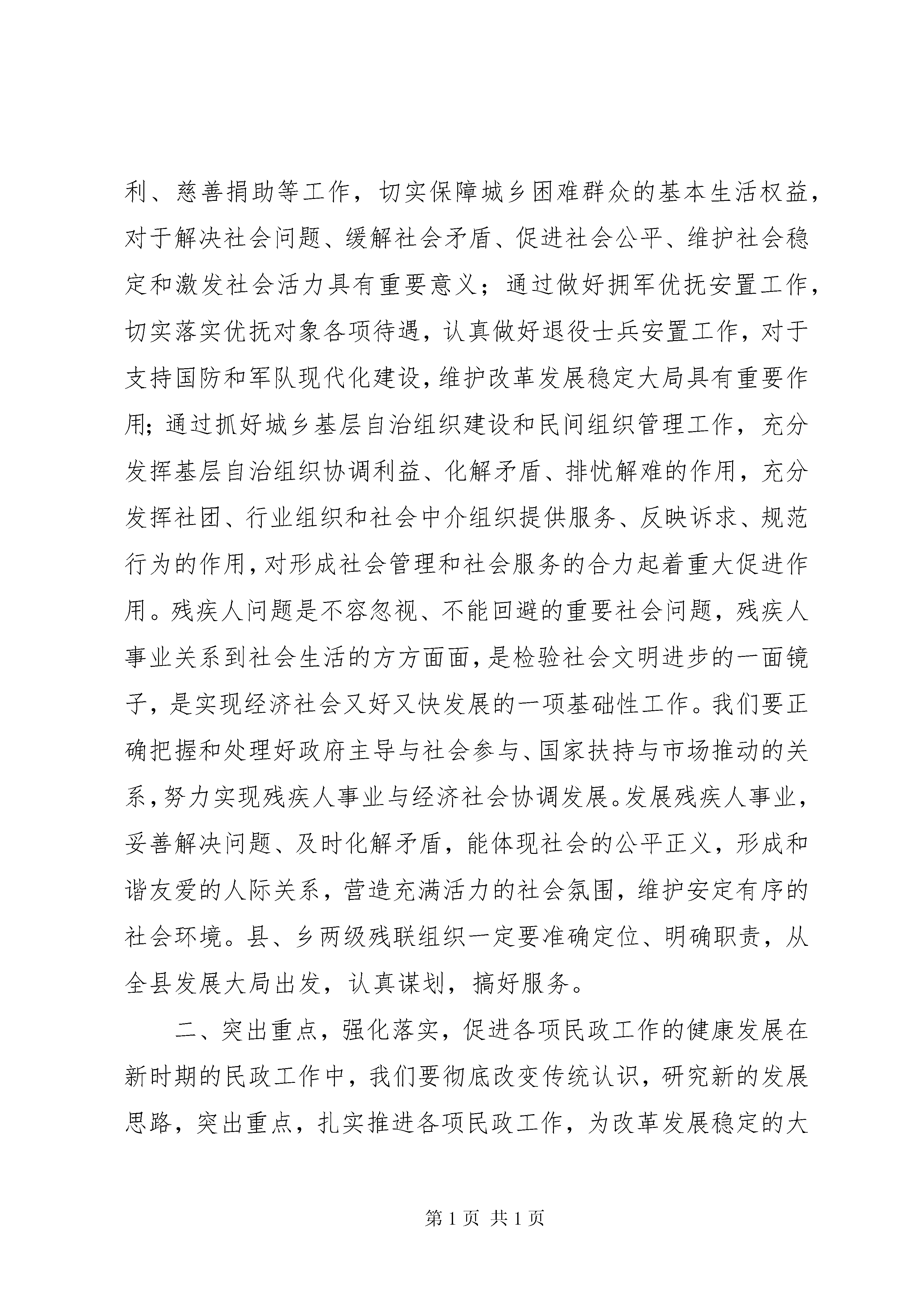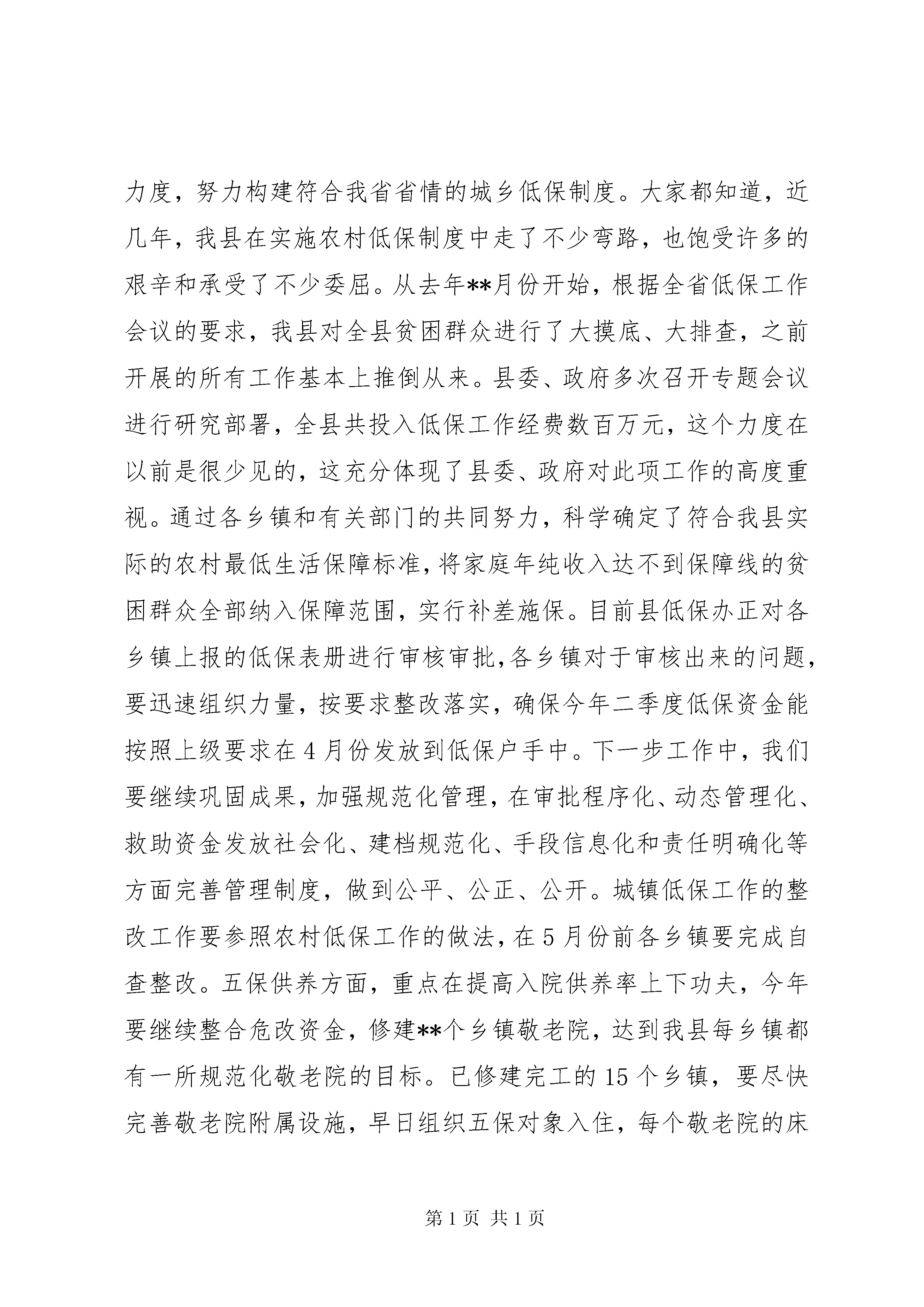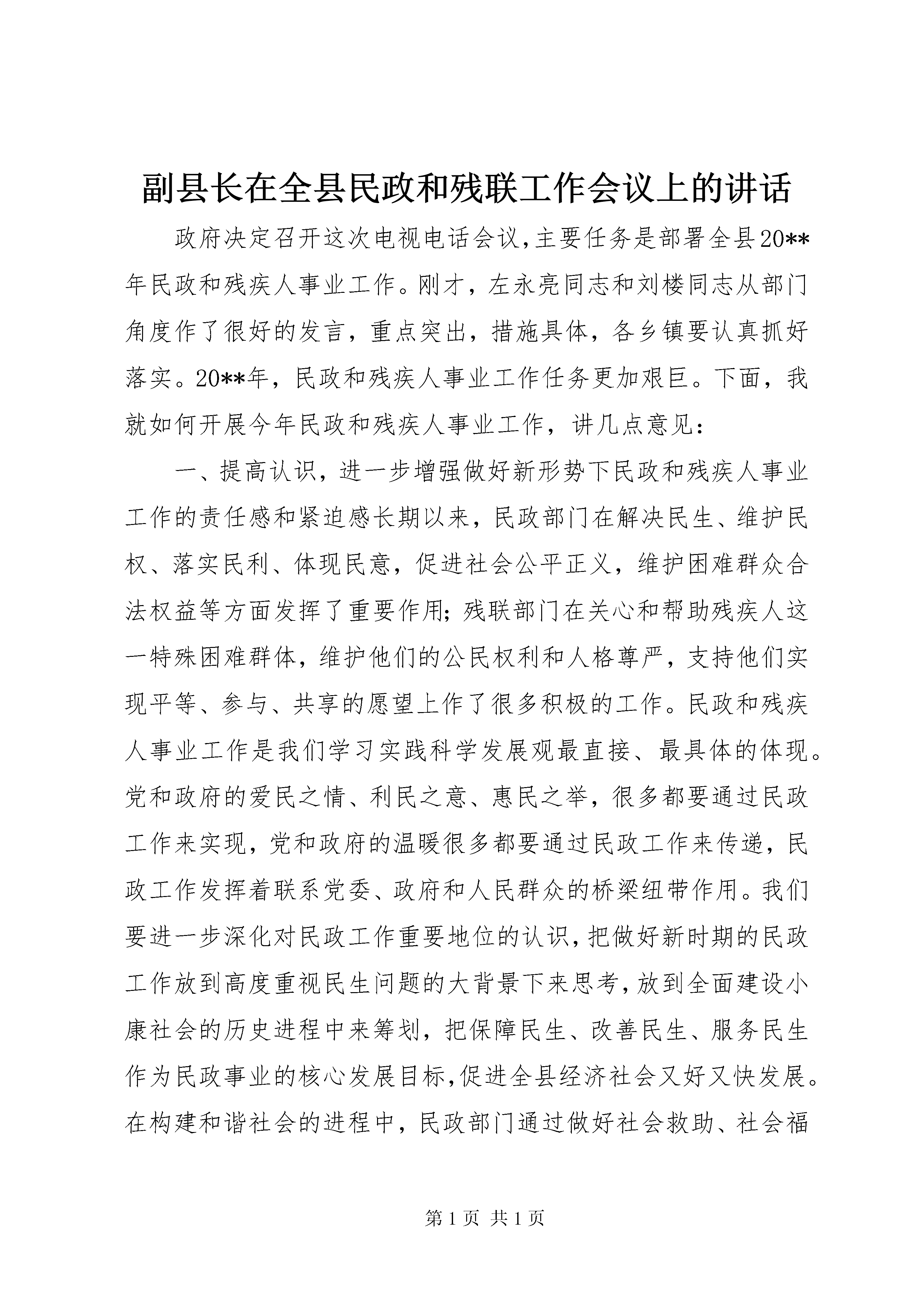 副县长在全县民政和残联工作会议上的讲话政府决定召开这次电视电话会议,主要任务是部署全县20**年民政和残疾人事业工作。刚才,左永亮同志和刘楼同志从部门角度作了很好的发言,重点突出,措施具体,各乡镇要认真抓好落实。20**年,民政和残疾人事业工作任务更加艰巨。下面,我就如何开展今年民政和残疾人事业工作,讲几点意见:一、提高认识,进一步增强做好新形势下民政和残疾人事业工作的责任感和紧迫感长期以来,民政部门在解决民生、维护民权、落实民利、体现民意,促进社会公平正义,维护困难群众合法权益等方面发挥了重要作用;残联部门在关心和帮助残疾人这一特殊困难群体,维护他们的公民权利和人格尊严,支持他们实现平等、参与、共享的愿望上作了很多积极的工作。民政和残疾人事业工作是我们学习实践科学发展观最直接、最具体的体现。党和政府的爱民之情、利民之意、惠民之举,很多都要通过民政工作来实现,党和政府的温暖很多都要通过民政工作来传递,民政工作发挥着联系党委、政府和人民群众的桥梁纽带作用。我们要进一步深化对民政工作重要地位的认识,把做好新时期的民政工作放到高度重视民生问题的大背景下来思考,放到全面建设小康社会的历史进程中来筹划,把保障民生、改善民生、服务民生作为民政事业的核心发展目标,促进全县经济社会又好又快发展。在构建和谐社会的进程中,民政部门通过做好社会救助、社会福利、慈善捐助等工作,切实保障城乡困难群众的基本生活权益,对于解决社会问题、缓解社会矛盾、促进社会公平、维护社会稳定和激发社会活力具有重要意义;通过做好拥军优抚安置工作,切实落实优抚对象各项待遇,认真做好退役士兵安置工作,对于支持国防和军队现代化建设,维护改革发展稳定大局具有重要作用;通过抓好城乡基层自治组织建设和民间组织管理工作,充分发挥基层自治组织协调利益、化解矛盾、排忧解难的作用,充分发挥社团、行业组织和社会中介组织提供服务、反映诉求、规范行为的作用,对形成社会管理和社会服务的合力起着重大促进作用。残疾人问题是不容忽视、不能回避的重要社会问题,残疾人事业关系到社会生活的方方面面,是检验社会文明进步的一面镜子,是实现经济社会又好又快发展的一项基础性工作。我们要正确把握和处理好政府主导与社会参与、国家扶持与市场推动的关系,努力实现残疾人事业与经济社会协调发展。发展残疾人事业,妥善解决问题、及时化解矛盾,能体现社会的公平正义,形成和谐友爱的人际关系,营造充满活力的社会氛围,维护安定有序的社会环境。县、乡两级残联组织一定要准确定位、明确职责,从全县发展大局出发,认真谋划,搞好服务。二、突出重点,强化落实,促进各项民政工作的健康发展在新时期的民政工作中,我们要彻底改变传统认识,研究新的发展思路,突出重点,扎实推进各项民政工作,为改革发展稳定的大局服务。(一)加强领导,落实责任,进一步形成民政工作合力民政工作必须坚持和落实“政府主导、部门协作、社会参与”的工作机制,进一步强化领导责任和部门责任。各乡镇人民政府要切实负起领导责任,把民政工作放在更加重要的位置,要充分认识新形势下民政工作的重要地位和作用,关心支持民政工作,把民政工作列入重要议事日程抓紧、抓实、抓好。对重点工作,主要领导和分管领导要亲自出面,经常过问,做到心中有数,及时帮助研究解决民政工作中遇到的各类问题。各有关部门要强化大局意识,主动配合,积极支持民政工作,加强沟通协调,建立合作互动、和谐发展的工作运行机制,既有明确分工,又能发挥整体效能,切实维护、保障好人民群众的基本生活权益和民主政治权利。民政部门要切实履行职责,加强统筹规划、综合协调、监督管理,做到协调有方、督办有力、监管有效。同时,要加大工作宣传力度,强化信息的上传下达与反馈,增加工作透明度,提升社会公信度,努力在全社会形成了解民政、关注民政、支持民政的良好氛围。(二)不断健全完善城乡救助体系,维护困难群众权益党的十七大以来,以科学发展观为统领,社会救助上升为国家对改善民生的制度安排。保障困难群众基本生活,是民政工作的重中之重,在这方面,近几年来省委、省政府加大资金投入、加大工作力度,努力构建符合我省省情的城乡低保制度。大家都知道,近几年,我县在实施农村低保制度中走了不少弯路,也饱受许多的艰辛和承受了不少委屈。从去年**月份开始,根据全省低保工作会议的要求,我县对全县贫困群众进行了大摸底、大排查,之前开展的所有工作基本上推倒从来。县委、政府多次召开专题会议进行研究部署,全县共投入低保工作经费数百万元,这个力度在以前是很少见的,这充分体现了县委、政府对此项工作的高度重视。通过各乡镇和有关部门的共同努力,科学确定了符合我县实际的农村最低生活保障标准,将家庭年纯收入达不到保障线的贫困群众全部纳入保障范围,实行补差施保。目前县低保办正对各乡镇上报的低保表册进行审核审批