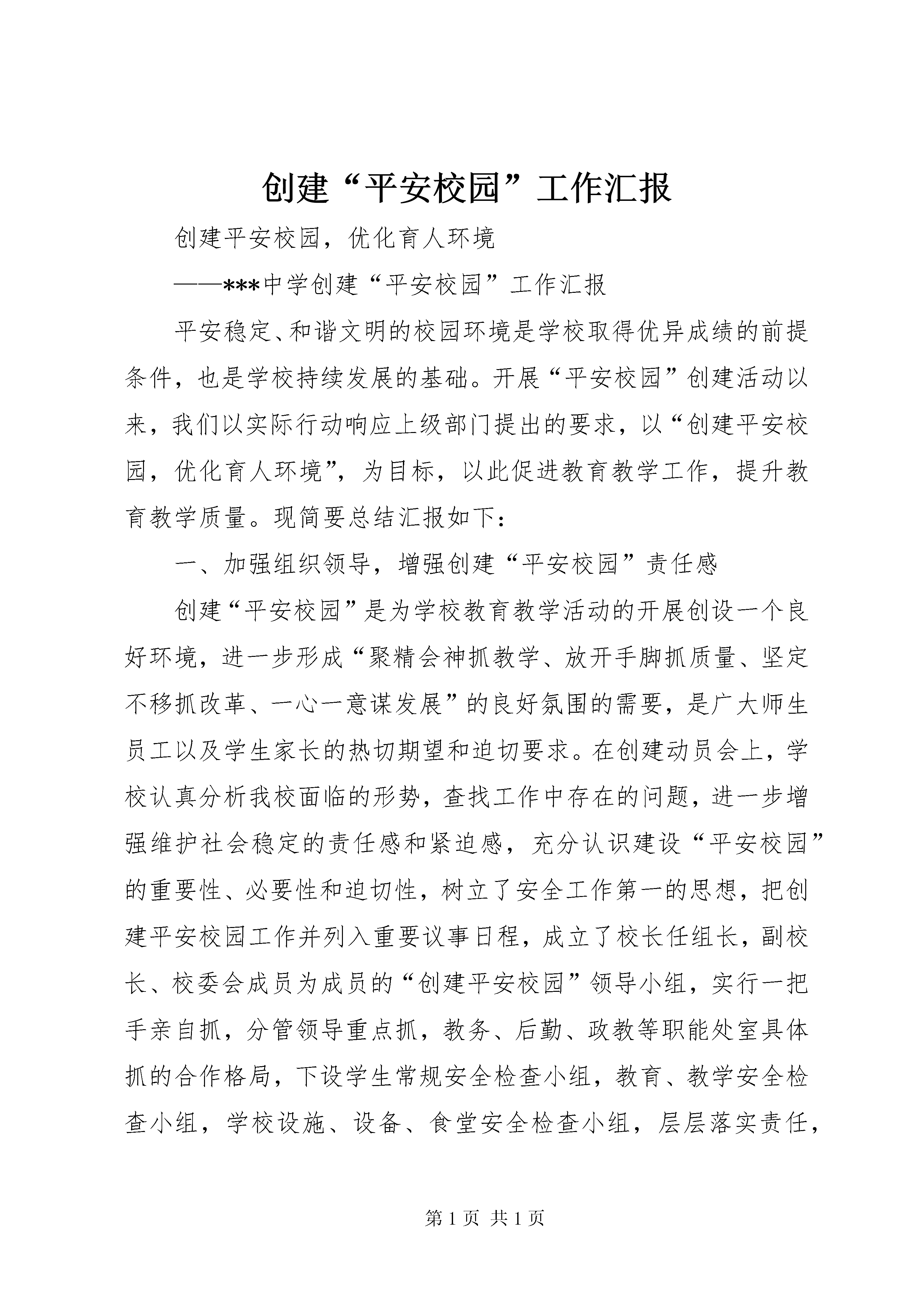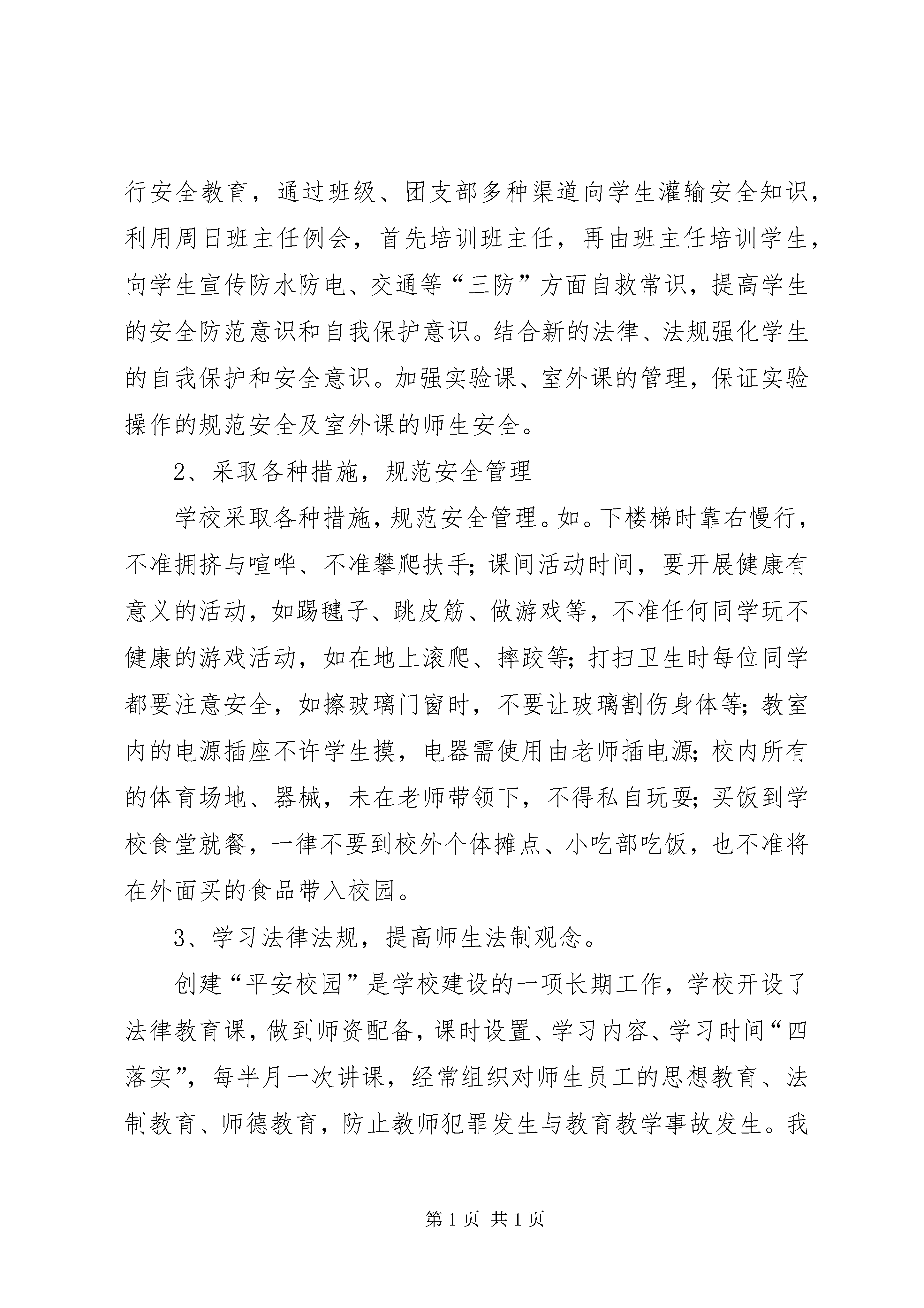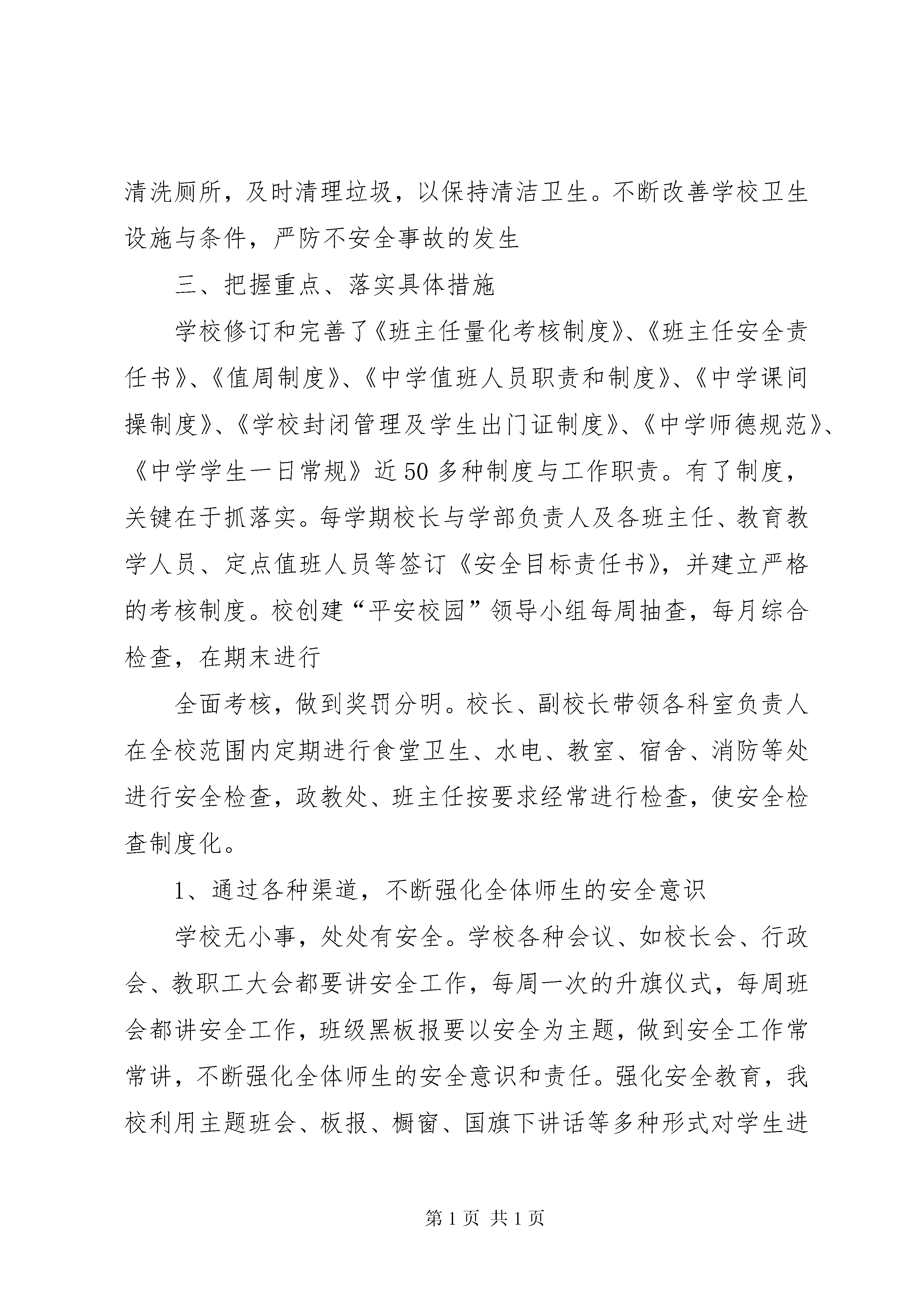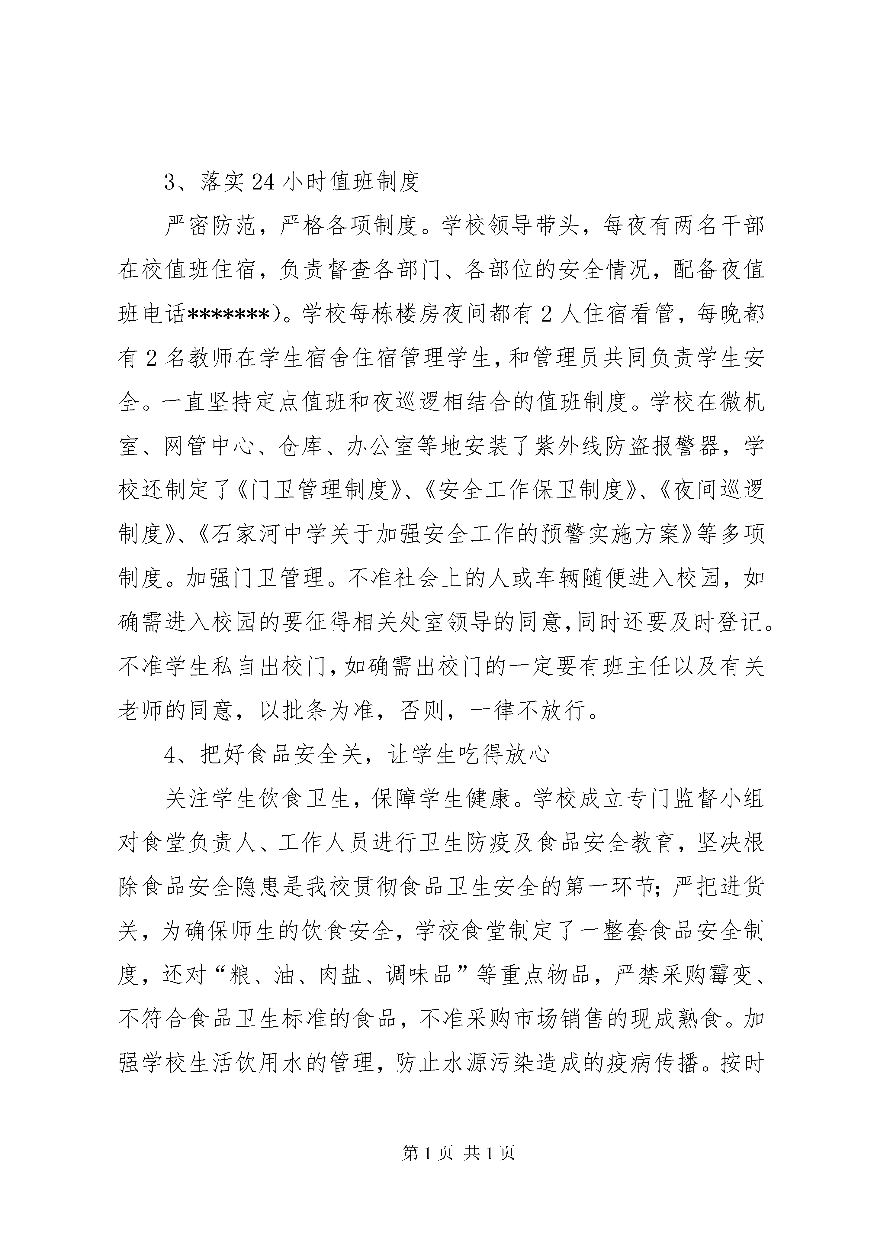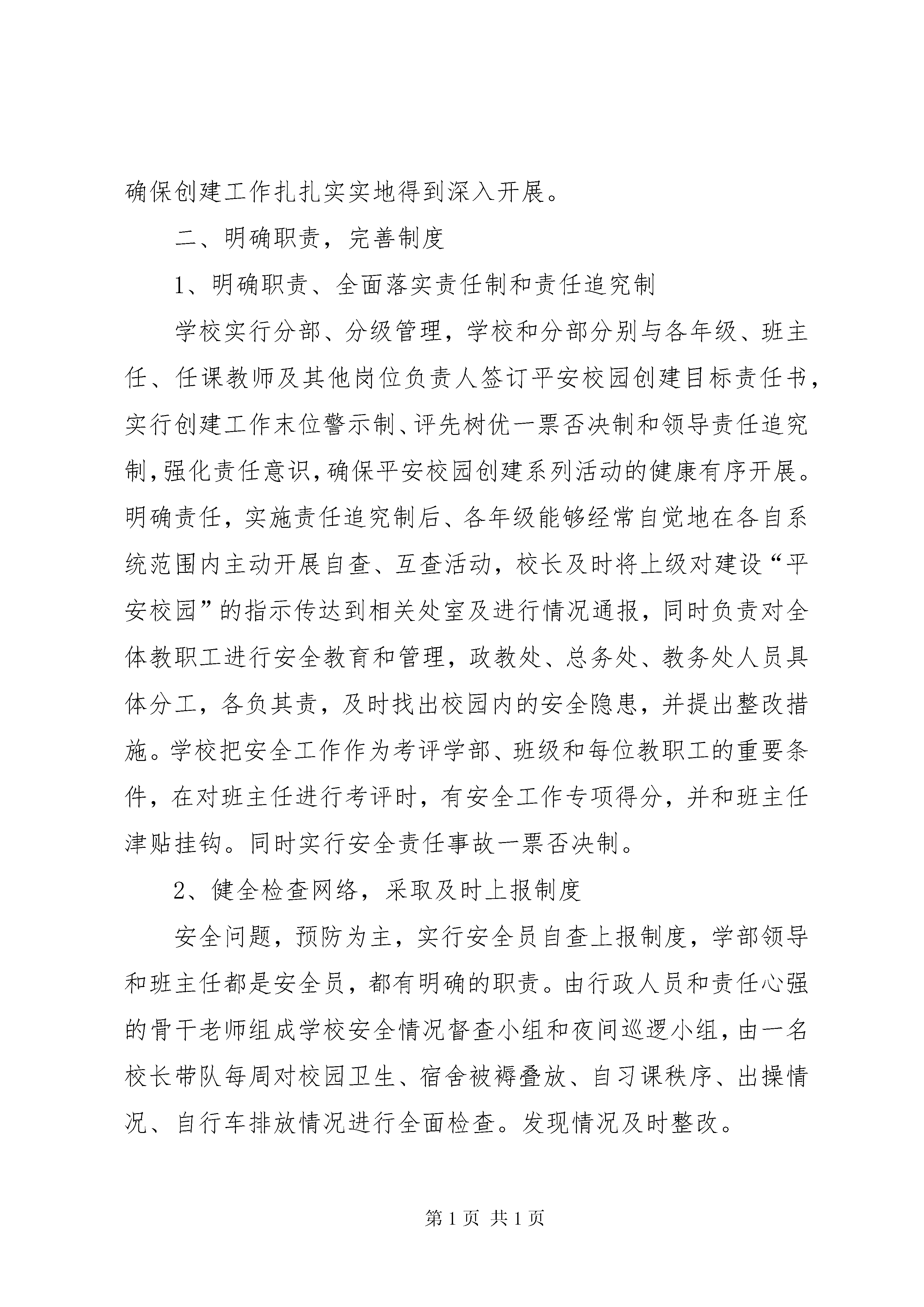 创建“平安校园”工作汇报创建平安校园,优化育人环境——***中学创建“平安校园”工作汇报平安稳定、和谐文明的校园环境是学校取得优异成绩的前提条件,也是学校持续发展的基础。开展“平安校园”创建活动以来,我们以实际行动响应上级部门提出的要求,以“创建平安校园,优化育人环境”,为目标,以此促进教育教学工作,提升教育教学质量。现简要总结汇报如下:一、加强组织领导,增强创建“平安校园”责任感创建“平安校园”是为学校教育教学活动的开展创设一个良好环境,进一步形成“聚精会神抓教学、放开手脚抓质量、坚定不移抓改革、一心一意谋发展”的良好氛围的需要,是广大师生员工以及学生家长的热切期望和迫切要求。在创建动员会上,学校认真分析我校面临的形势,查找工作中存在的问题,进一步增强维护社会稳定的责任感和紧迫感,充分认识建设“平安校园”的重要性、必要性和迫切性,树立了安全工作第一的思想,把创建平安校园工作并列入重要议事日程,成立了校长任组长,副校长、校委会成员为成员的“创建平安校园”领导小组,实行一把手亲自抓,分管领导重点抓,教务、后勤、政教等职能处室具体抓的合作格局,下设学生常规安全检查小组,教育、教学安全检查小组,学校设施、设备、食堂安全检查小组,层层落实责任,确保创建工作扎扎实实地得到深入开展。二、明确职责,完善制度1、明确职责、全面落实责任制和责任追究制学校实行分部、分级管理,学校和分部分别与各年级、班主任、任课教师及其他岗位负责人签订平安校园创建目标责任书,实行创建工作末位警示制、评先树优一票否决制和领导责任追究制,强化责任意识,确保平安校园创建系列活动的健康有序开展。明确责任,实施责任追究制后、各年级能够经常自觉地在各自系统范围内主动开展自查、互查活动,校长及时将上级对建设“平安校园”的指示传达到相关处室及进行情况通报,同时负责对全体教职工进行安全教育和管理,政教处、总务处、教务处人员具体分工,各负其责,及时找出校园内的安全隐患,并提出整改措施。学校把安全工作作为考评学部、班级和每位教职工的重要条件,在对班主任进行考评时,有安全工作专项得分,并和班主任津贴挂钩。同时实行安全责任事故一票否决制。2、健全检查网络,采取及时上报制度安全问题,预防为主,实行安全员自查上报制度,学部领导和班主任都是安全员,都有明确的职责。由行政人员和责任心强的骨干老师组成学校安全情况督查小组和夜间巡逻小组,由一名校长带队每周对校园卫生、宿舍被褥叠放、自习课秩序、出操情况、自行车排放情况进行全面检查。发现情况及时整改。3、落实24小时值班制度严密防范,严格各项制度。学校领导带头,每夜有两名干部在校值班住宿,负责督查各部门、各部位的安全情况,配备夜值班电话*******)。学校每栋楼房夜间都有2人住宿看管,每晚都有2名教师在学生宿舍住宿管理学生,和管理员共同负责学生安全。一直坚持定点值班和夜巡逻相结合的值班制度。学校在微机室、网管中心、仓库、办公室等地安装了紫外线防盗报警器,学校还制定了《门卫管理制度》、《安全工作保卫制度》、《夜间巡逻制度》、《石家河中学关于加强安全工作的预警实施方案》等多项制度。加强门卫管理。不准社会上的人或车辆随便进入校园,如确需进入校园的要征得相关处室领导的同意,同时还要及时登记。不准学生私自出校门,如确需出校门的一定要有班主任以及有关老师的同意,以批条为准,否则,一律不放行。4、把好食品安全关,让学生吃得放心关注学生饮食卫生,保障学生健康。学校成立专门监督小组对食堂负责人、工作人员进行卫生防疫及食品安全教育,坚决根除食品安全隐患是我校贯彻食品卫生安全的第一环节;严把进货关,为确保师生的饮食安全,学校食堂制定了一整套食品安全制度,还对“粮、油、肉盐、调味品”等重点物品,严禁采购霉变、不符合食品卫生标准的食品,不准采购市场销售的现成熟食。加强学校生活饮用水的管理,防止水源污染造成的疫病传播。按时清洗厕所,及时清理垃圾,以保持清洁卫生。不断改善学校卫生设施与条件,严防不安全事故的发生三、把握重点、落实具体措施学校修订和完善了《班主任量化考核制度》、《班主任安全责任书》、《值周制度》、《中学值班人员职责和制度》、《中学课间操制度》、《学校封闭管理及学生出门证制度》、《中学师德规范》、《中学学生一日常规》近50多种制度与工作职责。有了制度,关键在于抓落实。每学期校长与学部负责人及各班主任、教育教学人员、定点值班人员等签订《安全目标责任书》,并建立严格的考核制度。校创建“平安校园”领导小组每周抽查,每月综合检查,在期末进行全面考核,做到奖罚分明。校长、副校长带领各科室负责人在全校范围内定期进行食堂卫生、水电、教室、宿舍、消防等处进行安全检查,政教处、班主任按要求经常进行检查,使安全检查制度化。1、通过各种渠道,不断强化全体师生的安全意