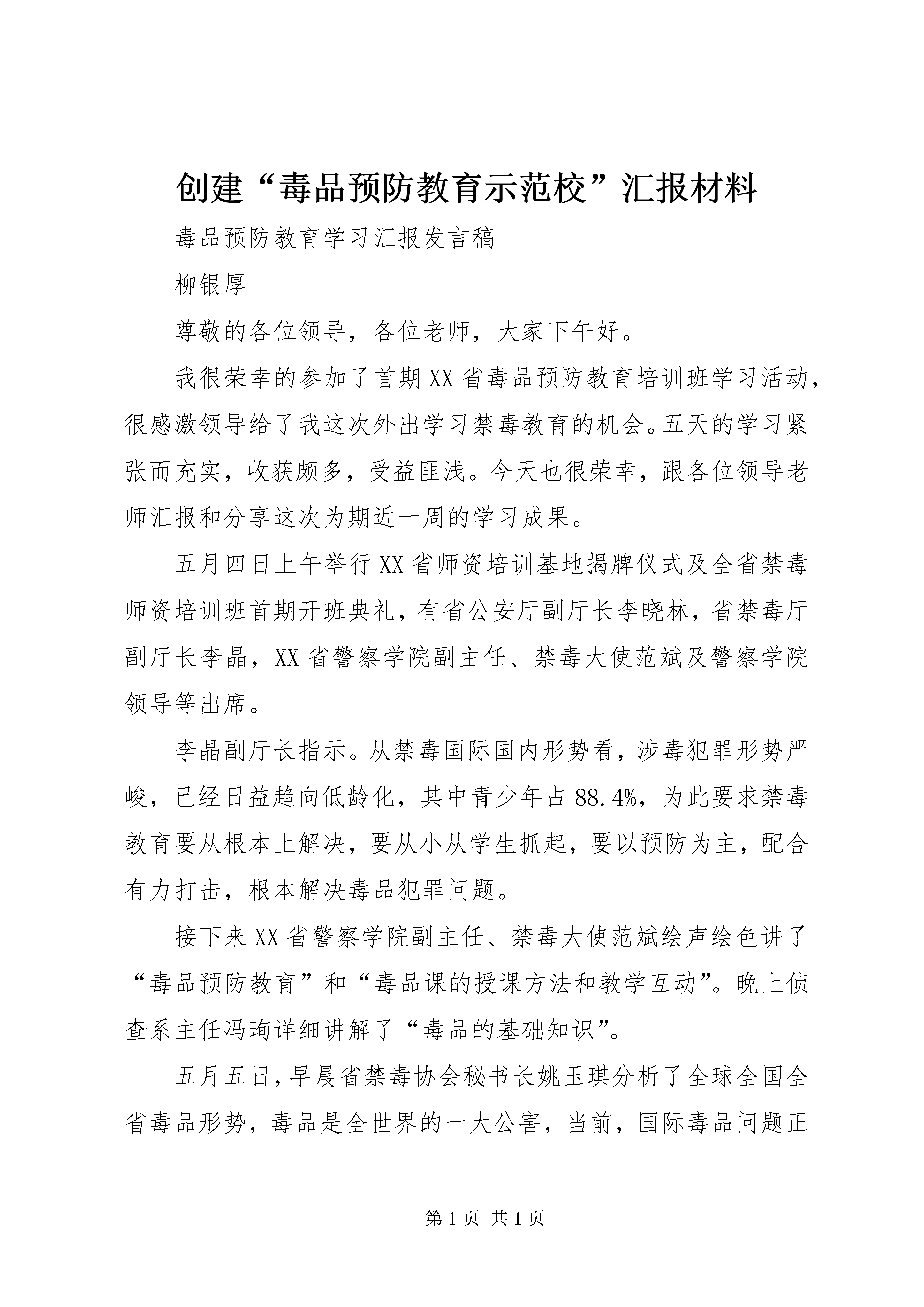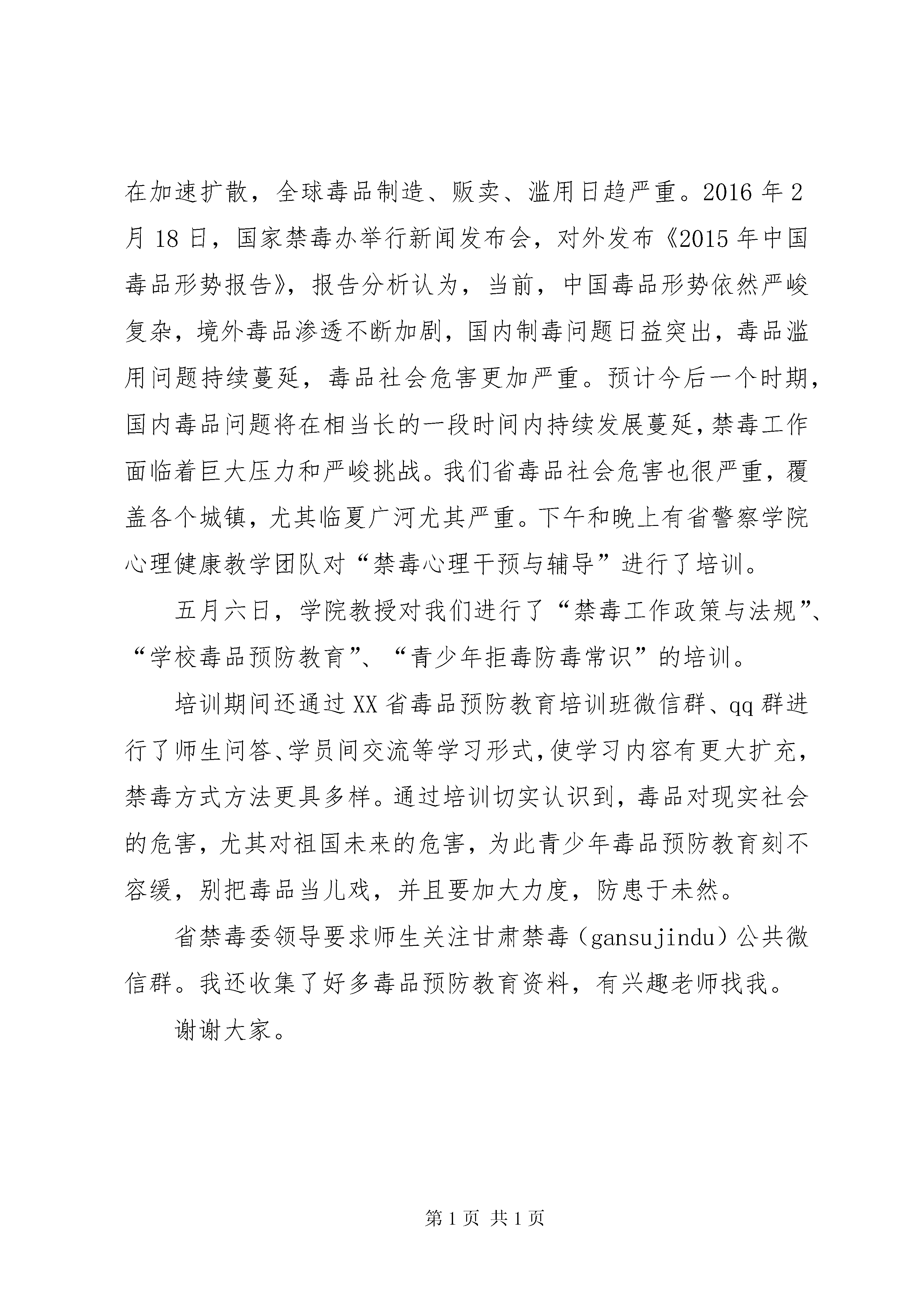 创建“毒品预防教育示范校”汇报材料毒品预防教育学习汇报发言稿柳银厚尊敬的各位领导,各位老师,大家下午好。我很荣幸的参加了首期XX省毒品预防教育培训班学习活动,很感激领导给了我这次外出学习禁毒教育的机会。五天的学习紧张而充实,收获颇多,受益匪浅。今天也很荣幸,跟各位领导老师汇报和分享这次为期近一周的学习成果。五月四日上午举行XX省师资培训基地揭牌仪式及全省禁毒师资培训班首期开班典礼,有省公安厅副厅长李晓林,省禁毒厅副厅长李晶,XX省警察学院副主任、禁毒大使范斌及警察学院领导等出席。李晶副厅长指示。从禁毒国际国内形势看,涉毒犯罪形势严峻,已经日益趋向低龄化,其中青少年占88.4%,为此要求禁毒教育要从根本上解决,要从小从学生抓起,要以预防为主,配合有力打击,根本解决毒品犯罪问题。接下来XX省警察学院副主任、禁毒大使范斌绘声绘色讲了“毒品预防教育”和“毒品课的授课方法和教学互动”。晚上侦查系主任冯珣详细讲解了“毒品的基础知识”。五月五日,早晨省禁毒协会秘书长姚玉琪分析了全球全国全省毒品形势,毒品是全世界的一大公害,当前,国际毒品问题正在加速扩散,全球毒品制造、贩卖、滥用日趋严重。2016年2月18日,国家禁毒办举行新闻发布会,对外发布《2015年中国毒品形势报告》,报告分析认为,当前,中国毒品形势依然严峻复杂,境外毒品渗透不断加剧,国内制毒问题日益突出,毒品滥用问题持续蔓延,毒品社会危害更加严重。预计今后一个时期,国内毒品问题将在相当长的一段时间内持续发展蔓延,禁毒工作面临着巨大压力和严峻挑战。我们省毒品社会危害也很严重,覆盖各个城镇,尤其临夏广河尤其严重。下午和晚上有省警察学院心理健康教学团队对“禁毒心理干预与辅导”进行了培训。五月六日,学院教授对我们进行了“禁毒工作政策与法规”、“学校毒品预防教育”、“青少年拒毒防毒常识”的培训。培训期间还通过XX省毒品预防教育培训班微信群、qq群进行了师生问答、学员间交流等学习形式,使学习内容有更大扩充,禁毒方式方法更具多样。通过培训切实认识到,毒品对现实社会的危害,尤其对祖国未来的危害,为此青少年毒品预防教育刻不容缓,别把毒品当儿戏,并且要加大力度,防患于未然。省禁毒委领导要求师生关注甘肃禁毒(gansujindu)公共微信群。我还收集了好多毒品预防教育资料,有兴趣老师找我。谢谢大家。