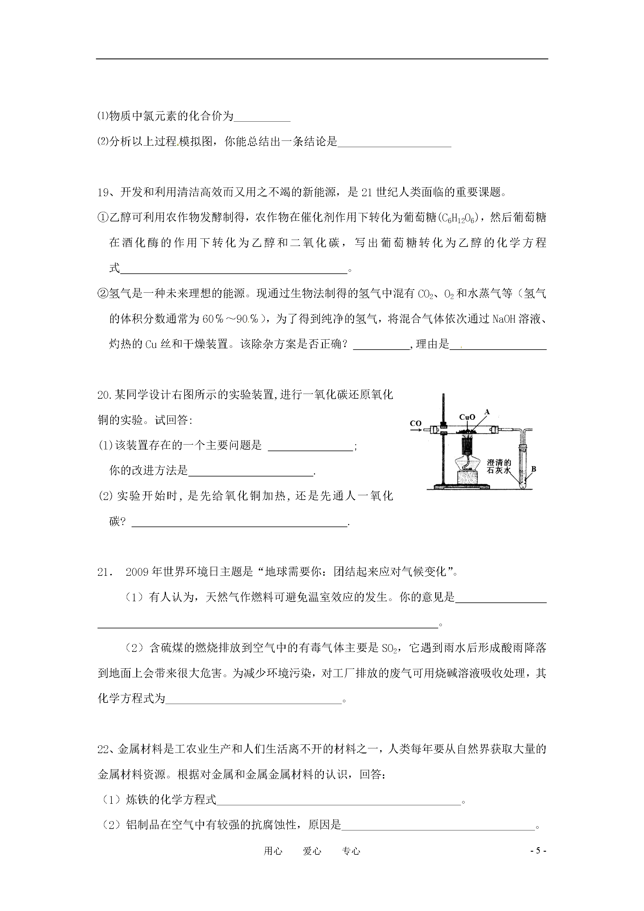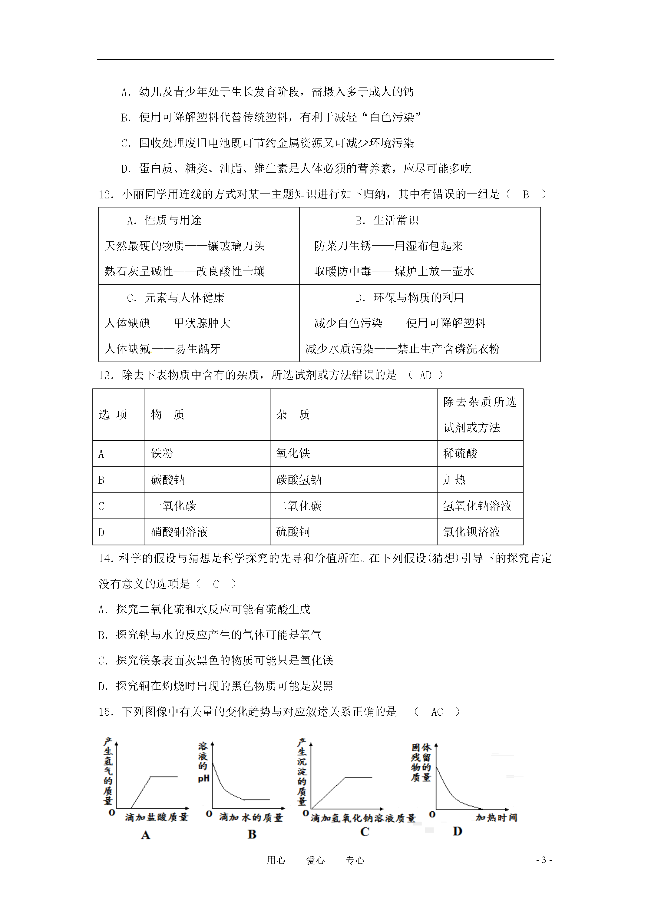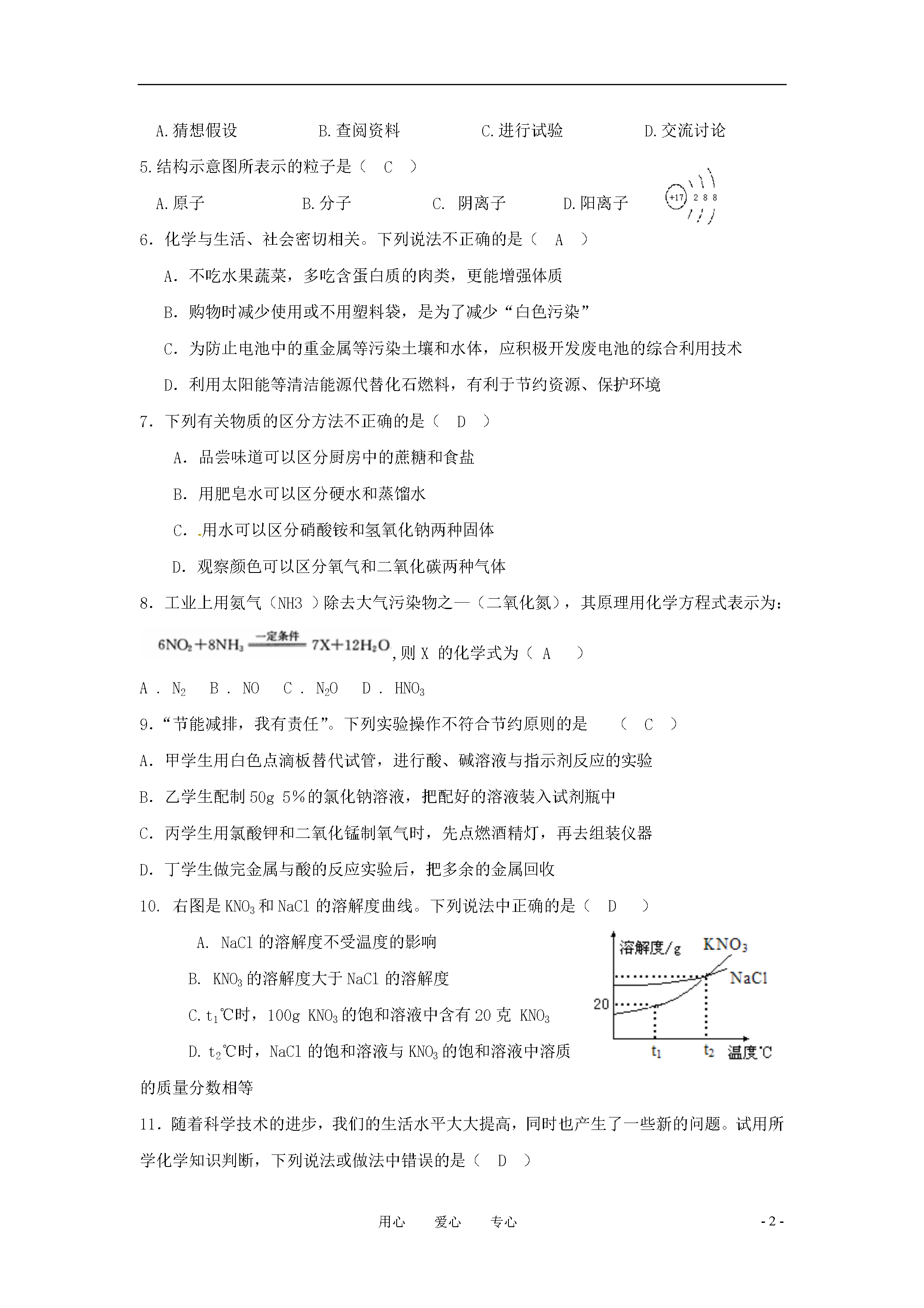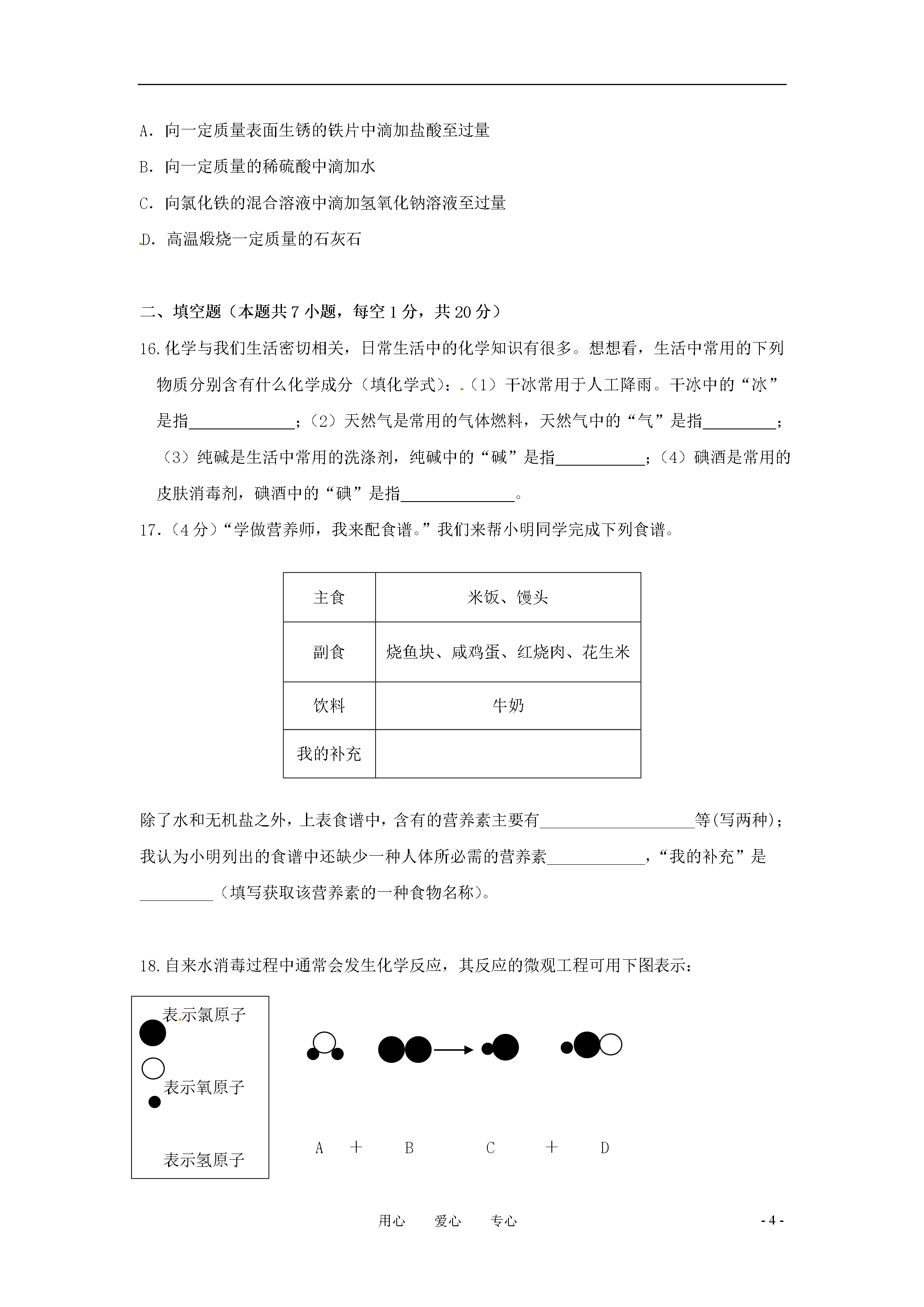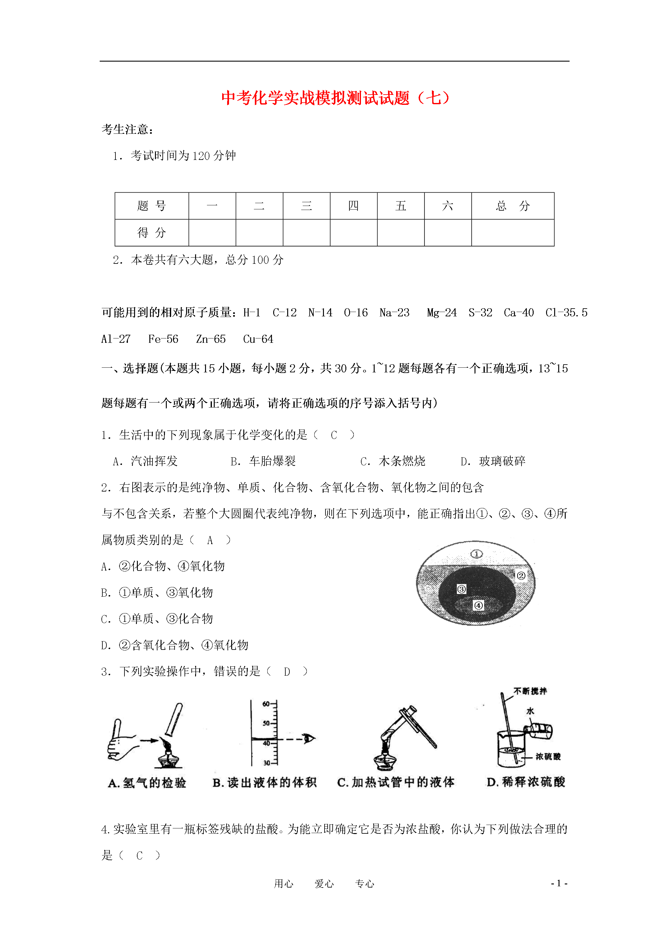 -13-用心爱心专心中考化学实战模拟测试试题(七)考生注意:1.考试时间为120分钟2.本卷共有六大题,总分100分题号一二三四五六总分得分可能用到的相对原子质量:H-1C-12N-14O-16Na-23Mg-24S-32Ca-40Cl-35.5Al-27Fe-56Zn-65Cu-64一、选择题(本题共15小题,每小题2分,共30分。1~12题每题各有一个正确选项,13~15题每题有一个或两个正确选项,请将正确选项的序号添入括号内)1.生活中的下列现象属于化学变化的是(C)A.汽油挥发B.车胎爆裂C.木条燃烧D.玻璃破碎2.右图表示的是纯净物、单质、化合物、含氧化合物、氧化物之间的包含与不包含关系,若整个大圆圈代表纯净物,则在下列选项中,能正确指出①、②、③、④所属物质类别的是(A)A.②化合物、④氧化物B.①单质、③氧化物C.①单质、③化合物D.②含氧化合物、④氧化物3.下列实验操作中,错误的是(D)4.实验室里有一瓶标签残缺的盐酸。为能立即确定它是否为浓盐酸,你认为下列做法合理的是(C)A.猜想假设B.查阅资料C.进行试验D.交流讨论5.结构示意图所表示的粒子是(C)A.原子B.分子C.阴离子D.阳离子6.化学与生活、社会密切相关。下列说法不正确的是(A)A.不吃水果蔬菜,多吃含蛋白质的肉类,更能增强体质B.购物时减少使用或不用塑料袋,是为了减少“白色污染”C.为防止电池中的重金属等污染土壤和水体,应积极开发废电池的综合利用技术D.利用太阳能等清洁能源代替化石燃料,有利于节约资源、保护环境7.下列有关物质的区分方法不正确的是(D)A.品尝味道可以区分厨房中的蔗糖和食盐B.用肥皂水可以区分硬水和蒸馏水C.用水可以区分硝酸铵和氢氧化钠两种固体D.观察颜色可以区分氧气和二氧化碳两种气体8.工业上用氨气(NH3)除去大气污染物之—(二氧化氮),其原理用化学方程式表示为:,则X的化学式为(A)A.N2B.NOC.N2OD.HNO39.“节能减排,我有责任”。下列实验操作不符合节约原则的是(C)A.甲学生用白色点滴板替代试管,进行酸、碱溶液与指示剂反应的实验B.乙学生配制50g5%的氯化钠溶液,把配好的溶液装入试剂瓶中C.丙学生用氯酸钾和二氧化锰制氧气时,先点燃酒精灯,再去组装仪器D.丁学生做完金属与酸的反应实验后,把多余的金属回收10.右图是KNO3和NaCl的溶解度曲线。下列说法中正确的是(D)A.NaCl的溶解度不受温度的影响B.KNO3的溶解度大于NaCl的溶解度C.t1℃时,100gKNO3的饱和溶液中含有20克KNO3D.t2℃时,NaCl的饱和溶液与KNO3的饱和溶液中溶质的质量分数相等11.随着科学技术的进步,我们的生活水平大大提高,同时也产生了一些新的问题。试用所学化学知识判断,下列说法或做法中错误的是(D)A.幼儿及青少年处于生长发育阶段,需摄入多于成人的钙B.使用可降解塑料代替传统塑料,有利于减轻“白色污染”C.回收处理废旧电池既可节约金属资源又可减少环境污染D.蛋白质、糖类、油脂、维生素是人体必须的营养素,应尽可能多吃12.小丽同学用连线的方式对某一主题知识进行如下归纳,其中有错误的一组是(B)A.性质与用途天然最硬的物质——镶玻璃刀头熟石灰呈碱性——改良酸性士壤B.生活常识防菜刀生锈——用湿布包起来取暖防中毒——煤炉上放一壶水C.元素与人体健康人体缺碘——甲状腺肿大人体缺氟——易生龋牙D.环保与物质的利用减少白色污染——使用可降解塑料减少水质污染——禁止生产含磷洗衣粉13.除去下表物质中含有的杂质,所选试剂或方法错误的是(AD)选项物质杂质除去杂质所选试剂或方法A铁粉氧化铁稀硫酸B碳酸钠碳酸氢钠加热C一氧化碳二氧化碳氢氧化钠溶液D硝酸铜溶液硫酸铜氯化钡溶液14.科学的假设与猜想是科学探究的先导和价值所在。在下列假设(猜想)引导下的探究肯定没有意义的选项是(C)A.探究二氧化硫和水反应可能有硫酸生成B.探究钠与水的反应产生的气体可能是氧气C.探究镁条表面灰黑色的物质可能只是氧化镁D.探究铜在灼烧时出现的黑色物质可能是炭黑15.下列图像中有关量的变化趋势与对应叙述关系正确的是(AC)A.向一定质量表面生锈的铁片中滴加盐酸至过量B.向一定质量的稀硫酸中滴加水C.向氯化铁的混合溶液中滴加氢氧化钠溶液至过量D.高温煅烧一定质量的石灰石二、填空题(本题共7小题,每空1分,共20分)16.化学与我们生活密切相关,日常生活中的化学知识有很多。想想看,生活中常用的下列物质分别含有什么化学成分(填化学式):(1)干冰常用于人工降雨。干冰中的“冰”是指;(2)天然气是常用的气体燃料,天然气中的“气”是指;(3)纯碱是生活中常用的洗涤剂,纯碱中的“碱”是指;(4)碘酒是常用的皮肤消毒剂,碘酒中的“碘”是指。17.(4分)“学做营养师