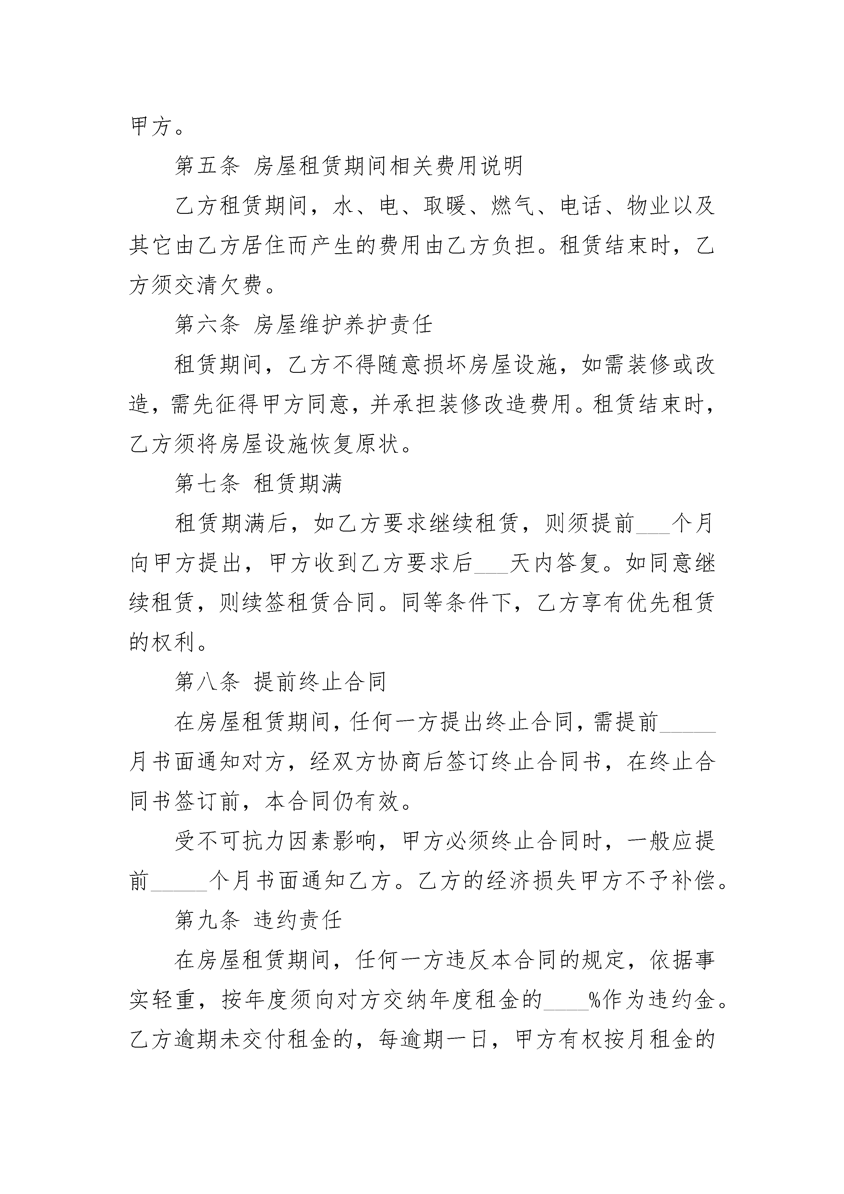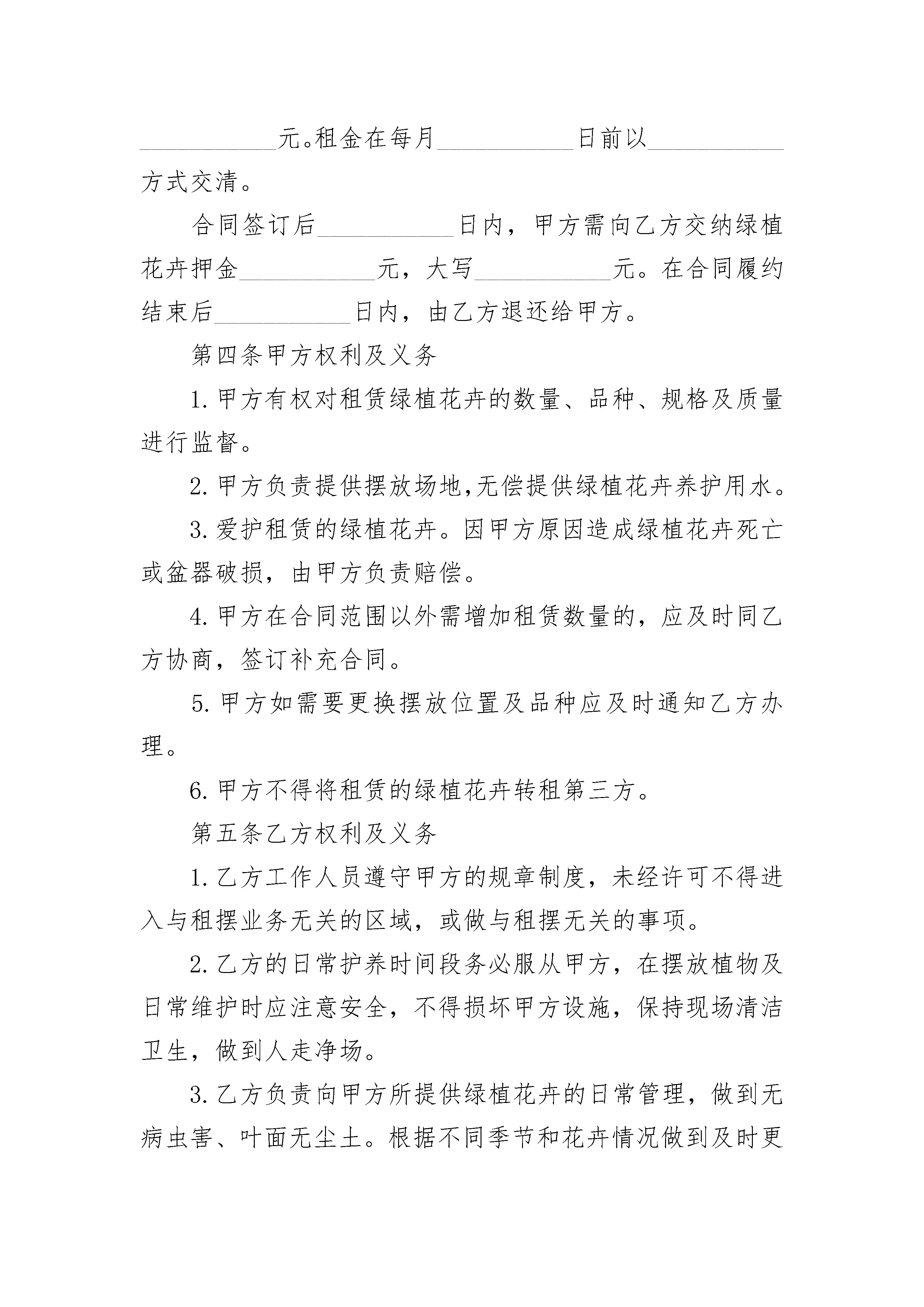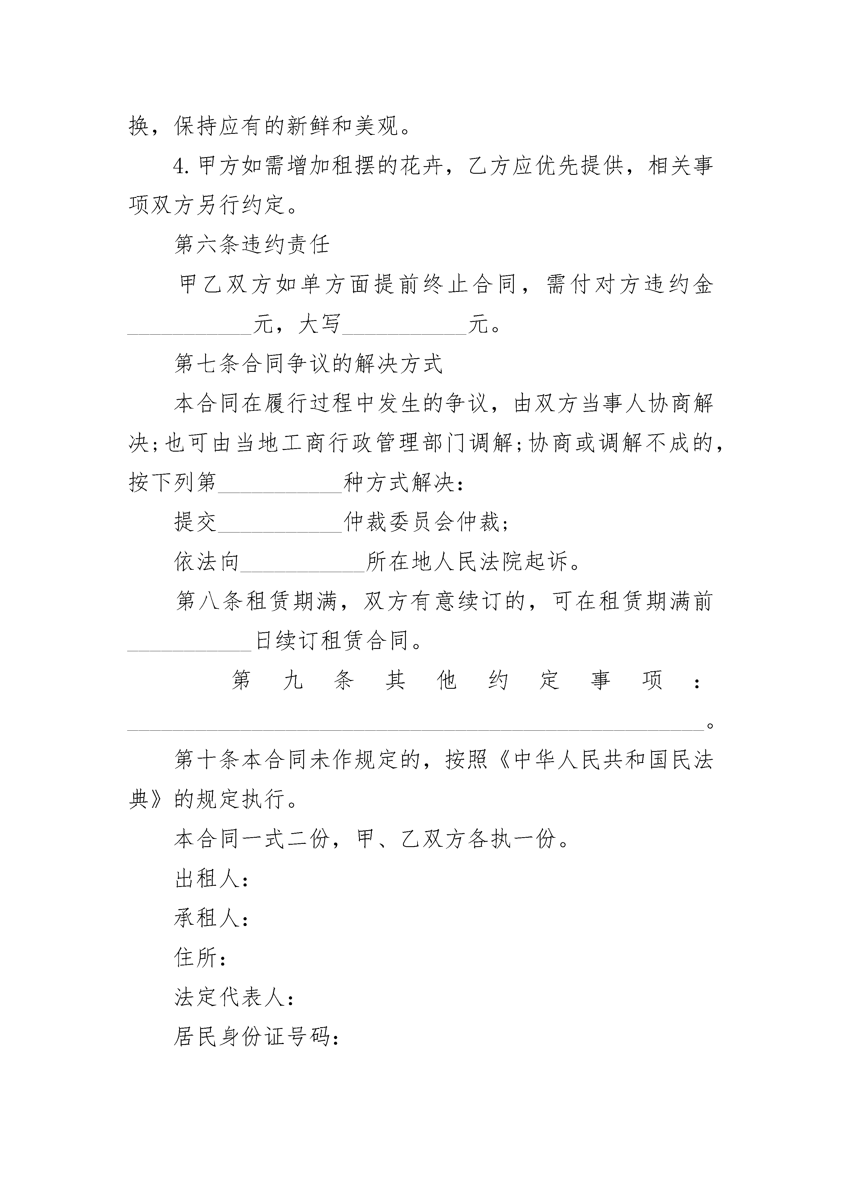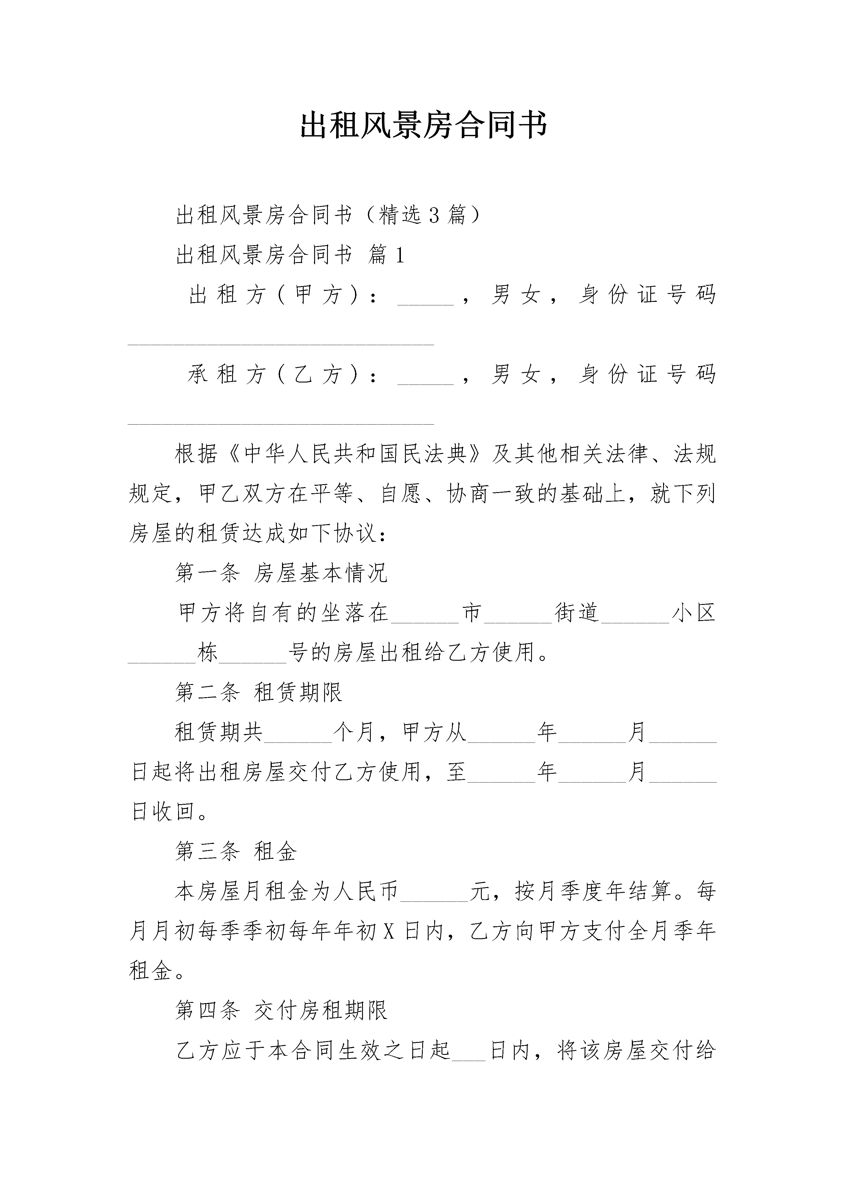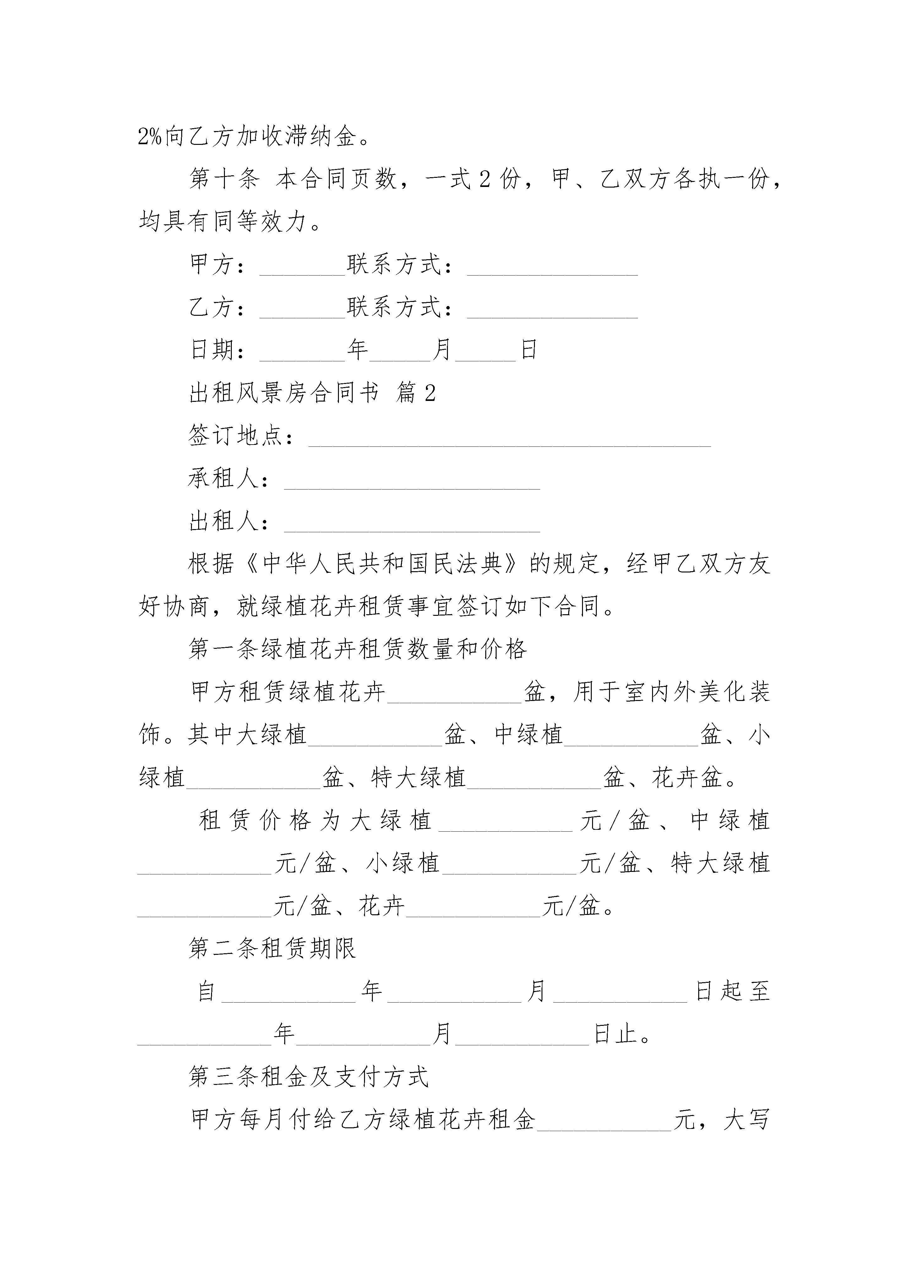 出租风景房合同书出租风景房合同书(精选3篇)出租风景房合同书篇1出租方(甲方):_____,男女,身份证号码___________________________承租方(乙方):_____,男女,身份证号码___________________________根据《中华人民共和国民法典》及其他相关法律、法规规定,甲乙双方在平等、自愿、协商一致的基础上,就下列房屋的租赁达成如下协议:第一条房屋基本情况甲方将自有的坐落在______市______街道______小区______栋______号的房屋出租给乙方使用。第二条租赁期限租赁期共______个月,甲方从______年______月______日起将出租房屋交付乙方使用,至______年______月______日收回。第三条租金本房屋月租金为人民币______元,按月季度年结算。每月月初每季季初每年年初X日内,乙方向甲方支付全月季年租金。第四条交付房租期限乙方应于本合同生效之日起___日内,将该房屋交付给甲方。第五条房屋租赁期间相关费用说明乙方租赁期间,水、电、取暖、燃气、电话、物业以及其它由乙方居住而产生的费用由乙方负担。租赁结束时,乙方须交清欠费。第六条房屋维护养护责任租赁期间,乙方不得随意损坏房屋设施,如需装修或改造,需先征得甲方同意,并承担装修改造费用。租赁结束时,乙方须将房屋设施恢复原状。第七条租赁期满租赁期满后,如乙方要求继续租赁,则须提前___个月向甲方提出,甲方收到乙方要求后___天内答复。如同意继续租赁,则续签租赁合同。同等条件下,乙方享有优先租赁的权利。第八条提前终止合同在房屋租赁期间,任何一方提出终止合同,需提前_____月书面通知对方,经双方协商后签订终止合同书,在终止合同书签订前,本合同仍有效。受不可抗力因素影响,甲方必须终止合同时,一般应提前_____个月书面通知乙方。乙方的经济损失甲方不予补偿。第九条违约责任在房屋租赁期间,任何一方违反本合同的规定,依据事实轻重,按年度须向对方交纳年度租金的____%作为违约金。乙方逾期未交付租金的,每逾期一日,甲方有权按月租金的2%向乙方加收滞纳金。第十条本合同页数,一式2份,甲、乙双方各执一份,均具有同等效力。甲方:_______联系方式:______________乙方:_______联系方式:______________日期:_______年_____月_____日出租风景房合同书篇2签订地点:_________________________________承租人:_____________________出租人:_____________________根据《中华人民共和国民法典》的规定,经甲乙双方友好协商,就绿植花卉租赁事宜签订如下合同。第一条绿植花卉租赁数量和价格甲方租赁绿植花卉___________盆,用于室内外美化装饰。其中大绿植___________盆、中绿植___________盆、小绿植___________盆、特大绿植___________盆、花卉盆。租赁价格为大绿植___________元/盆、中绿植___________元/盆、小绿植___________元/盆、特大绿植___________元/盆、花卉___________元/盆。第二条租赁期限自___________年___________月___________日起至___________年___________月___________日止。第三条租金及支付方式甲方每月付给乙方绿植花卉租金___________元,大写___________元。租金在每月___________日前以___________方式交清。合同签订后___________日内,甲方需向乙方交纳绿植花卉押金___________元,大写___________元。在合同履约结束后___________日内,由乙方退还给甲方。第四条甲方权利及义务1.甲方有权对租赁绿植花卉的数量、品种、规格及质量进行监督。2.甲方负责提供摆放场地,无偿提供绿植花卉养护用水。3.爱护租赁的绿植花卉。因甲方原因造成绿植花卉死亡或盆器破损,由甲方负责赔偿。4.甲方在合同范围以外需增加租赁数量的,应及时同乙方协商,签订补充合同。5.甲方如需要更换摆放位置及品种应及时通知乙方办理。6.甲方不得将租赁的绿植花卉转租第三方。第五条乙方权利及义务1.乙方工作人员遵守甲方的规章制度,未经许可不得进入与租摆业务无关的区域,或做与租摆无关的事项。2.乙方的日常护养时间段务必服从甲方,在摆放植物及日常维护时应注意安全,不得损坏甲方设施,保持现场清洁卫生,做到人走净场。3.乙方负责向甲方所提供绿植花卉的日常管理,做到无病虫害、叶面无尘土。根据不同季节和花卉情况做到及时更换,保持应有的新鲜和美观。