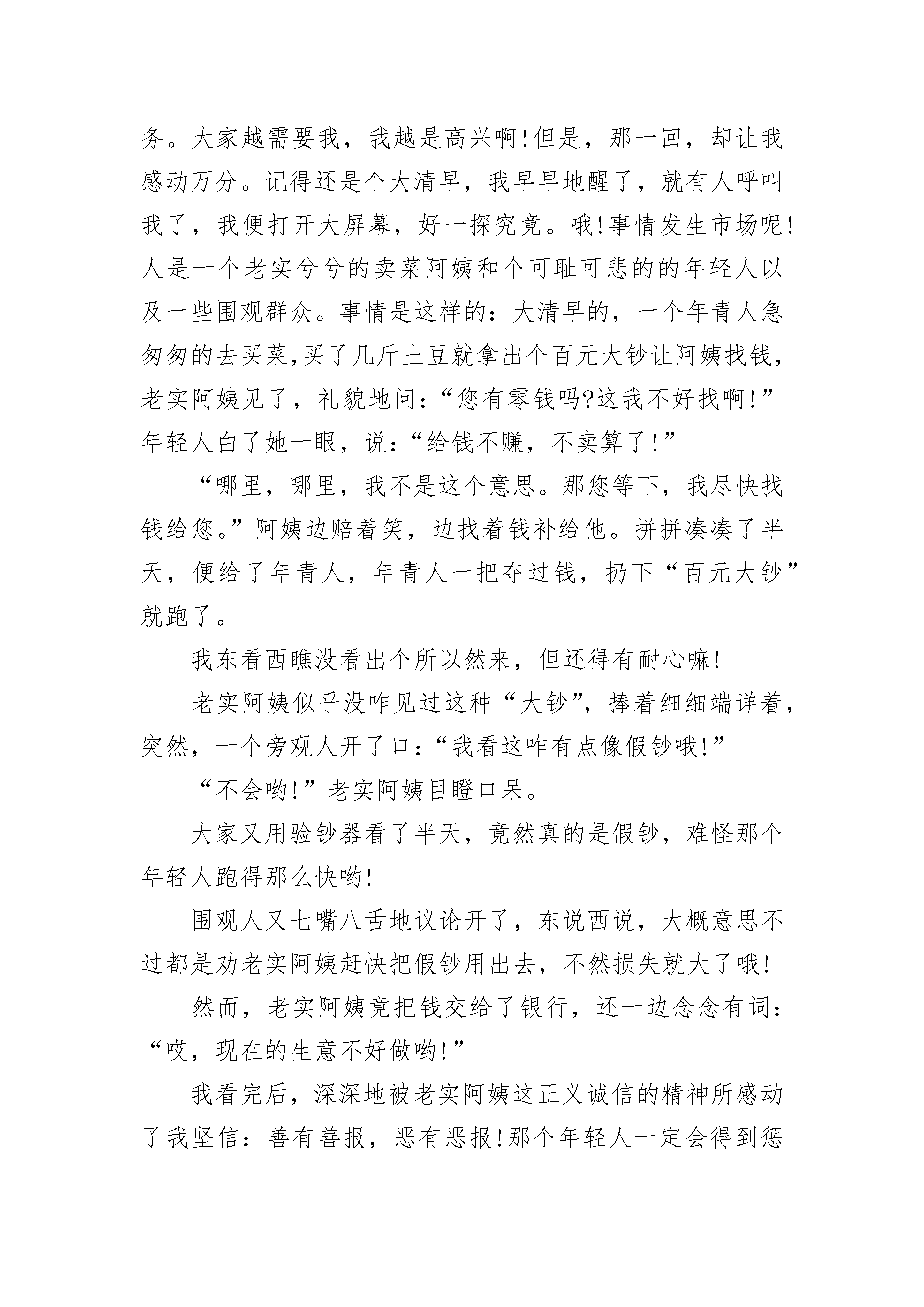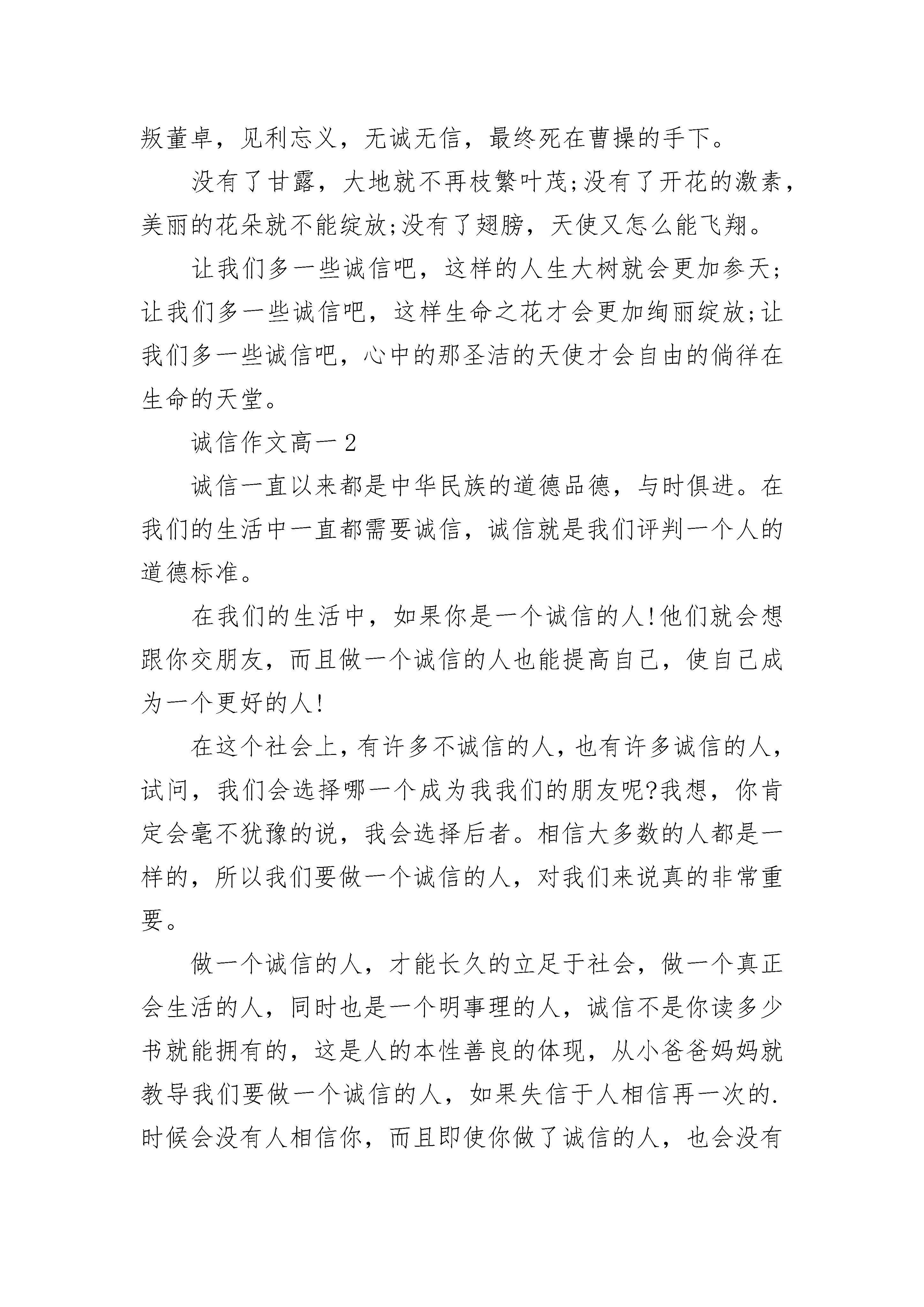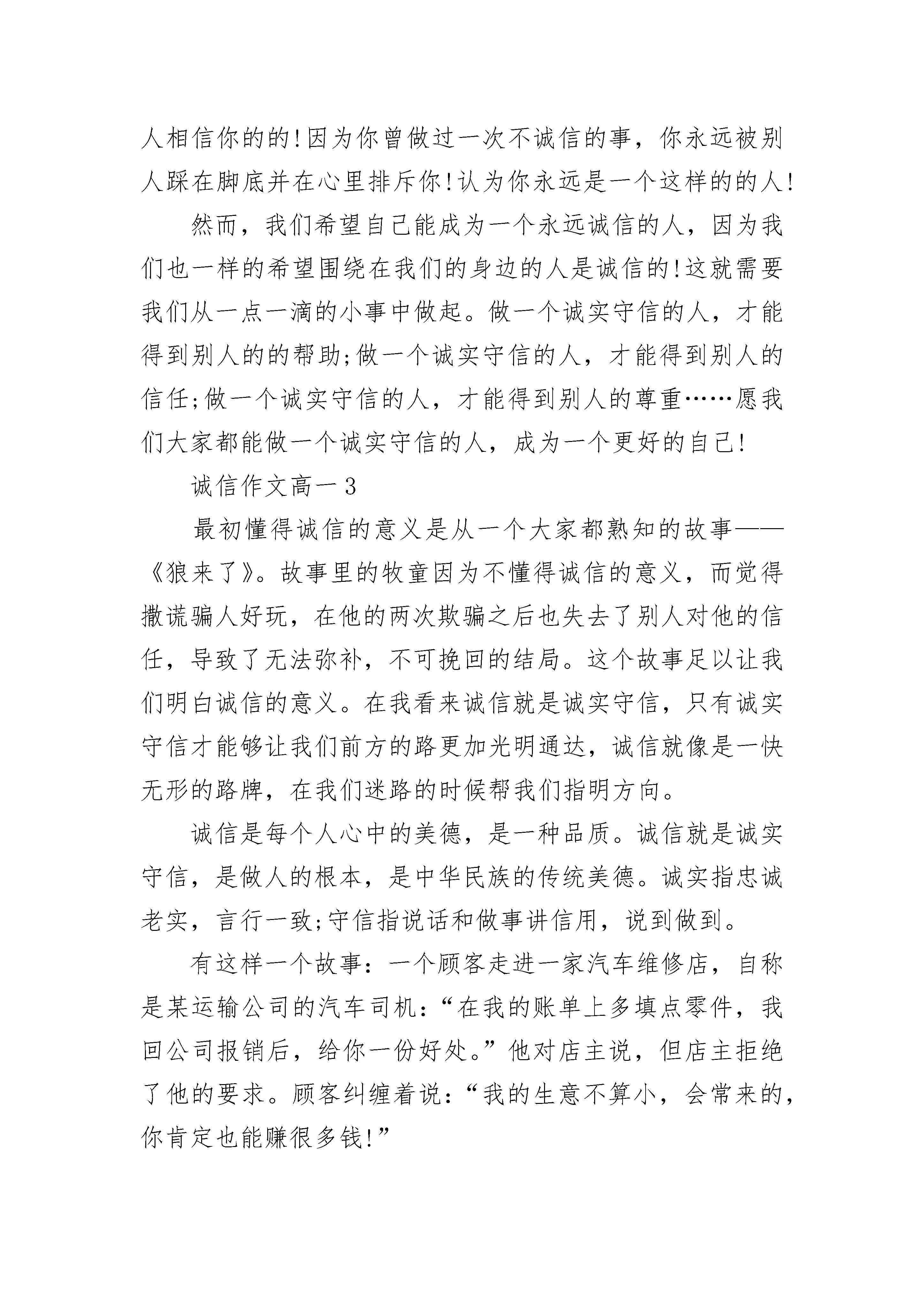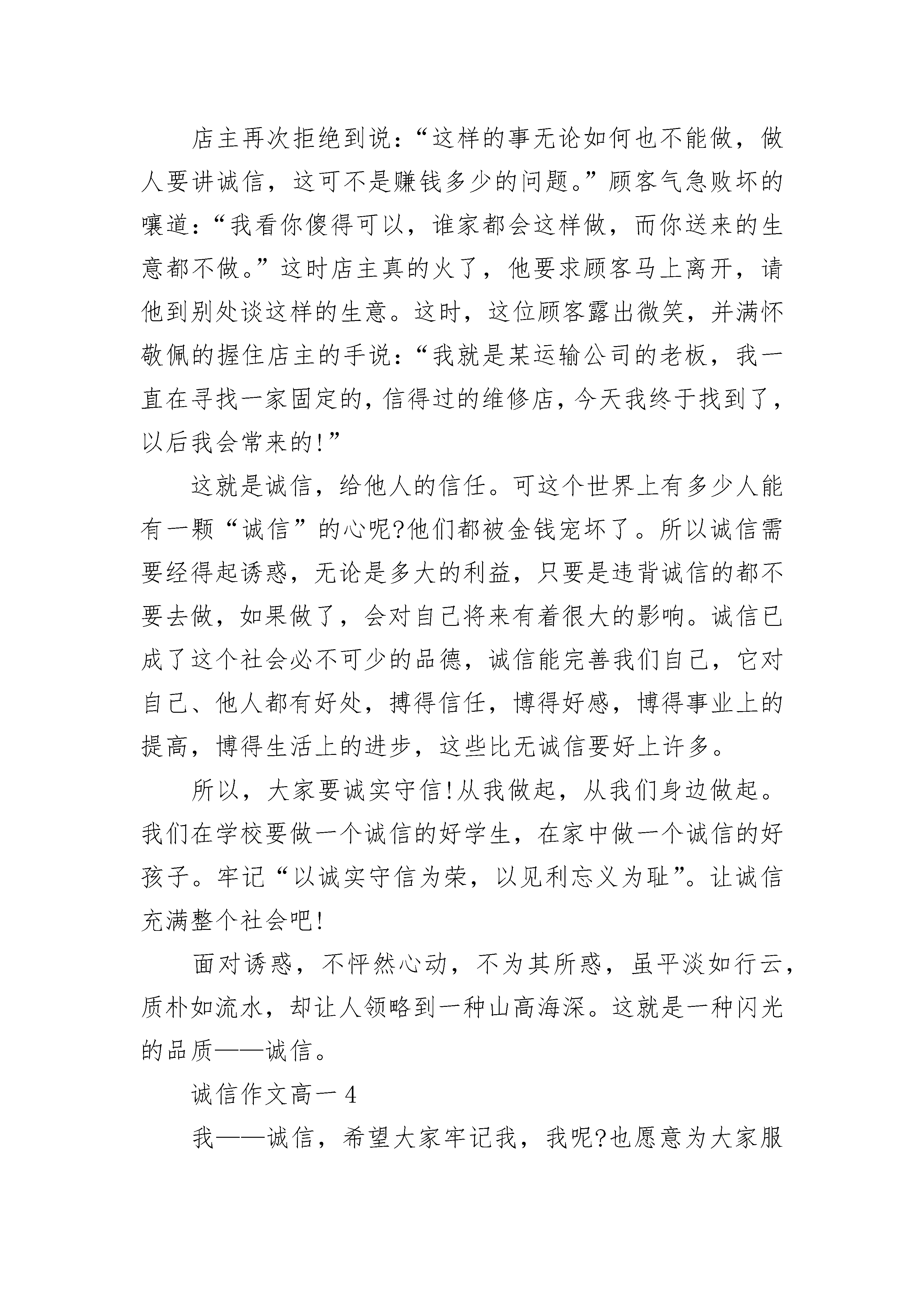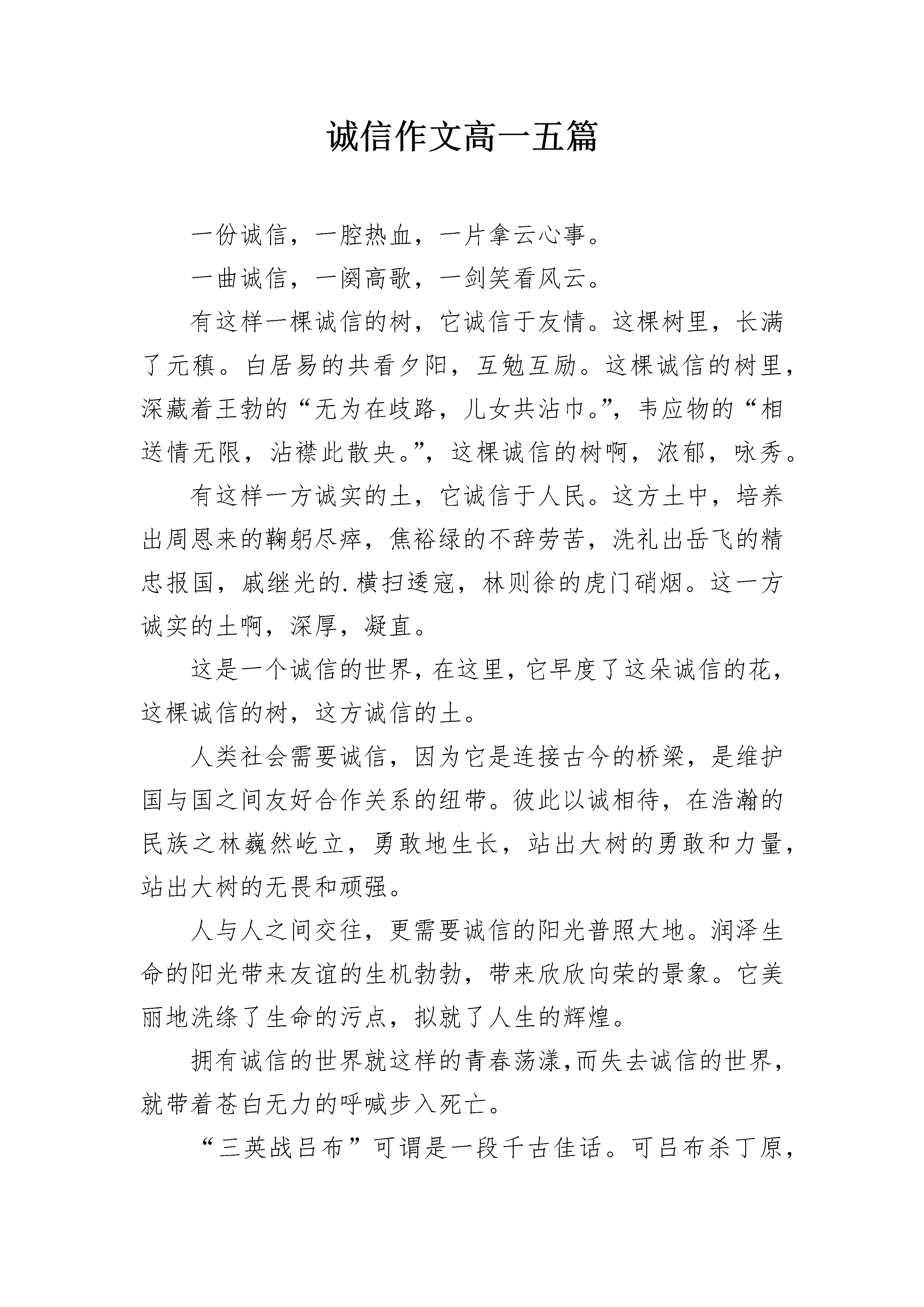 诚信作文高一五篇一份诚信,一腔热血,一片拿云心事。一曲诚信,一阕高歌,一剑笑看风云。有这样一棵诚信的树,它诚信于友情。这棵树里,长满了元稹。白居易的共看夕阳,互勉互励。这棵诚信的树里,深藏着王勃的“无为在歧路,儿女共沾巾。”,韦应物的“相送情无限,沾襟此散央。”,这棵诚信的树啊,浓郁,咏秀。有这样一方诚实的土,它诚信于人民。这方土中,培养出周恩来的鞠躬尽瘁,焦裕绿的不辞劳苦,洗礼出岳飞的精忠报国,戚继光的.横扫逶寇,林则徐的虎门硝烟。这一方诚实的土啊,深厚,凝直。这是一个诚信的世界,在这里,它早度了这朵诚信的花,这棵诚信的树,这方诚信的土。人类社会需要诚信,因为它是连接古今的桥梁,是维护国与国之间友好合作关系的纽带。彼此以诚相待,在浩瀚的民族之林巍然屹立,勇敢地生长,站出大树的勇敢和力量,站出大树的无畏和顽强。人与人之间交往,更需要诚信的阳光普照大地。润泽生命的阳光带来友谊的生机勃勃,带来欣欣向荣的景象。它美丽地洗绦了生命的污点,拟就了人生的辉煌。拥有诚信的世界就这样的青春荡漾,而失去诚信的世界,就带着苍白无力的呼喊步入死亡。“三英战吕布”可谓是一段千古佳话。可吕布杀丁原,叛董卓,见利忘义,无诚无信,最终死在曹操的手下。没有了甘露,大地就不再枝繁叶茂;没有了开花的激素,美丽的花朵就不能绽放;没有了翅膀,天使又怎么能飞翔。让我们多一些诚信吧,这样的人生大树就会更加参天;让我们多一些诚信吧,这样生命之花才会更加绚丽绽放;让我们多一些诚信吧,心中的那圣洁的天使才会自由的倘徉在生命的天堂。诚信作文高一2诚信一直以来都是中华民族的道德品德,与时俱进。在我们的生活中一直都需要诚信,诚信就是我们评判一个人的道德标准。在我们的生活中,如果你是一个诚信的人!他们就会想跟你交朋友,而且做一个诚信的人也能提高自己,使自己成为一个更好的人!在这个社会上,有许多不诚信的人,也有许多诚信的人,试问,我们会选择哪一个成为我我们的朋友呢?我想,你肯定会毫不犹豫的说,我会选择后者。相信大多数的人都是一样的,所以我们要做一个诚信的人,对我们来说真的非常重要。做一个诚信的人,才能长久的立足于社会,做一个真正会生活的人,同时也是一个明事理的人,诚信不是你读多少书就能拥有的,这是人的本性善良的体现,从小爸爸妈妈就教导我们要做一个诚信的人,如果失信于人相信再一次的.时候会没有人相信你,而且即使你做了诚信的人,也会没有人相信你的的!因为你曾做过一次不诚信的事,你永远被别人踩在脚底并在心里排斥你!认为你永远是一个这样的的人!然而,我们希望自己能成为一个永远诚信的人,因为我们也一样的希望围绕在我们的身边的人是诚信的!这就需要我们从一点一滴的小事中做起。做一个诚实守信的人,才能得到别人的的帮助;做一个诚实守信的人,才能得到别人的信任;做一个诚实守信的人,才能得到别人的尊重……愿我们大家都能做一个诚实守信的人,成为一个更好的自己!诚信作文高一3最初懂得诚信的意义是从一个大家都熟知的故事——《狼来了》。故事里的牧童因为不懂得诚信的意义,而觉得撒谎骗人好玩,在他的两次欺骗之后也失去了别人对他的信任,导致了无法弥补,不可挽回的结局。这个故事足以让我们明白诚信的意义。在我看来诚信就是诚实守信,只有诚实守信才能够让我们前方的路更加光明通达,诚信就像是一快无形的路牌,在我们迷路的时候帮我们指明方向。诚信是每个人心中的美德,是一种品质。诚信就是诚实守信,是做人的根本,是中华民族的传统美德。诚实指忠诚老实,言行一致;守信指说话和做事讲信用,说到做到。有这样一个故事:一个顾客走进一家汽车维修店,自称是某运输公司的汽车司机:“在我的账单上多填点零件,我回公司报销后,给你一份好处。”他对店主说,但店主拒绝了他的要求。顾客纠缠着说:“我的生意不算小,会常来的,你肯定也能赚很多钱!”店主再次拒绝到说:“这样的事无论如何也不能做,做人要讲诚信,这可不是赚钱多少的问题。”顾客气急败坏的嚷道:“我看你傻得可以,谁家都会这样做,而你送来的生意都不做。”这时店主真的火了,他要求顾客马上离开,请他到别处谈这样的生意。这时,这位顾客露出微笑,并满怀敬佩的握住店主的手说:“我就是某运输公司的老板,我一直在寻找一家固定的,信得过的维修店,今天我终于找到了,以后我会常来的!”这就是诚信,给他人的信任。可这个世界上有多少人能有一颗“诚信”的心呢?他们都被金钱宠坏了。所以诚信需要经得起诱惑,无论是多大的利益,只要是违背诚信的都不要去做,如果做了,会对自己将来有着很大的影响。诚信已成了这个社会必不可少的品德,诚信能完善我们自己,它对自己、他人都有好处,搏得信任,博得好感,博得事业上的提高,博得生活上的进步,这些比无诚信要好上许多。所以,大家要诚实守信!从我做起,从我们身边做起。我们在学校要做一个诚信的好学生,在家中做一个诚信的