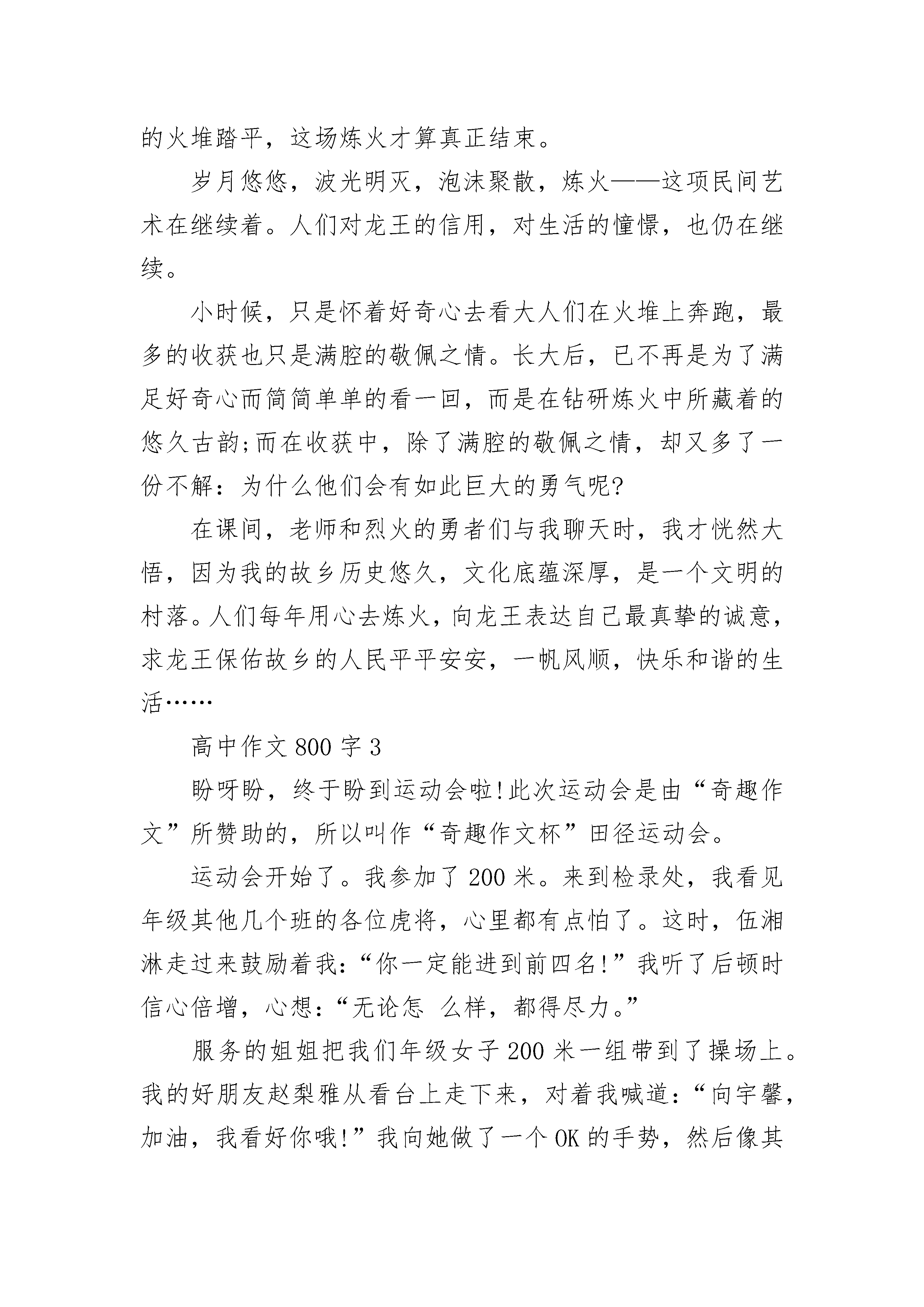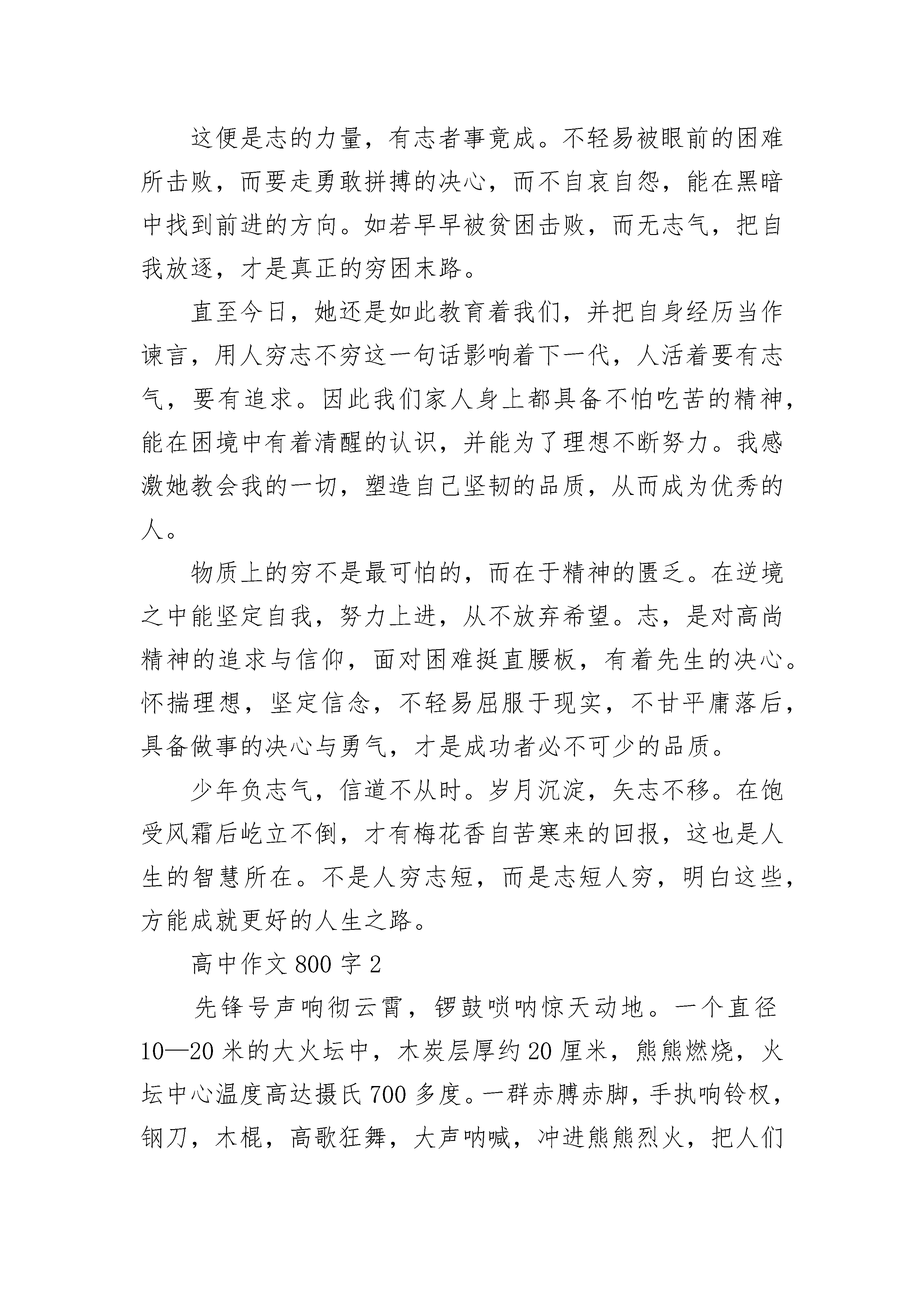 高中作文800字经典穷且意坚,不坠青云之志。命运赋予人生挫折,贫穷到富贵的差距,苦难坎坷或是幸福安逸,穷途末路要有勇敢拼搏的决心,境遇艰难意志越发坚定,不要做浮萍般随波逐流,而要走苍鹰博空的雄伟姿态。人穷志不穷的人,骨子里大都有一种倨傲的清高,那是面对困难时的一股韧劲,不轻易屈服于命运,在逆境之中也不会停止奋斗的脚步。而关于这我有着深切体会,这源自我的奶奶,她完美地掩饰了这一点,并实现了对自我的突破。人可以穷一时,却不能一生无志。这是她常挂在嘴边的一句话,也是她对自身经历的深深感慨。在前我奶奶是书香门第的大小姐,从小锦衣玉食,也接受了良好的教育,经历后作为知青下乡,那时也不过十六年纪。从养尊处优到艰苦卓绝,高强度的劳动,让执笔娇嫩的双手磨成了茧,原本柔弱的面容变成了刚毅。巨大的心理落差和物质贫乏的环境并不是把人压垮的关键,而是在于人的心志。面对艰巨是否怀有坚定的信念,去迎接曙光的到来。于是奶奶咬牙坚持,在饱含歧视中坚定自我,努力上进,越是困难越不能放弃。待到平反后她又抓住机遇当了幼师,在考核中发奋图强取得第一,转而毛遂自荐升格为小学教师,最后慢慢升级为校长。她得到了回报。在别人羡慕的眼光中,他说如果没有当初自己坚定的对信念与坚持,就不会取得今天的成就。这便是志的力量,有志者事竟成。不轻易被眼前的困难所击败,而要走勇敢拼搏的决心,而不自哀自怨,能在黑暗中找到前进的方向。如若早早被贫困击败,而无志气,把自我放逐,才是真正的穷困末路。直至今日,她还是如此教育着我们,并把自身经历当作谏言,用人穷志不穷这一句话影响着下一代,人活着要有志气,要有追求。因此我们家人身上都具备不怕吃苦的精神,能在困境中有着清醒的认识,并能为了理想不断努力。我感激她教会我的一切,塑造自己坚韧的品质,从而成为优秀的人。物质上的穷不是最可怕的,而在于精神的匮乏。在逆境之中能坚定自我,努力上进,从不放弃希望。志,是对高尚精神的追求与信仰,面对困难挺直腰板,有着先生的决心。怀揣理想,坚定信念,不轻易屈服于现实,不甘平庸落后,具备做事的决心与勇气,才是成功者必不可少的品质。少年负志气,信道不从时。岁月沉淀,矢志不移。在饱受风霜后屹立不倒,才有梅花香自苦寒来的回报,这也是人生的智慧所在。不是人穷志短,而是志短人穷,明白这些,方能成就更好的人生之路。高中作文800字2先锋号声响彻云霄,锣鼓唢呐惊天动地。一个直径10—20米的大火坛中,木炭层厚约20厘米,熊熊燃烧,火坛中心温度高达摄氏700多度。一群赤膊赤脚,手执响铃杈,钢刀,木棍,高歌狂舞,大声呐喊,冲进熊熊烈火,把人们依靠自身意志力和力量去与大自然拼搏而求生的情景表现得淋漓尽致。这是一个多么气势庞大,具有神秘色彩的民间艺术——炼火!炼火,历史悠久,是土生土长的原生态民间艺术,具有原始神秘感、独特稀有性、自发群体性和综合艺术性的特征,体现了中华民族百折不饶、自强不息、赴汤蹈火、勇往直前的人文精神。双峰炼火,自唐武宗年间始祖羊愔迁居双峰以后,就有了这个活动。传说,有人曾在九赤龙丘上空亲眼看见一条龙腾空而起,瞬间又回到了潭底……此后,这口座落在群山之中的潭水,就被誉为“九赤龙丘”,九赤庙也从此香火鼎盛,成了全村人民供奉龙王的神庙。在庄重的仪式过后,村民们将龙王神庙请下山,择好地点,将神像供奉,集百家炭火,举行炼火,为保平安。当夜幕渐渐降临,炼火场上便热闹起来了,村民们事先准备了长凳,在炼火场上一排排坐下。然而,参加炼火的村民也要在这时做最后的准备。等到一切都准备就绪,炼火才算真正的开始,整个火场也随之兴奋起来。在熙熙攘攘的人群中,参加炼火的村民排成一列,在锣鼓声中展开了这次的炼火。炼火的村民们一个接一个往火堆上冲,不时掀起一阵阵炭火的巨浪,铺天盖地地涌过,在一旁观看的观众无不叫好。炼火的村民依次从东、南、西、北四个方向涌向前去,火堆上映出村民们粗狂豪放的身影。直到炼火的村民们将圆锥形的火堆踏平,这场炼火才算真正结束。岁月悠悠,波光明灭,泡沫聚散,炼火——这项民间艺术在继续着。人们对龙王的信用,对生活的憧憬,也仍在继续。小时候,只是怀着好奇心去看大人们在火堆上奔跑,最多的收获也只是满腔的敬佩之情。长大后,已不再是为了满足好奇心而简简单单的看一回,而是在钻研炼火中所藏着的悠久古韵;而在收获中,除了满腔的敬佩之情,却又多了一份不解:为什么他们会有如此巨大的勇气呢?在课间,老师和烈火的勇者们与我聊天时,我才恍然大悟,因为我的故乡历史悠久,文化底蕴深厚,是一个文明的村落。人们每年用心去炼火,向龙王表达自己最真挚的诚意,求龙王保佑故乡的人民平平安安,一帆风顺,快乐和谐的生活……高中作文800字3盼呀盼,终于盼到运动会啦!此次运动会是由“奇趣作文”所赞助的,所以叫作“奇趣作文杯”田径运动会。运动会开始了。我参加了200米。来到检录处,我
