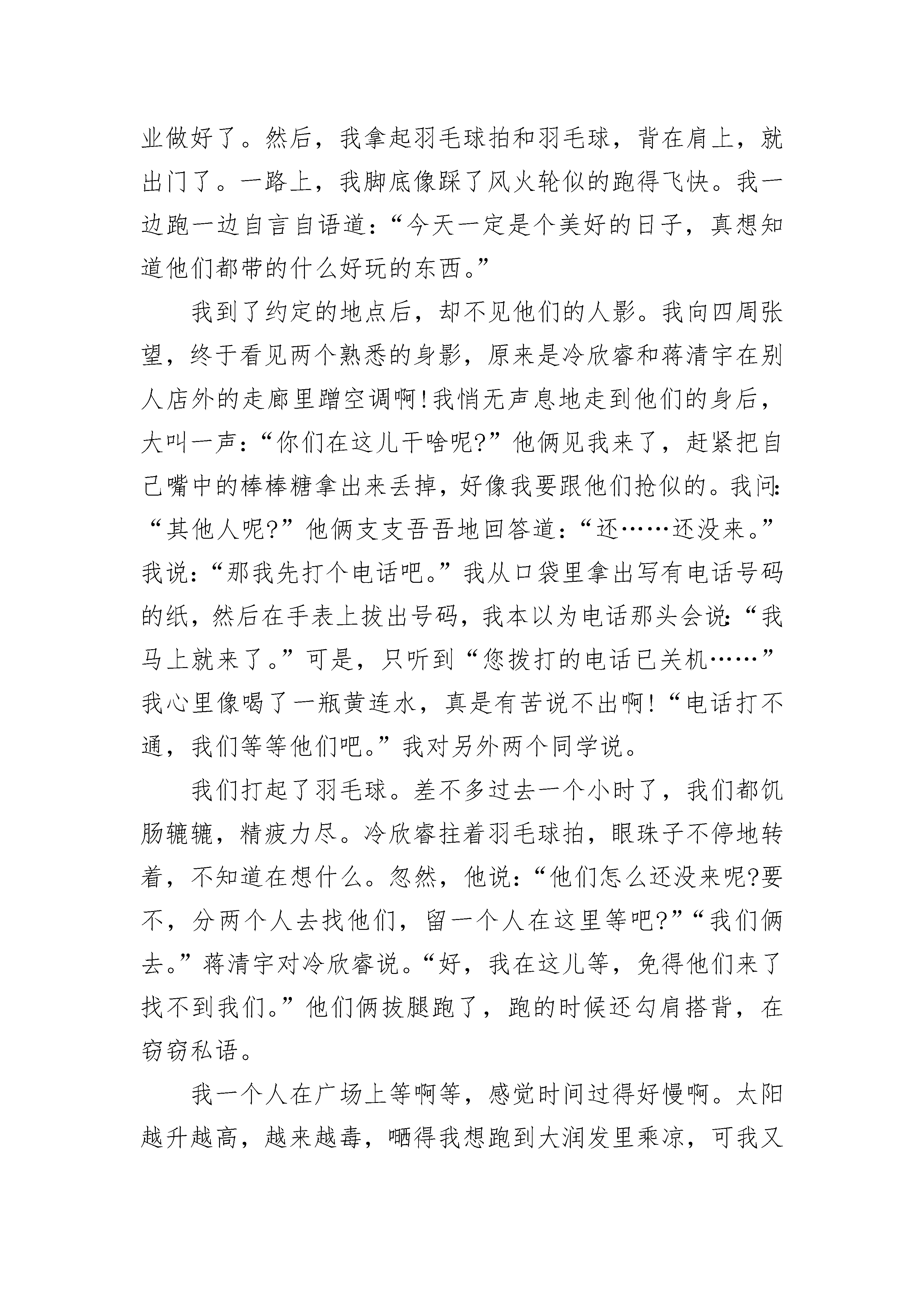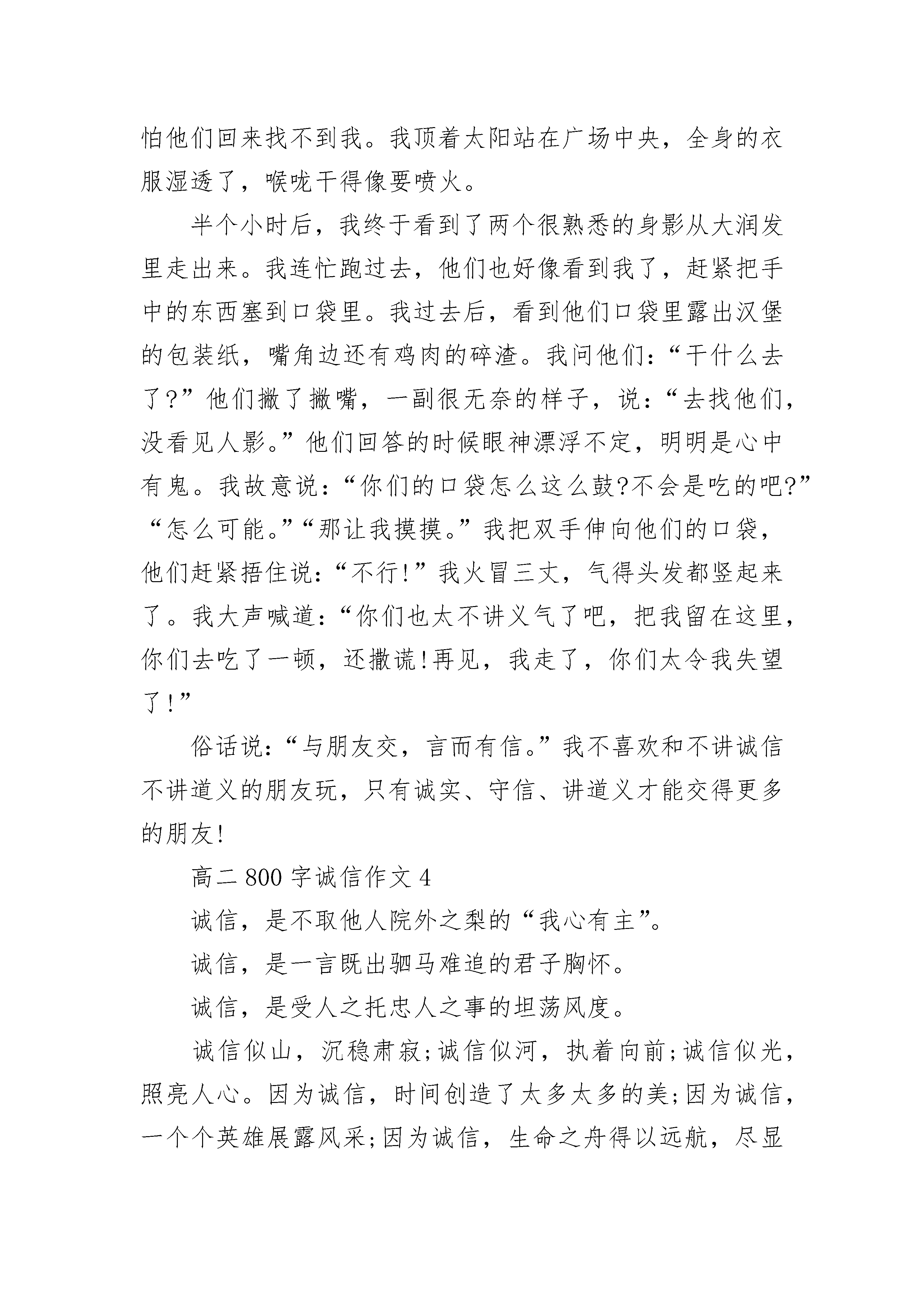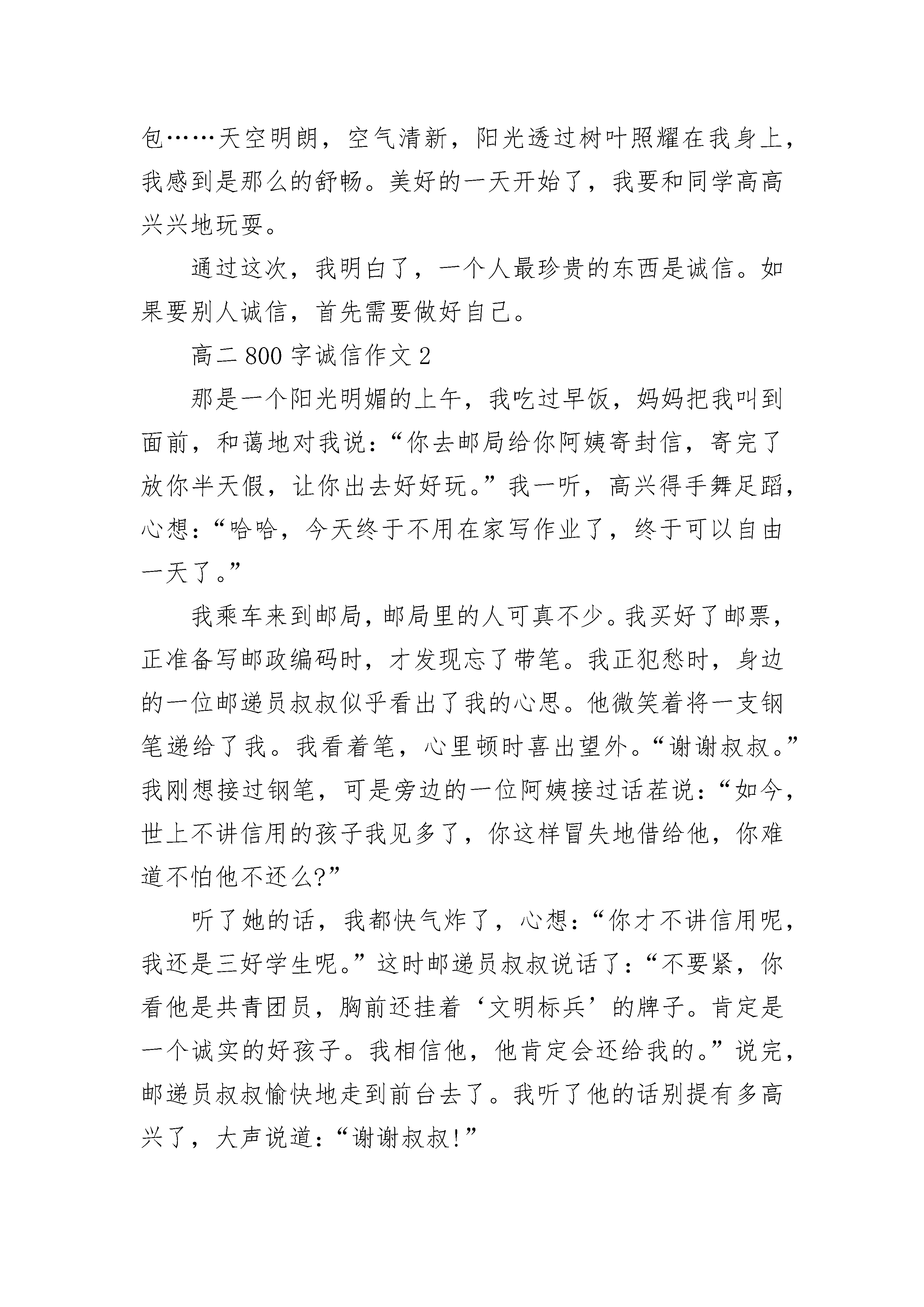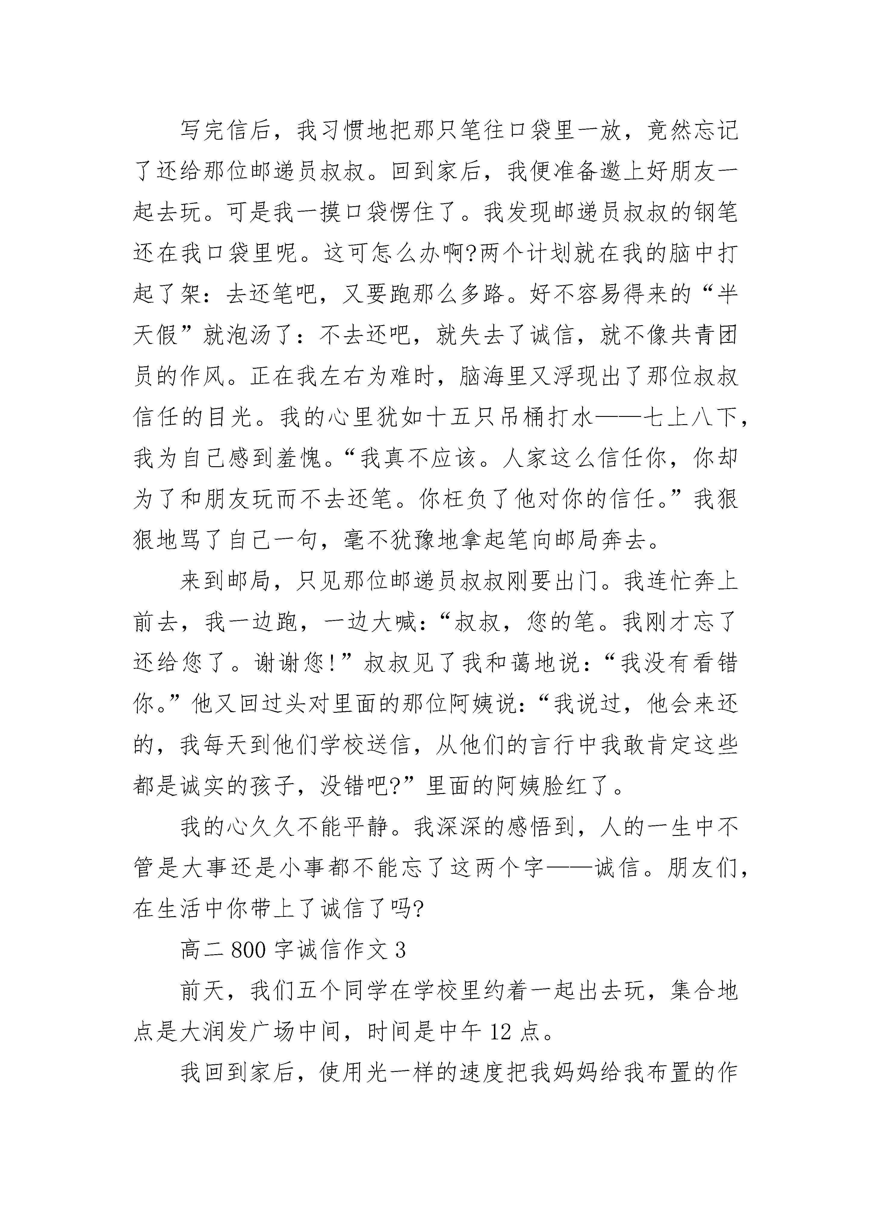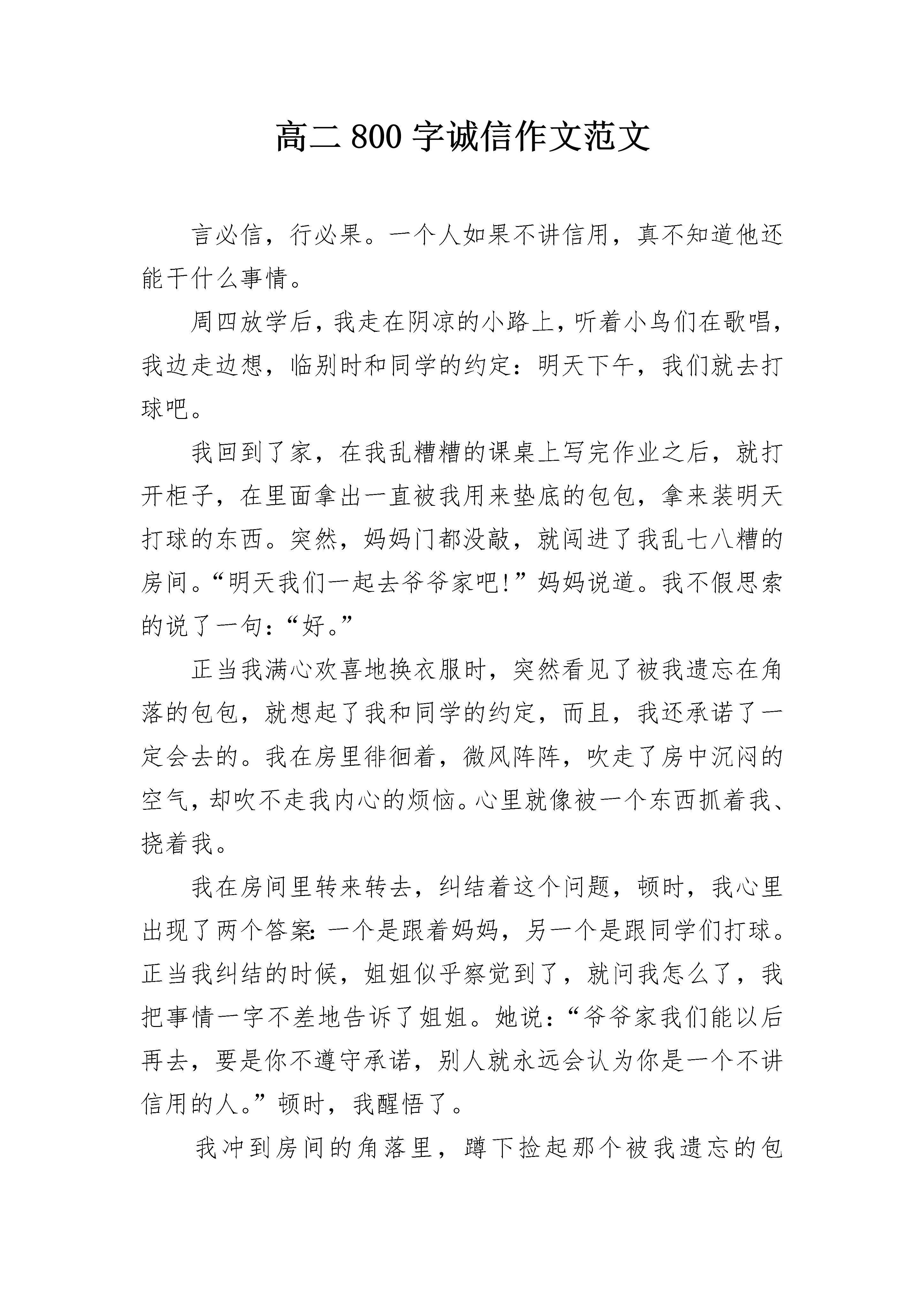 高二800字诚信作文范文言必信,行必果。一个人如果不讲信用,真不知道他还能干什么事情。周四放学后,我走在阴凉的小路上,听着小鸟们在歌唱,我边走边想,临别时和同学的约定:明天下午,我们就去打球吧。我回到了家,在我乱糟糟的课桌上写完作业之后,就打开柜子,在里面拿出一直被我用来垫底的包包,拿来装明天打球的东西。突然,妈妈门都没敲,就闯进了我乱七八糟的房间。“明天我们一起去爷爷家吧!”妈妈说道。我不假思索的说了一句:“好。”正当我满心欢喜地换衣服时,突然看见了被我遗忘在角落的包包,就想起了我和同学的约定,而且,我还承诺了一定会去的。我在房里徘徊着,微风阵阵,吹走了房中沉闷的空气,却吹不走我内心的烦恼。心里就像被一个东西抓着我、挠着我。我在房间里转来转去,纠结着这个问题,顿时,我心里出现了两个答案:一个是跟着妈妈,另一个是跟同学们打球。正当我纠结的时候,姐姐似乎察觉到了,就问我怎么了,我把事情一字不差地告诉了姐姐。她说:“爷爷家我们能以后再去,要是你不遵守承诺,别人就永远会认为你是一个不讲信用的人。”顿时,我醒悟了。我冲到房间的角落里,蹲下捡起那个被我遗忘的包包……天空明朗,空气清新,阳光透过树叶照耀在我身上,我感到是那么的舒畅。美好的一天开始了,我要和同学高高兴兴地玩耍。通过这次,我明白了,一个人最珍贵的东西是诚信。如果要别人诚信,首先需要做好自己。高二800字诚信作文2那是一个阳光明媚的上午,我吃过早饭,妈妈把我叫到面前,和蔼地对我说:“你去邮局给你阿姨寄封信,寄完了放你半天假,让你出去好好玩。”我一听,高兴得手舞足蹈,心想:“哈哈,今天终于不用在家写作业了,终于可以自由一天了。”我乘车来到邮局,邮局里的人可真不少。我买好了邮票,正准备写邮政编码时,才发现忘了带笔。我正犯愁时,身边的一位邮递员叔叔似乎看出了我的心思。他微笑着将一支钢笔递给了我。我看着笔,心里顿时喜出望外。“谢谢叔叔。”我刚想接过钢笔,可是旁边的一位阿姨接过话茬说:“如今,世上不讲信用的孩子我见多了,你这样冒失地借给他,你难道不怕他不还么?”听了她的话,我都快气炸了,心想:“你才不讲信用呢,我还是三好学生呢。”这时邮递员叔叔说话了:“不要紧,你看他是共青团员,胸前还挂着‘文明标兵’的牌子。肯定是一个诚实的好孩子。我相信他,他肯定会还给我的。”说完,邮递员叔叔愉快地走到前台去了。我听了他的话别提有多高兴了,大声说道:“谢谢叔叔!”写完信后,我习惯地把那只笔往口袋里一放,竟然忘记了还给那位邮递员叔叔。回到家后,我便准备邀上好朋友一起去玩。可是我一摸口袋愣住了。我发现邮递员叔叔的钢笔还在我口袋里呢。这可怎么办啊?两个计划就在我的脑中打起了架:去还笔吧,又要跑那么多路。好不容易得来的“半天假”就泡汤了:不去还吧,就失去了诚信,就不像共青团员的作风。正在我左右为难时,脑海里又浮现出了那位叔叔信任的目光。我的心里犹如十五只吊桶打水——七上八下,我为自己感到羞愧。“我真不应该。人家这么信任你,你却为了和朋友玩而不去还笔。你枉负了他对你的信任。”我狠狠地骂了自己一句,毫不犹豫地拿起笔向邮局奔去。来到邮局,只见那位邮递员叔叔刚要出门。我连忙奔上前去,我一边跑,一边大喊:“叔叔,您的笔。我刚才忘了还给您了。谢谢您!”叔叔见了我和蔼地说:“我没有看错你。”他又回过头对里面的那位阿姨说:“我说过,他会来还的,我每天到他们学校送信,从他们的言行中我敢肯定这些都是诚实的孩子,没错吧?”里面的阿姨脸红了。我的心久久不能平静。我深深的感悟到,人的一生中不管是大事还是小事都不能忘了这两个字——诚信。朋友们,在生活中你带上了诚信了吗?高二800字诚信作文3前天,我们五个同学在学校里约着一起出去玩,集合地点是大润发广场中间,时间是中午12点。我回到家后,使用光一样的速度把我妈妈给我布置的作业做好了。然后,我拿起羽毛球拍和羽毛球,背在肩上,就出门了。一路上,我脚底像踩了风火轮似的跑得飞快。我一边跑一边自言自语道:“今天一定是个美好的日子,真想知道他们都带的什么好玩的东西。”我到了约定的地点后,却不见他们的人影。我向四周张望,终于看见两个熟悉的身影,原来是冷欣睿和蒋清宇在别人店外的走廊里蹭空调啊!我悄无声息地走到他们的身后,大叫一声:“你们在这儿干啥呢?”他俩见我来了,赶紧把自己嘴中的棒棒糖拿出来丢掉,好像我要跟他们抢似的。我问:“其他人呢?”他俩支支吾吾地回答道:“还……还没来。”我说:“那我先打个电话吧。”我从口袋里拿出写有电话号码的纸,然后在手表上拔出号码,我本以为电话那头会说:“我马上就来了。”可是,只听到“您拨打的电话已关机……”我心里像喝了一瓶黄连水,真是有苦说不出啊!“电话打不通,我们等等他们吧。”我对另外两个同学说。我们打起了羽毛球。差不多过去一个小时了,我们都饥肠辘辘,精疲力尽。冷欣睿拄