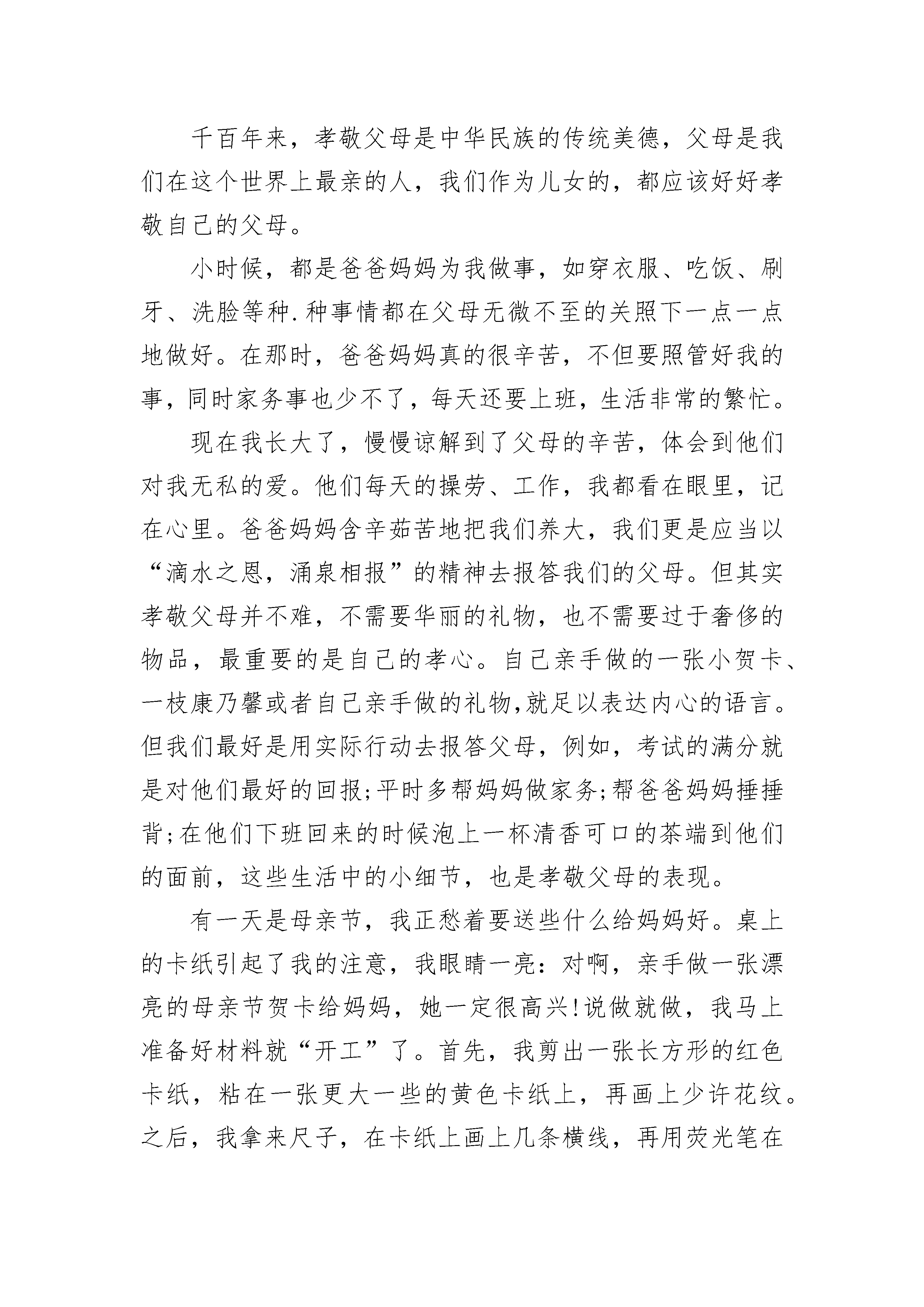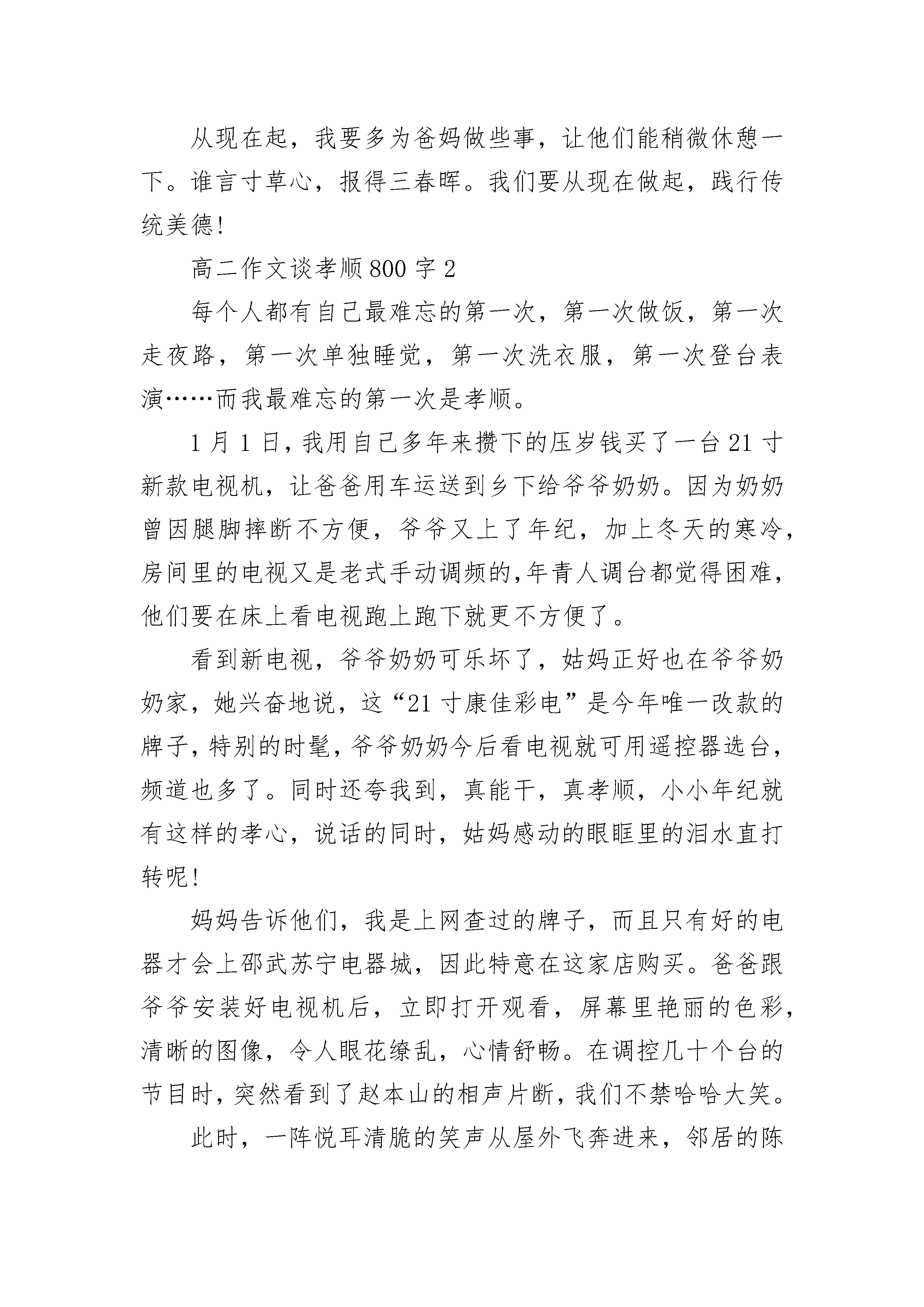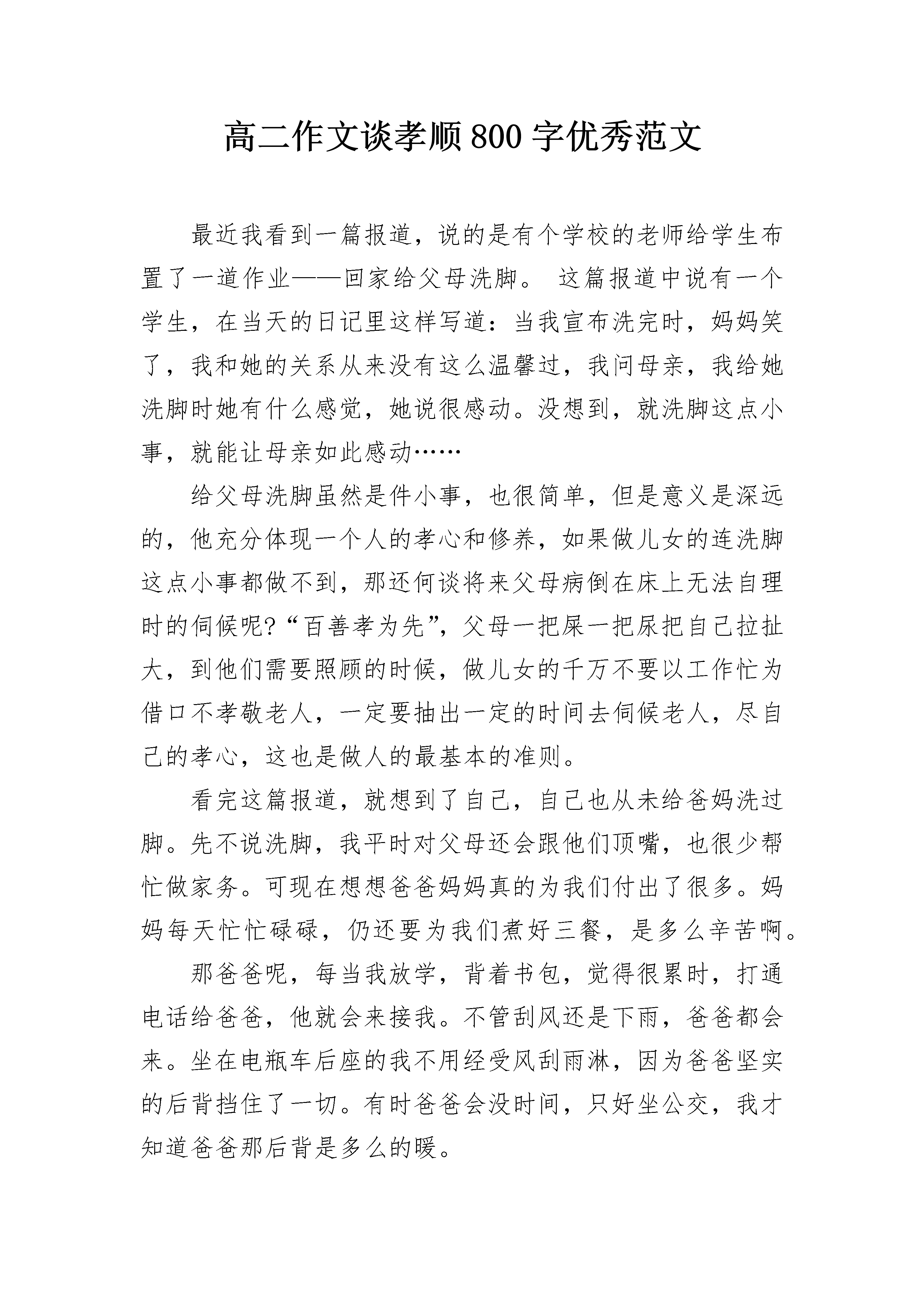 高二作文谈孝顺800字优秀范文最近我看到一篇报道,说的是有个学校的老师给学生布置了一道作业——回家给父母洗脚。这篇报道中说有一个学生,在当天的日记里这样写道:当我宣布洗完时,妈妈笑了,我和她的关系从来没有这么温馨过,我问母亲,我给她洗脚时她有什么感觉,她说很感动。没想到,就洗脚这点小事,就能让母亲如此感动……给父母洗脚虽然是件小事,也很简单,但是意义是深远的,他充分体现一个人的孝心和修养,如果做儿女的连洗脚这点小事都做不到,那还何谈将来父母病倒在床上无法自理时的伺候呢?“百善孝为先”,父母一把屎一把尿把自己拉扯大,到他们需要照顾的时候,做儿女的千万不要以工作忙为借口不孝敬老人,一定要抽出一定的时间去伺候老人,尽自己的孝心,这也是做人的最基本的准则。看完这篇报道,就想到了自己,自己也从未给爸妈洗过脚。先不说洗脚,我平时对父母还会跟他们顶嘴,也很少帮忙做家务。可现在想想爸爸妈妈真的为我们付出了很多。妈妈每天忙忙碌碌,仍还要为我们煮好三餐,是多么辛苦啊。那爸爸呢,每当我放学,背着书包,觉得很累时,打通电话给爸爸,他就会来接我。不管刮风还是下雨,爸爸都会来。坐在电瓶车后座的我不用经受风刮雨淋,因为爸爸坚实的后背挡住了一切。有时爸爸会没时间,只好坐公交,我才知道爸爸那后背是多么的暖。从现在起,我要多为爸妈做些事,让他们能稍微休憩一下。谁言寸草心,报得三春晖。我们要从现在做起,践行传统美德!高二作文谈孝顺800字2每个人都有自己最难忘的第一次,第一次做饭,第一次走夜路,第一次单独睡觉,第一次洗衣服,第一次登台表演……而我最难忘的第一次是孝顺。1月1日,我用自己多年来攒下的压岁钱买了一台21寸新款电视机,让爸爸用车运送到乡下给爷爷奶奶。因为奶奶曾因腿脚摔断不方便,爷爷又上了年纪,加上冬天的寒冷,房间里的电视又是老式手动调频的,年青人调台都觉得困难,他们要在床上看电视跑上跑下就更不方便了。看到新电视,爷爷奶奶可乐坏了,姑妈正好也在爷爷奶奶家,她兴奋地说,这“21寸康佳彩电”是今年唯一改款的牌子,特别的时髦,爷爷奶奶今后看电视就可用遥控器选台,频道也多了。同时还夸我到,真能干,真孝顺,小小年纪就有这样的孝心,说话的同时,姑妈感动的眼眶里的泪水直打转呢!妈妈告诉他们,我是上网查过的牌子,而且只有好的电器才会上邵武苏宁电器城,因此特意在这家店购买。爸爸跟爷爷安装好电视机后,立即打开观看,屏幕里艳丽的色彩,清晰的图像,令人眼花缭乱,心情舒畅。在调控几十个台的节目时,突然看到了赵本山的相声片断,我们不禁哈哈大笑。此时,一阵悦耳清脆的笑声从屋外飞奔进来,邻居的陈大妈人未到,声音先来了:“大娘,你们都在做舍事乐成这样?”奶奶站起身说:“这不,我的孙女给我们送来彩电呗!”大妈激动了:“哎哟哟,你们这是哪门儿的福气呀!才十二岁的孙女就这般地孝顺,你们现在要活到一百二十岁啦,真是让人羡慕啊!”我听了心里感到美滋滋地。我心里想到,这次给他们买了新电视机,下次挣钱了,还给他们买一套房子,就会变成第二次的孝顺,第三次,第四次……人的一生毕竟是短暂的,所以我要抓紧时间努力地学习,掌握更多的技能,长大做个对国家、对社会有贡献的人,把这些愿望早早实现。高二作文谈孝顺800字3岁月之船悄悄划过,记忆的空隙间留一抹淡淡的回忆。而那回忆,把孝顺两字深深的刻在我的心里。每个人心里都应该有一颗孝顺之心,丢失了这颗心,那人生该多么枯燥无味啊!岁月之船悄悄划过,记忆的空隙间留一抹淡淡的回忆。而那回忆,把孝顺两字深深的刻在我的心里。每个人心里都应该有一颗孝顺之心,丢失了这颗心,那人生该多么枯燥无味啊!而在妈妈饱经风霜的脸上,又多了几道岁月的残痕……一天早晨,北风北风“呼呼”的刮着,好像打翻了天上的瓶子。我早早就准备好去学校报名,看看窗外的天气,不由愁眉苦脸。妈妈见我这副模样,说到;“不要担心,妈妈带你去。”我当时欣喜的一蹦三尺高。可是,当妈妈将电瓶车拉到门外的时候,我的心情就像是突然从高山帅进了万丈深渊。北风刮在脸上,如刀割似的难受。我的耳朵顿时就冻僵了。妈妈的电瓶车视乎看起来已经好久没用了,有一点破旧。只见妈妈做在电瓶车上,说到;“快上来。”由于寒冷,我不情愿的坐上了电瓶车。电瓶车如他的外表一样,不紧不慢的前进着。风怒号着带来阵阵凉意,我心想要是迟到怎么办?妈妈的声音突然从头顶传来:“靖靖,冷吗?”我一怔,抬头正想回答,看见妈妈只穿了一件衣服,身子在寒风中瑟瑟发抖。顿时我眼泪直奔,但是,我还是止着了我的眼泪。我颤抖的问:“妈妈,你不冷吗?”“妈妈不冷?”妈妈坚定的回答了我,我感觉妈妈的身影忽然宽大起来。这句话语久久传回我的耳边,久久的久久的……有爱才会有孝顺,孝顺两字是不可以分开的,是永远在一起打的。妈妈为了我,自己多辛苦多累,多疲卷,都没有向我说过。她只是默默的承受这一切。你们看过