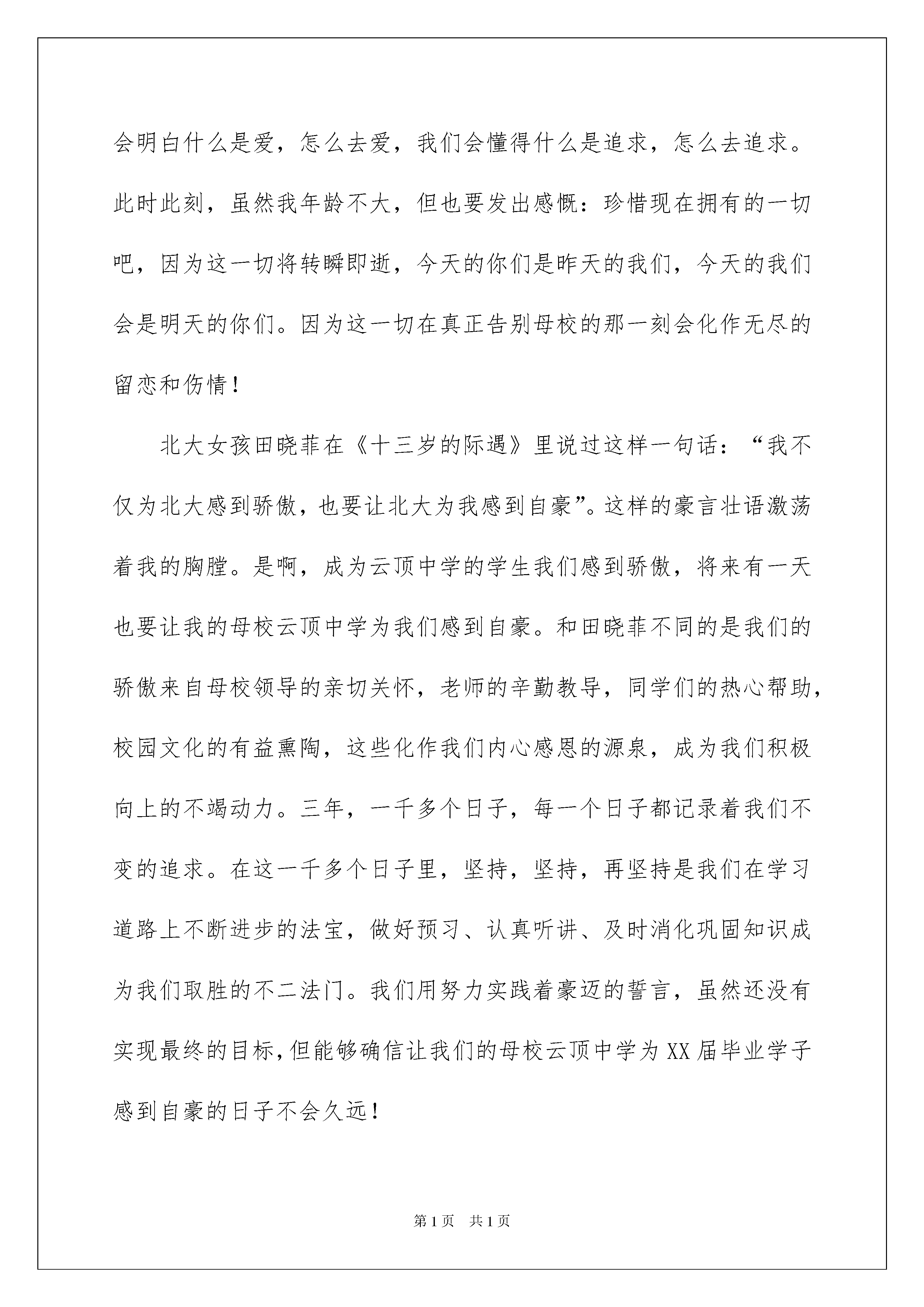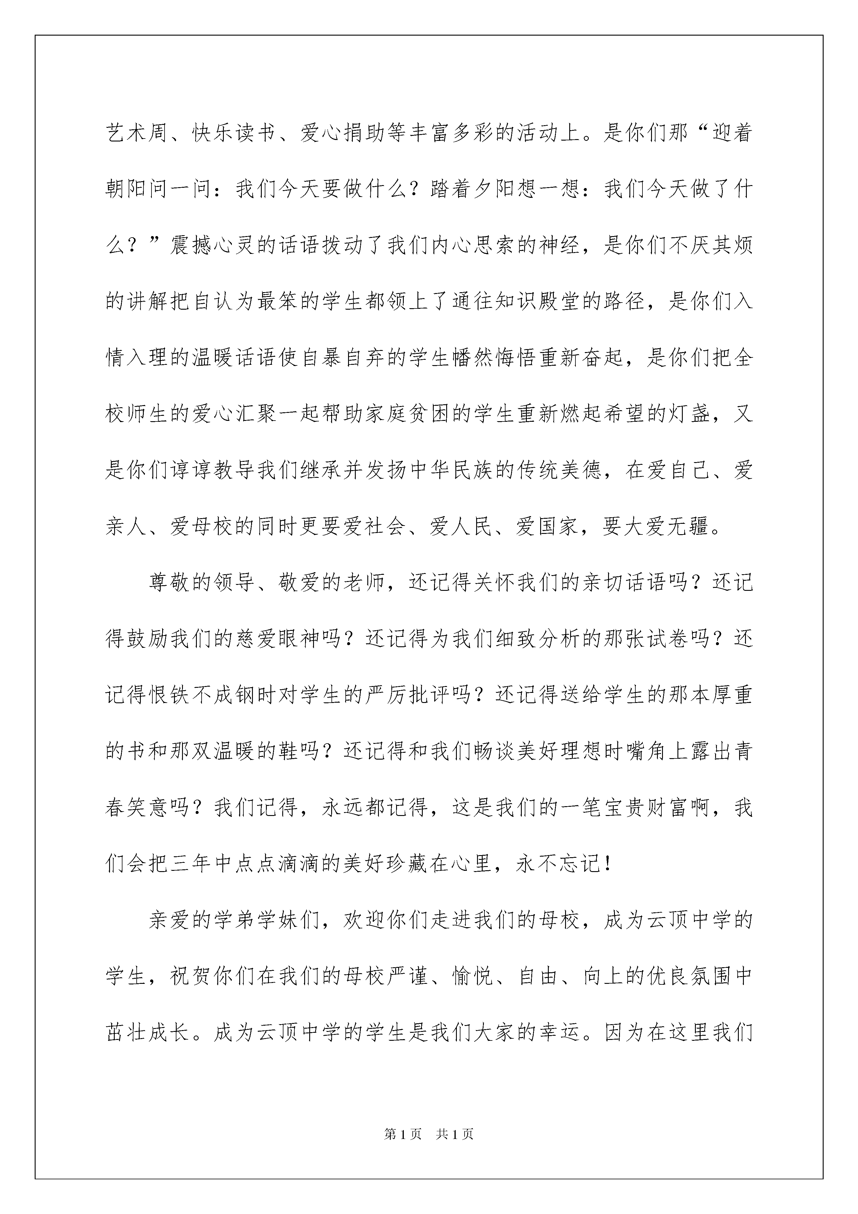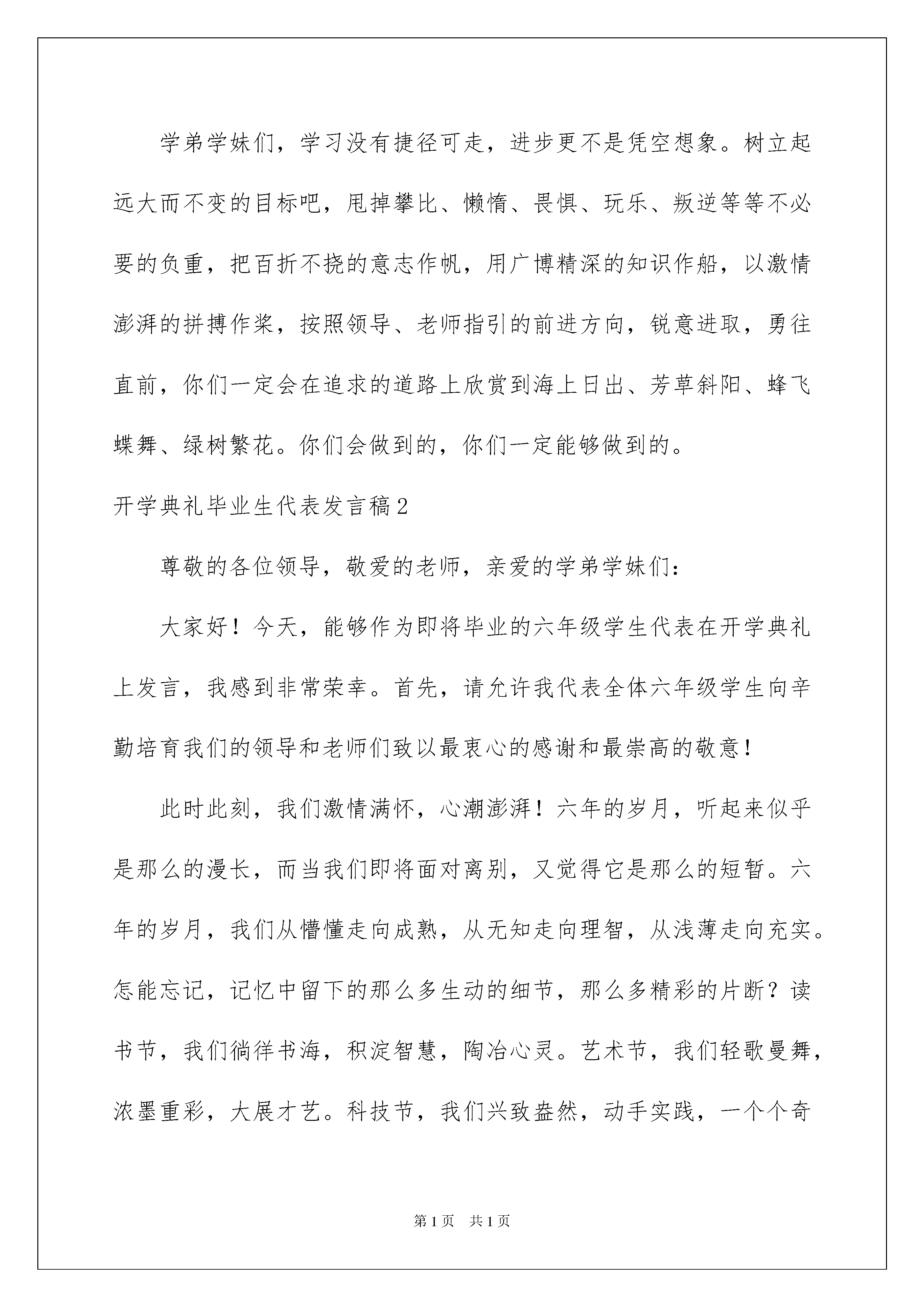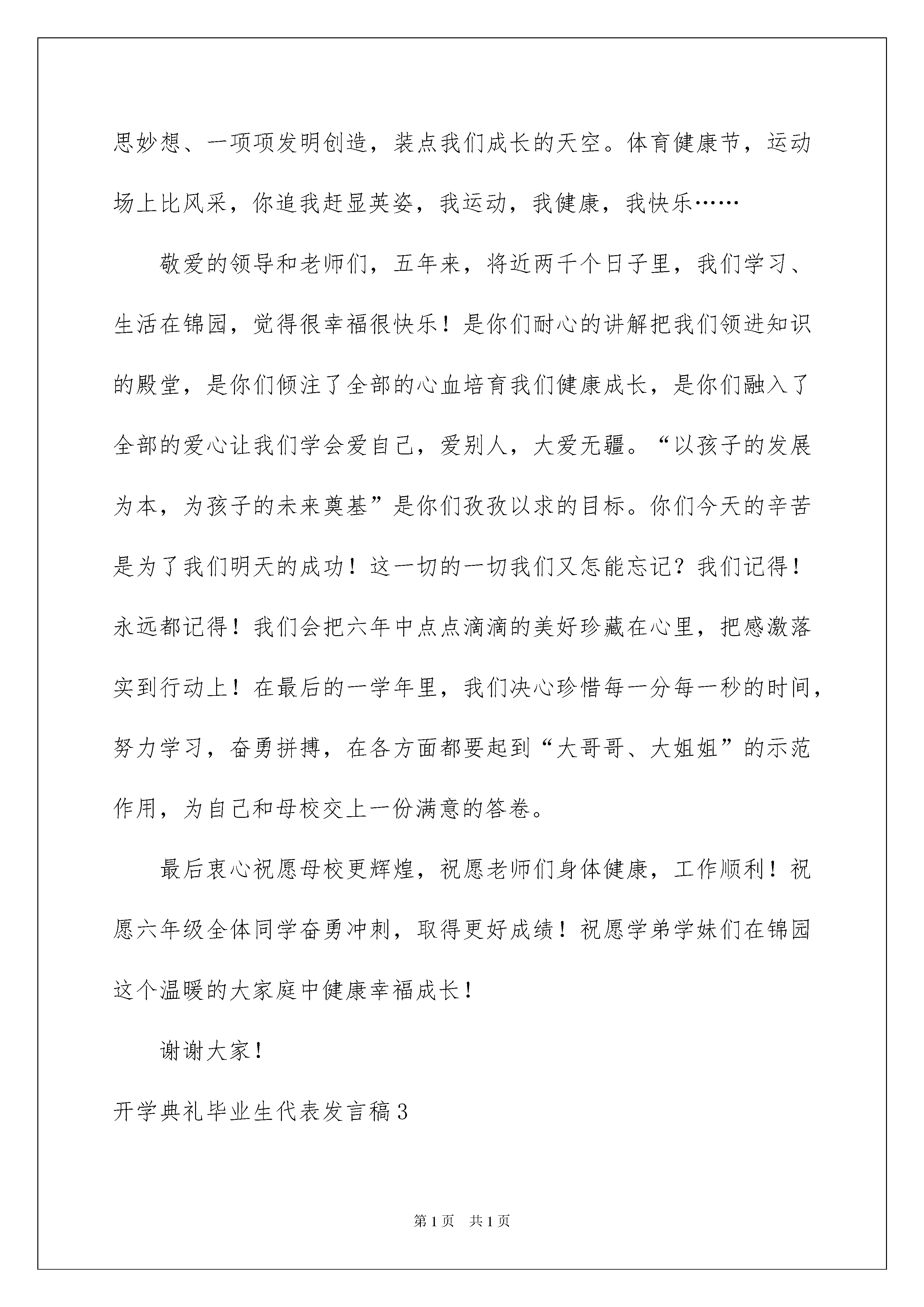 2022开学典礼毕业生代表发言稿开学典礼毕业生代表发言稿在日新月异的现代社会中,越来越多人会去使用发言稿,发言稿的格式由称谓、开场白、主干、结尾等几部分组成。那么问题来了,到底应如何写好一份发言稿呢?下面是我帮大家整理的开学典礼毕业生代表发言稿,希望能够帮助到大家。开学典礼毕业生代表发言稿1尊敬的各位领导、老师,亲爱的学弟学妹们:大家下午好!今天,能够作为XX届毕业生代表在母校开学典礼上发言,我感到非常的荣幸。首先,请允许我代表XX届全体毕业生向辛勤培育我们的领导、老师们致以最衷心的感谢和最崇高的敬意!领导、老师,此时此刻,我怎能不向你们表达感谢和敬意?怎么能忘记啊,在这短暂美好的三年里,你们倾注了全部的心血培育我们健康成长,你们把真挚的爱落实在筹建食堂改善伙食的具体行动中,融入在改变教学方式,实施快乐课堂的学习体验里,体现在运动会、艺术周、快乐读书、爱心捐助等丰富多彩的活动上。是你们那“迎着朝阳问一问:我们今天要做什么?踏着夕阳想一想:我们今天做了什么?”震撼心灵的话语拨动了我们内心思索的神经,是你们不厌其烦的讲解把自认为最笨的学生都领上了通往知识殿堂的路径,是你们入情入理的温暖话语使自暴自弃的学生幡然悔悟重新奋起,是你们把全校师生的爱心汇聚一起帮助家庭贫困的学生重新燃起希望的灯盏,又是你们谆谆教导我们继承并发扬中华民族的传统美德,在爱自己、爱亲人、爱母校的同时更要爱社会、爱人民、爱国家,要大爱无疆。尊敬的领导、敬爱的老师,还记得关怀我们的亲切话语吗?还记得鼓励我们的慈爱眼神吗?还记得为我们细致分析的那张试卷吗?还记得恨铁不成钢时对学生的严厉批评吗?还记得送给学生的那本厚重的书和那双温暖的鞋吗?还记得和我们畅谈美好理想时嘴角上露出青春笑意吗?我们记得,永远都记得,这是我们的一笔宝贵财富啊,我们会把三年中点点滴滴的美好珍藏在心里,永不忘记!亲爱的学弟学妹们,欢迎你们走进我们的母校,成为云顶中学的学生,祝贺你们在我们的母校严谨、愉悦、自由、向上的优良氛围中茁壮成长。成为云顶中学的学生是我们大家的幸运。因为在这里我们会明白什么是爱,怎么去爱,我们会懂得什么是追求,怎么去追求。此时此刻,虽然我年龄不大,但也要发出感慨:珍惜现在拥有的一切吧,因为这一切将转瞬即逝,今天的你们是昨天的我们,今天的我们会是明天的你们。因为这一切在真正告别母校的那一刻会化作无尽的留恋和伤情!北大女孩田晓菲在《十三岁的际遇》里说过这样一句话:“我不仅为北大感到骄傲,也要让北大为我感到自豪”。这样的豪言壮语激荡着我的胸膛。是啊,成为云顶中学的学生我们感到骄傲,将来有一天也要让我的母校云顶中学为我们感到自豪。和田晓菲不同的是我们的骄傲来自母校领导的亲切关怀,老师的辛勤教导,同学们的热心帮助,校园文化的有益熏陶,这些化作我们内心感恩的源泉,成为我们积极向上的不竭动力。三年,一千多个日子,每一个日子都记录着我们不变的追求。在这一千多个日子里,坚持,坚持,再坚持是我们在学习道路上不断进步的法宝,做好预习、认真听讲、及时消化巩固知识成为我们取胜的不二法门。我们用努力实践着豪迈的誓言,虽然还没有实现最终的目标,但能够确信让我们的母校云顶中学为XX届毕业学子感到自豪的日子不会久远!学弟学妹们,学习没有捷径可走,进步更不是凭空想象。树立起远大而不变的目标吧,甩掉攀比、懒惰、畏惧、玩乐、叛逆等等不必要的负重,把百折不挠的意志作帆,用广博精深的知识作船,以激情澎湃的拼搏作桨,按照领导、老师指引的前进方向,锐意进取,勇往直前,你们一定会在追求的道路上欣赏到海上日出、芳草斜阳、蜂飞蝶舞、绿树繁花。你们会做到的,你们一定能够做到的。开学典礼毕业生代表发言稿2尊敬的各位领导,敬爱的老师,亲爱的学弟学妹们:大家好!今天,能够作为即将毕业的六年级学生代表在开学典礼上发言,我感到非常荣幸。首先,请允许我代表全体六年级学生向辛勤培育我们的领导和老师们致以最衷心的感谢和最崇高的敬意!此时此刻,我们激情满怀,心潮澎湃!六年的岁月,听起来似乎是那么的漫长,而当我们即将面对离别,又觉得它是那么的短暂。六年的岁月,我们从懵懂走向成熟,从无知走向理智,从浅薄走向充实。怎能忘记,记忆中留下的那么多生动的细节,那么多精彩的片断?读书节,我们徜徉书海,积淀智慧,陶冶心灵。艺术节,我们轻歌曼舞,浓墨重彩,大展才艺。科技节,我们兴致盎然,动手实践,一个个奇思妙想、一项项发明创造,装点我们成长的天空。体育健康节,运动场上比风采,你追我赶显英姿,我运动,我健康,我快乐……敬爱的领导和老师们,五年来,将近两千个日子里,我们学习、生活在锦园,觉得很幸福很快乐!是你们耐心的