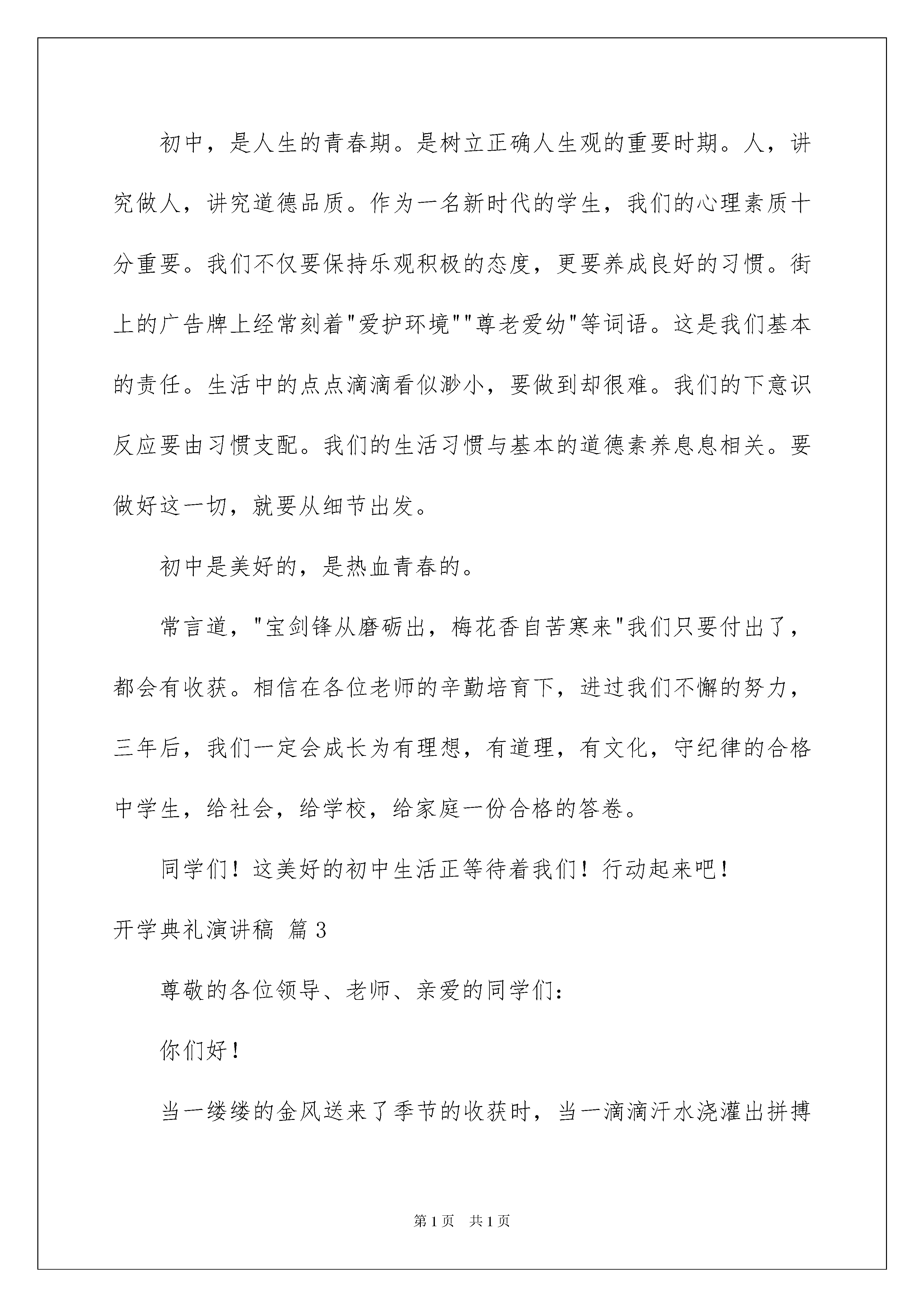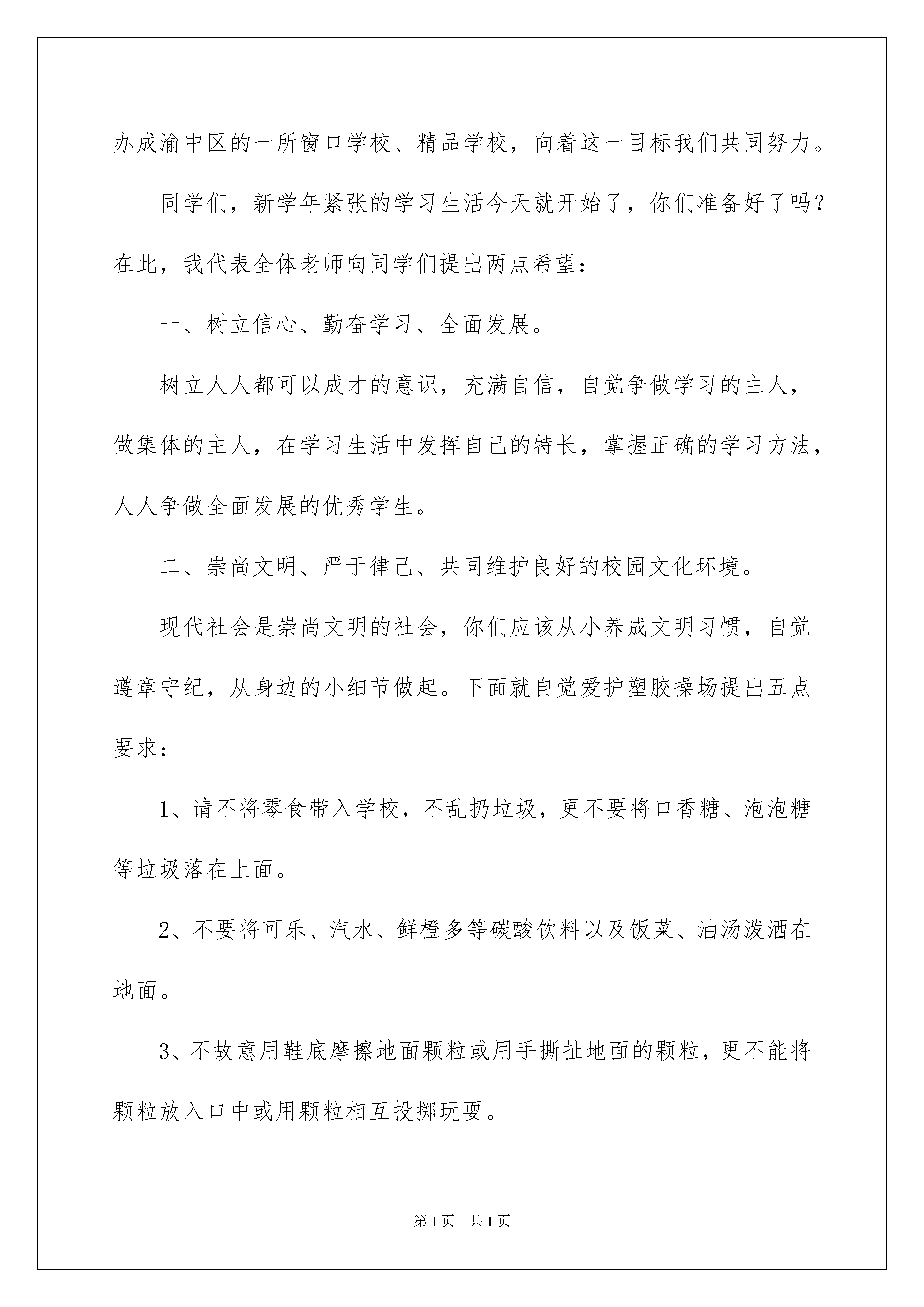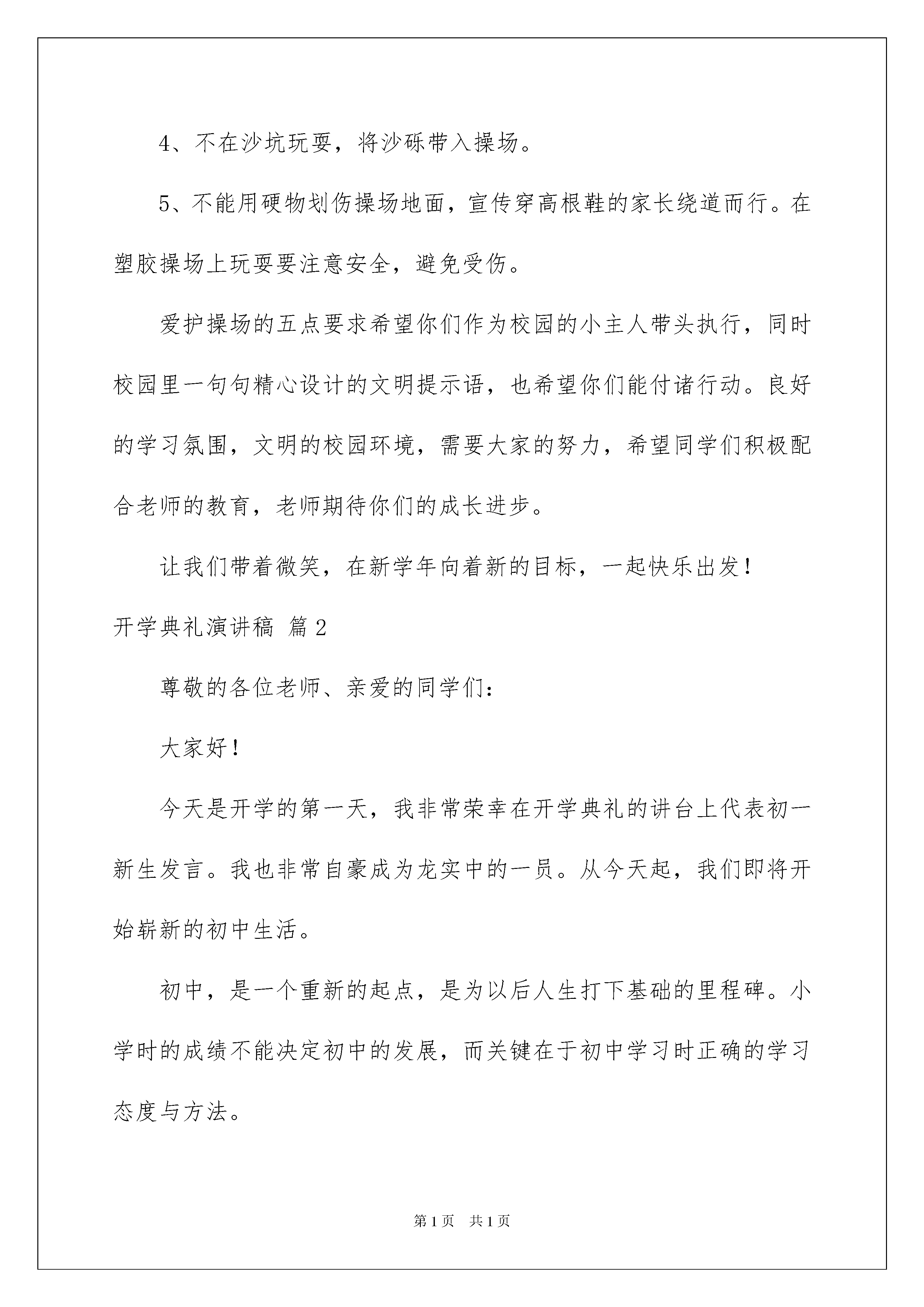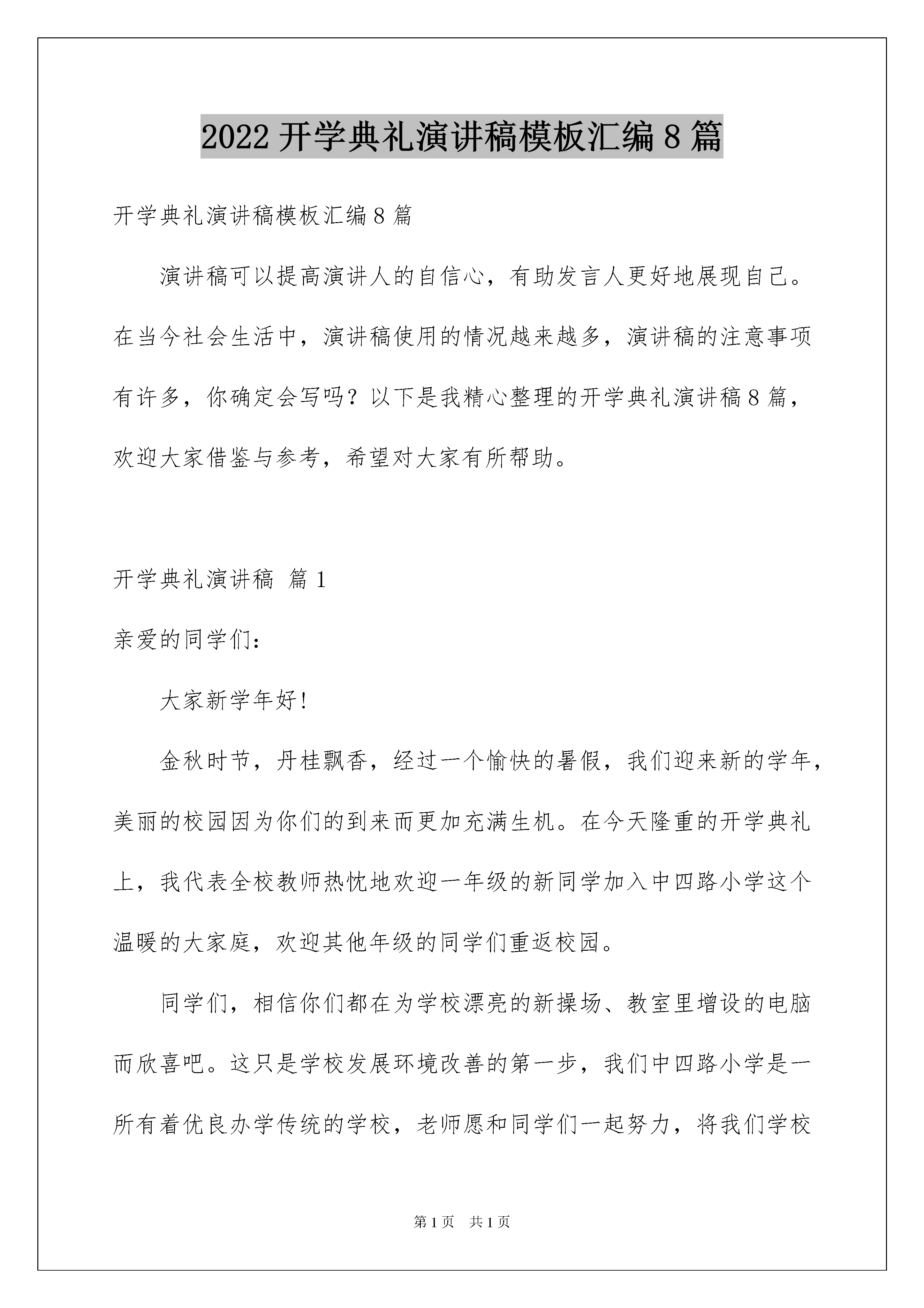 2022开学典礼演讲稿模板汇编8篇开学典礼演讲稿模板汇编8篇演讲稿可以提高演讲人的自信心,有助发言人更好地展现自己。在当今社会生活中,演讲稿使用的情况越来越多,演讲稿的注意事项有许多,你确定会写吗?以下是我精心整理的开学典礼演讲稿8篇,欢迎大家借鉴与参考,希望对大家有所帮助。开学典礼演讲稿篇1亲爱的同学们:大家新学年好!金秋时节,丹桂飘香,经过一个愉快的暑假,我们迎来新的学年,美丽的校园因为你们的到来而更加充满生机。在今天隆重的开学典礼上,我代表全校教师热忱地欢迎一年级的新同学加入中四路小学这个温暖的大家庭,欢迎其他年级的同学们重返校园。同学们,相信你们都在为学校漂亮的新操场、教室里增设的电脑而欣喜吧。这只是学校发展环境改善的第一步,我们中四路小学是一所有着优良办学传统的学校,老师愿和同学们一起努力,将我们学校办成渝中区的一所窗口学校、精品学校,向着这一目标我们共同努力。同学们,新学年紧张的学习生活今天就开始了,你们准备好了吗?在此,我代表全体老师向同学们提出两点希望:一、树立信心、勤奋学习、全面发展。树立人人都可以成才的意识,充满自信,自觉争做学习的主人,做集体的主人,在学习生活中发挥自己的特长,掌握正确的学习方法,人人争做全面发展的优秀学生。二、崇尚文明、严于律己、共同维护良好的校园文化环境。现代社会是崇尚文明的社会,你们应该从小养成文明习惯,自觉遵章守纪,从身边的小细节做起。下面就自觉爱护塑胶操场提出五点要求:1、请不将零食带入学校,不乱扔垃圾,更不要将口香糖、泡泡糖等垃圾落在上面。2、不要将可乐、汽水、鲜橙多等碳酸饮料以及饭菜、油汤泼洒在地面。3、不故意用鞋底摩擦地面颗粒或用手撕扯地面的颗粒,更不能将颗粒放入口中或用颗粒相互投掷玩耍。4、不在沙坑玩耍,将沙砾带入操场。5、不能用硬物划伤操场地面,宣传穿高根鞋的家长绕道而行。在塑胶操场上玩耍要注意安全,避免受伤。爱护操场的五点要求希望你们作为校园的小主人带头执行,同时校园里一句句精心设计的文明提示语,也希望你们能付诸行动。良好的学习氛围,文明的校园环境,需要大家的努力,希望同学们积极配合老师的教育,老师期待你们的成长进步。让我们带着微笑,在新学年向着新的目标,一起快乐出发!开学典礼演讲稿篇2尊敬的各位老师、亲爱的同学们:大家好!今天是开学的第一天,我非常荣幸在开学典礼的讲台上代表初一新生发言。我也非常自豪成为龙实中的一员。从今天起,我们即将开始崭新的初中生活。初中,是一个重新的起点,是为以后人生打下基础的里程碑。小学时的成绩不能决定初中的发展,而关键在于初中学习时正确的学习态度与方法。初中的课程复杂繁重,不比小学只有两三门主科,而此时,在初中紧张的生活中,学习方式的正确至关重要。从小学起,老师就告诉我们"课前预习,课后复习","上课认真听讲,不做小动作"等等。我相信这几句话耳熟能详。可规范的按照要求去做的,肯定没多少。大家不要认为一时疏忽没有关系,细节决定成败。而初中学习还有一个很重要的,就是目标。目标,就是对自己未来的定位。初中学习,我们得清楚自己想要什么,想干什么,为什么这么做。因为学习更多的是为自己。有的人目标就是考个好成绩,这是对自己负责的表现。不要认为他们的很渺小,要记住积少成多。有的人目标很远大,但要知道成功是一步一个脚印实现的,不能好高骛远。有的人梦想总会改变,那是因为客观因素的影响。多以我们必须坚定自己为什么要这么干,一路走下去。有了目标,有了动力;有了动力,就得付诸行动。初中学习用心自然是好,可是"死读书"终究得不到一个好的结果。学习要讲究劳逸结合,该玩就玩,该学就学,不能时时刻刻墨守成规。要注意身心的疲惫,适当的放松。课余去打打篮球,跳跳绳,让自己的初中在一个快乐、充实的生活中度过。初中,是人生的青春期。是树立正确人生观的重要时期。人,讲究做人,讲究道德品质。作为一名新时代的学生,我们的心理素质十分重要。我们不仅要保持乐观积极的态度,更要养成良好的习惯。街上的广告牌上经常刻着"爱护环境""尊老爱幼"等词语。这是我们基本的责任。生活中的点点滴滴看似渺小,要做到却很难。我们的下意识反应要由习惯支配。我们的生活习惯与基本的道德素养息息相关。要做好这一切,就要从细节出发。初中是美好的,是热血青春的。常言道,"宝剑锋从磨砺出,梅花香自苦寒来"我们只要付出了,都会有收获。相信在各位老师的辛勤培育下,进过我们不懈的努力,三年后,我们一定会成长为有理想,有道理,有文化,守纪律的合格中学生,给社会,给学校,给家庭一份合格的答卷。同学们!这美好的初中生活正等待着我们!行动起来吧!开学典礼演讲稿篇3尊敬的各位领导、老师