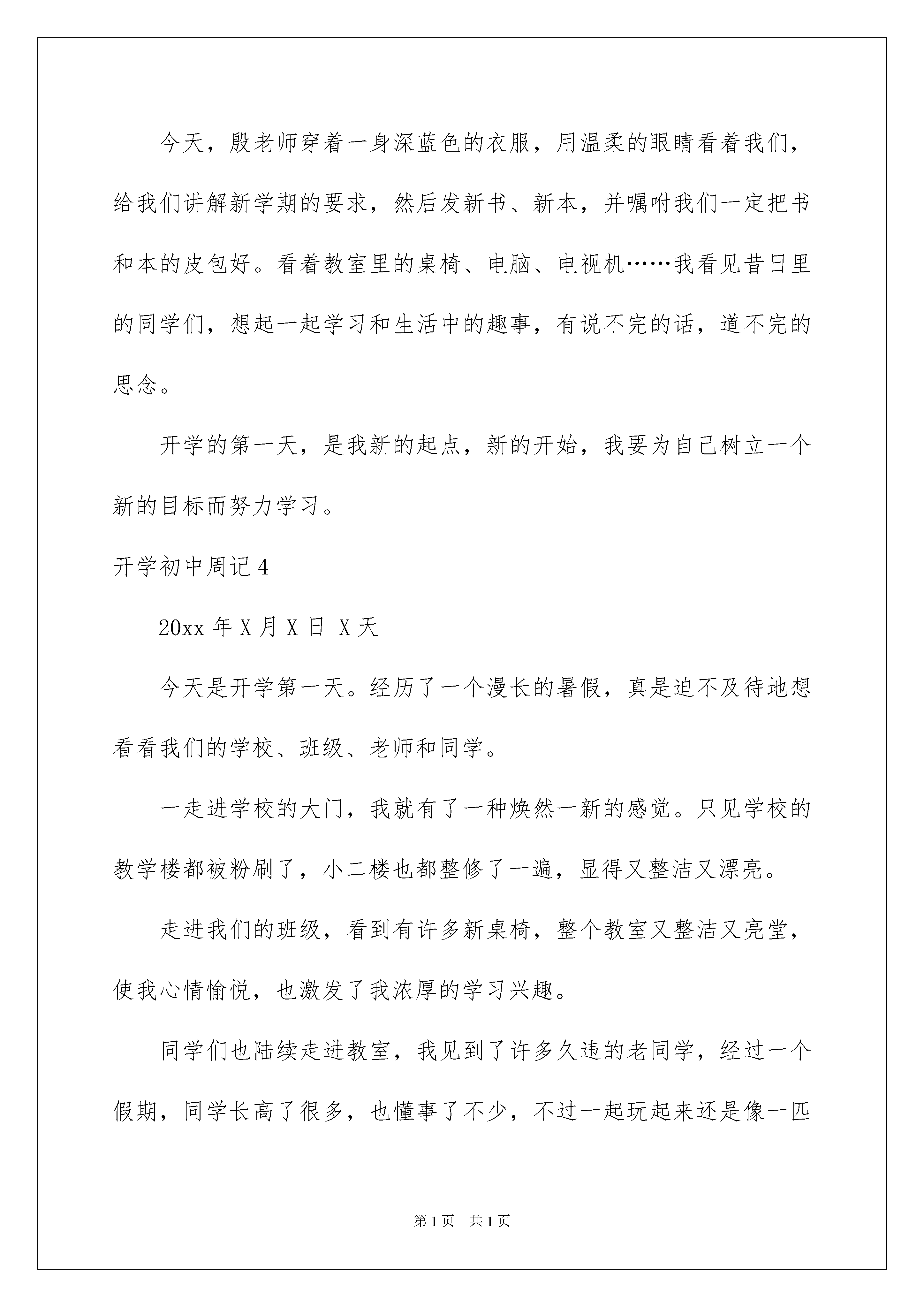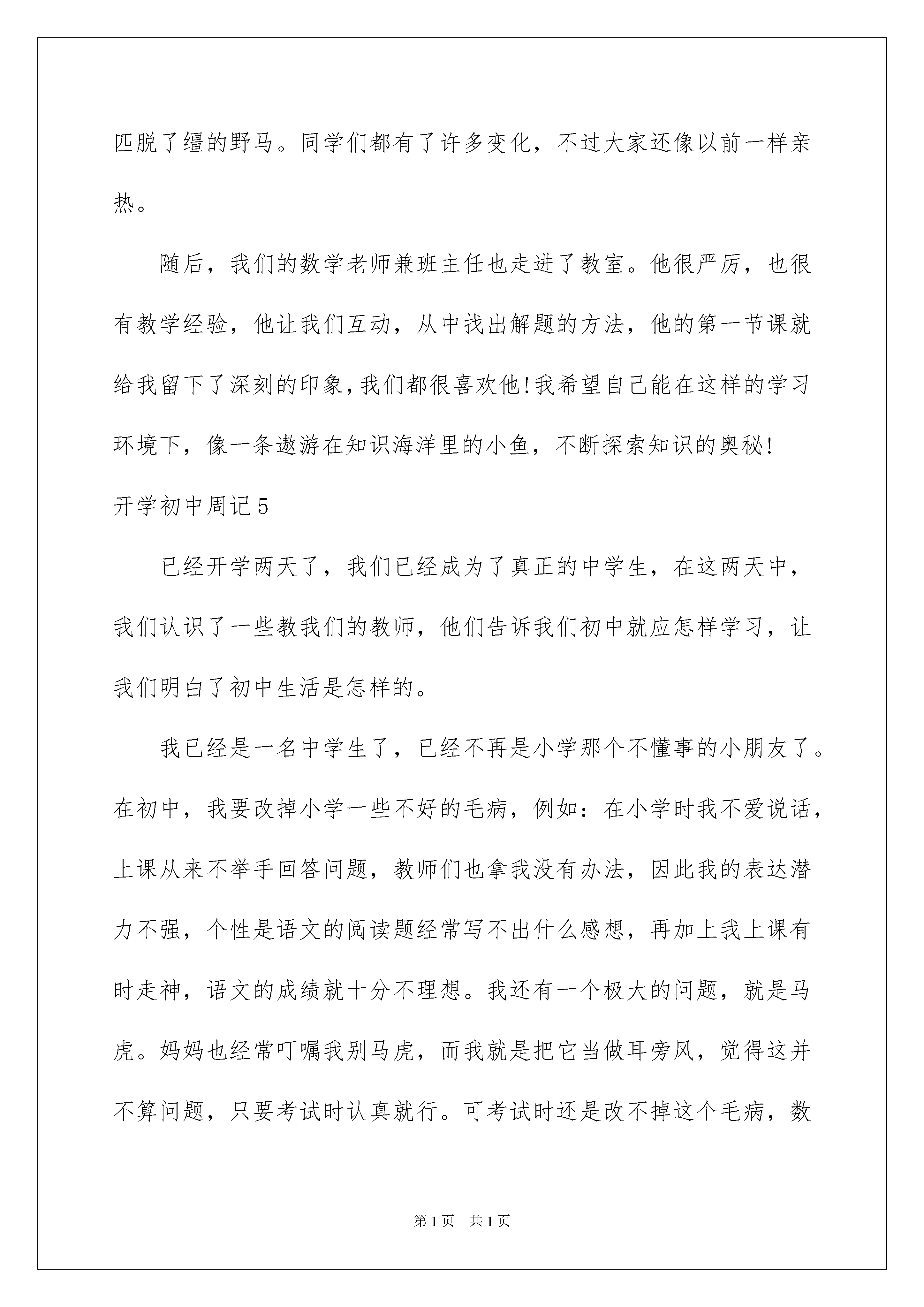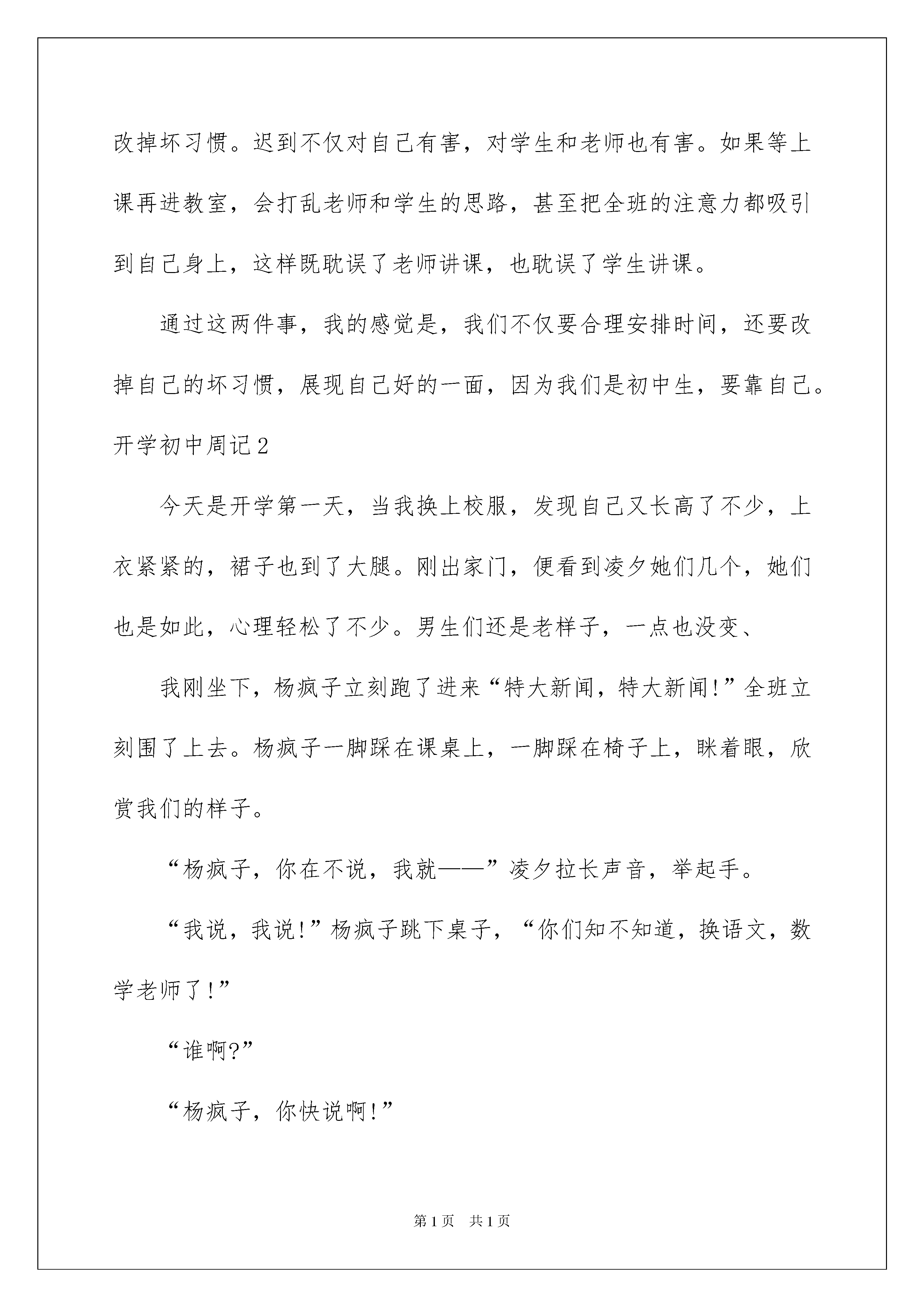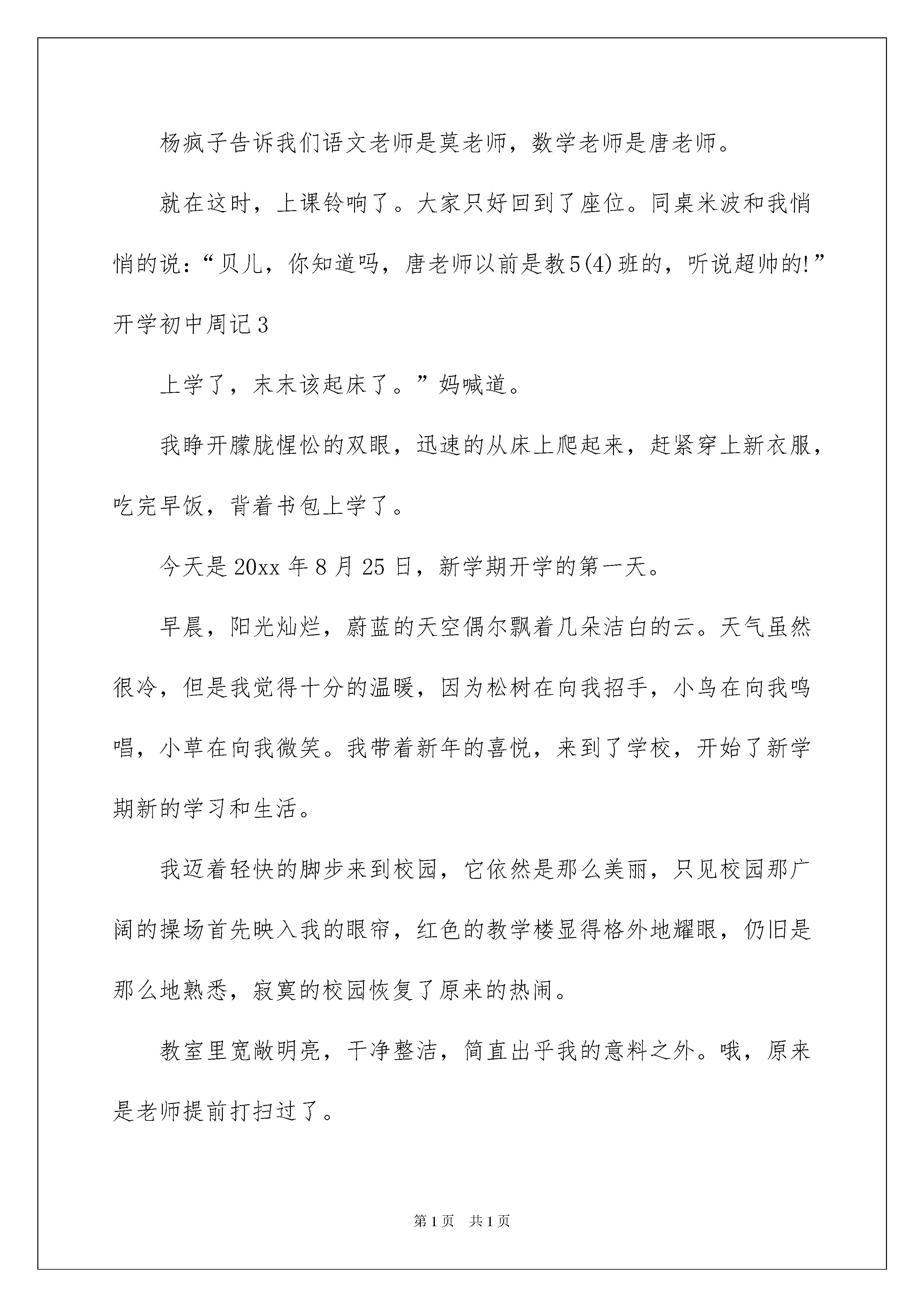 2022开学初中周记开学初中周记时光飞逝,如梭之日,转眼一周又过去了,我们对人和事情也有了新的看法,这时候,最关键的周记怎么能落下!千万不能认为周记随便应付就可以,下面是我为大家整理的开学初中周记,欢迎阅读与收藏。开学初中周记1我已经从小学生变成初中生了!开学第一天,老师对我们说:“我们从现在开始就是初中生了,什么都要自己做,合理安排时间,上课不要迟到……”老师本来说的是我们要好好干,但是我想的太简单了。我们开学这么多天,每次老师留作业,总有人比别人落后一步,因为他在做别的事情,而别人在做作业,等等,作业来的多了,他就在那里着急,最后作业写的一塌糊涂。如果是这样,我们不仅会被老师吵到,还会证明我们是不会安排自己时间的初中生。我们小学可以迟到,但是现在已经长大了,是初中生了,一定要改掉坏习惯。迟到不仅对自己有害,对学生和老师也有害。如果等上课再进教室,会打乱老师和学生的思路,甚至把全班的注意力都吸引到自己身上,这样既耽误了老师讲课,也耽误了学生讲课。通过这两件事,我的感觉是,我们不仅要合理安排时间,还要改掉自己的坏习惯,展现自己好的一面,因为我们是初中生,要靠自己。开学初中周记2今天是开学第一天,当我换上校服,发现自己又长高了不少,上衣紧紧的,裙子也到了大腿。刚出家门,便看到凌夕她们几个,她们也是如此,心理轻松了不少。男生们还是老样子,一点也没变、我刚坐下,杨疯子立刻跑了进来“特大新闻,特大新闻!”全班立刻围了上去。杨疯子一脚踩在课桌上,一脚踩在椅子上,眯着眼,欣赏我们的样子。“杨疯子,你在不说,我就——”凌夕拉长声音,举起手。“我说,我说!”杨疯子跳下桌子,“你们知不知道,换语文,数学老师了!”“谁啊?”“杨疯子,你快说啊!”杨疯子告诉我们语文老师是莫老师,数学老师是唐老师。就在这时,上课铃响了。大家只好回到了座位。同桌米波和我悄悄的说:“贝儿,你知道吗,唐老师以前是教5(4)班的,听说超帅的!”开学初中周记3上学了,末末该起床了。”妈喊道。我睁开朦胧惺忪的双眼,迅速的从床上爬起来,赶紧穿上新衣服,吃完早饭,背着书包上学了。今天是20xx年8月25日,新学期开学的第一天。早晨,阳光灿烂,蔚蓝的天空偶尔飘着几朵洁白的云。天气虽然很冷,但是我觉得十分的温暖,因为松树在向我招手,小鸟在向我鸣唱,小草在向我微笑。我带着新年的喜悦,来到了学校,开始了新学期新的学习和生活。我迈着轻快的脚步来到校园,它依然是那么美丽,只见校园那广阔的操场首先映入我的眼帘,红色的教学楼显得格外地耀眼,仍旧是那么地熟悉,寂寞的校园恢复了原来的热闹。教室里宽敞明亮,干净整洁,简直出乎我的意料之外。哦,原来是老师提前打扫过了。今天,殷老师穿着一身深蓝色的衣服,用温柔的眼睛看着我们,给我们讲解新学期的要求,然后发新书、新本,并嘱咐我们一定把书和本的皮包好。看着教室里的桌椅、电脑、电视机……我看见昔日里的同学们,想起一起学习和生活中的趣事,有说不完的话,道不完的思念。开学的第一天,是我新的起点,新的开始,我要为自己树立一个新的目标而努力学习。开学初中周记420xx年X月X日X天今天是开学第一天。经历了一个漫长的暑假,真是迫不及待地想看看我们的学校、班级、老师和同学。一走进学校的大门,我就有了一种焕然一新的感觉。只见学校的教学楼都被粉刷了,小二楼也都整修了一遍,显得又整洁又漂亮。走进我们的班级,看到有许多新桌椅,整个教室又整洁又亮堂,使我心情愉悦,也激发了我浓厚的学习兴趣。同学们也陆续走进教室,我见到了许多久违的老同学,经过一个假期,同学长高了很多,也懂事了不少,不过一起玩起来还是像一匹匹脱了缰的野马。同学们都有了许多变化,不过大家还像以前一样亲热。随后,我们的数学老师兼班主任也走进了教室。他很严厉,也很有教学经验,他让我们互动,从中找出解题的方法,他的第一节课就给我留下了深刻的印象,我们都很喜欢他!我希望自己能在这样的学习环境下,像一条遨游在知识海洋里的小鱼,不断探索知识的奥秘!开学初中周记5已经开学两天了,我们已经成为了真正的中学生,在这两天中,我们认识了一些教我们的教师,他们告诉我们初中就应怎样学习,让我们明白了初中生活是怎样的。我已经是一名中学生了,已经不再是小学那个不懂事的小朋友了。在初中,我要改掉小学一些不好的毛病,例如:在小学时我不爱说话,上课从来不举手回答问题,教师们也拿我没有办法,因此我的表达潜力不强,个性是语文的阅读题经常写不出什么感想,再加上我上课有时走神,语文的成绩就十分不理想。我还有一个极大的问题,就是马虎。妈妈也经常叮嘱我别马虎,而我就是把它当做耳旁风,觉得这并不算问题,只要考试时认真就