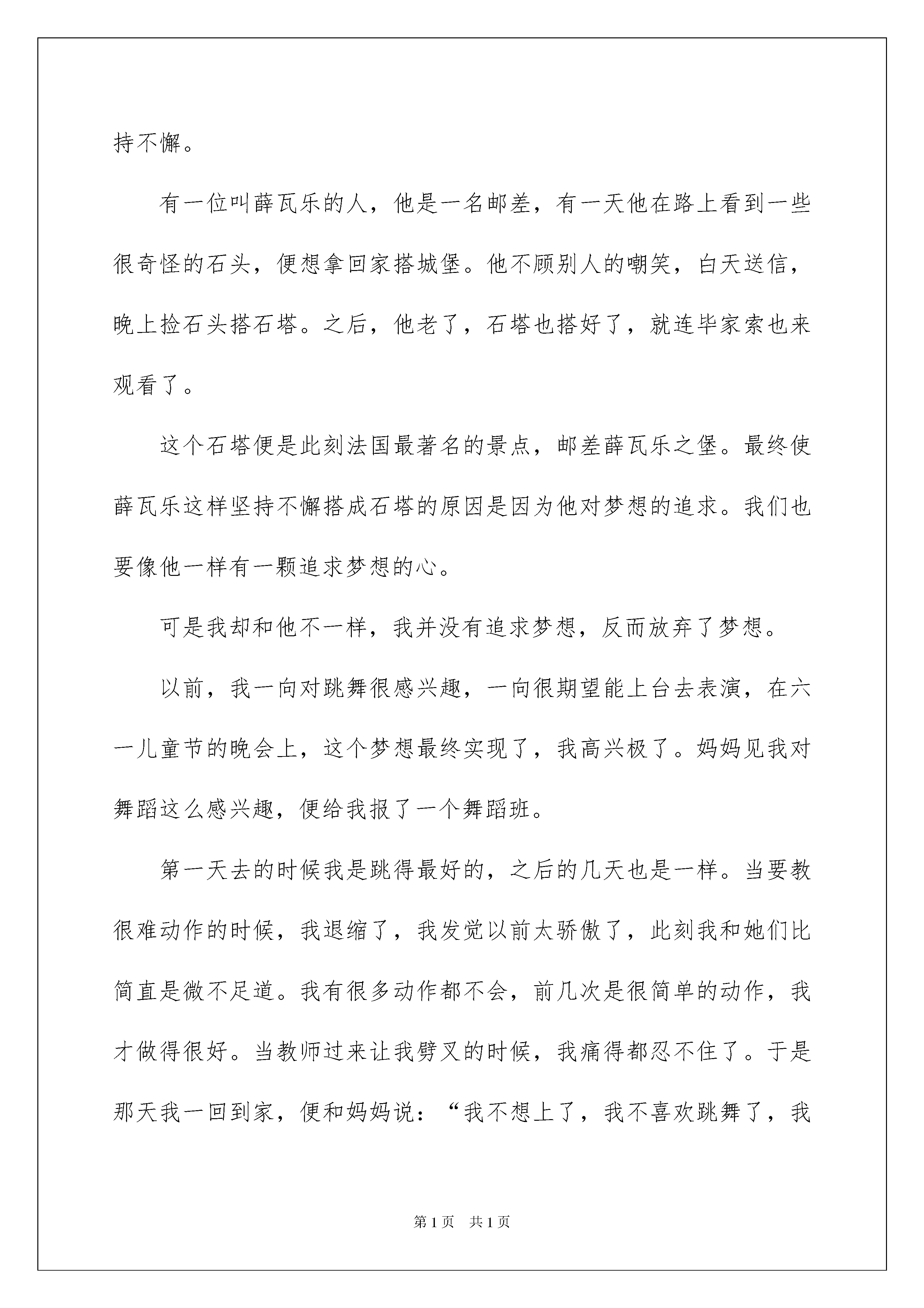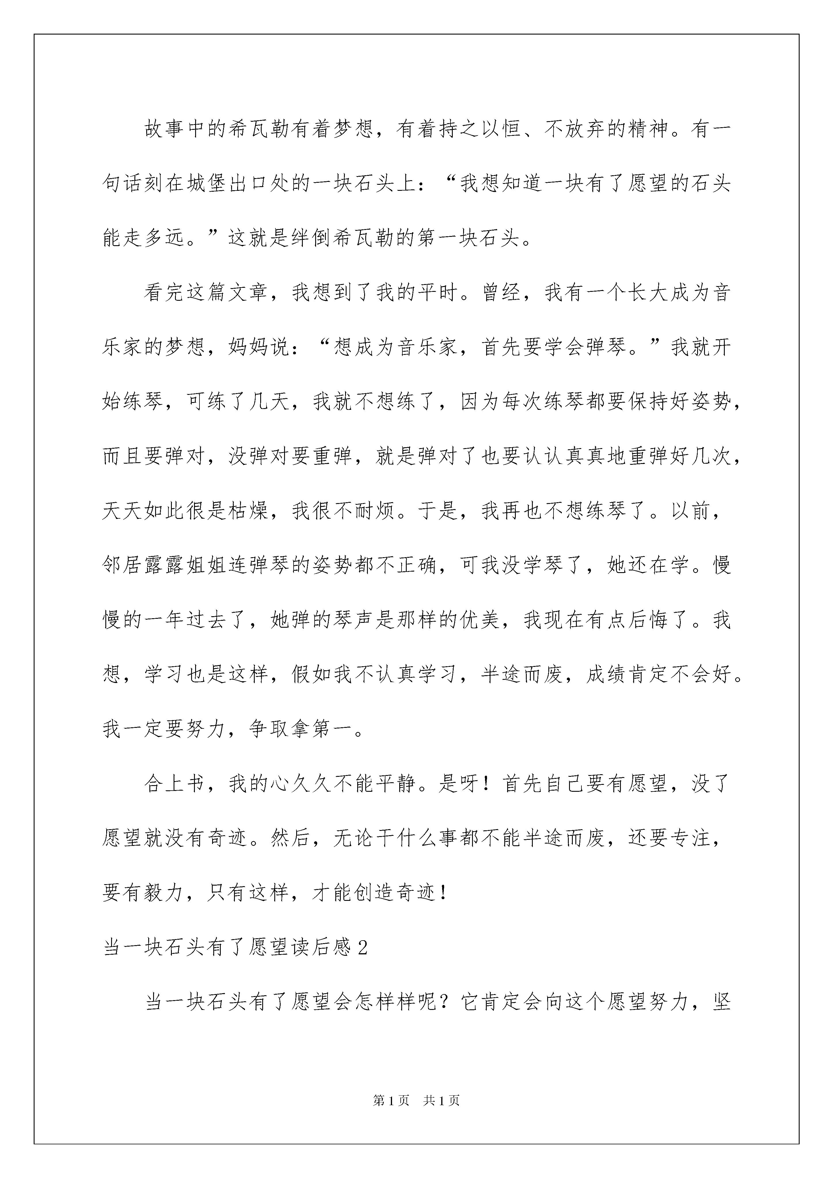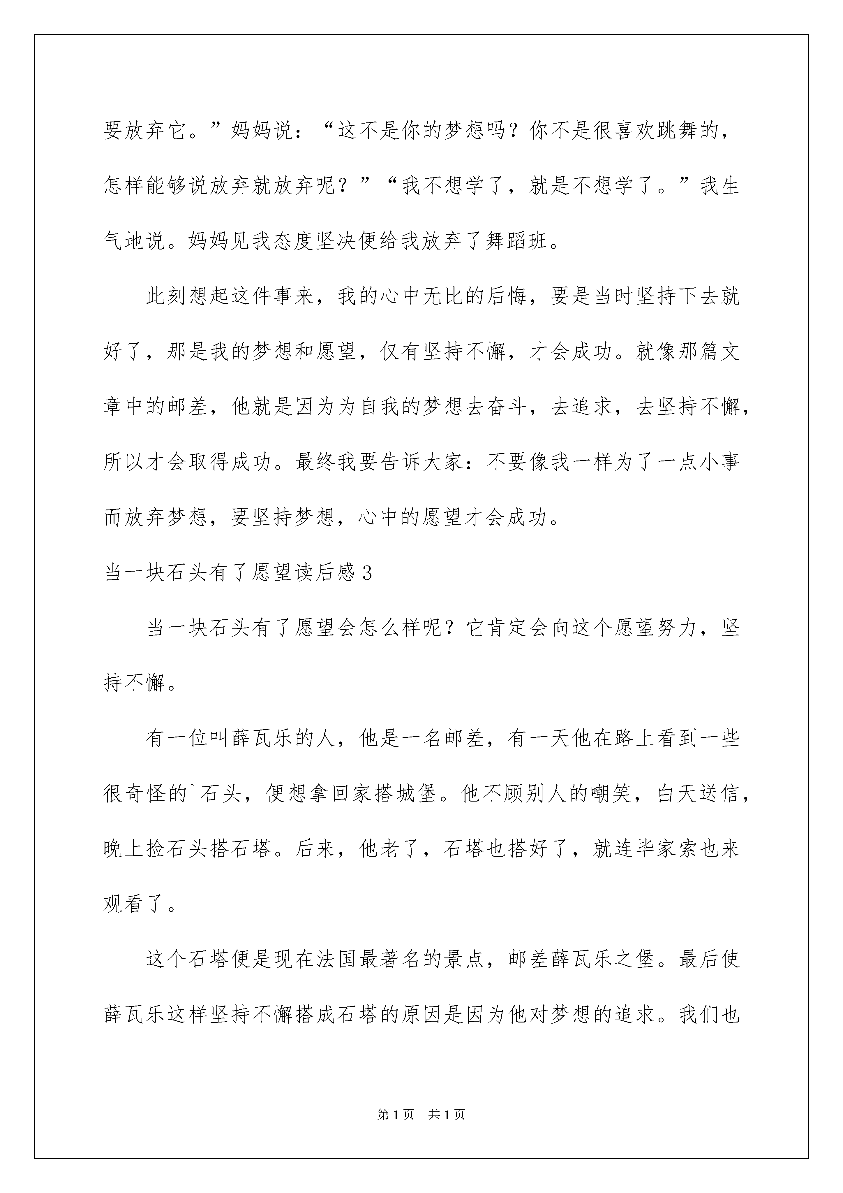 2022当一块石头有了愿望读后感当一块石头有了愿望读后感读完某一作品后,相信大家都增长了不少见闻,此时需要认真地做好记录,写写读后感了。可是读后感怎么写才合适呢?以下是我整理的当一块石头有了愿望读后感,供大家参考借鉴,希望可以帮助到有需要的朋友。当一块石头有了愿望读后感1读了《当一块石头有了愿望》以后,我懂得了:如果让生命中的每一样东西都拥有愿望,人生才会绚丽!首先自己要有愿望,没了愿望就没有奇迹。这篇文章讲的是:一位叫希瓦勒的乡村邮递员,在山路上被石头绊倒,那块石头很奇特,他把它拾了起来,放在邮包里,村里人看见了,觉得这是个不小的负担,好意的劝他把它扔掉。可是他却不肯。回到家,他想,用这些石头建造一座城堡多美啊!于是,他看见美丽而奇特的石头就拣。二十多年后,出现了一座很美的城堡,这是希瓦勒建造的。故事中的希瓦勒有着梦想,有着持之以恒、不放弃的精神。有一句话刻在城堡出口处的一块石头上:“我想知道一块有了愿望的石头能走多远。”这就是绊倒希瓦勒的第一块石头。看完这篇文章,我想到了我的平时。曾经,我有一个长大成为音乐家的梦想,妈妈说:“想成为音乐家,首先要学会弹琴。”我就开始练琴,可练了几天,我就不想练了,因为每次练琴都要保持好姿势,而且要弹对,没弹对要重弹,就是弹对了也要认认真真地重弹好几次,天天如此很是枯燥,我很不耐烦。于是,我再也不想练琴了。以前,邻居露露姐姐连弹琴的姿势都不正确,可我没学琴了,她还在学。慢慢的一年过去了,她弹的琴声是那样的优美,我现在有点后悔了。我想,学习也是这样,假如我不认真学习,半途而废,成绩肯定不会好。我一定要努力,争取拿第一。合上书,我的心久久不能平静。是呀!首先自己要有愿望,没了愿望就没有奇迹。然后,无论干什么事都不能半途而废,还要专注,要有毅力,只有这样,才能创造奇迹!当一块石头有了愿望读后感2当一块石头有了愿望会怎样样呢?它肯定会向这个愿望努力,坚持不懈。有一位叫薛瓦乐的人,他是一名邮差,有一天他在路上看到一些很奇怪的石头,便想拿回家搭城堡。他不顾别人的嘲笑,白天送信,晚上捡石头搭石塔。之后,他老了,石塔也搭好了,就连毕家索也来观看了。这个石塔便是此刻法国最著名的景点,邮差薛瓦乐之堡。最终使薛瓦乐这样坚持不懈搭成石塔的原因是因为他对梦想的追求。我们也要像他一样有一颗追求梦想的心。可是我却和他不一样,我并没有追求梦想,反而放弃了梦想。以前,我一向对跳舞很感兴趣,一向很期望能上台去表演,在六一儿童节的晚会上,这个梦想最终实现了,我高兴极了。妈妈见我对舞蹈这么感兴趣,便给我报了一个舞蹈班。第一天去的时候我是跳得最好的,之后的几天也是一样。当要教很难动作的时候,我退缩了,我发觉以前太骄傲了,此刻我和她们比简直是微不足道。我有很多动作都不会,前几次是很简单的动作,我才做得很好。当教师过来让我劈叉的时候,我痛得都忍不住了。于是那天我一回到家,便和妈妈说:“我不想上了,我不喜欢跳舞了,我要放弃它。”妈妈说:“这不是你的梦想吗?你不是很喜欢跳舞的,怎样能够说放弃就放弃呢?”“我不想学了,就是不想学了。”我生气地说。妈妈见我态度坚决便给我放弃了舞蹈班。此刻想起这件事来,我的心中无比的后悔,要是当时坚持下去就好了,那是我的梦想和愿望,仅有坚持不懈,才会成功。就像那篇文章中的邮差,他就是因为为自我的梦想去奋斗,去追求,去坚持不懈,所以才会取得成功。最终我要告诉大家:不要像我一样为了一点小事而放弃梦想,要坚持梦想,心中的愿望才会成功。当一块石头有了愿望读后感3当一块石头有了愿望会怎么样呢?它肯定会向这个愿望努力,坚持不懈。有一位叫薛瓦乐的人,他是一名邮差,有一天他在路上看到一些很奇怪的`石头,便想拿回家搭城堡。他不顾别人的嘲笑,白天送信,晚上捡石头搭石塔。后来,他老了,石塔也搭好了,就连毕家索也来观看了。这个石塔便是现在法国最著名的景点,邮差薛瓦乐之堡。最后使薛瓦乐这样坚持不懈搭成石塔的原因是因为他对梦想的追求。我们也要像他一样有一颗追求梦想的心。可是我却和他不一样,我并没有追求梦想,反而放弃了梦想。以前,我一直对跳舞很感兴趣,一直很希望能上台去表演,在六一儿童节的晚会上,这个梦想终于实现了,我高兴极了。妈妈见我对舞蹈这么感兴趣,便给我报了一个舞蹈班。第一天去的时候我是跳得最好的,后来的几天也是一样。当要教很难动作的时候,我退缩了,我发觉以前太骄傲了,现在我和她们比简直是微不足道。我有很多动作都不会,前几次是很简单的动作,我才做得很好。当老师过来让我劈叉的时候,我痛得都忍不住了。于是那天我一回到家,便和妈妈说:“我不想上了,我不喜欢跳舞了,我要放弃它。”妈妈说:“