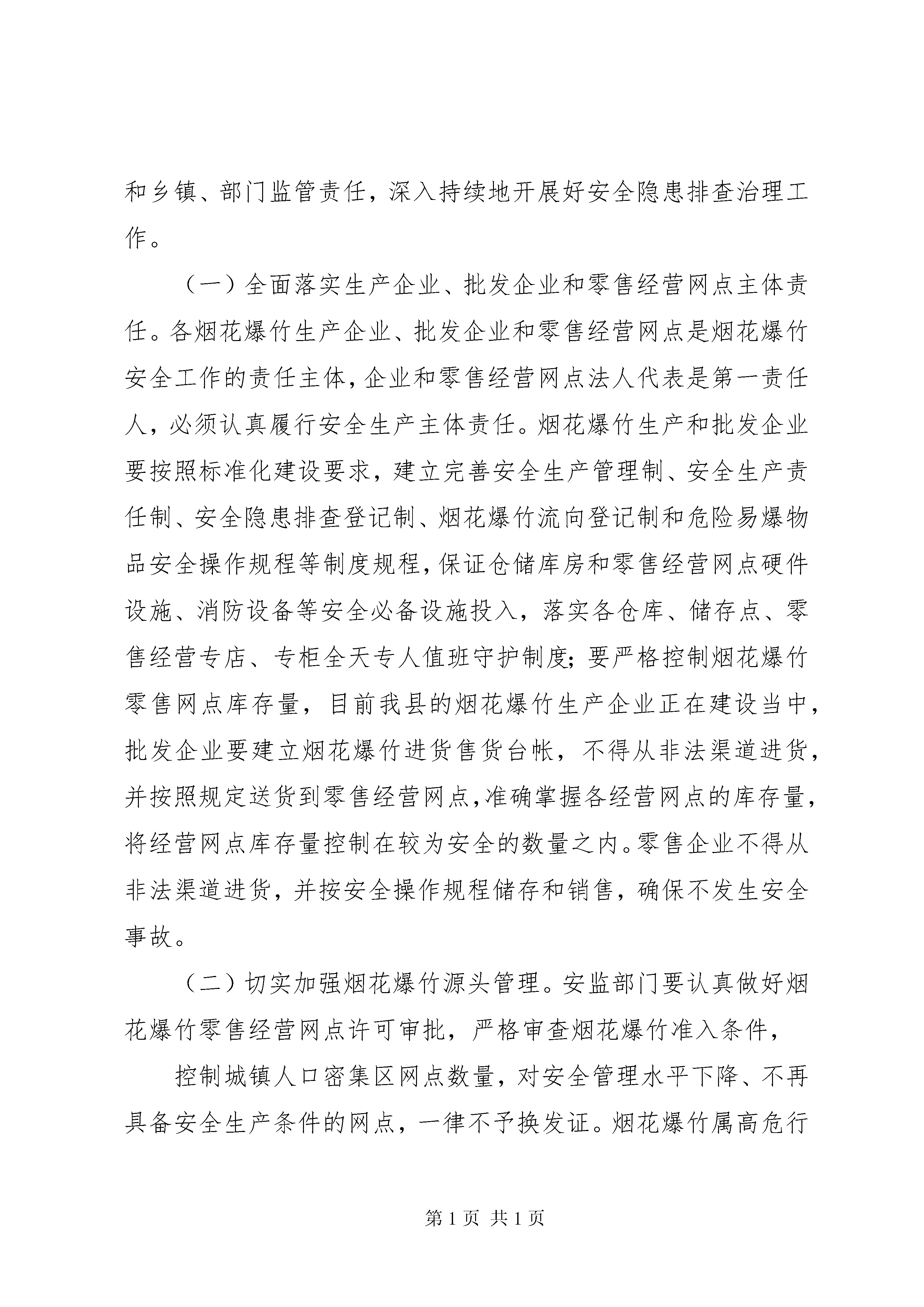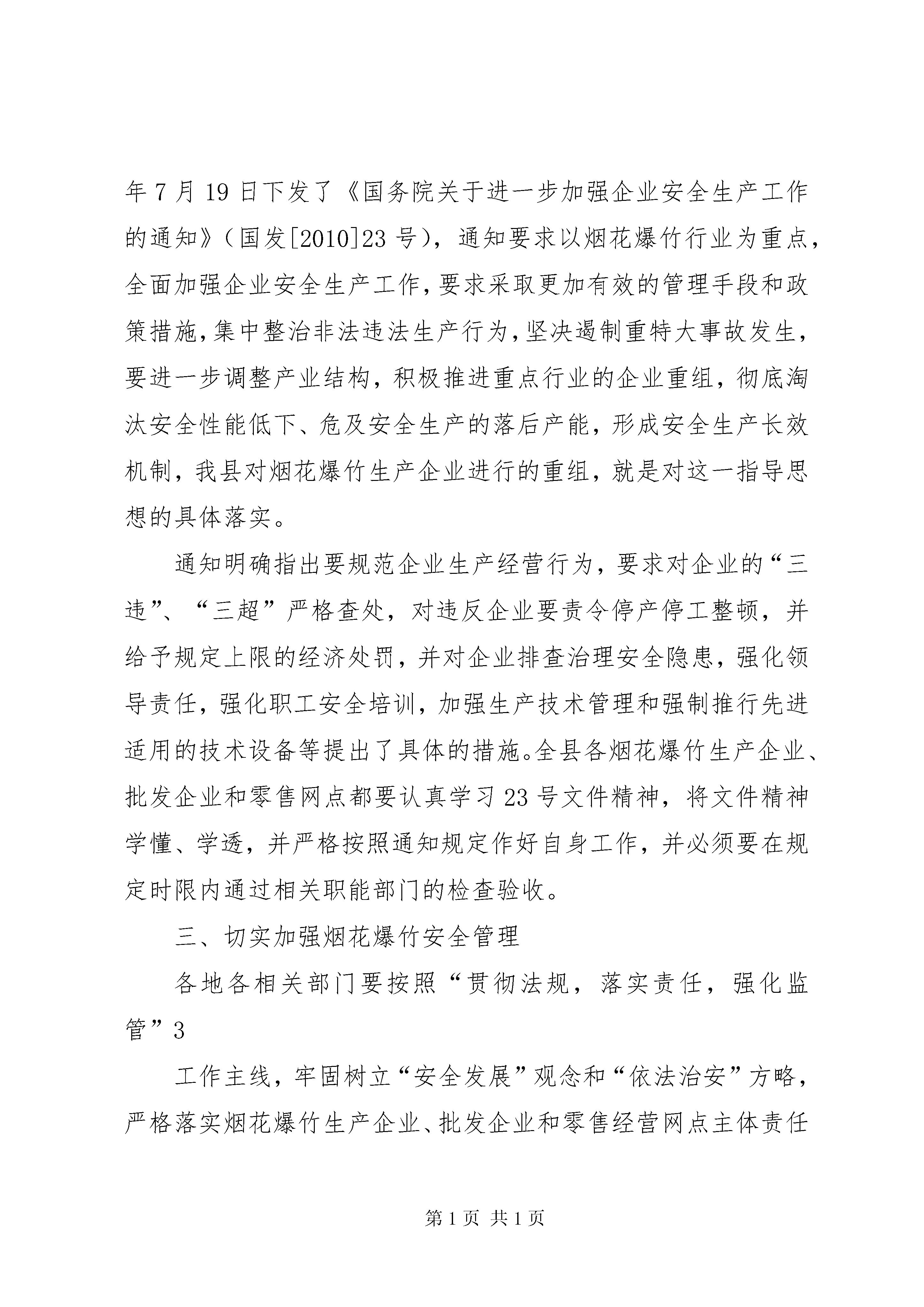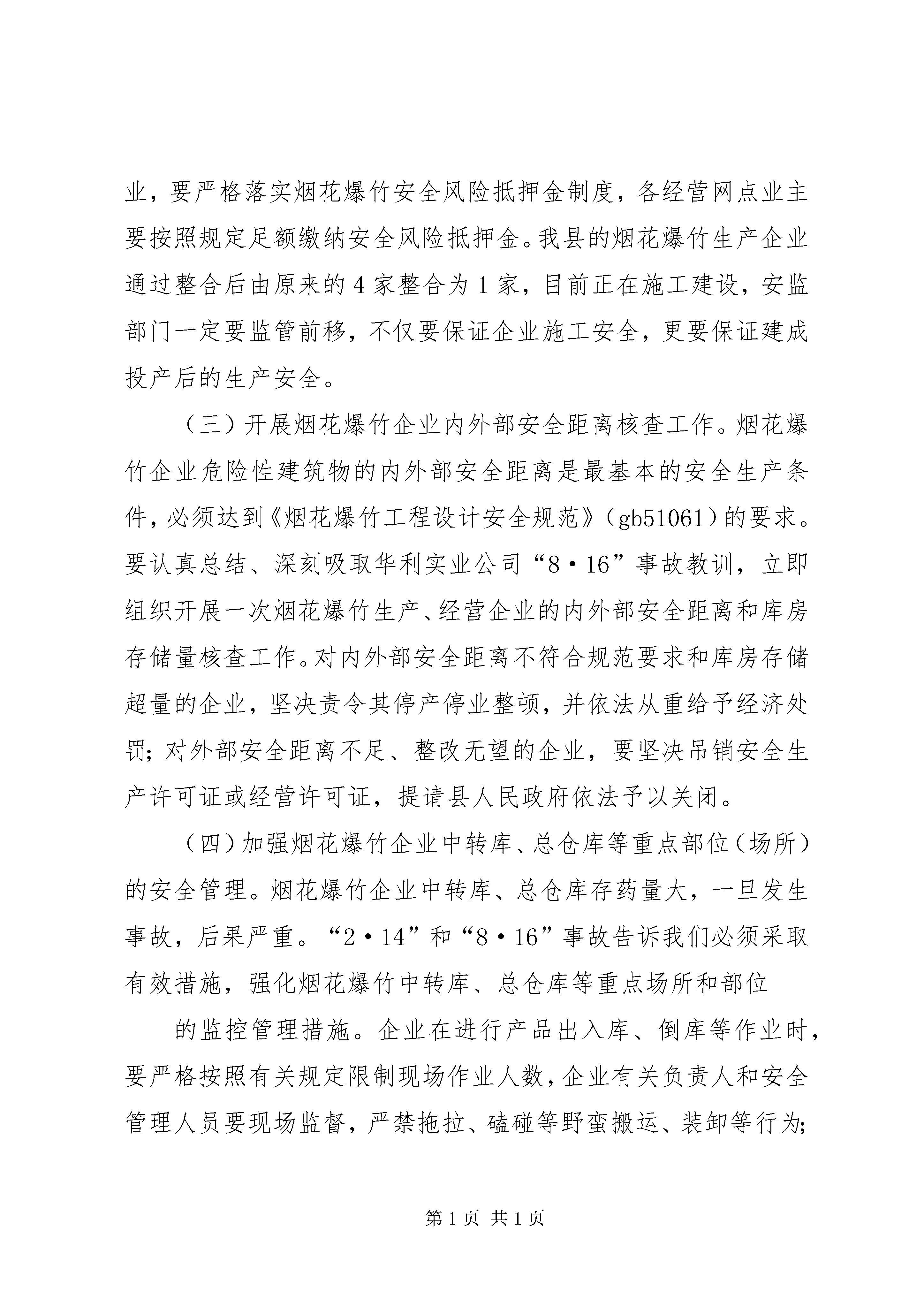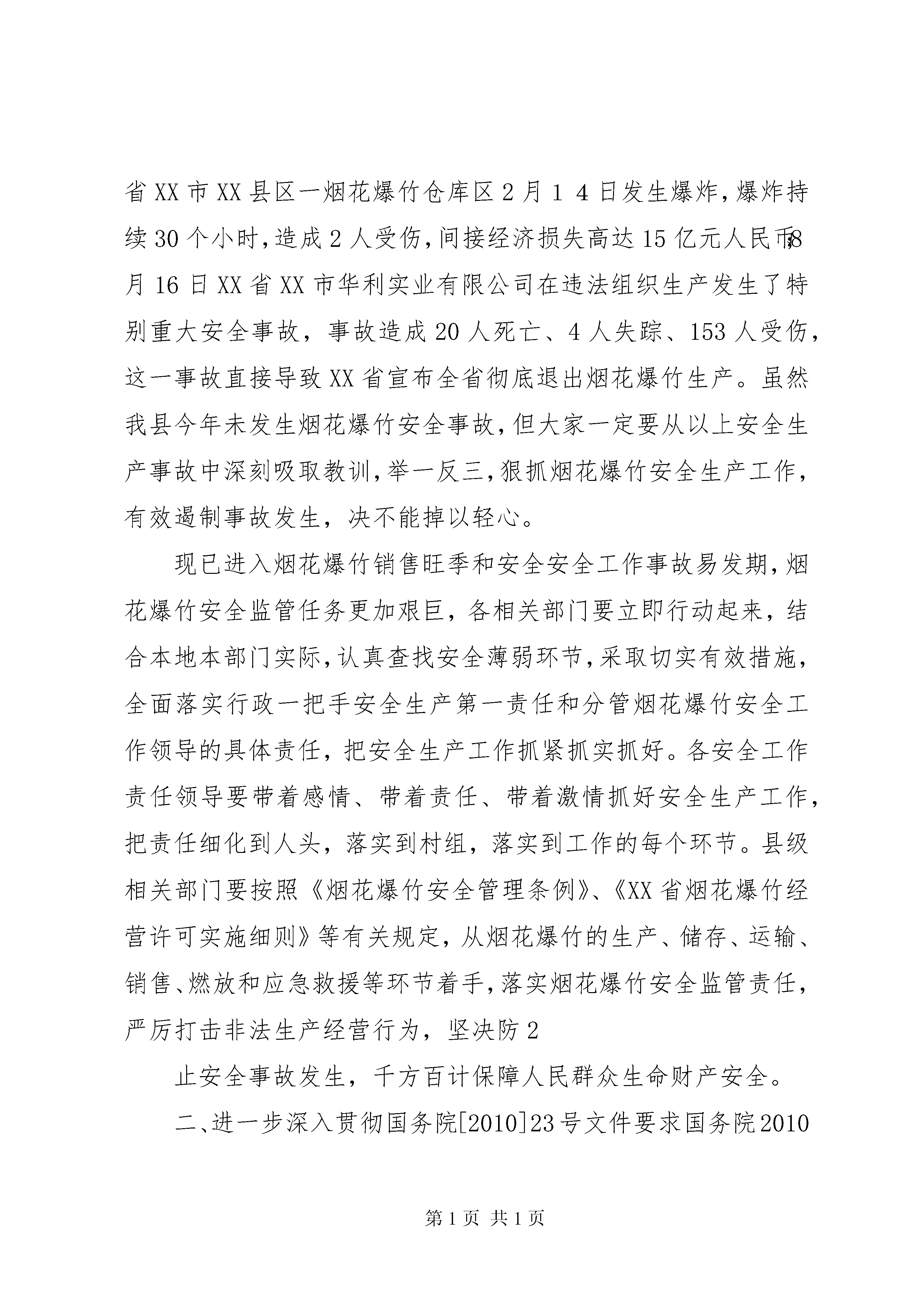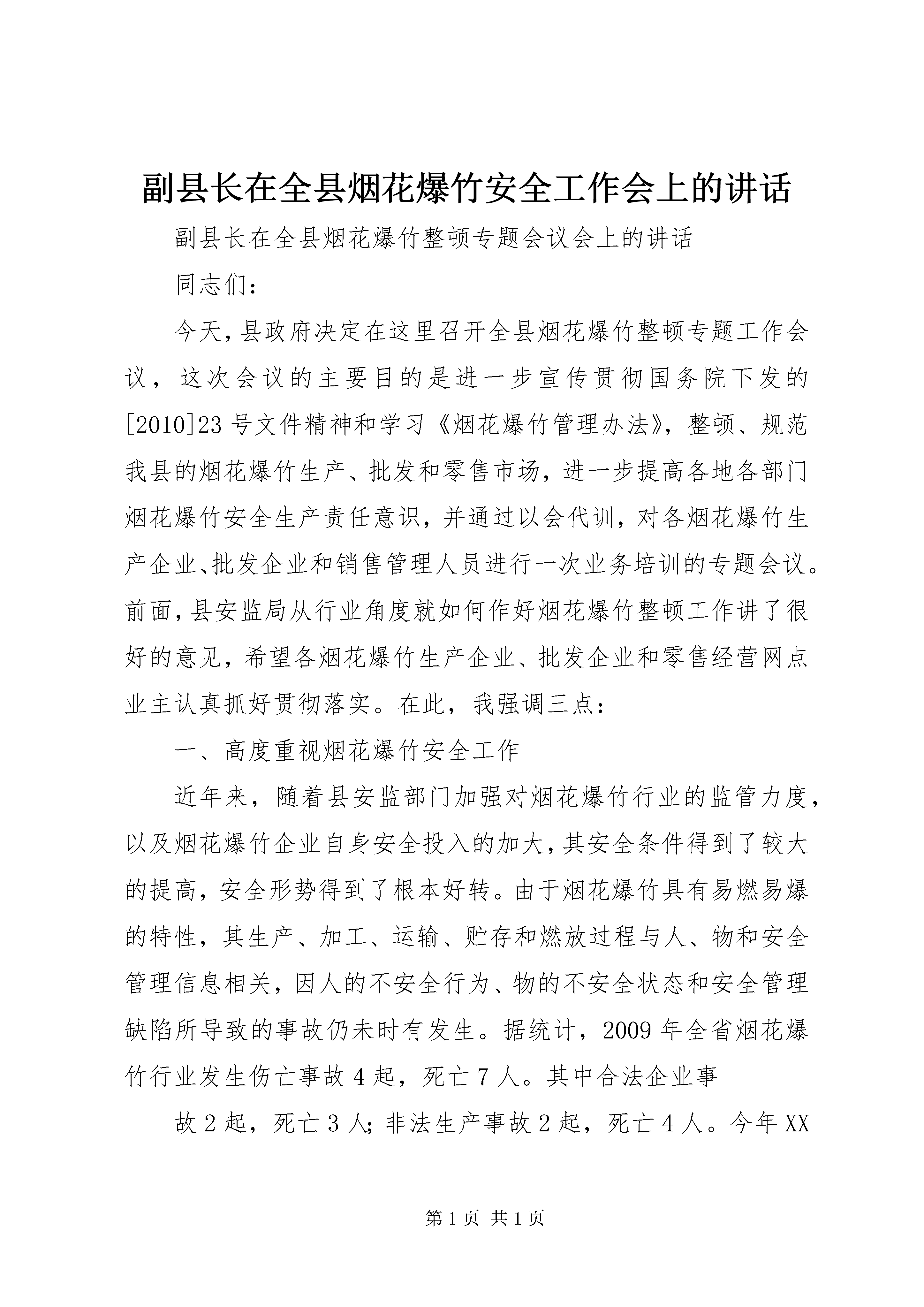 副县长在全县烟花爆竹安全工作会上的讲话副县长在全县烟花爆竹整顿专题会议会上的讲话同志们:今天,县政府决定在这里召开全县烟花爆竹整顿专题工作会议,这次会议的主要目的是进一步宣传贯彻国务院下发的[2010]23号文件精神和学习《烟花爆竹管理办法》,整顿、规范我县的烟花爆竹生产、批发和零售市场,进一步提高各地各部门烟花爆竹安全生产责任意识,并通过以会代训,对各烟花爆竹生产企业、批发企业和销售管理人员进行一次业务培训的专题会议。前面,县安监局从行业角度就如何作好烟花爆竹整顿工作讲了很好的意见,希望各烟花爆竹生产企业、批发企业和零售经营网点业主认真抓好贯彻落实。在此,我强调三点:一、高度重视烟花爆竹安全工作近年来,随着县安监部门加强对烟花爆竹行业的监管力度,以及烟花爆竹企业自身安全投入的加大,其安全条件得到了较大的提高,安全形势得到了根本好转。由于烟花爆竹具有易燃易爆的特性,其生产、加工、运输、贮存和燃放过程与人、物和安全管理信息相关,因人的不安全行为、物的不安全状态和安全管理缺陷所导致的事故仍未时有发生。据统计,2009年全省烟花爆竹行业发生伤亡事故4起,死亡7人。其中合法企业事故2起,死亡3人;非法生产事故2起,死亡4人。今年XX省XX市XX县区一烟花爆竹仓库区2月14日发生爆炸,爆炸持续30个小时,造成2人受伤,间接经济损失高达15亿元人民币;8月16日XX省XX市华利实业有限公司在违法组织生产发生了特别重大安全事故,事故造成20人死亡、4人失踪、153人受伤,这一事故直接导致XX省宣布全省彻底退出烟花爆竹生产。虽然我县今年未发生烟花爆竹安全事故,但大家一定要从以上安全生产事故中深刻吸取教训,举一反三,狠抓烟花爆竹安全生产工作,有效遏制事故发生,决不能掉以轻心。现已进入烟花爆竹销售旺季和安全安全工作事故易发期,烟花爆竹安全监管任务更加艰巨,各相关部门要立即行动起来,结合本地本部门实际,认真查找安全薄弱环节,采取切实有效措施,全面落实行政一把手安全生产第一责任和分管烟花爆竹安全工作领导的具体责任,把安全生产工作抓紧抓实抓好。各安全工作责任领导要带着感情、带着责任、带着激情抓好安全生产工作,把责任细化到人头,落实到村组,落实到工作的每个环节。县级相关部门要按照《烟花爆竹安全管理条例》、《XX省烟花爆竹经营许可实施细则》等有关规定,从烟花爆竹的生产、储存、运输、销售、燃放和应急救援等环节着手,落实烟花爆竹安全监管责任,严厉打击非法生产经营行为,坚决防2止安全事故发生,千方百计保障人民群众生命财产安全。二、进一步深入贯彻国务院[2010]23号文件要求国务院2010年7月19日下发了《国务院关于进一步加强企业安全生产工作的通知》(国发[2010]23号),通知要求以烟花爆竹行业为重点,全面加强企业安全生产工作,要求采取更加有效的管理手段和政策措施,集中整治非法违法生产行为,坚决遏制重特大事故发生,要进一步调整产业结构,积极推进重点行业的企业重组,彻底淘汰安全性能低下、危及安全生产的落后产能,形成安全生产长效机制,我县对烟花爆竹生产企业进行的重组,就是对这一指导思想的具体落实。通知明确指出要规范企业生产经营行为,要求对企业的“三违”、“三超”严格查处,对违反企业要责令停产停工整顿,并给予规定上限的经济处罚,并对企业排查治理安全隐患,强化领导责任,强化职工安全培训,加强生产技术管理和强制推行先进适用的技术设备等提出了具体的措施。全县各烟花爆竹生产企业、批发企业和零售网点都要认真学习23号文件精神,将文件精神学懂、学透,并严格按照通知规定作好自身工作,并必须要在规定时限内通过相关职能部门的检查验收。三、切实加强烟花爆竹安全管理各地各相关部门要按照“贯彻法规,落实责任,强化监管”3工作主线,牢固树立“安全发展”观念和“依法治安”方略,严格落实烟花爆竹生产企业、批发企业和零售经营网点主体责任和乡镇、部门监管责任,深入持续地开展好安全隐患排查治理工作。(一)全面落实生产企业、批发企业和零售经营网点主体责任。各烟花爆竹生产企业、批发企业和零售经营网点是烟花爆竹安全工作的责任主体,企业和零售经营网点法人代表是第一责任人,必须认真履行安全生产主体责任。烟花爆竹生产和批发企业要按照标准化建设要求,建立完善安全生产管理制、安全生产责任制、安全隐患排查登记制、烟花爆竹流向登记制和危险易爆物品安全操作规程等制度规程,保证仓储库房和零售经营网点硬件设施、消防设备等安全必备设施投入,落实各仓库、储存点、零售经营专店、专柜全天专人值班守护制度;要严格控制烟花爆竹零售网点库存量,目前我县的烟花爆竹生产企业正在建设当中,批发企业要建立烟花爆竹进货售货台帐,不得从非法渠道进货,并按照规定送货到零售经营网点,准确掌握各经营网点的库存量,将经营网点库存量