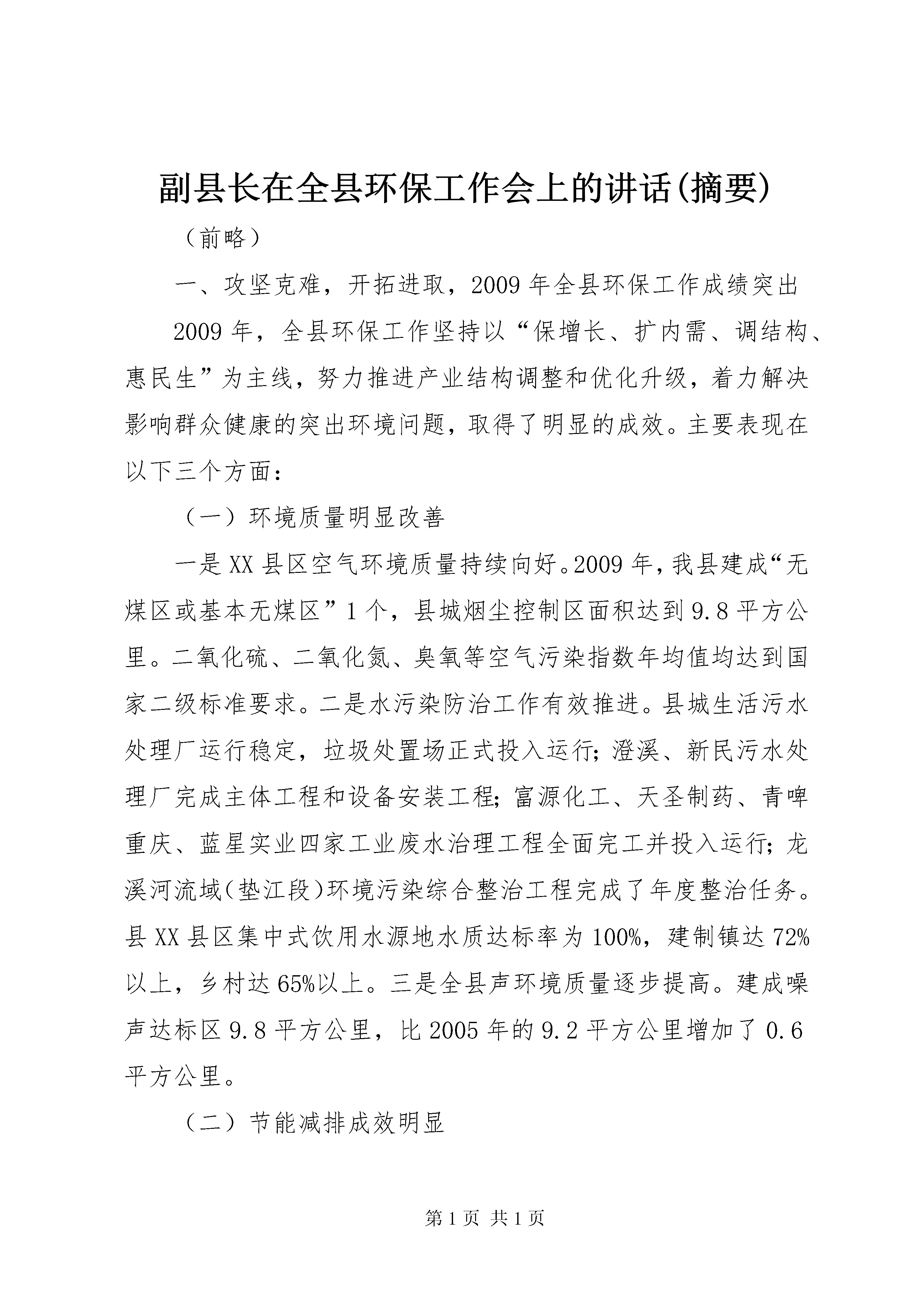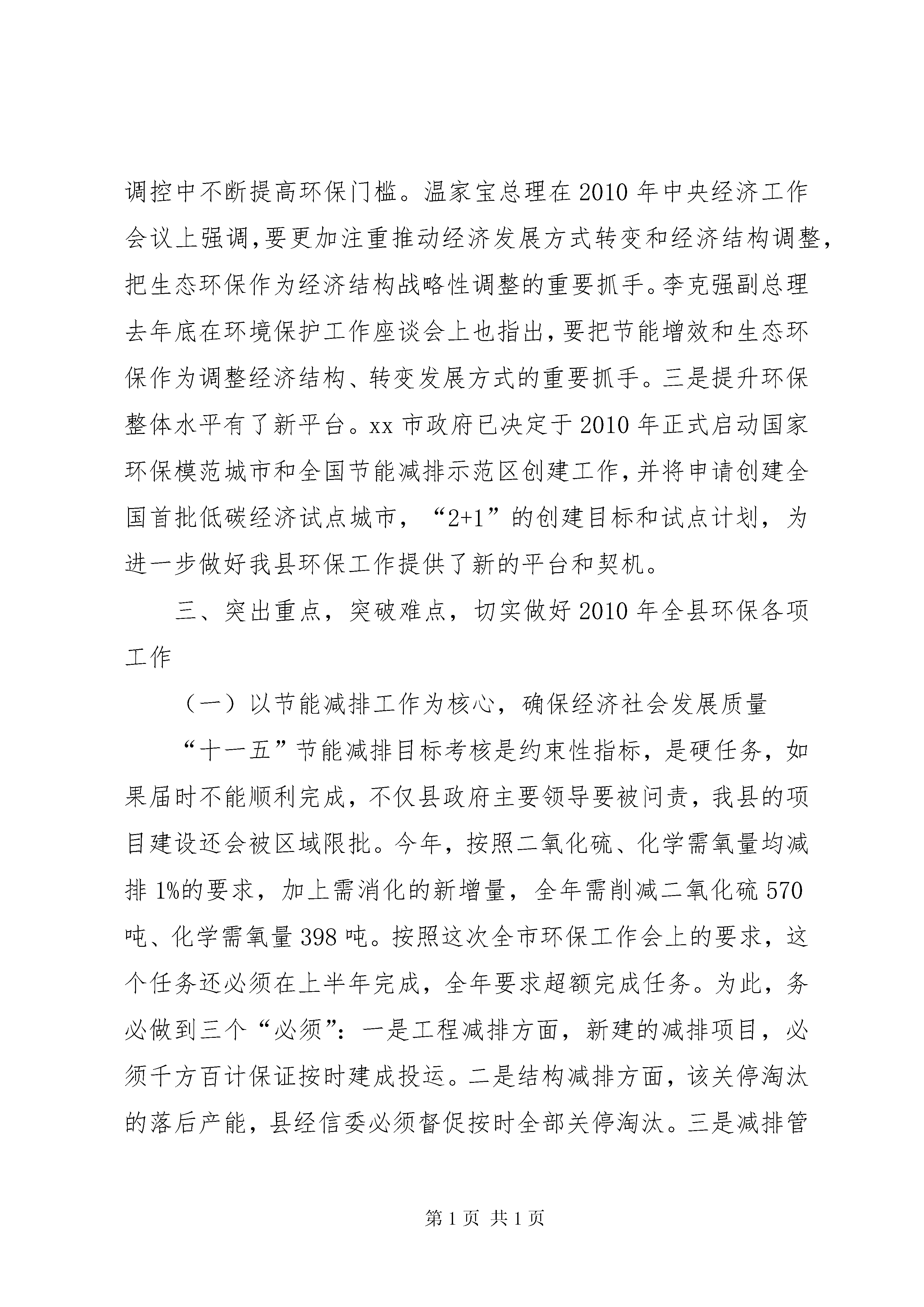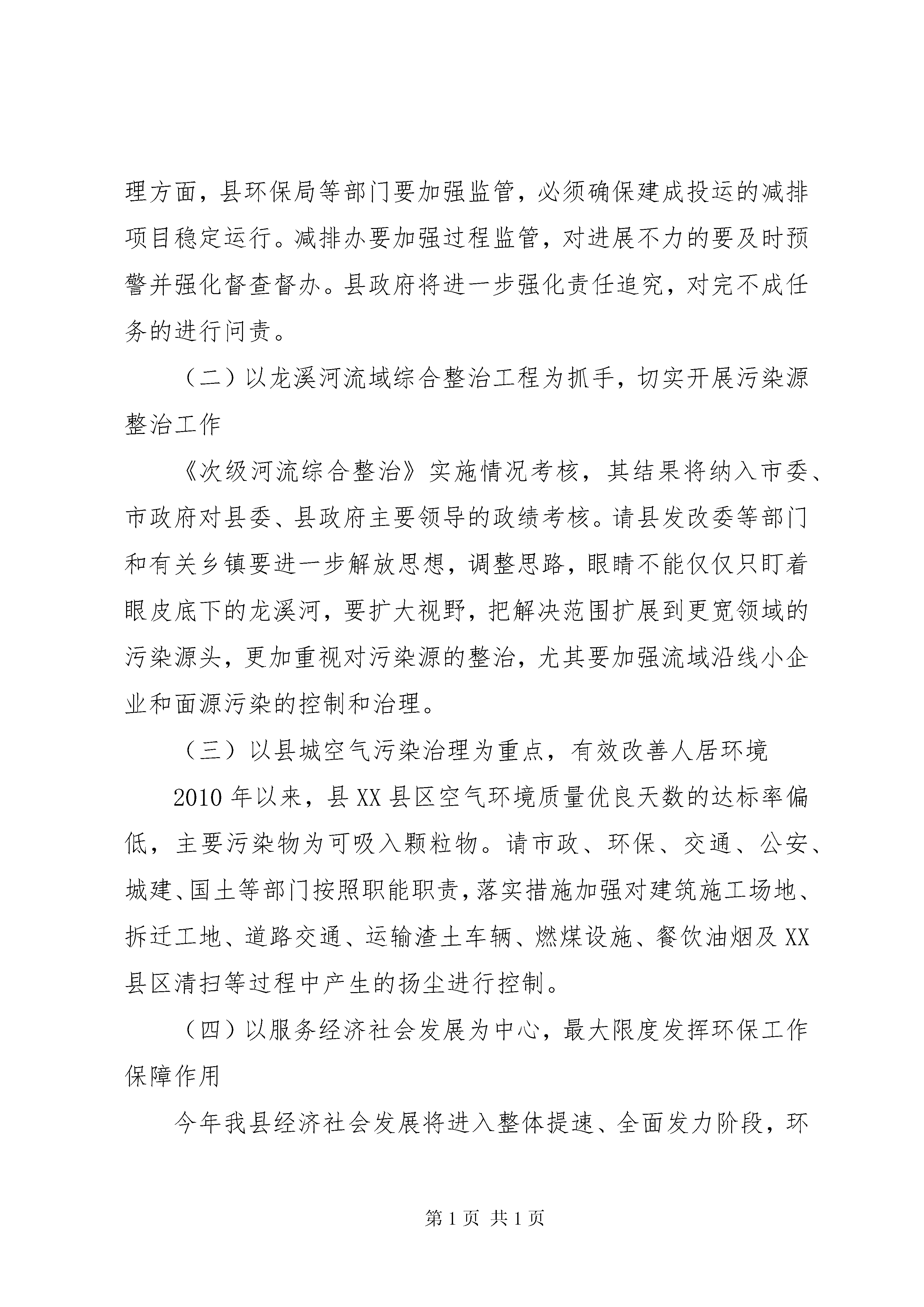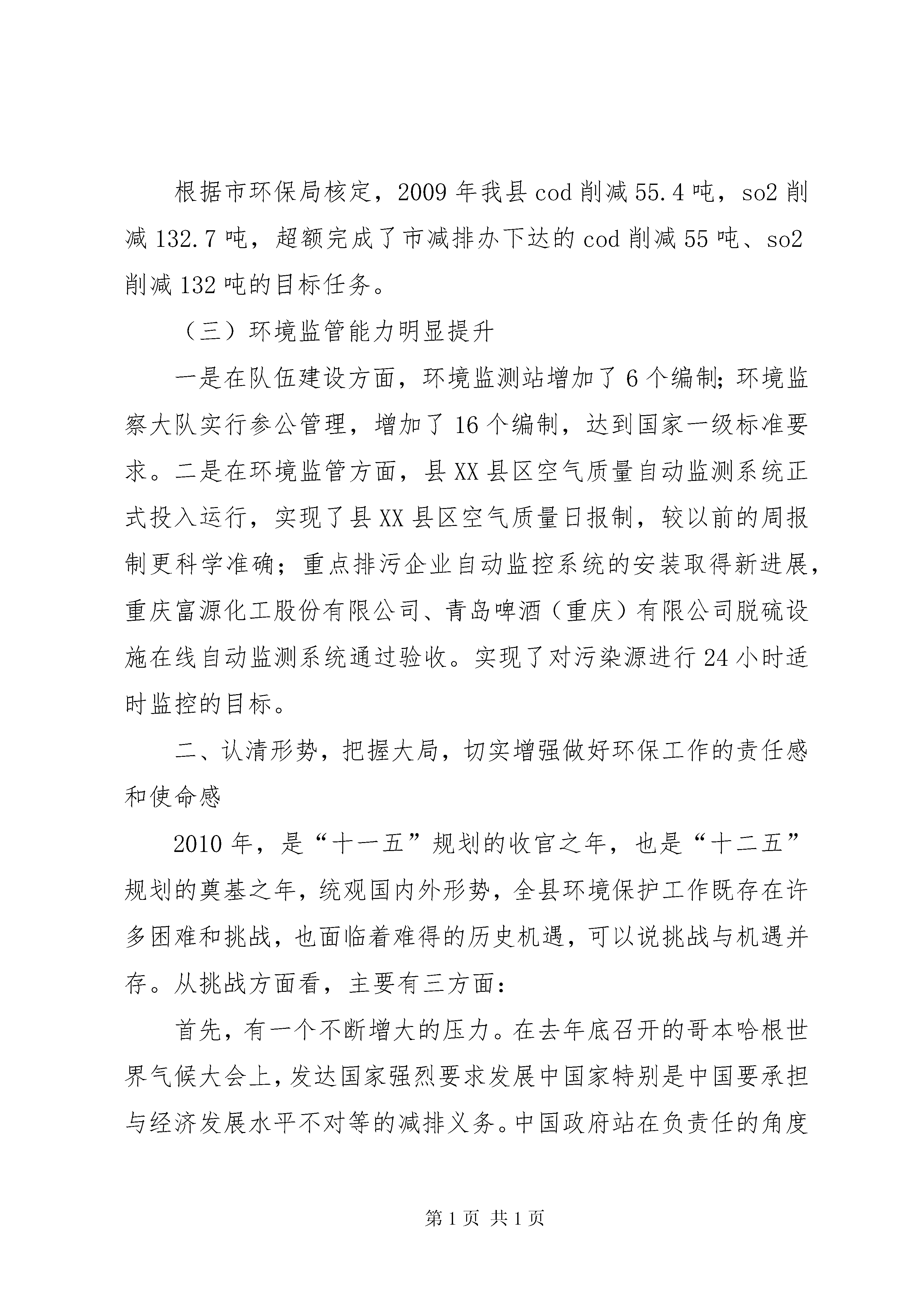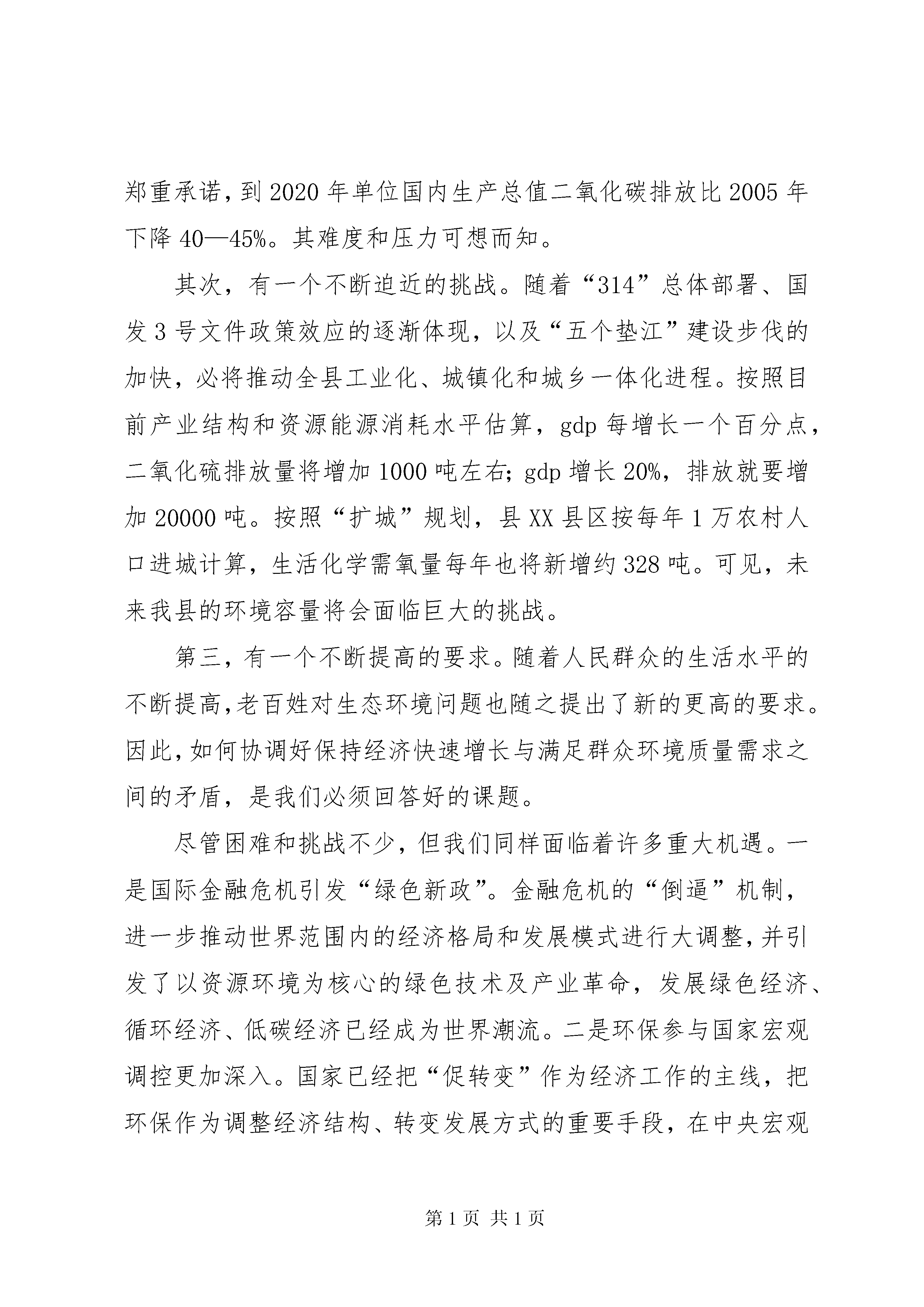 副县长在全县环保工作会上的讲话(摘要)(前略)一、攻坚克难,开拓进取,2009年全县环保工作成绩突出2009年,全县环保工作坚持以“保增长、扩内需、调结构、惠民生”为主线,努力推进产业结构调整和优化升级,着力解决影响群众健康的突出环境问题,取得了明显的成效。主要表现在以下三个方面:(一)环境质量明显改善一是XX县区空气环境质量持续向好。2009年,我县建成“无煤区或基本无煤区”1个,县城烟尘控制区面积达到9.8平方公里。二氧化硫、二氧化氮、臭氧等空气污染指数年均值均达到国家二级标准要求。二是水污染防治工作有效推进。县城生活污水处理厂运行稳定,垃圾处置场正式投入运行;澄溪、新民污水处理厂完成主体工程和设备安装工程;富源化工、天圣制药、青啤重庆、蓝星实业四家工业废水治理工程全面完工并投入运行;龙溪河流域(垫江段)环境污染综合整治工程完成了年度整治任务。县XX县区集中式饮用水源地水质达标率为100%,建制镇达72%以上,乡村达65%以上。三是全县声环境质量逐步提高。建成噪声达标区9.8平方公里,比2005年的9.2平方公里增加了0.6平方公里。(二)节能减排成效明显根据市环保局核定,2009年我县cod削减55.4吨,so2削减132.7吨,超额完成了市减排办下达的cod削减55吨、so2削减132吨的目标任务。(三)环境监管能力明显提升一是在队伍建设方面,环境监测站增加了6个编制;环境监察大队实行参公管理,增加了16个编制,达到国家一级标准要求。二是在环境监管方面,县XX县区空气质量自动监测系统正式投入运行,实现了县XX县区空气质量日报制,较以前的周报制更科学准确;重点排污企业自动监控系统的安装取得新进展,重庆富源化工股份有限公司、青岛啤酒(重庆)有限公司脱硫设施在线自动监测系统通过验收。实现了对污染源进行24小时适时监控的目标。二、认清形势,把握大局,切实增强做好环保工作的责任感和使命感2010年,是“十一五”规划的收官之年,也是“十二五”规划的奠基之年,统观国内外形势,全县环境保护工作既存在许多困难和挑战,也面临着难得的历史机遇,可以说挑战与机遇并存。从挑战方面看,主要有三方面:首先,有一个不断增大的压力。在去年底召开的哥本哈根世界气候大会上,发达国家强烈要求发展中国家特别是中国要承担与经济发展水平不对等的减排义务。中国政府站在负责任的角度郑重承诺,到2020年单位国内生产总值二氧化碳排放比2005年下降40—45%。其难度和压力可想而知。其次,有一个不断迫近的挑战。随着“314”总体部署、国发3号文件政策效应的逐渐体现,以及“五个垫江”建设步伐的加快,必将推动全县工业化、城镇化和城乡一体化进程。按照目前产业结构和资源能源消耗水平估算,gdp每增长一个百分点,二氧化硫排放量将增加1000吨左右;gdp增长20%,排放就要增加20000吨。按照“扩城”规划,县XX县区按每年1万农村人口进城计算,生活化学需氧量每年也将新增约328吨。可见,未来我县的环境容量将会面临巨大的挑战。第三,有一个不断提高的要求。随着人民群众的生活水平的不断提高,老百姓对生态环境问题也随之提出了新的更高的要求。因此,如何协调好保持经济快速增长与满足群众环境质量需求之间的矛盾,是我们必须回答好的课题。尽管困难和挑战不少,但我们同样面临着许多重大机遇。一是国际金融危机引发“绿色新政”。金融危机的“倒逼”机制,进一步推动世界范围内的经济格局和发展模式进行大调整,并引发了以资源环境为核心的绿色技术及产业革命,发展绿色经济、循环经济、低碳经济已经成为世界潮流。二是环保参与国家宏观调控更加深入。国家已经把“促转变”作为经济工作的主线,把环保作为调整经济结构、转变发展方式的重要手段,在中央宏观调控中不断提高环保门槛。温家宝总理在2010年中央经济工作会议上强调,要更加注重推动经济发展方式转变和经济结构调整,把生态环保作为经济结构战略性调整的重要抓手。李克强副总理去年底在环境保护工作座谈会上也指出,要把节能增效和生态环保作为调整经济结构、转变发展方式的重要抓手。三是提升环保整体水平有了新平台。xx市政府已决定于2010年正式启动国家环保模范城市和全国节能减排示范区创建工作,并将申请创建全国首批低碳经济试点城市,“2+1”的创建目标和试点计划,为进一步做好我县环保工作提供了新的平台和契机。三、突出重点,突破难点,切实做好2010年全县环保各项工作(一)以节能减排工作为核心,确保经济社会发展质量“十一五”节能减排目标考核是约束性指标,是硬任务,如果届时不能顺利完成,不仅县政府主要领导要被问责,我县的项目建设还会被区域限批。今年,按照二氧化硫、化学需氧量均减排1%的要求,加上需消化的新增量,全年需削减二氧化硫570吨、化学需氧量398吨。按照这次全市环
