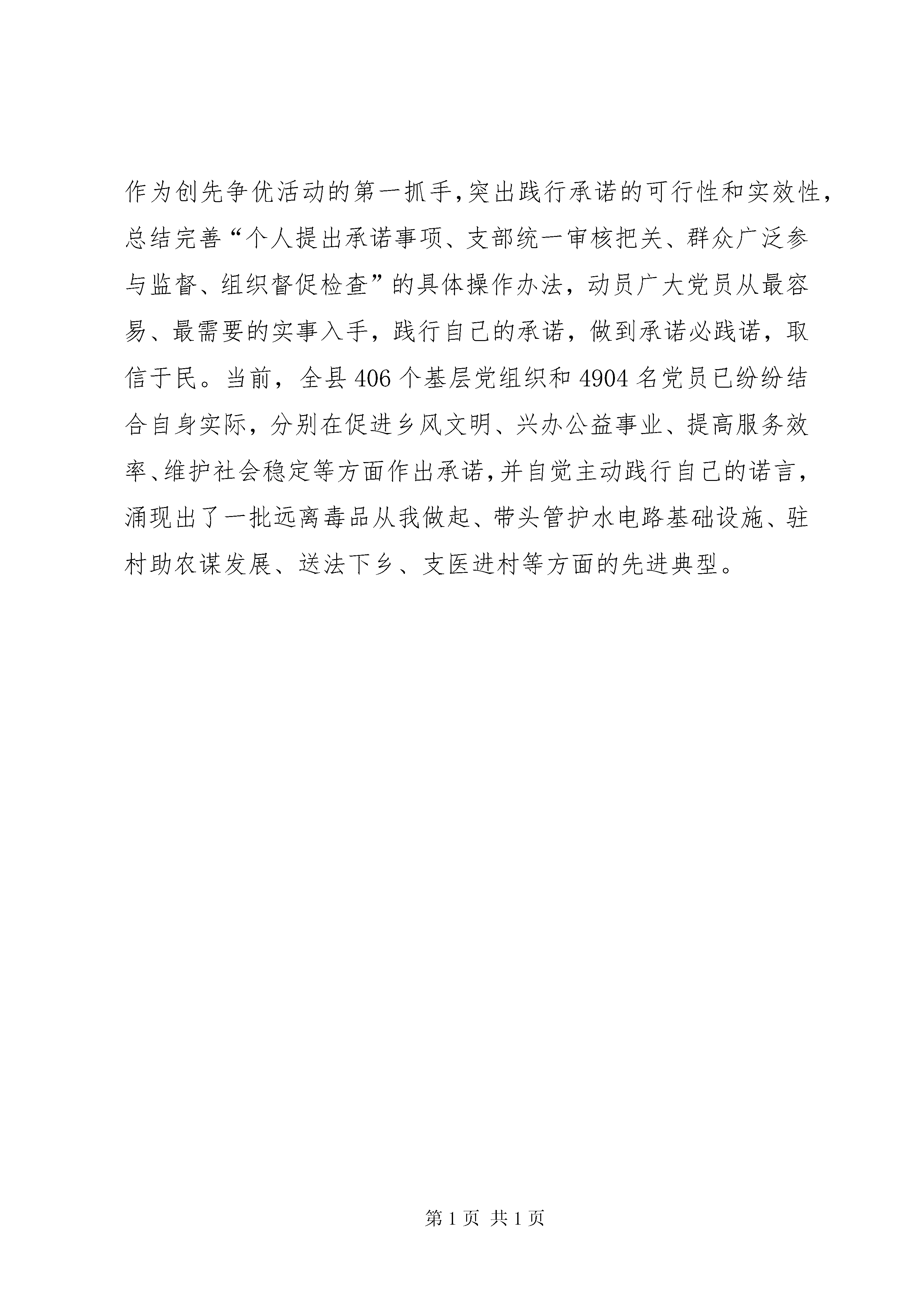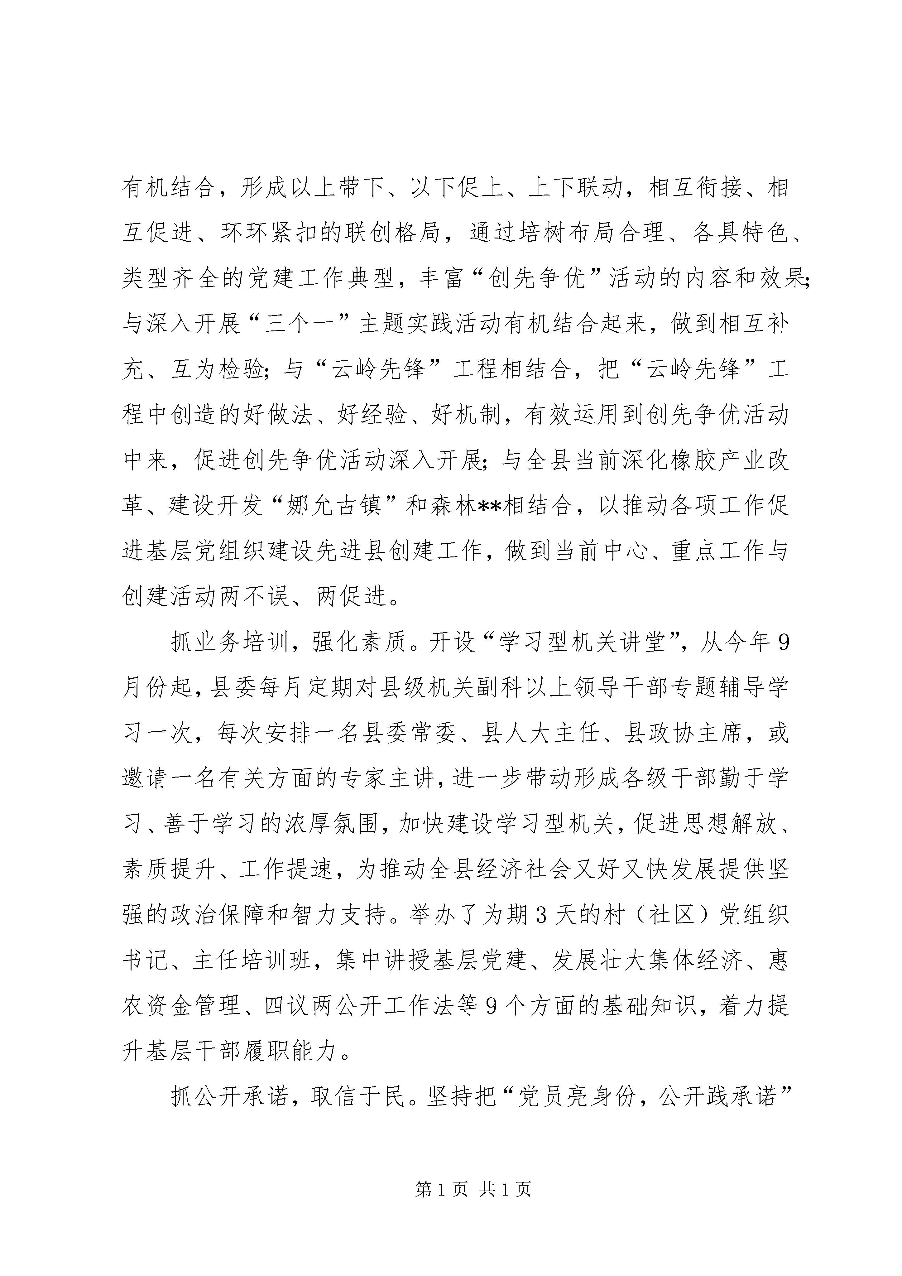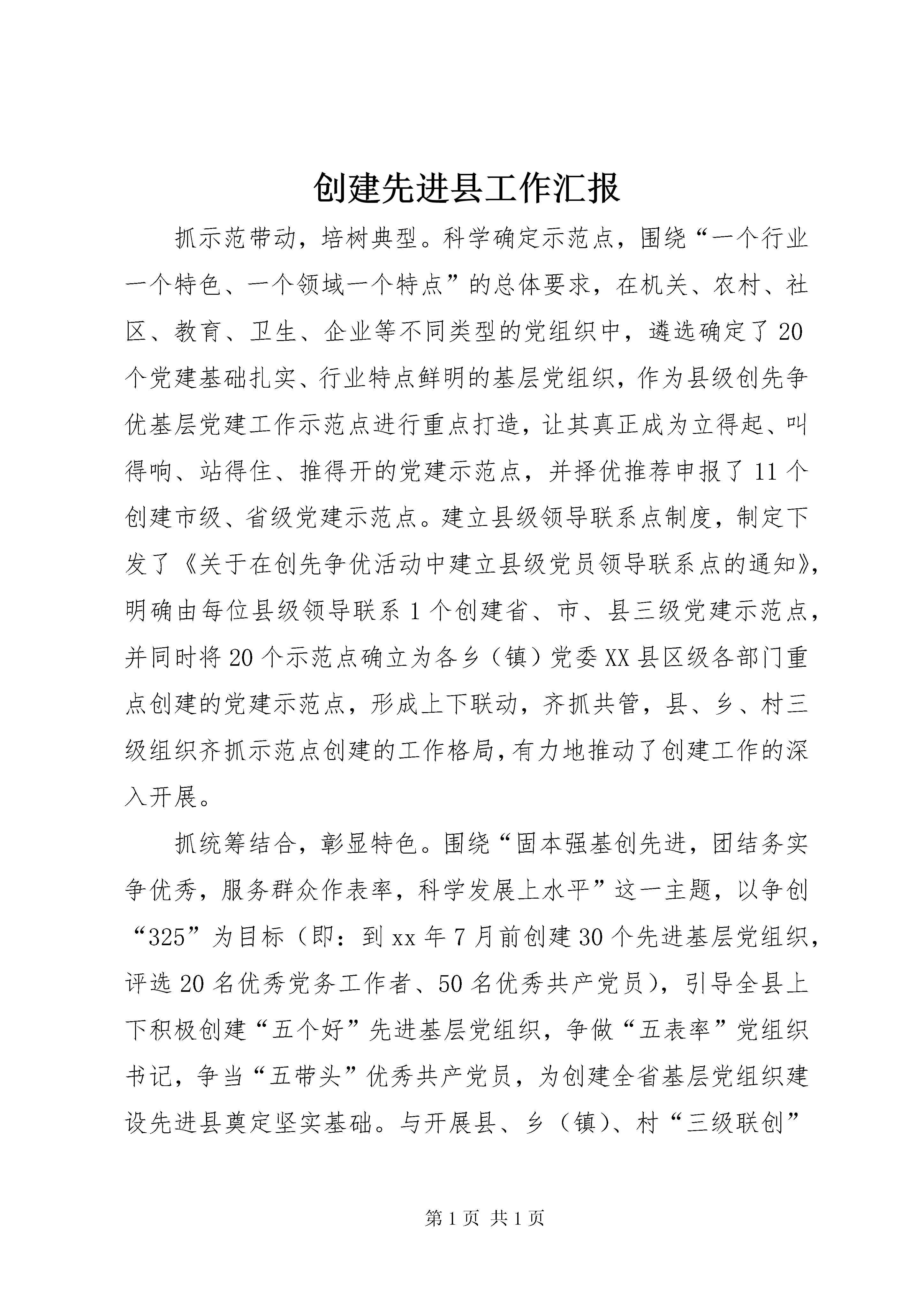 创建先进县工作汇报抓示范带动,培树典型。科学确定示范点,围绕“一个行业一个特色、一个领域一个特点”的总体要求,在机关、农村、社区、教育、卫生、企业等不同类型的党组织中,遴选确定了20个党建基础扎实、行业特点鲜明的基层党组织,作为县级创先争优基层党建工作示范点进行重点打造,让其真正成为立得起、叫得响、站得住、推得开的党建示范点,并择优推荐申报了11个创建市级、省级党建示范点。建立县级领导联系点制度,制定下发了《关于在创先争优活动中建立县级党员领导联系点的通知》,明确由每位县级领导联系1个创建省、市、县三级党建示范点,并同时将20个示范点确立为各乡(镇)党委XX县区级各部门重点创建的党建示范点,形成上下联动,齐抓共管,县、乡、村三级组织齐抓示范点创建的工作格局,有力地推动了创建工作的深入开展。抓统筹结合,彰显特色。围绕“固本强基创先进,团结务实争优秀,服务群众作表率,科学发展上水平”这一主题,以争创“325”为目标(即:到xx年7月前创建30个先进基层党组织,评选20名优秀党务工作者、50名优秀共产党员),引导全县上下积极创建“五个好”先进基层党组织,争做“五表率”党组织书记,争当“五带头”优秀共产党员,为创建全省基层党组织建设先进县奠定坚实基础。与开展县、乡(镇)、村“三级联创”有机结合,形成以上带下、以下促上、上下联动,相互衔接、相互促进、环环紧扣的联创格局,通过培树布局合理、各具特色、类型齐全的党建工作典型,丰富“创先争优”活动的内容和效果;与深入开展“三个一”主题实践活动有机结合起来,做到相互补充、互为检验;与“云岭先锋”工程相结合,把“云岭先锋”工程中创造的好做法、好经验、好机制,有效运用到创先争优活动中来,促进创先争优活动深入开展;与全县当前深化橡胶产业改革、建设开发“娜允古镇”和森林**相结合,以推动各项工作促进基层党组织建设先进县创建工作,做到当前中心、重点工作与创建活动两不误、两促进。抓业务培训,强化素质。开设“学习型机关讲堂”,从今年9月份起,县委每月定期对县级机关副科以上领导干部专题辅导学习一次,每次安排一名县委常委、县人大主任、县政协主席,或邀请一名有关方面的专家主讲,进一步带动形成各级干部勤于学习、善于学习的浓厚氛围,加快建设学习型机关,促进思想解放、素质提升、工作提速,为推动全县经济社会又好又快发展提供坚强的政治保障和智力支持。举办了为期3天的村(社区)党组织书记、主任培训班,集中讲授基层党建、发展壮大集体经济、惠农资金管理、四议两公开工作法等9个方面的基础知识,着力提升基层干部履职能力。抓公开承诺,取信于民。坚持把“党员亮身份,公开践承诺”作为创先争优活动的第一抓手,突出践行承诺的可行性和实效性,总结完善“个人提出承诺事项、支部统一审核把关、群众广泛参与监督、组织督促检查”的具体操作办法,动员广大党员从最容易、最需要的实事入手,践行自己的承诺,做到承诺必践诺,取信于民。当前,全县406个基层党组织和4904名党员已纷纷结合自身实际,分别在促进乡风文明、兴办公益事业、提高服务效率、维护社会稳定等方面作出承诺,并自觉主动践行自己的诺言,涌现出了一批远离毒品从我做起、带头管护水电路基础设施、驻村助农谋发展、送法下乡、支医进村等方面的先进典型。
