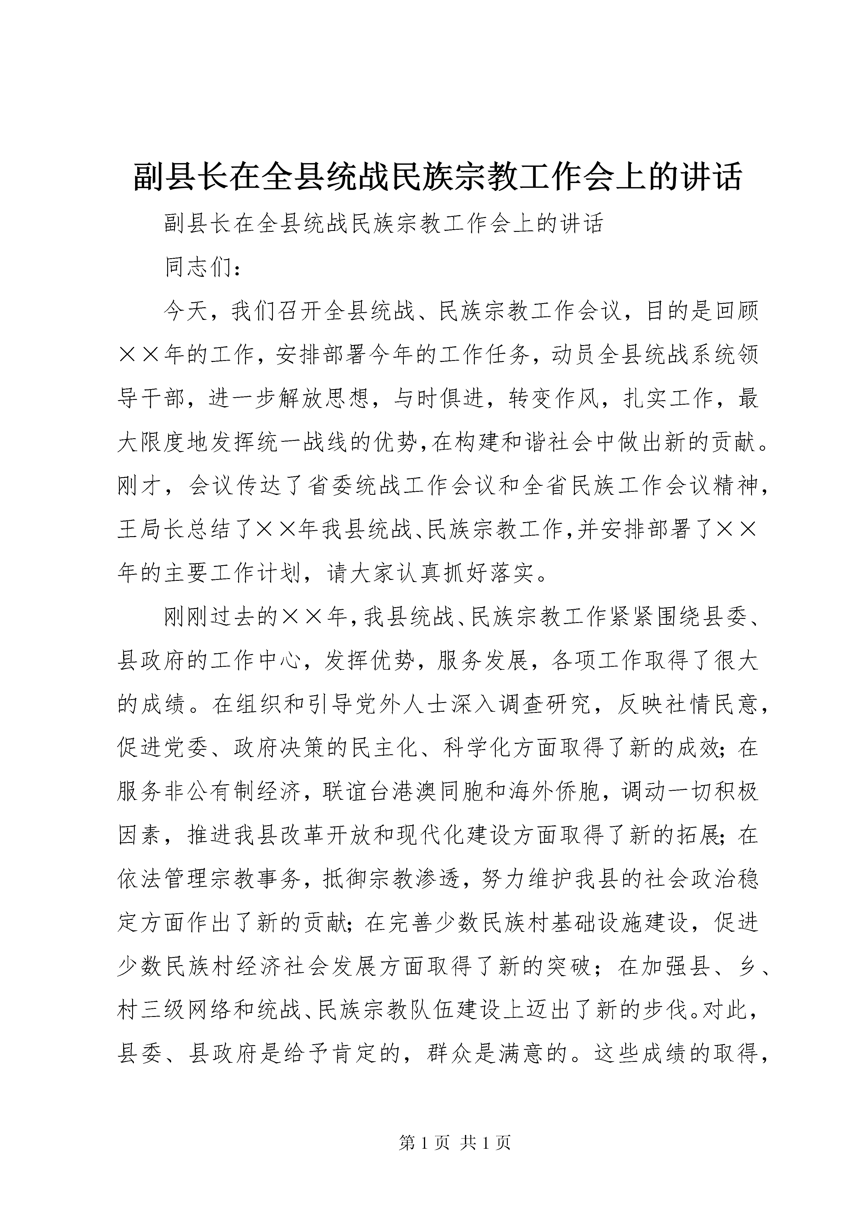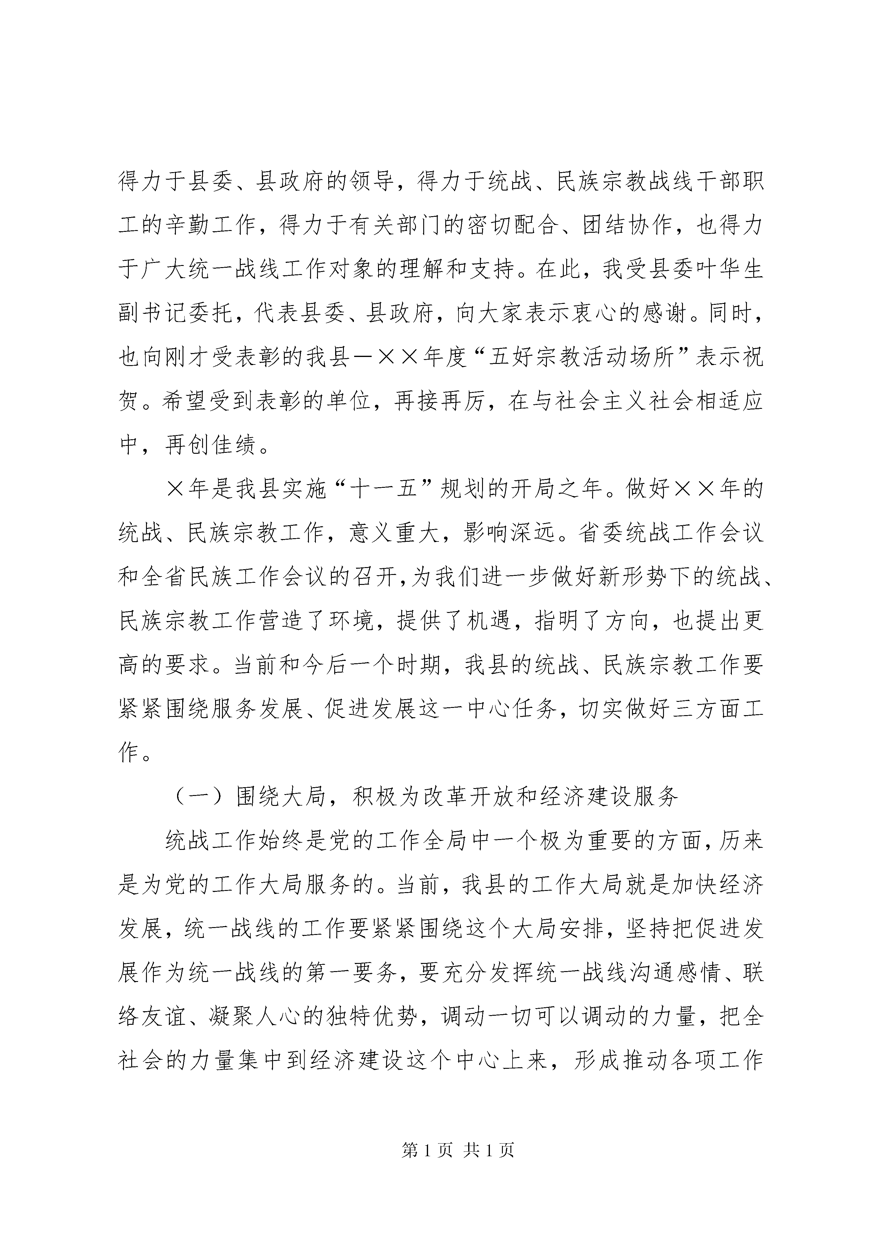 副县长在全县统战民族宗教工作会上的讲话副县长在全县统战民族宗教工作会上的讲话同志们:今天,我们召开全县统战、民族宗教工作会议,目的是回顾××年的工作,安排部署今年的工作任务,动员全县统战系统领导干部,进一步解放思想,与时俱进,转变作风,扎实工作,最大限度地发挥统一战线的优势,在构建和谐社会中做出新的贡献。刚才,会议传达了省委统战工作会议和全省民族工作会议精神,王局长总结了××年我县统战、民族宗教工作,并安排部署了××年的主要工作计划,请大家认真抓好落实。刚刚过去的××年,我县统战、民族宗教工作紧紧围绕县委、县政府的工作中心,发挥优势,服务发展,各项工作取得了很大的成绩。在组织和引导党外人士深入调查研究,反映社情民意,促进党委、政府决策的民主化、科学化方面取得了新的成效;在服务非公有制经济,联谊台港澳同胞和海外侨胞,调动一切积极因素,推进我县改革开放和现代化建设方面取得了新的拓展;在依法管理宗教事务,抵御宗教渗透,努力维护我县的社会政治稳定方面作出了新的贡献;在完善少数民族村基础设施建设,促进少数民族村经济社会发展方面取得了新的突破;在加强县、乡、村三级网络和统战、民族宗教队伍建设上迈出了新的步伐。对此,县委、县政府是给予肯定的,群众是满意的。这些成绩的取得,得力于县委、县政府的领导,得力于统战、民族宗教战线干部职工的辛勤工作,得力于有关部门的密切配合、团结协作,也得力于广大统一战线工作对象的理解和支持。在此,我受县委叶华生副书记委托,代表县委、县政府,向大家表示衷心的感谢。同时,也向刚才受表彰的我县-××年度“五好宗教活动场所”表示祝贺。希望受到表彰的单位,再接再厉,在与社会主义社会相适应中,再创佳绩。×年是我县实施“十一五”规划的开局之年。做好××年的统战、民族宗教工作,意义重大,影响深远。省委统战工作会议和全省民族工作会议的召开,为我们进一步做好新形势下的统战、民族宗教工作营造了环境,提供了机遇,指明了方向,也提出更高的要求。当前和今后一个时期,我县的统战、民族宗教工作要紧紧围绕服务发展、促进发展这一中心任务,切实做好三方面工作。(一)围绕大局,积极为改革开放和经济建设服务统战工作始终是党的工作全局中一个极为重要的方面,历来是为党的工作大局服务的。当前,我县的工作大局就是加快经济发展,统一战线的工作要紧紧围绕这个大局安排,坚持把促进发展作为统一战线的第一要务,要充分发挥统一战线沟通感情、联络友谊、凝聚人心的独特优势,调动一切可以调动的力量,把全社会的力量集中到经济建设这个中心上来,形成推动各项工作“走前列”的强大合力。一要发挥好统一战线对外联系面广、交往渠道多的优势,利用各种海内外关系,积极开展多层次、多渠道、多形式的外联工作,不断扩大我县的对外交往与合作。二要充分发挥统一战线“人才库”、“智囊团”的作用,重视和调动统一战线广大成员为经济建设建言献策的积极性。要积极创造条件,鼓励和支持统一战线的广大成员深入实际,围绕事关全县大局的重大问题,开展调查研究,集中民智和民意,促进科学决策。要以推动非公有制经济的发展为重点积极做好经济领域的统战工作,按照“团结、帮助、教育、引导”的方针,加强非公有制经济人士的思想政治工作,引导他们争做优秀中国特色社会主义建设者。工商联要充分发挥其职能作用,为非公有制经济发展做好排忧解难和服务保障工作,努力营造一个良好的发展环境,使其不断发挥促进县域经济发展的“主力军”作用。文秘114版权所有(二)理顺关系,化解矛盾,维护安定团结的政治局面保持政治和社会的稳定,是加快经济社会发展的前提,也是统战、民族宗教工作的重点。统战、民族宗教工作部门要协调好不同对象的思想政治工作,理顺关系,化解矛盾,维护稳定。要发挥统一战线涉及面广和工作对象代表性强、影响力大的优势,深入群众,了解社情民意,掌握思想动态,做好团结鼓劲、凝聚人心的工作。对于广大统战对象要加强联络,沟通感情,取得共识,化消积因素为积极因素,把各方面的力量引导到改革和发展的大局上来。要认清形势,积极稳妥地做好民族、宗教工作。宗教工作要把握一个关键,就是要全面正确地贯彻执行宗教信仰自由政策与《宗教事务条例》,依法加强对宗教事务的管理;夯实两个基础,就是要健全完善县、乡、村三级宗教工作网络和乡、村两级宗教管理责任制;强化三项管理,就是要强化对宗教活动场所、信教群众和宗教活动的管理。以实现一个目标,就是要坚持独立自主自办原则,引导宗教与社会主义社会相适应。民族工作要通过政策引导、项目带动、典型示范,扶持少数民族村发展经济,完善基础设施建设,推进民族团结进步。三、强化领导,促进统战、民族宗教工作深入发展各乡镇、各有关部门一定要高度重视和自觉抓好统战、民族宗教工作,继续坚持统战工作“四副县长在全县统战民族宗教工作会上的讲话个纳入